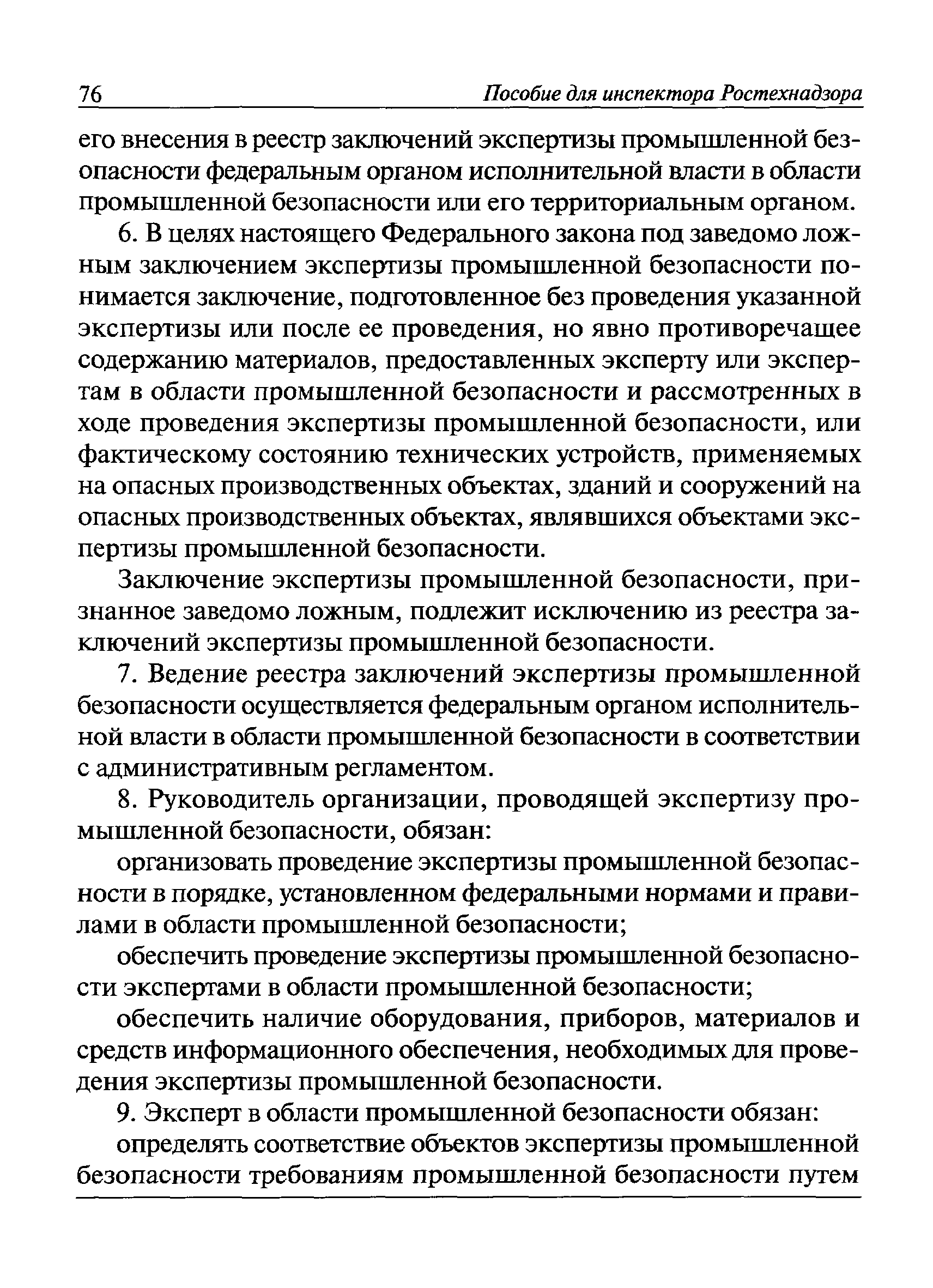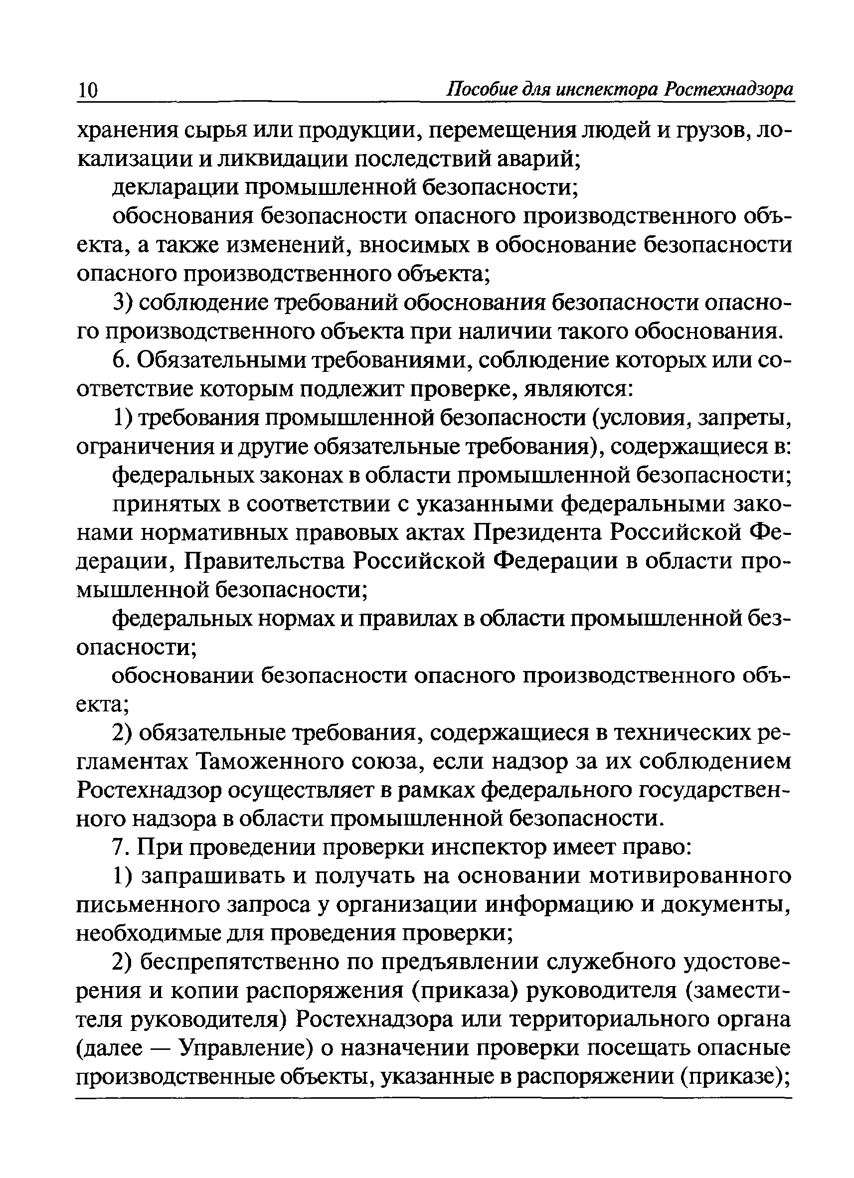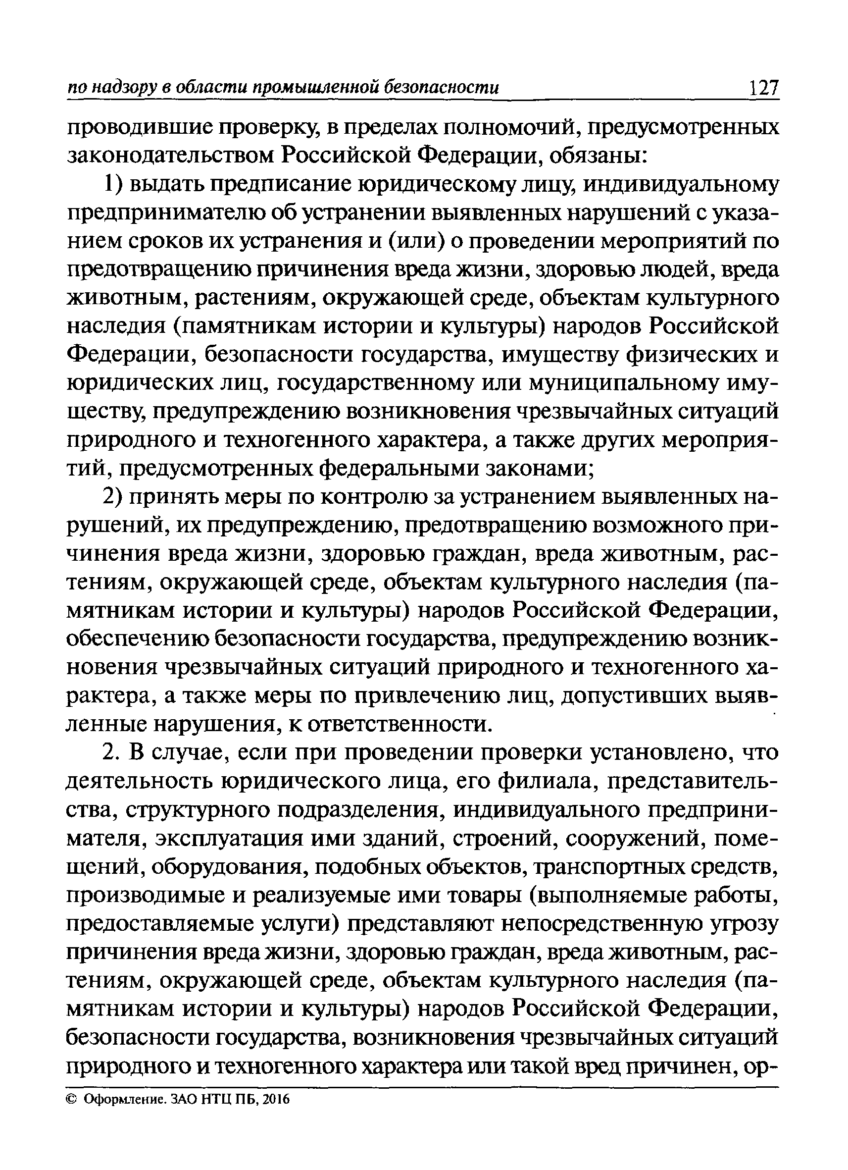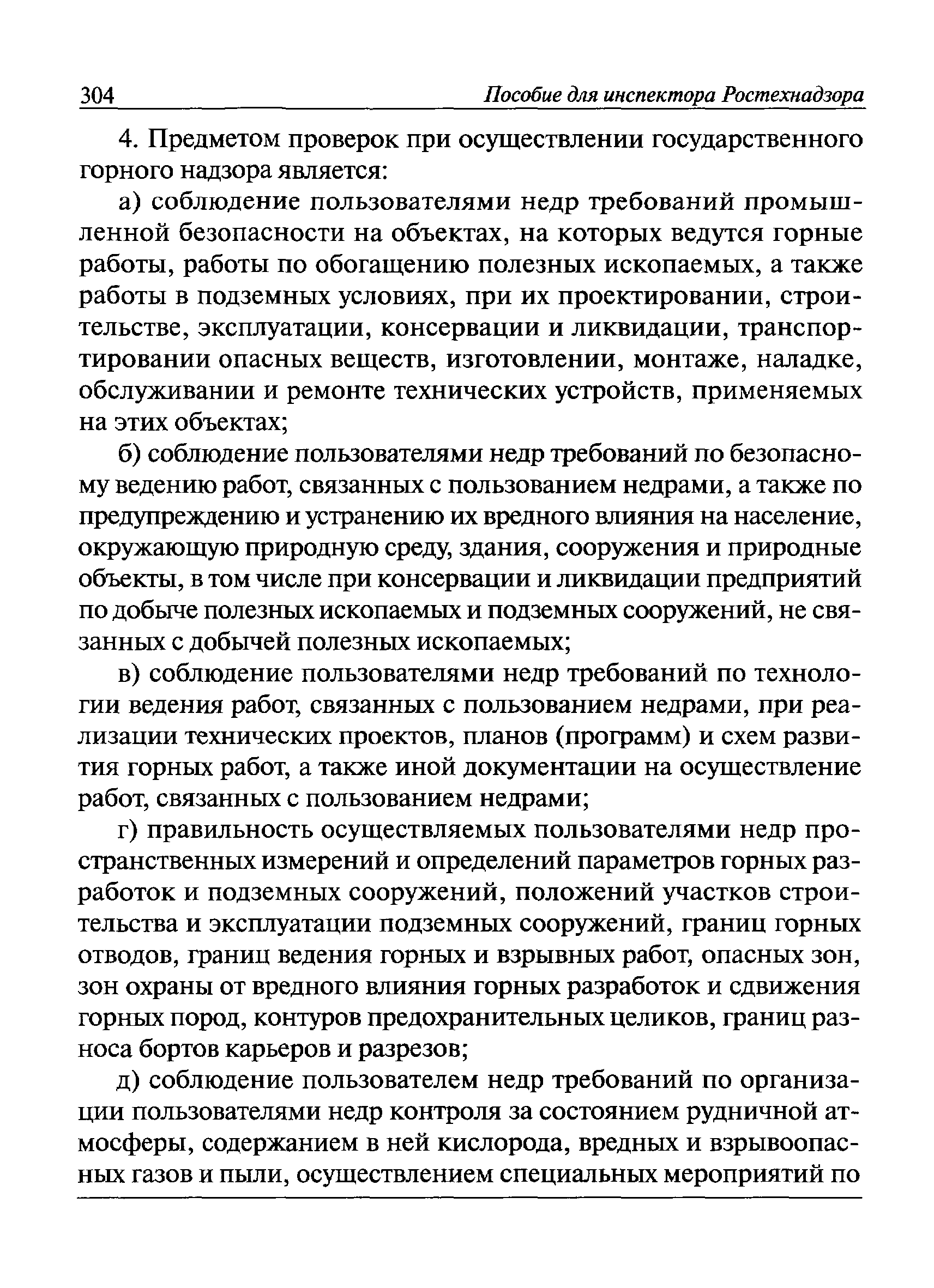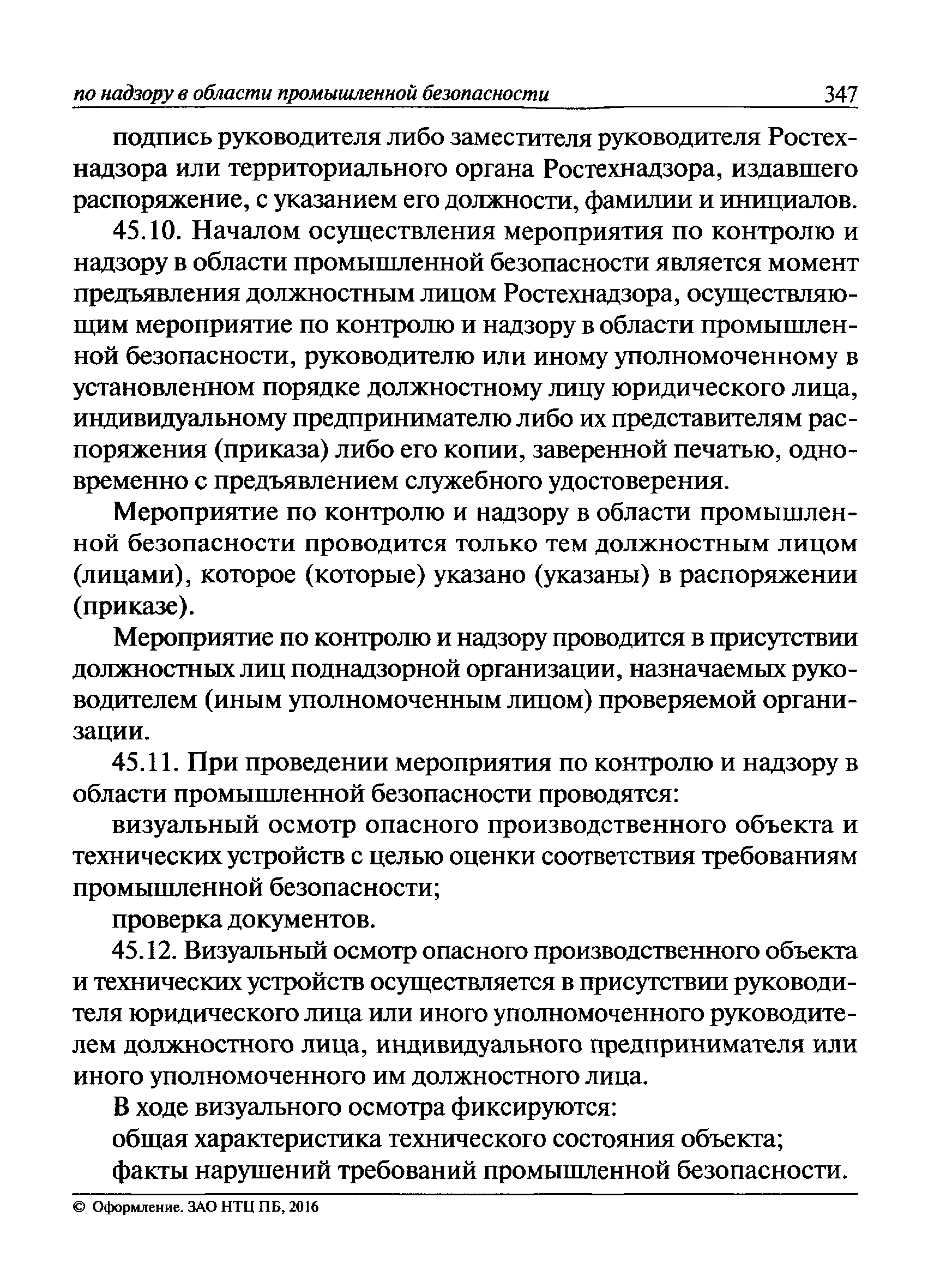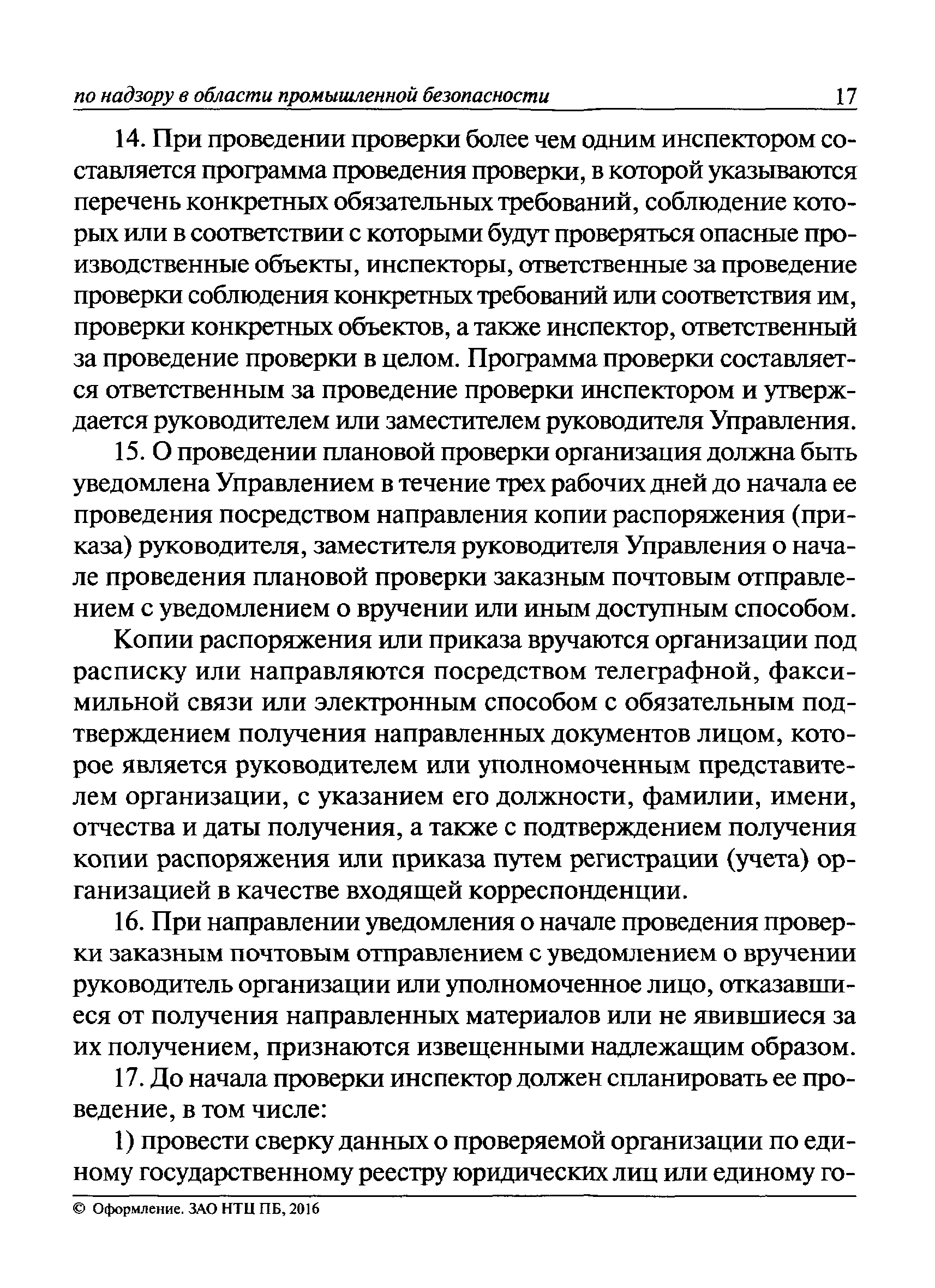 | Оглавление: | I Общие положения II Подготовка к проведению плановой проверки III Проведение плановой проверки IV Проведение документарной проверки V Особенности проведения внеплановой проверки VI Оформление результатов проверки VII Контроль исполнения выданного предписания VIII Особенности проведения проверок в режиме постоянного государственного надзора на опасных производственных объектах 1 класса опасности IХ Перечень нормативных правовых актов, используемых при проведении проверки Приложение 1. Распоряжение (приказ) Приложение 2. Акт проверки территориальным органом Ростехнадзора юридического лица, индивидуального предпринимателя Приложение 3. Предписание Законодательные и иные нормативные правовые акты к Пособию для инспектора Ростехнадзора по надзору в области промышленной безопасности Федеральный закон от 21 июля 1997 г. № 116-ФЗ "О промышленной безопасности опасных производственных объектов" Закон Российской Федерации от 21 февраля 1992 г. № 2395-1 "О недрах" (извлечения) Федеральный закон от 26 декабря 2008 г. № 294-ФЗ "О защите прав юридических лиц и индивидуальных предпринимателей при осуществлении государственного контроля (надзора) и муниципального контроля" (извлечения) Федеральный закон от 27 декабря 2002 г. № 184-ФЗ "О техническом регулировании" (извлечения) Кодекс Российской Федерации об административных правонарушениях от 30 декабря 2001 г. № 195-ФЗ (извлечения) Положение о Федеральной службе по экологическому, технологическому и атомному надзору, утвержденное постановлением Правительства Российской Федерации от 30 июля 2004 г. № 401 Положение о федеральном государственном надзоре в области промышленной безопасности, утвержденное постановлением Правительства Российской Федерации от 15 ноября 2012 г. № 1170 Положение о режиме постоянного государственного надзора на опасных производственных объектах и гидротехнических сооружениях, утвержденное постановлением Правительства Российской Федерации от 5 мая 2012 г. № 455 Положение о государственном надзоре за безопасным ведением работ, связанных с пользованием недрами, утвержденное постановлением Правительства Российской Федерации от 2 февраля 2010 г. № 39 Постановление Правительства Российской Федерации от 13 мая 2013 г. № 407 "0б уполномоченных органах Российской Федерации по обеспечению государственного контроля (надзора) за соблюдением требований технических регламентов Таможенного союза" Постановление Правительства Российской Федерации от 23 декабря 2014 г. № 1447 "0б уполномоченных органах Российской Федерации по обеспечению государственного контроля (надзора) за соблюдением требований технического регламента Таможенного союза "О безопасности взрывчатых веществ и изделий на их основе" Административный регламент по исполнению Федеральной службой по экологическом технологическому и атомному надзору государственной функции по осуществлению контроля и надзора за соблюдением требований промышленной безопасности при проектировании, строительстве, эксплуатации, консервации опасных веществ на опасных производственных объектах, утвержденный приказом Минприроды России от 30 октября 2008 г. № 280 |