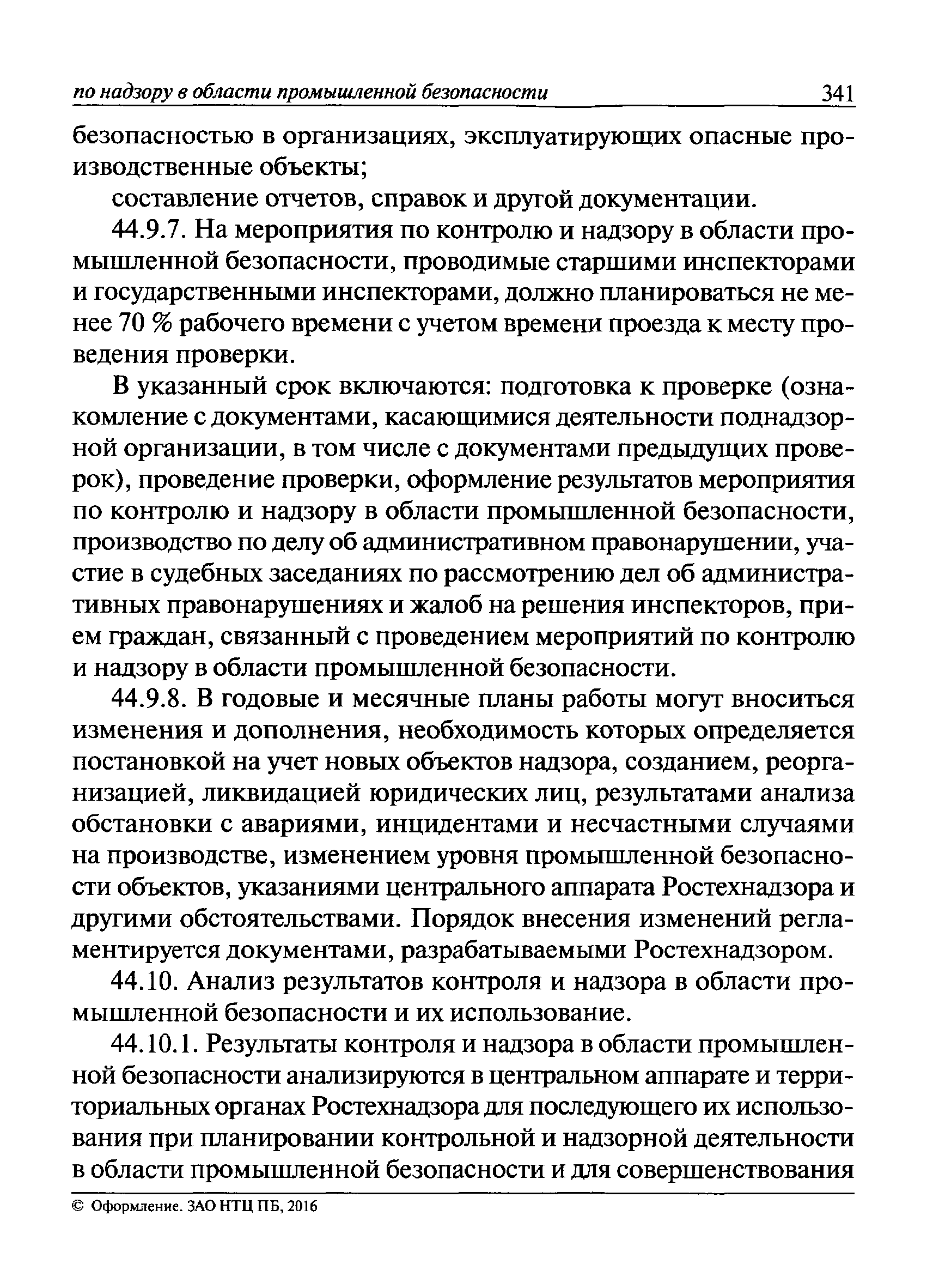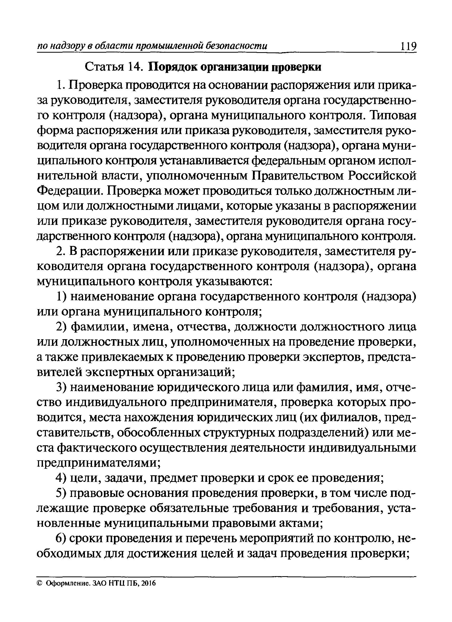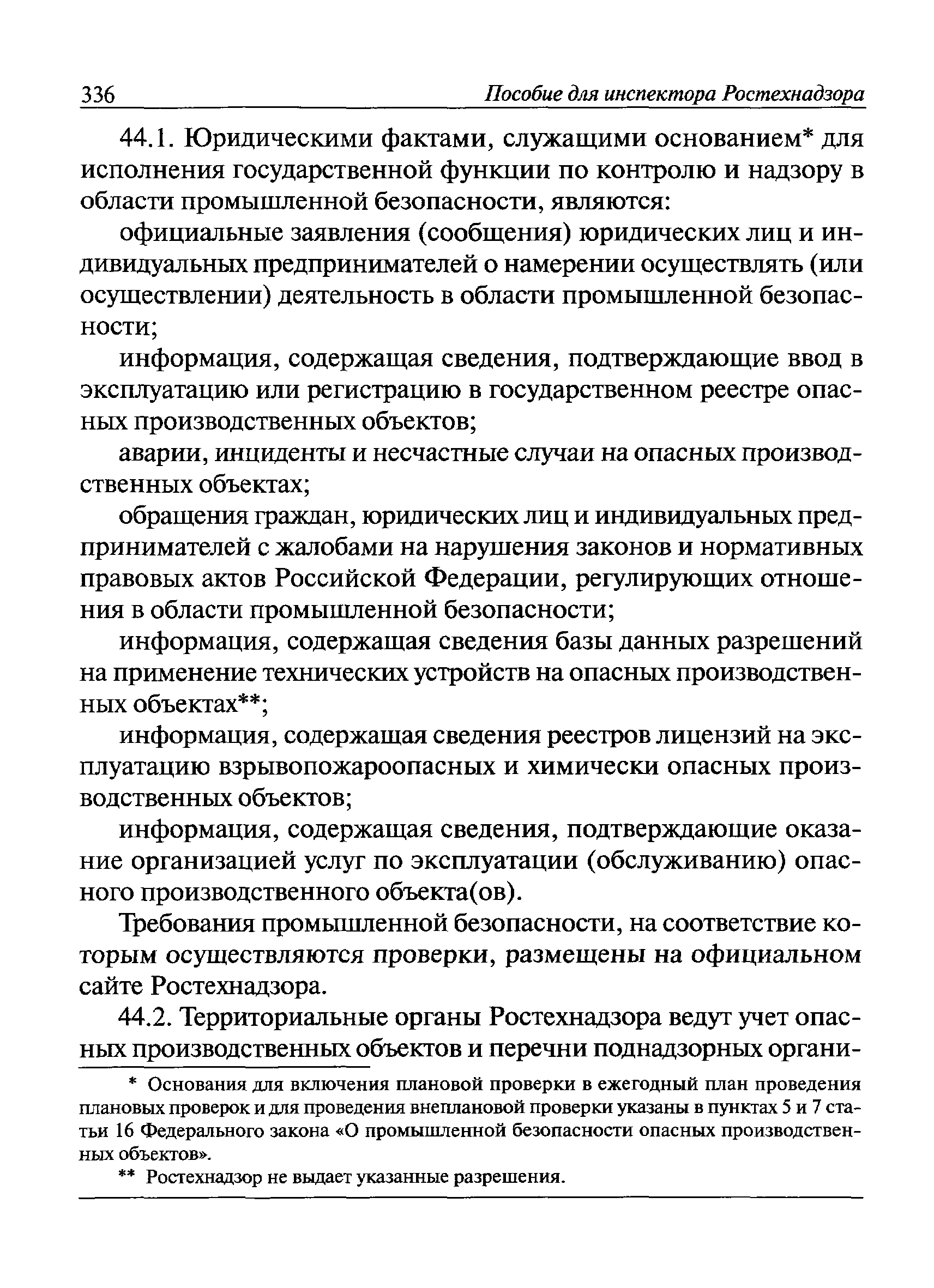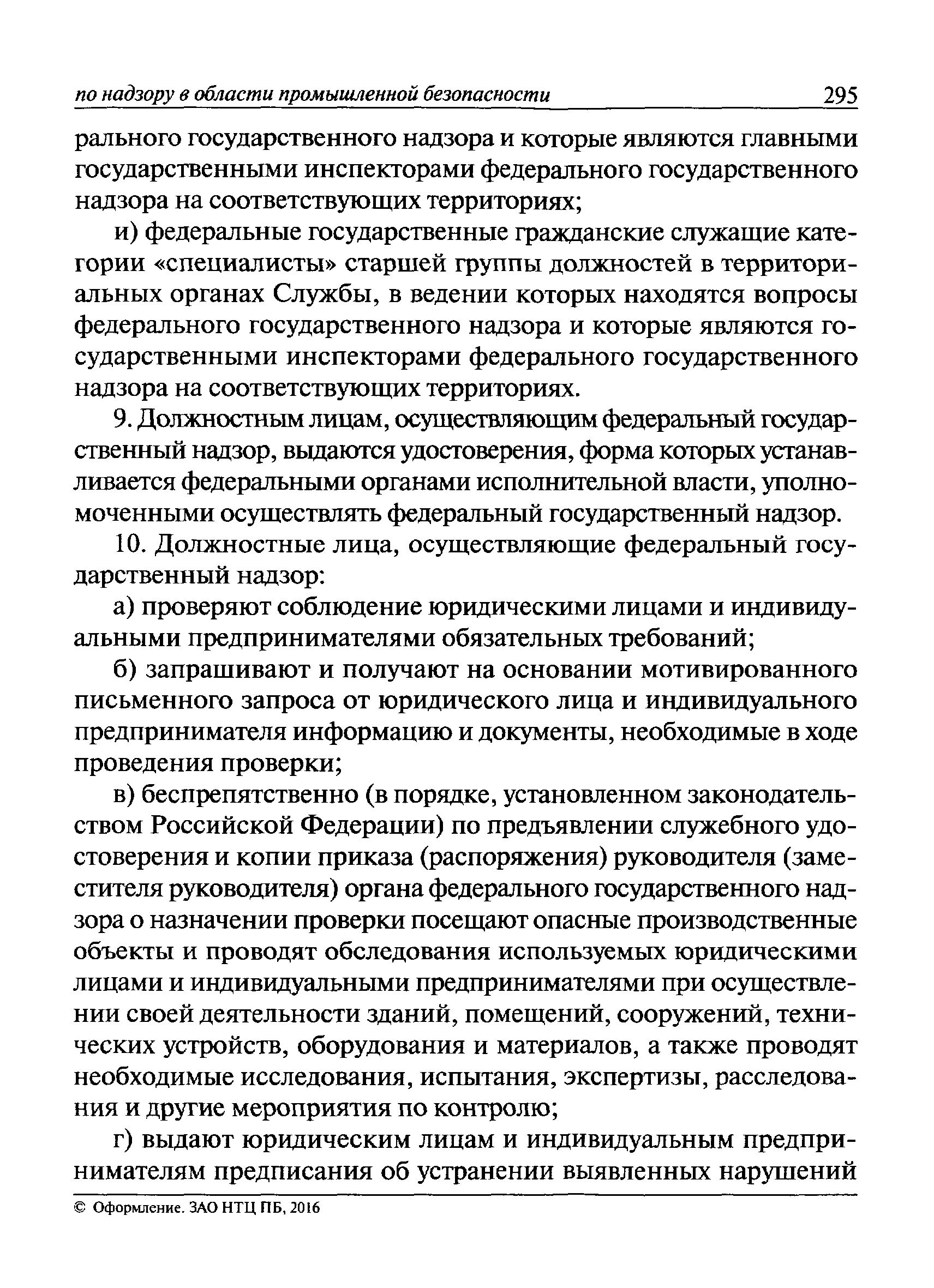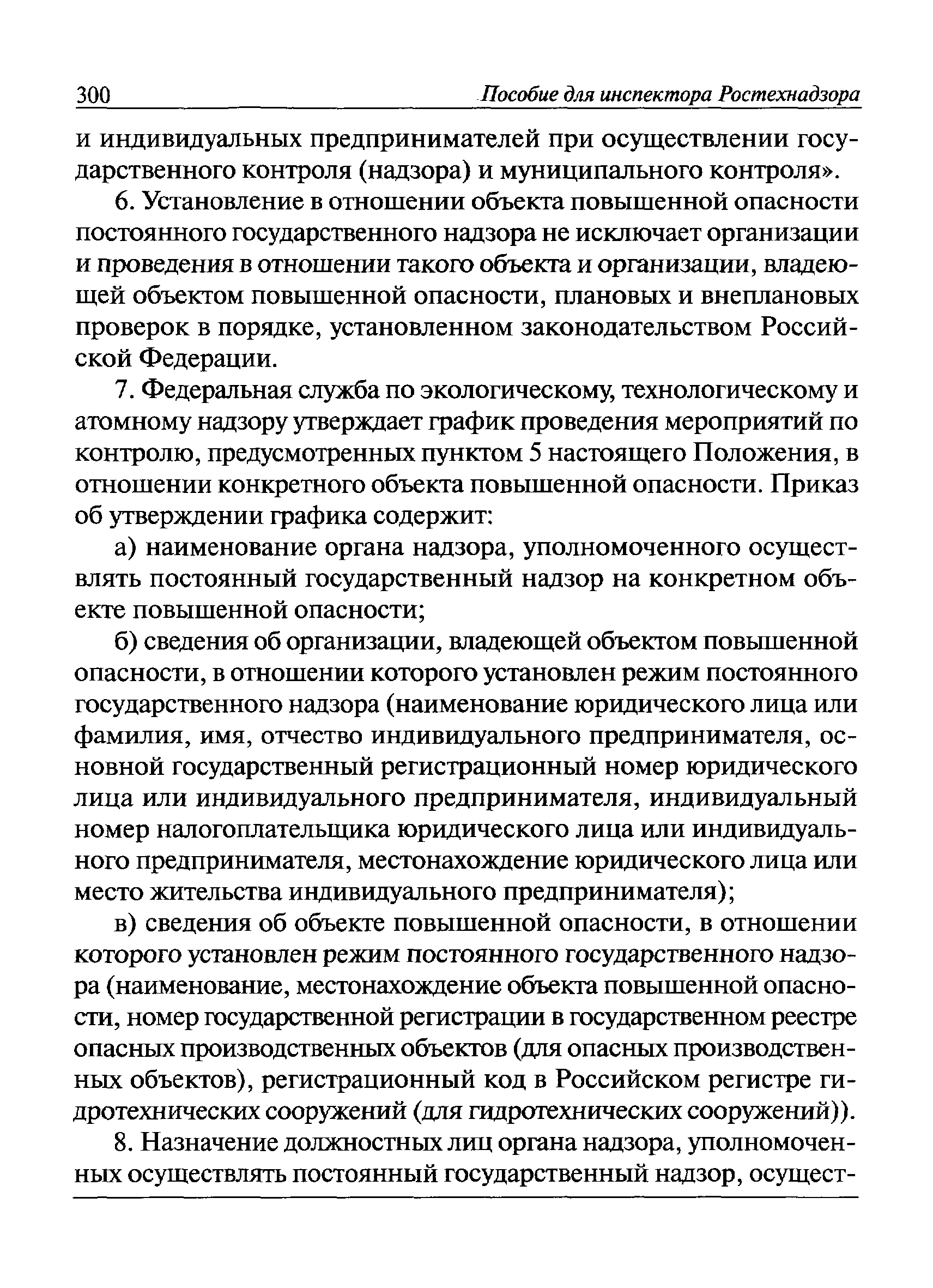 | Оглавление: | I Общие положения II Подготовка к проведению плановой проверки III Проведение плановой проверки IV Проведение документарной проверки V Особенности проведения внеплановой проверки VI Оформление результатов проверки VII Контроль исполнения выданного предписания VIII Особенности проведения проверок в режиме постоянного государственного надзора на опасных производственных объектах 1 класса опасности IХ Перечень нормативных правовых актов, используемых при проведении проверки Приложение 1. Распоряжение (приказ) Приложение 2. Акт проверки территориальным органом Ростехнадзора юридического лица, индивидуального предпринимателя Приложение 3. Предписание Законодательные и иные нормативные правовые акты к Пособию для инспектора Ростехнадзора по надзору в области промышленной безопасности Федеральный закон от 21 июля 1997 г. № 116-ФЗ "О промышленной безопасности опасных производственных объектов" Закон Российской Федерации от 21 февраля 1992 г. № 2395-1 "О недрах" (извлечения) Федеральный закон от 26 декабря 2008 г. № 294-ФЗ "О защите прав юридических лиц и индивидуальных предпринимателей при осуществлении государственного контроля (надзора) и муниципального контроля" (извлечения) Федеральный закон от 27 декабря 2002 г. № 184-ФЗ "О техническом регулировании" (извлечения) Кодекс Российской Федерации об административных правонарушениях от 30 декабря 2001 г. № 195-ФЗ (извлечения) Положение о Федеральной службе по экологическому, технологическому и атомному надзору, утвержденное постановлением Правительства Российской Федерации от 30 июля 2004 г. № 401 Положение о федеральном государственном надзоре в области промышленной безопасности, утвержденное постановлением Правительства Российской Федерации от 15 ноября 2012 г. № 1170 Положение о режиме постоянного государственного надзора на опасных производственных объектах и гидротехнических сооружениях, утвержденное постановлением Правительства Российской Федерации от 5 мая 2012 г. № 455 Положение о государственном надзоре за безопасным ведением работ, связанных с пользованием недрами, утвержденное постановлением Правительства Российской Федерации от 2 февраля 2010 г. № 39 Постановление Правительства Российской Федерации от 13 мая 2013 г. № 407 "0б уполномоченных органах Российской Федерации по обеспечению государственного контроля (надзора) за соблюдением требований технических регламентов Таможенного союза" Постановление Правительства Российской Федерации от 23 декабря 2014 г. № 1447 "0б уполномоченных органах Российской Федерации по обеспечению государственного контроля (надзора) за соблюдением требований технического регламента Таможенного союза "О безопасности взрывчатых веществ и изделий на их основе" Административный регламент по исполнению Федеральной службой по экологическом технологическому и атомному надзору государственной функции по осуществлению контроля и надзора за соблюдением требований промышленной безопасности при проектировании, строительстве, эксплуатации, консервации опасных веществ на опасных производственных объектах, утвержденный приказом Минприроды России от 30 октября 2008 г. № 280 |