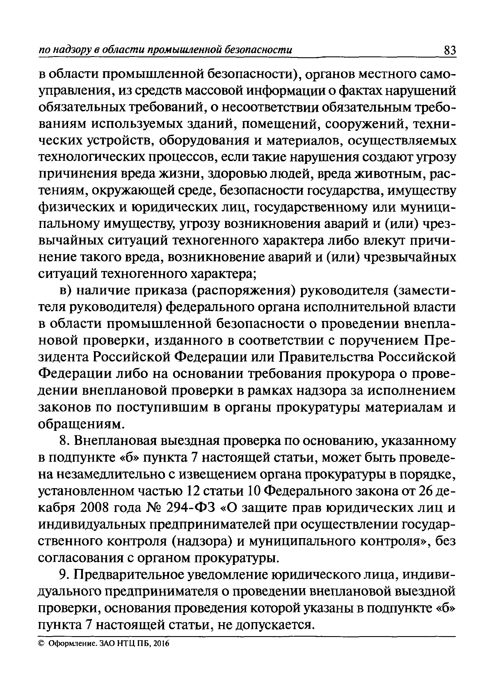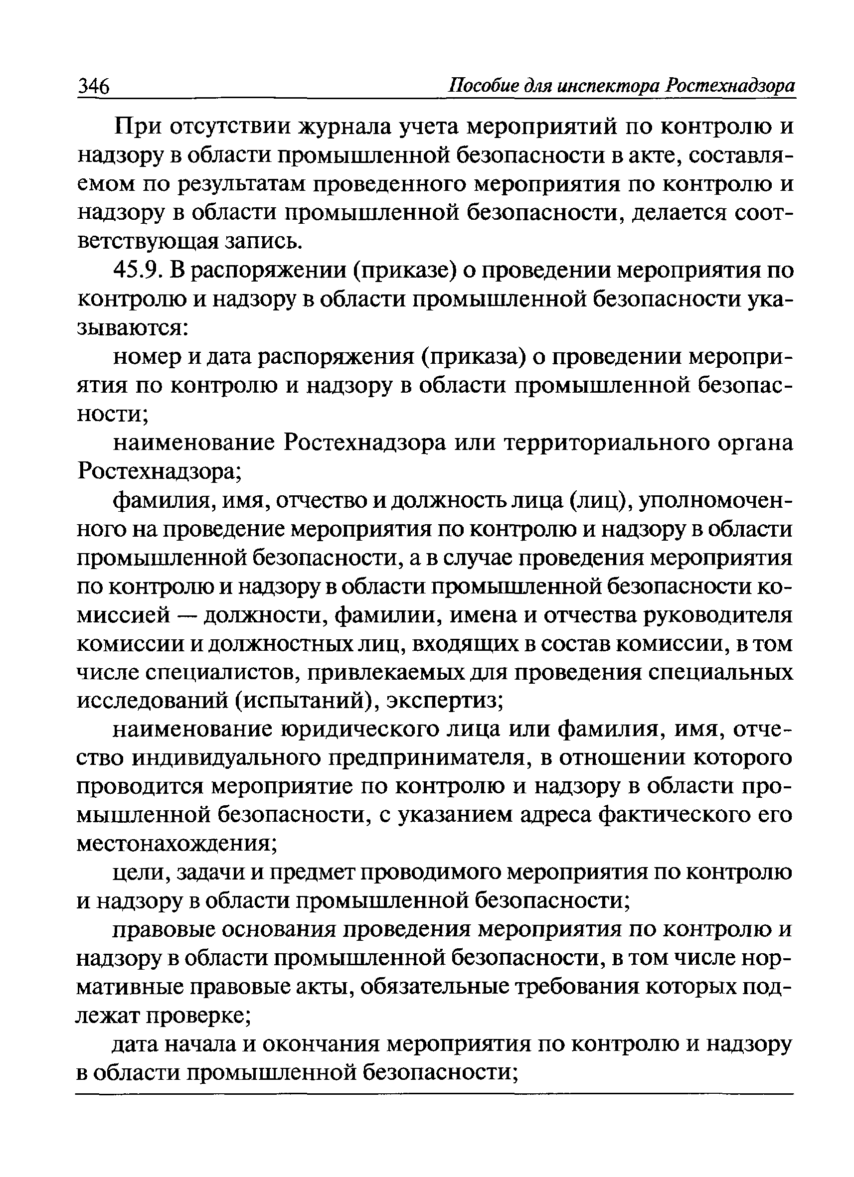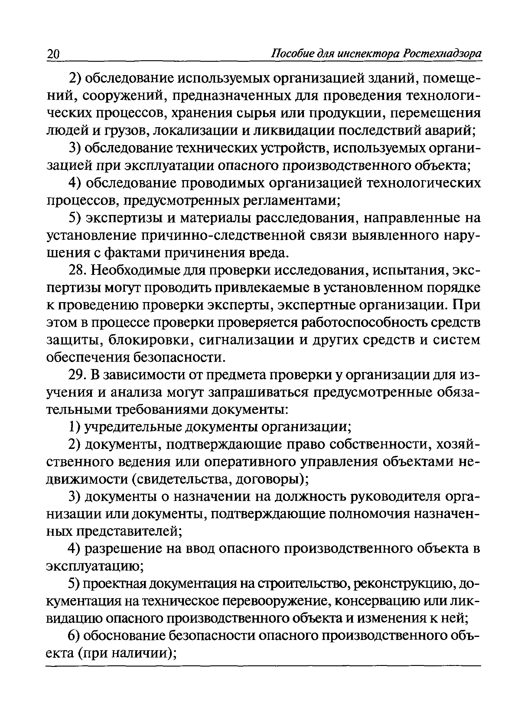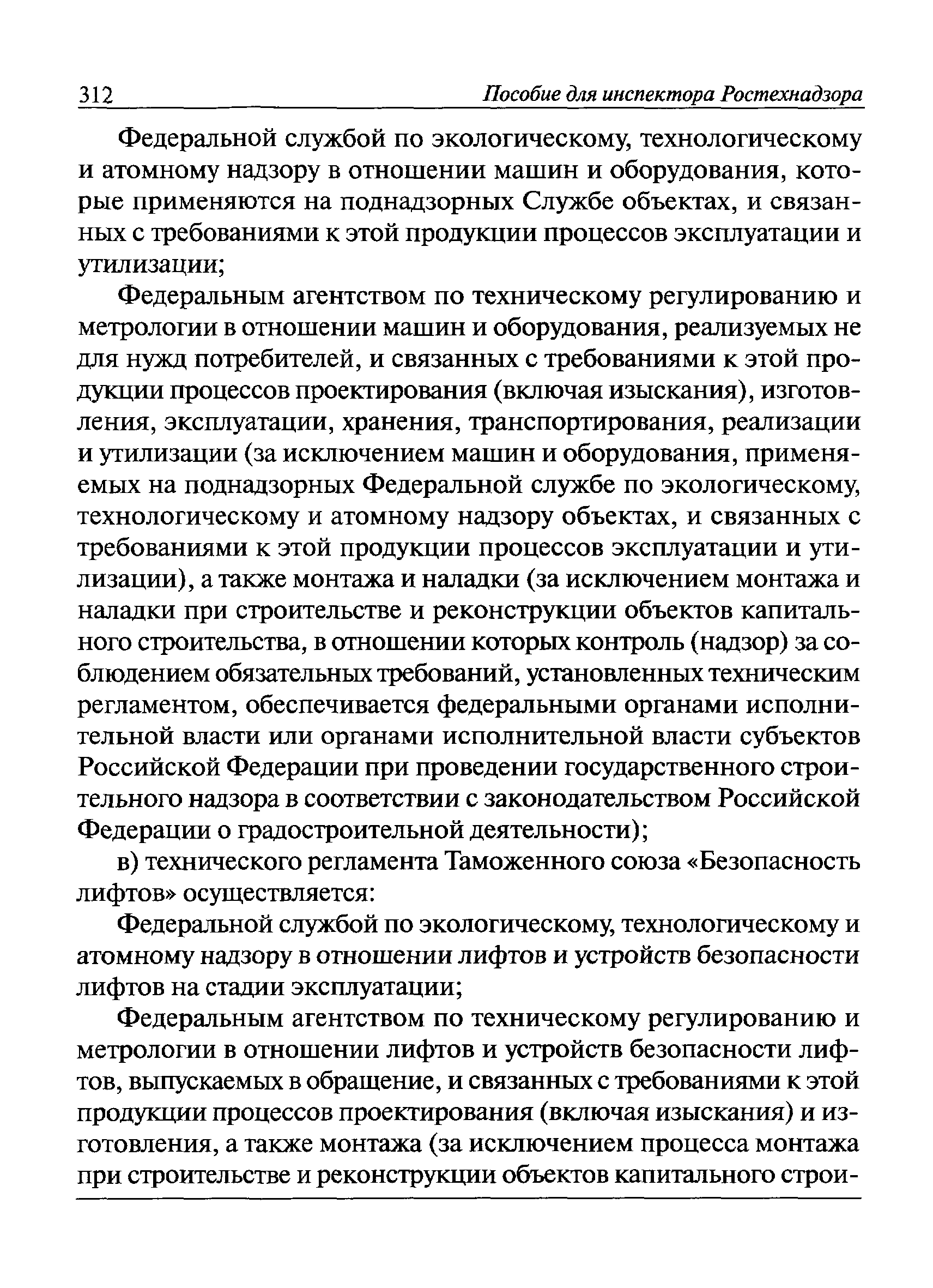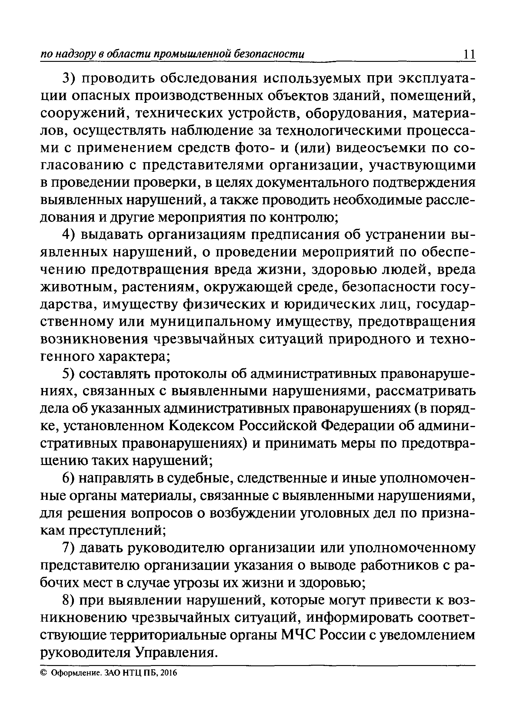 | Оглавление: | I Общие положения II Подготовка к проведению плановой проверки III Проведение плановой проверки IV Проведение документарной проверки V Особенности проведения внеплановой проверки VI Оформление результатов проверки VII Контроль исполнения выданного предписания VIII Особенности проведения проверок в режиме постоянного государственного надзора на опасных производственных объектах 1 класса опасности IХ Перечень нормативных правовых актов, используемых при проведении проверки Приложение 1. Распоряжение (приказ) Приложение 2. Акт проверки территориальным органом Ростехнадзора юридического лица, индивидуального предпринимателя Приложение 3. Предписание Законодательные и иные нормативные правовые акты к Пособию для инспектора Ростехнадзора по надзору в области промышленной безопасности Федеральный закон от 21 июля 1997 г. № 116-ФЗ "О промышленной безопасности опасных производственных объектов" Закон Российской Федерации от 21 февраля 1992 г. № 2395-1 "О недрах" (извлечения) Федеральный закон от 26 декабря 2008 г. № 294-ФЗ "О защите прав юридических лиц и индивидуальных предпринимателей при осуществлении государственного контроля (надзора) и муниципального контроля" (извлечения) Федеральный закон от 27 декабря 2002 г. № 184-ФЗ "О техническом регулировании" (извлечения) Кодекс Российской Федерации об административных правонарушениях от 30 декабря 2001 г. № 195-ФЗ (извлечения) Положение о Федеральной службе по экологическому, технологическому и атомному надзору, утвержденное постановлением Правительства Российской Федерации от 30 июля 2004 г. № 401 Положение о федеральном государственном надзоре в области промышленной безопасности, утвержденное постановлением Правительства Российской Федерации от 15 ноября 2012 г. № 1170 Положение о режиме постоянного государственного надзора на опасных производственных объектах и гидротехнических сооружениях, утвержденное постановлением Правительства Российской Федерации от 5 мая 2012 г. № 455 Положение о государственном надзоре за безопасным ведением работ, связанных с пользованием недрами, утвержденное постановлением Правительства Российской Федерации от 2 февраля 2010 г. № 39 Постановление Правительства Российской Федерации от 13 мая 2013 г. № 407 "0б уполномоченных органах Российской Федерации по обеспечению государственного контроля (надзора) за соблюдением требований технических регламентов Таможенного союза" Постановление Правительства Российской Федерации от 23 декабря 2014 г. № 1447 "0б уполномоченных органах Российской Федерации по обеспечению государственного контроля (надзора) за соблюдением требований технического регламента Таможенного союза "О безопасности взрывчатых веществ и изделий на их основе" Административный регламент по исполнению Федеральной службой по экологическом технологическому и атомному надзору государственной функции по осуществлению контроля и надзора за соблюдением требований промышленной безопасности при проектировании, строительстве, эксплуатации, консервации опасных веществ на опасных производственных объектах, утвержденный приказом Минприроды России от 30 октября 2008 г. № 280 |