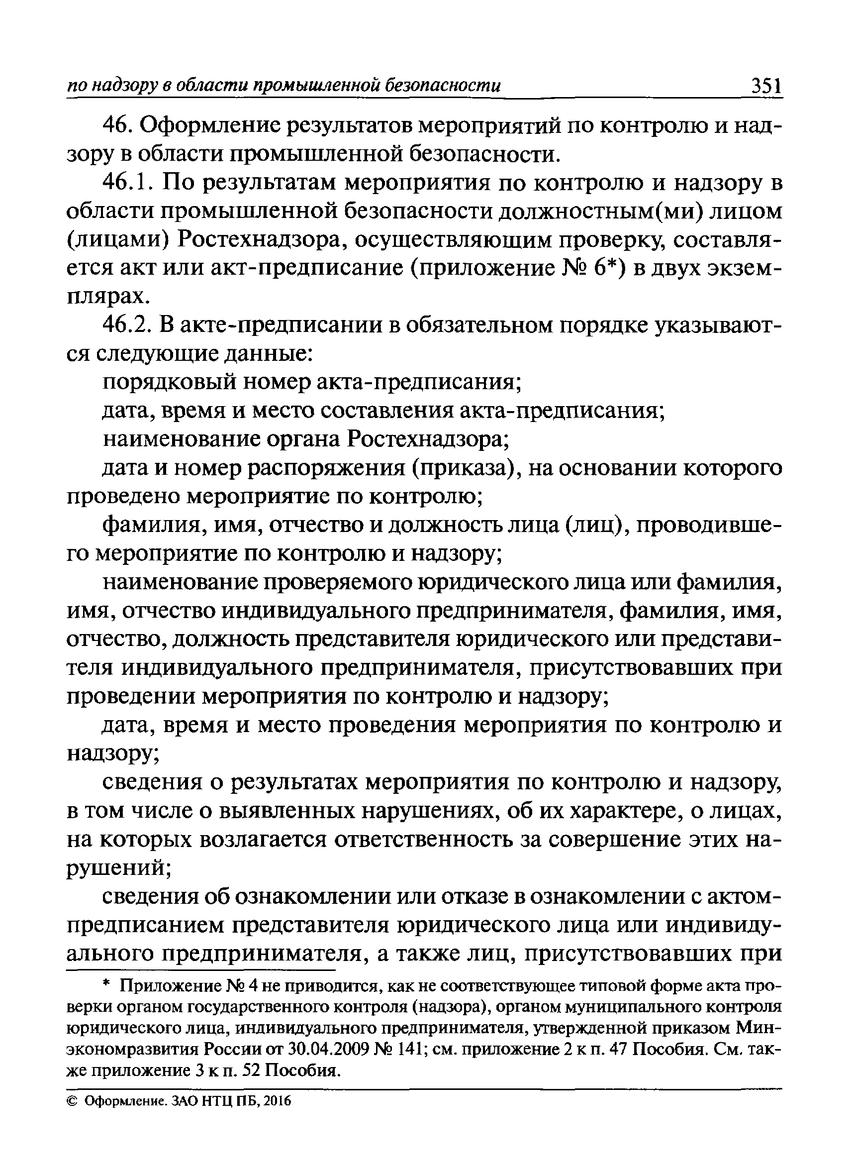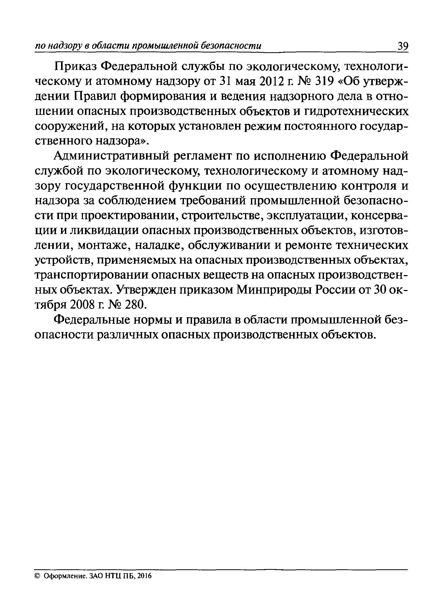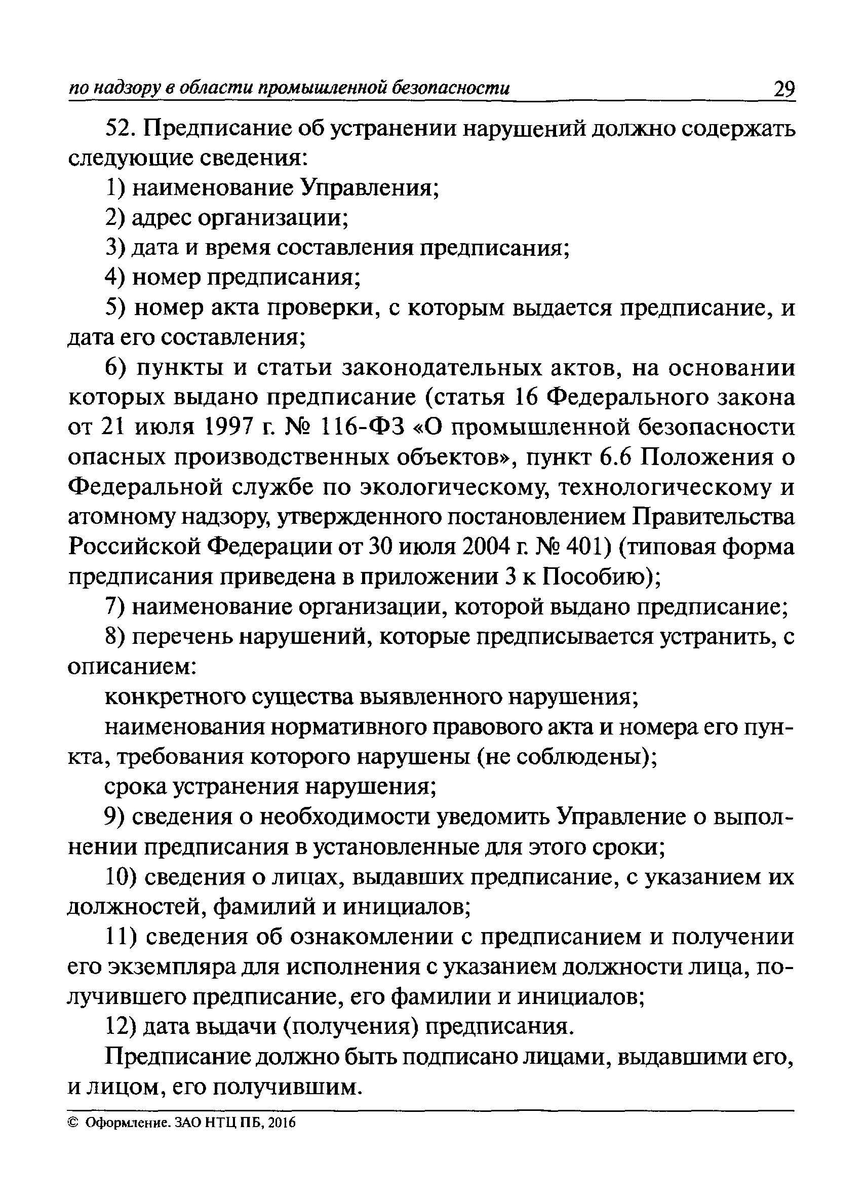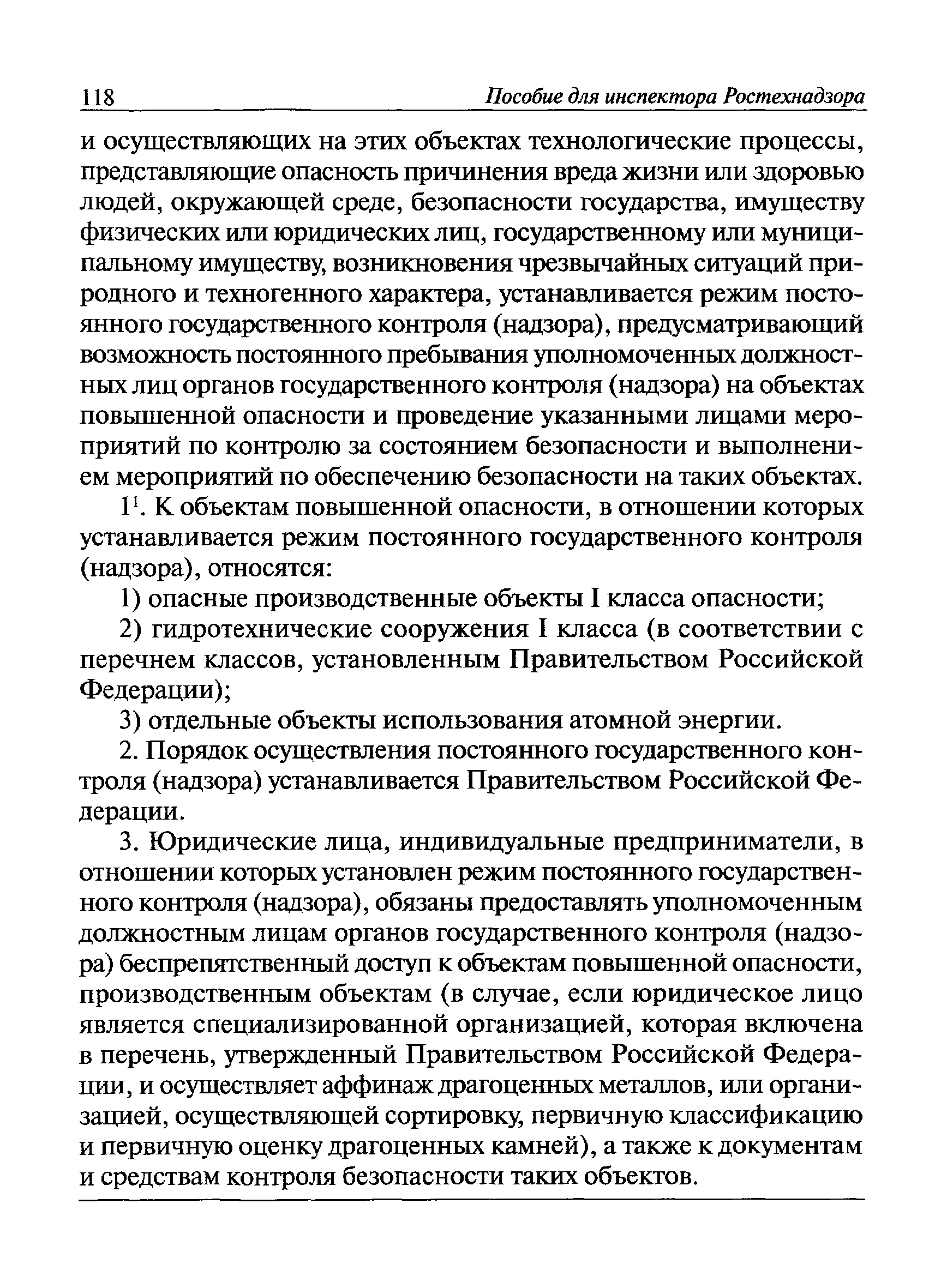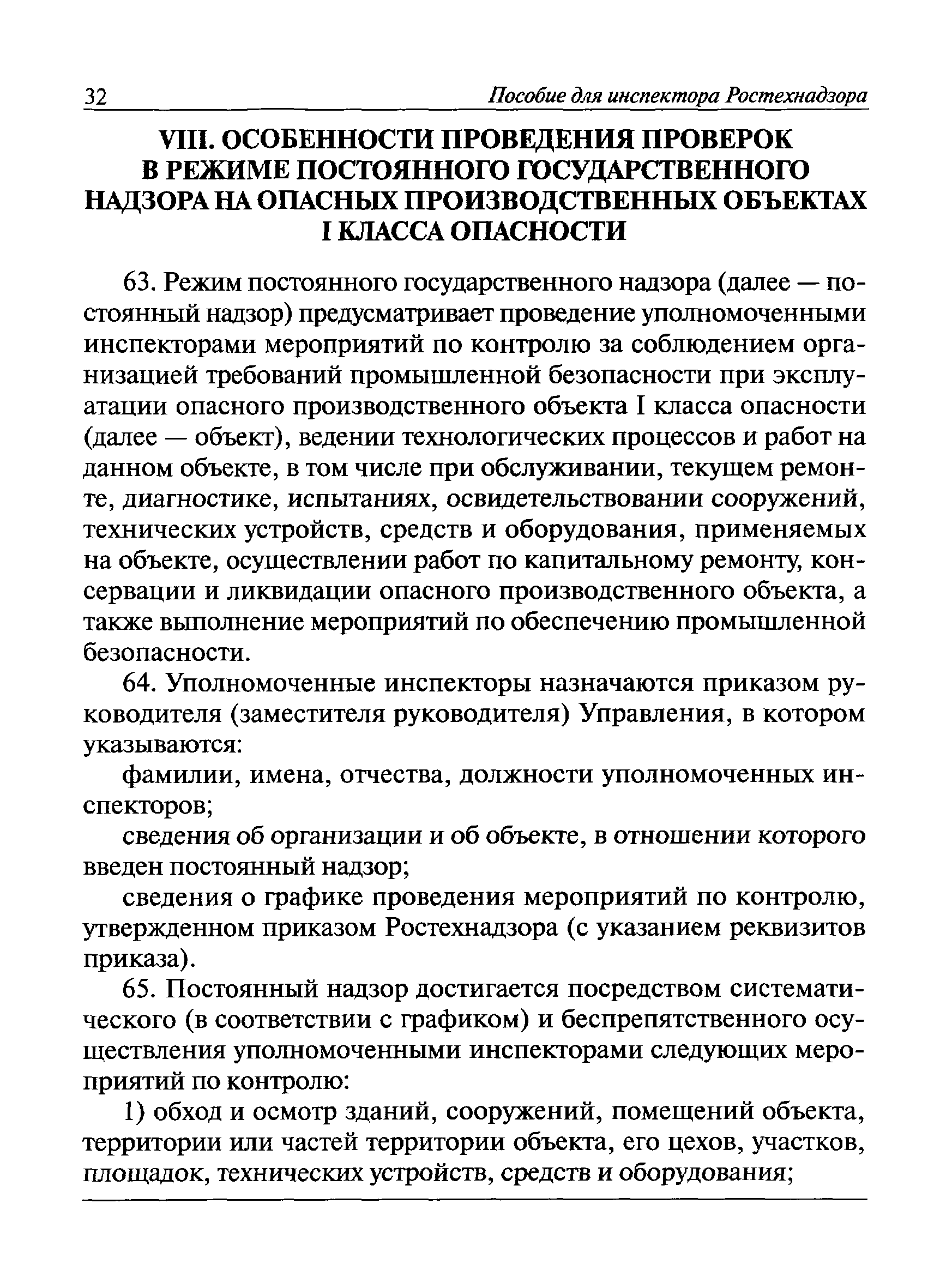| Оглавление: | I Общие положения II Подготовка к проведению плановой проверки III Проведение плановой проверки IV Проведение документарной проверки V Особенности проведения внеплановой проверки VI Оформление результатов проверки VII Контроль исполнения выданного предписания VIII Особенности проведения проверок в режиме постоянного государственного надзора на опасных производственных объектах 1 класса опасности IХ Перечень нормативных правовых актов, используемых при проведении проверки Приложение 1. Распоряжение (приказ) Приложение 2. Акт проверки территориальным органом Ростехнадзора юридического лица, индивидуального предпринимателя Приложение 3. Предписание Законодательные и иные нормативные правовые акты к Пособию для инспектора Ростехнадзора по надзору в области промышленной безопасности Федеральный закон от 21 июля 1997 г. № 116-ФЗ "О промышленной безопасности опасных производственных объектов" Закон Российской Федерации от 21 февраля 1992 г. № 2395-1 "О недрах" (извлечения) Федеральный закон от 26 декабря 2008 г. № 294-ФЗ "О защите прав юридических лиц и индивидуальных предпринимателей при осуществлении государственного контроля (надзора) и муниципального контроля" (извлечения) Федеральный закон от 27 декабря 2002 г. № 184-ФЗ "О техническом регулировании" (извлечения) Кодекс Российской Федерации об административных правонарушениях от 30 декабря 2001 г. № 195-ФЗ (извлечения) Положение о Федеральной службе по экологическому, технологическому и атомному надзору, утвержденное постановлением Правительства Российской Федерации от 30 июля 2004 г. № 401 Положение о федеральном государственном надзоре в области промышленной безопасности, утвержденное постановлением Правительства Российской Федерации от 15 ноября 2012 г. № 1170 Положение о режиме постоянного государственного надзора на опасных производственных объектах и гидротехнических сооружениях, утвержденное постановлением Правительства Российской Федерации от 5 мая 2012 г. № 455 Положение о государственном надзоре за безопасным ведением работ, связанных с пользованием недрами, утвержденное постановлением Правительства Российской Федерации от 2 февраля 2010 г. № 39 Постановление Правительства Российской Федерации от 13 мая 2013 г. № 407 "0б уполномоченных органах Российской Федерации по обеспечению государственного контроля (надзора) за соблюдением требований технических регламентов Таможенного союза" Постановление Правительства Российской Федерации от 23 декабря 2014 г. № 1447 "0б уполномоченных органах Российской Федерации по обеспечению государственного контроля (надзора) за соблюдением требований технического регламента Таможенного союза "О безопасности взрывчатых веществ и изделий на их основе" Административный регламент по исполнению Федеральной службой по экологическом технологическому и атомному надзору государственной функции по осуществлению контроля и надзора за соблюдением требований промышленной безопасности при проектировании, строительстве, эксплуатации, консервации опасных веществ на опасных производственных объектах, утвержденный приказом Минприроды России от 30 октября 2008 г. № 280 |
