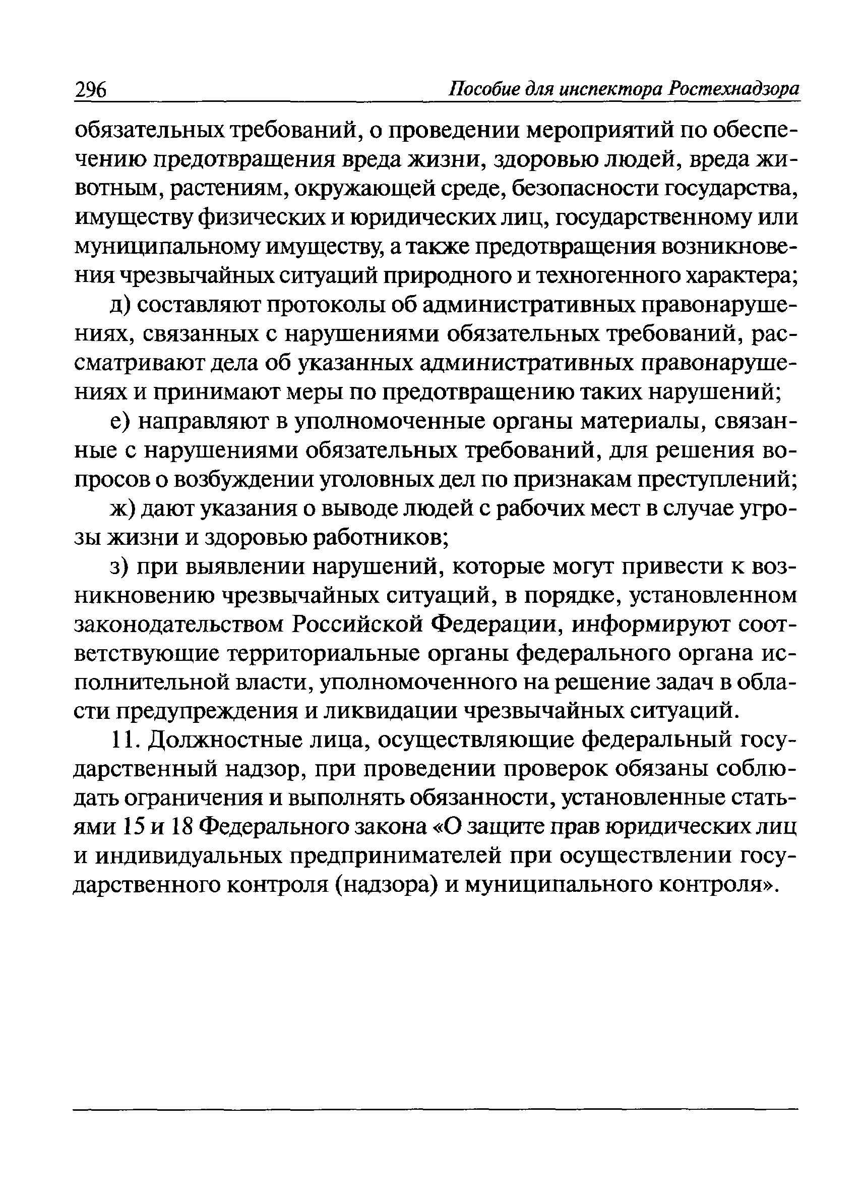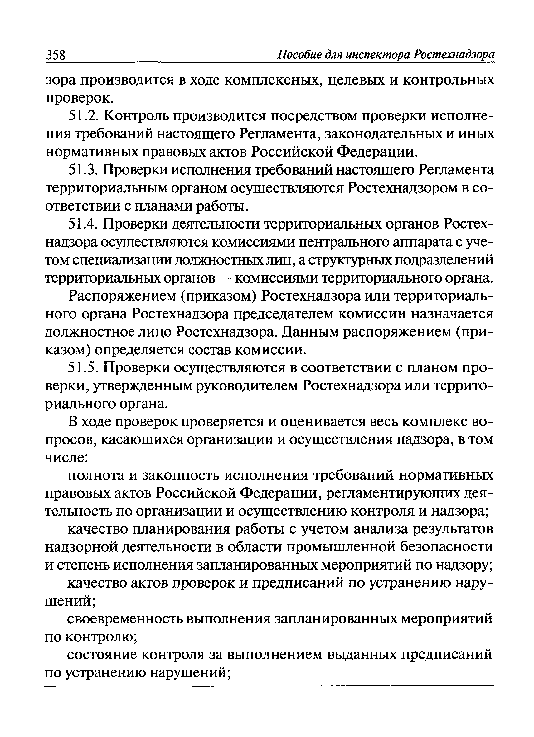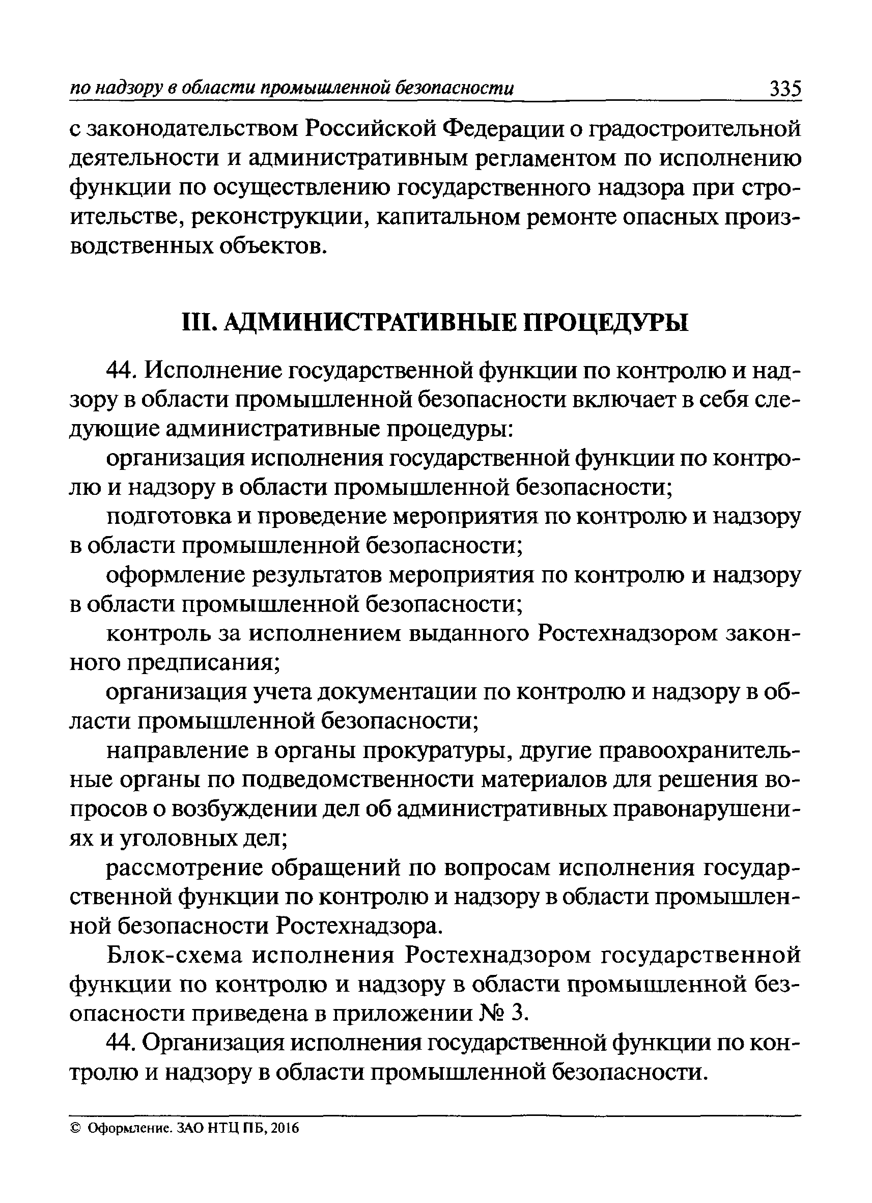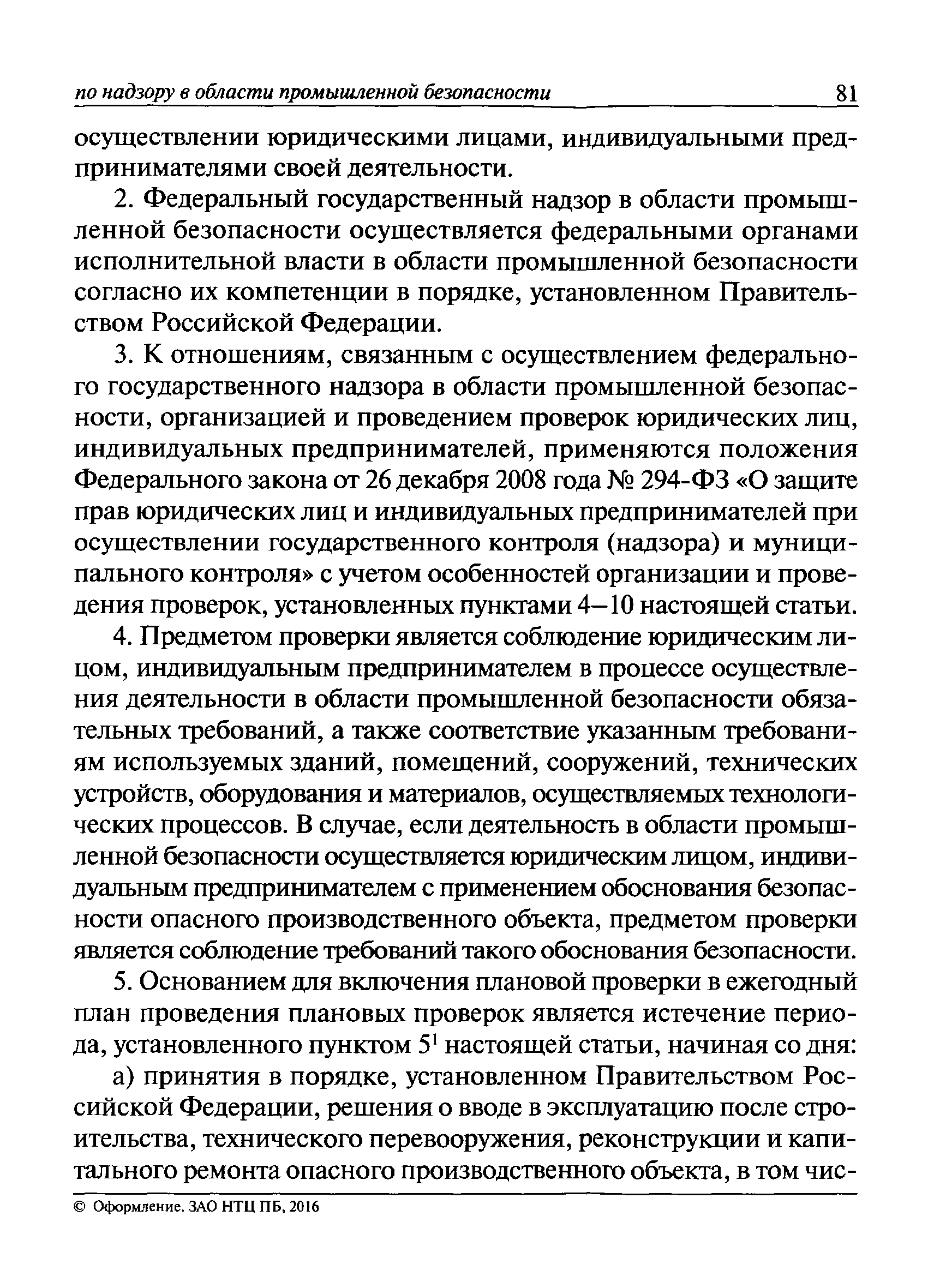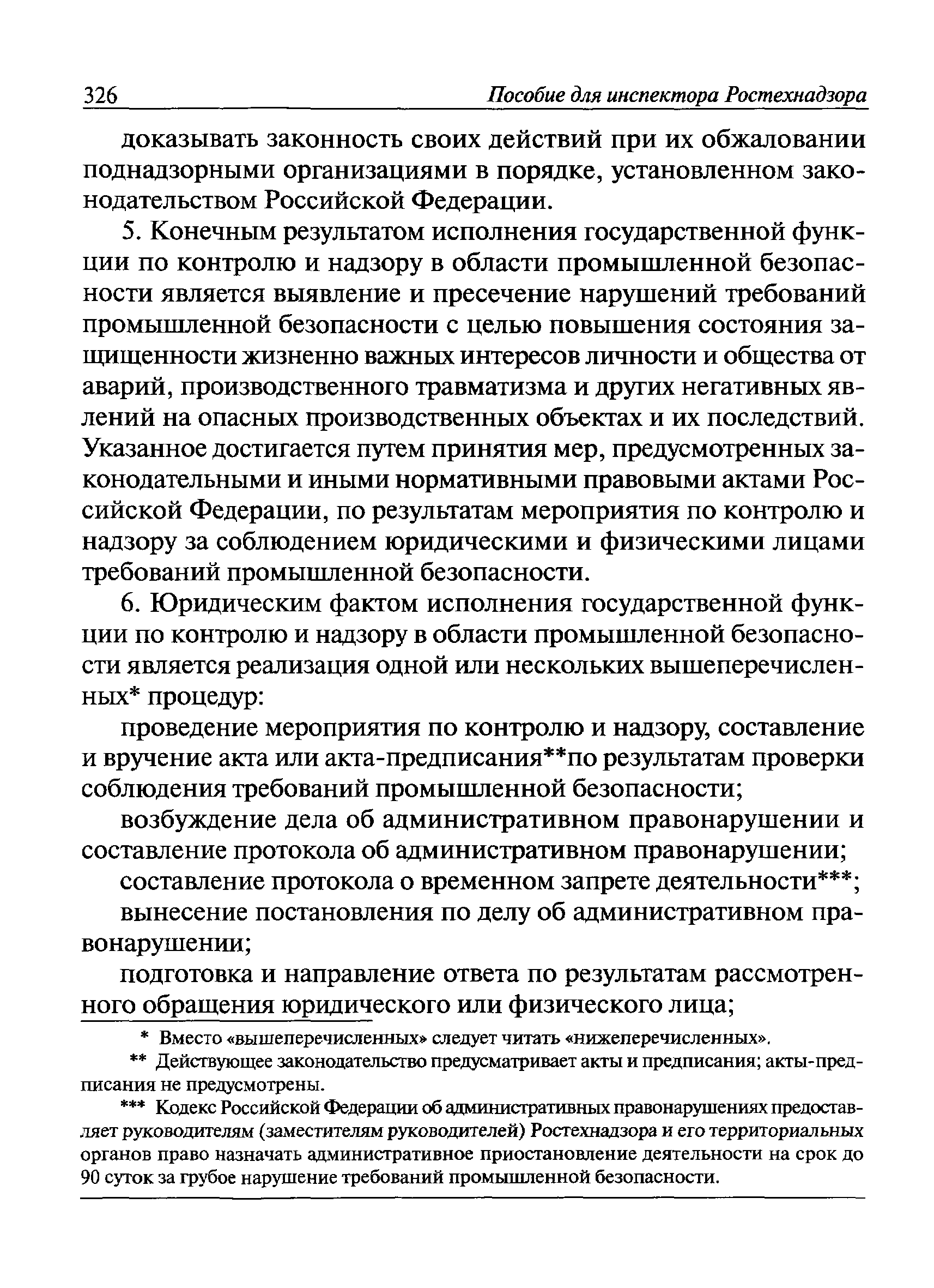 | Оглавление: | I Общие положения II Подготовка к проведению плановой проверки III Проведение плановой проверки IV Проведение документарной проверки V Особенности проведения внеплановой проверки VI Оформление результатов проверки VII Контроль исполнения выданного предписания VIII Особенности проведения проверок в режиме постоянного государственного надзора на опасных производственных объектах 1 класса опасности IХ Перечень нормативных правовых актов, используемых при проведении проверки Приложение 1. Распоряжение (приказ) Приложение 2. Акт проверки территориальным органом Ростехнадзора юридического лица, индивидуального предпринимателя Приложение 3. Предписание Законодательные и иные нормативные правовые акты к Пособию для инспектора Ростехнадзора по надзору в области промышленной безопасности Федеральный закон от 21 июля 1997 г. № 116-ФЗ "О промышленной безопасности опасных производственных объектов" Закон Российской Федерации от 21 февраля 1992 г. № 2395-1 "О недрах" (извлечения) Федеральный закон от 26 декабря 2008 г. № 294-ФЗ "О защите прав юридических лиц и индивидуальных предпринимателей при осуществлении государственного контроля (надзора) и муниципального контроля" (извлечения) Федеральный закон от 27 декабря 2002 г. № 184-ФЗ "О техническом регулировании" (извлечения) Кодекс Российской Федерации об административных правонарушениях от 30 декабря 2001 г. № 195-ФЗ (извлечения) Положение о Федеральной службе по экологическому, технологическому и атомному надзору, утвержденное постановлением Правительства Российской Федерации от 30 июля 2004 г. № 401 Положение о федеральном государственном надзоре в области промышленной безопасности, утвержденное постановлением Правительства Российской Федерации от 15 ноября 2012 г. № 1170 Положение о режиме постоянного государственного надзора на опасных производственных объектах и гидротехнических сооружениях, утвержденное постановлением Правительства Российской Федерации от 5 мая 2012 г. № 455 Положение о государственном надзоре за безопасным ведением работ, связанных с пользованием недрами, утвержденное постановлением Правительства Российской Федерации от 2 февраля 2010 г. № 39 Постановление Правительства Российской Федерации от 13 мая 2013 г. № 407 "0б уполномоченных органах Российской Федерации по обеспечению государственного контроля (надзора) за соблюдением требований технических регламентов Таможенного союза" Постановление Правительства Российской Федерации от 23 декабря 2014 г. № 1447 "0б уполномоченных органах Российской Федерации по обеспечению государственного контроля (надзора) за соблюдением требований технического регламента Таможенного союза "О безопасности взрывчатых веществ и изделий на их основе" Административный регламент по исполнению Федеральной службой по экологическом технологическому и атомному надзору государственной функции по осуществлению контроля и надзора за соблюдением требований промышленной безопасности при проектировании, строительстве, эксплуатации, консервации опасных веществ на опасных производственных объектах, утвержденный приказом Минприроды России от 30 октября 2008 г. № 280 |