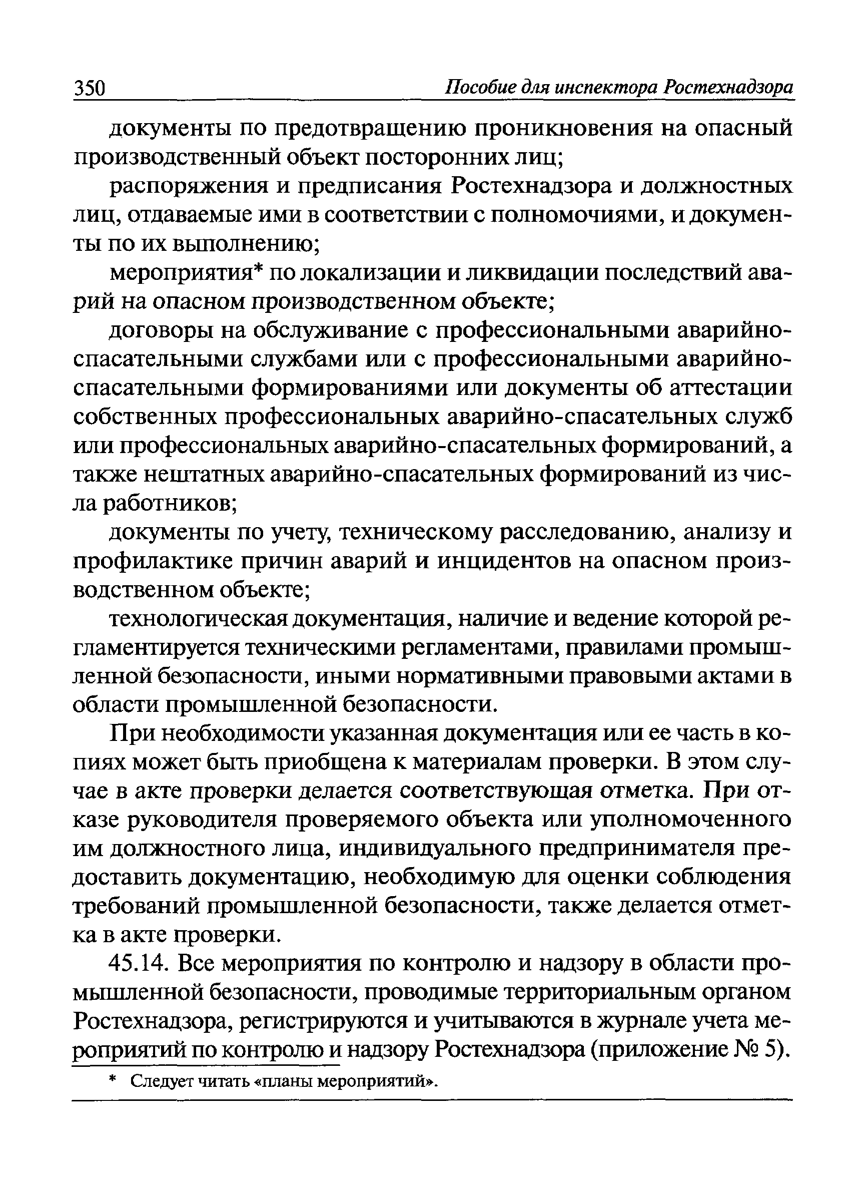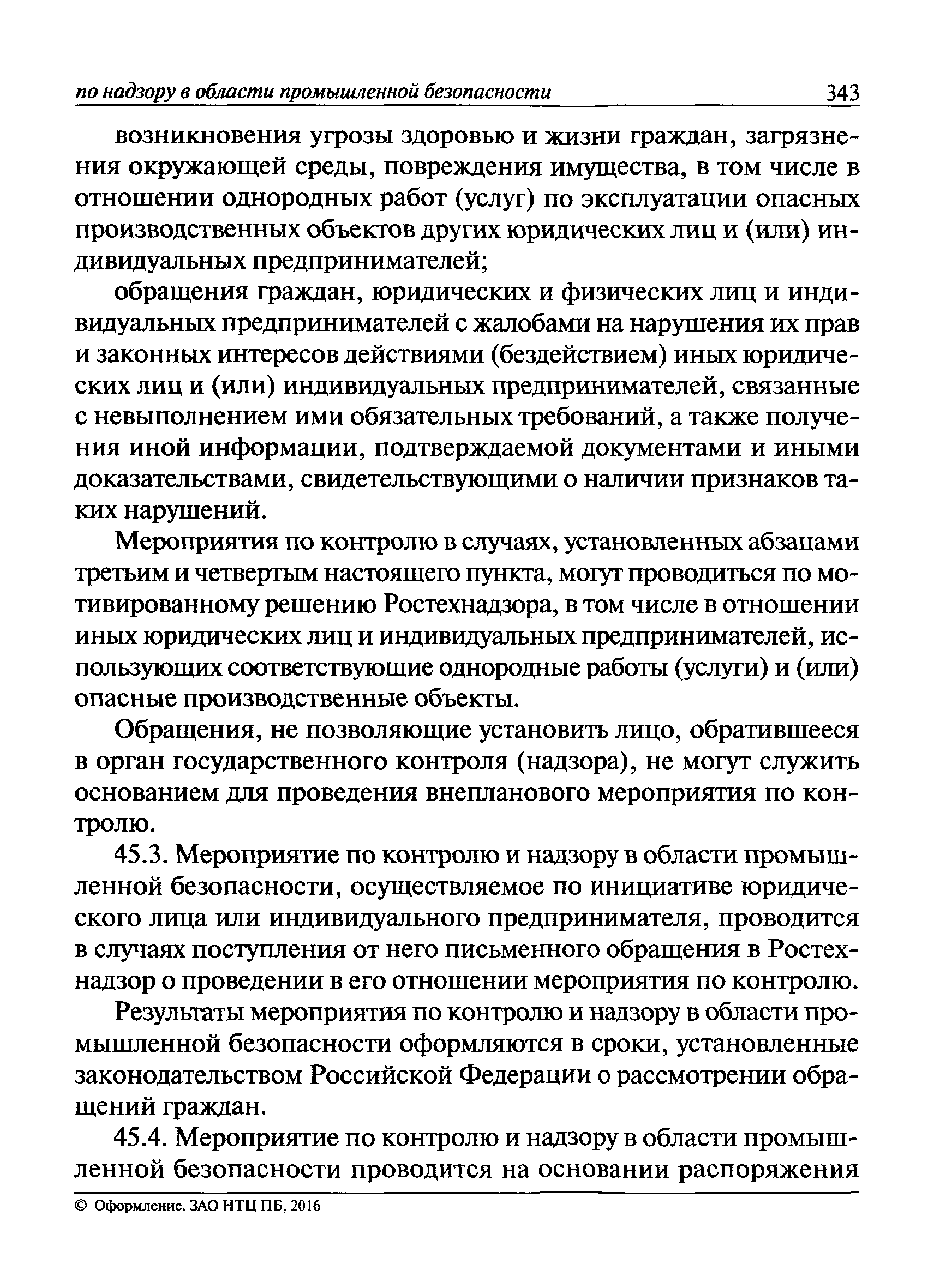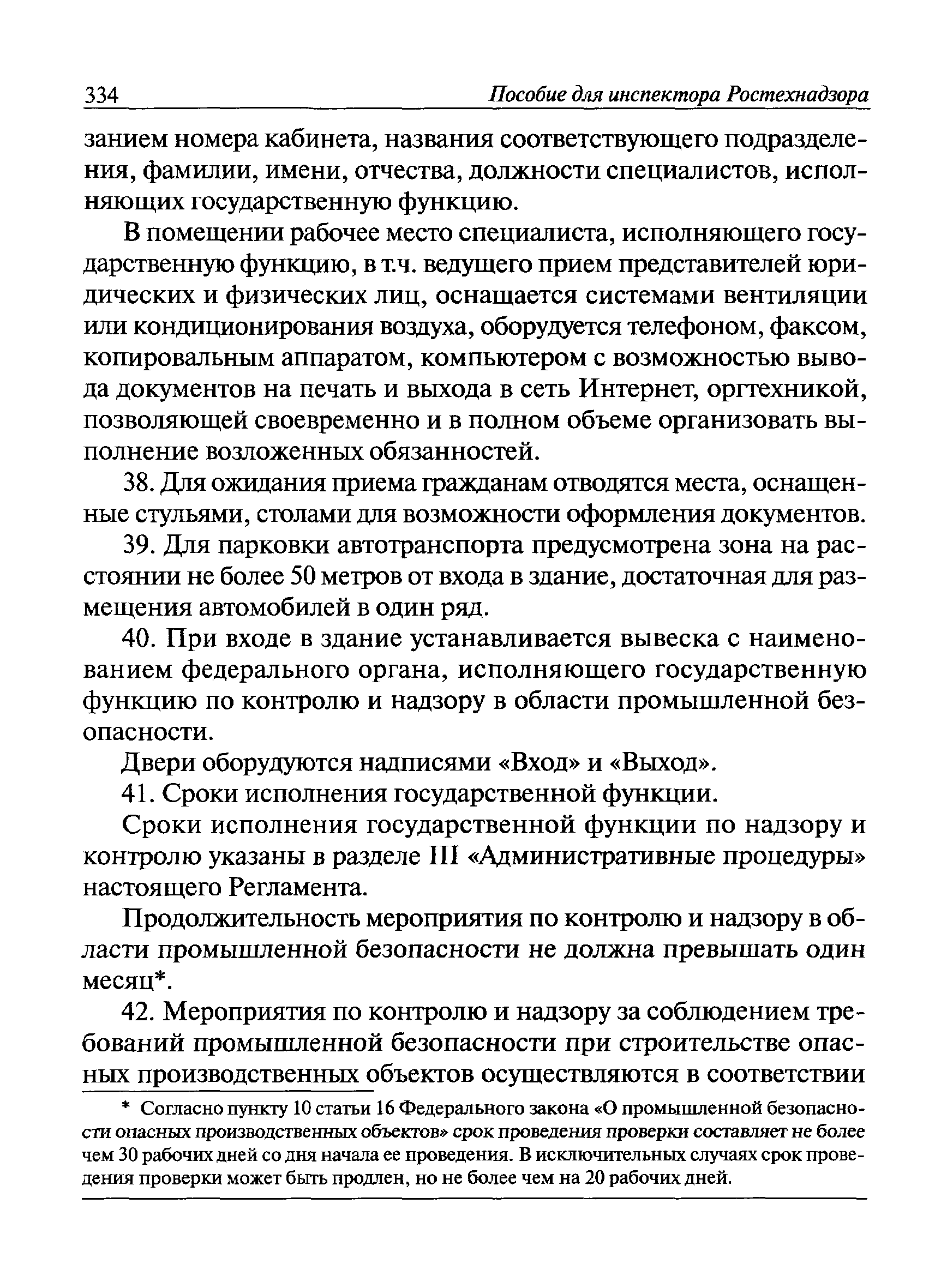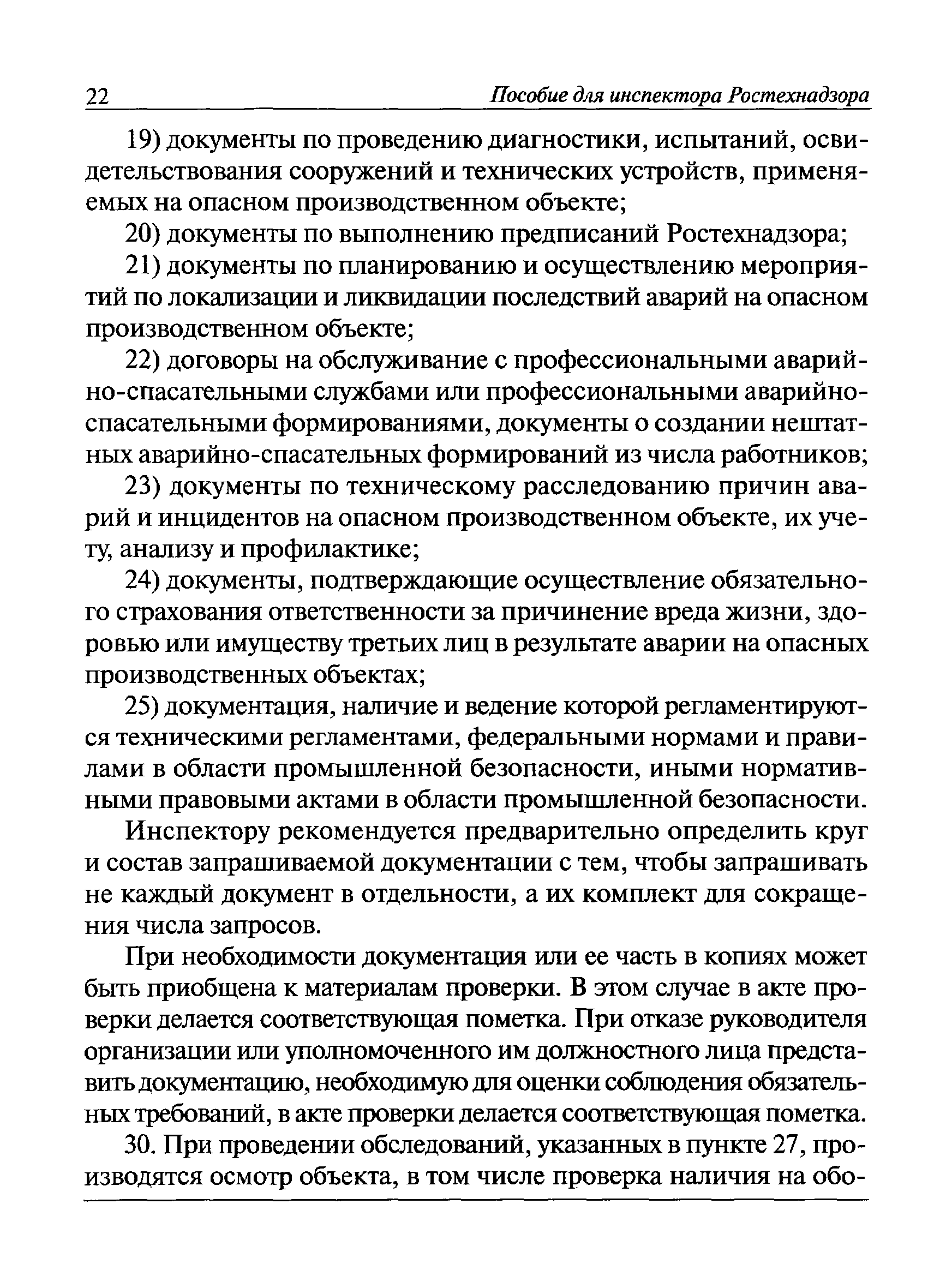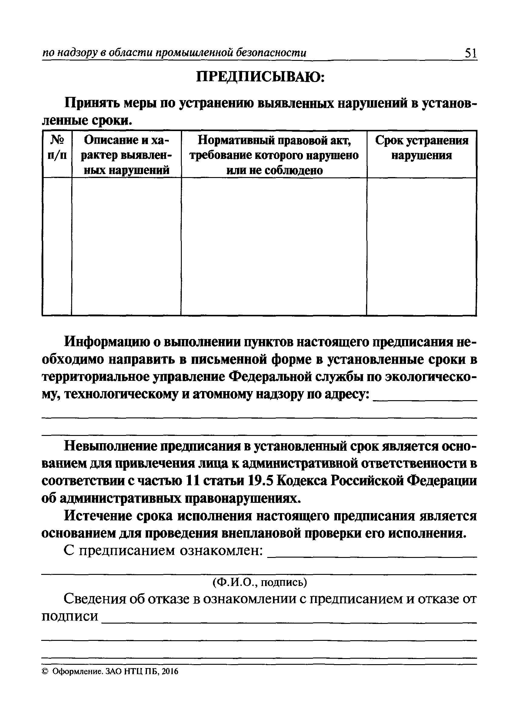 | Оглавление: | I Общие положения II Подготовка к проведению плановой проверки III Проведение плановой проверки IV Проведение документарной проверки V Особенности проведения внеплановой проверки VI Оформление результатов проверки VII Контроль исполнения выданного предписания VIII Особенности проведения проверок в режиме постоянного государственного надзора на опасных производственных объектах 1 класса опасности IХ Перечень нормативных правовых актов, используемых при проведении проверки Приложение 1. Распоряжение (приказ) Приложение 2. Акт проверки территориальным органом Ростехнадзора юридического лица, индивидуального предпринимателя Приложение 3. Предписание Законодательные и иные нормативные правовые акты к Пособию для инспектора Ростехнадзора по надзору в области промышленной безопасности Федеральный закон от 21 июля 1997 г. № 116-ФЗ "О промышленной безопасности опасных производственных объектов" Закон Российской Федерации от 21 февраля 1992 г. № 2395-1 "О недрах" (извлечения) Федеральный закон от 26 декабря 2008 г. № 294-ФЗ "О защите прав юридических лиц и индивидуальных предпринимателей при осуществлении государственного контроля (надзора) и муниципального контроля" (извлечения) Федеральный закон от 27 декабря 2002 г. № 184-ФЗ "О техническом регулировании" (извлечения) Кодекс Российской Федерации об административных правонарушениях от 30 декабря 2001 г. № 195-ФЗ (извлечения) Положение о Федеральной службе по экологическому, технологическому и атомному надзору, утвержденное постановлением Правительства Российской Федерации от 30 июля 2004 г. № 401 Положение о федеральном государственном надзоре в области промышленной безопасности, утвержденное постановлением Правительства Российской Федерации от 15 ноября 2012 г. № 1170 Положение о режиме постоянного государственного надзора на опасных производственных объектах и гидротехнических сооружениях, утвержденное постановлением Правительства Российской Федерации от 5 мая 2012 г. № 455 Положение о государственном надзоре за безопасным ведением работ, связанных с пользованием недрами, утвержденное постановлением Правительства Российской Федерации от 2 февраля 2010 г. № 39 Постановление Правительства Российской Федерации от 13 мая 2013 г. № 407 "0б уполномоченных органах Российской Федерации по обеспечению государственного контроля (надзора) за соблюдением требований технических регламентов Таможенного союза" Постановление Правительства Российской Федерации от 23 декабря 2014 г. № 1447 "0б уполномоченных органах Российской Федерации по обеспечению государственного контроля (надзора) за соблюдением требований технического регламента Таможенного союза "О безопасности взрывчатых веществ и изделий на их основе" Административный регламент по исполнению Федеральной службой по экологическом технологическому и атомному надзору государственной функции по осуществлению контроля и надзора за соблюдением требований промышленной безопасности при проектировании, строительстве, эксплуатации, консервации опасных веществ на опасных производственных объектах, утвержденный приказом Минприроды России от 30 октября 2008 г. № 280 |