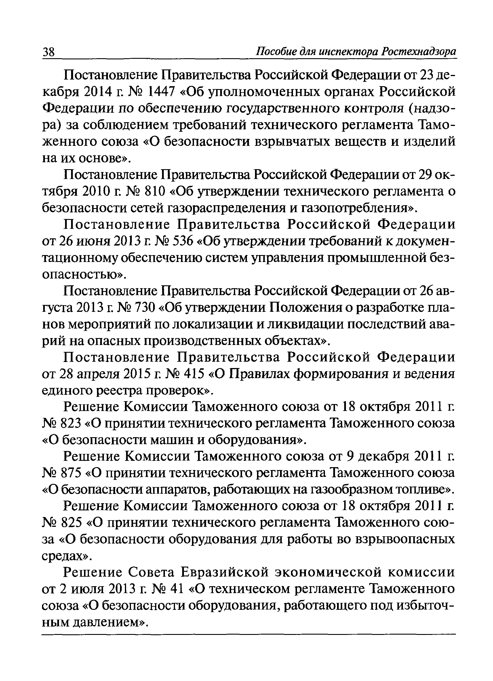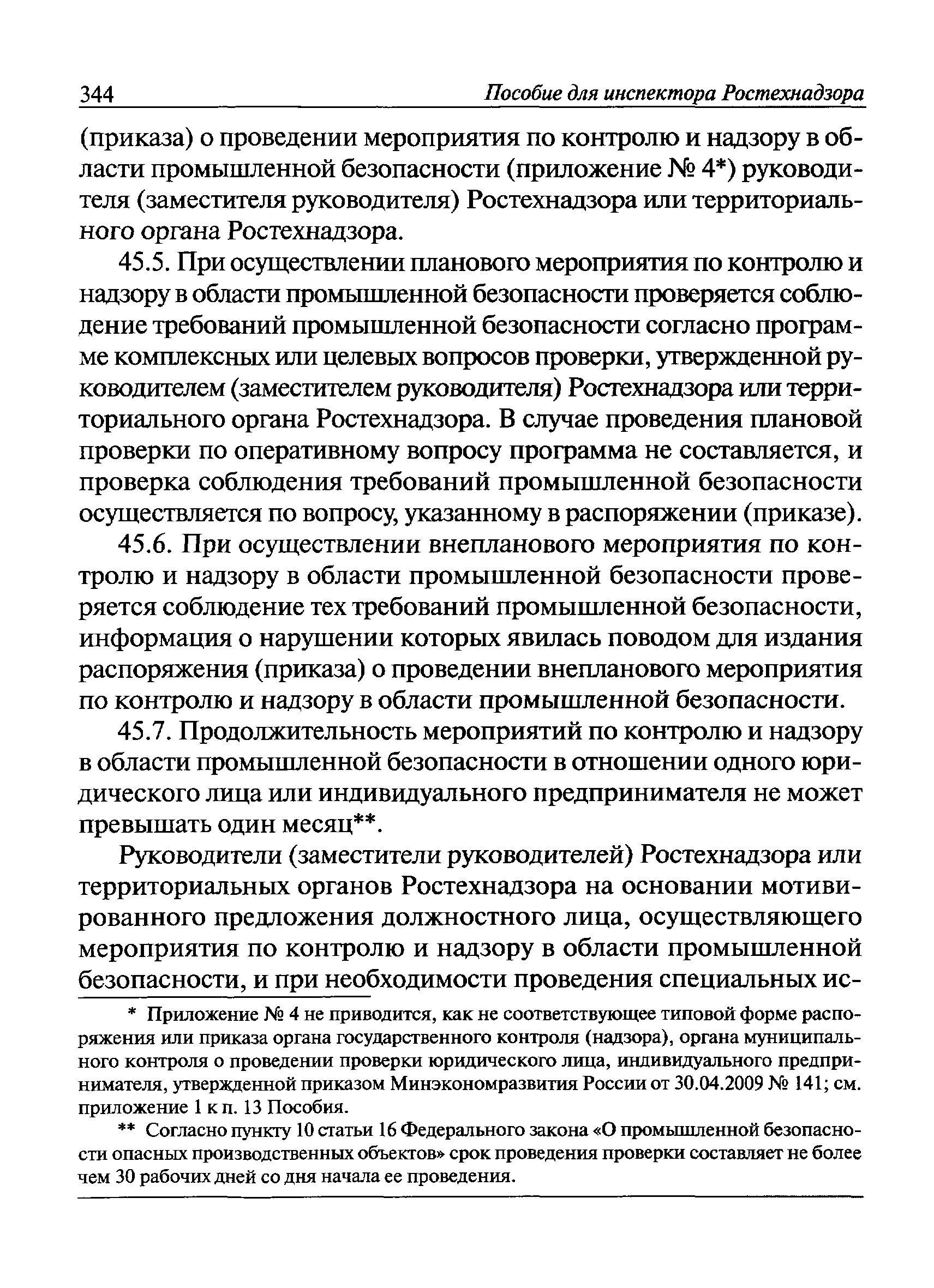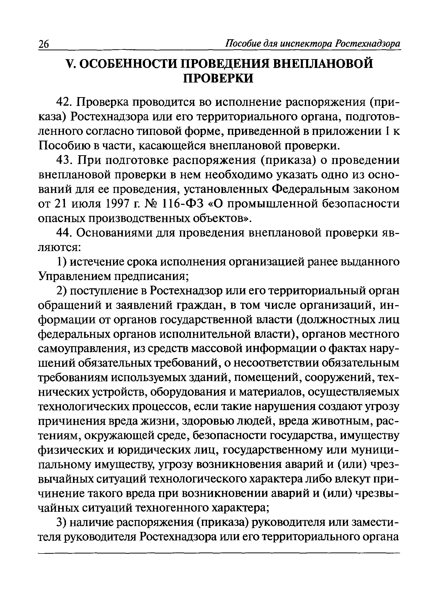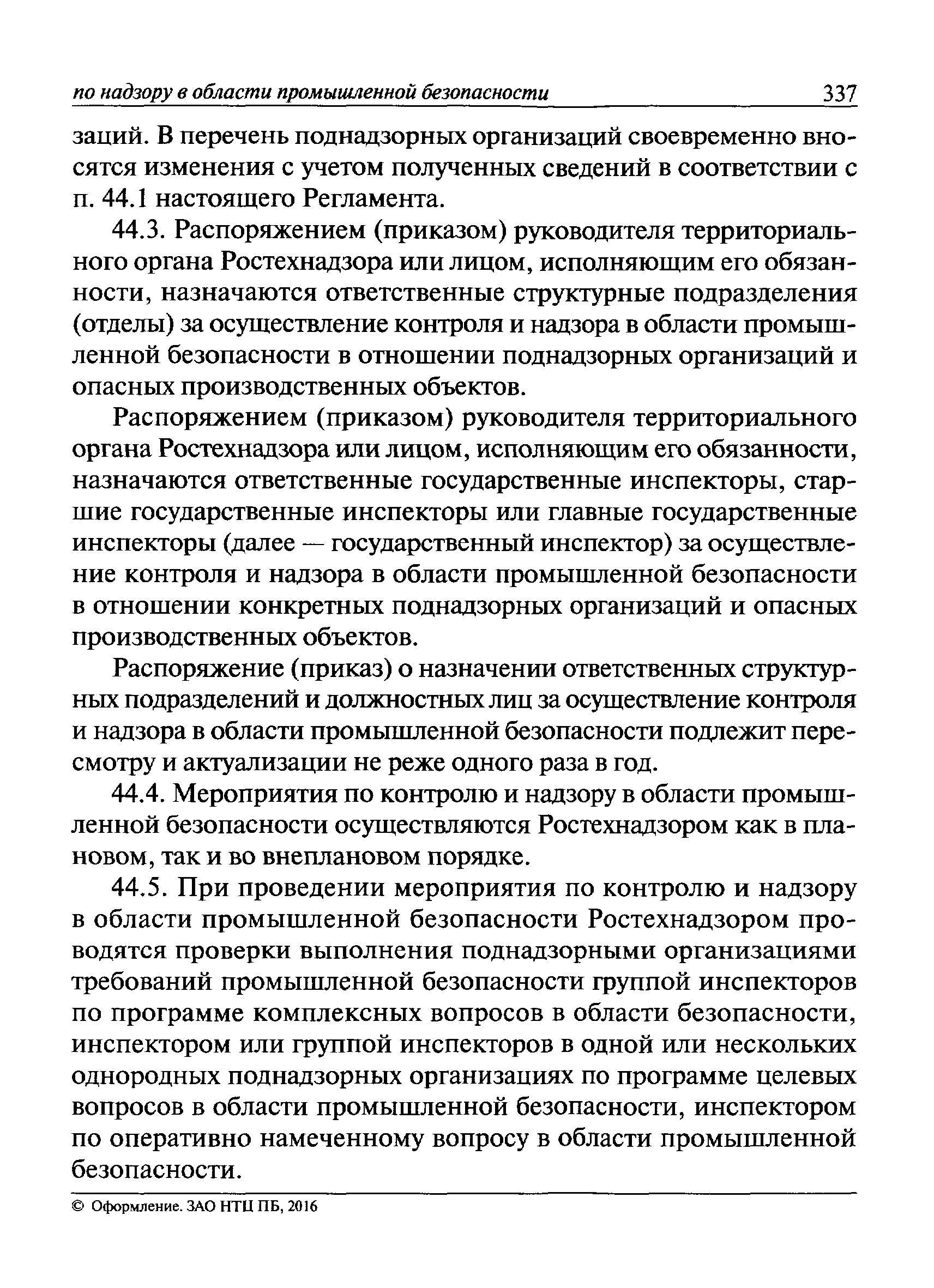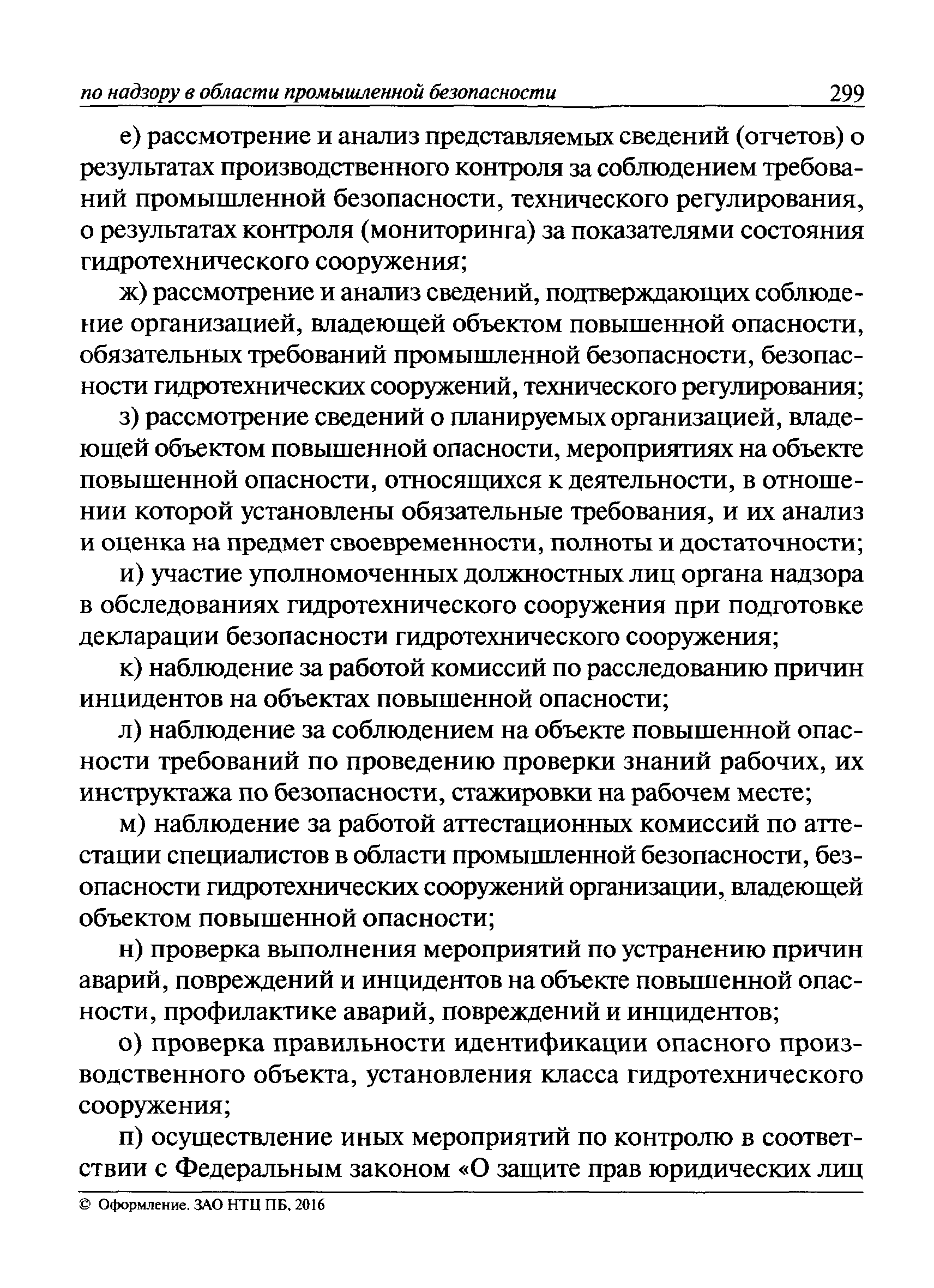 | Оглавление: | I Общие положения II Подготовка к проведению плановой проверки III Проведение плановой проверки IV Проведение документарной проверки V Особенности проведения внеплановой проверки VI Оформление результатов проверки VII Контроль исполнения выданного предписания VIII Особенности проведения проверок в режиме постоянного государственного надзора на опасных производственных объектах 1 класса опасности IХ Перечень нормативных правовых актов, используемых при проведении проверки Приложение 1. Распоряжение (приказ) Приложение 2. Акт проверки территориальным органом Ростехнадзора юридического лица, индивидуального предпринимателя Приложение 3. Предписание Законодательные и иные нормативные правовые акты к Пособию для инспектора Ростехнадзора по надзору в области промышленной безопасности Федеральный закон от 21 июля 1997 г. № 116-ФЗ "О промышленной безопасности опасных производственных объектов" Закон Российской Федерации от 21 февраля 1992 г. № 2395-1 "О недрах" (извлечения) Федеральный закон от 26 декабря 2008 г. № 294-ФЗ "О защите прав юридических лиц и индивидуальных предпринимателей при осуществлении государственного контроля (надзора) и муниципального контроля" (извлечения) Федеральный закон от 27 декабря 2002 г. № 184-ФЗ "О техническом регулировании" (извлечения) Кодекс Российской Федерации об административных правонарушениях от 30 декабря 2001 г. № 195-ФЗ (извлечения) Положение о Федеральной службе по экологическому, технологическому и атомному надзору, утвержденное постановлением Правительства Российской Федерации от 30 июля 2004 г. № 401 Положение о федеральном государственном надзоре в области промышленной безопасности, утвержденное постановлением Правительства Российской Федерации от 15 ноября 2012 г. № 1170 Положение о режиме постоянного государственного надзора на опасных производственных объектах и гидротехнических сооружениях, утвержденное постановлением Правительства Российской Федерации от 5 мая 2012 г. № 455 Положение о государственном надзоре за безопасным ведением работ, связанных с пользованием недрами, утвержденное постановлением Правительства Российской Федерации от 2 февраля 2010 г. № 39 Постановление Правительства Российской Федерации от 13 мая 2013 г. № 407 "0б уполномоченных органах Российской Федерации по обеспечению государственного контроля (надзора) за соблюдением требований технических регламентов Таможенного союза" Постановление Правительства Российской Федерации от 23 декабря 2014 г. № 1447 "0б уполномоченных органах Российской Федерации по обеспечению государственного контроля (надзора) за соблюдением требований технического регламента Таможенного союза "О безопасности взрывчатых веществ и изделий на их основе" Административный регламент по исполнению Федеральной службой по экологическом технологическому и атомному надзору государственной функции по осуществлению контроля и надзора за соблюдением требований промышленной безопасности при проектировании, строительстве, эксплуатации, консервации опасных веществ на опасных производственных объектах, утвержденный приказом Минприроды России от 30 октября 2008 г. № 280 |