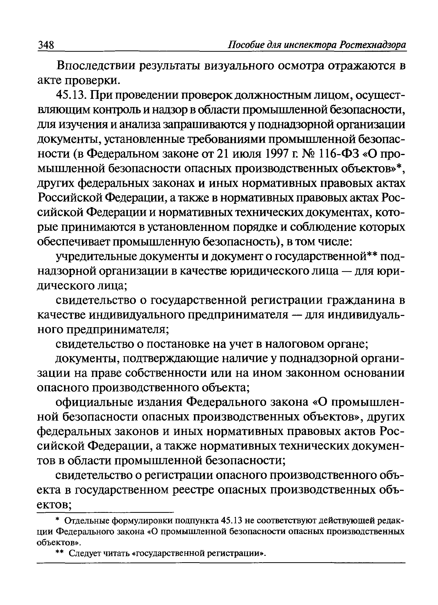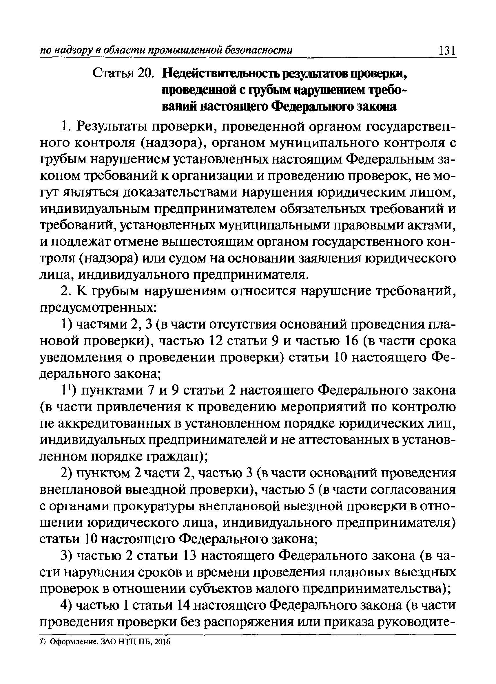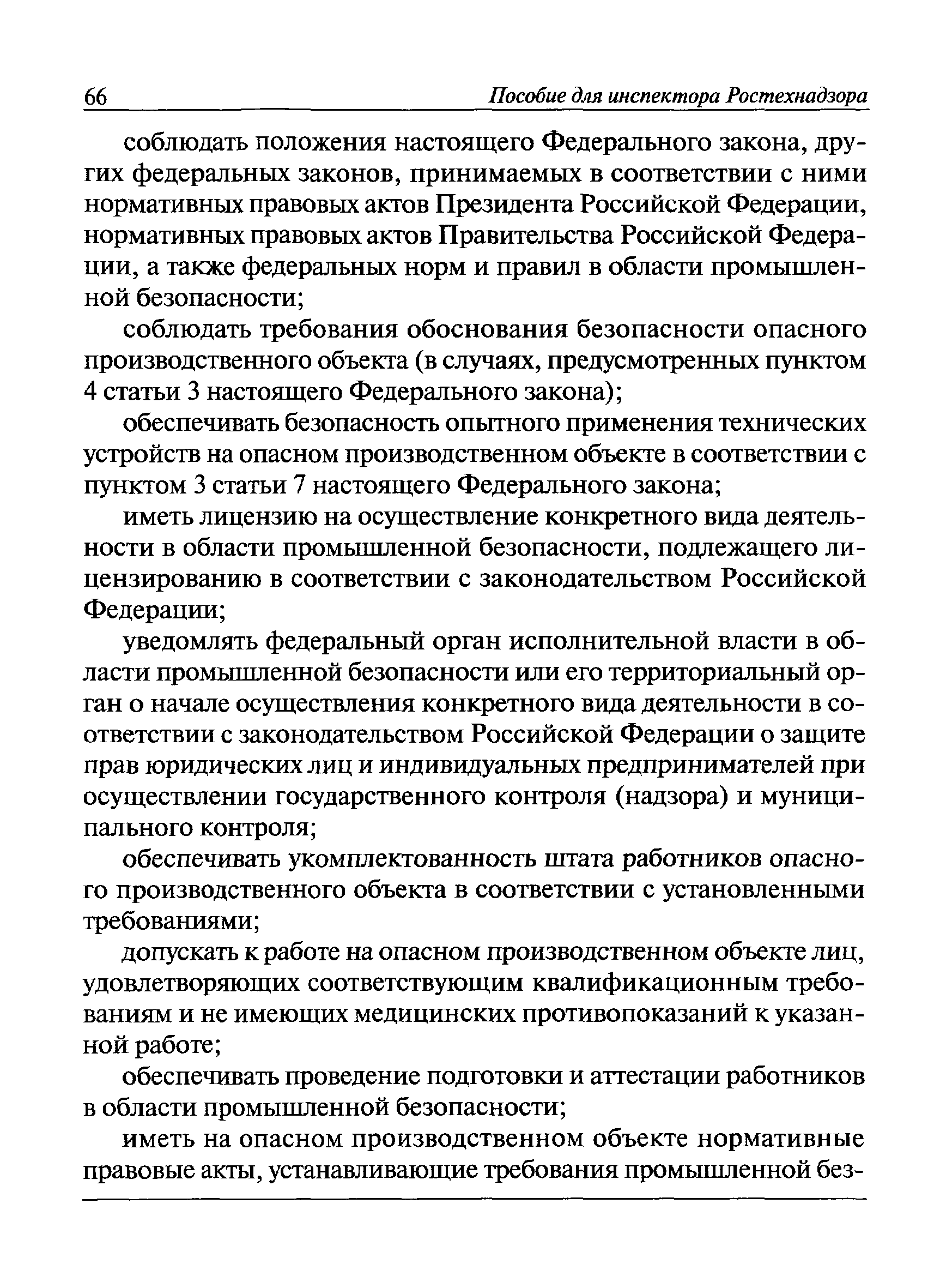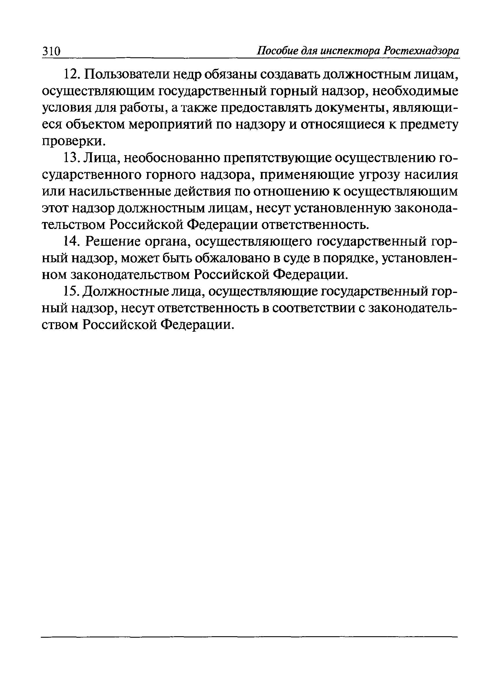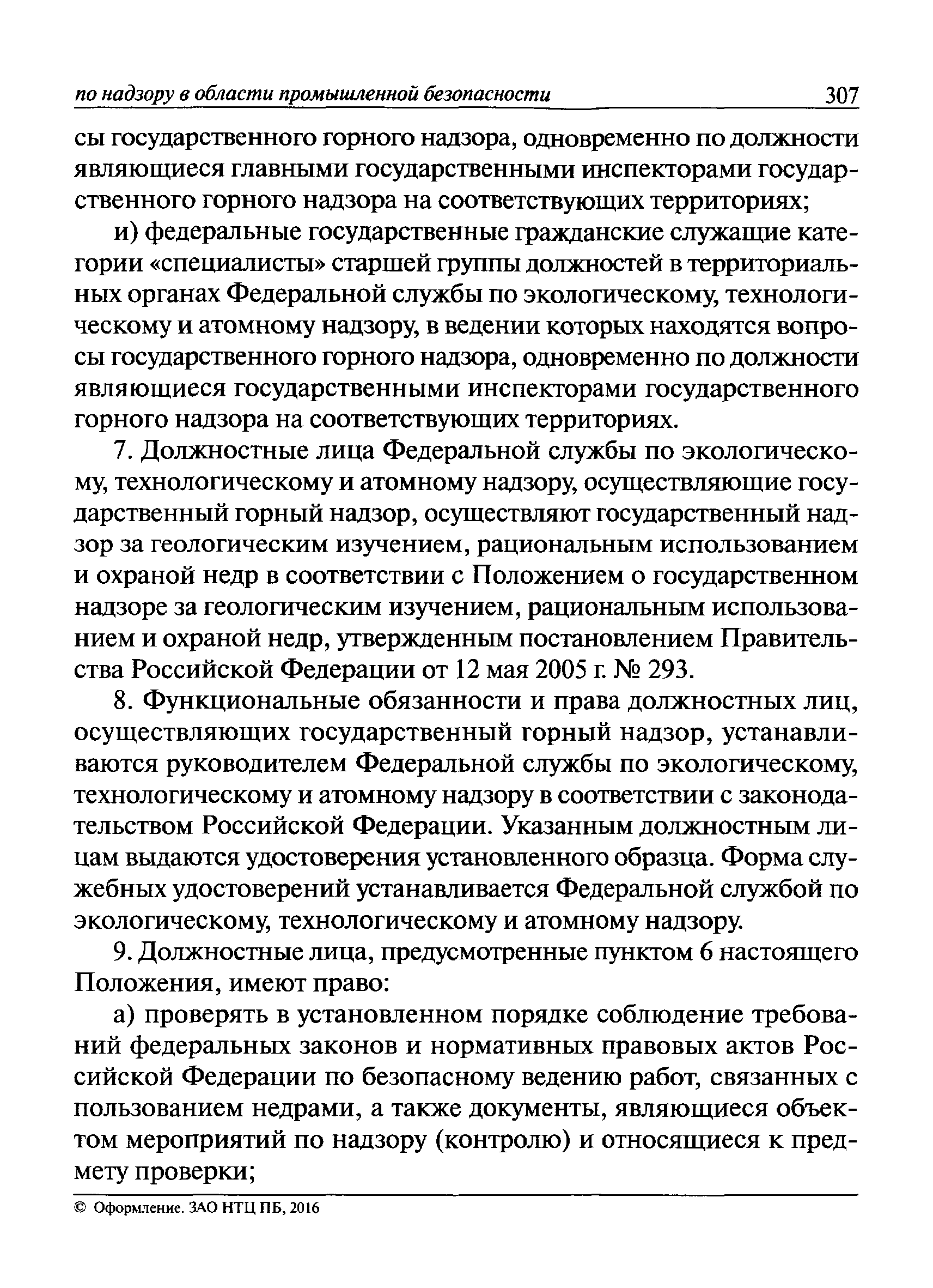 | Оглавление: | I Общие положения II Подготовка к проведению плановой проверки III Проведение плановой проверки IV Проведение документарной проверки V Особенности проведения внеплановой проверки VI Оформление результатов проверки VII Контроль исполнения выданного предписания VIII Особенности проведения проверок в режиме постоянного государственного надзора на опасных производственных объектах 1 класса опасности IХ Перечень нормативных правовых актов, используемых при проведении проверки Приложение 1. Распоряжение (приказ) Приложение 2. Акт проверки территориальным органом Ростехнадзора юридического лица, индивидуального предпринимателя Приложение 3. Предписание Законодательные и иные нормативные правовые акты к Пособию для инспектора Ростехнадзора по надзору в области промышленной безопасности Федеральный закон от 21 июля 1997 г. № 116-ФЗ "О промышленной безопасности опасных производственных объектов" Закон Российской Федерации от 21 февраля 1992 г. № 2395-1 "О недрах" (извлечения) Федеральный закон от 26 декабря 2008 г. № 294-ФЗ "О защите прав юридических лиц и индивидуальных предпринимателей при осуществлении государственного контроля (надзора) и муниципального контроля" (извлечения) Федеральный закон от 27 декабря 2002 г. № 184-ФЗ "О техническом регулировании" (извлечения) Кодекс Российской Федерации об административных правонарушениях от 30 декабря 2001 г. № 195-ФЗ (извлечения) Положение о Федеральной службе по экологическому, технологическому и атомному надзору, утвержденное постановлением Правительства Российской Федерации от 30 июля 2004 г. № 401 Положение о федеральном государственном надзоре в области промышленной безопасности, утвержденное постановлением Правительства Российской Федерации от 15 ноября 2012 г. № 1170 Положение о режиме постоянного государственного надзора на опасных производственных объектах и гидротехнических сооружениях, утвержденное постановлением Правительства Российской Федерации от 5 мая 2012 г. № 455 Положение о государственном надзоре за безопасным ведением работ, связанных с пользованием недрами, утвержденное постановлением Правительства Российской Федерации от 2 февраля 2010 г. № 39 Постановление Правительства Российской Федерации от 13 мая 2013 г. № 407 "0б уполномоченных органах Российской Федерации по обеспечению государственного контроля (надзора) за соблюдением требований технических регламентов Таможенного союза" Постановление Правительства Российской Федерации от 23 декабря 2014 г. № 1447 "0б уполномоченных органах Российской Федерации по обеспечению государственного контроля (надзора) за соблюдением требований технического регламента Таможенного союза "О безопасности взрывчатых веществ и изделий на их основе" Административный регламент по исполнению Федеральной службой по экологическом технологическому и атомному надзору государственной функции по осуществлению контроля и надзора за соблюдением требований промышленной безопасности при проектировании, строительстве, эксплуатации, консервации опасных веществ на опасных производственных объектах, утвержденный приказом Минприроды России от 30 октября 2008 г. № 280 |