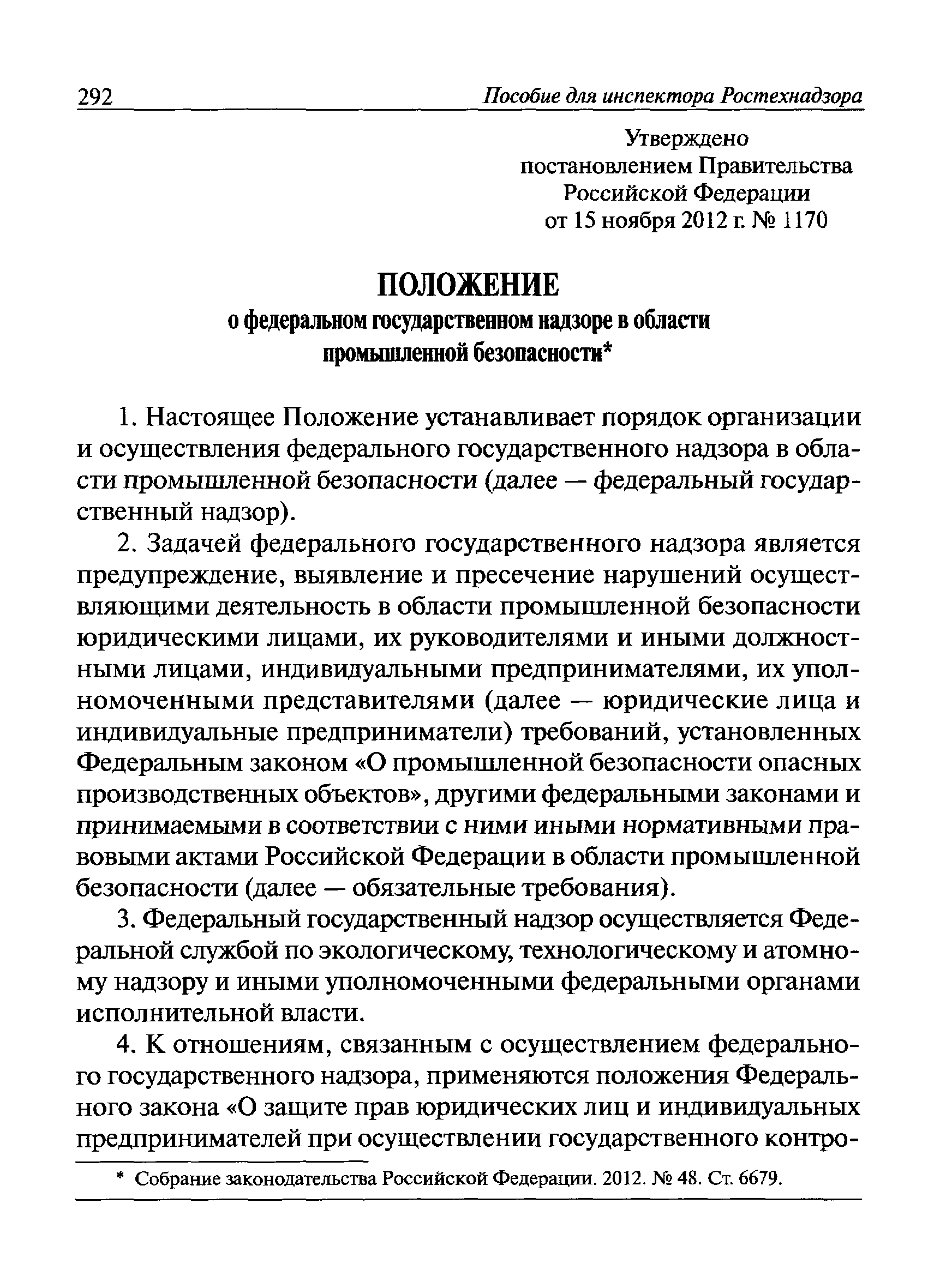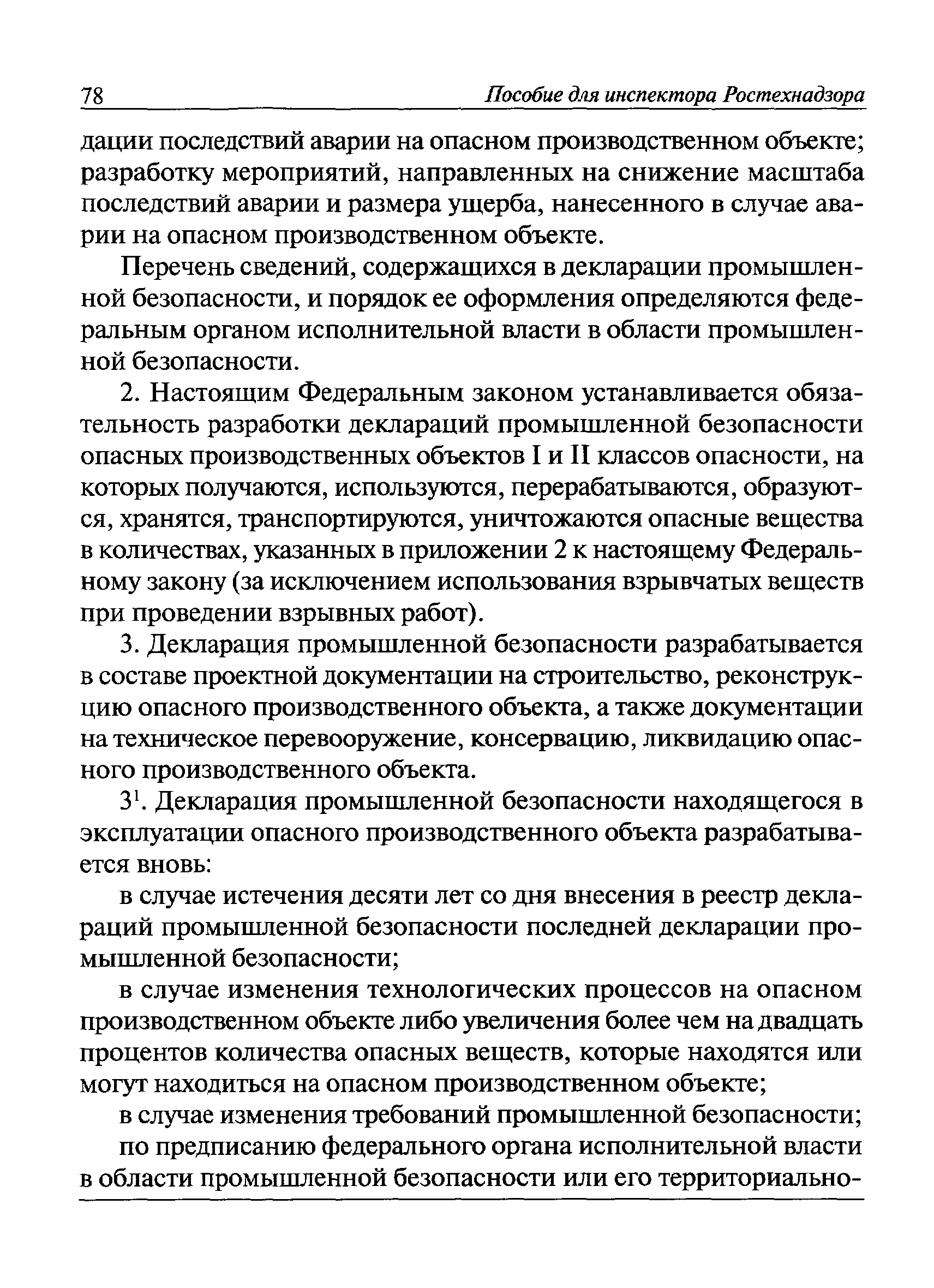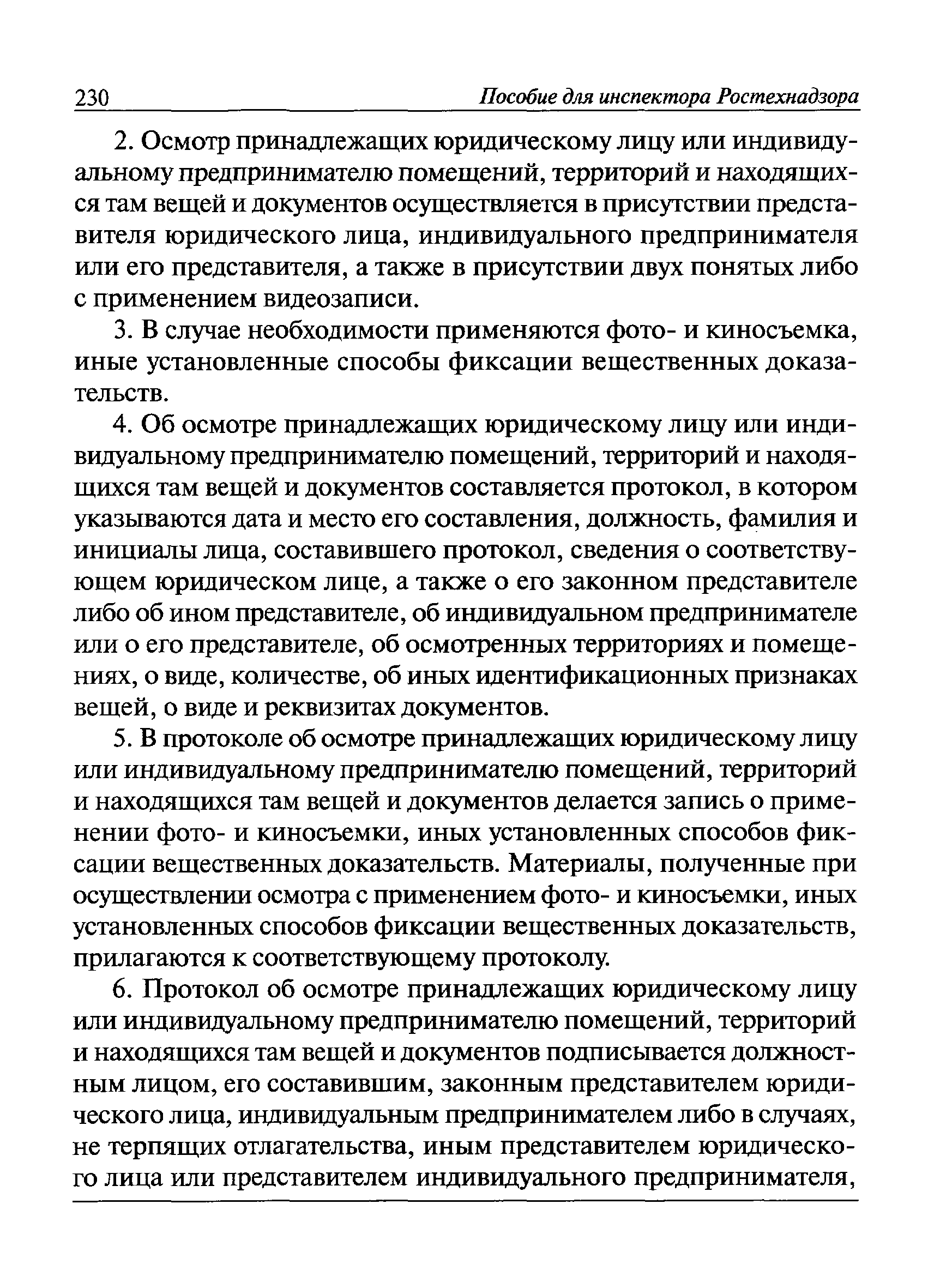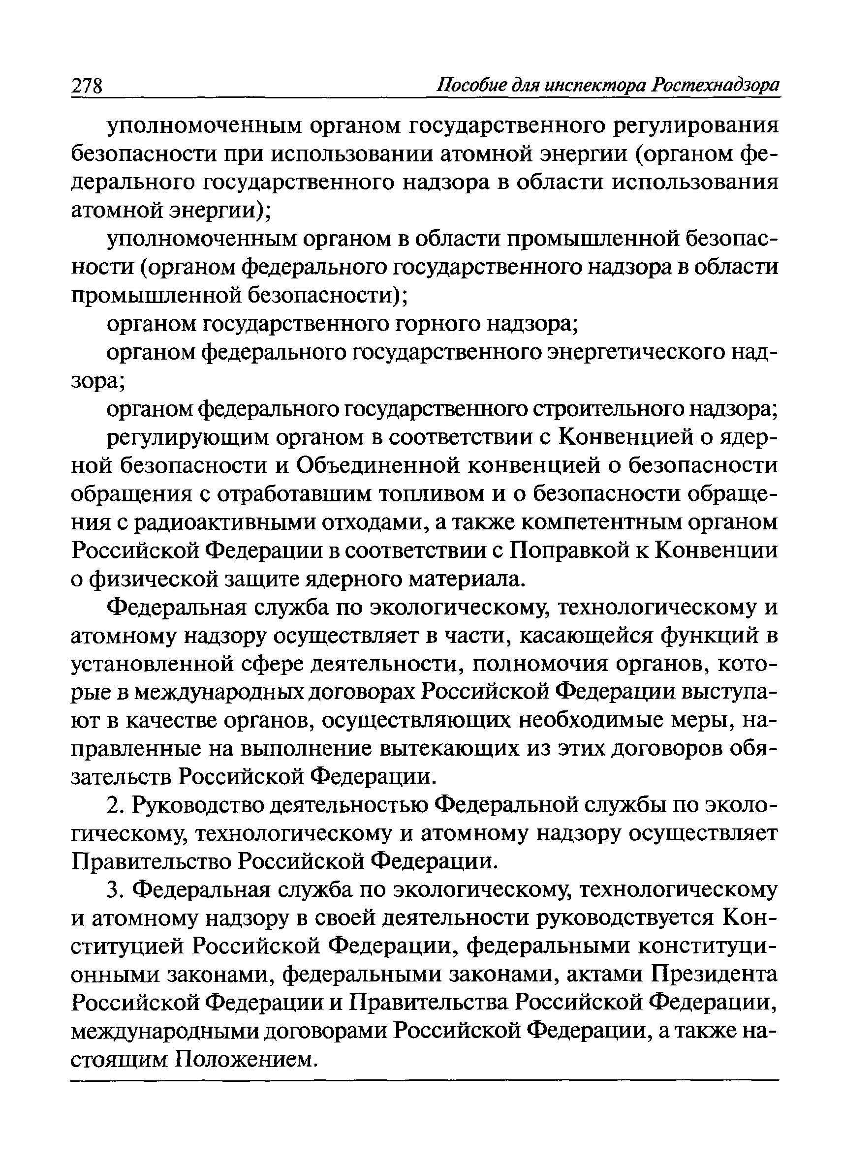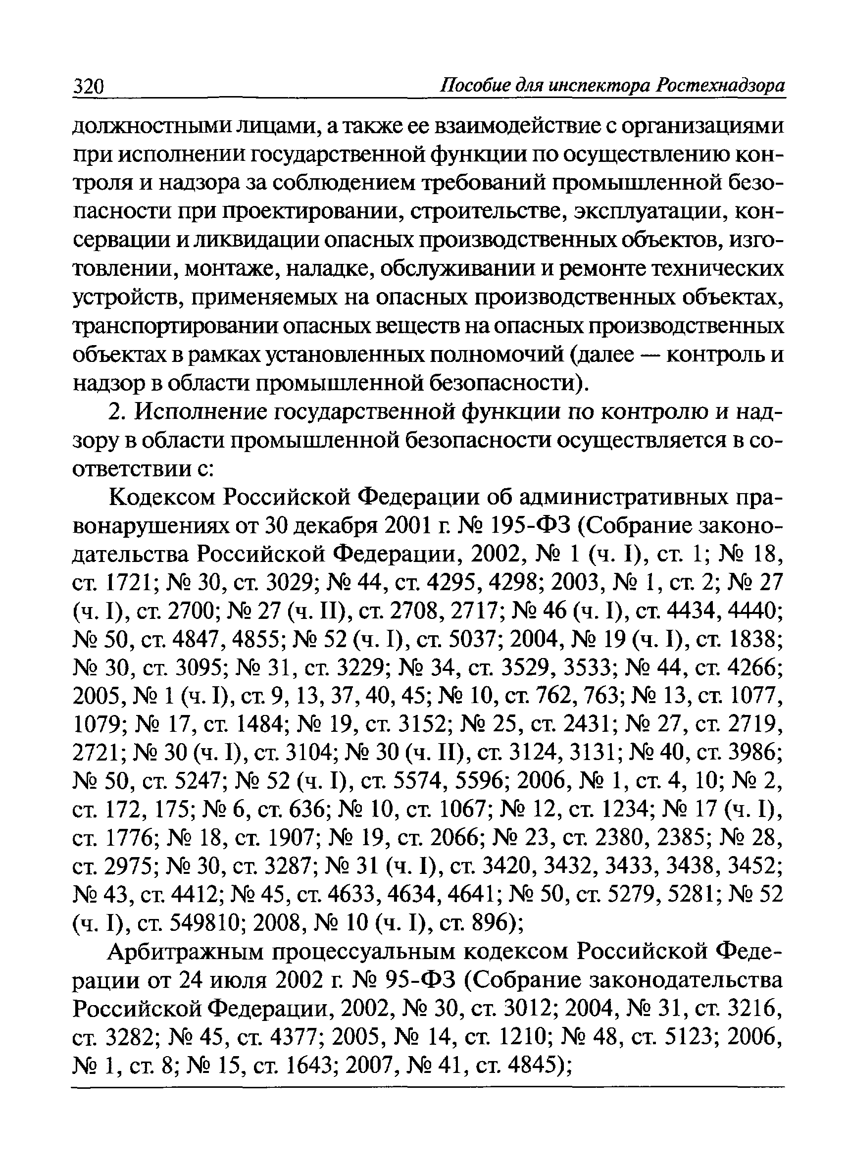 | Оглавление: | I Общие положения II Подготовка к проведению плановой проверки III Проведение плановой проверки IV Проведение документарной проверки V Особенности проведения внеплановой проверки VI Оформление результатов проверки VII Контроль исполнения выданного предписания VIII Особенности проведения проверок в режиме постоянного государственного надзора на опасных производственных объектах 1 класса опасности IХ Перечень нормативных правовых актов, используемых при проведении проверки Приложение 1. Распоряжение (приказ) Приложение 2. Акт проверки территориальным органом Ростехнадзора юридического лица, индивидуального предпринимателя Приложение 3. Предписание Законодательные и иные нормативные правовые акты к Пособию для инспектора Ростехнадзора по надзору в области промышленной безопасности Федеральный закон от 21 июля 1997 г. № 116-ФЗ "О промышленной безопасности опасных производственных объектов" Закон Российской Федерации от 21 февраля 1992 г. № 2395-1 "О недрах" (извлечения) Федеральный закон от 26 декабря 2008 г. № 294-ФЗ "О защите прав юридических лиц и индивидуальных предпринимателей при осуществлении государственного контроля (надзора) и муниципального контроля" (извлечения) Федеральный закон от 27 декабря 2002 г. № 184-ФЗ "О техническом регулировании" (извлечения) Кодекс Российской Федерации об административных правонарушениях от 30 декабря 2001 г. № 195-ФЗ (извлечения) Положение о Федеральной службе по экологическому, технологическому и атомному надзору, утвержденное постановлением Правительства Российской Федерации от 30 июля 2004 г. № 401 Положение о федеральном государственном надзоре в области промышленной безопасности, утвержденное постановлением Правительства Российской Федерации от 15 ноября 2012 г. № 1170 Положение о режиме постоянного государственного надзора на опасных производственных объектах и гидротехнических сооружениях, утвержденное постановлением Правительства Российской Федерации от 5 мая 2012 г. № 455 Положение о государственном надзоре за безопасным ведением работ, связанных с пользованием недрами, утвержденное постановлением Правительства Российской Федерации от 2 февраля 2010 г. № 39 Постановление Правительства Российской Федерации от 13 мая 2013 г. № 407 "0б уполномоченных органах Российской Федерации по обеспечению государственного контроля (надзора) за соблюдением требований технических регламентов Таможенного союза" Постановление Правительства Российской Федерации от 23 декабря 2014 г. № 1447 "0б уполномоченных органах Российской Федерации по обеспечению государственного контроля (надзора) за соблюдением требований технического регламента Таможенного союза "О безопасности взрывчатых веществ и изделий на их основе" Административный регламент по исполнению Федеральной службой по экологическом технологическому и атомному надзору государственной функции по осуществлению контроля и надзора за соблюдением требований промышленной безопасности при проектировании, строительстве, эксплуатации, консервации опасных веществ на опасных производственных объектах, утвержденный приказом Минприроды России от 30 октября 2008 г. № 280 |