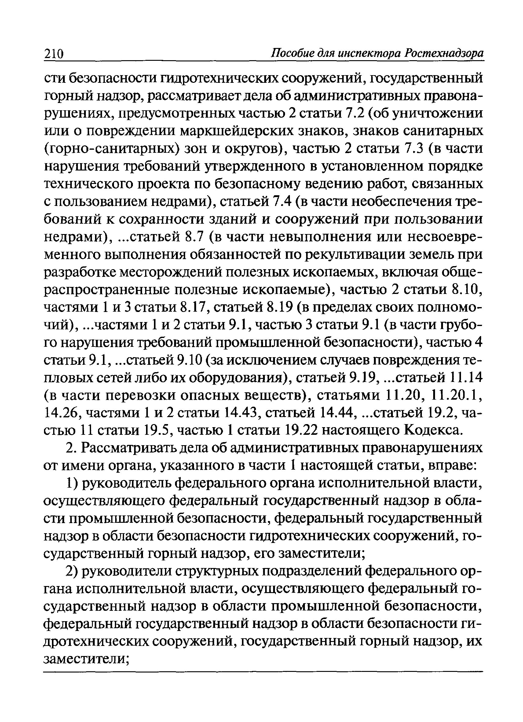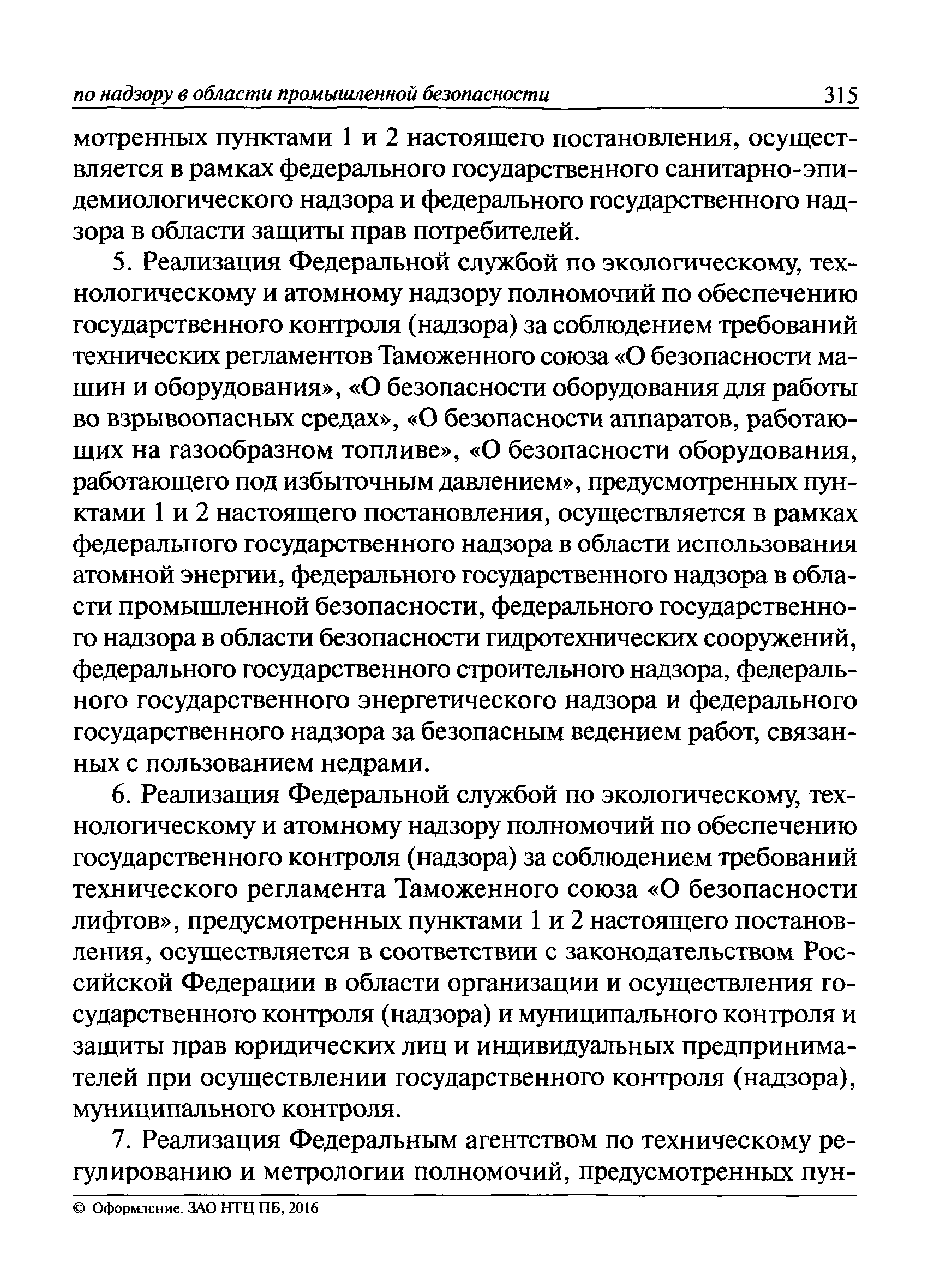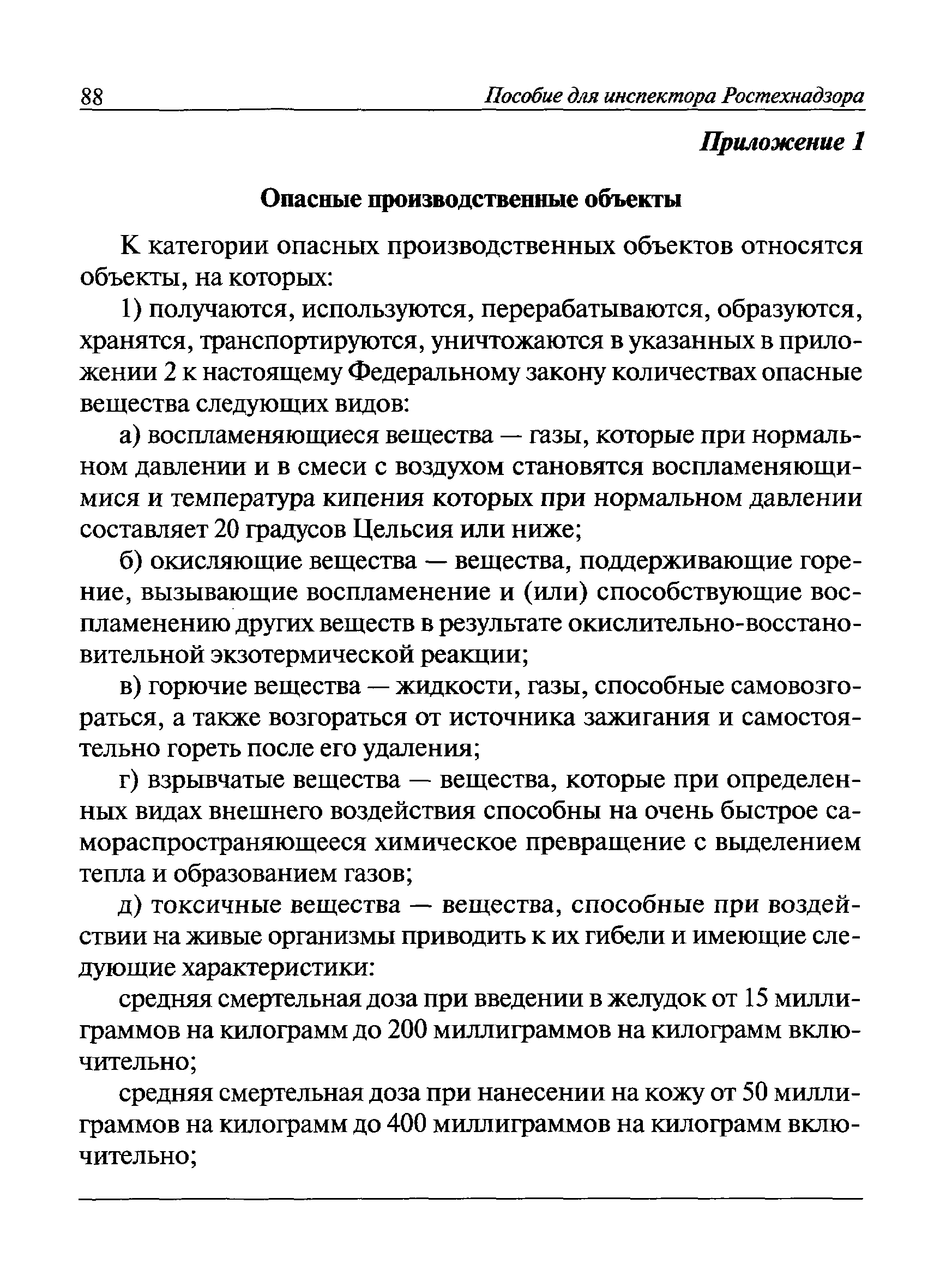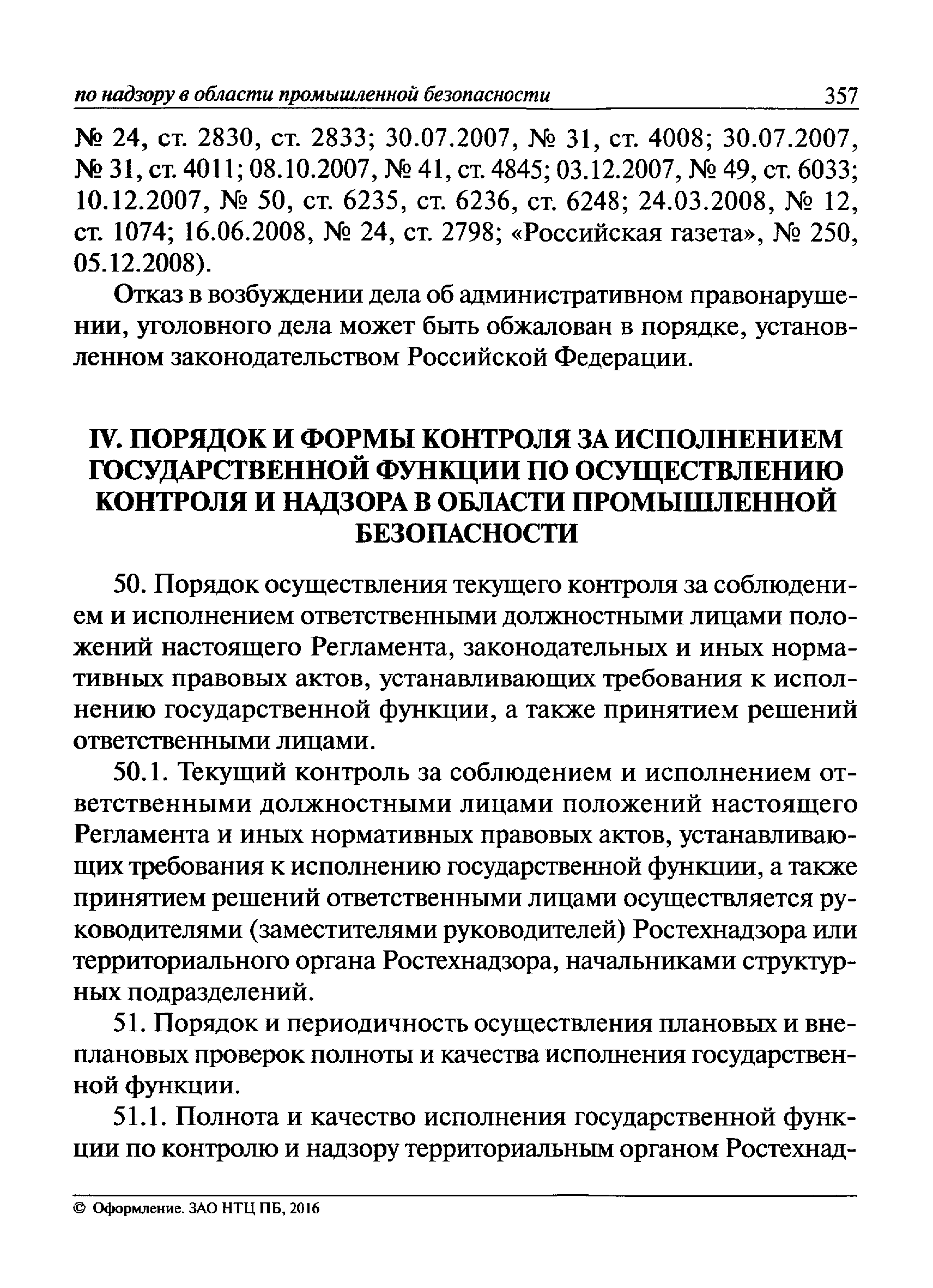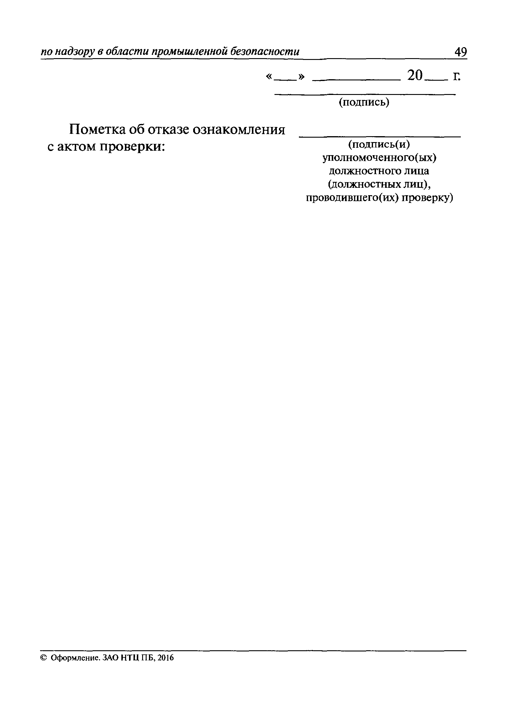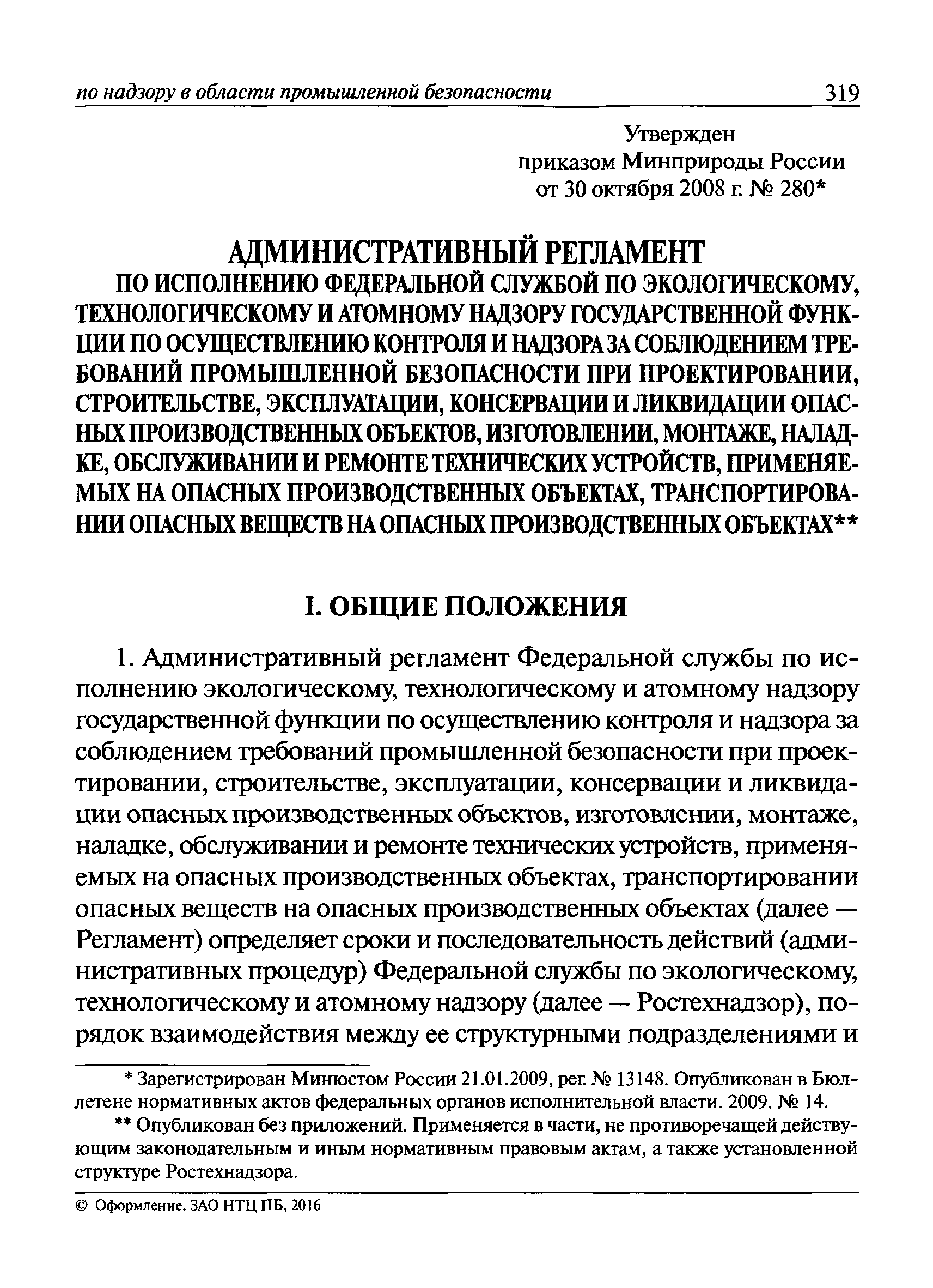 | Оглавление: | I Общие положения II Подготовка к проведению плановой проверки III Проведение плановой проверки IV Проведение документарной проверки V Особенности проведения внеплановой проверки VI Оформление результатов проверки VII Контроль исполнения выданного предписания VIII Особенности проведения проверок в режиме постоянного государственного надзора на опасных производственных объектах 1 класса опасности IХ Перечень нормативных правовых актов, используемых при проведении проверки Приложение 1. Распоряжение (приказ) Приложение 2. Акт проверки территориальным органом Ростехнадзора юридического лица, индивидуального предпринимателя Приложение 3. Предписание Законодательные и иные нормативные правовые акты к Пособию для инспектора Ростехнадзора по надзору в области промышленной безопасности Федеральный закон от 21 июля 1997 г. № 116-ФЗ "О промышленной безопасности опасных производственных объектов" Закон Российской Федерации от 21 февраля 1992 г. № 2395-1 "О недрах" (извлечения) Федеральный закон от 26 декабря 2008 г. № 294-ФЗ "О защите прав юридических лиц и индивидуальных предпринимателей при осуществлении государственного контроля (надзора) и муниципального контроля" (извлечения) Федеральный закон от 27 декабря 2002 г. № 184-ФЗ "О техническом регулировании" (извлечения) Кодекс Российской Федерации об административных правонарушениях от 30 декабря 2001 г. № 195-ФЗ (извлечения) Положение о Федеральной службе по экологическому, технологическому и атомному надзору, утвержденное постановлением Правительства Российской Федерации от 30 июля 2004 г. № 401 Положение о федеральном государственном надзоре в области промышленной безопасности, утвержденное постановлением Правительства Российской Федерации от 15 ноября 2012 г. № 1170 Положение о режиме постоянного государственного надзора на опасных производственных объектах и гидротехнических сооружениях, утвержденное постановлением Правительства Российской Федерации от 5 мая 2012 г. № 455 Положение о государственном надзоре за безопасным ведением работ, связанных с пользованием недрами, утвержденное постановлением Правительства Российской Федерации от 2 февраля 2010 г. № 39 Постановление Правительства Российской Федерации от 13 мая 2013 г. № 407 "0б уполномоченных органах Российской Федерации по обеспечению государственного контроля (надзора) за соблюдением требований технических регламентов Таможенного союза" Постановление Правительства Российской Федерации от 23 декабря 2014 г. № 1447 "0б уполномоченных органах Российской Федерации по обеспечению государственного контроля (надзора) за соблюдением требований технического регламента Таможенного союза "О безопасности взрывчатых веществ и изделий на их основе" Административный регламент по исполнению Федеральной службой по экологическом технологическому и атомному надзору государственной функции по осуществлению контроля и надзора за соблюдением требований промышленной безопасности при проектировании, строительстве, эксплуатации, консервации опасных веществ на опасных производственных объектах, утвержденный приказом Минприроды России от 30 октября 2008 г. № 280 |