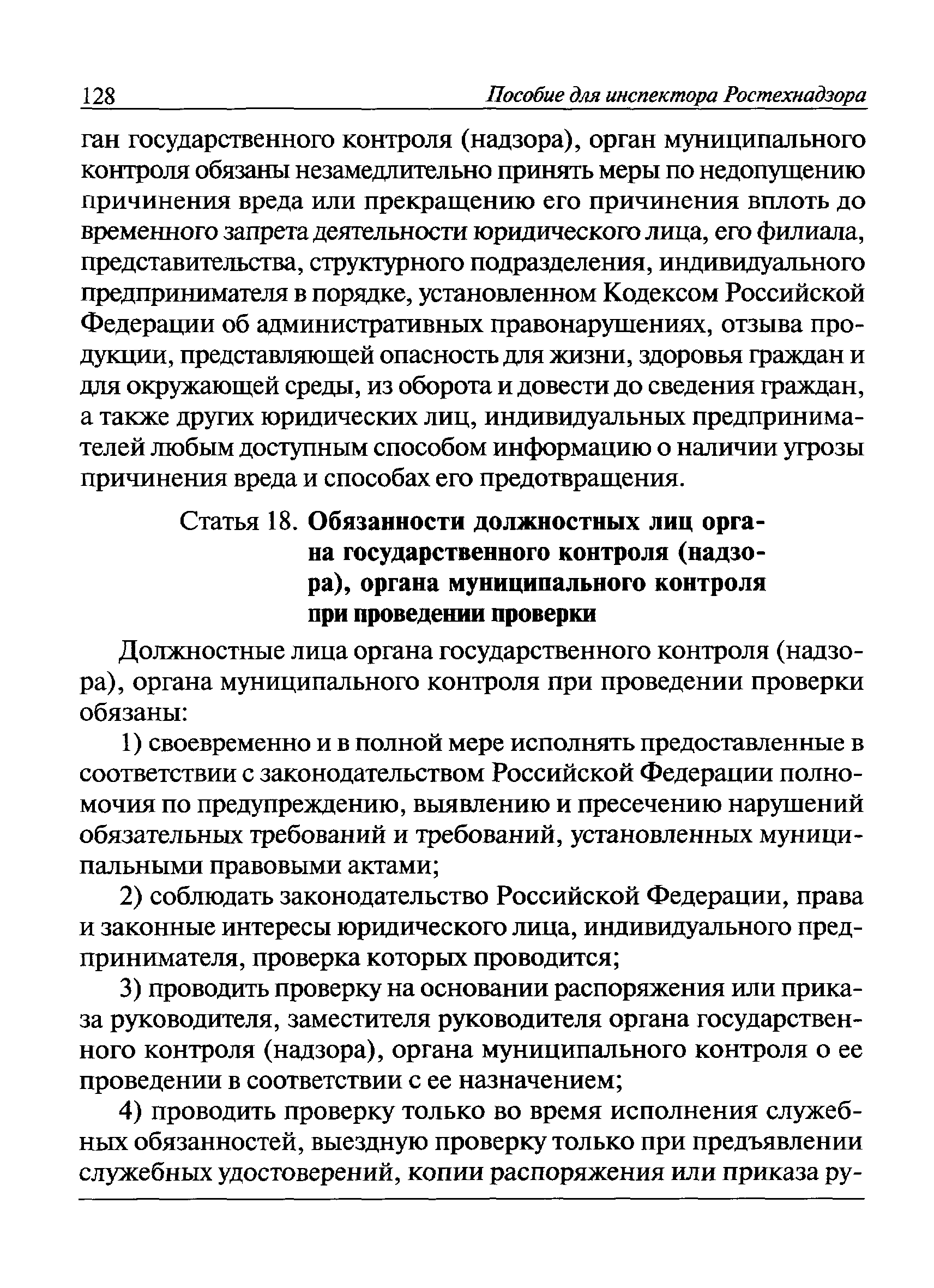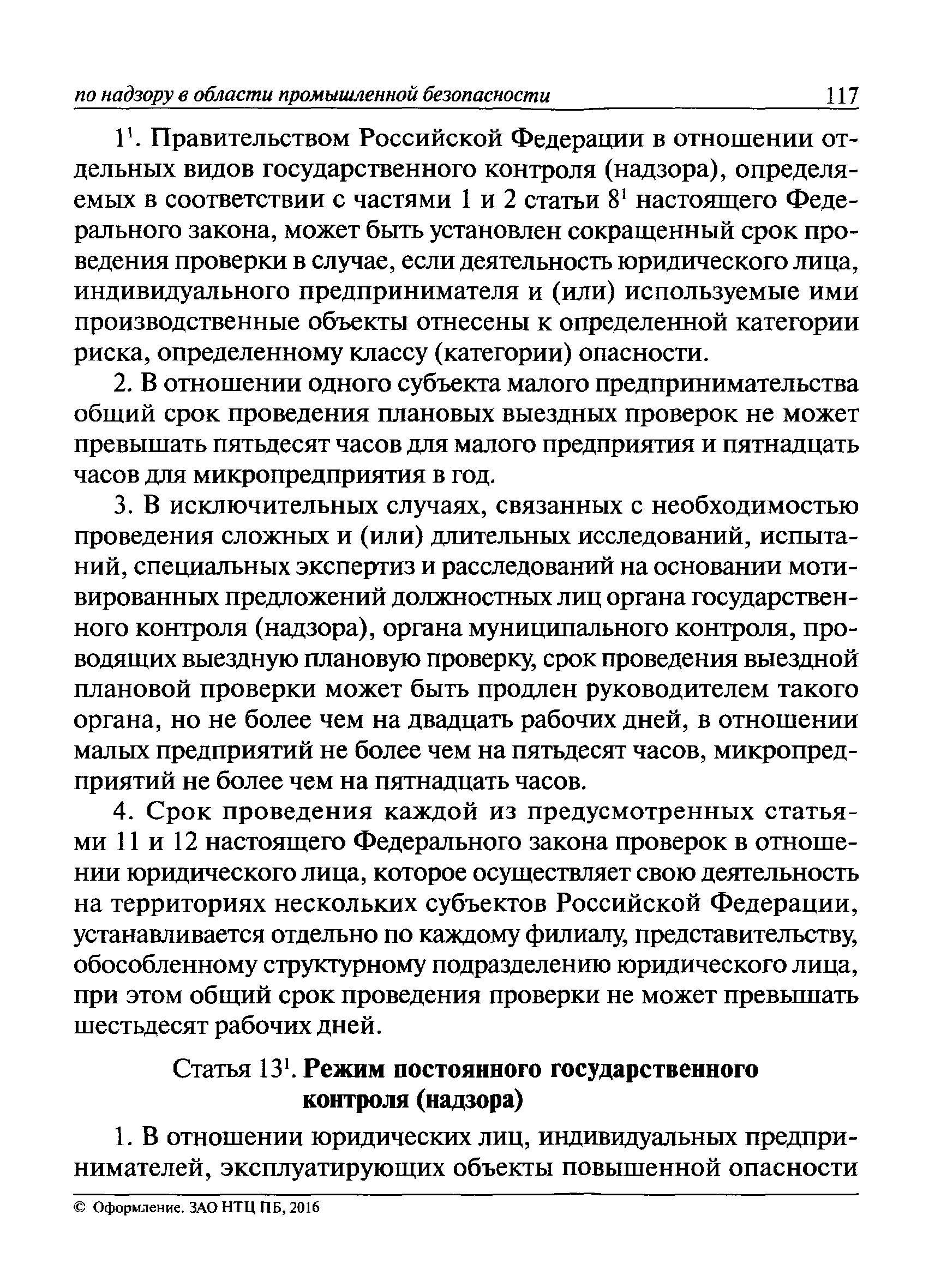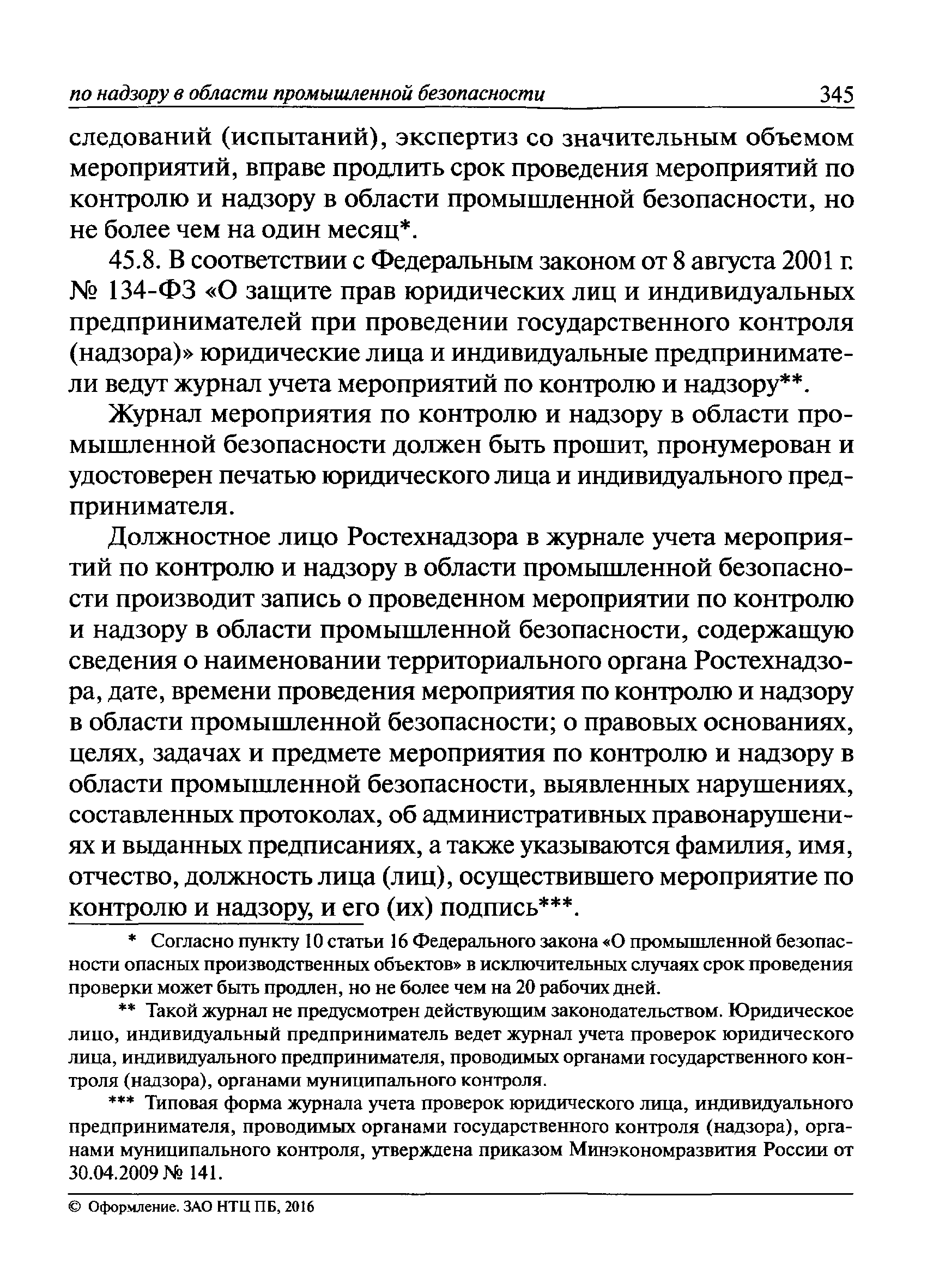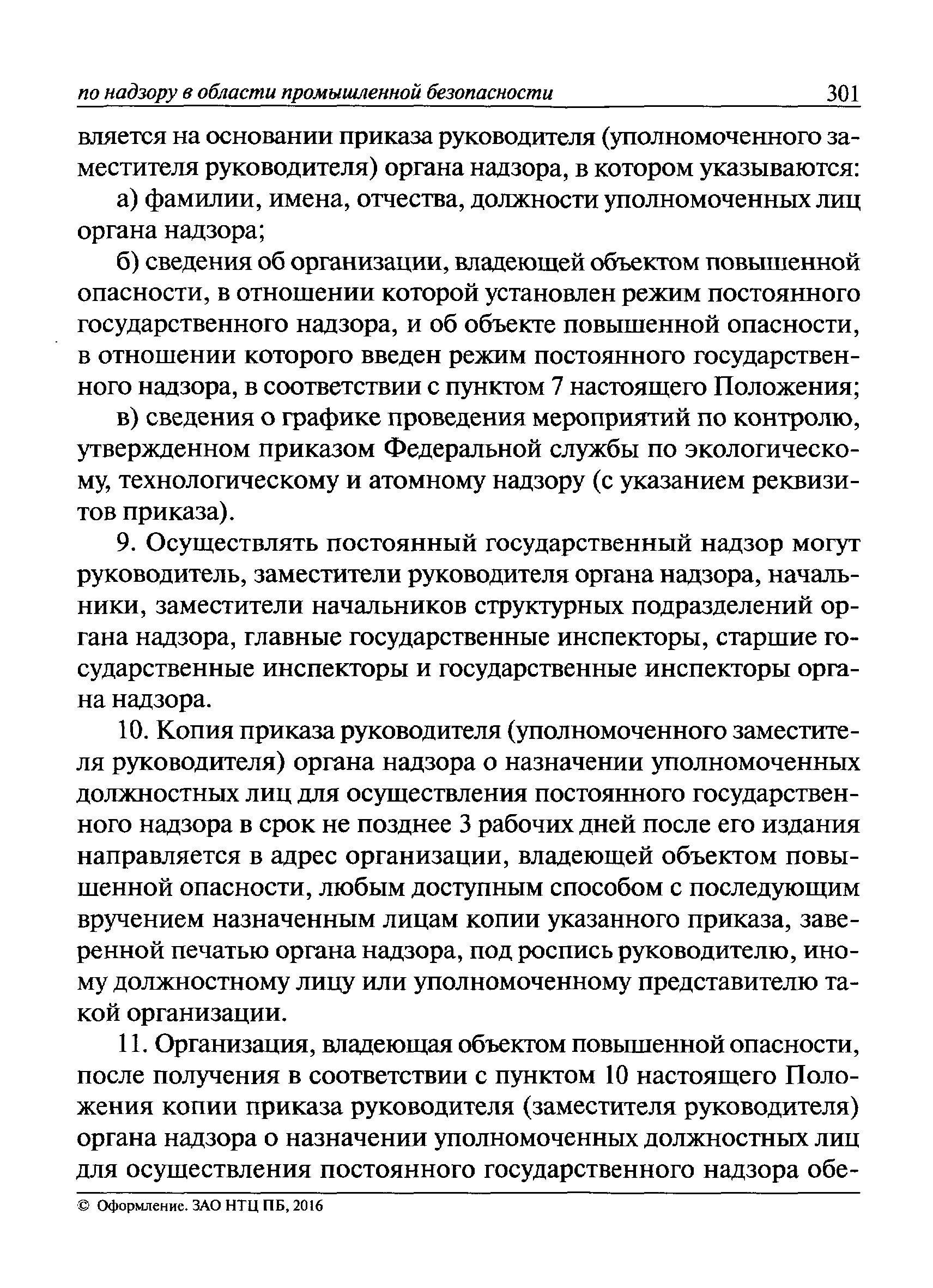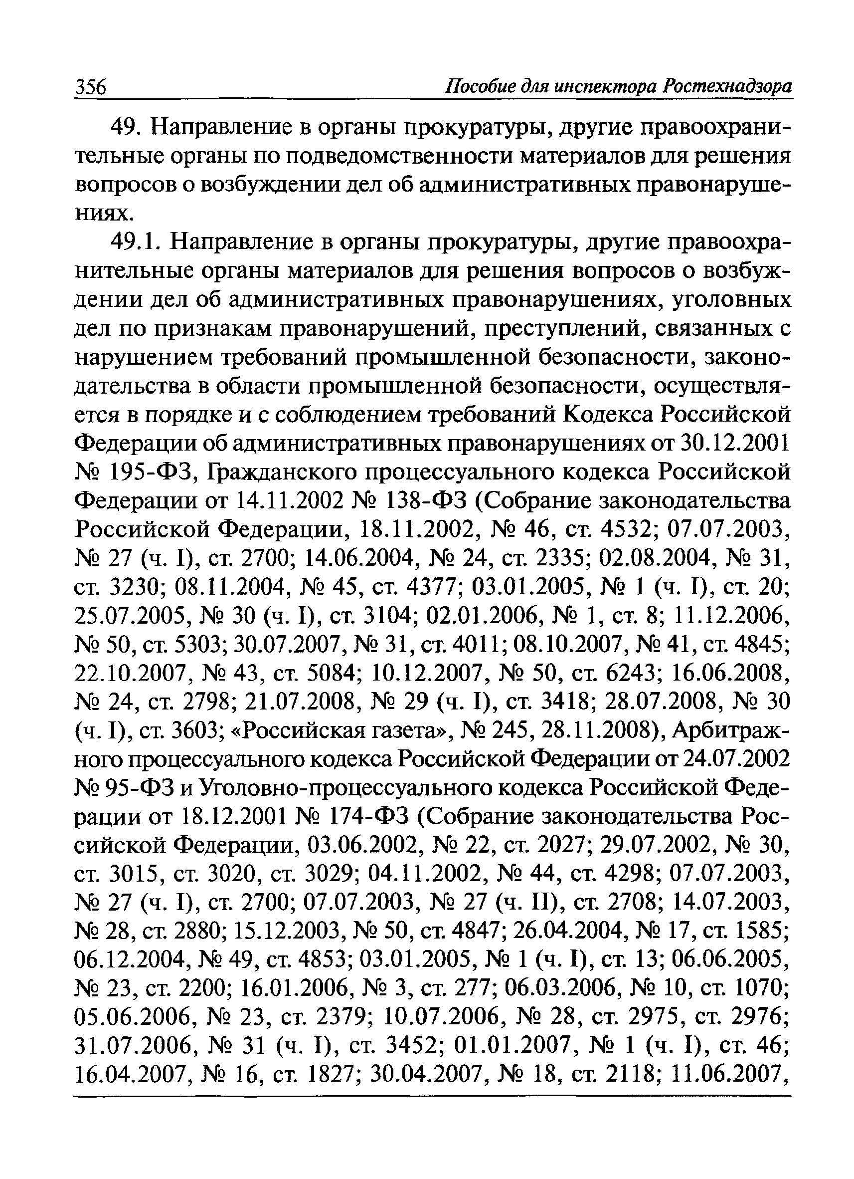 | Оглавление: | I Общие положения II Подготовка к проведению плановой проверки III Проведение плановой проверки IV Проведение документарной проверки V Особенности проведения внеплановой проверки VI Оформление результатов проверки VII Контроль исполнения выданного предписания VIII Особенности проведения проверок в режиме постоянного государственного надзора на опасных производственных объектах 1 класса опасности IХ Перечень нормативных правовых актов, используемых при проведении проверки Приложение 1. Распоряжение (приказ) Приложение 2. Акт проверки территориальным органом Ростехнадзора юридического лица, индивидуального предпринимателя Приложение 3. Предписание Законодательные и иные нормативные правовые акты к Пособию для инспектора Ростехнадзора по надзору в области промышленной безопасности Федеральный закон от 21 июля 1997 г. № 116-ФЗ "О промышленной безопасности опасных производственных объектов" Закон Российской Федерации от 21 февраля 1992 г. № 2395-1 "О недрах" (извлечения) Федеральный закон от 26 декабря 2008 г. № 294-ФЗ "О защите прав юридических лиц и индивидуальных предпринимателей при осуществлении государственного контроля (надзора) и муниципального контроля" (извлечения) Федеральный закон от 27 декабря 2002 г. № 184-ФЗ "О техническом регулировании" (извлечения) Кодекс Российской Федерации об административных правонарушениях от 30 декабря 2001 г. № 195-ФЗ (извлечения) Положение о Федеральной службе по экологическому, технологическому и атомному надзору, утвержденное постановлением Правительства Российской Федерации от 30 июля 2004 г. № 401 Положение о федеральном государственном надзоре в области промышленной безопасности, утвержденное постановлением Правительства Российской Федерации от 15 ноября 2012 г. № 1170 Положение о режиме постоянного государственного надзора на опасных производственных объектах и гидротехнических сооружениях, утвержденное постановлением Правительства Российской Федерации от 5 мая 2012 г. № 455 Положение о государственном надзоре за безопасным ведением работ, связанных с пользованием недрами, утвержденное постановлением Правительства Российской Федерации от 2 февраля 2010 г. № 39 Постановление Правительства Российской Федерации от 13 мая 2013 г. № 407 "0б уполномоченных органах Российской Федерации по обеспечению государственного контроля (надзора) за соблюдением требований технических регламентов Таможенного союза" Постановление Правительства Российской Федерации от 23 декабря 2014 г. № 1447 "0б уполномоченных органах Российской Федерации по обеспечению государственного контроля (надзора) за соблюдением требований технического регламента Таможенного союза "О безопасности взрывчатых веществ и изделий на их основе" Административный регламент по исполнению Федеральной службой по экологическом технологическому и атомному надзору государственной функции по осуществлению контроля и надзора за соблюдением требований промышленной безопасности при проектировании, строительстве, эксплуатации, консервации опасных веществ на опасных производственных объектах, утвержденный приказом Минприроды России от 30 октября 2008 г. № 280 |