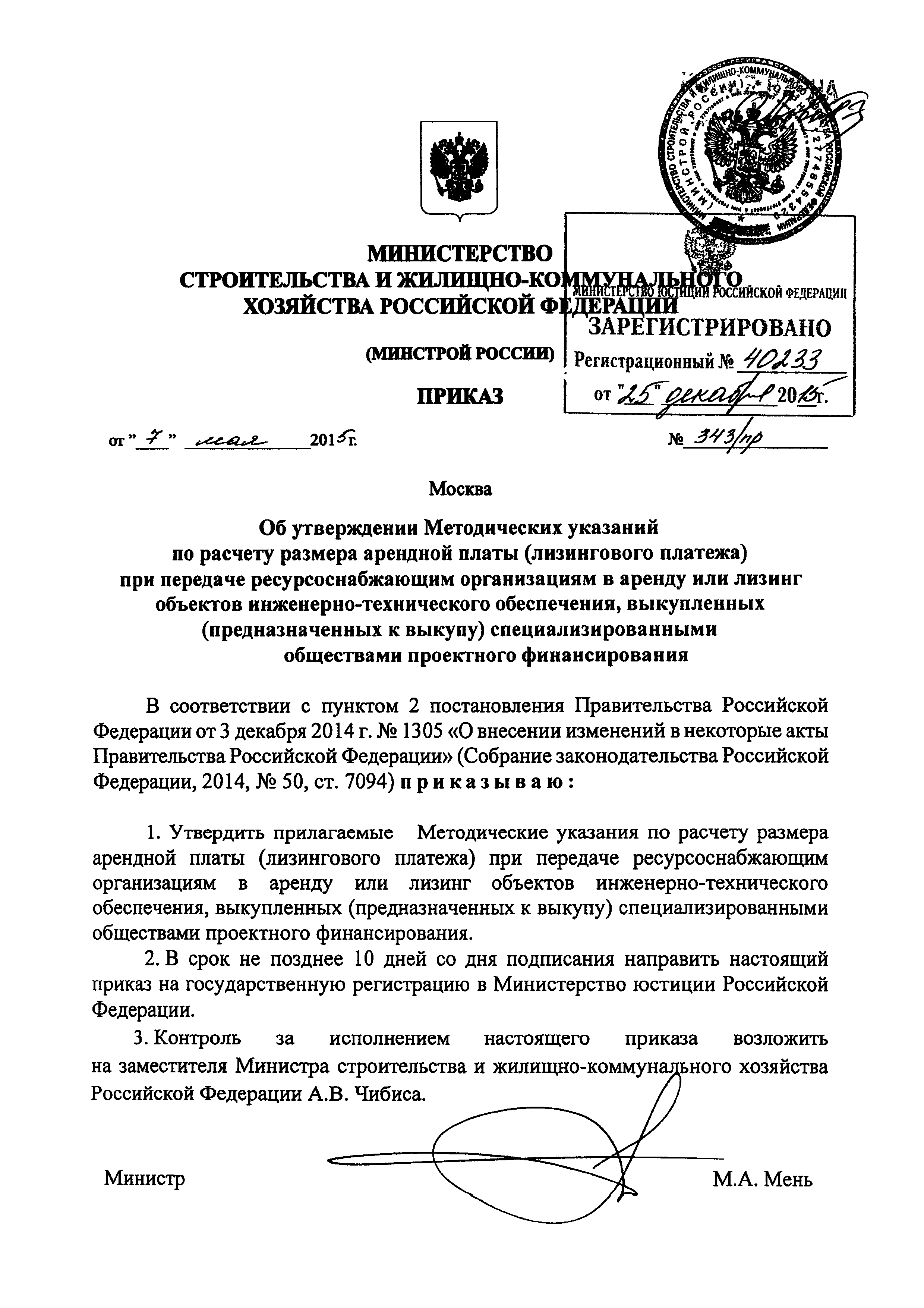 | Название рус.: | Методические указания по расчету размера арендной платы (лизингового платежа) при передаче ресурсоснабжающим организациям в аренду или лизинг объектов инженерно-технического обеспечения, выкупленных (предназначенных к выкупу) специализированными обществами проектного финансирования |