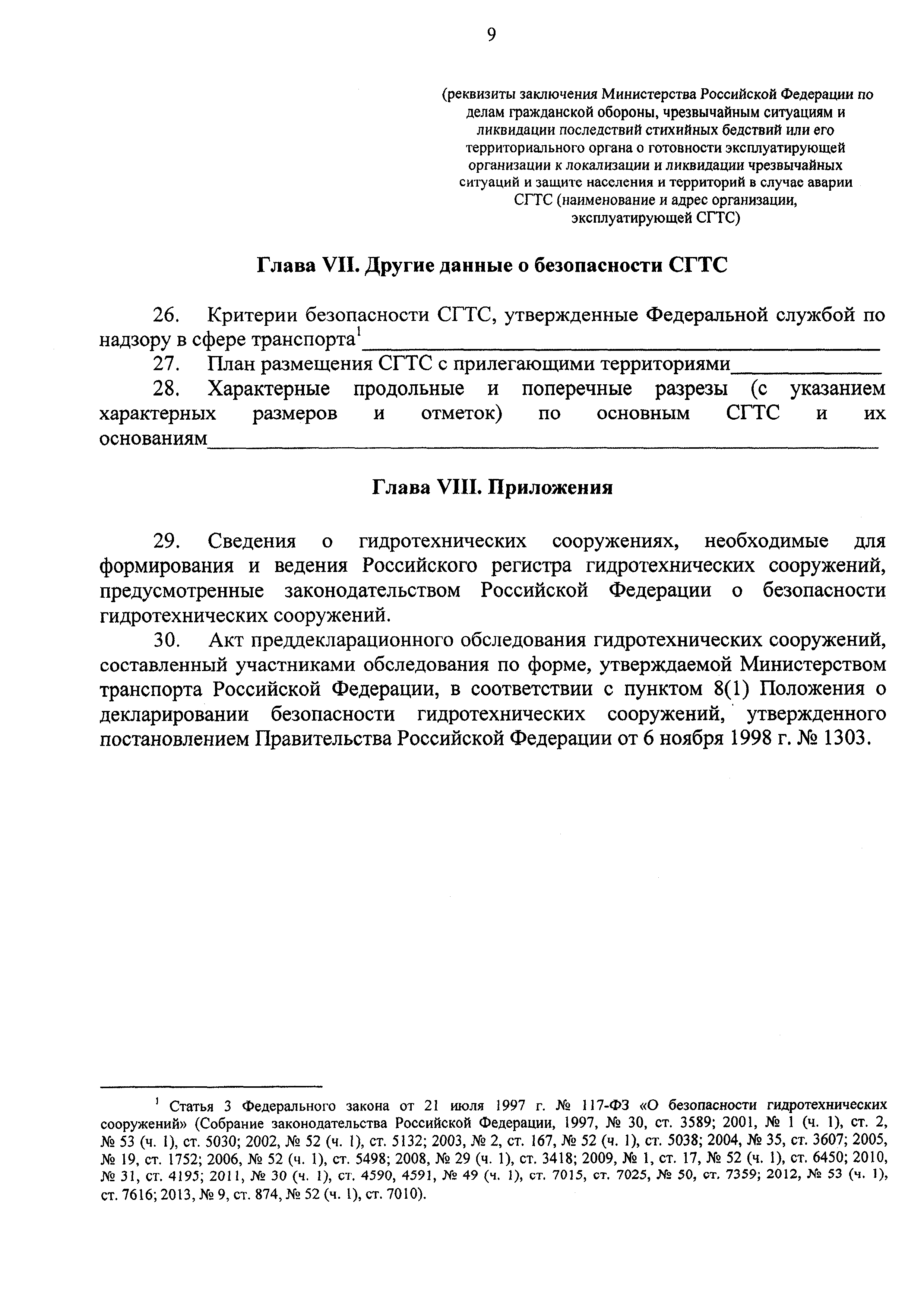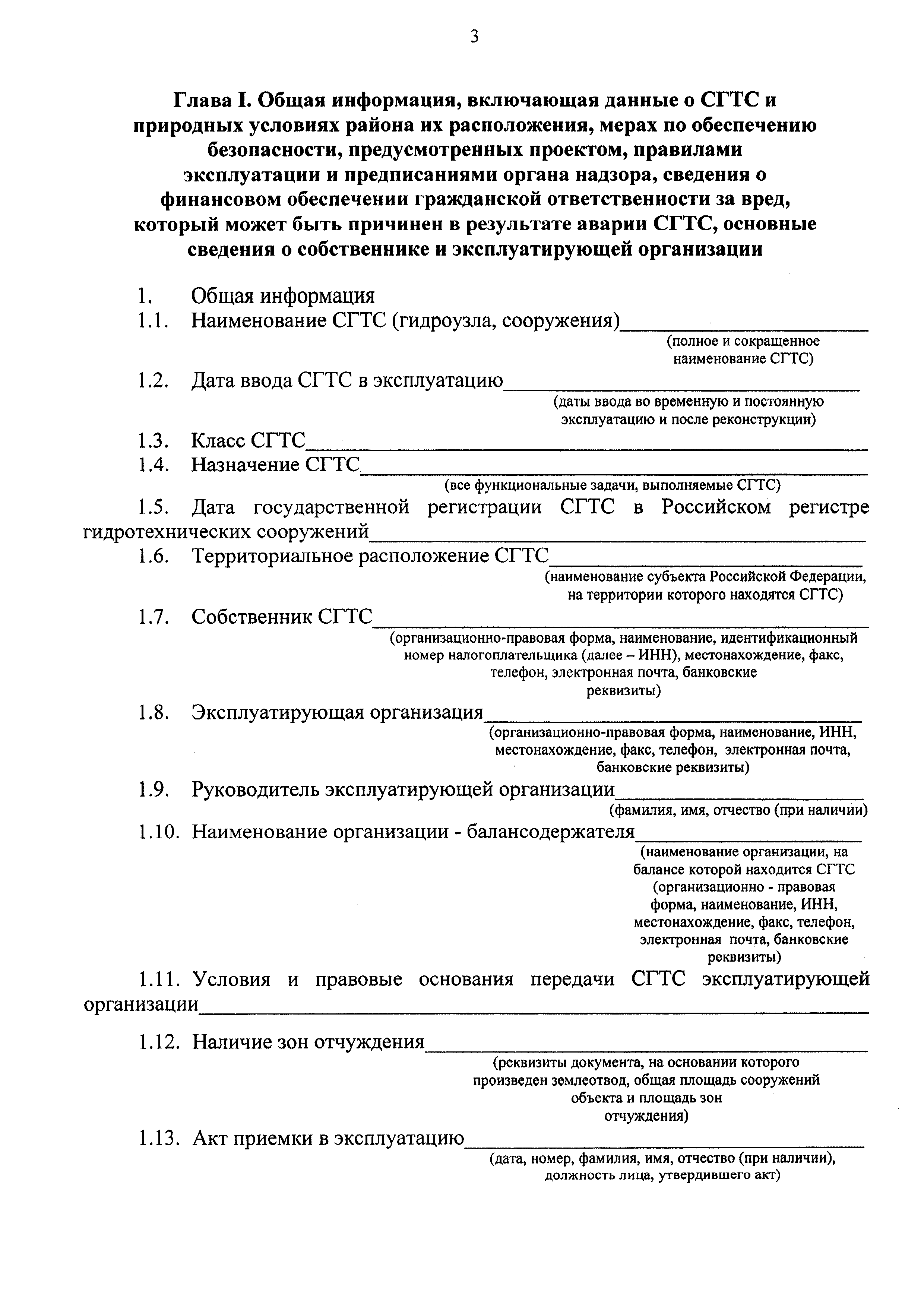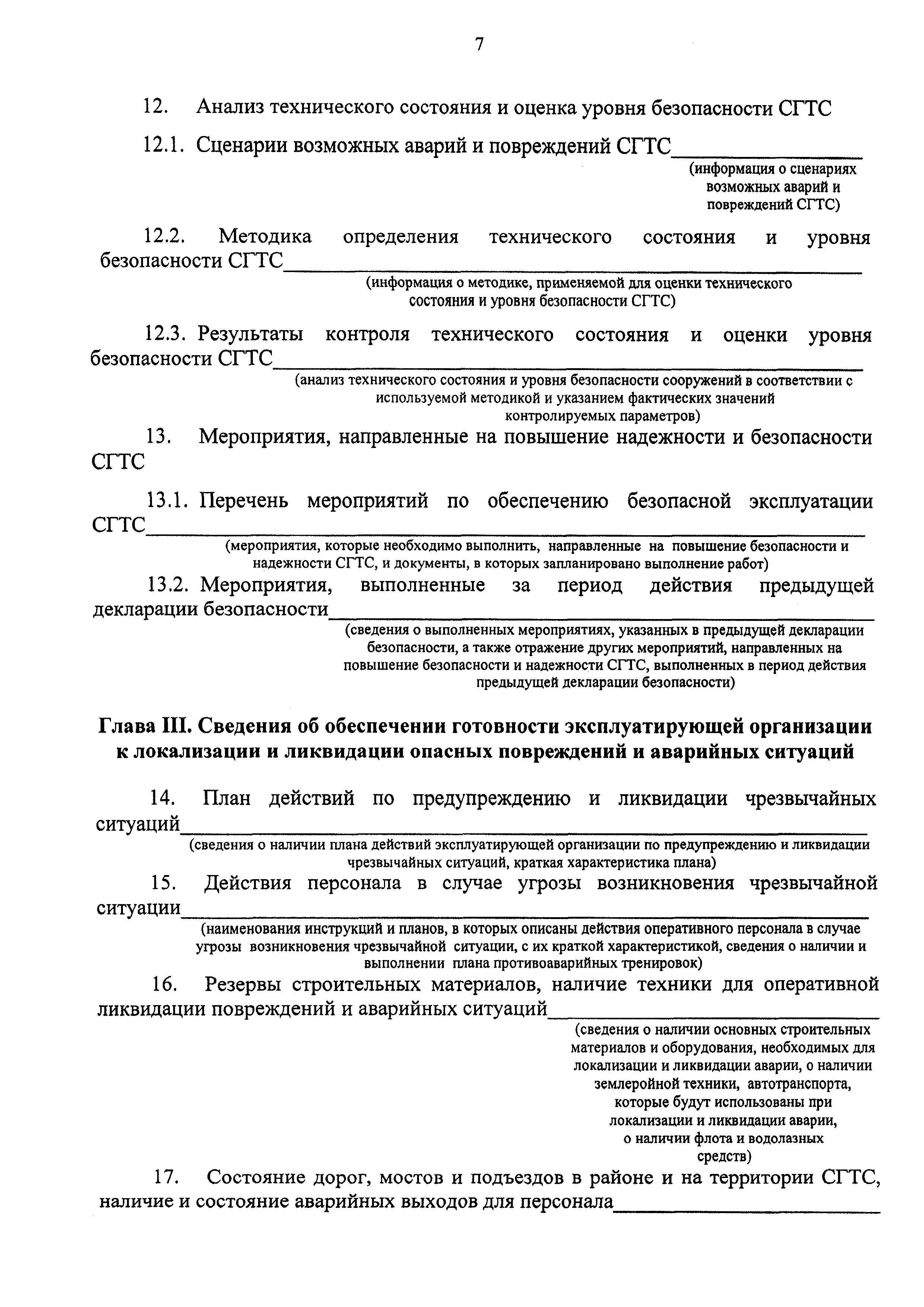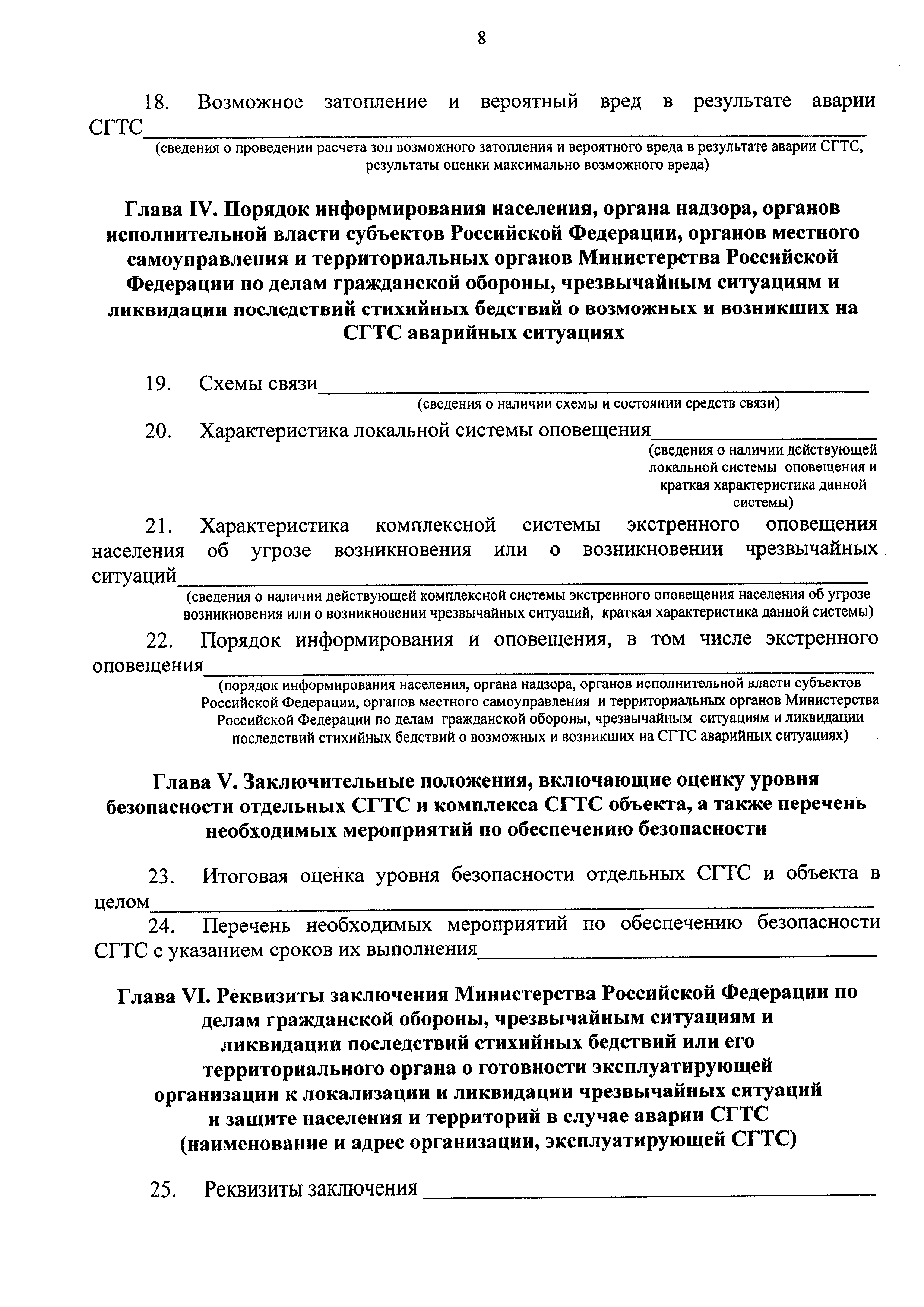 | Оглавление: | Глава I. Общая информация, включающая данные о СГТС и природных условиях района их расположения, мерах по обеспечению безопасности, предусмотренных проектом, правилами эксплуатации и предписаниями органа надзора, сведения о финансовом обеспечении гражданской ответственности за вред, который может быть причинен в результате аварии СТГС, основные сведения о собственнике и эксплуатирующей организации Глава II. Анализ и оценка безопасности СТГС, включая определение возможных источников опасности Глава III. Сведения об обеспечении готовности эксплуатирующей организации к локализации и ликвидации опасных повреждений и аварийных ситуаций Глава IV. Порядок информирования населения, органа надзора, органов исполнительной власти субъектов Российской Федерации, органов местного самоуправления и территориальных органов Министерства Российской Федерации по делам гражданской обороны, чрезвычайным ситуациям и ликвидации последствий стихийных бедствий от возможных и возникших на СТГС аварийных ситуациях Глава V. Заключительные положения, включающие оценку уровня безопасности отдельных СТГС и комплекса СТГС объекта, а также перечень необходимых мероприятий по обеспечению безопасности Глава VI. Реквизиты заключения Министерства Российской Федерации по делам гражданской обороны, чрезвычайным ситуациям и ликвидации последствий стихийных бедствий или его территориального органа о готовности эксплуатирующей организации к локализации и ликвидации чрезвычайных ситуаций и защите населения и территории в случае аварии СТГС (наименование и адрес организации, эксплуатирующей СТГС) Глава VII. Другие данные о безопасности СТГС Глава VIII. Приложения |