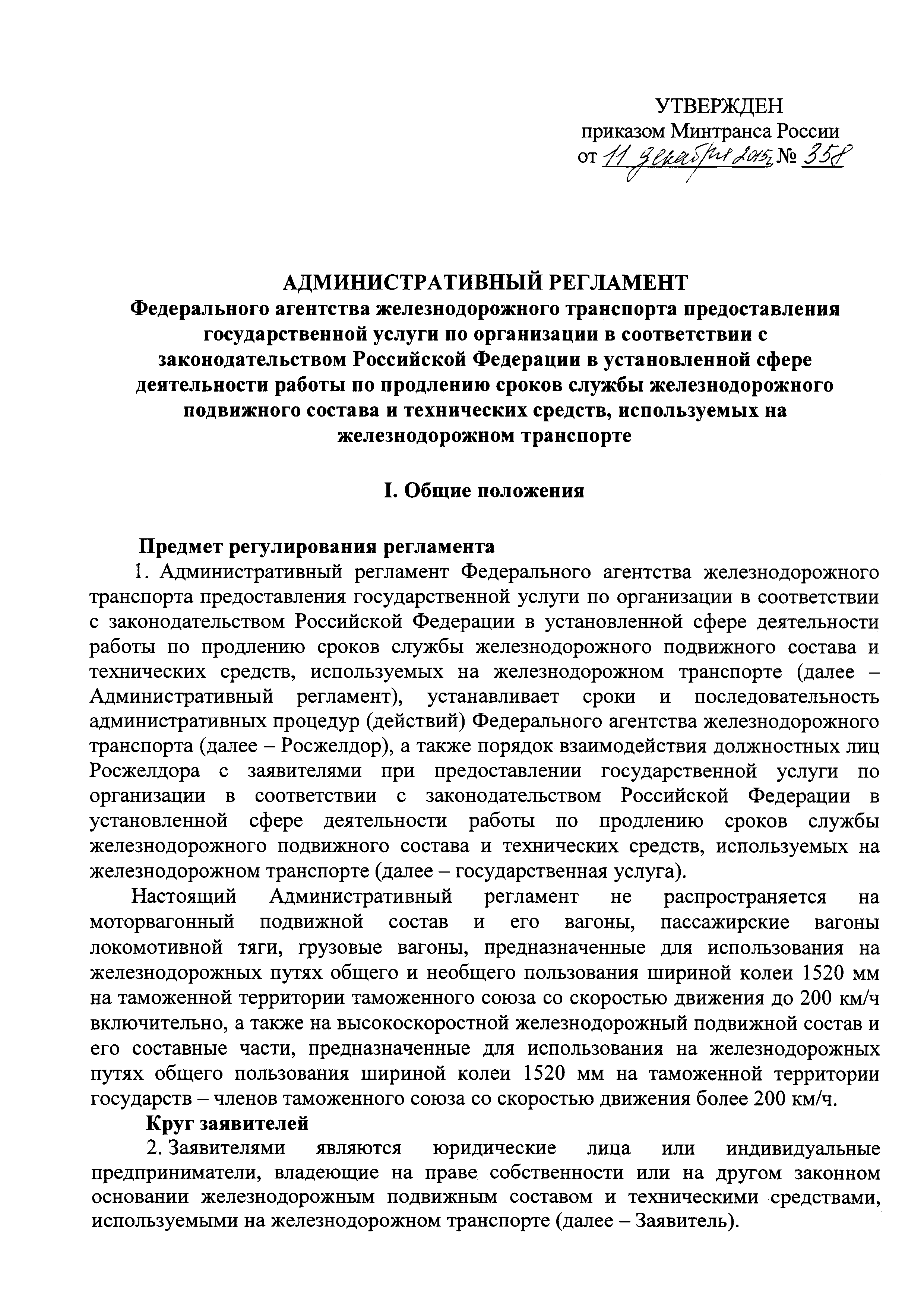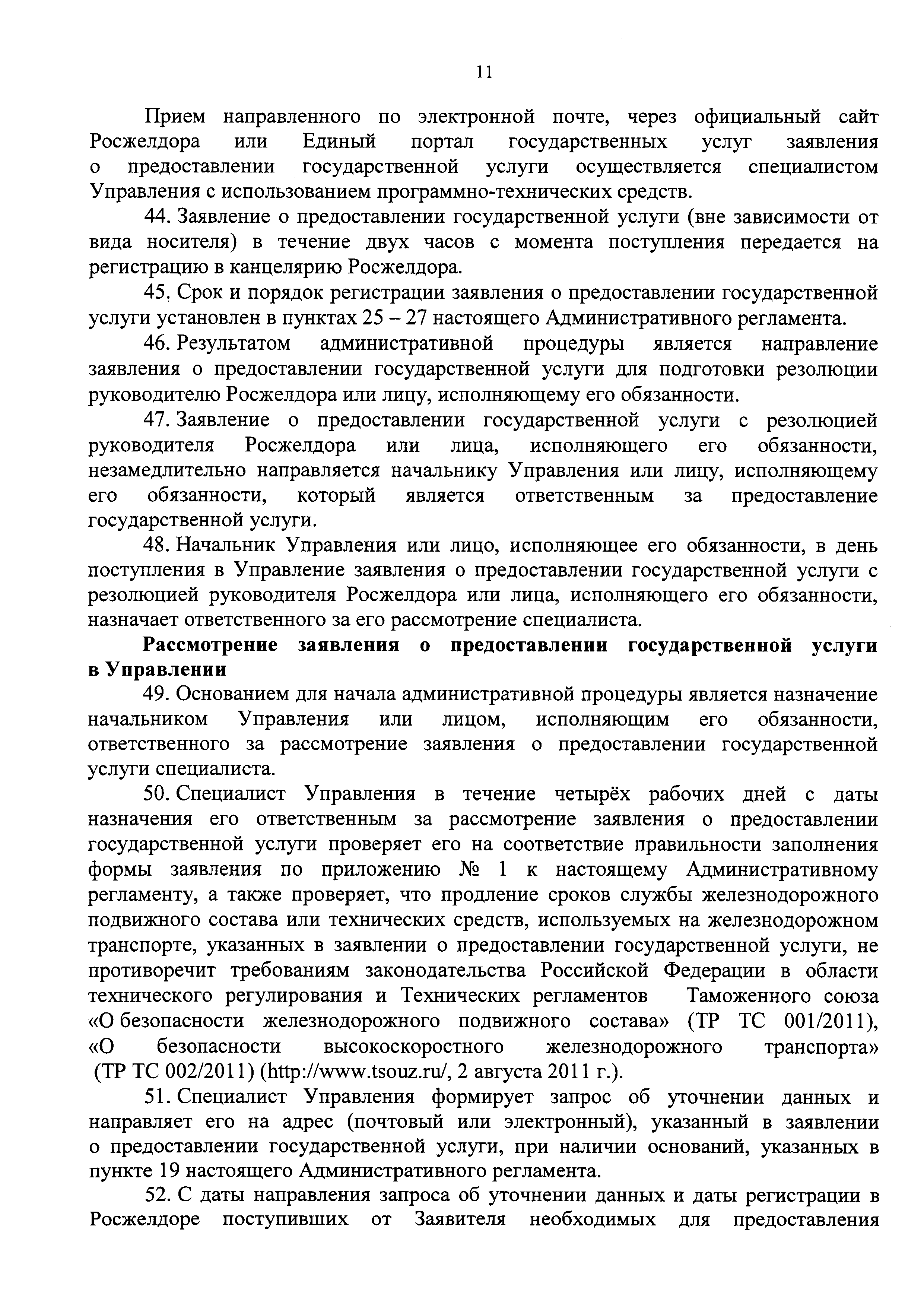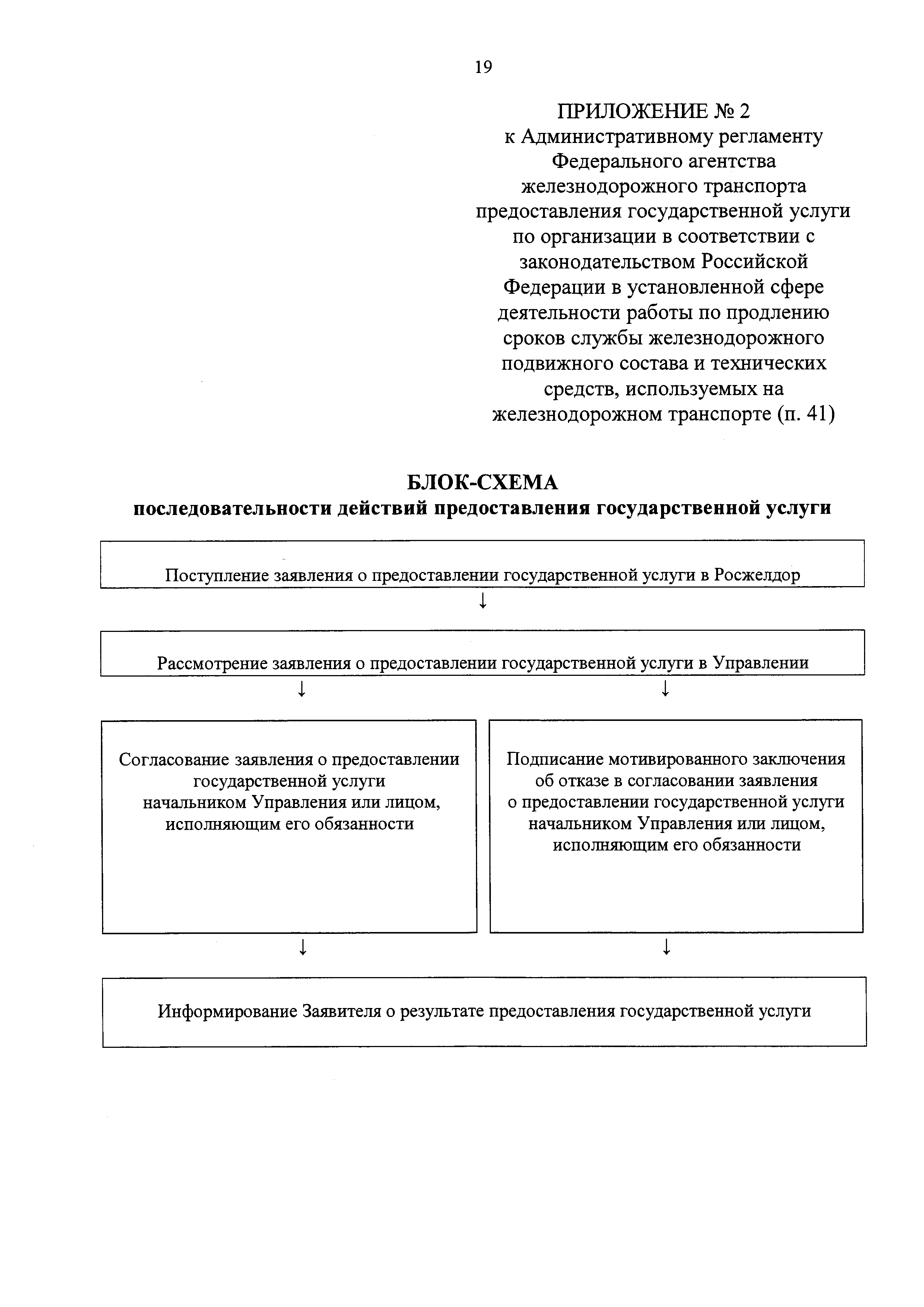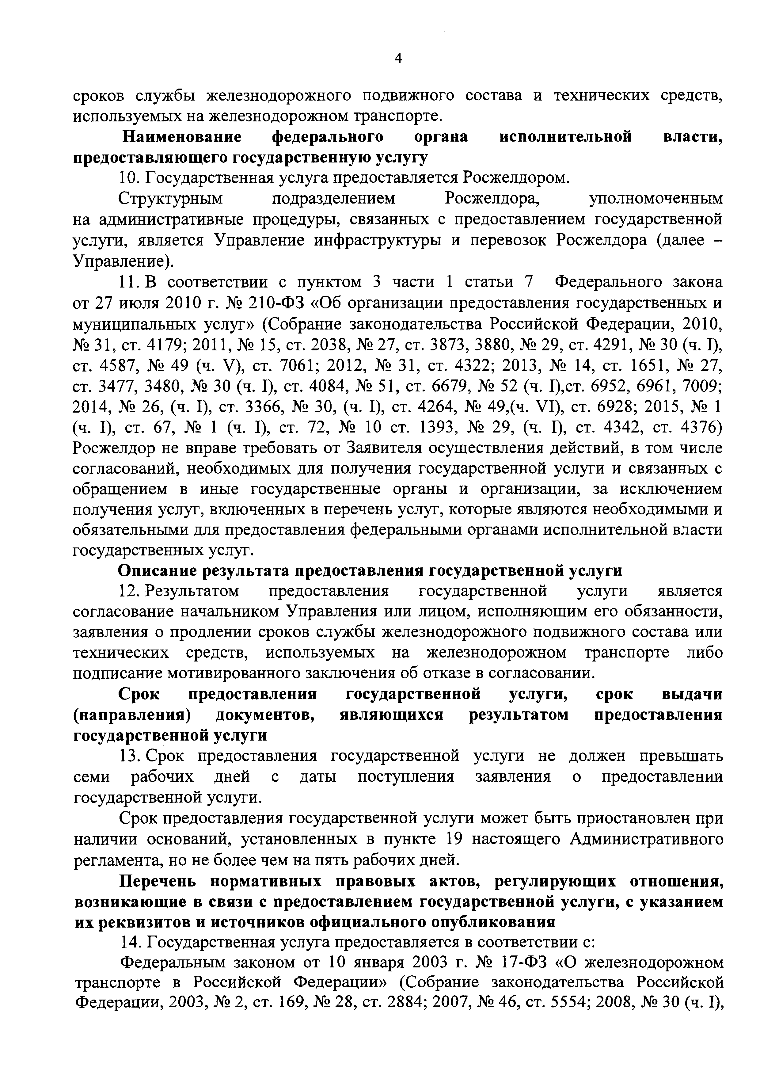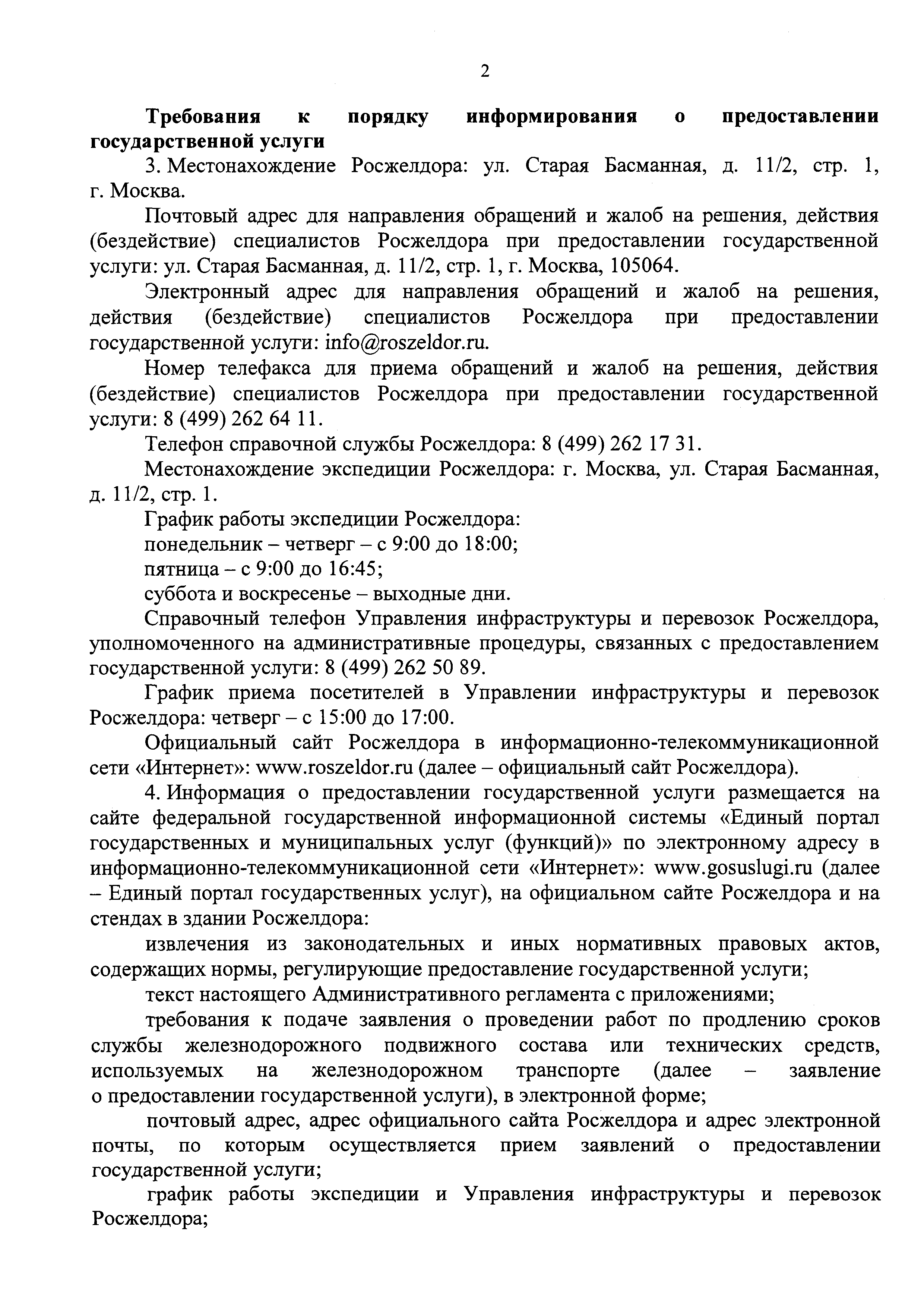 | Оглавление: | I. Общие положения II. Стандарт предоставления государственной услуги III. Состав, последовательность и сроки выполнения административных процедур, требования к порядку их выполнения, в том числе особенности выполнения административных процедур (действий) в электронной форме IV. Формы контроля за предоставлением государственной функции V. Досудебный (внесудебный) порядок обжалования решений и действий (бездействия) Росжелдора, а также специалистов Росжелдора, ответственных за административные процедуры, связанные с предоставлением государственной услуги Приложение № 1. Заявление о продлении сроков службы железнодорожного подвижного состава или технических средств, используемых на железнодорожном транспорте Приложение № 2. Блок-схема последовательности действий предоставления государственной услуги |