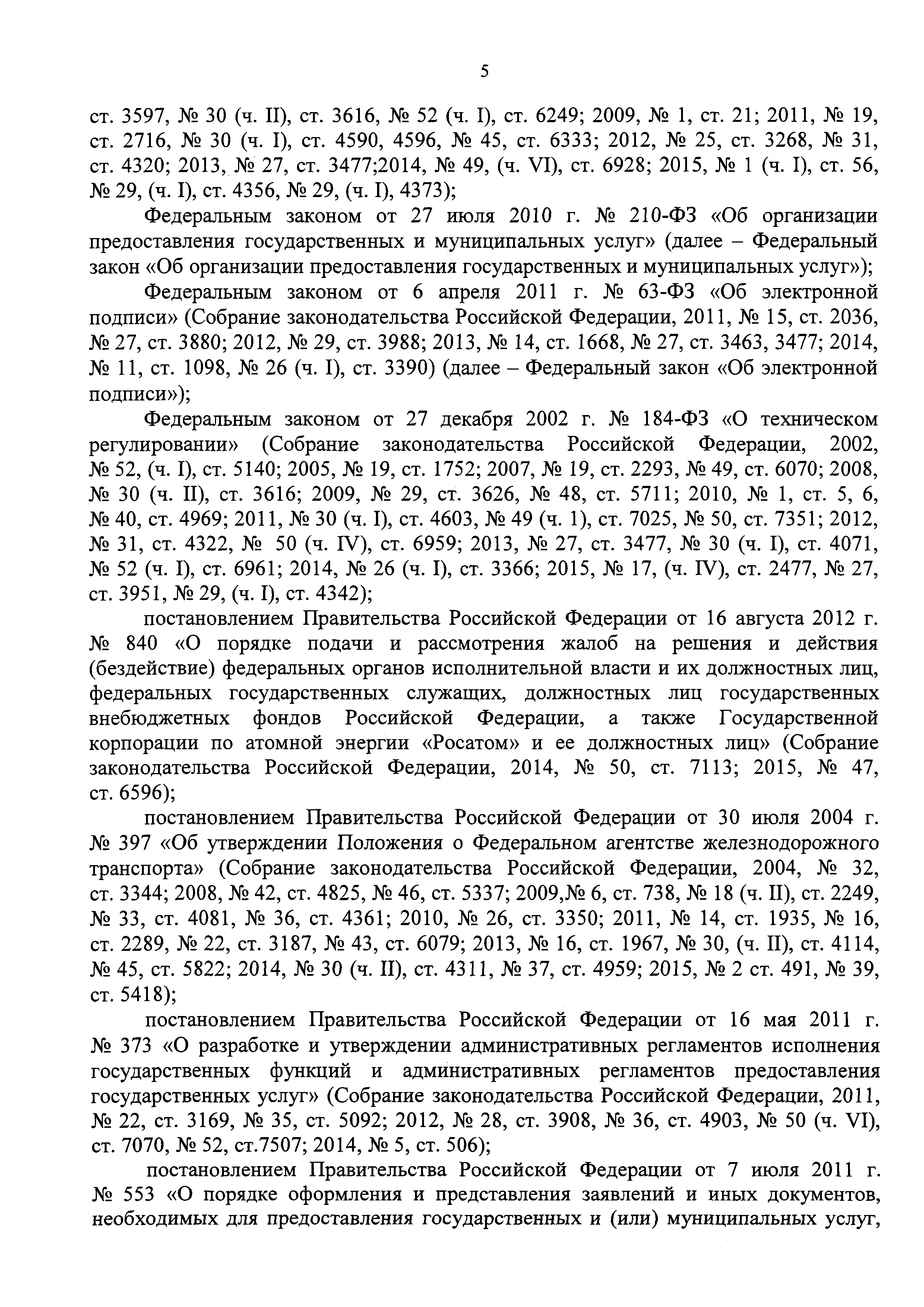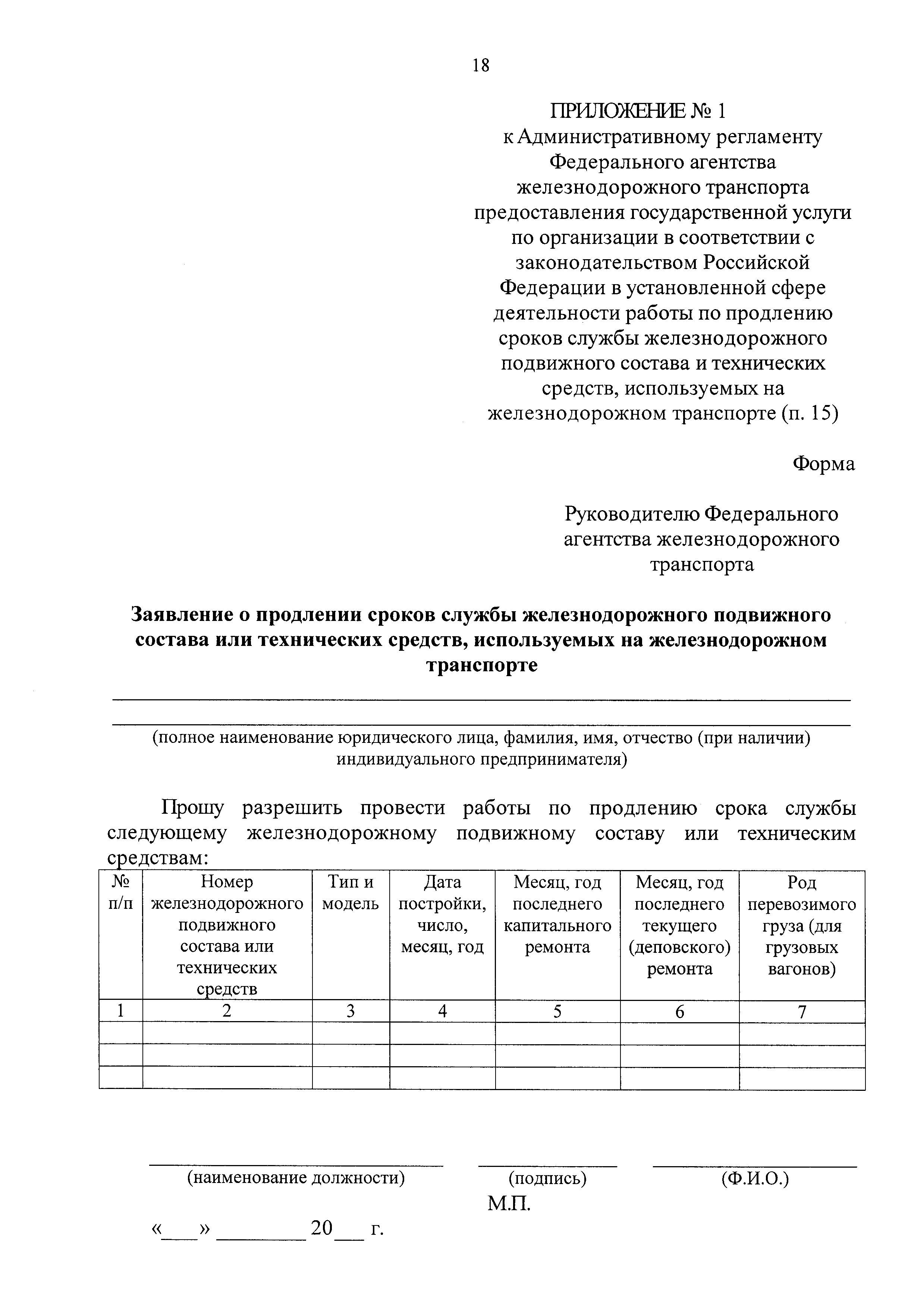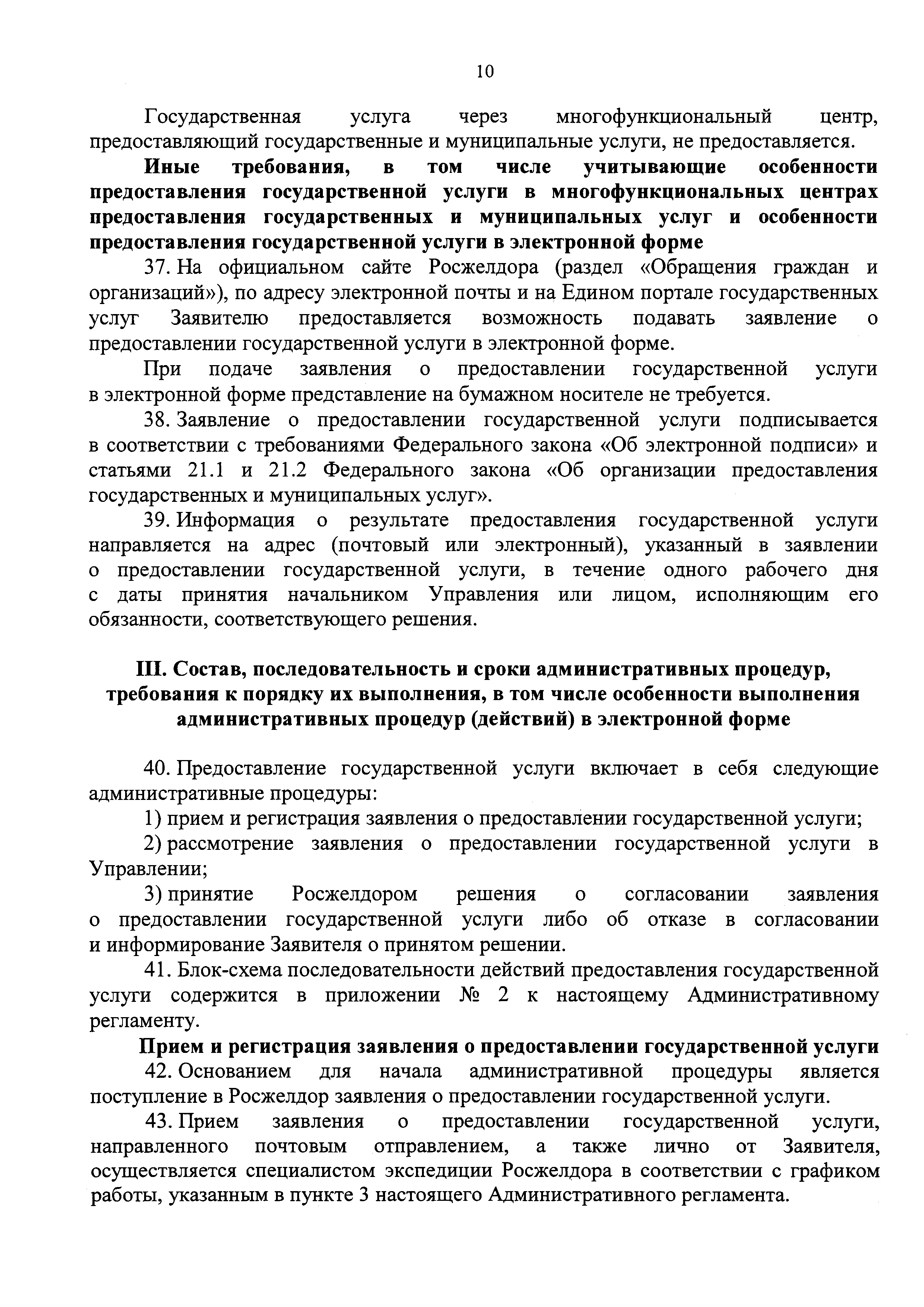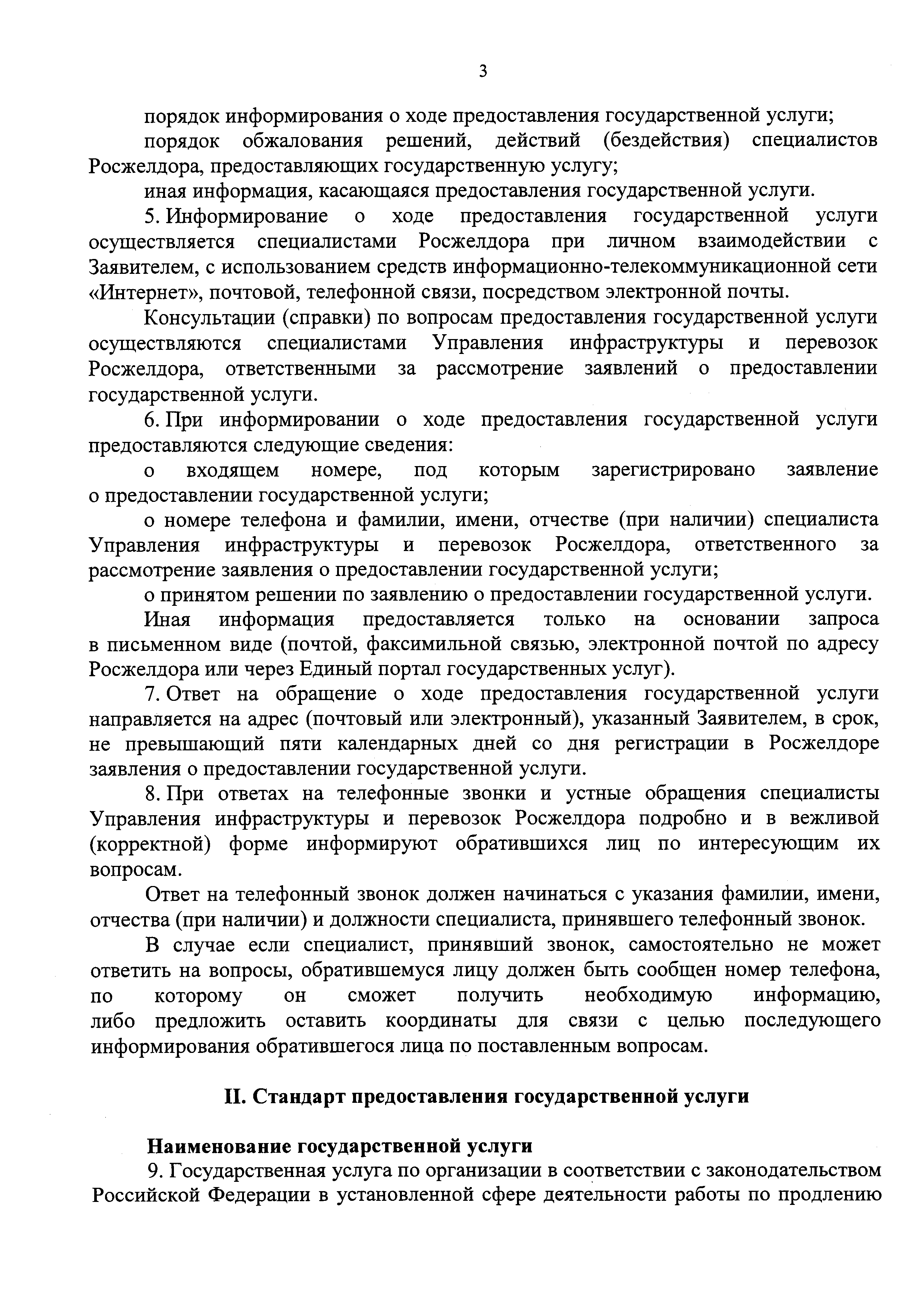 | Оглавление: | I. Общие положения II. Стандарт предоставления государственной услуги III. Состав, последовательность и сроки выполнения административных процедур, требования к порядку их выполнения, в том числе особенности выполнения административных процедур (действий) в электронной форме IV. Формы контроля за предоставлением государственной функции V. Досудебный (внесудебный) порядок обжалования решений и действий (бездействия) Росжелдора, а также специалистов Росжелдора, ответственных за административные процедуры, связанные с предоставлением государственной услуги Приложение № 1. Заявление о продлении сроков службы железнодорожного подвижного состава или технических средств, используемых на железнодорожном транспорте Приложение № 2. Блок-схема последовательности действий предоставления государственной услуги |