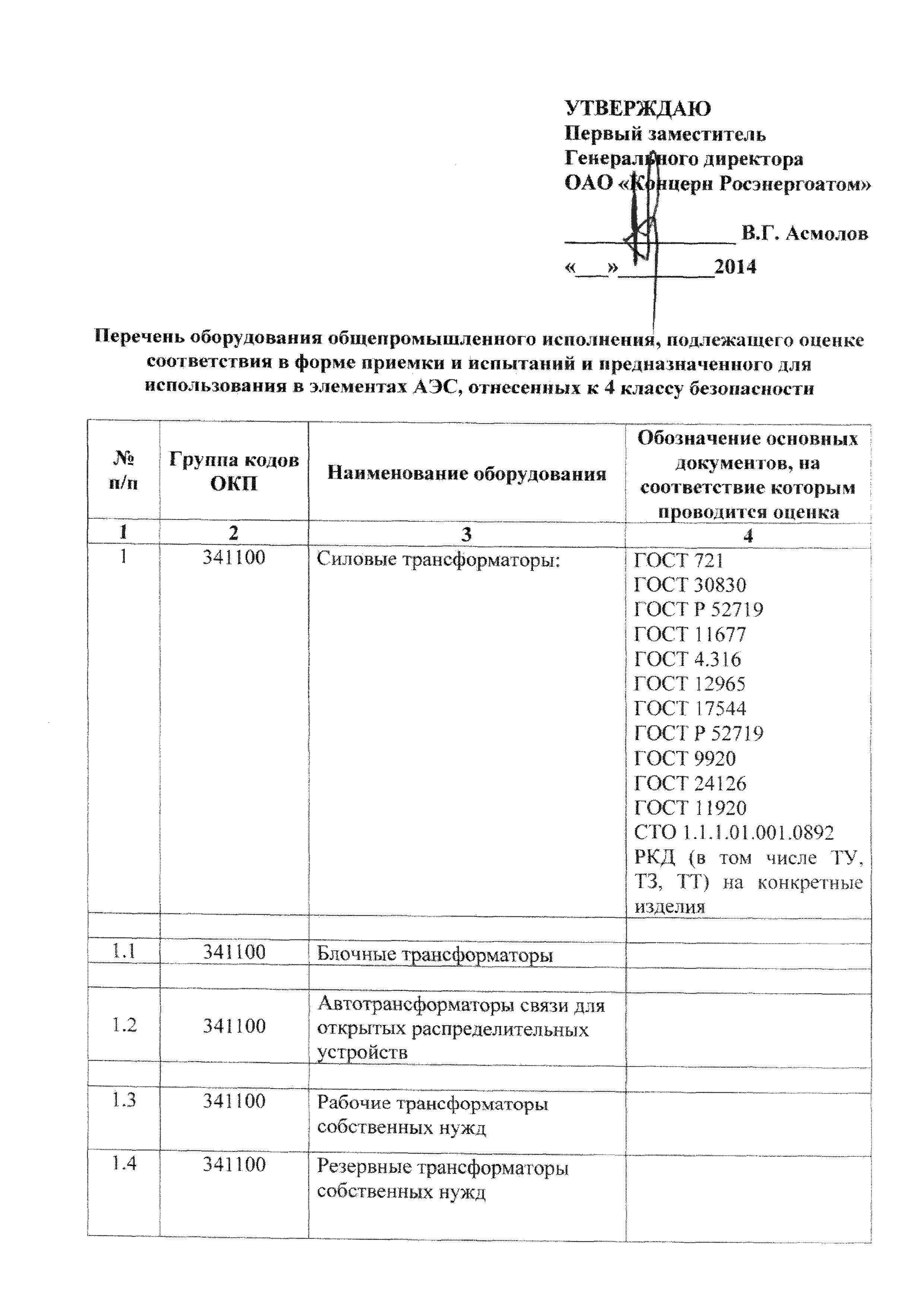 Скачать Перечень оборудования общепромышленного исполнения, подлежащего оценке соответствия в форме приемки и испытаний и предназначенного для использования в элементах АЭС, отнесенных к 4 классу безопасности