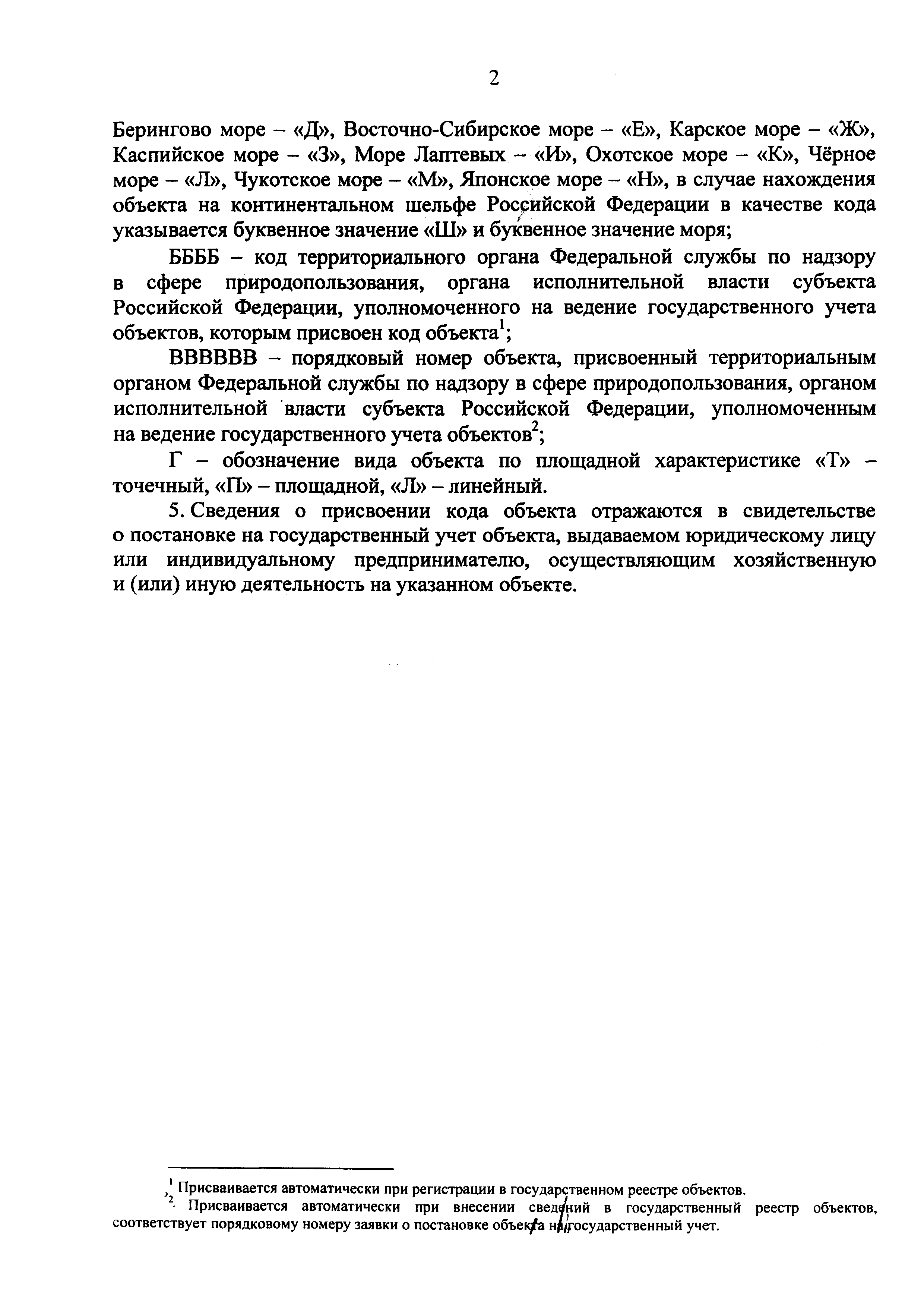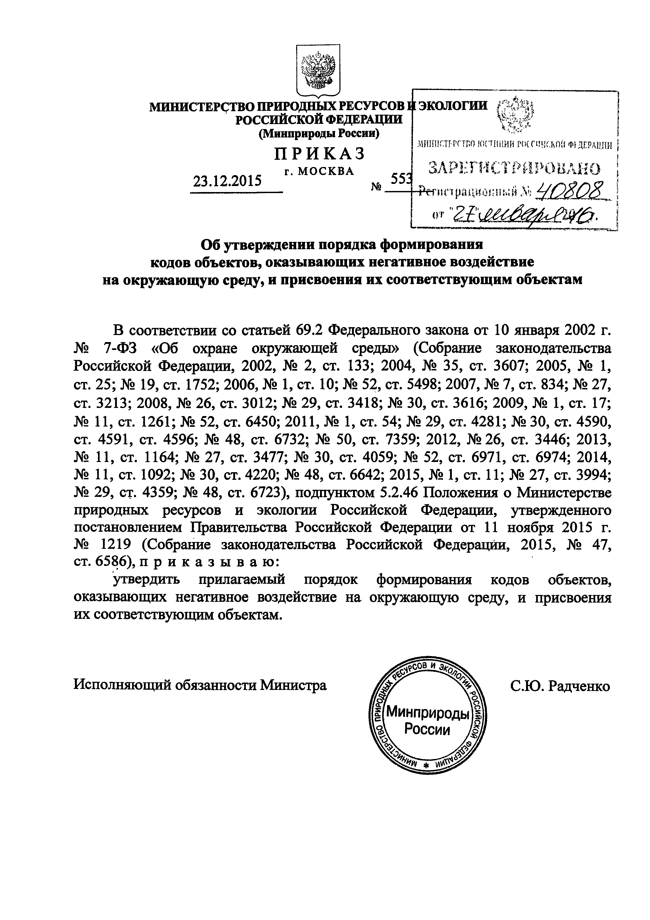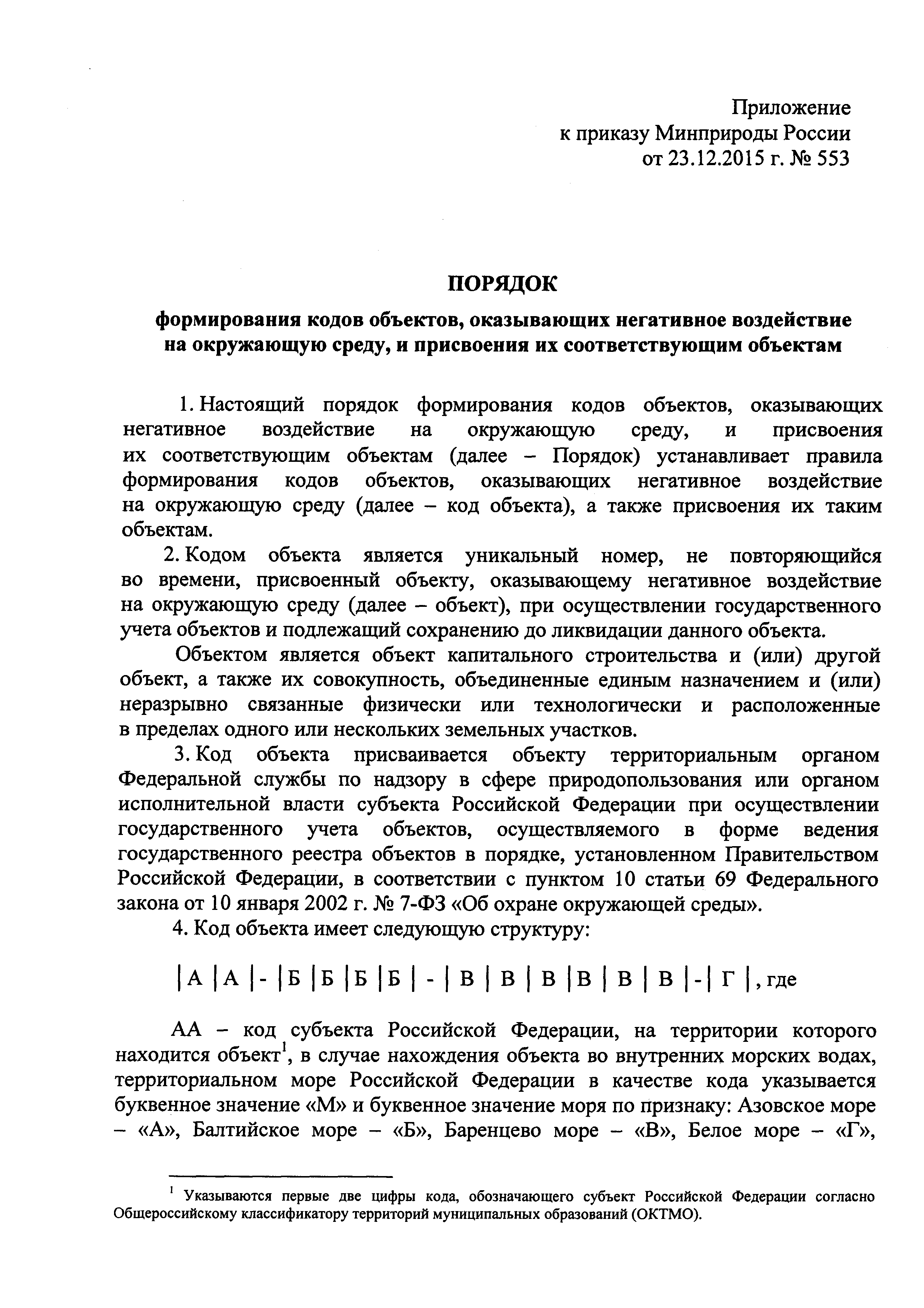 Порядок формирования кодов объектов, оказывающих негативное воздействие на окружающую среду, и присвоения их соответствующим объектам| Статус: | действует | | Название рус.: | Порядок формирования кодов объектов, оказывающих негативное воздействие на окружающую среду, и присвоения их соответствующим объектам | | Дата добавления в базу: | 01.02.2017 | | Дата актуализации: | 01.01.2021 | | Дата введения: | 12.02.2016 | | Область применения: | Порядок формирования кодов объектов, оказывающих негативное воздействие на окружающую среду, и присвоения их соответствующим объектам устанавливает правила формирования кодов объектов, оказывающих негативное воздействие на окружающую среду, а также присвоения их таким объектам | | Утверждён: | 23.12.2015 Министерство природных ресурсов и экологии Российской Федерации (553)