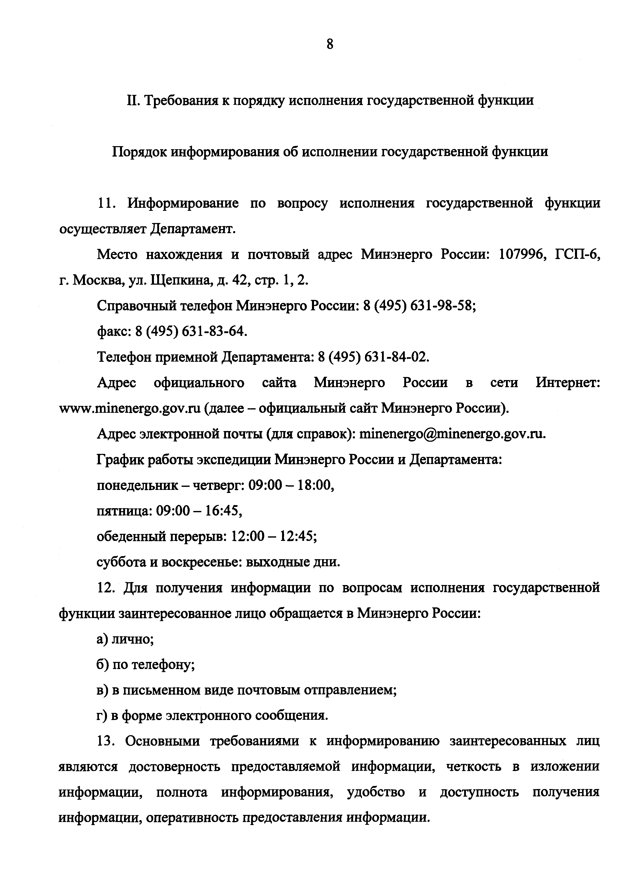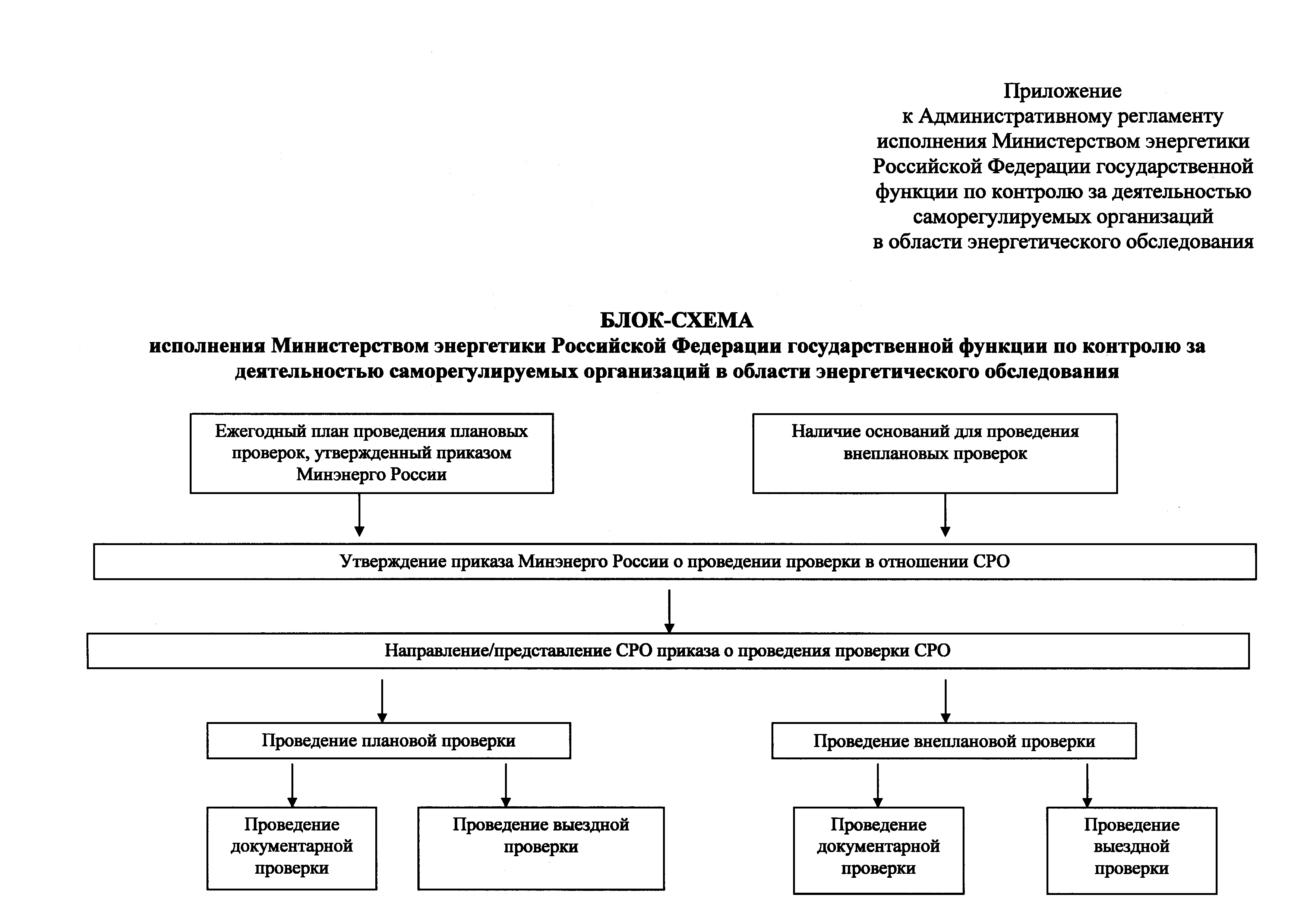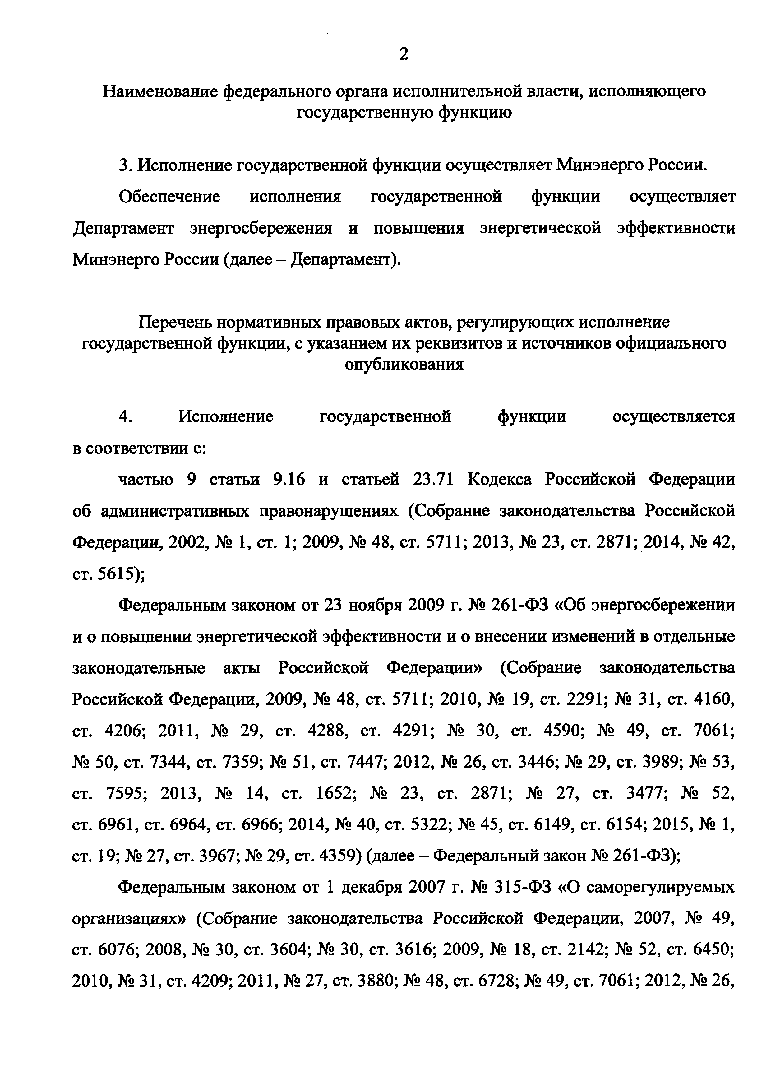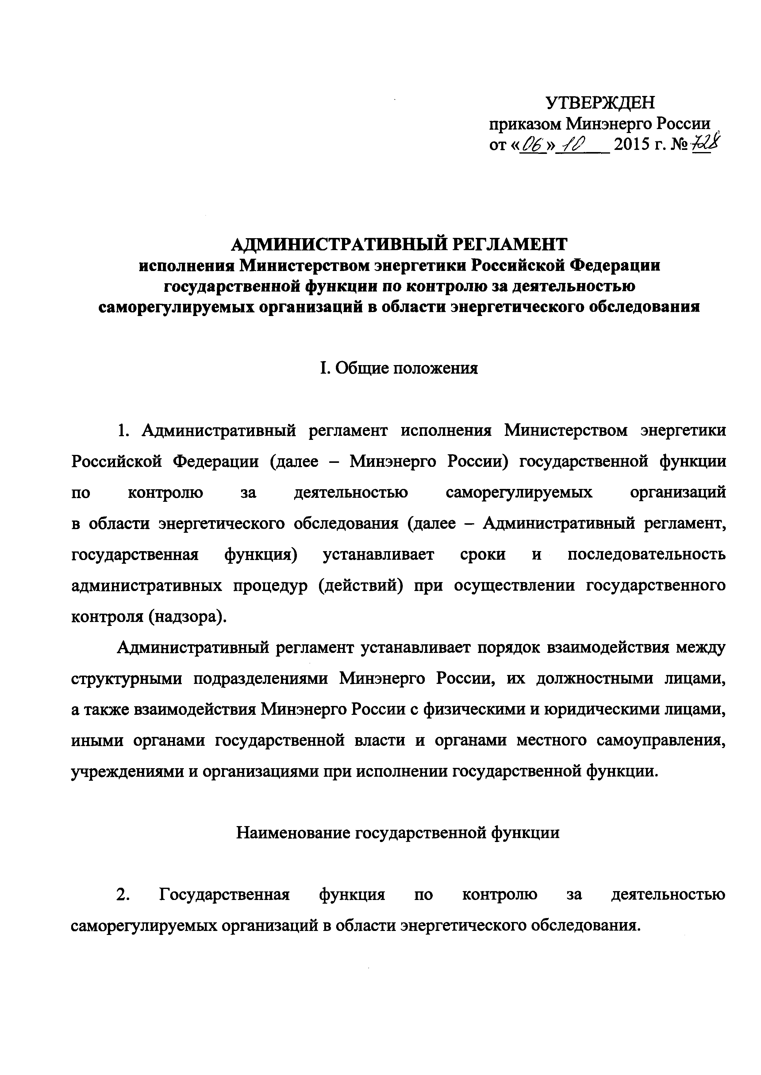 | Оглавление: | I. Общие положения II. Требования к порядку исполнения государственной функции III. Состав, последовательность и сроки выполнения административных процедур (действий), требования к порядку их выполнения IV. Порядок и формы контроля за исполнением государственной функции V. Досудебный (внесудебный) порядок обжалования решений и действий (бездействия) и решений, принятых (осуществляемых) в ходе исполнения государственной функции Приложение. Блок-схема исполнения Министерством энергетики Российской Федерации государственной функции по контролю за деятельностью саморегулируемых организаций в области энергетического обследования |