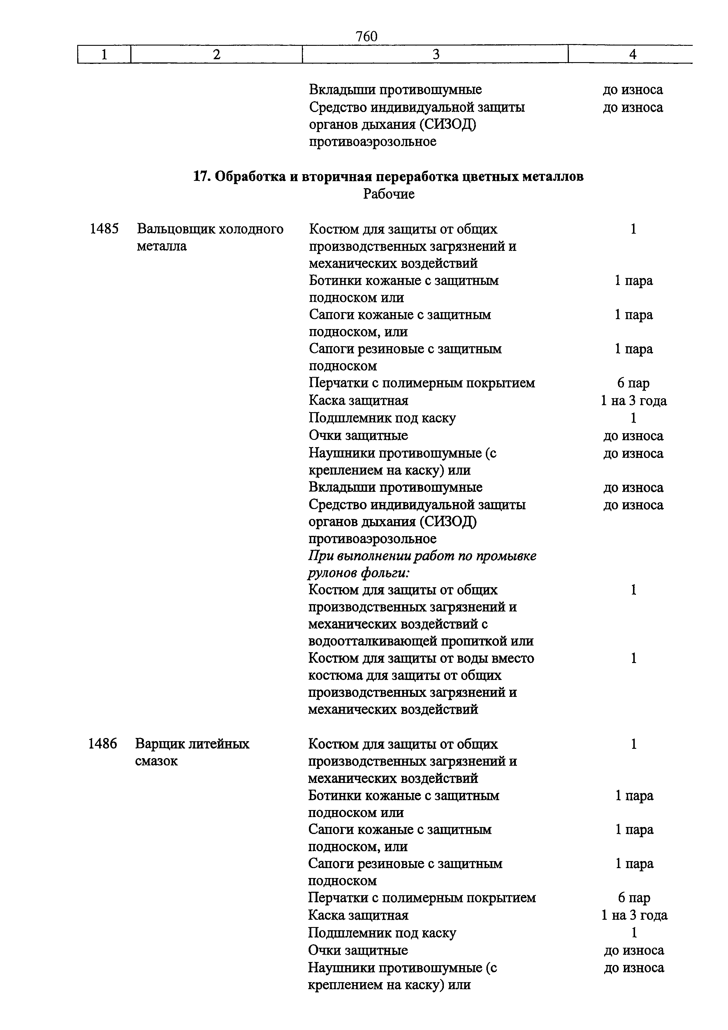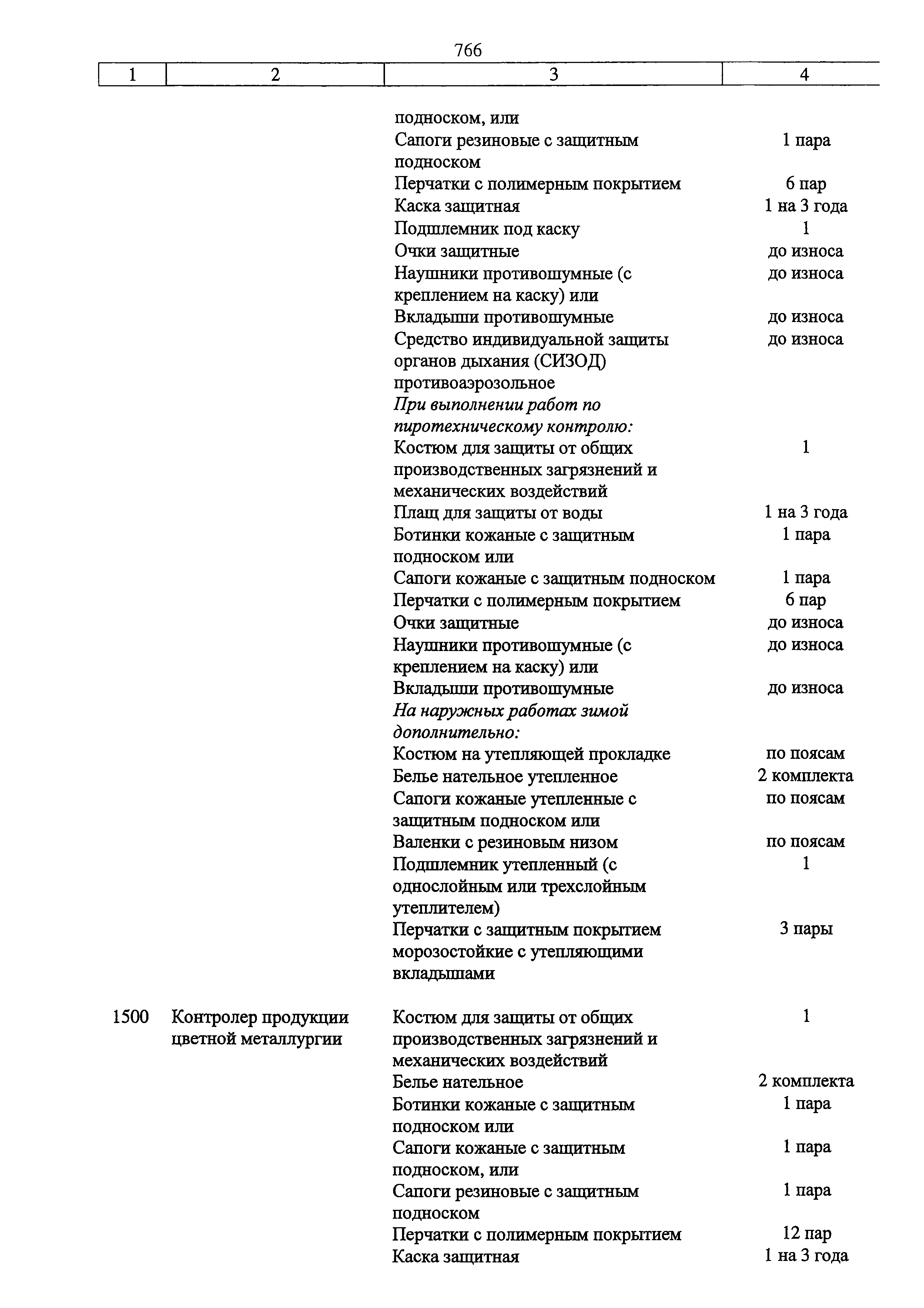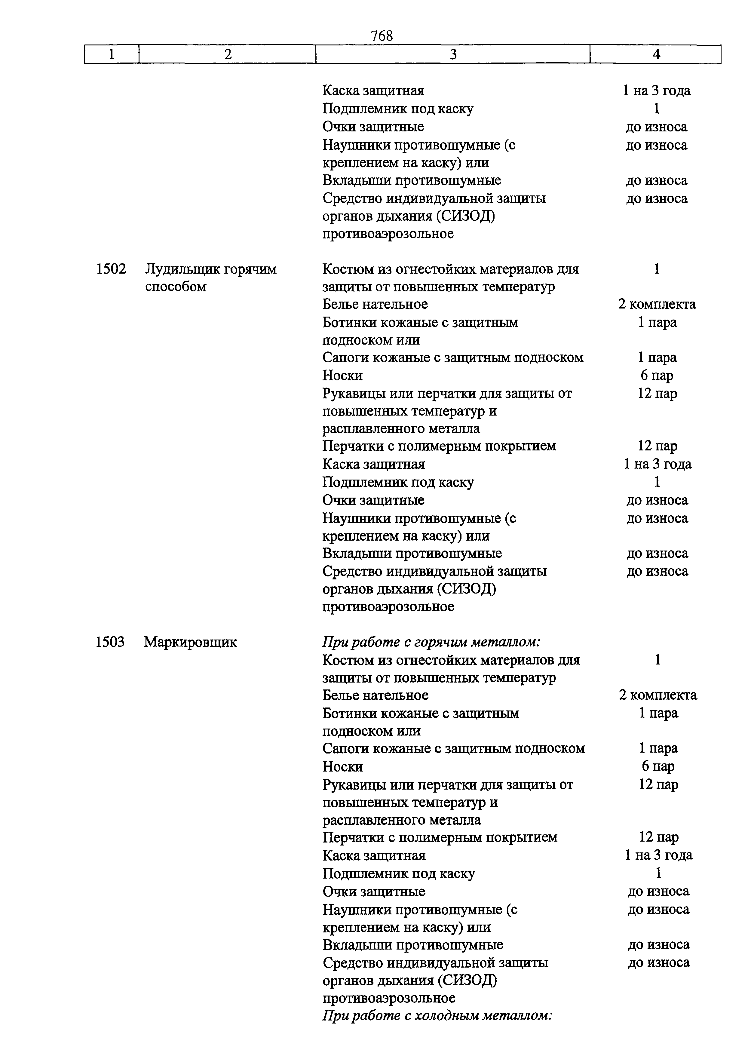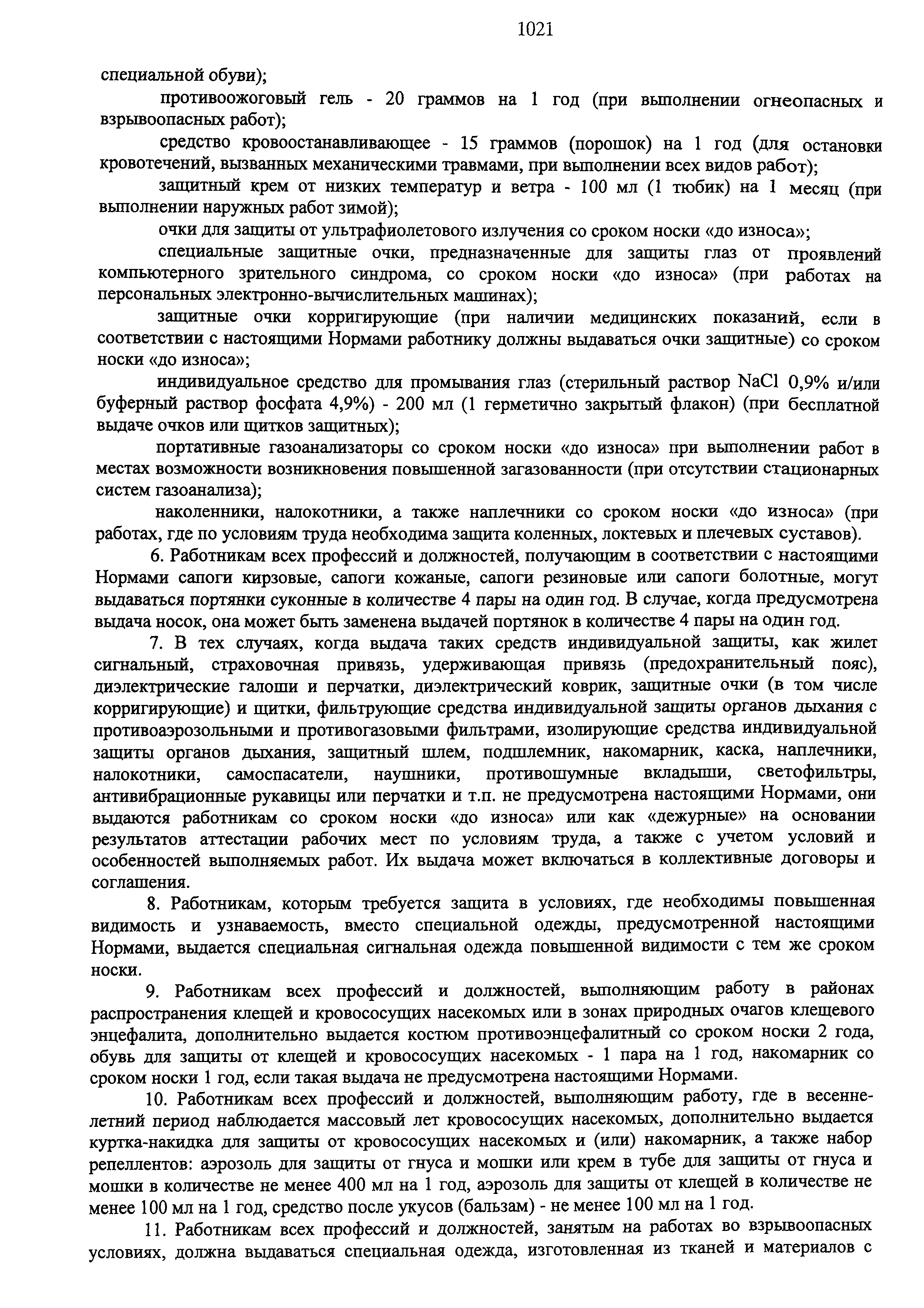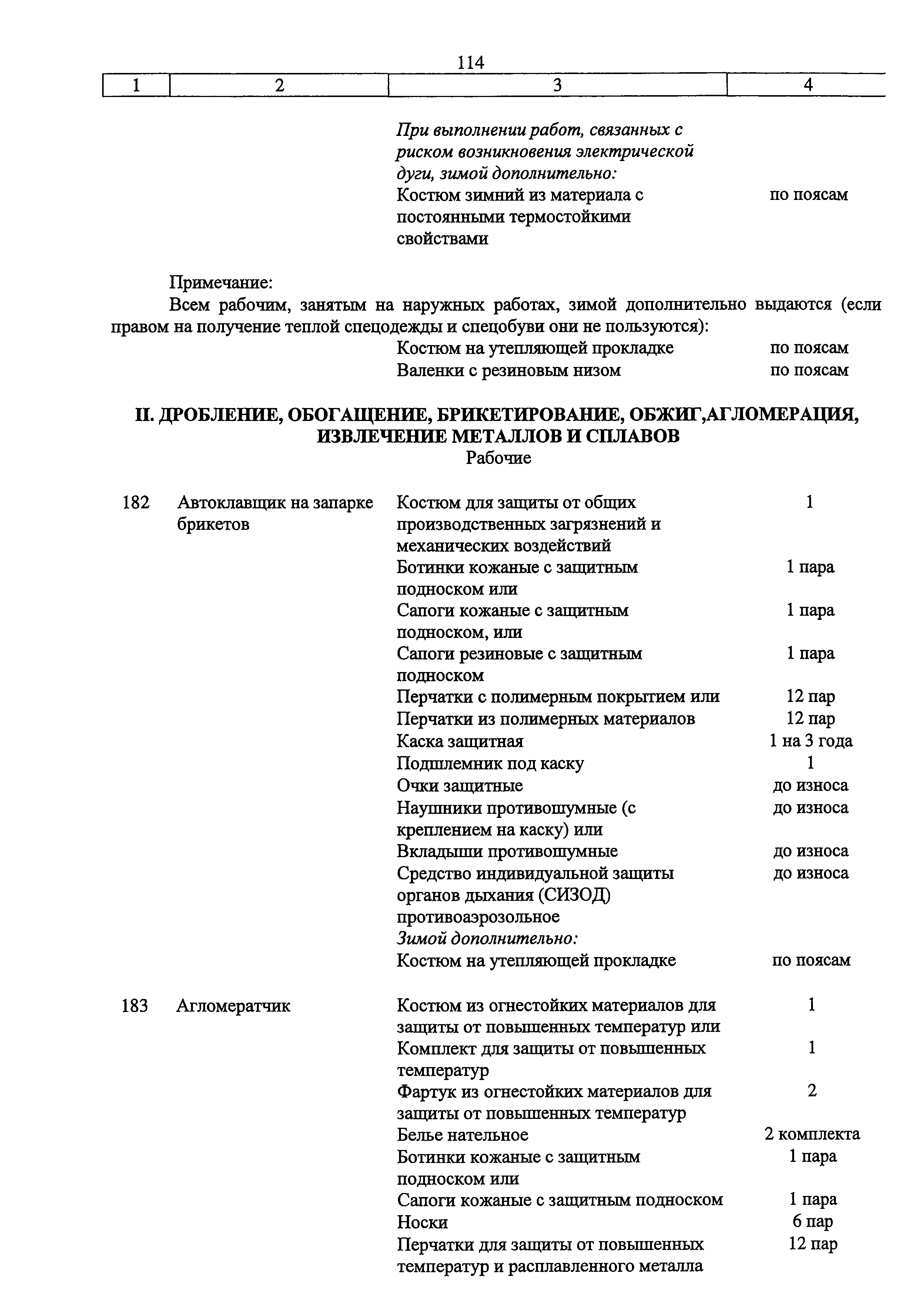 Типовые нормы бесплатной выдачи специальной одежды, специальной обуви и других средств индивидуальной защиты работникам горной и металлургической промышленности и металлургических производств других отраслей промышленности, занятым на работах с вредными и (или) опасными условиями труда, а также на работах, выполняемых в особых температурных условиях или связанных с загрязнением| Статус: | действует | | Название рус.: | Типовые нормы бесплатной выдачи специальной одежды, специальной обуви и других средств индивидуальной защиты работникам горной и металлургической промышленности и металлургических производств других отраслей промышленности, занятым на работах с вредными и (или) опасными условиями труда, а также на работах, выполняемых в особых температурных условиях или связанных с загрязнением | | Дата добавления в базу: | 01.02.2017 | | Дата актуализации: | 01.01.2021 | | Дата введения: | 14.02.2014 | | Область применения: | Нормы утверждаются локальными нормативными актами работодателя на основании результатов аттестации рабочих мест по условиям труда и могут быть включены в коллективный и (или) трудовой договор с указанием типовых норм, по сравнению с которыми улучшается обеспечение работников специальной одеждой, специальной обувью и другими средствами индивидуальной защиты. | | Оглавление: | I Горнодобывающая промышленность 1 Подземные горные работы (шахты) 2 Открытые горные работы и шахтная поверхность 3 Работа на гидравлических установках или с промывочными приборами 4 Дражные работы II Дробление, обогащение, брикетирование, обжиг, агломерация, извлечение металлов и сплавов III Черная металлургия 1 Коксохимическое производство 1.1 Углеподготовительные цеха 1.2 Углеобогатительные цеха 1.3 Производство каменноугольного кокса 1.4 Производство кристаллического нафталина, кумароновой смолы, смолоперерабатывающие цеха 1.5 Производство пиридиновых и фенольно-крезольных продуктов 1.6 Цеха улавливания химических продуктов и газовые цеха 1.7 Цеха ректификации сырого бензола 1.8 Цеха очистки коксового газа от сероводорода 1.9 Производство пекового кокса 1.10 Производство термоантрацита 2 Доменное производство 3 Сталеплавильное производство 3.1 Установки непрерывной разливки стали 4 Производство ферросплавов 4.1 Электролитическое производство 4.2 Производство электролитического хрома 4.3 Производство феррованадия 4.4 Подготовка шихты, обжиг руд и концентратов 4.5 Разливка и разделка ферросплавов 4.6 Обжиг извести 4.7 Общие профессии и должности ферросплавного производства 5 Прокатное производство 6 Производство труб (прокатка, сварка и волочение) 7 Колесопрокатное и бандажное производства 8 Валопрокатное производство 9 Производство рельсовых скреплений 10 Производство баллонов 11 Труболитейное производство 12 Производство метизов 12.1 Производство металлических канатов, сеток, пружин и пружинной ленты, щеток, цепей, колючей проволоки и других метизов 12.2 Волочение проволоки, калибровка и шлифовка металла 12.3 Изготовление волок 12.4 Холодноштамповочные и кузнечно-прессовые работы 12.5 Термическая обработка 12.6 Травление металла, защитные покрытия проволоки и извлечение железного купороса 12.7 Производство металлических электродов и порошковой проволоки 13 Производство огнеупоров 13.1 Огнеупоры 13.2 Карборундовые стержни 13.3 Высокоогнеупорные окислы 14 Ремонт 