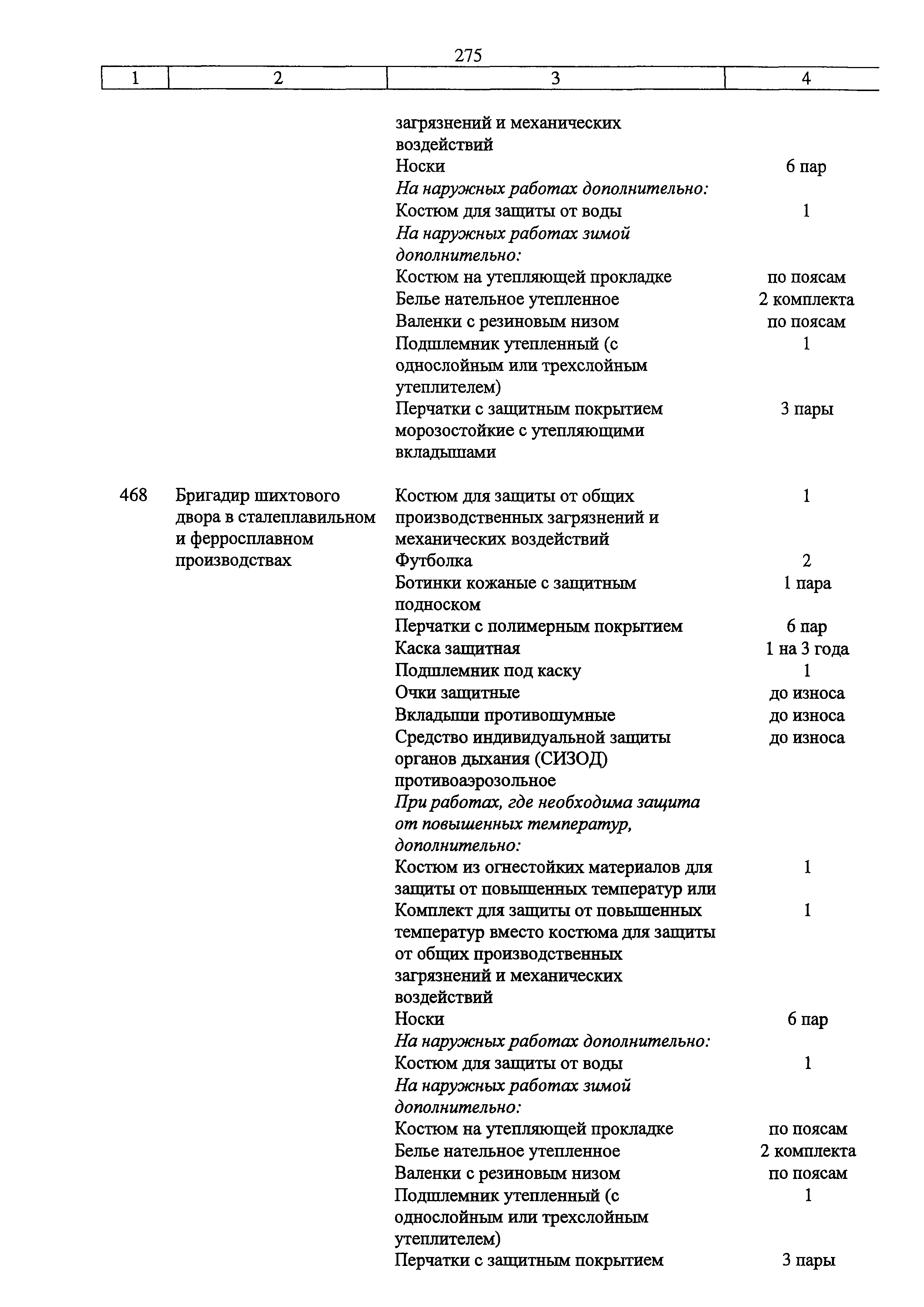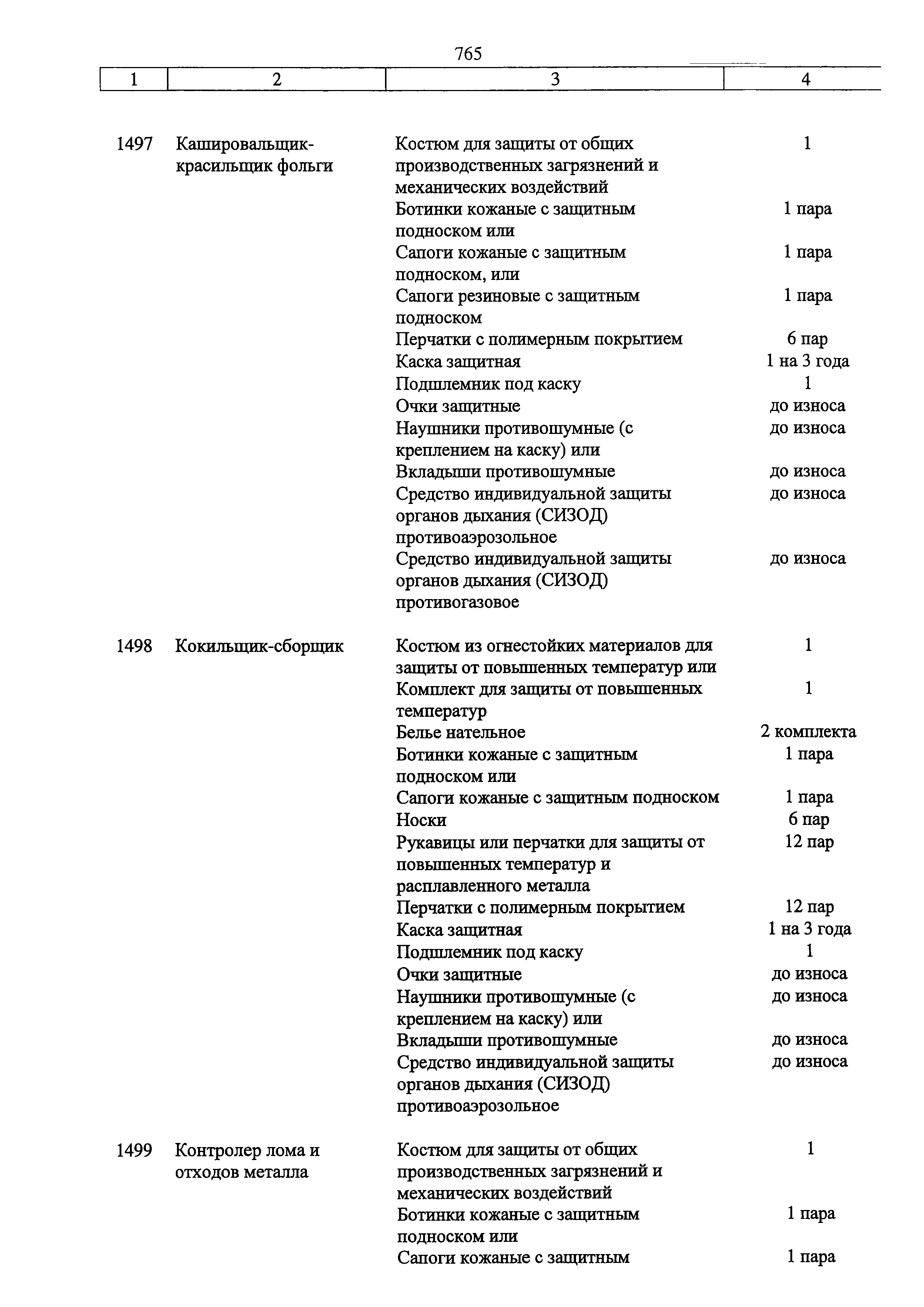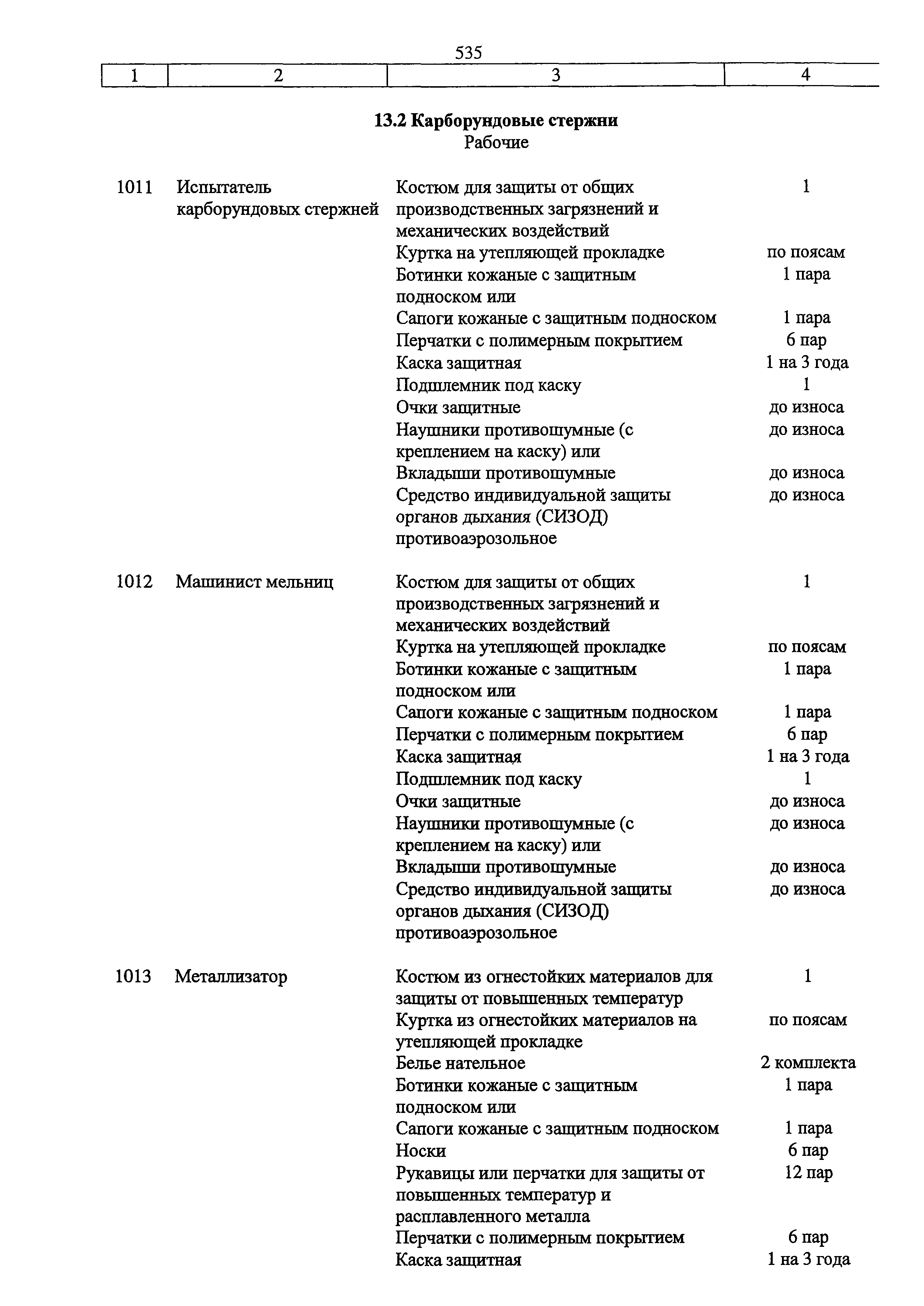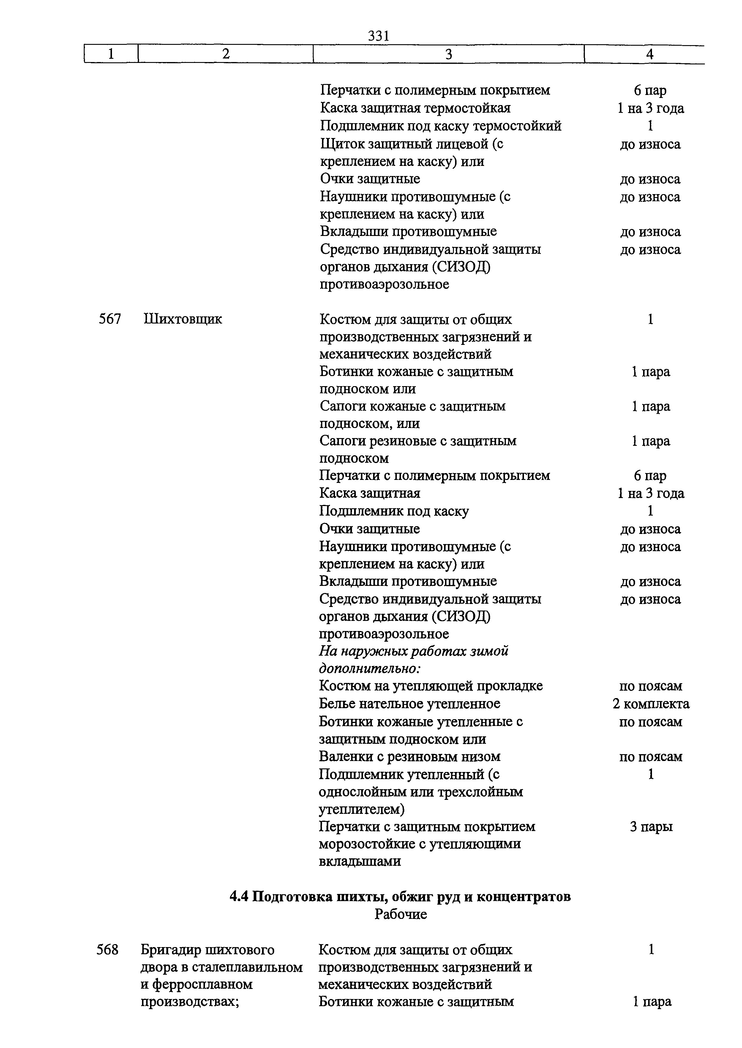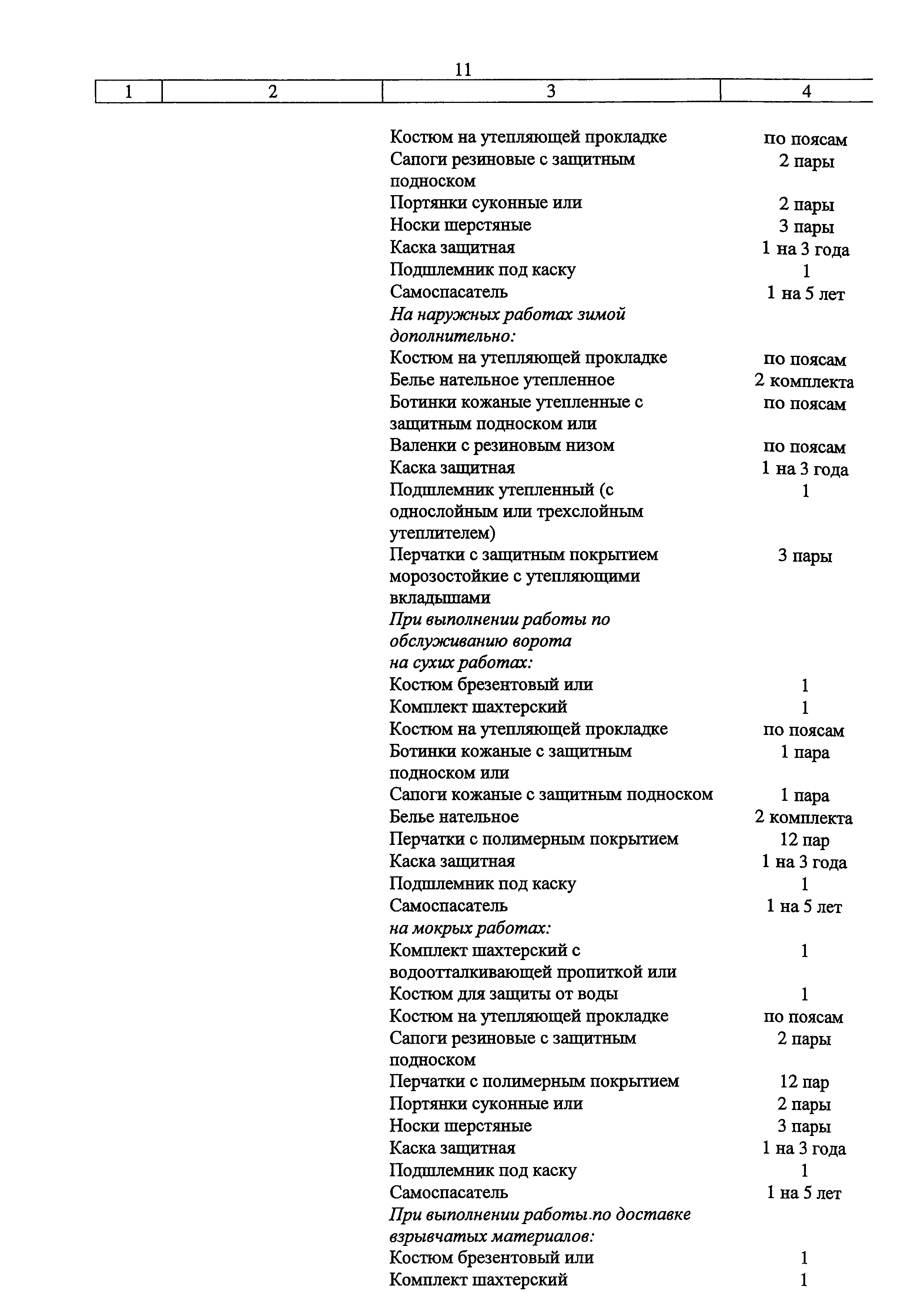 Типовые нормы бесплатной выдачи специальной одежды, специальной обуви и других средств индивидуальной защиты работникам горной и металлургической промышленности и металлургических производств других отраслей промышленности, занятым на работах с вредными и (или) опасными условиями труда, а также на работах, выполняемых в особых температурных условиях или связанных с загрязнением| Статус: | действует | | Название рус.: | Типовые нормы бесплатной выдачи специальной одежды, специальной обуви и других средств индивидуальной защиты работникам горной и металлургической промышленности и металлургических производств других отраслей промышленности, занятым на работах с вредными и (или) опасными условиями труда, а также на работах, выполняемых в особых температурных условиях или связанных с загрязнением | | Дата добавления в базу: | 01.02.2017 | | Дата актуализации: | 01.01.2021 | | Дата введения: | 14.02.2014 | | Область применения: | Нормы утверждаются локальными нормативными актами работодателя на основании результатов аттестации рабочих мест по условиям труда и могут быть включены в коллективный и (или) трудовой договор с указанием типовых норм, по сравнению с которыми улучшается обеспечение работников специальной одеждой, специальной обувью и другими средствами индивидуальной защиты. | | Оглавление: | I Горнодобывающая промышленность 1 Подземные горные работы (шахты) 2 Открытые горные работы и шахтная поверхность 3 Работа на гидравлических установках или с промывочными приборами 4 Дражные работы II Дробление, обогащение, брикетирование, обжиг, агломерация, извлечение металлов и сплавов III Черная металлургия 1 Коксохимическое производство 1.1 Углеподготовительные цеха 1.2 Углеобогатительные цеха 1.3 Производство каменноугольного кокса 1.4 Производство кристаллического нафталина, кумароновой смолы, смолоперерабатывающие цеха 1.5 Производство пиридиновых и фенольно-крезольных продуктов 1.6 Цеха улавливания химических продуктов и газовые цеха 1.7 Цеха ректификации сырого бензола 1.8 Цеха очистки коксового газа от сероводорода 1.9 Производство пекового кокса 1.10 Производство термоантрацита 2 Доменное производство 3 Сталеплавильное производство 3.1 Установки непрерывной разливки стали 4 Производство ферросплавов 4.1 Электролитическое производство 4.2 Производство электролитического хрома 4.3 Производство феррованадия 4.4 Подготовка шихты, обжиг руд и концентратов 4.5 Разливка и разделка ферросплавов 4.6 Обжиг извести 4.7 Общие профессии и должности ферросплавного производства 5 Прокатное производство 6 Производство труб (прокатка, сварка и волочение) 7 Колесопрокатное и бандажное производства 8 Валопрокатное производство 9 Производство рельсовых скреплений 10 Производство баллонов 11 Труболитейное производство 12 Производство метизов 12.1 Производство металлических канатов, сеток, пружин и пружинной ленты, щеток, цепей, колючей проволоки и других метизов 12.2 Волочение проволоки, калибровка и шлифовка металла 12.3 Изготовление волок 12.4 Холодноштамповочные и кузнечно-прессовые работы 12.5 Термическая обработка 12.6 Травление металла, защитные покрытия проволоки и извлечение железного купороса 12.7 Производство металлических электродов и порошковой проволоки 13 Производство огнеупоров 13.1 Огнеупоры 13.2 Карборундовые стержни 13.3 Высокоогнеупорные окислы 14 Ремонт 