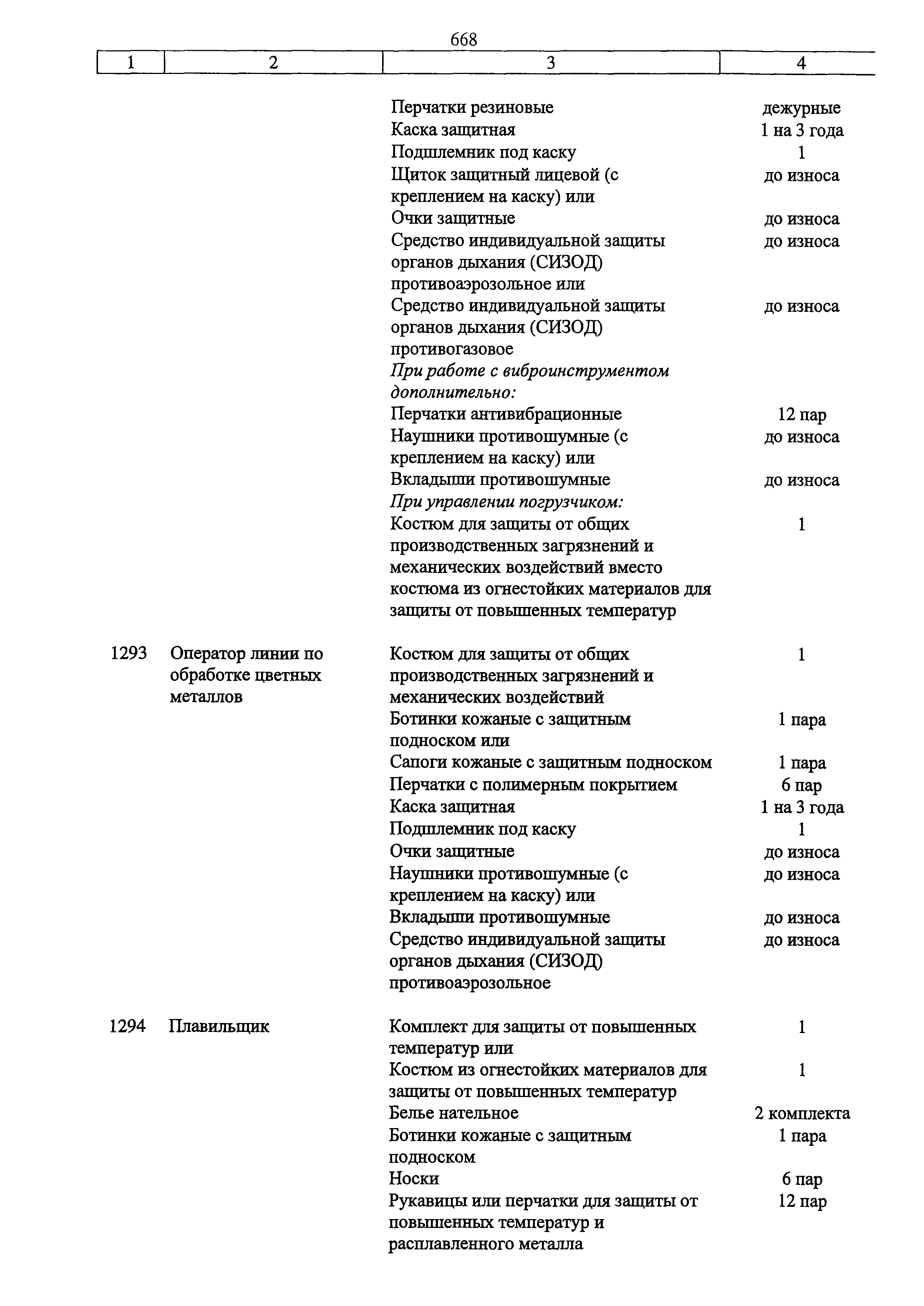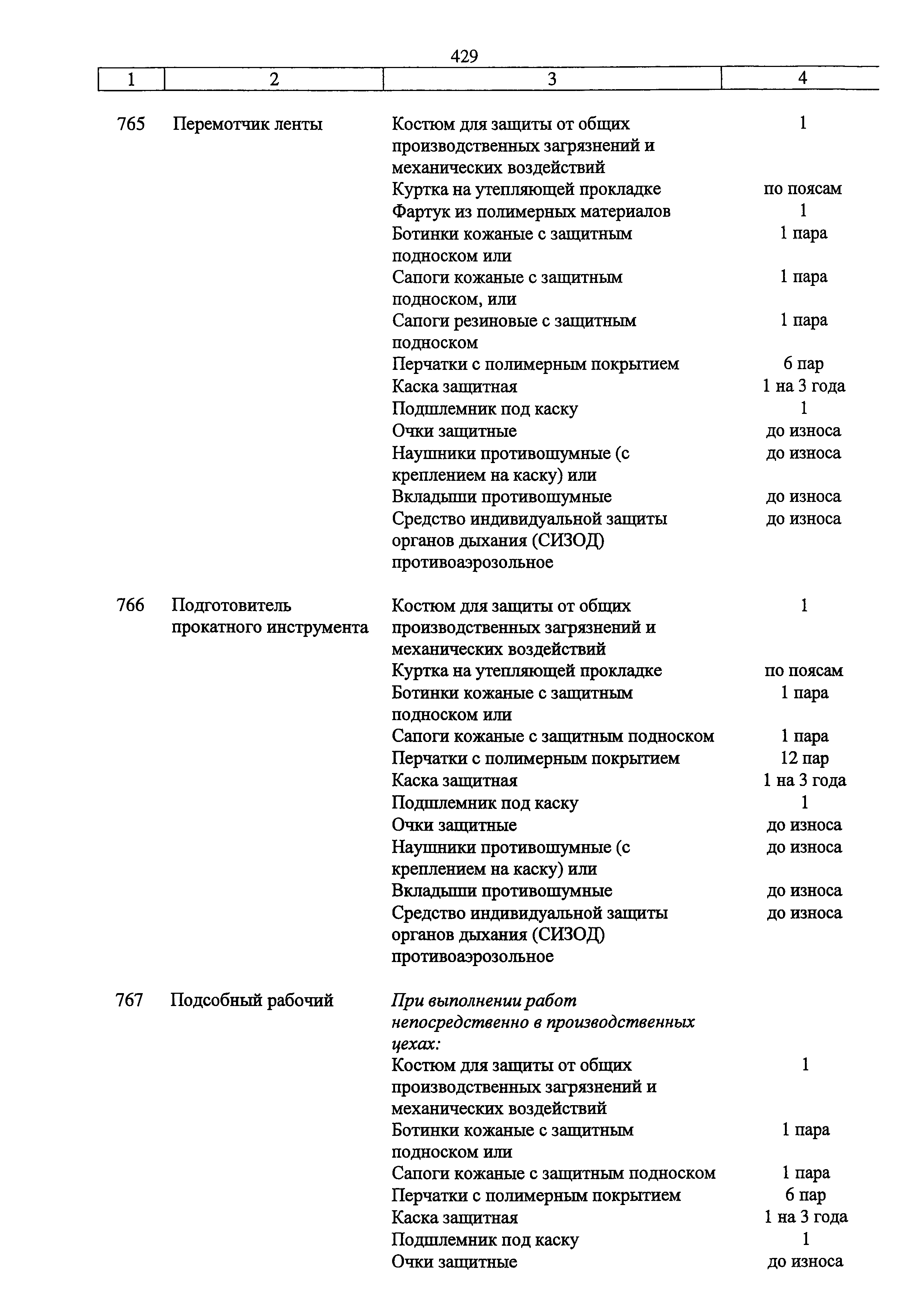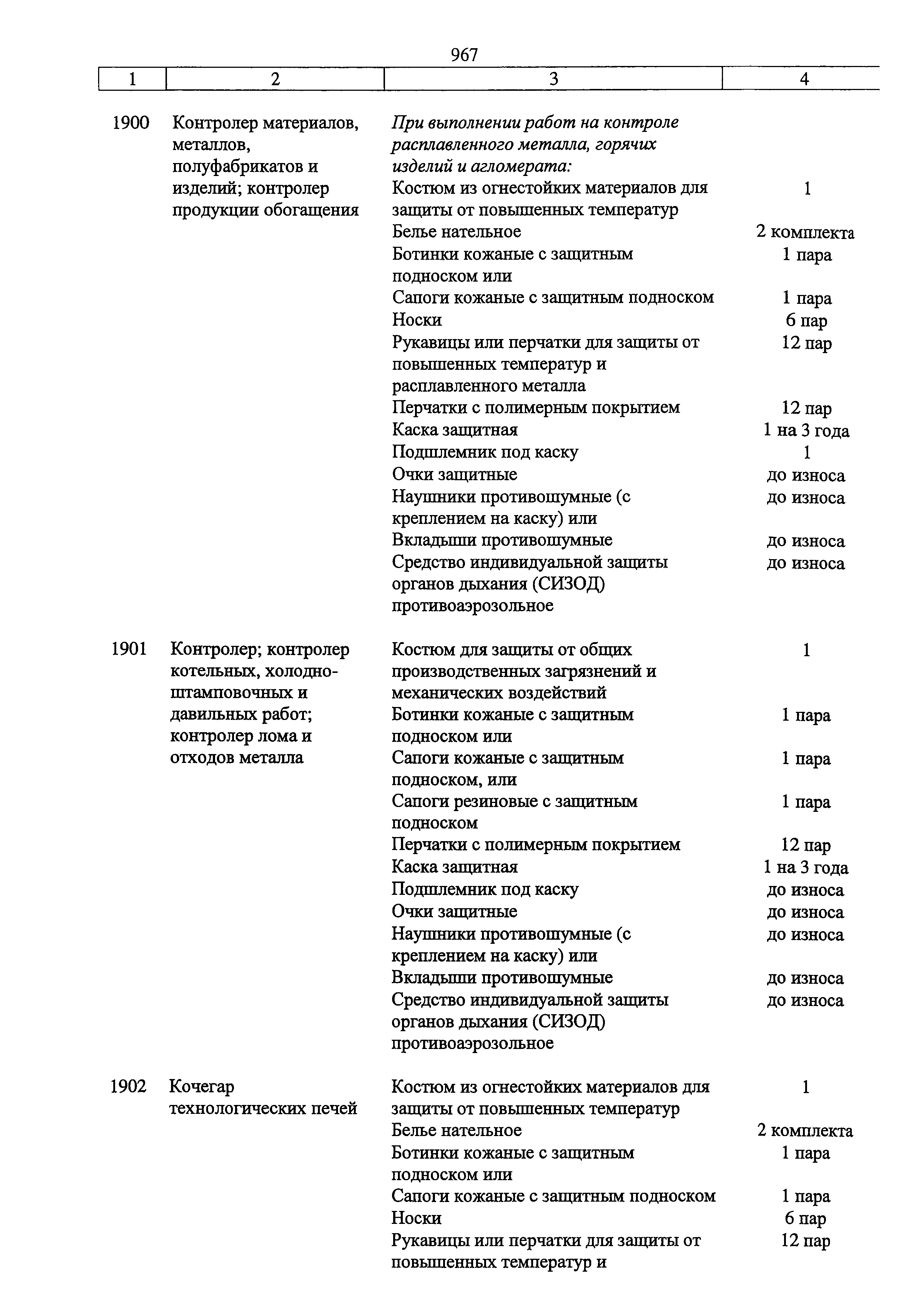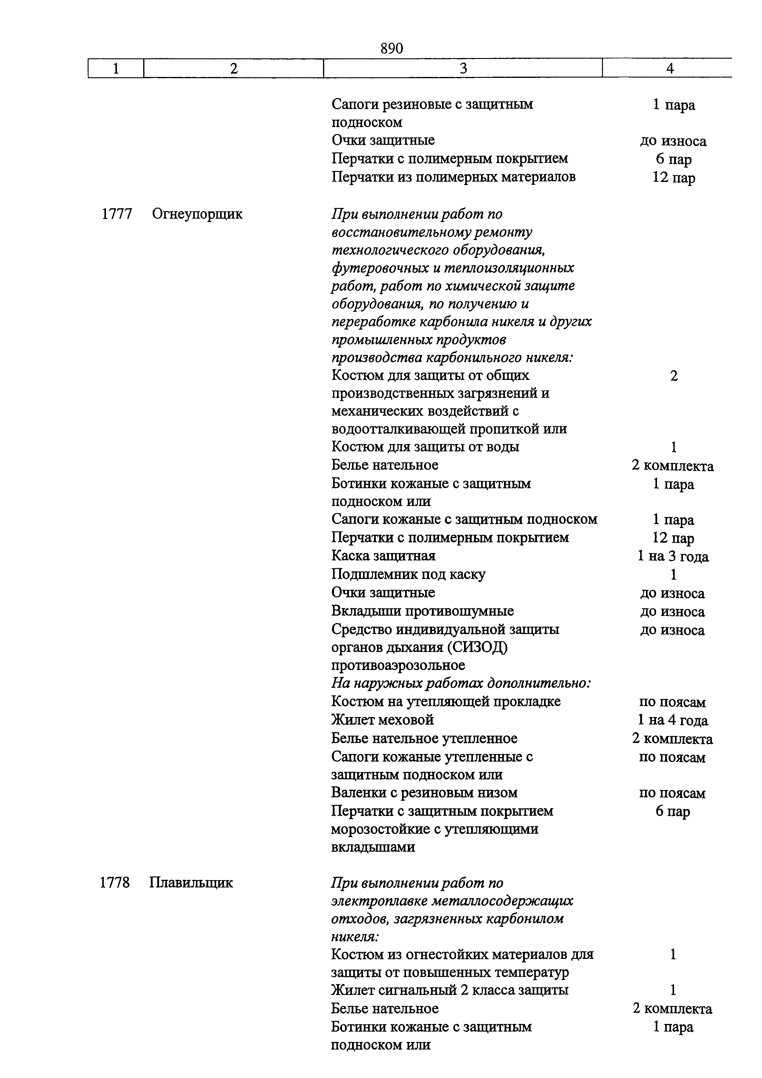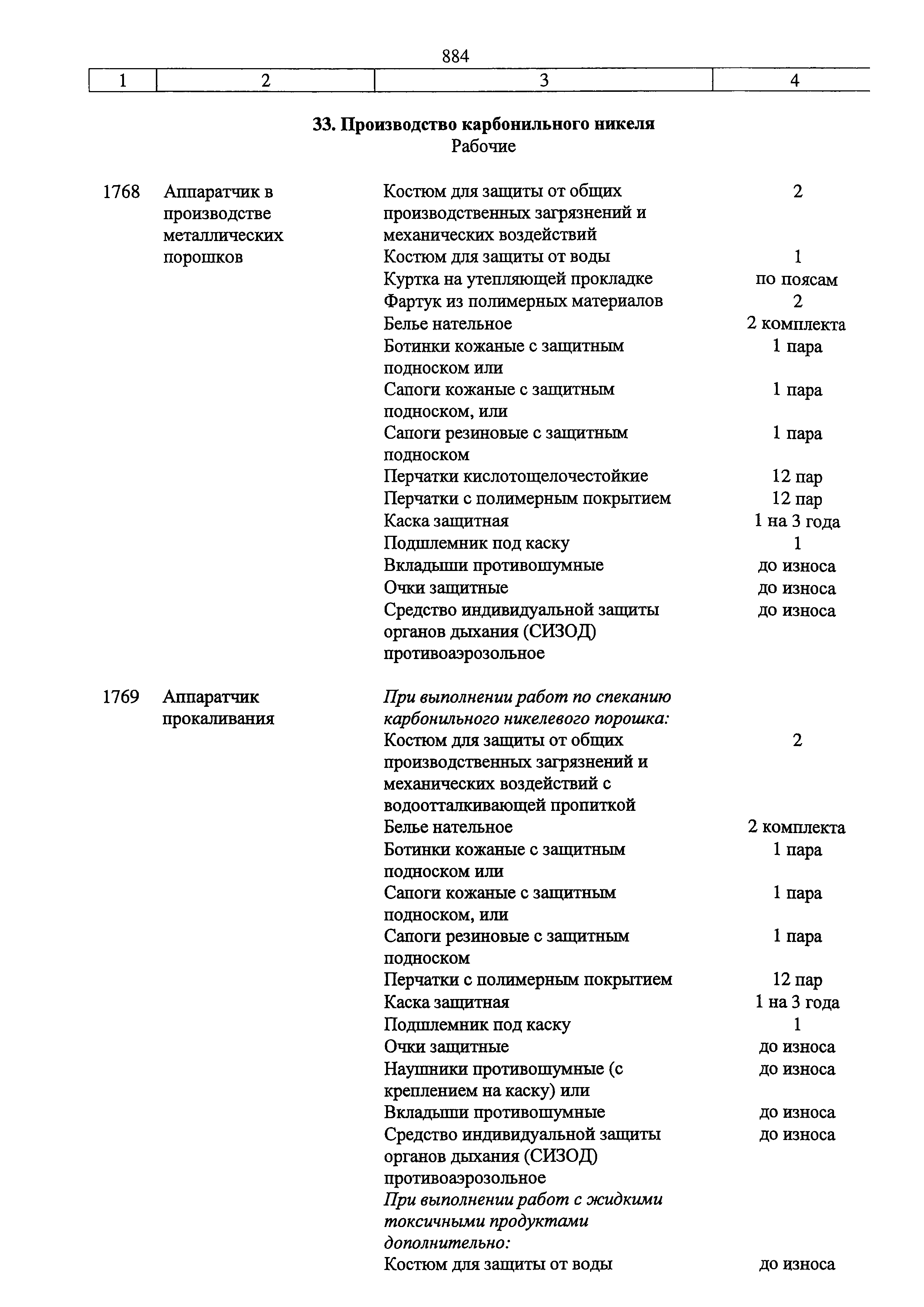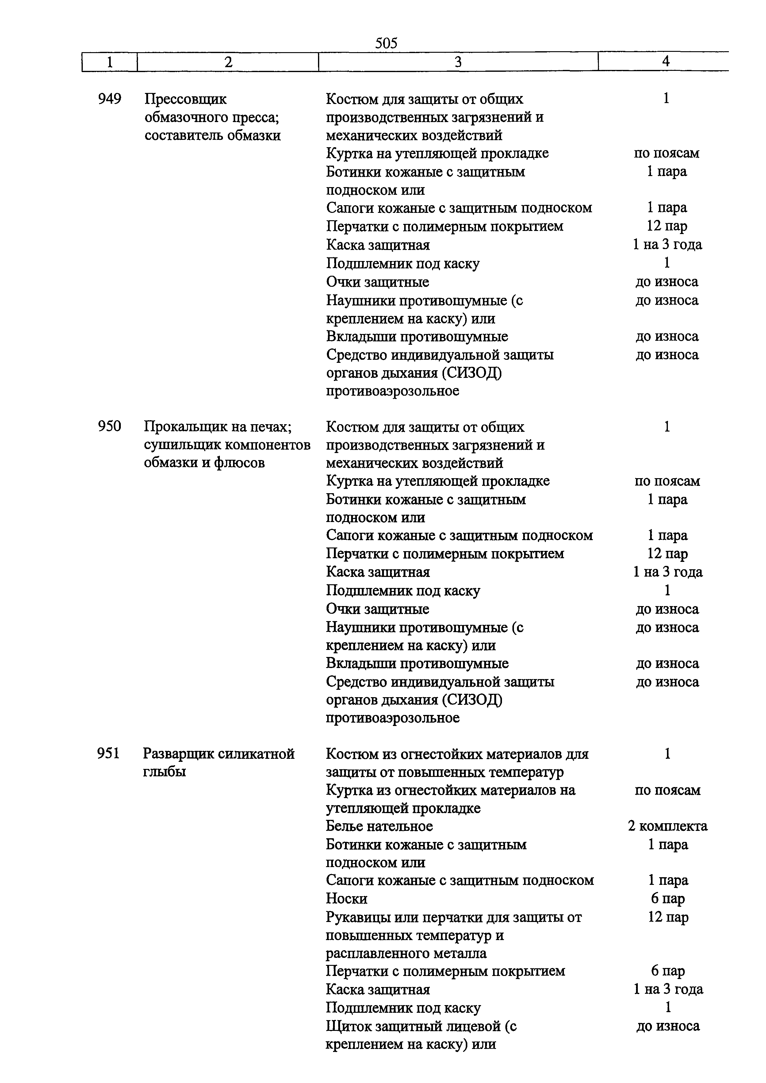 Типовые нормы бесплатной выдачи специальной одежды, специальной обуви и других средств индивидуальной защиты работникам горной и металлургической промышленности и металлургических производств других отраслей промышленности, занятым на работах с вредными и (или) опасными условиями труда, а также на работах, выполняемых в особых температурных условиях или связанных с загрязнением| Статус: | действует | | Название рус.: | Типовые нормы бесплатной выдачи специальной одежды, специальной обуви и других средств индивидуальной защиты работникам горной и металлургической промышленности и металлургических производств других отраслей промышленности, занятым на работах с вредными и (или) опасными условиями труда, а также на работах, выполняемых в особых температурных условиях или связанных с загрязнением | | Дата добавления в базу: | 01.02.2017 | | Дата актуализации: | 01.01.2021 | | Дата введения: | 14.02.2014 | | Область применения: | Нормы утверждаются локальными нормативными актами работодателя на основании результатов аттестации рабочих мест по условиям труда и могут быть включены в коллективный и (или) трудовой договор с указанием типовых норм, по сравнению с которыми улучшается обеспечение работников специальной одеждой, специальной обувью и другими средствами индивидуальной защиты. | | Оглавление: | I Горнодобывающая промышленность 1 Подземные горные работы (шахты) 2 Открытые горные работы и шахтная поверхность 3 Работа на гидравлических установках или с промывочными приборами 4 Дражные работы II Дробление, обогащение, брикетирование, обжиг, агломерация, извлечение металлов и сплавов III Черная металлургия 1 Коксохимическое производство 1.1 Углеподготовительные цеха 1.2 Углеобогатительные цеха 1.3 Производство каменноугольного кокса 1.4 Производство кристаллического нафталина, кумароновой смолы, смолоперерабатывающие цеха 1.5 Производство пиридиновых и фенольно-крезольных продуктов 1.6 Цеха улавливания химических продуктов и газовые цеха 1.7 Цеха ректификации сырого бензола 1.8 Цеха очистки коксового газа от сероводорода 1.9 Производство пекового кокса 1.10 Производство термоантрацита 2 Доменное производство 3 Сталеплавильное производство 3.1 Установки непрерывной разливки стали 4 Производство ферросплавов 4.1 Электролитическое производство 4.2 Производство электролитического хрома 4.3 Производство феррованадия 4.4 Подготовка шихты, обжиг руд и концентратов 4.5 Разливка и разделка ферросплавов 4.6 Обжиг извести 4.7 Общие профессии и должности ферросплавного производства 5 Прокатное производство 6 Производство труб (прокатка, сварка и волочение) 7 Колесопрокатное и бандажное производства 8 Валопрокатное производство 9 Производство рельсовых скреплений 10 Производство баллонов 11 Труболитейное производство 12 Производство метизов 12.1 Производство металлических канатов, сеток, пружин и пружинной ленты, щеток, цепей, колючей проволоки и других метизов 12.2 Волочение проволоки, калибровка и шлифовка металла 12.3 Изготовление волок 12.4 Холодноштамповочные и кузнечно-прессовые работы 12.5 Термическая обработка 12.6 Травление металла, защитные покрытия проволоки и извлечение железного купороса 12.7 Производство металлических электродов и порошковой проволоки 13 Производство огнеупоров 13.1 Огнеупоры 13.2 Карборундовые стержни 13.3 Высокоогнеупорные окислы 14 Ремонт 