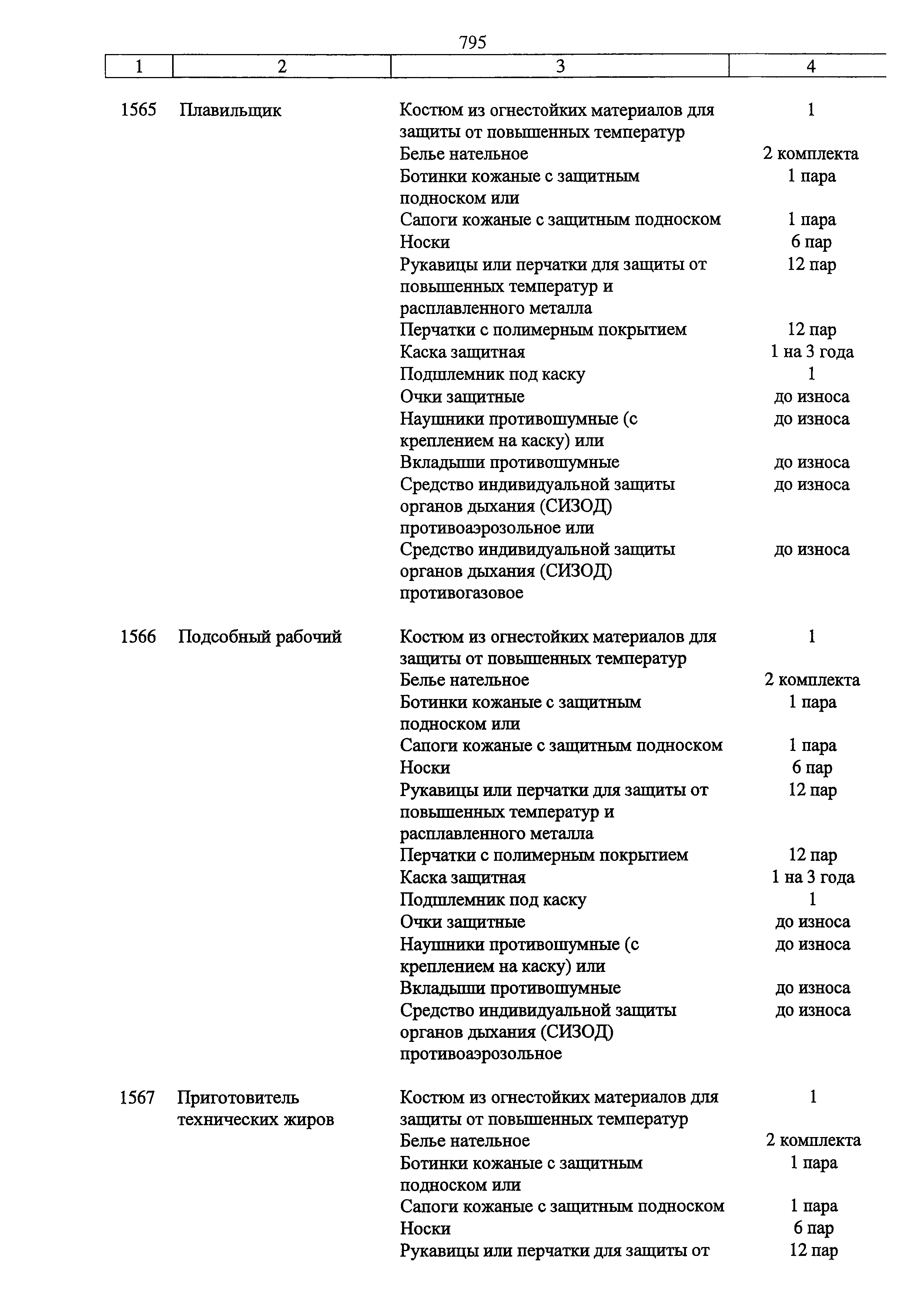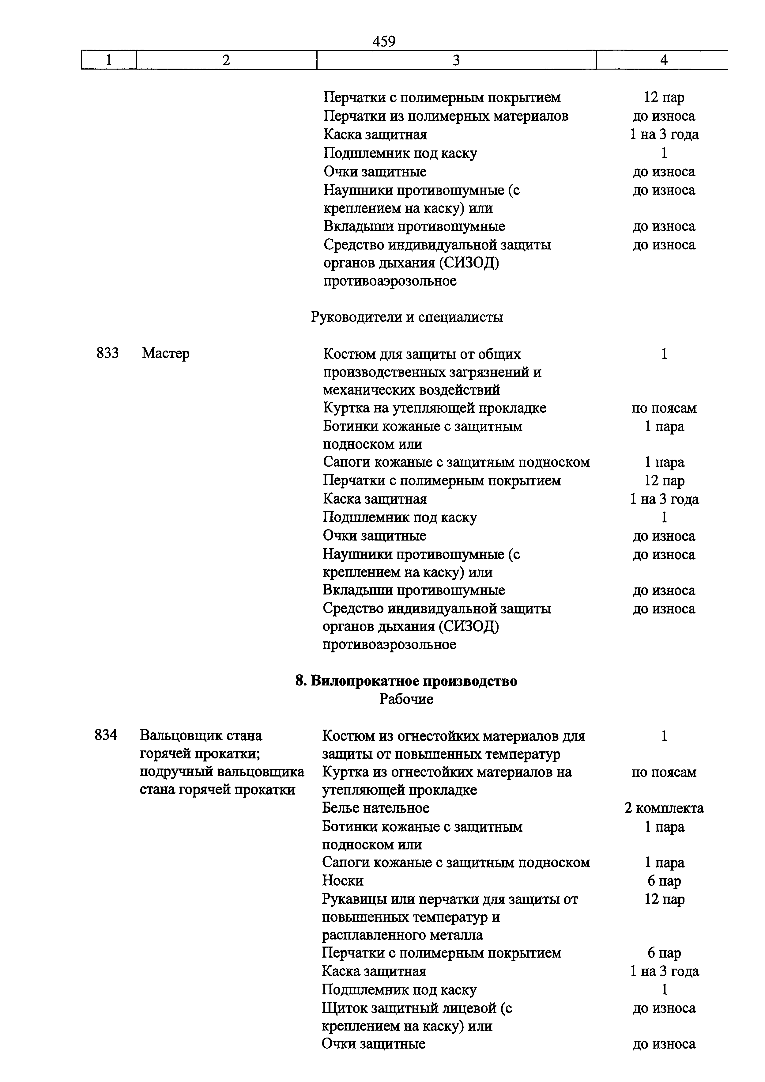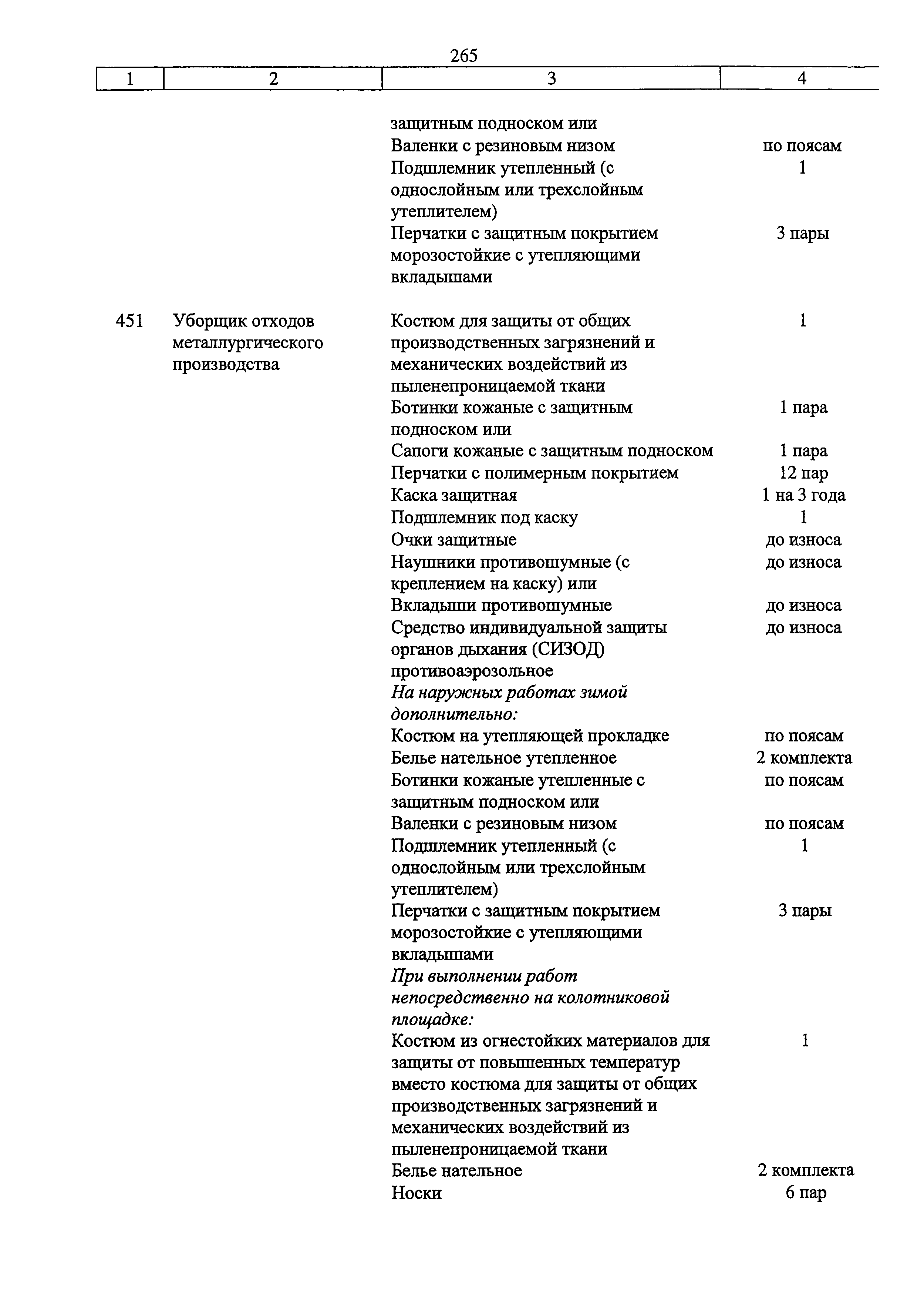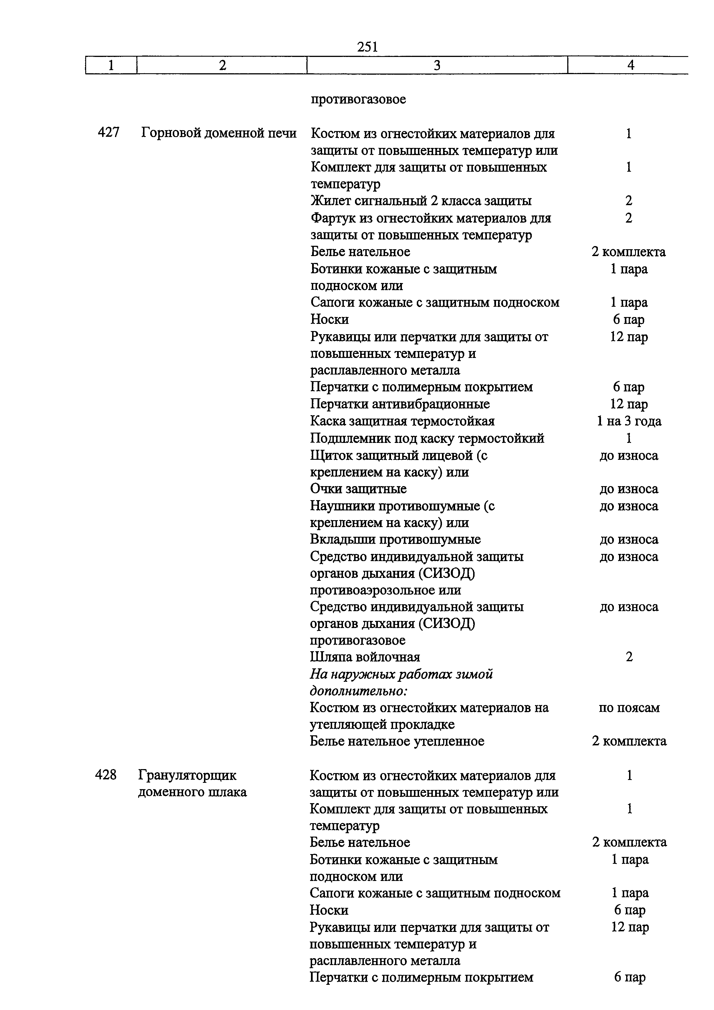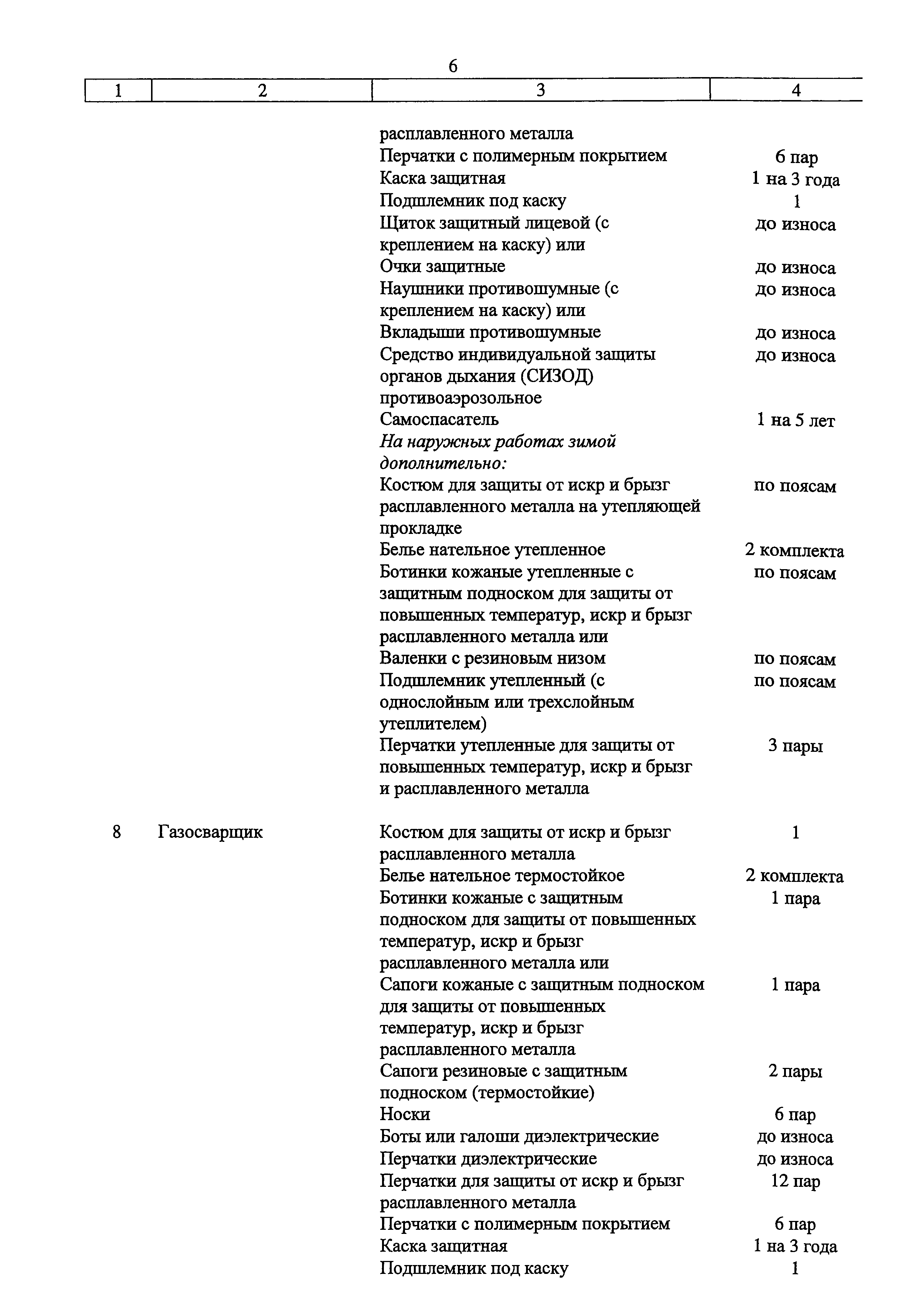 Типовые нормы бесплатной выдачи специальной одежды, специальной обуви и других средств индивидуальной защиты работникам горной и металлургической промышленности и металлургических производств других отраслей промышленности, занятым на работах с вредными и (или) опасными условиями труда, а также на работах, выполняемых в особых температурных условиях или связанных с загрязнением| Статус: | действует | | Название рус.: | Типовые нормы бесплатной выдачи специальной одежды, специальной обуви и других средств индивидуальной защиты работникам горной и металлургической промышленности и металлургических производств других отраслей промышленности, занятым на работах с вредными и (или) опасными условиями труда, а также на работах, выполняемых в особых температурных условиях или связанных с загрязнением | | Дата добавления в базу: | 01.02.2017 | | Дата актуализации: | 01.01.2021 | | Дата введения: | 14.02.2014 | | Область применения: | Нормы утверждаются локальными нормативными актами работодателя на основании результатов аттестации рабочих мест по условиям труда и могут быть включены в коллективный и (или) трудовой договор с указанием типовых норм, по сравнению с которыми улучшается обеспечение работников специальной одеждой, специальной обувью и другими средствами индивидуальной защиты. | | Оглавление: | I Горнодобывающая промышленность 1 Подземные горные работы (шахты) 2 Открытые горные работы и шахтная поверхность 3 Работа на гидравлических установках или с промывочными приборами 4 Дражные работы II Дробление, обогащение, брикетирование, обжиг, агломерация, извлечение металлов и сплавов III Черная металлургия 1 Коксохимическое производство 1.1 Углеподготовительные цеха 1.2 Углеобогатительные цеха 1.3 Производство каменноугольного кокса 1.4 Производство кристаллического нафталина, кумароновой смолы, смолоперерабатывающие цеха 1.5 Производство пиридиновых и фенольно-крезольных продуктов 1.6 Цеха улавливания химических продуктов и газовые цеха 1.7 Цеха ректификации сырого бензола 1.8 Цеха очистки коксового газа от сероводорода 1.9 Производство пекового кокса 1.10 Производство термоантрацита 2 Доменное производство 3 Сталеплавильное производство 3.1 Установки непрерывной разливки стали 4 Производство ферросплавов 4.1 Электролитическое производство 4.2 Производство электролитического хрома 4.3 Производство феррованадия 4.4 Подготовка шихты, обжиг руд и концентратов 4.5 Разливка и разделка ферросплавов 4.6 Обжиг извести 4.7 Общие профессии и должности ферросплавного производства 5 Прокатное производство 6 Производство труб (прокатка, сварка и волочение) 7 Колесопрокатное и бандажное производства 8 Валопрокатное производство 9 Производство рельсовых скреплений 10 Производство баллонов 11 Труболитейное производство 12 Производство метизов 12.1 Производство металлических канатов, сеток, пружин и пружинной ленты, щеток, цепей, колючей проволоки и других метизов 12.2 Волочение проволоки, калибровка и шлифовка металла 12.3 Изготовление волок 12.4 Холодноштамповочные и кузнечно-прессовые работы 12.5 Термическая обработка 12.6 Травление металла, защитные покрытия проволоки и извлечение железного купороса 12.7 Производство металлических электродов и порошковой проволоки 13 Производство огнеупоров 13.1 Огнеупоры 13.2 Карборундовые стержни 13.3 Высокоогнеупорные окислы 14 Ремонт 