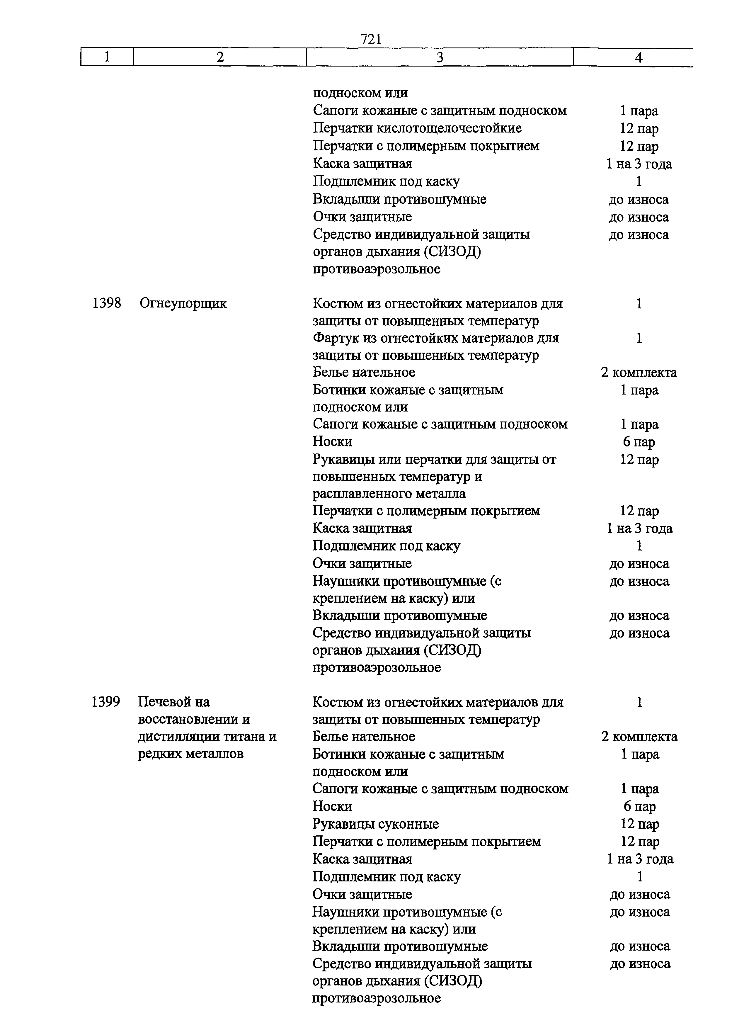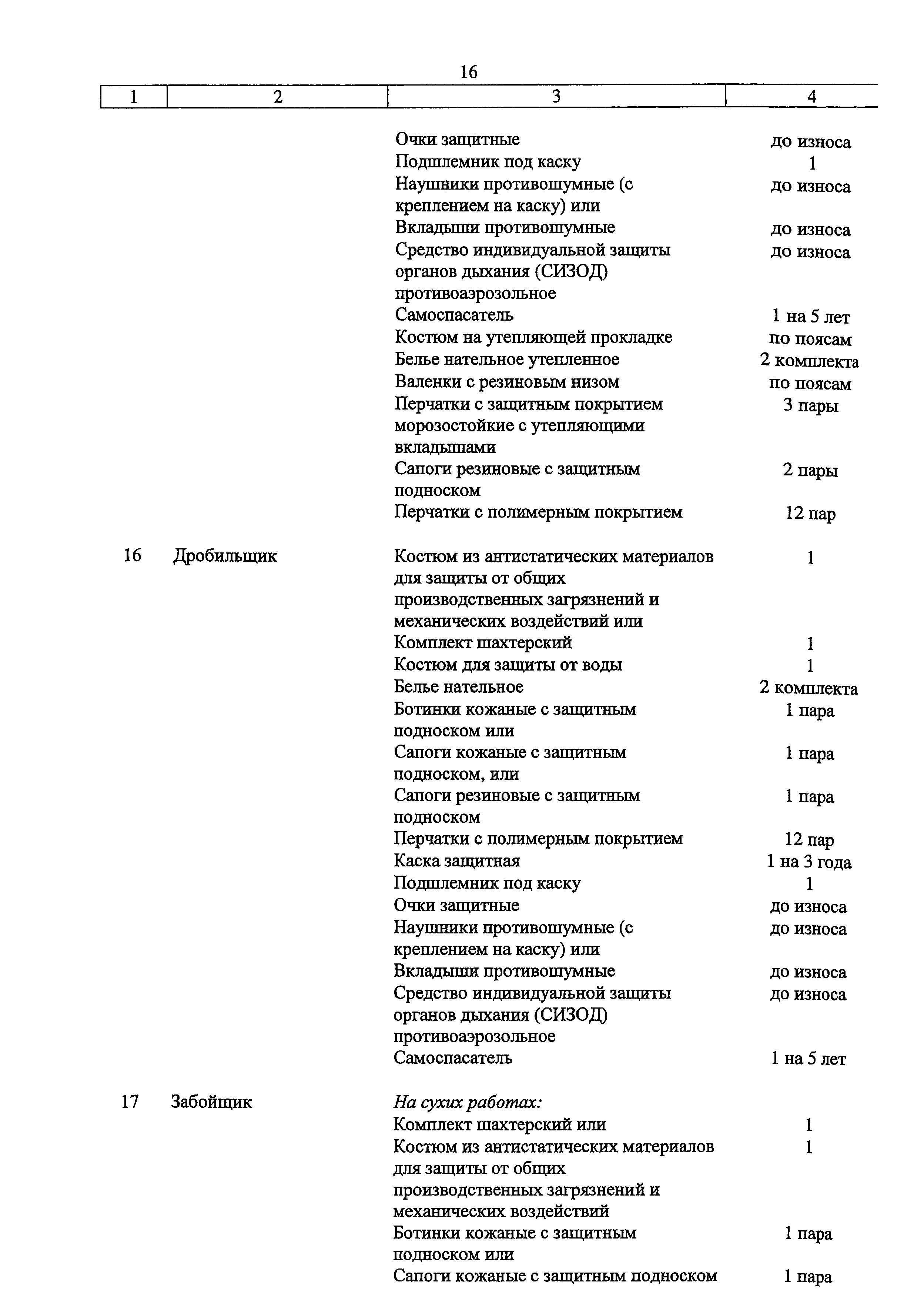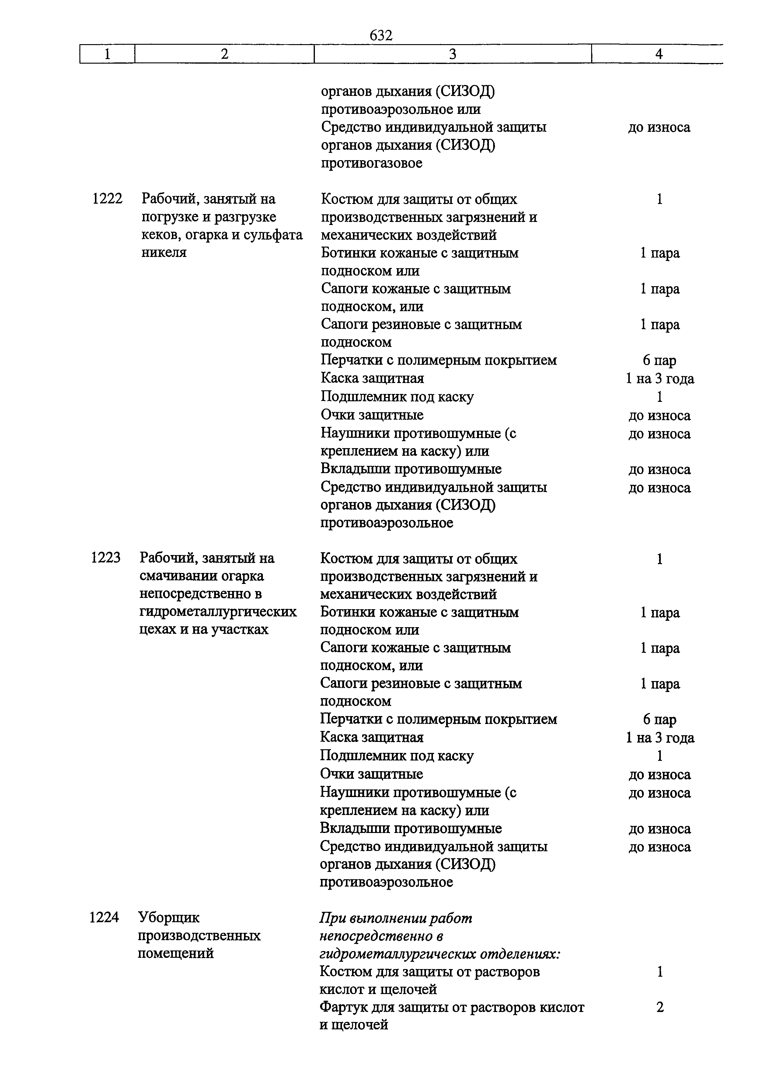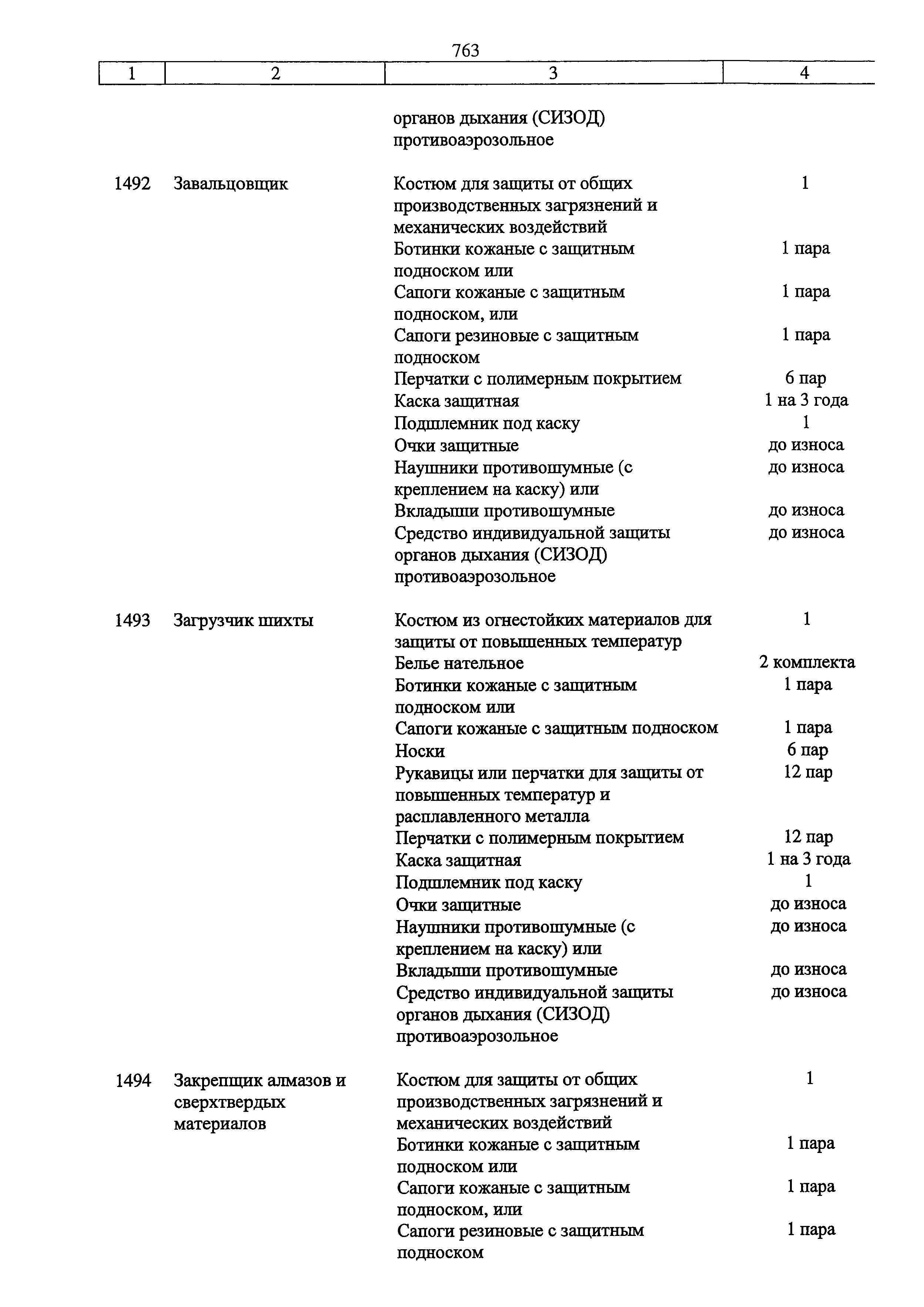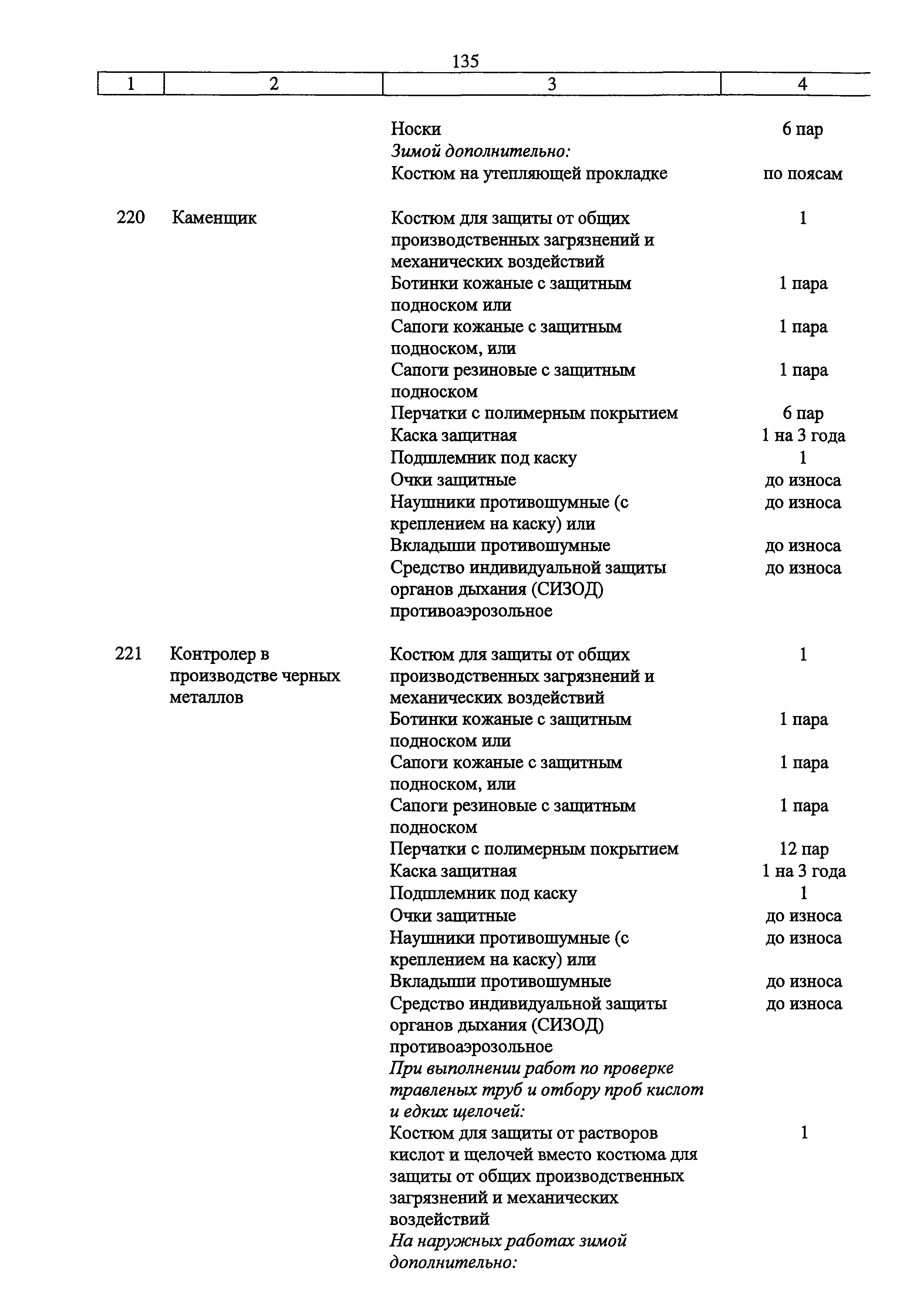 Типовые нормы бесплатной выдачи специальной одежды, специальной обуви и других средств индивидуальной защиты работникам горной и металлургической промышленности и металлургических производств других отраслей промышленности, занятым на работах с вредными и (или) опасными условиями труда, а также на работах, выполняемых в особых температурных условиях или связанных с загрязнением| Статус: | действует | | Название рус.: | Типовые нормы бесплатной выдачи специальной одежды, специальной обуви и других средств индивидуальной защиты работникам горной и металлургической промышленности и металлургических производств других отраслей промышленности, занятым на работах с вредными и (или) опасными условиями труда, а также на работах, выполняемых в особых температурных условиях или связанных с загрязнением | | Дата добавления в базу: | 01.02.2017 | | Дата актуализации: | 01.01.2021 | | Дата введения: | 14.02.2014 | | Область применения: | Нормы утверждаются локальными нормативными актами работодателя на основании результатов аттестации рабочих мест по условиям труда и могут быть включены в коллективный и (или) трудовой договор с указанием типовых норм, по сравнению с которыми улучшается обеспечение работников специальной одеждой, специальной обувью и другими средствами индивидуальной защиты. | | Оглавление: | I Горнодобывающая промышленность 1 Подземные горные работы (шахты) 2 Открытые горные работы и шахтная поверхность 3 Работа на гидравлических установках или с промывочными приборами 4 Дражные работы II Дробление, обогащение, брикетирование, обжиг, агломерация, извлечение металлов и сплавов III Черная металлургия 1 Коксохимическое производство 1.1 Углеподготовительные цеха 1.2 Углеобогатительные цеха 1.3 Производство каменноугольного кокса 1.4 Производство кристаллического нафталина, кумароновой смолы, смолоперерабатывающие цеха 1.5 Производство пиридиновых и фенольно-крезольных продуктов 1.6 Цеха улавливания химических продуктов и газовые цеха 1.7 Цеха ректификации сырого бензола 1.8 Цеха очистки коксового газа от сероводорода 1.9 Производство пекового кокса 1.10 Производство термоантрацита 2 Доменное производство 3 Сталеплавильное производство 3.1 Установки непрерывной разливки стали 4 Производство ферросплавов 4.1 Электролитическое производство 4.2 Производство электролитического хрома 4.3 Производство феррованадия 4.4 Подготовка шихты, обжиг руд и концентратов 4.5 Разливка и разделка ферросплавов 4.6 Обжиг извести 4.7 Общие профессии и должности ферросплавного производства 5 Прокатное производство 6 Производство труб (прокатка, сварка и волочение) 7 Колесопрокатное и бандажное производства 8 Валопрокатное производство 9 Производство рельсовых скреплений 10 Производство баллонов 11 Труболитейное производство 12 Производство метизов 12.1 Производство металлических канатов, сеток, пружин и пружинной ленты, щеток, цепей, колючей проволоки и других метизов 12.2 Волочение проволоки, калибровка и шлифовка металла 12.3 Изготовление волок 12.4 Холодноштамповочные и кузнечно-прессовые работы 12.5 Термическая обработка 12.6 Травление металла, защитные покрытия проволоки и извлечение железного купороса 12.7 Производство металлических электродов и порошковой проволоки 13 Производство огнеупоров 13.1 Огнеупоры 13.2 Карборундовые стержни 13.3 Высокоогнеупорные окислы 14 Ремонт 
