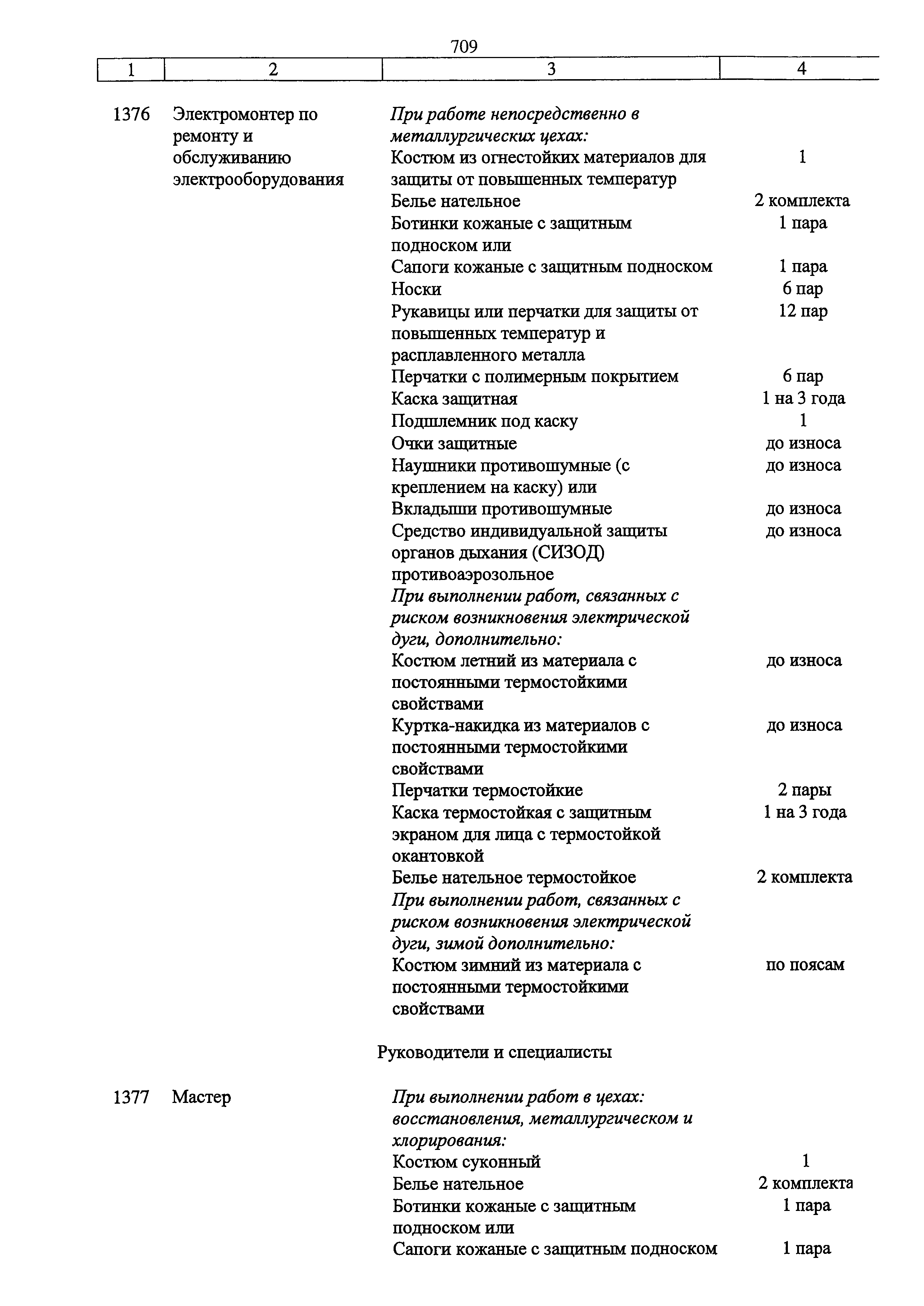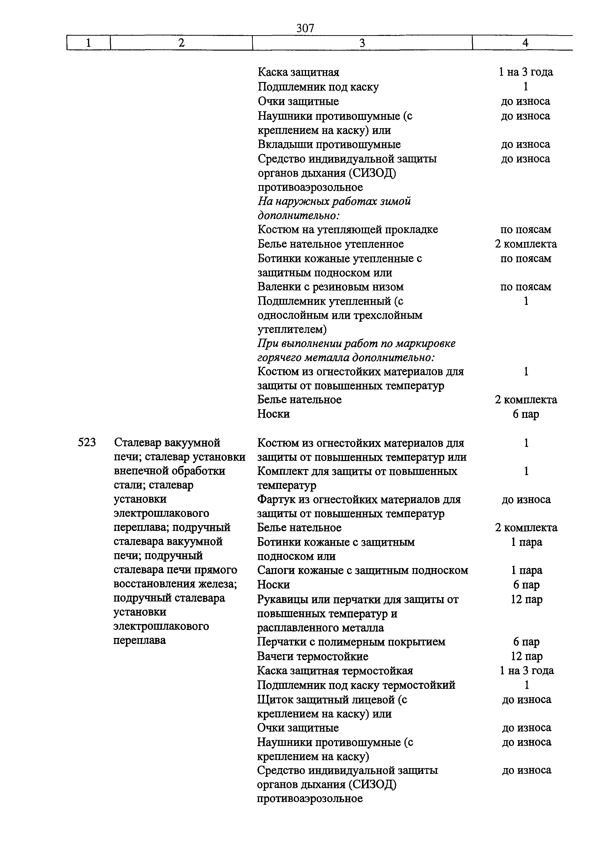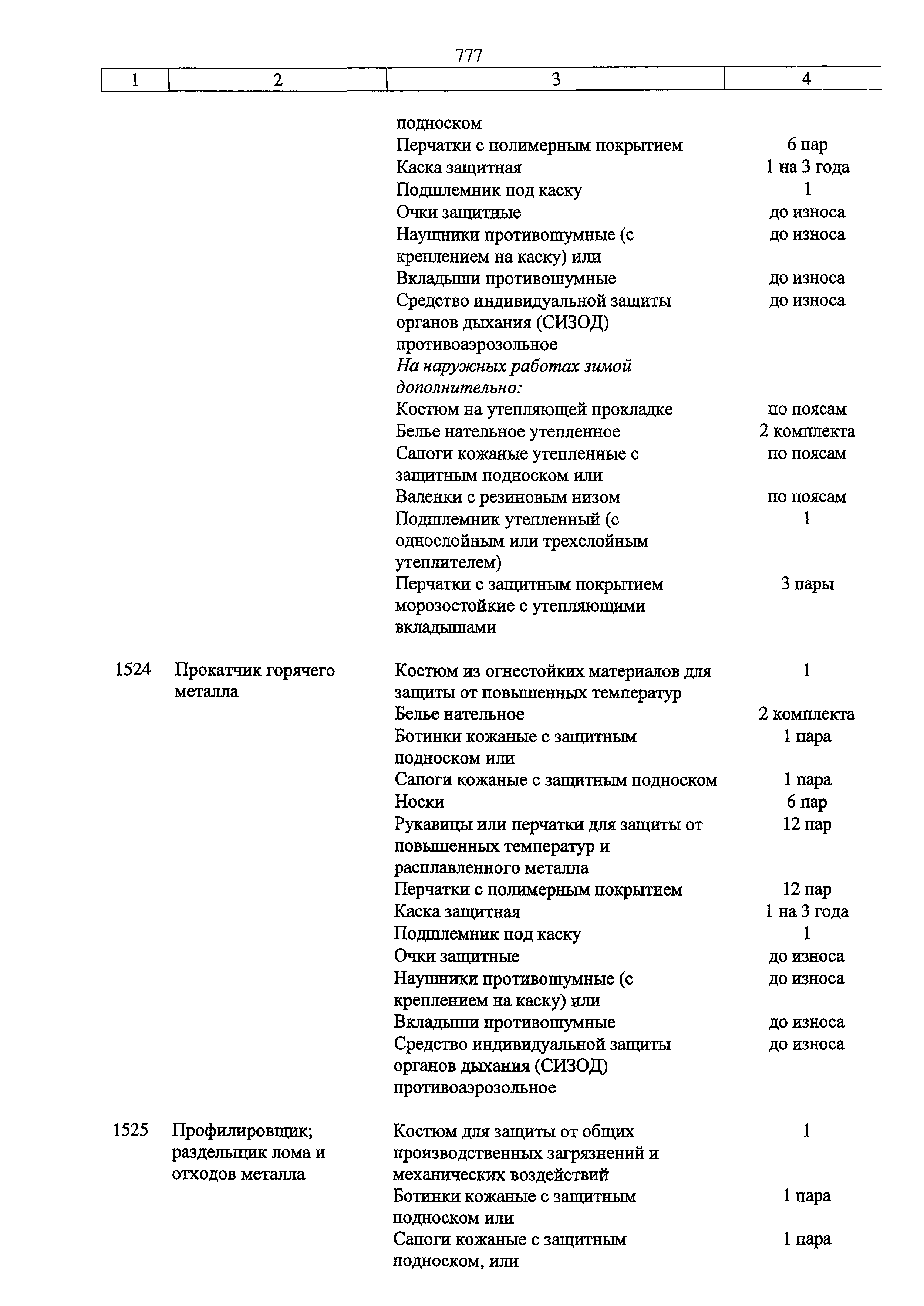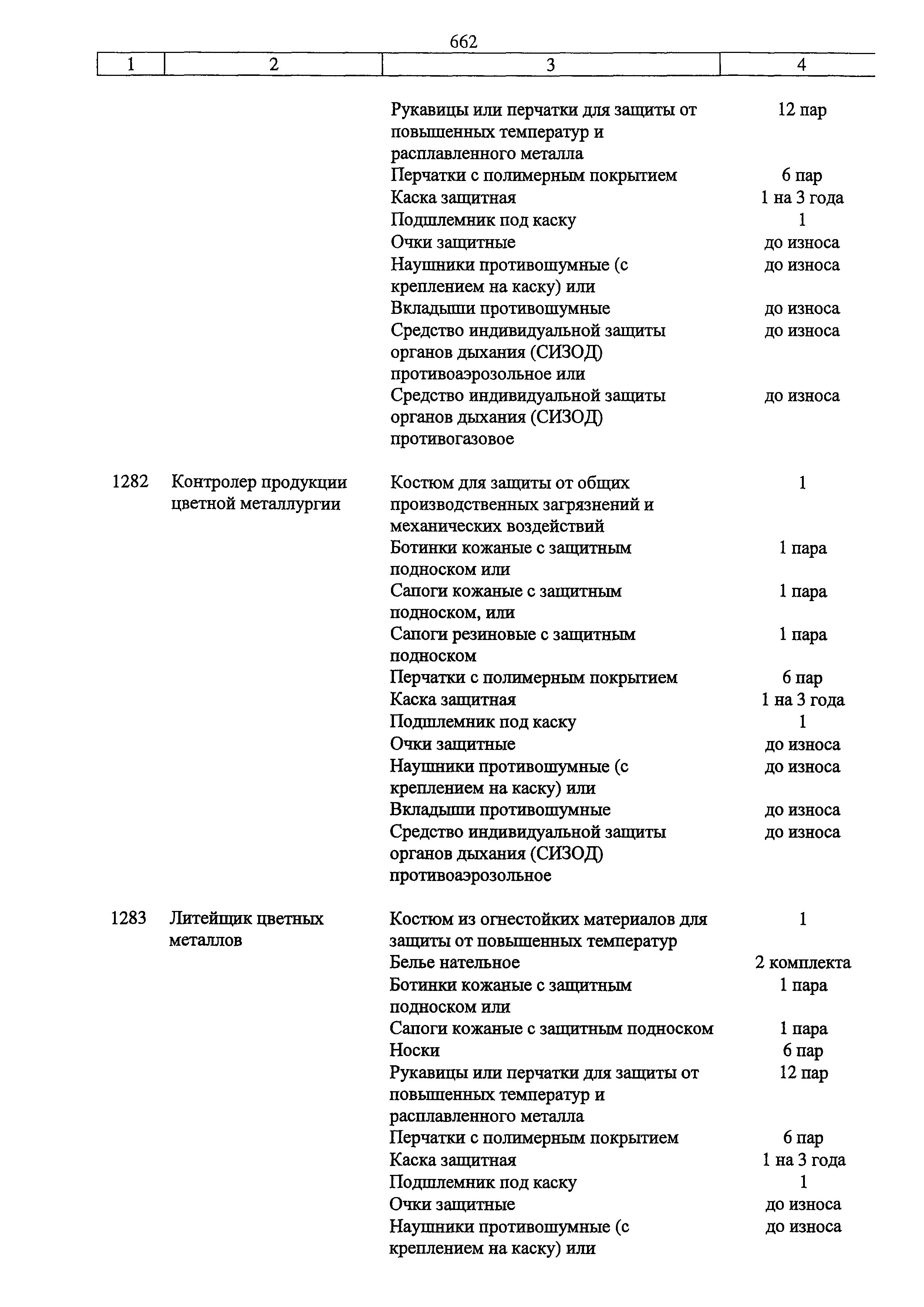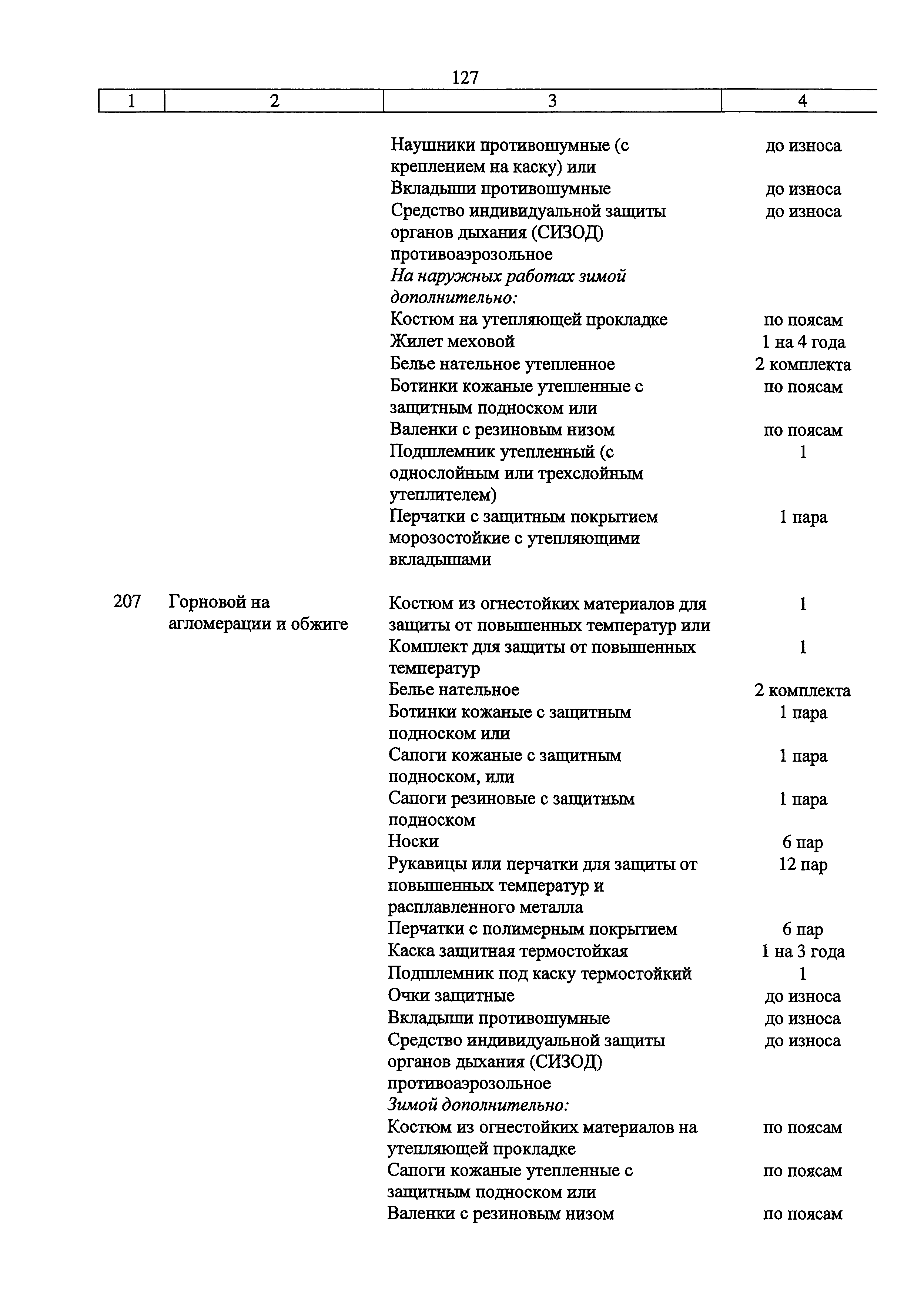Типовые нормы бесплатной выдачи специальной одежды, специальной обуви и других средств индивидуальной защиты работникам горной и металлургической промышленности и металлургических производств других отраслей промышленности, занятым на работах с вредными и (или) опасными условиями труда, а также на работах, выполняемых в особых температурных условиях или связанных с загрязнением| Статус: | действует | | Название рус.: | Типовые нормы бесплатной выдачи специальной одежды, специальной обуви и других средств индивидуальной защиты работникам горной и металлургической промышленности и металлургических производств других отраслей промышленности, занятым на работах с вредными и (или) опасными условиями труда, а также на работах, выполняемых в особых температурных условиях или связанных с загрязнением | | Дата добавления в базу: | 01.02.2017 | | Дата актуализации: | 01.01.2021 | | Дата введения: | 14.02.2014 | | Область применения: | Нормы утверждаются локальными нормативными актами работодателя на основании результатов аттестации рабочих мест по условиям труда и могут быть включены в коллективный и (или) трудовой договор с указанием типовых норм, по сравнению с которыми улучшается обеспечение работников специальной одеждой, специальной обувью и другими средствами индивидуальной защиты. | | Оглавление: | I Горнодобывающая промышленность 1 Подземные горные работы (шахты) 2 Открытые горные работы и шахтная поверхность 3 Работа на гидравлических установках или с промывочными приборами 4 Дражные работы II Дробление, обогащение, брикетирование, обжиг, агломерация, извлечение металлов и сплавов III Черная металлургия 1 Коксохимическое производство 1.1 Углеподготовительные цеха 1.2 Углеобогатительные цеха 1.3 Производство каменноугольного кокса 1.4 Производство кристаллического нафталина, кумароновой смолы, смолоперерабатывающие цеха 1.5 Производство пиридиновых и фенольно-крезольных продуктов 1.6 Цеха улавливания химических продуктов и газовые цеха 1.7 Цеха ректификации сырого бензола 1.8 Цеха очистки коксового газа от сероводорода 1.9 Производство пекового кокса 1.10 Производство термоантрацита 2 Доменное производство 3 Сталеплавильное производство 3.1 Установки непрерывной разливки стали 4 Производство ферросплавов 4.1 Электролитическое производство 4.2 Производство электролитического хрома 4.3 Производство феррованадия 4.4 Подготовка шихты, обжиг руд и концентратов 4.5 Разливка и разделка ферросплавов 4.6 Обжиг извести 4.7 Общие профессии и должности ферросплавного производства 5 Прокатное производство 6 Производство труб (прокатка, сварка и волочение) 7 Колесопрокатное и бандажное производства 8 Валопрокатное производство 9 Производство рельсовых скреплений 10 Производство баллонов 11 Труболитейное производство 12 Производство метизов 12.1 Производство металлических канатов, сеток, пружин и пружинной ленты, щеток, цепей, колючей проволоки и других метизов 12.2 Волочение проволоки, калибровка и шлифовка металла 12.3 Изготовление волок 12.4 Холодноштамповочные и кузнечно-прессовые работы 12.5 Термическая обработка 12.6 Травление металла, защитные покрытия проволоки и извлечение железного купороса 12.7 Производство металлических электродов и порошковой проволоки 13 Производство огнеупоров 13.1 Огнеупоры 13.2 Карборундовые стержни 13.3 Высокоогнеупорные окислы 14 Ремонт 