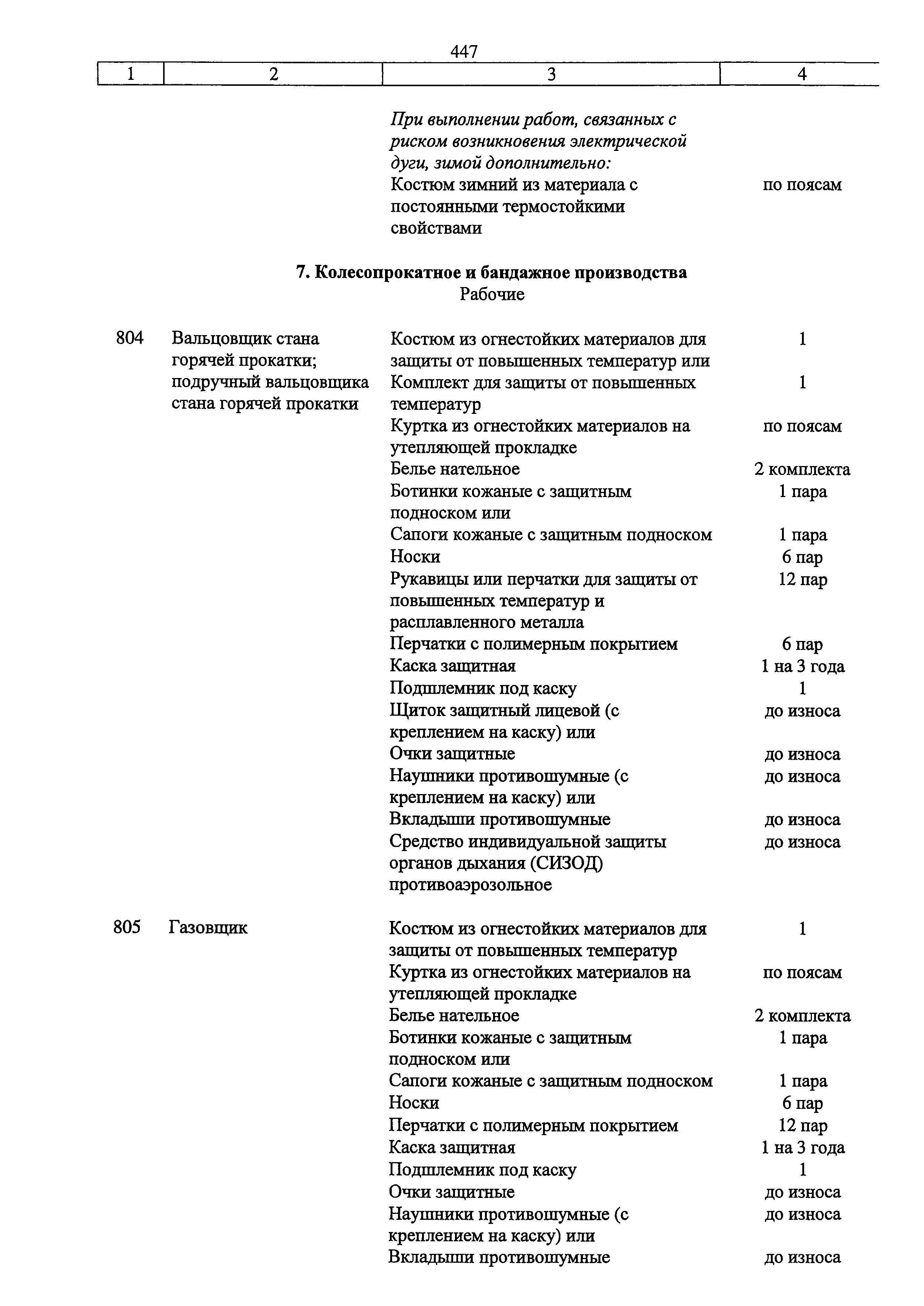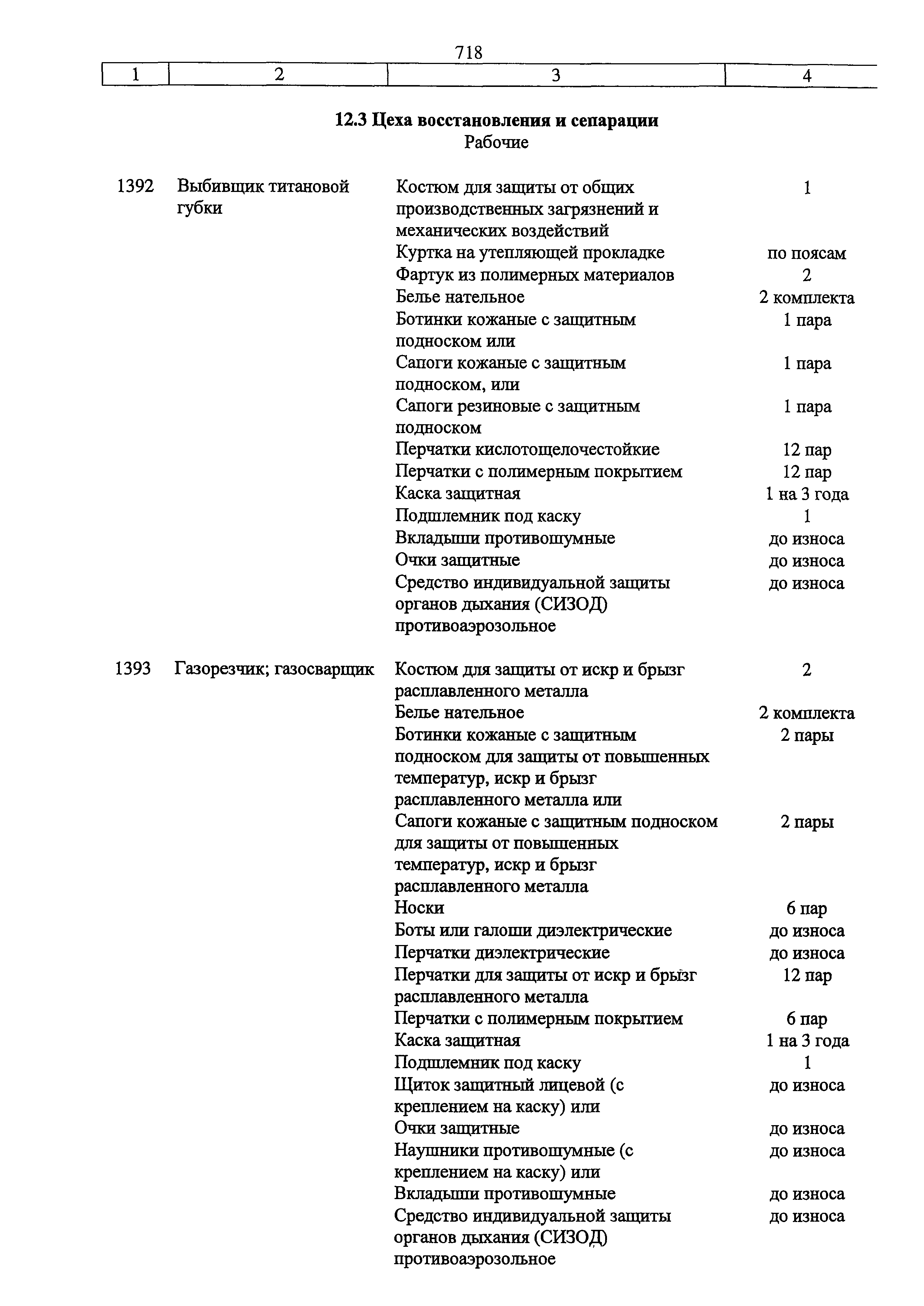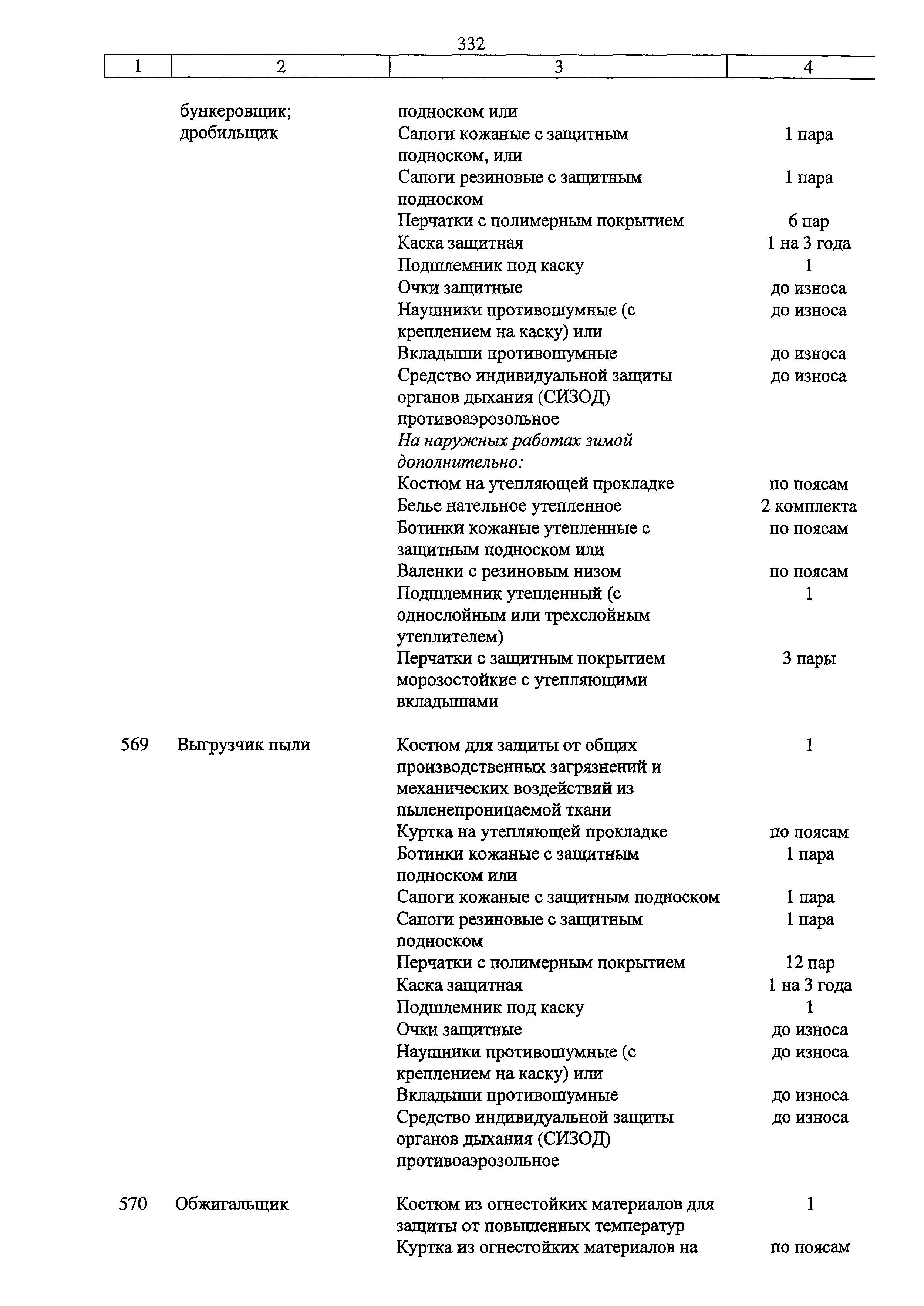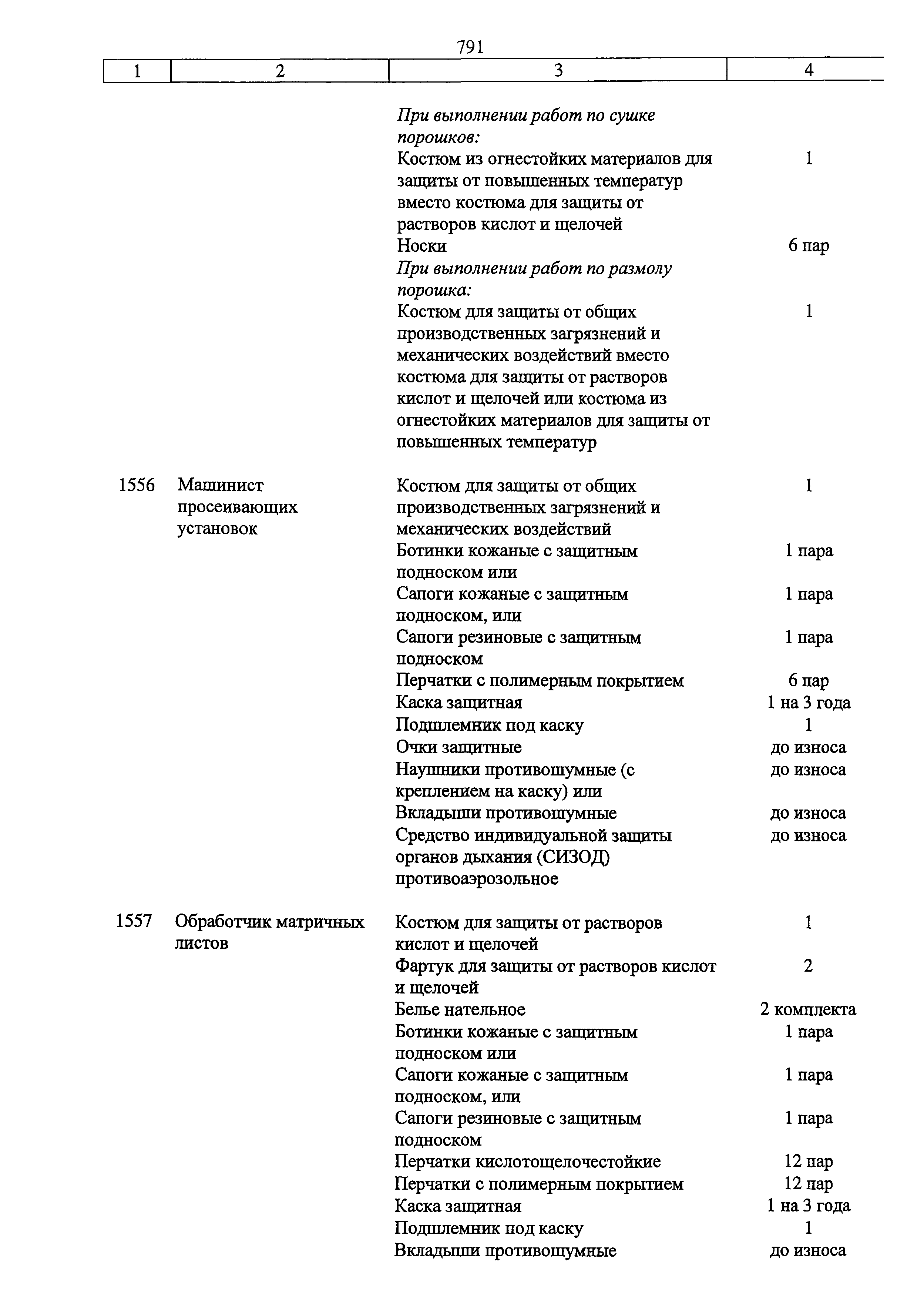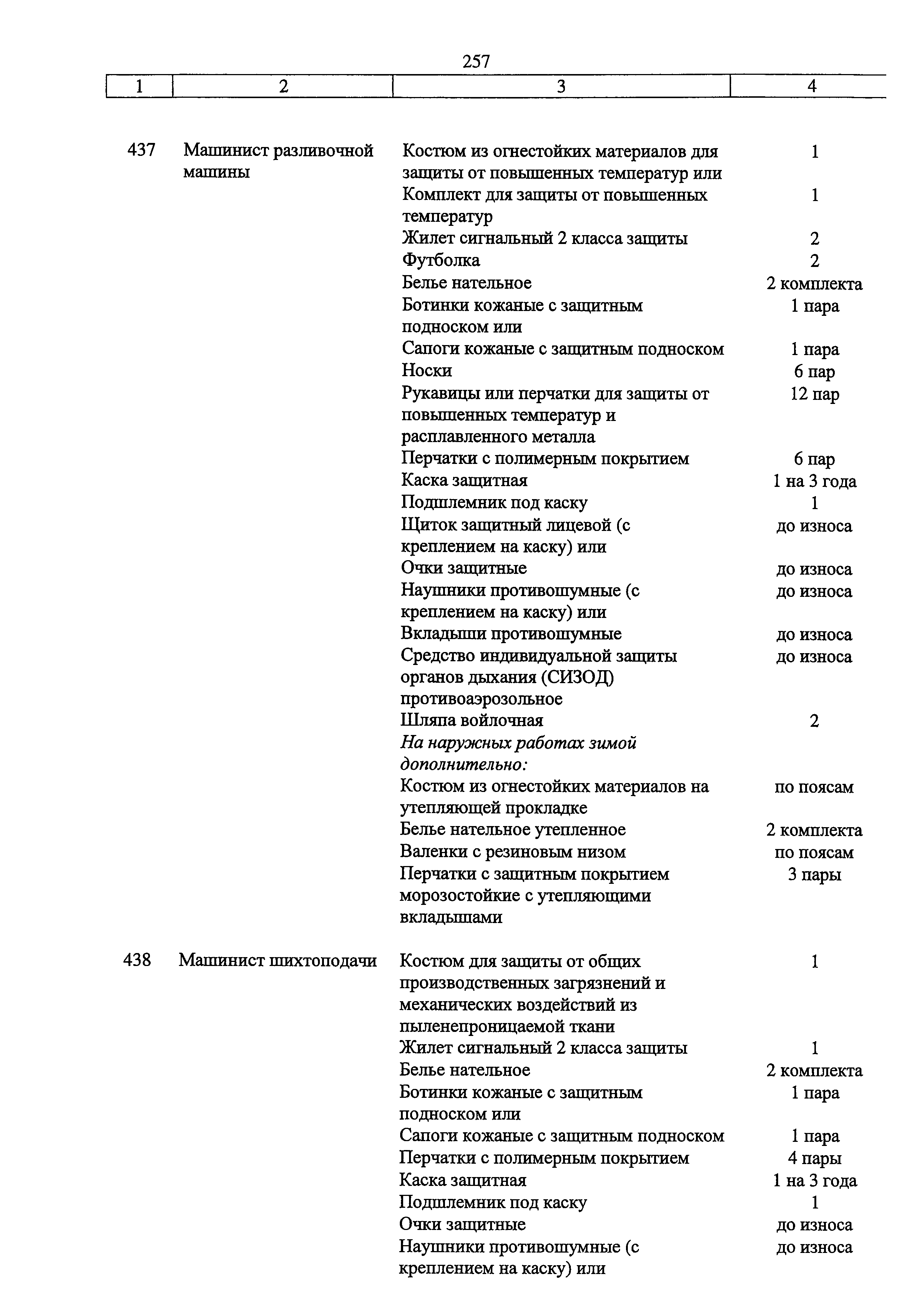 Типовые нормы бесплатной выдачи специальной одежды, специальной обуви и других средств индивидуальной защиты работникам горной и металлургической промышленности и металлургических производств других отраслей промышленности, занятым на работах с вредными и (или) опасными условиями труда, а также на работах, выполняемых в особых температурных условиях или связанных с загрязнением| Статус: | действует | | Название рус.: | Типовые нормы бесплатной выдачи специальной одежды, специальной обуви и других средств индивидуальной защиты работникам горной и металлургической промышленности и металлургических производств других отраслей промышленности, занятым на работах с вредными и (или) опасными условиями труда, а также на работах, выполняемых в особых температурных условиях или связанных с загрязнением | | Дата добавления в базу: | 01.02.2017 | | Дата актуализации: | 01.01.2021 | | Дата введения: | 14.02.2014 | | Область применения: | Нормы утверждаются локальными нормативными актами работодателя на основании результатов аттестации рабочих мест по условиям труда и могут быть включены в коллективный и (или) трудовой договор с указанием типовых норм, по сравнению с которыми улучшается обеспечение работников специальной одеждой, специальной обувью и другими средствами индивидуальной защиты. | | Оглавление: | I Горнодобывающая промышленность 1 Подземные горные работы (шахты) 2 Открытые горные работы и шахтная поверхность 3 Работа на гидравлических установках или с промывочными приборами 4 Дражные работы II Дробление, обогащение, брикетирование, обжиг, агломерация, извлечение металлов и сплавов III Черная металлургия 1 Коксохимическое производство 1.1 Углеподготовительные цеха 1.2 Углеобогатительные цеха 1.3 Производство каменноугольного кокса 1.4 Производство кристаллического нафталина, кумароновой смолы, смолоперерабатывающие цеха 1.5 Производство пиридиновых и фенольно-крезольных продуктов 1.6 Цеха улавливания химических продуктов и газовые цеха 1.7 Цеха ректификации сырого бензола 1.8 Цеха очистки коксового газа от сероводорода 1.9 Производство пекового кокса 1.10 Производство термоантрацита 2 Доменное производство 3 Сталеплавильное производство 3.1 Установки непрерывной разливки стали 4 Производство ферросплавов 4.1 Электролитическое производство 4.2 Производство электролитического хрома 4.3 Производство феррованадия 4.4 Подготовка шихты, обжиг руд и концентратов 4.5 Разливка и разделка ферросплавов 4.6 Обжиг извести 4.7 Общие профессии и должности ферросплавного производства 5 Прокатное производство 6 Производство труб (прокатка, сварка и волочение) 7 Колесопрокатное и бандажное производства 8 Валопрокатное производство 9 Производство рельсовых скреплений 10 Производство баллонов 11 Труболитейное производство 12 Производство метизов 12.1 Производство металлических канатов, сеток, пружин и пружинной ленты, щеток, цепей, колючей проволоки и других метизов 12.2 Волочение проволоки, калибровка и шлифовка металла 12.3 Изготовление волок 12.4 Холодноштамповочные и кузнечно-прессовые работы 12.5 Термическая обработка 12.6 Травление металла, защитные покрытия проволоки и извлечение железного купороса 12.7 Производство металлических электродов и порошковой проволоки 13 Производство огнеупоров 13.1 Огнеупоры 13.2 Карборундовые стержни 13.3 Высокоогнеупорные окислы 14 Ремонт 