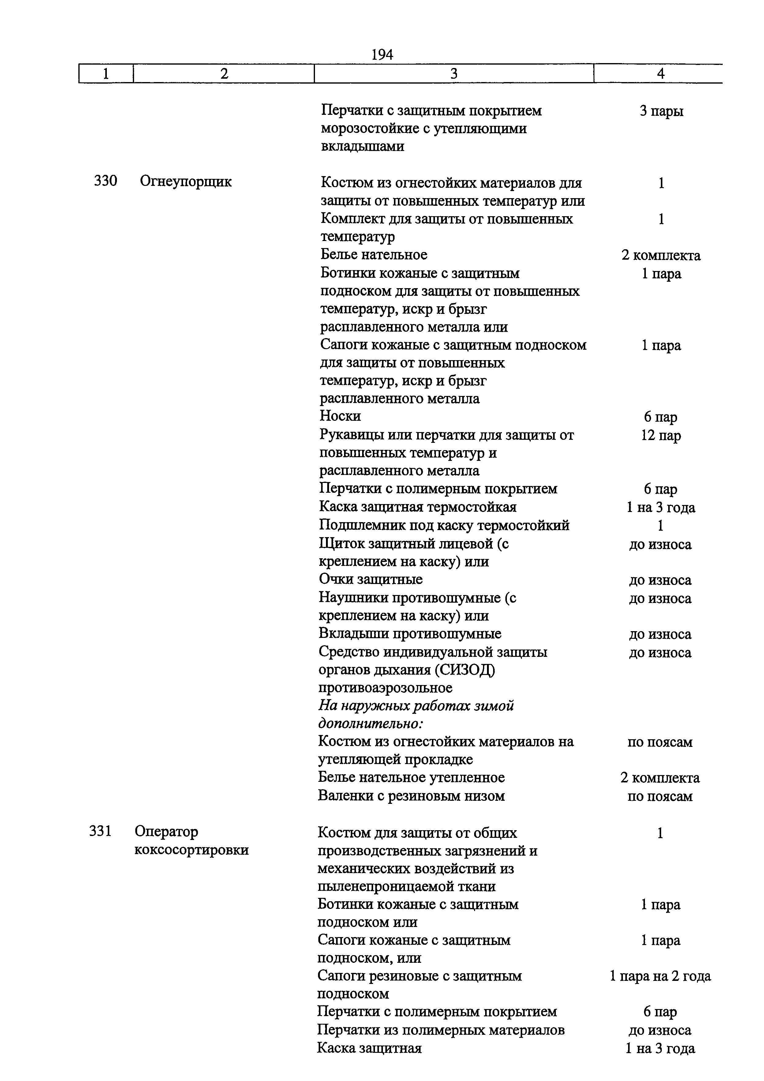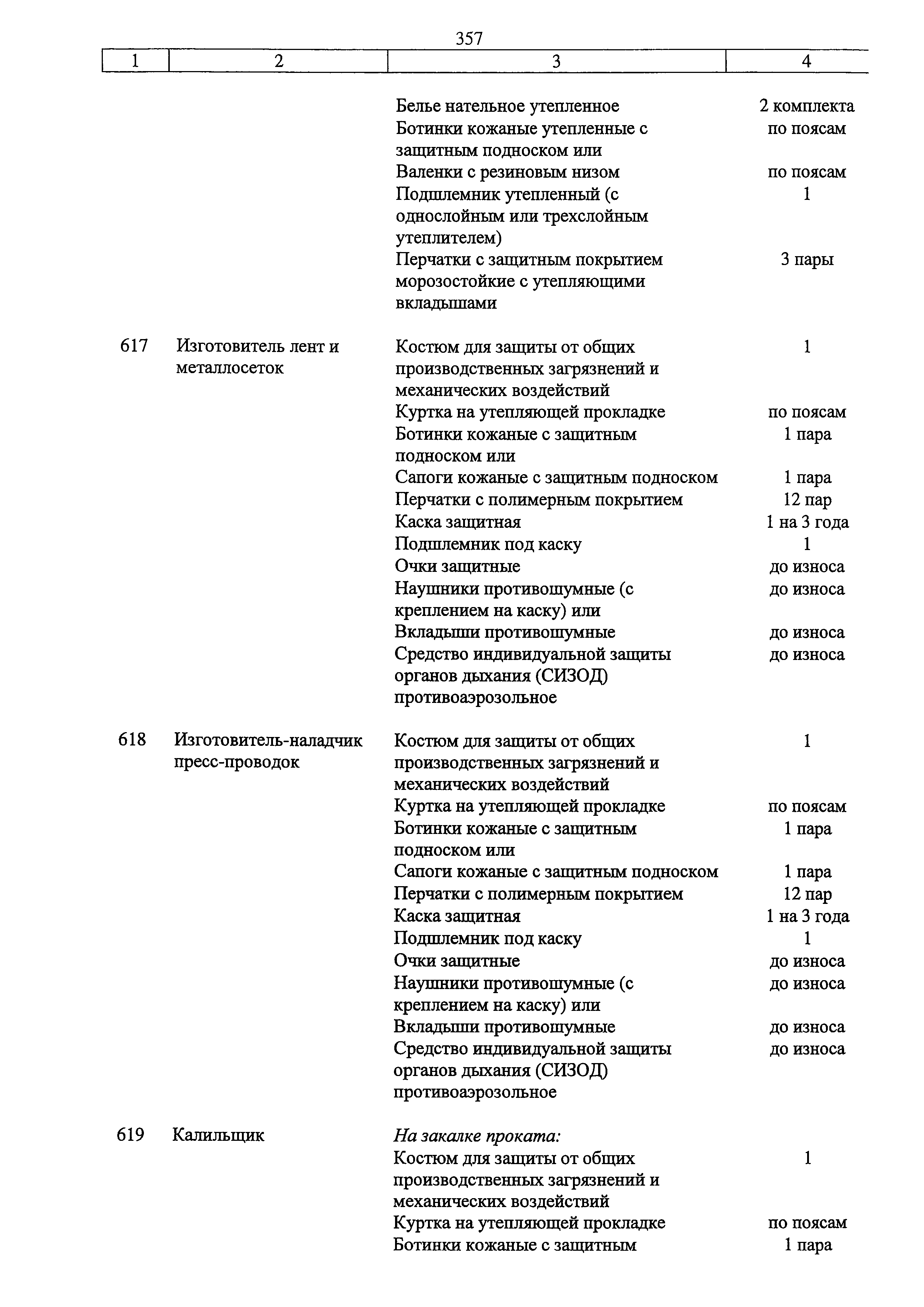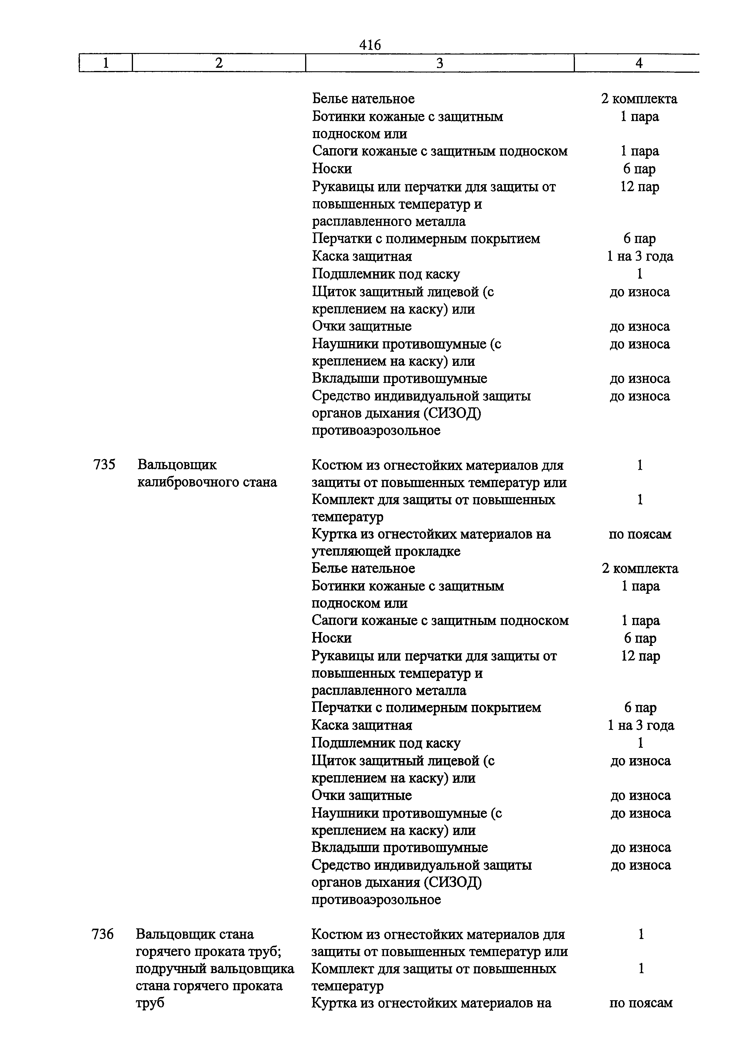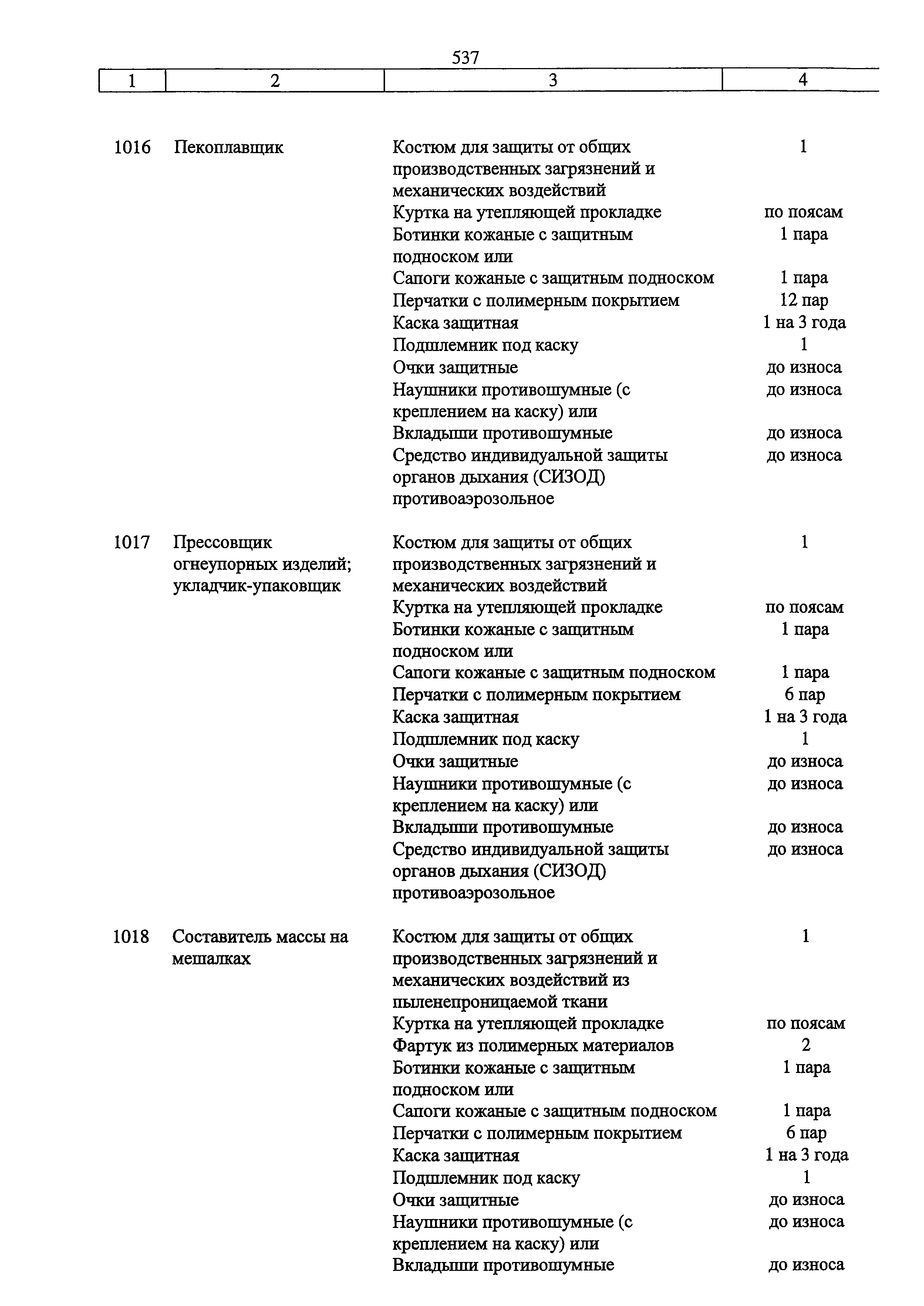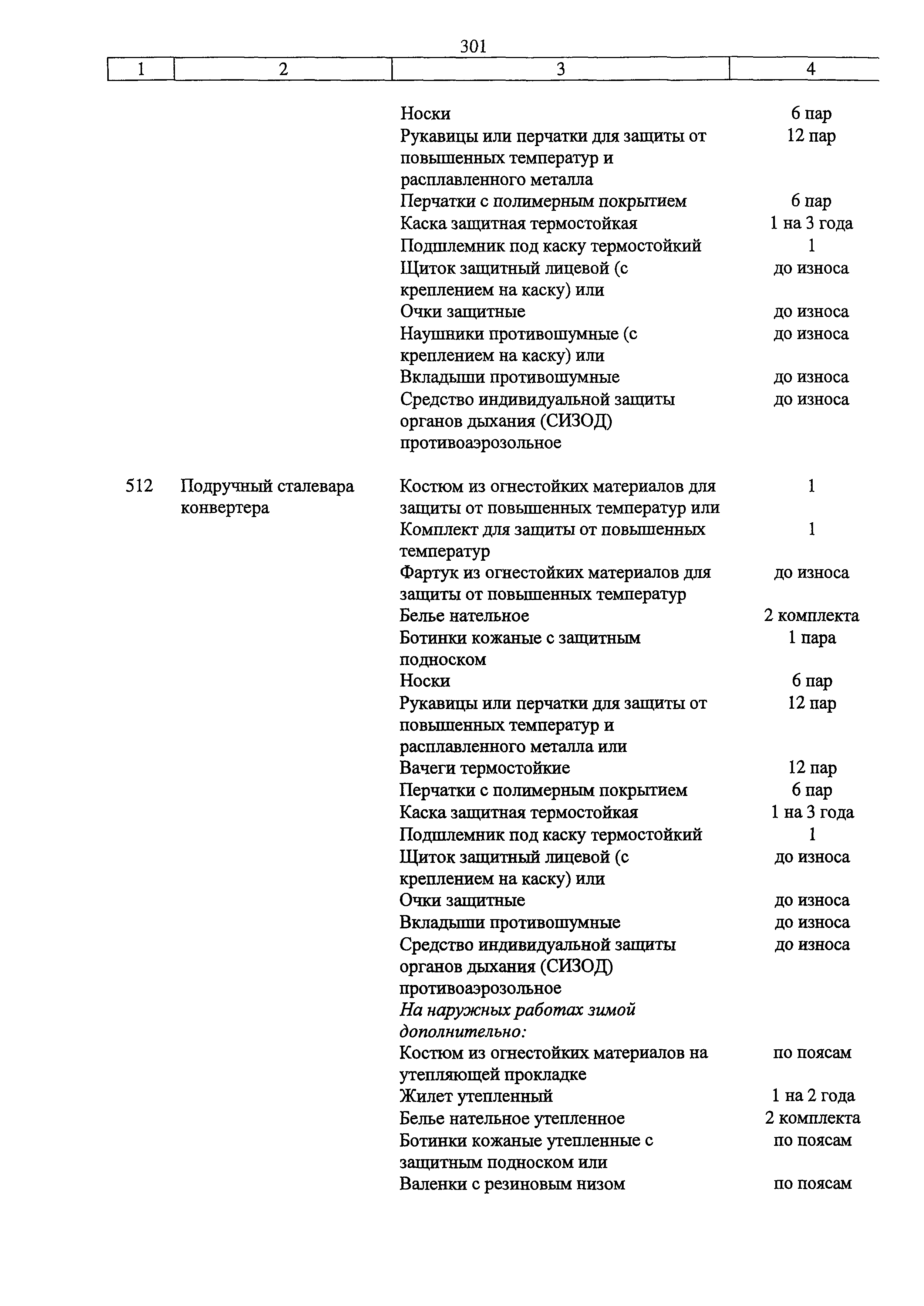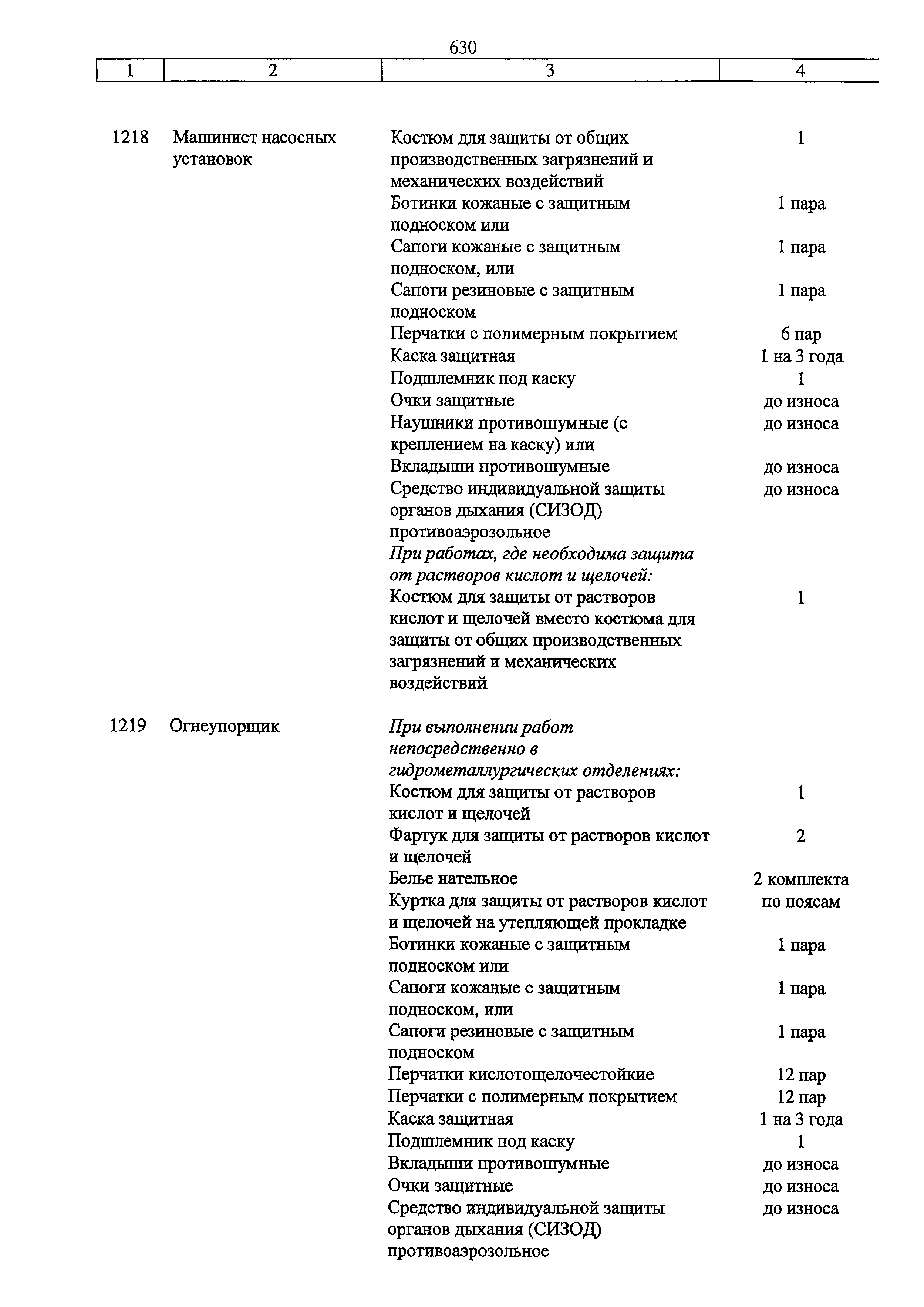 Типовые нормы бесплатной выдачи специальной одежды, специальной обуви и других средств индивидуальной защиты работникам горной и металлургической промышленности и металлургических производств других отраслей промышленности, занятым на работах с вредными и (или) опасными условиями труда, а также на работах, выполняемых в особых температурных условиях или связанных с загрязнением| Статус: | действует | | Название рус.: | Типовые нормы бесплатной выдачи специальной одежды, специальной обуви и других средств индивидуальной защиты работникам горной и металлургической промышленности и металлургических производств других отраслей промышленности, занятым на работах с вредными и (или) опасными условиями труда, а также на работах, выполняемых в особых температурных условиях или связанных с загрязнением | | Дата добавления в базу: | 01.02.2017 | | Дата актуализации: | 01.01.2021 | | Дата введения: | 14.02.2014 | | Область применения: | Нормы утверждаются локальными нормативными актами работодателя на основании результатов аттестации рабочих мест по условиям труда и могут быть включены в коллективный и (или) трудовой договор с указанием типовых норм, по сравнению с которыми улучшается обеспечение работников специальной одеждой, специальной обувью и другими средствами индивидуальной защиты. | | Оглавление: | I Горнодобывающая промышленность 1 Подземные горные работы (шахты) 2 Открытые горные работы и шахтная поверхность 3 Работа на гидравлических установках или с промывочными приборами 4 Дражные работы II Дробление, обогащение, брикетирование, обжиг, агломерация, извлечение металлов и сплавов III Черная металлургия 1 Коксохимическое производство 1.1 Углеподготовительные цеха 1.2 Углеобогатительные цеха 1.3 Производство каменноугольного кокса 1.4 Производство кристаллического нафталина, кумароновой смолы, смолоперерабатывающие цеха 1.5 Производство пиридиновых и фенольно-крезольных продуктов 1.6 Цеха улавливания химических продуктов и газовые цеха 1.7 Цеха ректификации сырого бензола 1.8 Цеха очистки коксового газа от сероводорода 1.9 Производство пекового кокса 1.10 Производство термоантрацита 2 Доменное производство 3 Сталеплавильное производство 3.1 Установки непрерывной разливки стали 4 Производство ферросплавов 4.1 Электролитическое производство 4.2 Производство электролитического хрома 4.3 Производство феррованадия 4.4 Подготовка шихты, обжиг руд и концентратов 4.5 Разливка и разделка ферросплавов 4.6 Обжиг извести 4.7 Общие профессии и должности ферросплавного производства 5 Прокатное производство 6 Производство труб (прокатка, сварка и волочение) 7 Колесопрокатное и бандажное производства 8 Валопрокатное производство 9 Производство рельсовых скреплений 10 Производство баллонов 11 Труболитейное производство 12 Производство метизов 12.1 Производство металлических канатов, сеток, пружин и пружинной ленты, щеток, цепей, колючей проволоки и других метизов 12.2 Волочение проволоки, калибровка и шлифовка металла 12.3 Изготовление волок 12.4 Холодноштамповочные и кузнечно-прессовые работы 12.5 Термическая обработка 12.6 Травление металла, защитные покрытия проволоки и извлечение железного купороса 12.7 Производство металлических электродов и порошковой проволоки 13 Производство огнеупоров 13.1 Огнеупоры 13.2 Карборундовые стержни 13.3 Высокоогнеупорные окислы 14 Ремонт 