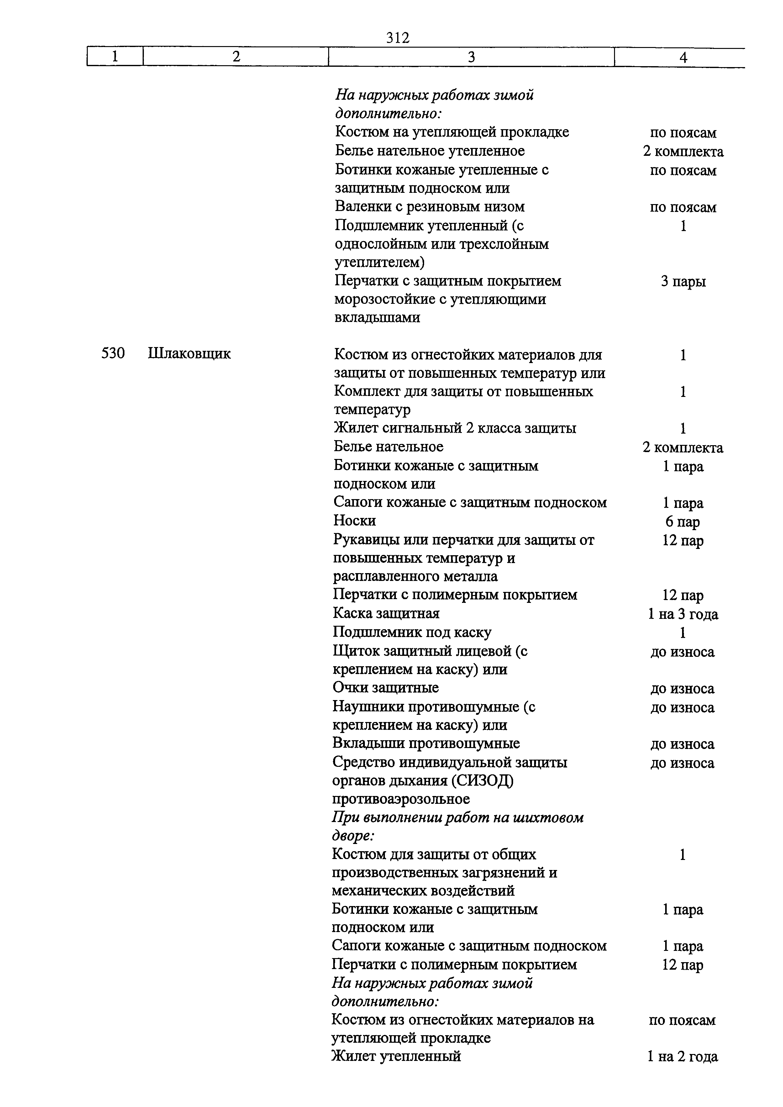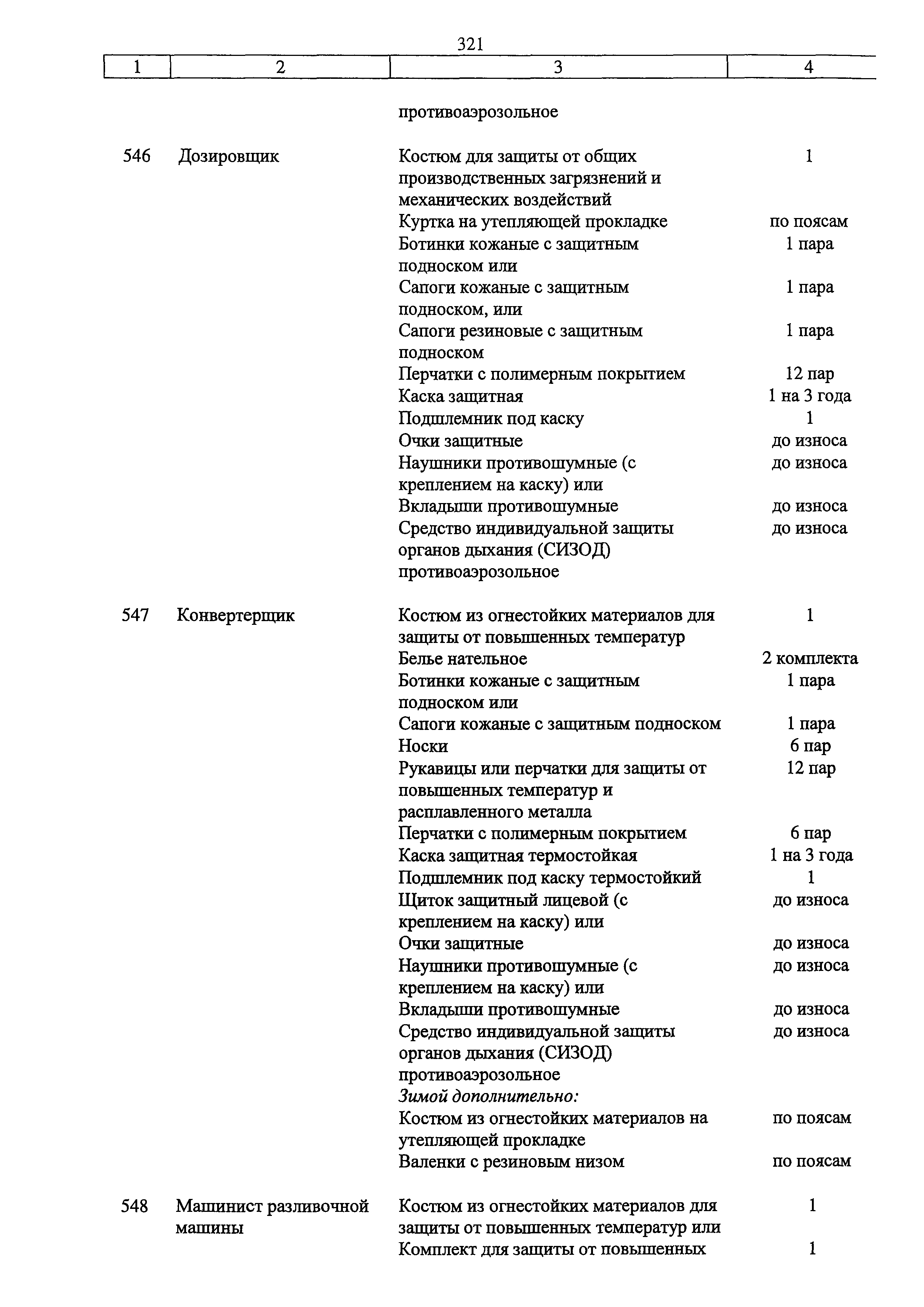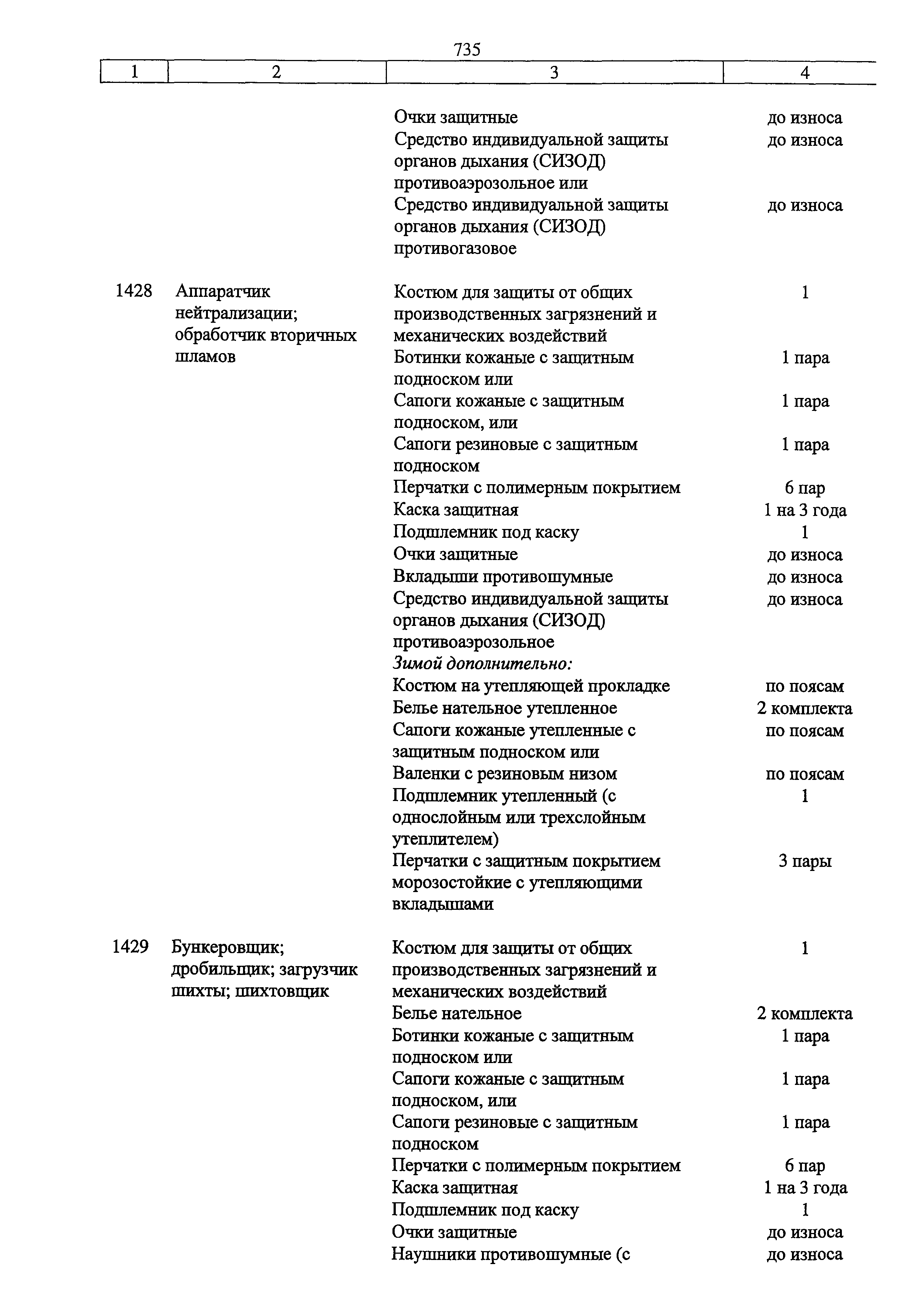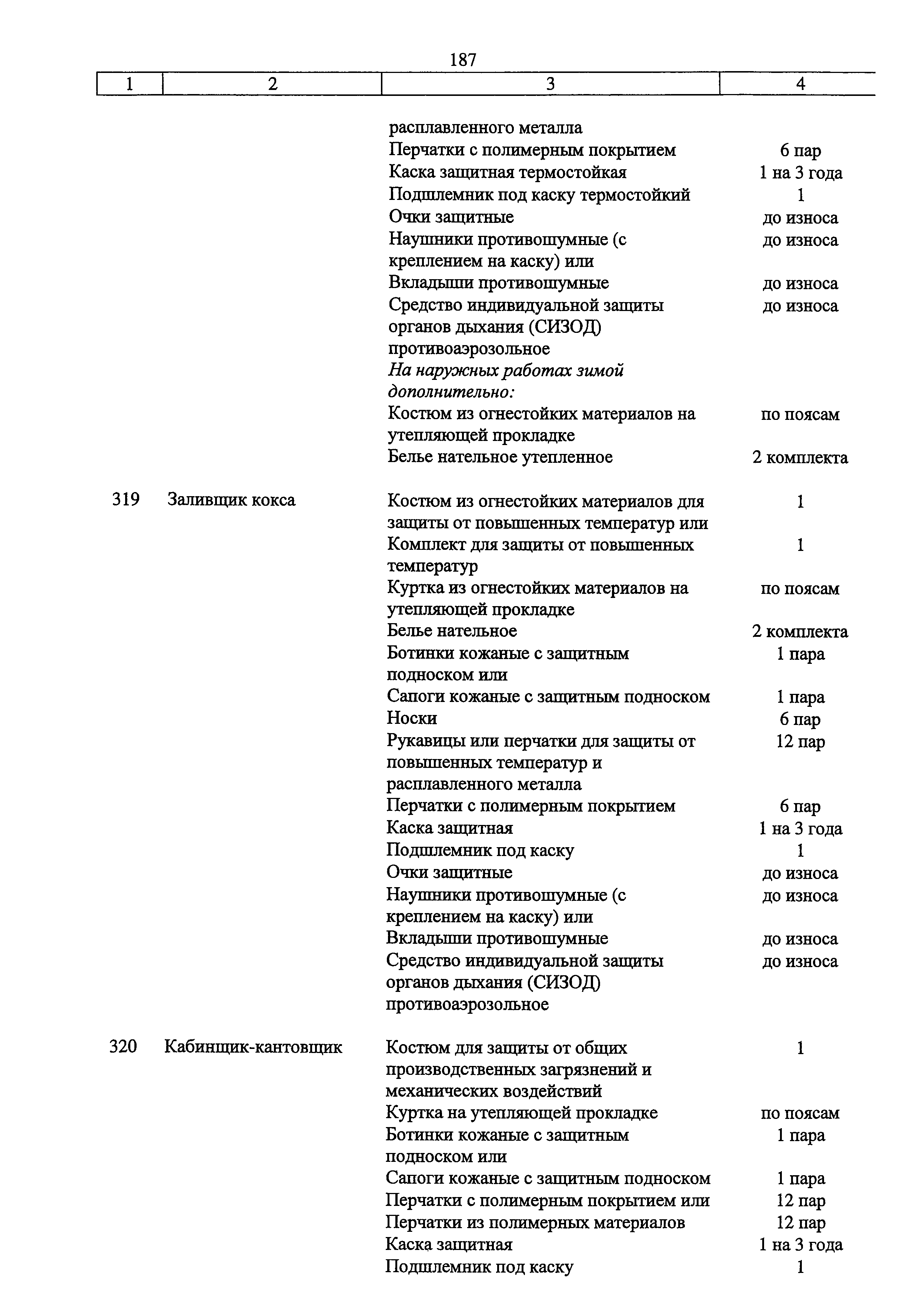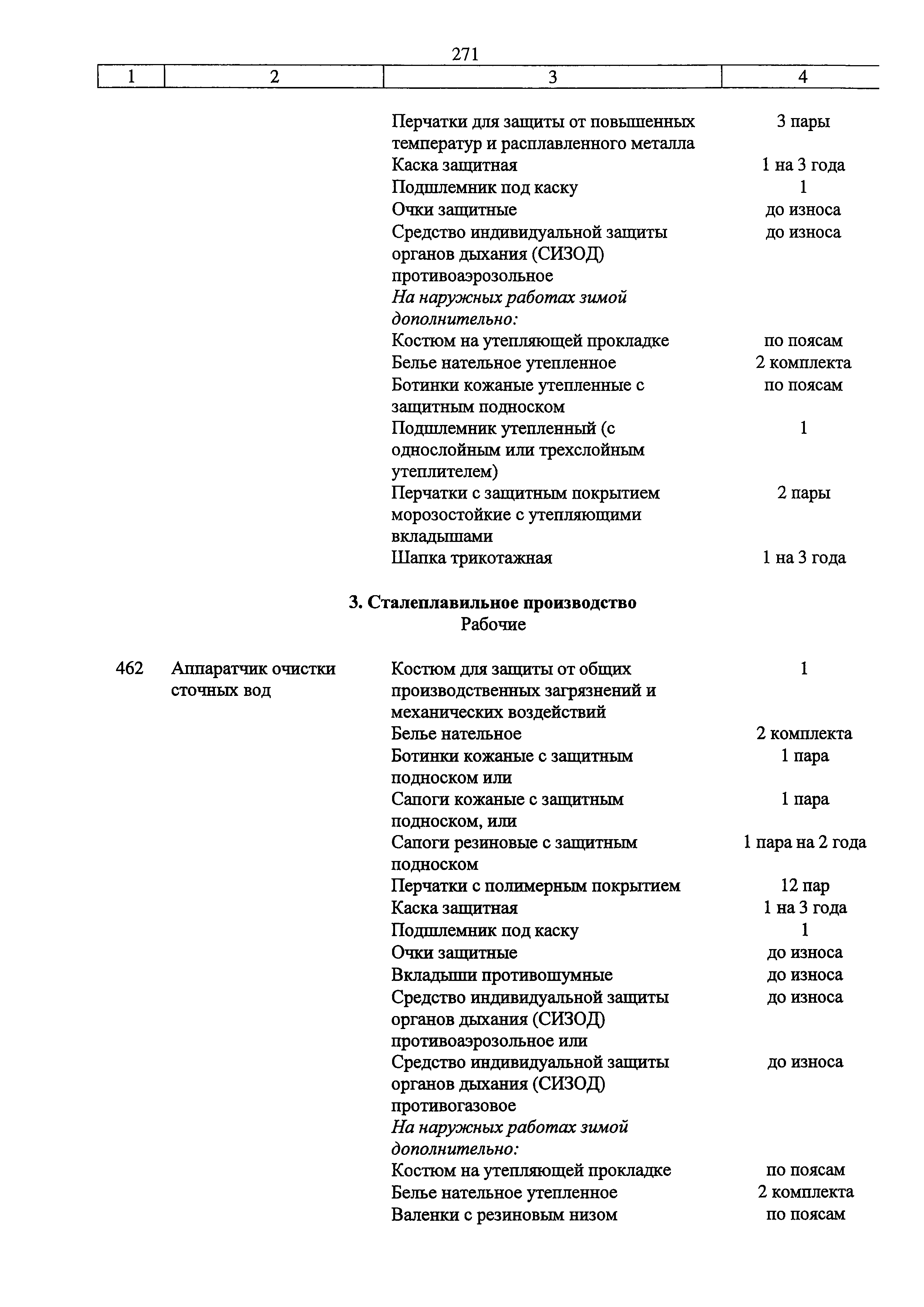 Типовые нормы бесплатной выдачи специальной одежды, специальной обуви и других средств индивидуальной защиты работникам горной и металлургической промышленности и металлургических производств других отраслей промышленности, занятым на работах с вредными и (или) опасными условиями труда, а также на работах, выполняемых в особых температурных условиях или связанных с загрязнением| Статус: | действует | | Название рус.: | Типовые нормы бесплатной выдачи специальной одежды, специальной обуви и других средств индивидуальной защиты работникам горной и металлургической промышленности и металлургических производств других отраслей промышленности, занятым на работах с вредными и (или) опасными условиями труда, а также на работах, выполняемых в особых температурных условиях или связанных с загрязнением | | Дата добавления в базу: | 01.02.2017 | | Дата актуализации: | 01.01.2021 | | Дата введения: | 14.02.2014 | | Область применения: | Нормы утверждаются локальными нормативными актами работодателя на основании результатов аттестации рабочих мест по условиям труда и могут быть включены в коллективный и (или) трудовой договор с указанием типовых норм, по сравнению с которыми улучшается обеспечение работников специальной одеждой, специальной обувью и другими средствами индивидуальной защиты. | | Оглавление: | I Горнодобывающая промышленность 1 Подземные горные работы (шахты) 2 Открытые горные работы и шахтная поверхность 3 Работа на гидравлических установках или с промывочными приборами 4 Дражные работы II Дробление, обогащение, брикетирование, обжиг, агломерация, извлечение металлов и сплавов III Черная металлургия 1 Коксохимическое производство 1.1 Углеподготовительные цеха 1.2 Углеобогатительные цеха 1.3 Производство каменноугольного кокса 1.4 Производство кристаллического нафталина, кумароновой смолы, смолоперерабатывающие цеха 1.5 Производство пиридиновых и фенольно-крезольных продуктов 1.6 Цеха улавливания химических продуктов и газовые цеха 1.7 Цеха ректификации сырого бензола 1.8 Цеха очистки коксового газа от сероводорода 1.9 Производство пекового кокса 1.10 Производство термоантрацита 2 Доменное производство 3 Сталеплавильное производство 3.1 Установки непрерывной разливки стали 4 Производство ферросплавов 4.1 Электролитическое производство 4.2 Производство электролитического хрома 4.3 Производство феррованадия 4.4 Подготовка шихты, обжиг руд и концентратов 4.5 Разливка и разделка ферросплавов 4.6 Обжиг извести 4.7 Общие профессии и должности ферросплавного производства 5 Прокатное производство 6 Производство труб (прокатка, сварка и волочение) 7 Колесопрокатное и бандажное производства 8 Валопрокатное производство 9 Производство рельсовых скреплений 10 Производство баллонов 11 Труболитейное производство 12 Производство метизов 12.1 Производство металлических канатов, сеток, пружин и пружинной ленты, щеток, цепей, колючей проволоки и других метизов 12.2 Волочение проволоки, калибровка и шлифовка металла 12.3 Изготовление волок 12.4 Холодноштамповочные и кузнечно-прессовые работы 12.5 Термическая обработка 12.6 Травление металла, защитные покрытия проволоки и извлечение железного купороса 12.7 Производство металлических электродов и порошковой проволоки 13 Производство огнеупоров 13.1 Огнеупоры 13.2 Карборундовые стержни 13.3 Высокоогнеупорные окислы 14 Ремонт 