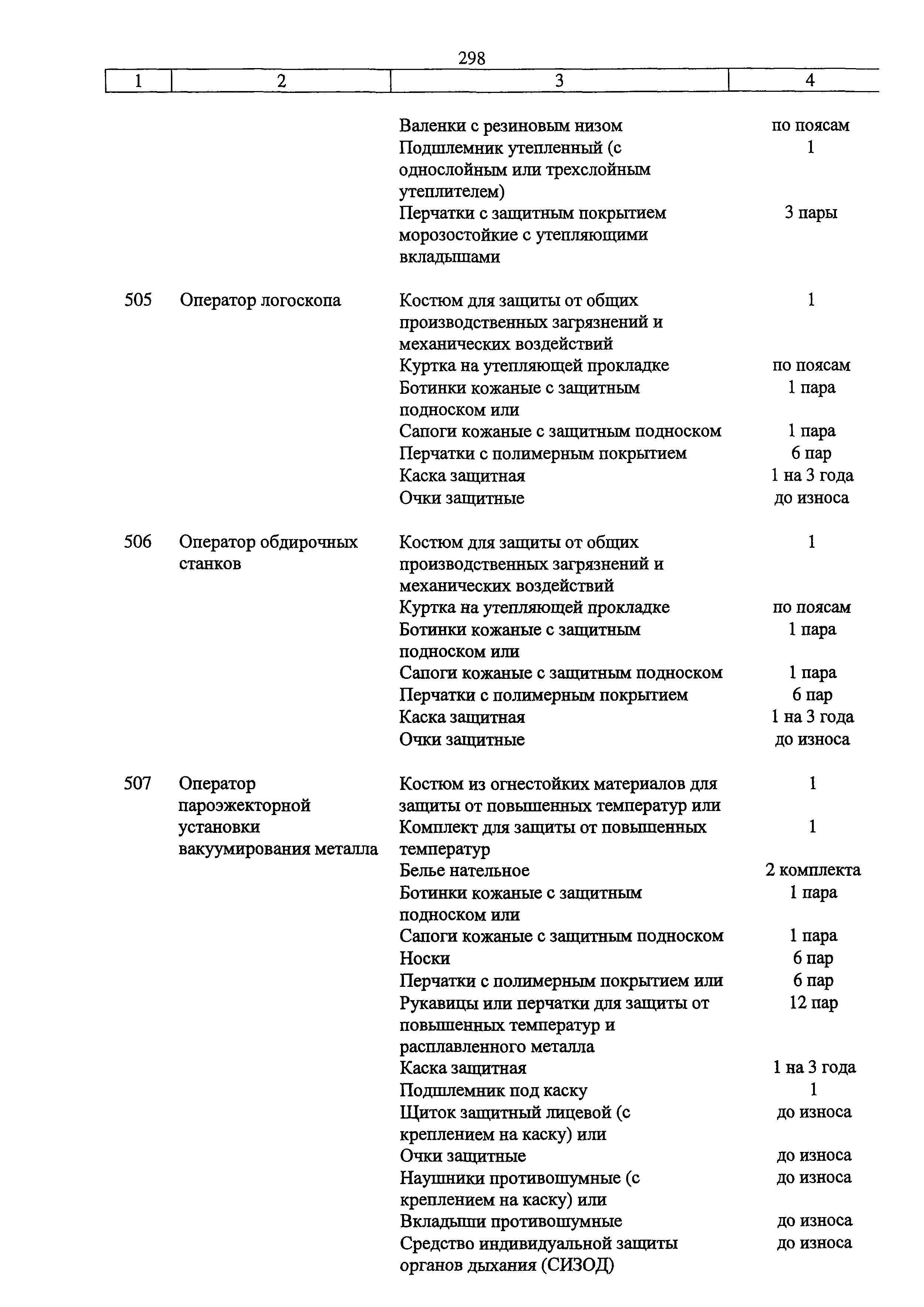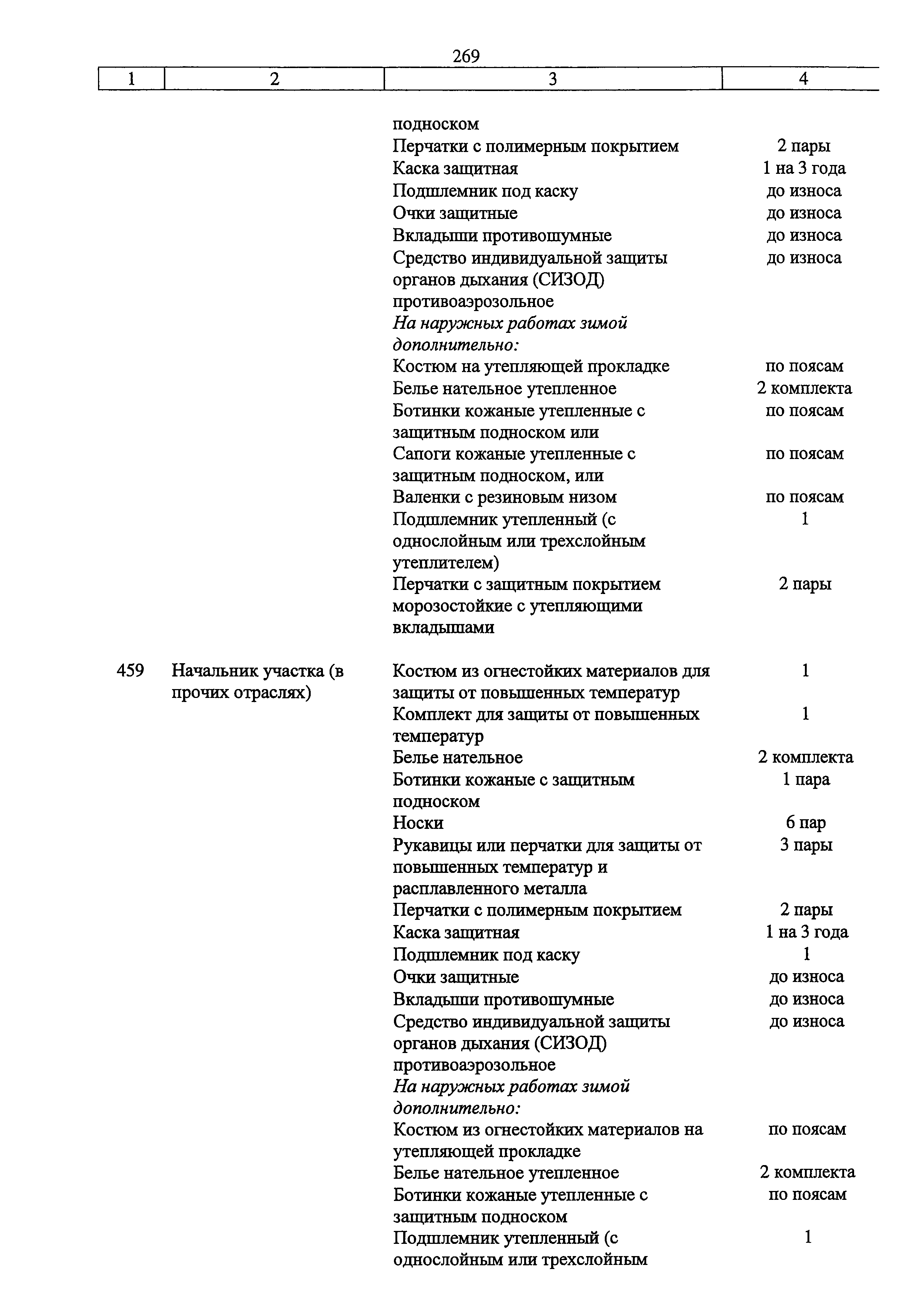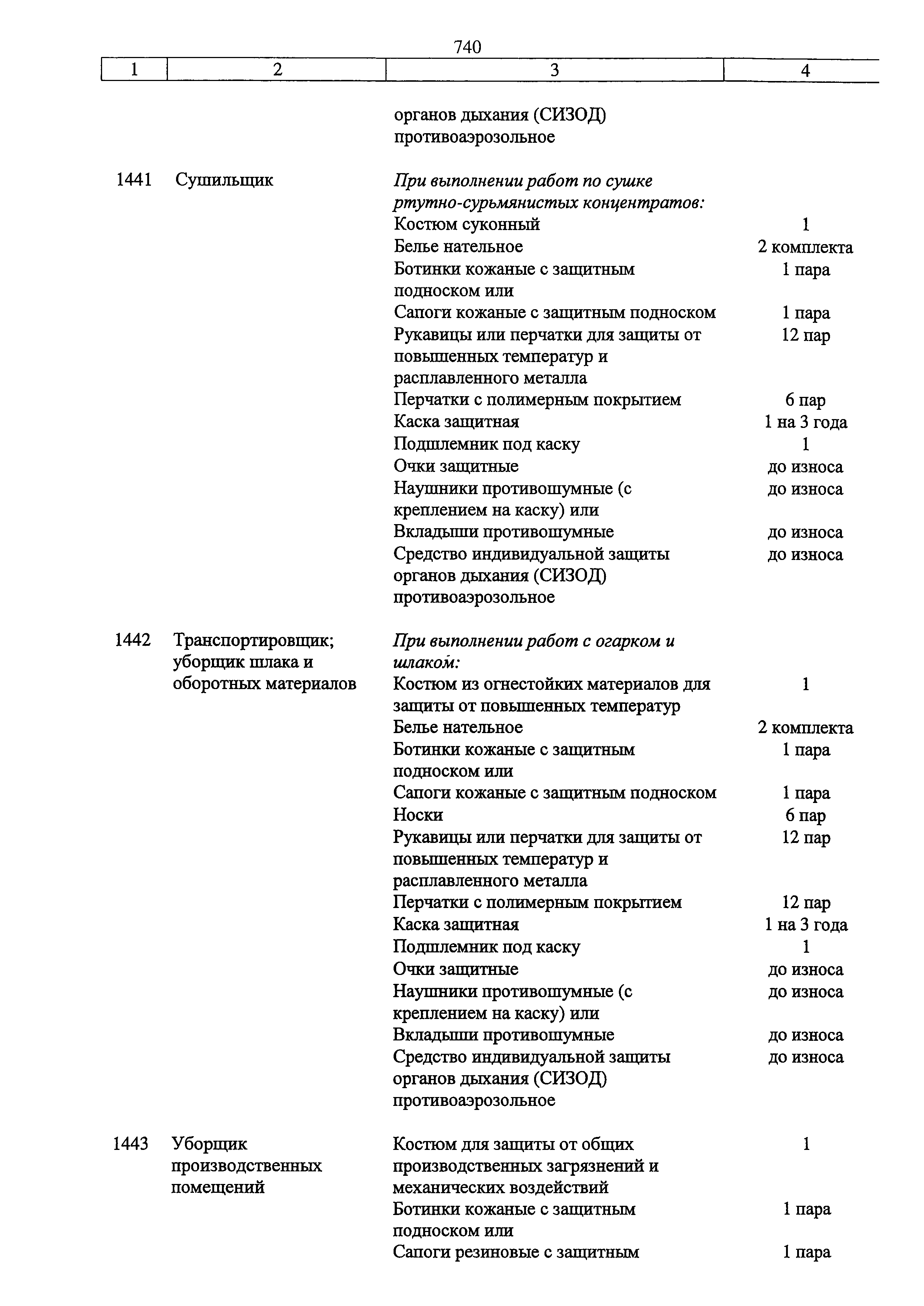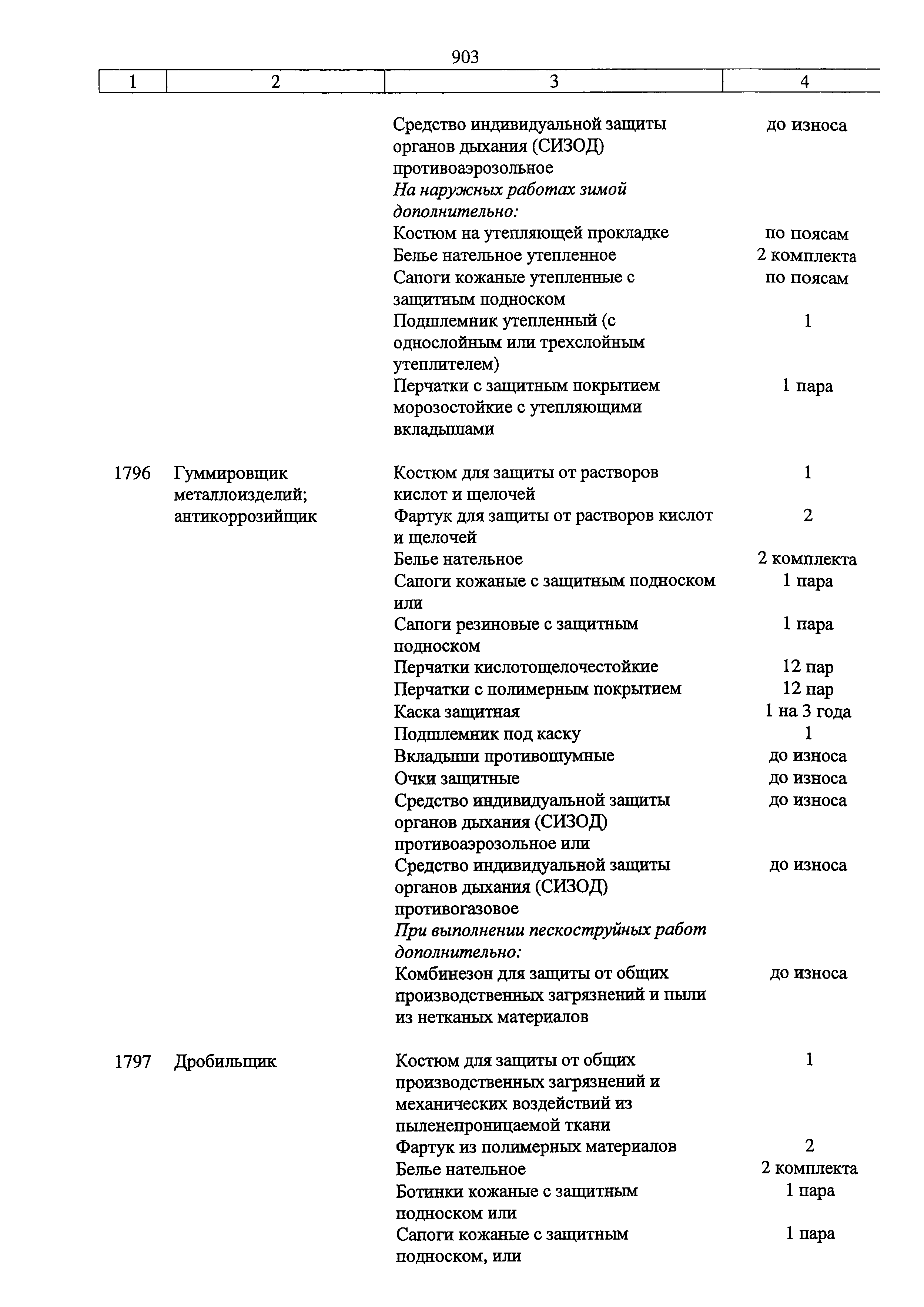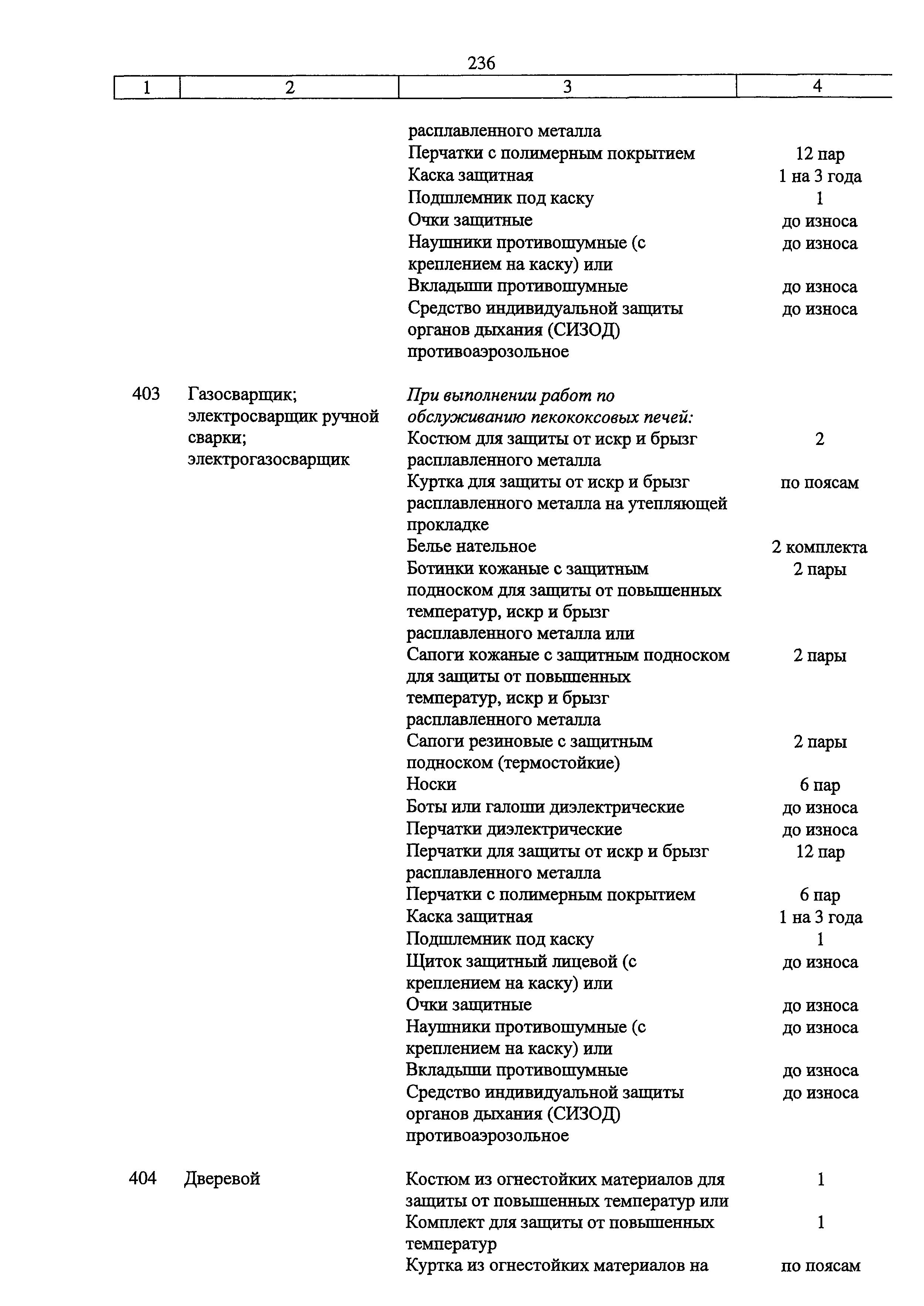 Типовые нормы бесплатной выдачи специальной одежды, специальной обуви и других средств индивидуальной защиты работникам горной и металлургической промышленности и металлургических производств других отраслей промышленности, занятым на работах с вредными и (или) опасными условиями труда, а также на работах, выполняемых в особых температурных условиях или связанных с загрязнением| Статус: | действует | | Название рус.: | Типовые нормы бесплатной выдачи специальной одежды, специальной обуви и других средств индивидуальной защиты работникам горной и металлургической промышленности и металлургических производств других отраслей промышленности, занятым на работах с вредными и (или) опасными условиями труда, а также на работах, выполняемых в особых температурных условиях или связанных с загрязнением | | Дата добавления в базу: | 01.02.2017 | | Дата актуализации: | 01.01.2021 | | Дата введения: | 14.02.2014 | | Область применения: | Нормы утверждаются локальными нормативными актами работодателя на основании результатов аттестации рабочих мест по условиям труда и могут быть включены в коллективный и (или) трудовой договор с указанием типовых норм, по сравнению с которыми улучшается обеспечение работников специальной одеждой, специальной обувью и другими средствами индивидуальной защиты. | | Оглавление: | I Горнодобывающая промышленность 1 Подземные горные работы (шахты) 2 Открытые горные работы и шахтная поверхность 3 Работа на гидравлических установках или с промывочными приборами 4 Дражные работы II Дробление, обогащение, брикетирование, обжиг, агломерация, извлечение металлов и сплавов III Черная металлургия 1 Коксохимическое производство 1.1 Углеподготовительные цеха 1.2 Углеобогатительные цеха 1.3 Производство каменноугольного кокса 1.4 Производство кристаллического нафталина, кумароновой смолы, смолоперерабатывающие цеха 1.5 Производство пиридиновых и фенольно-крезольных продуктов 1.6 Цеха улавливания химических продуктов и газовые цеха 1.7 Цеха ректификации сырого бензола 1.8 Цеха очистки коксового газа от сероводорода 1.9 Производство пекового кокса 1.10 Производство термоантрацита 2 Доменное производство 3 Сталеплавильное производство 3.1 Установки непрерывной разливки стали 4 Производство ферросплавов 4.1 Электролитическое производство 4.2 Производство электролитического хрома 4.3 Производство феррованадия 4.4 Подготовка шихты, обжиг руд и концентратов 4.5 Разливка и разделка ферросплавов 4.6 Обжиг извести 4.7 Общие профессии и должности ферросплавного производства 5 Прокатное производство 6 Производство труб (прокатка, сварка и волочение) 7 Колесопрокатное и бандажное производства 8 Валопрокатное производство 9 Производство рельсовых скреплений 10 Производство баллонов 11 Труболитейное производство 12 Производство метизов 12.1 Производство металлических канатов, сеток, пружин и пружинной ленты, щеток, цепей, колючей проволоки и других метизов 12.2 Волочение проволоки, калибровка и шлифовка металла 12.3 Изготовление волок 12.4 Холодноштамповочные и кузнечно-прессовые работы 12.5 Термическая обработка 12.6 Травление металла, защитные покрытия проволоки и извлечение железного купороса 12.7 Производство металлических электродов и порошковой проволоки 13 Производство огнеупоров 13.1 Огнеупоры 13.2 Карборундовые стержни 13.3 Высокоогнеупорные окислы 14 Ремонт 