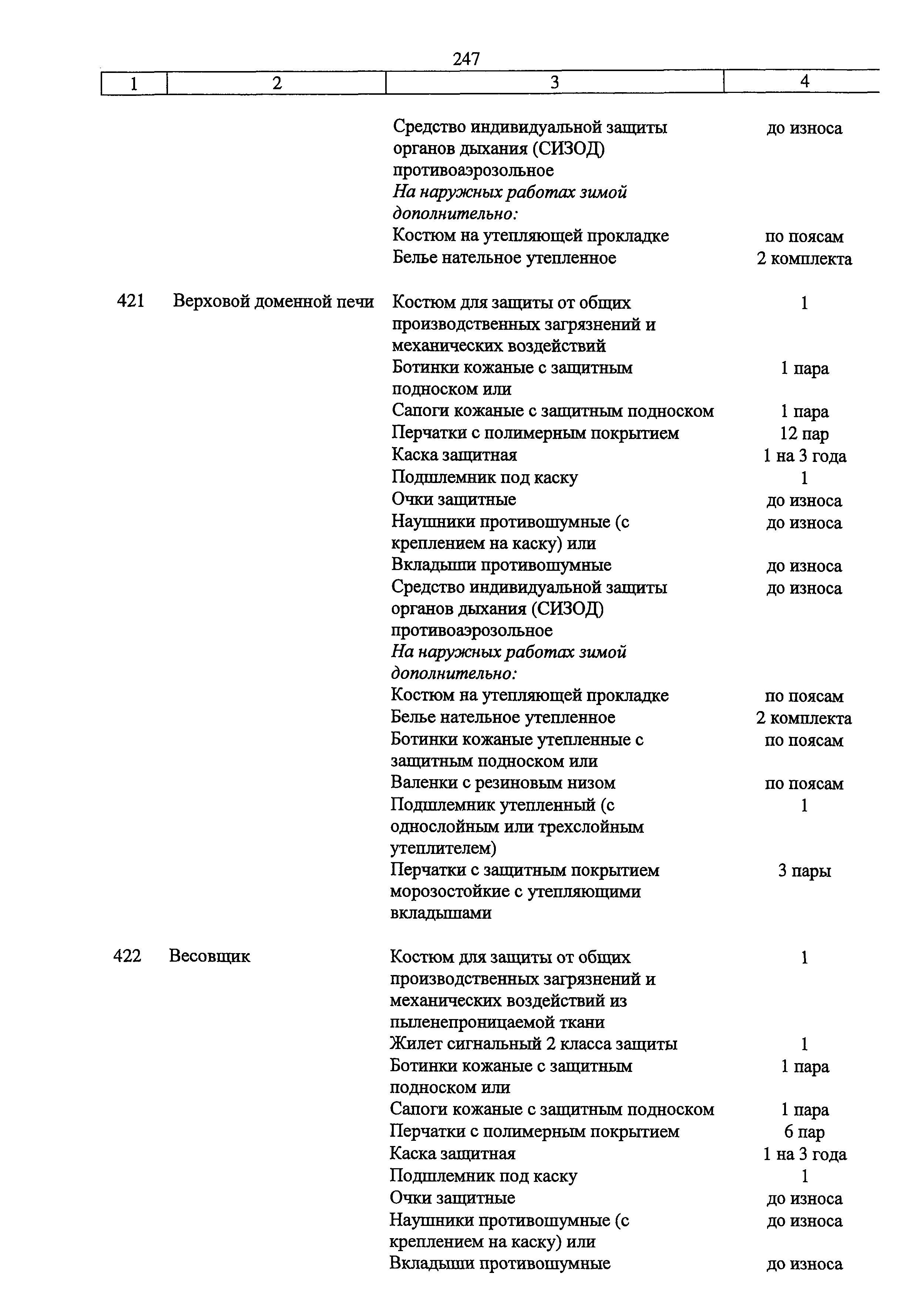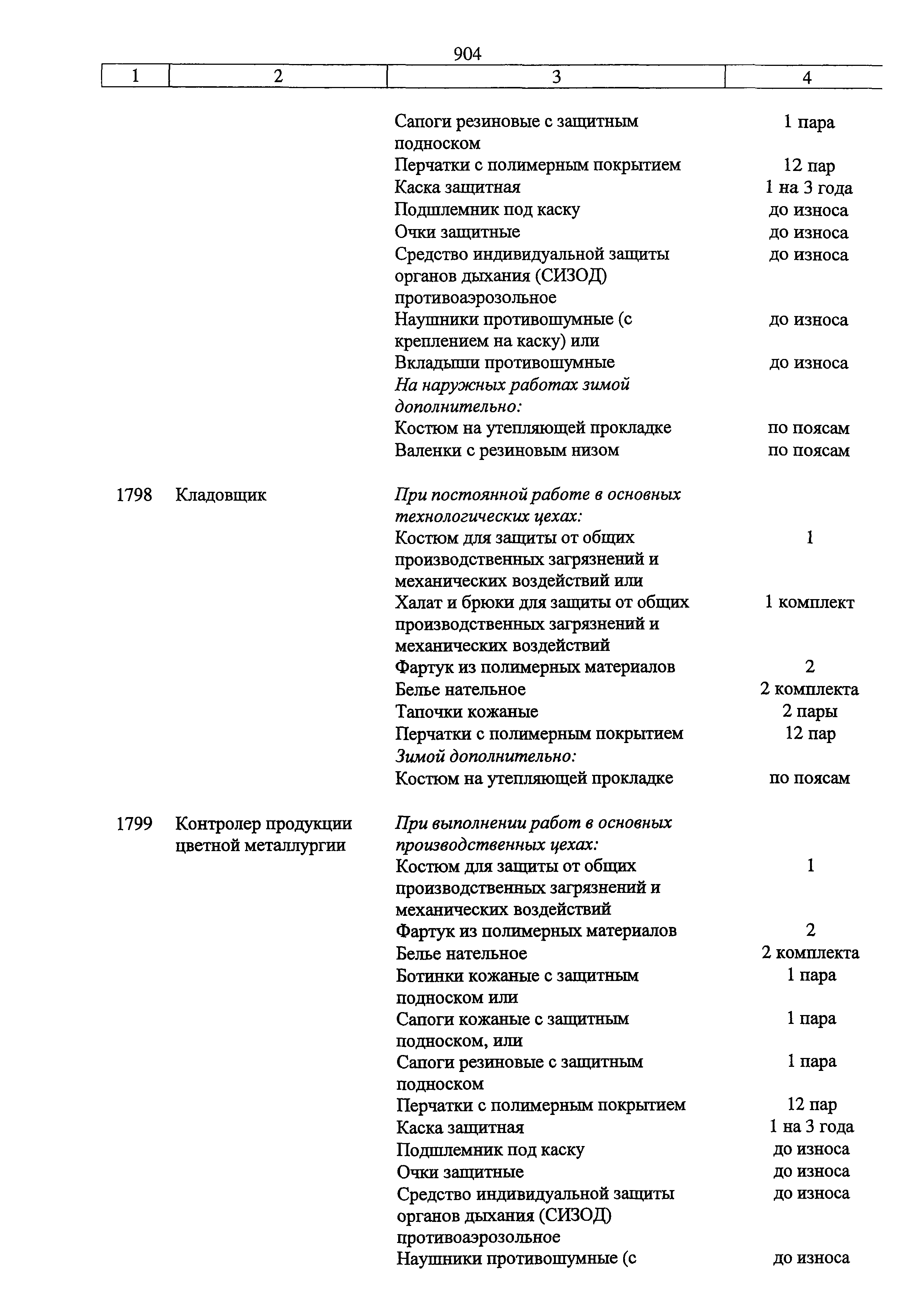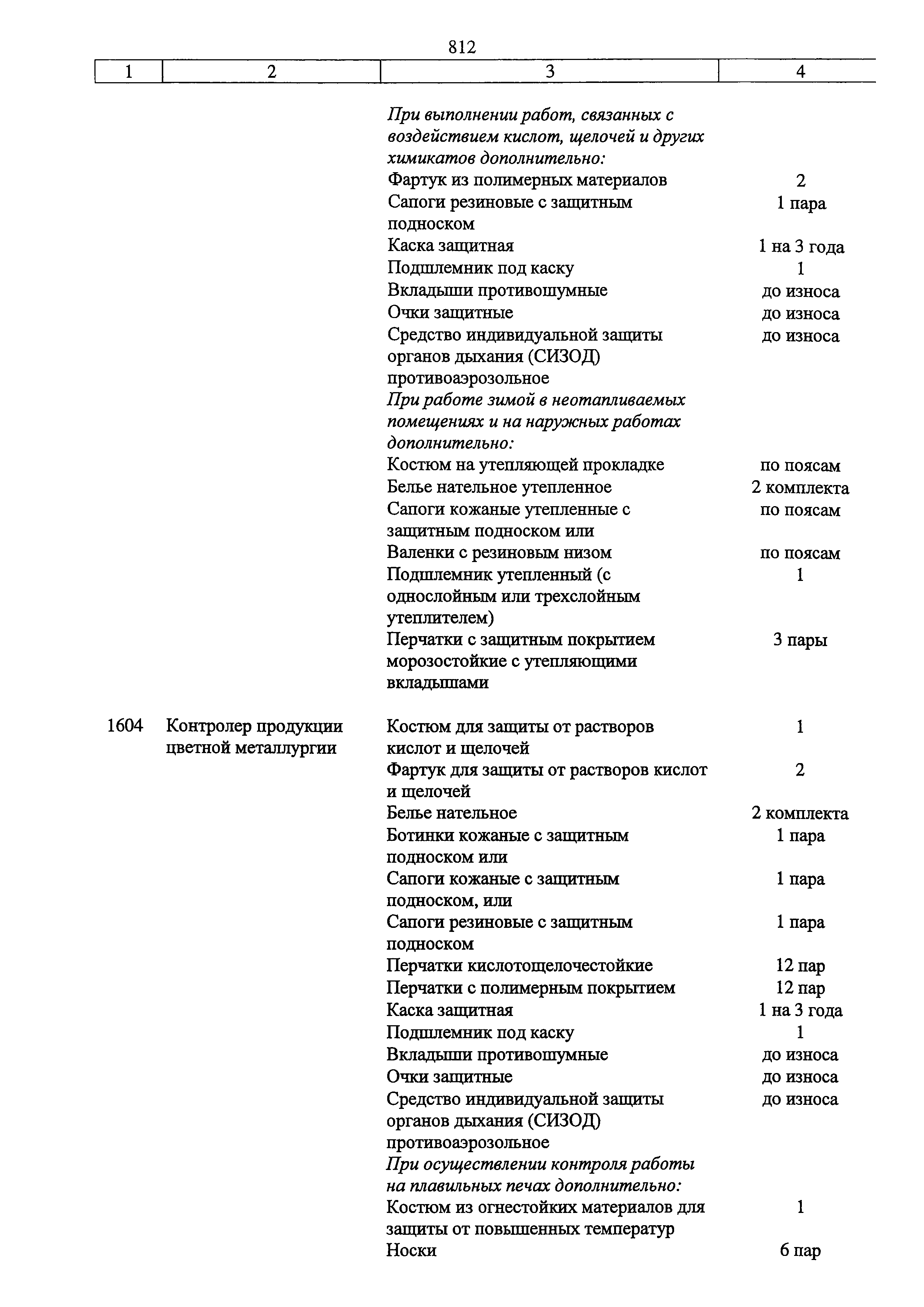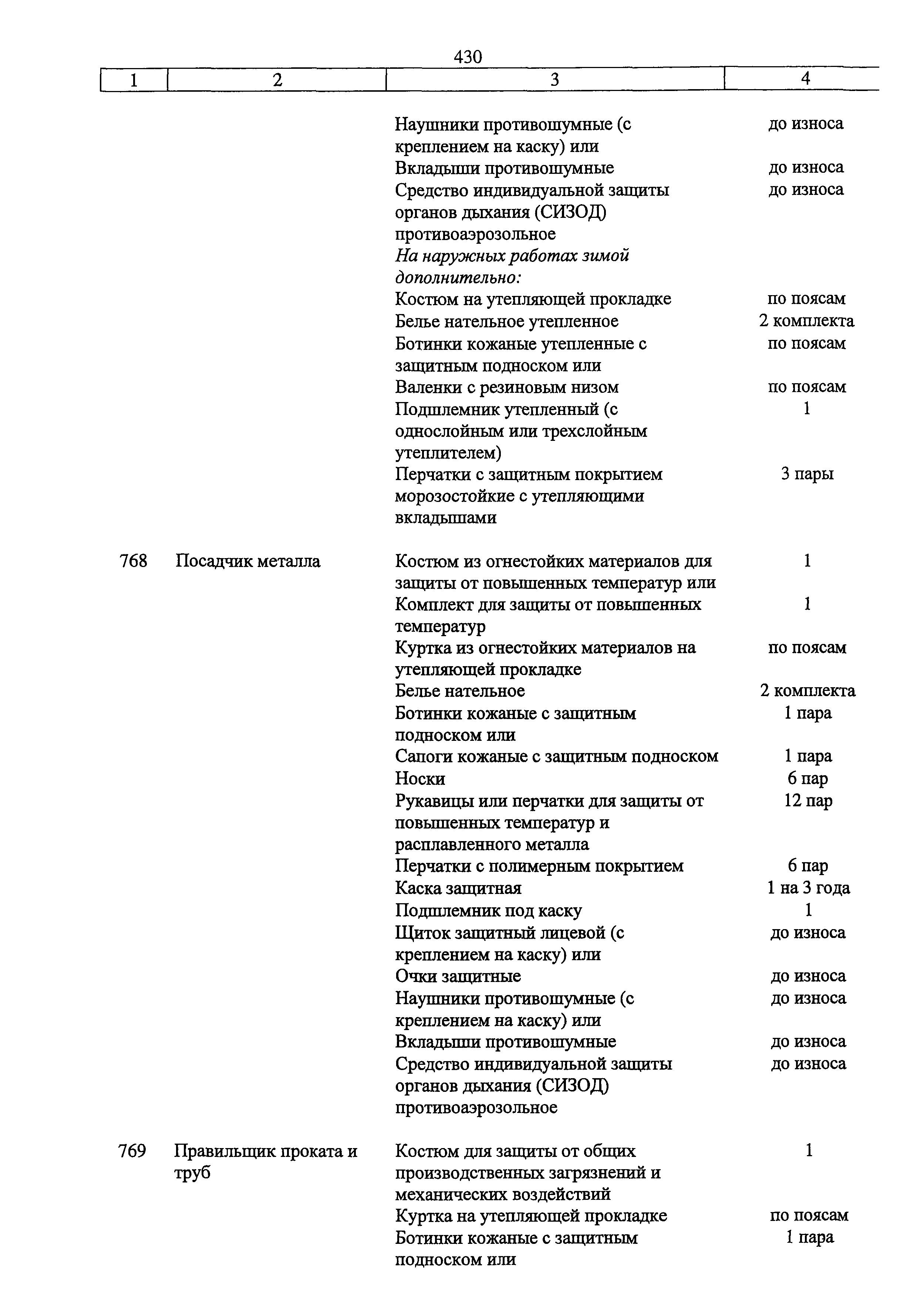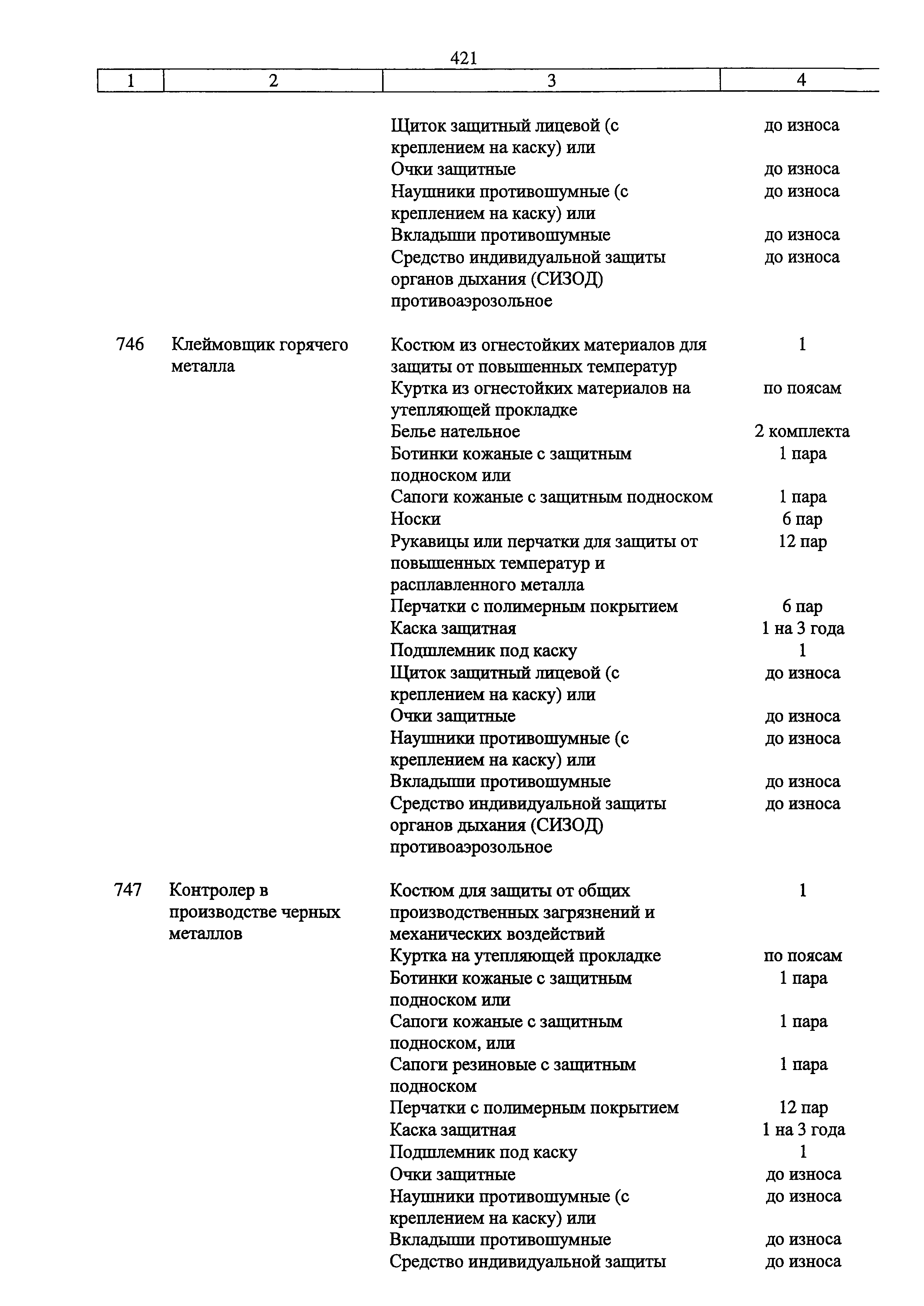 Типовые нормы бесплатной выдачи специальной одежды, специальной обуви и других средств индивидуальной защиты работникам горной и металлургической промышленности и металлургических производств других отраслей промышленности, занятым на работах с вредными и (или) опасными условиями труда, а также на работах, выполняемых в особых температурных условиях или связанных с загрязнением| Статус: | действует | | Название рус.: | Типовые нормы бесплатной выдачи специальной одежды, специальной обуви и других средств индивидуальной защиты работникам горной и металлургической промышленности и металлургических производств других отраслей промышленности, занятым на работах с вредными и (или) опасными условиями труда, а также на работах, выполняемых в особых температурных условиях или связанных с загрязнением | | Дата добавления в базу: | 01.02.2017 | | Дата актуализации: | 01.01.2021 | | Дата введения: | 14.02.2014 | | Область применения: | Нормы утверждаются локальными нормативными актами работодателя на основании результатов аттестации рабочих мест по условиям труда и могут быть включены в коллективный и (или) трудовой договор с указанием типовых норм, по сравнению с которыми улучшается обеспечение работников специальной одеждой, специальной обувью и другими средствами индивидуальной защиты. | | Оглавление: | I Горнодобывающая промышленность 1 Подземные горные работы (шахты) 2 Открытые горные работы и шахтная поверхность 3 Работа на гидравлических установках или с промывочными приборами 4 Дражные работы II Дробление, обогащение, брикетирование, обжиг, агломерация, извлечение металлов и сплавов III Черная металлургия 1 Коксохимическое производство 1.1 Углеподготовительные цеха 1.2 Углеобогатительные цеха 1.3 Производство каменноугольного кокса 1.4 Производство кристаллического нафталина, кумароновой смолы, смолоперерабатывающие цеха 1.5 Производство пиридиновых и фенольно-крезольных продуктов 1.6 Цеха улавливания химических продуктов и газовые цеха 1.7 Цеха ректификации сырого бензола 1.8 Цеха очистки коксового газа от сероводорода 1.9 Производство пекового кокса 1.10 Производство термоантрацита 2 Доменное производство 3 Сталеплавильное производство 3.1 Установки непрерывной разливки стали 4 Производство ферросплавов 4.1 Электролитическое производство 4.2 Производство электролитического хрома 4.3 Производство феррованадия 4.4 Подготовка шихты, обжиг руд и концентратов 4.5 Разливка и разделка ферросплавов 4.6 Обжиг извести 4.7 Общие профессии и должности ферросплавного производства 5 Прокатное производство 6 Производство труб (прокатка, сварка и волочение) 7 Колесопрокатное и бандажное производства 8 Валопрокатное производство 9 Производство рельсовых скреплений 10 Производство баллонов 11 Труболитейное производство 12 Производство метизов 12.1 Производство металлических канатов, сеток, пружин и пружинной ленты, щеток, цепей, колючей проволоки и других метизов 12.2 Волочение проволоки, калибровка и шлифовка металла 12.3 Изготовление волок 12.4 Холодноштамповочные и кузнечно-прессовые работы 12.5 Термическая обработка 12.6 Травление металла, защитные покрытия проволоки и извлечение железного купороса 12.7 Производство металлических электродов и порошковой проволоки 13 Производство огнеупоров 13.1 Огнеупоры 13.2 Карборундовые стержни 13.3 Высокоогнеупорные окислы 14 Ремонт 