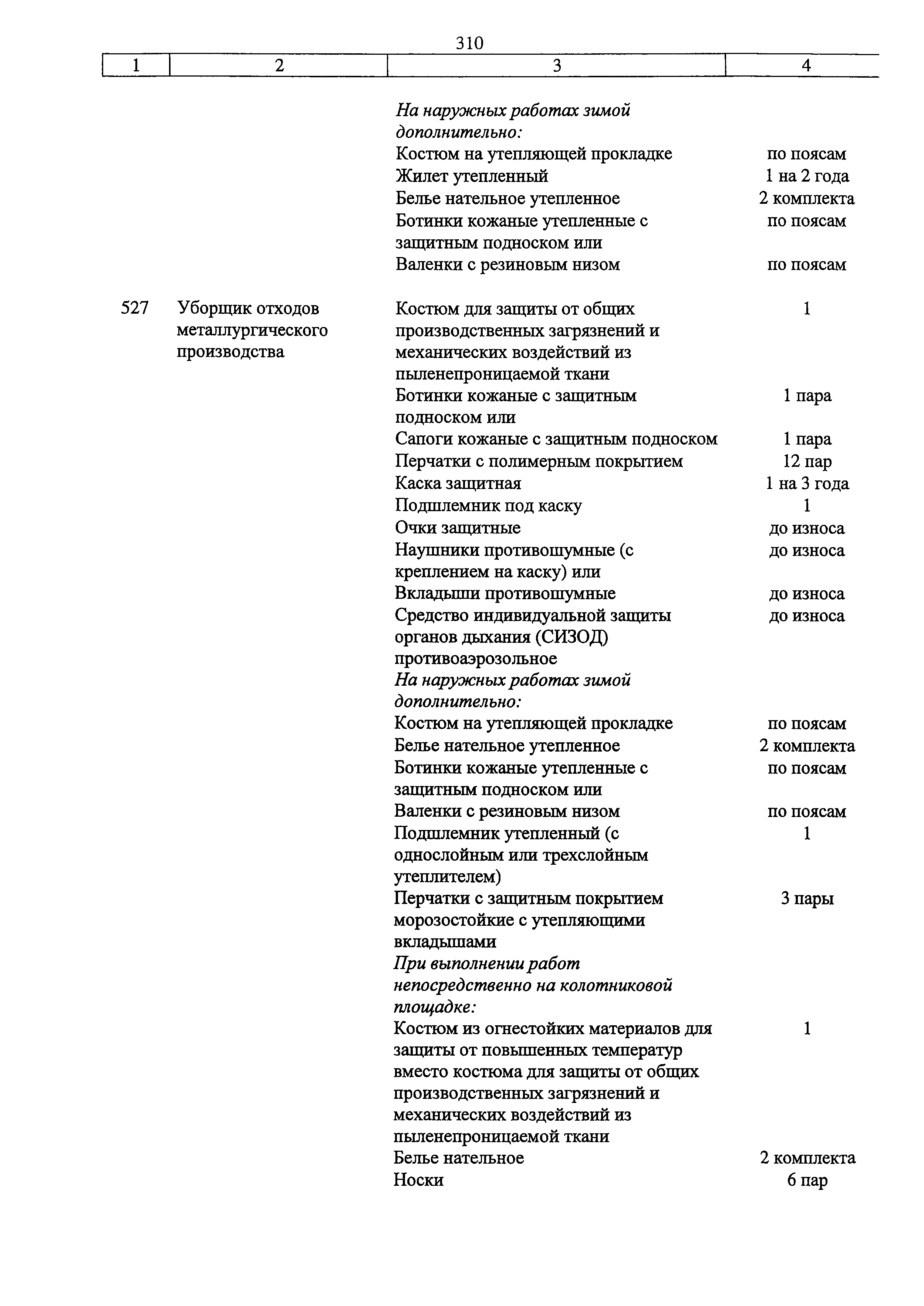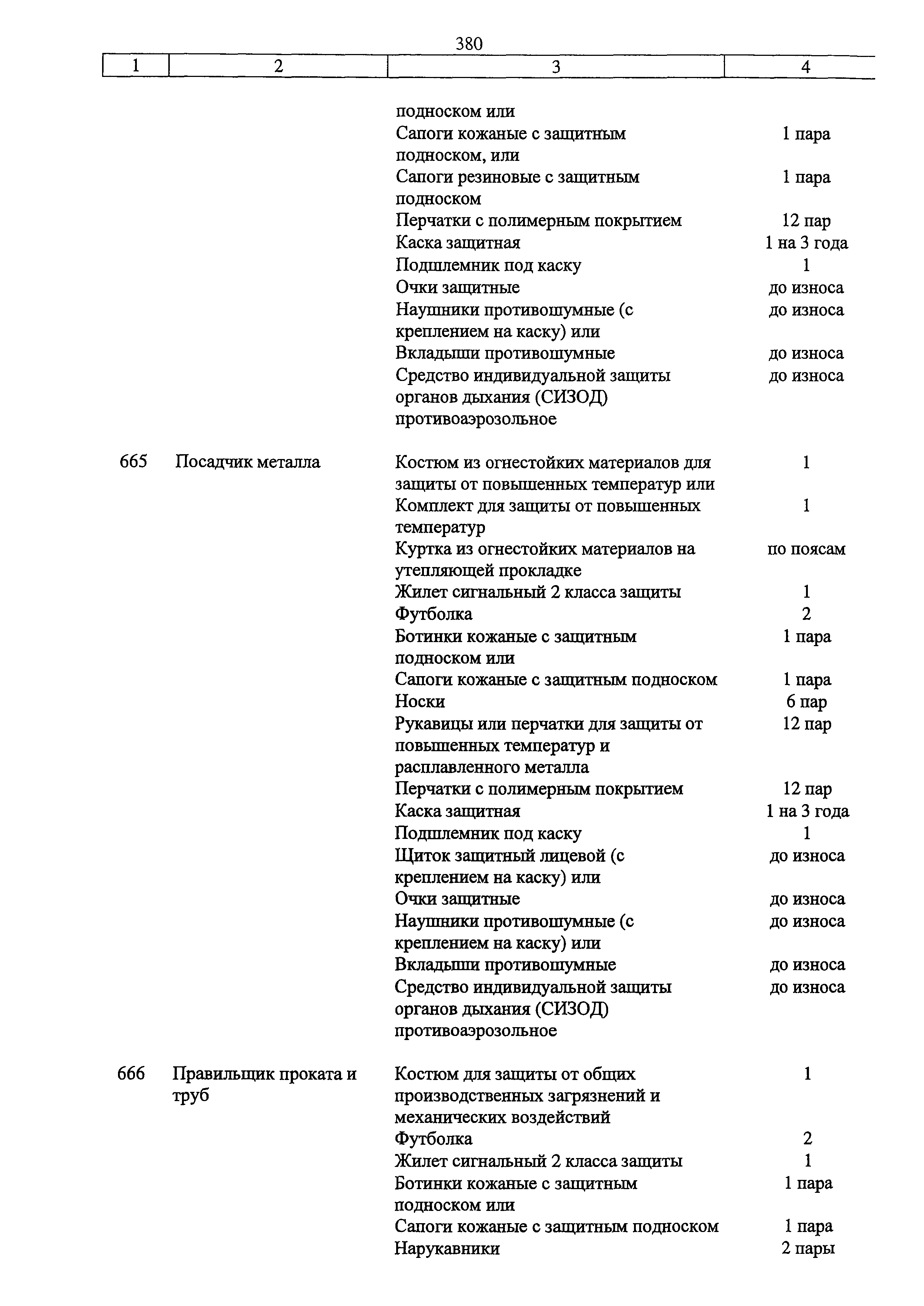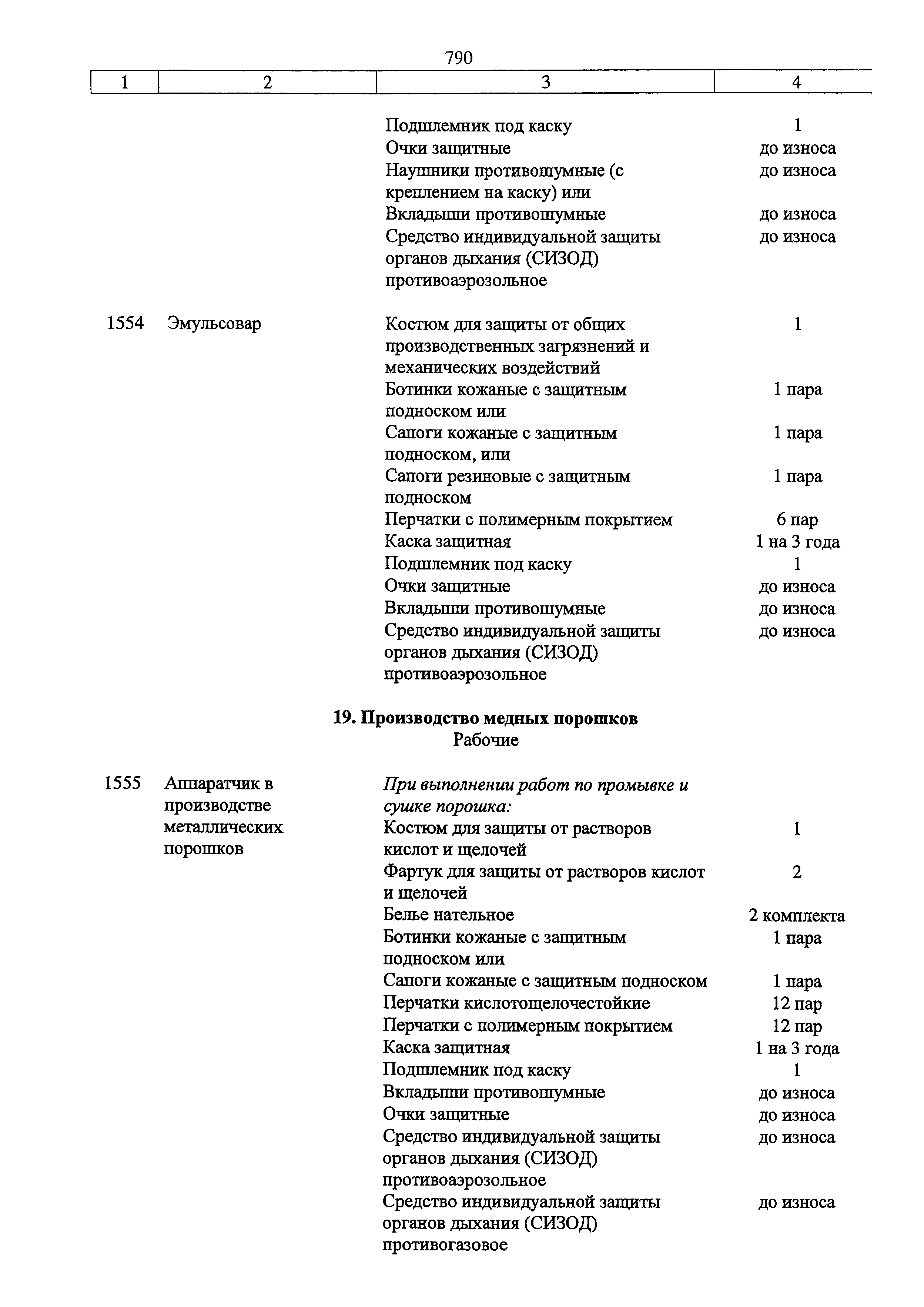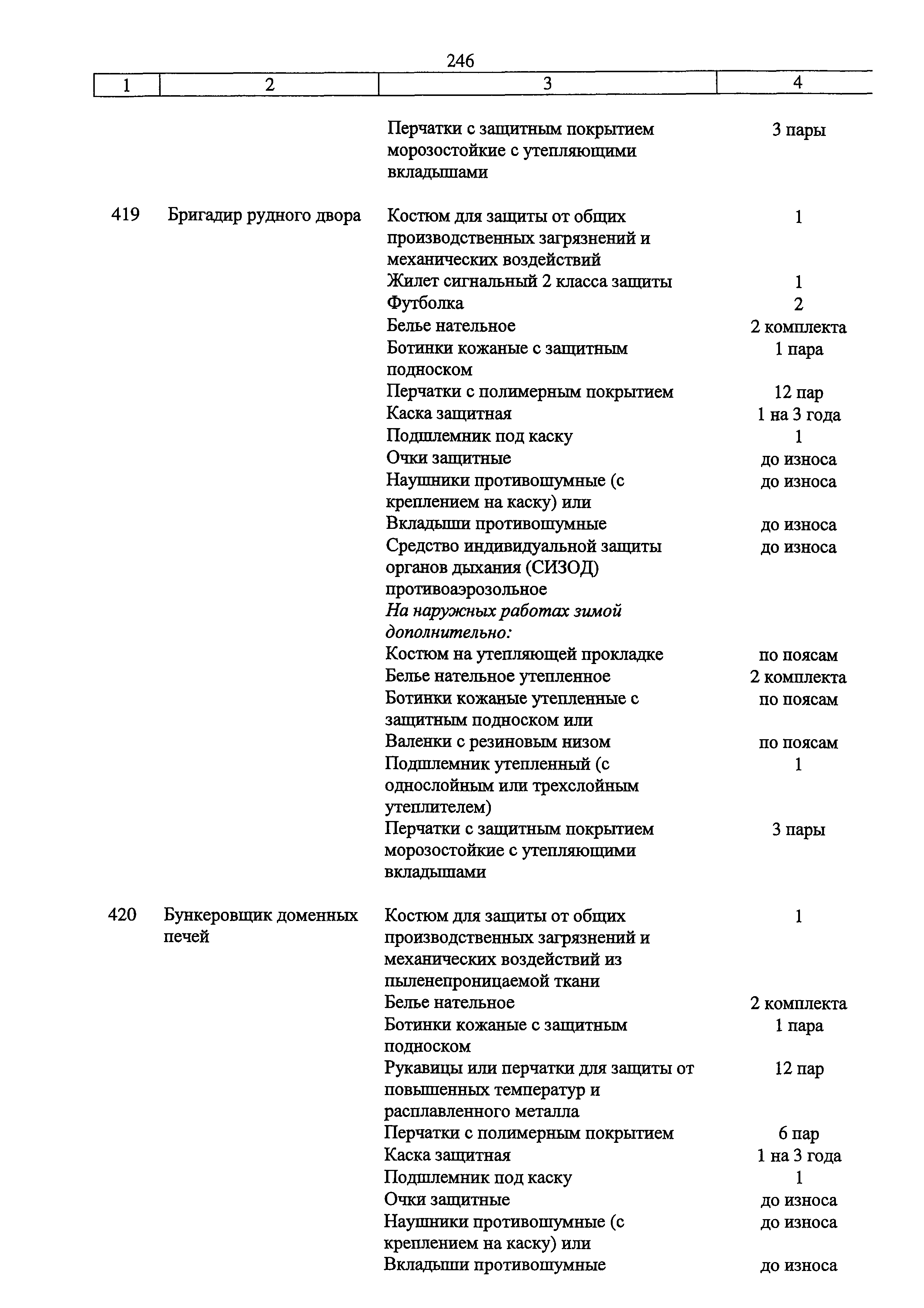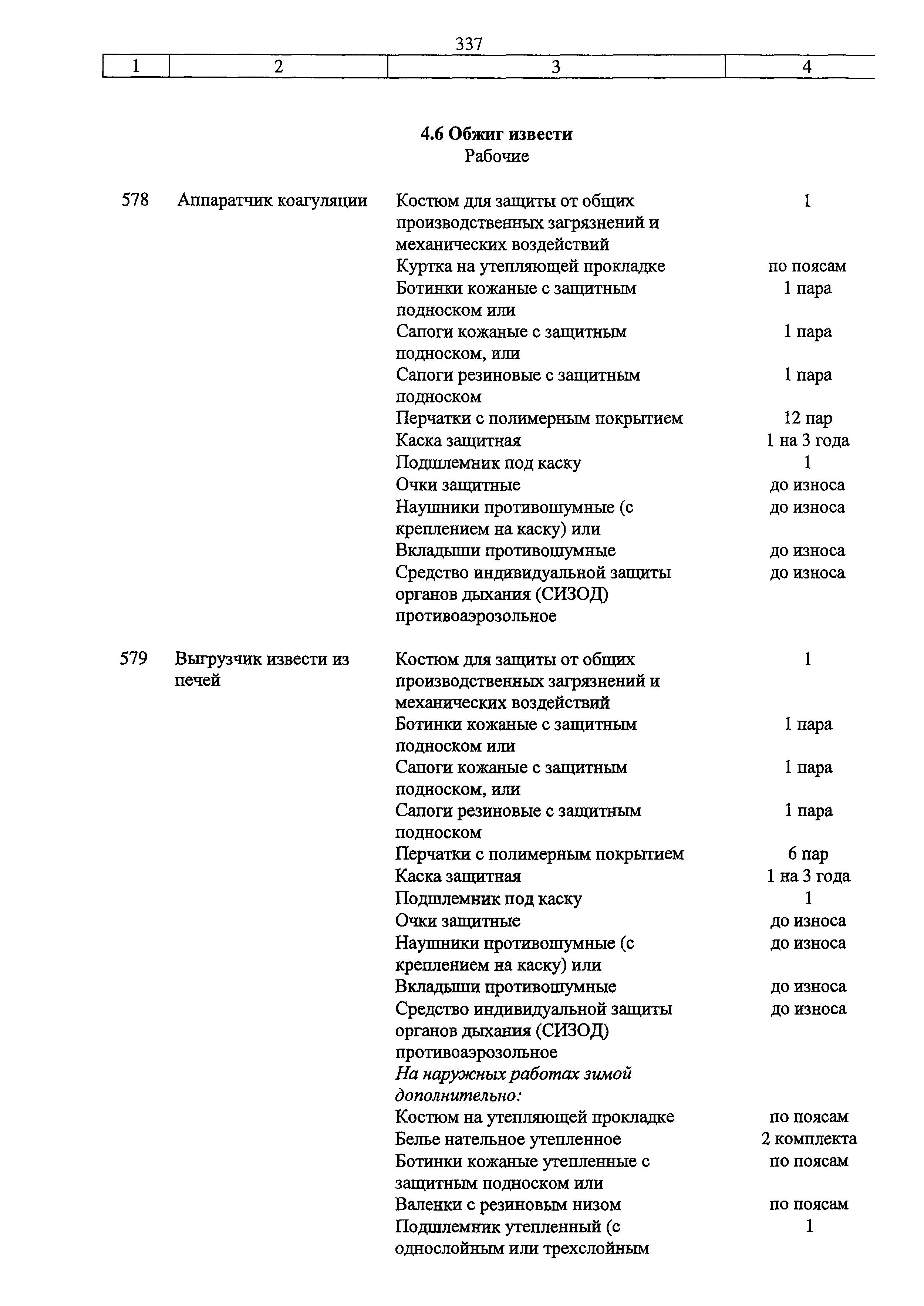 Типовые нормы бесплатной выдачи специальной одежды, специальной обуви и других средств индивидуальной защиты работникам горной и металлургической промышленности и металлургических производств других отраслей промышленности, занятым на работах с вредными и (или) опасными условиями труда, а также на работах, выполняемых в особых температурных условиях или связанных с загрязнением| Статус: | действует | | Название рус.: | Типовые нормы бесплатной выдачи специальной одежды, специальной обуви и других средств индивидуальной защиты работникам горной и металлургической промышленности и металлургических производств других отраслей промышленности, занятым на работах с вредными и (или) опасными условиями труда, а также на работах, выполняемых в особых температурных условиях или связанных с загрязнением | | Дата добавления в базу: | 01.02.2017 | | Дата актуализации: | 01.01.2021 | | Дата введения: | 14.02.2014 | | Область применения: | Нормы утверждаются локальными нормативными актами работодателя на основании результатов аттестации рабочих мест по условиям труда и могут быть включены в коллективный и (или) трудовой договор с указанием типовых норм, по сравнению с которыми улучшается обеспечение работников специальной одеждой, специальной обувью и другими средствами индивидуальной защиты. | | Оглавление: | I Горнодобывающая промышленность 1 Подземные горные работы (шахты) 2 Открытые горные работы и шахтная поверхность 3 Работа на гидравлических установках или с промывочными приборами 4 Дражные работы II Дробление, обогащение, брикетирование, обжиг, агломерация, извлечение металлов и сплавов III Черная металлургия 1 Коксохимическое производство 1.1 Углеподготовительные цеха 1.2 Углеобогатительные цеха 1.3 Производство каменноугольного кокса 1.4 Производство кристаллического нафталина, кумароновой смолы, смолоперерабатывающие цеха 1.5 Производство пиридиновых и фенольно-крезольных продуктов 1.6 Цеха улавливания химических продуктов и газовые цеха 1.7 Цеха ректификации сырого бензола 1.8 Цеха очистки коксового газа от сероводорода 1.9 Производство пекового кокса 1.10 Производство термоантрацита 2 Доменное производство 3 Сталеплавильное производство 3.1 Установки непрерывной разливки стали 4 Производство ферросплавов 4.1 Электролитическое производство 4.2 Производство электролитического хрома 4.3 Производство феррованадия 4.4 Подготовка шихты, обжиг руд и концентратов 4.5 Разливка и разделка ферросплавов 4.6 Обжиг извести 4.7 Общие профессии и должности ферросплавного производства 5 Прокатное производство 6 Производство труб (прокатка, сварка и волочение) 7 Колесопрокатное и бандажное производства 8 Валопрокатное производство 9 Производство рельсовых скреплений 10 Производство баллонов 11 Труболитейное производство 12 Производство метизов 12.1 Производство металлических канатов, сеток, пружин и пружинной ленты, щеток, цепей, колючей проволоки и других метизов 12.2 Волочение проволоки, калибровка и шлифовка металла 12.3 Изготовление волок 12.4 Холодноштамповочные и кузнечно-прессовые работы 12.5 Термическая обработка 12.6 Травление металла, защитные покрытия проволоки и извлечение железного купороса 12.7 Производство металлических электродов и порошковой проволоки 13 Производство огнеупоров 13.1 Огнеупоры 13.2 Карборундовые стержни 13.3 Высокоогнеупорные окислы 14 Ремонт 