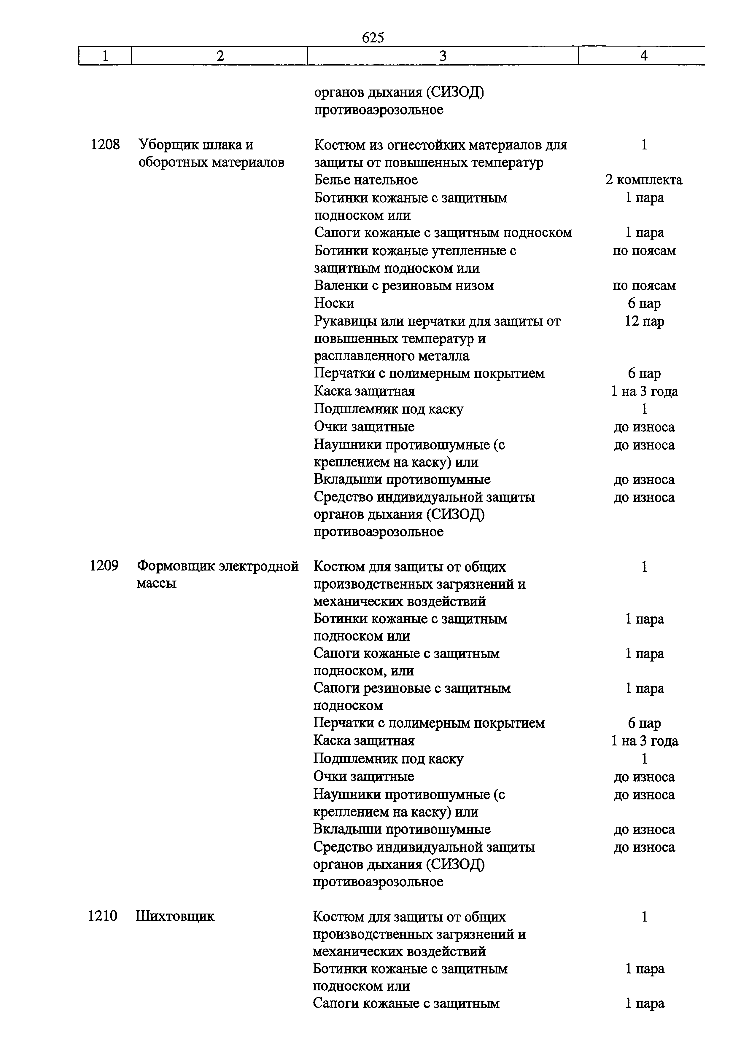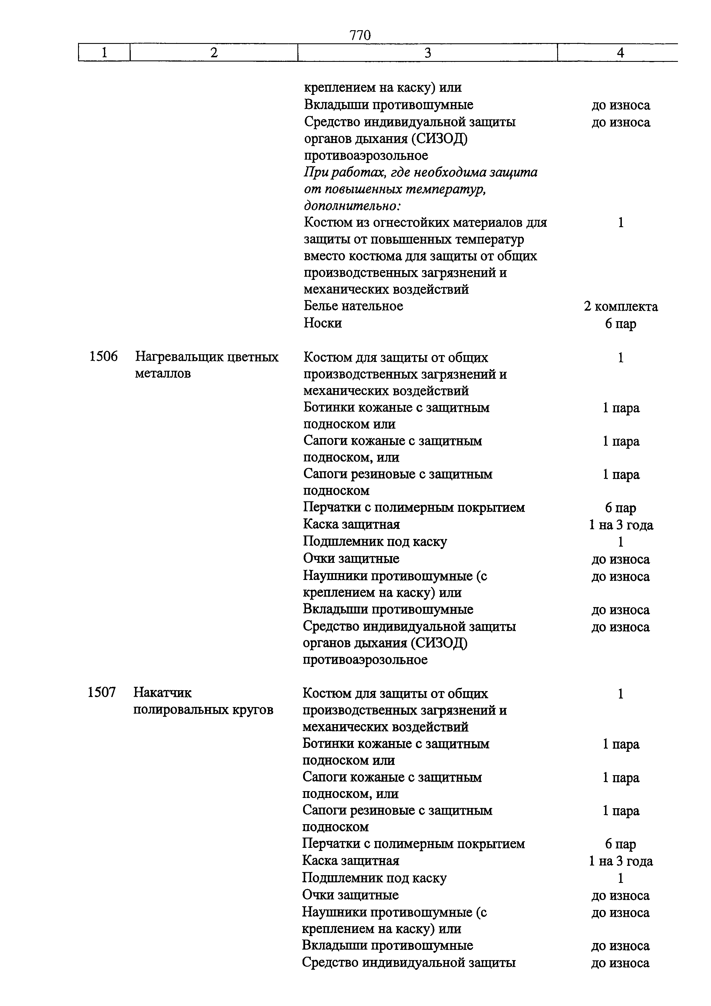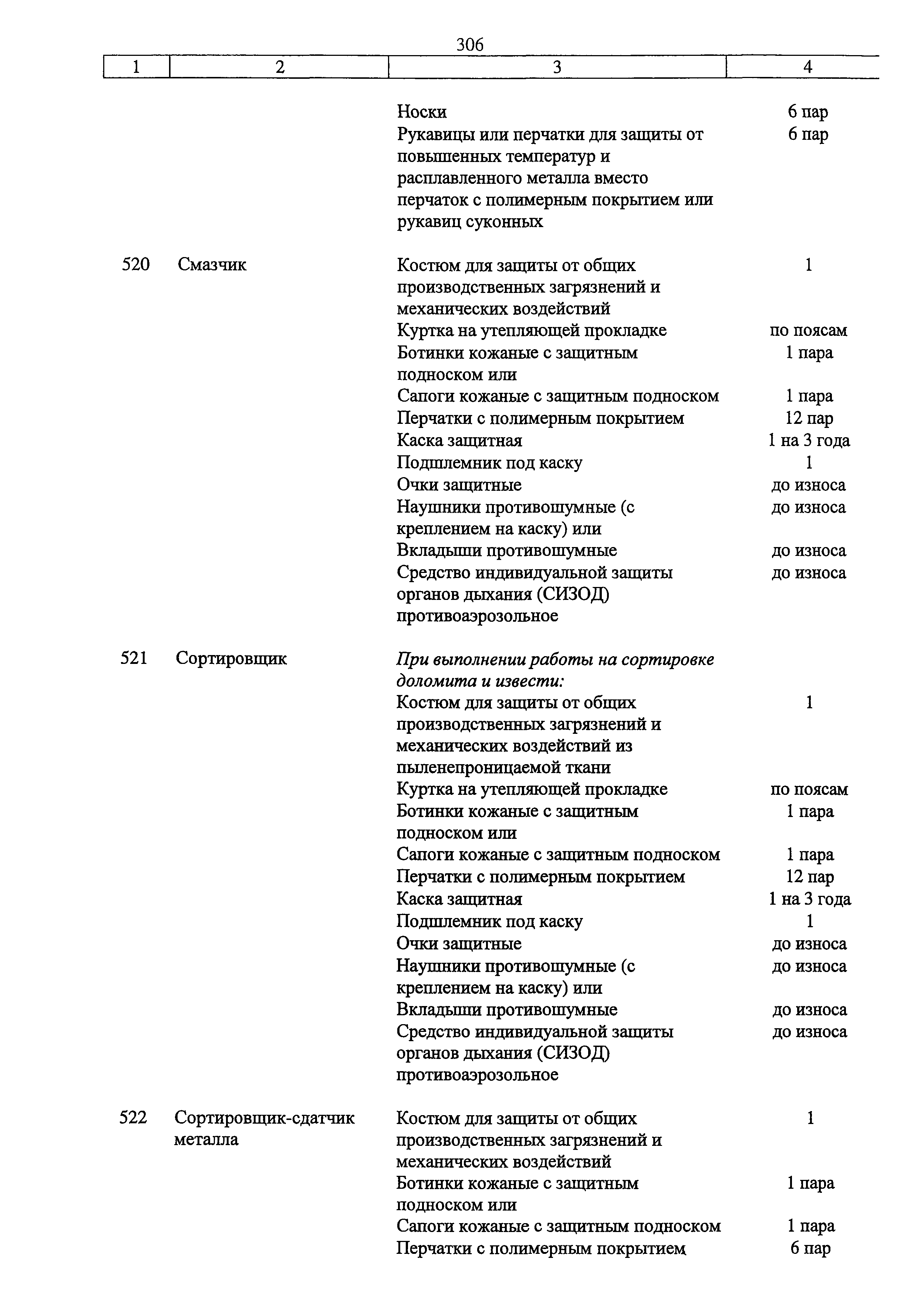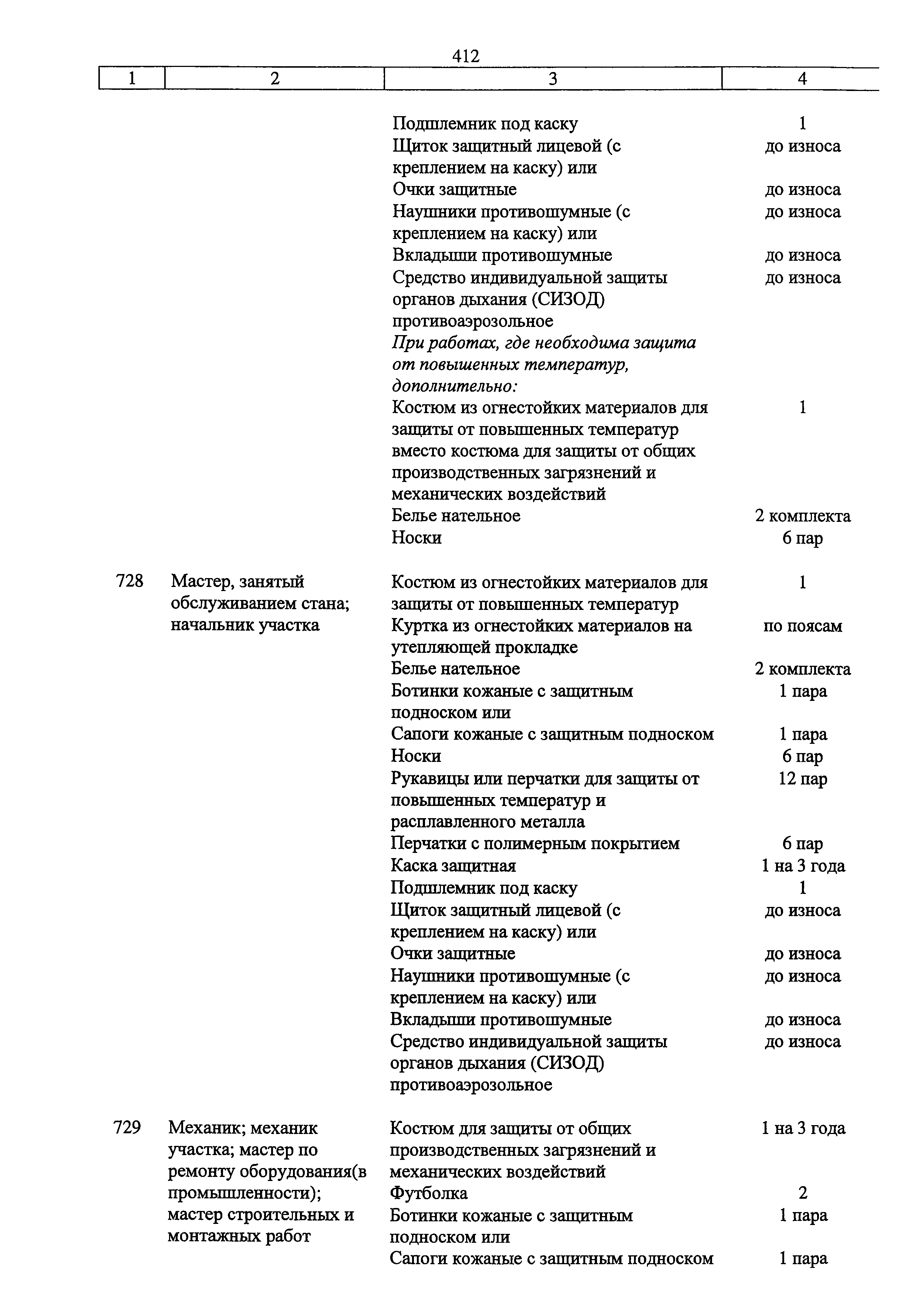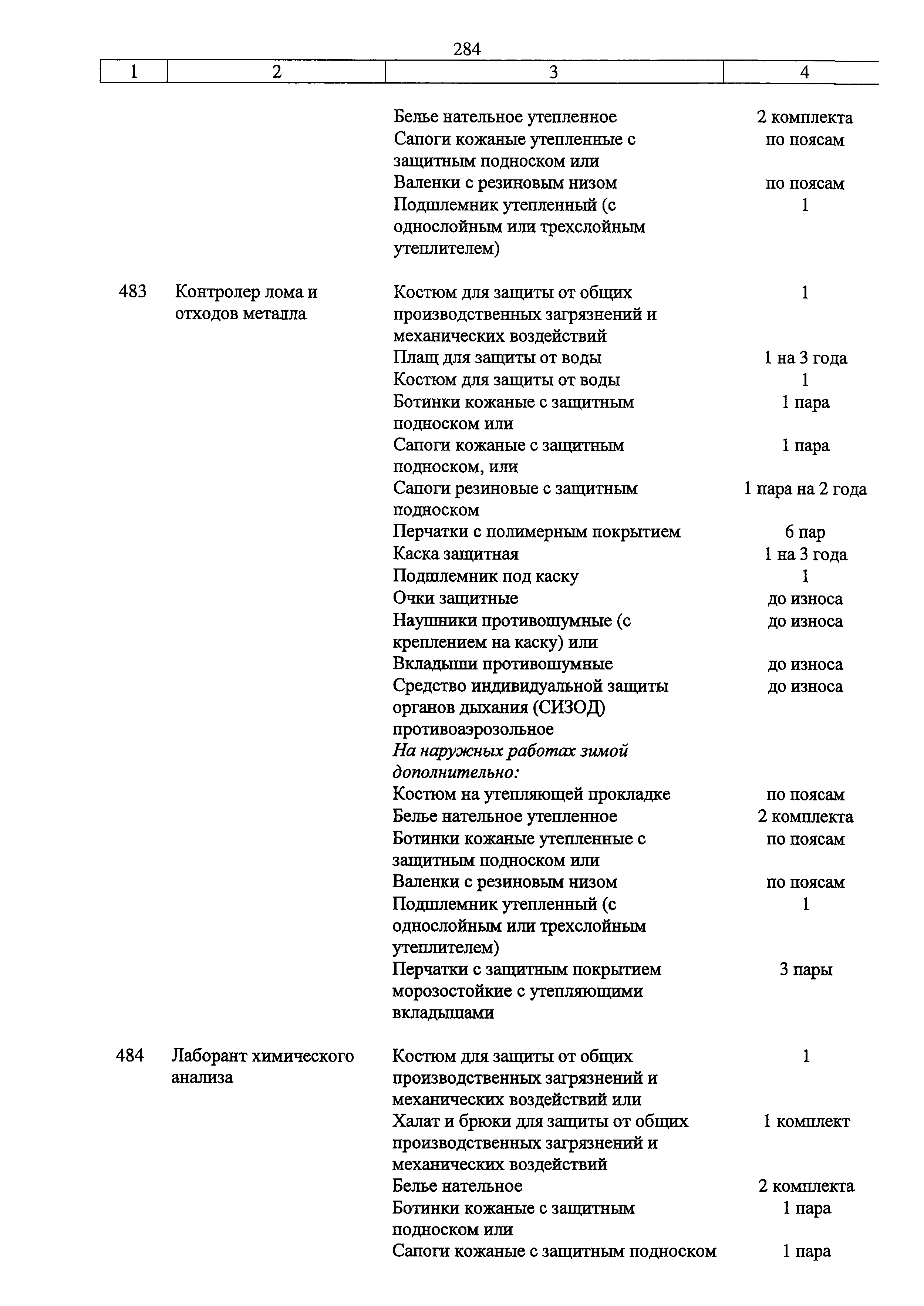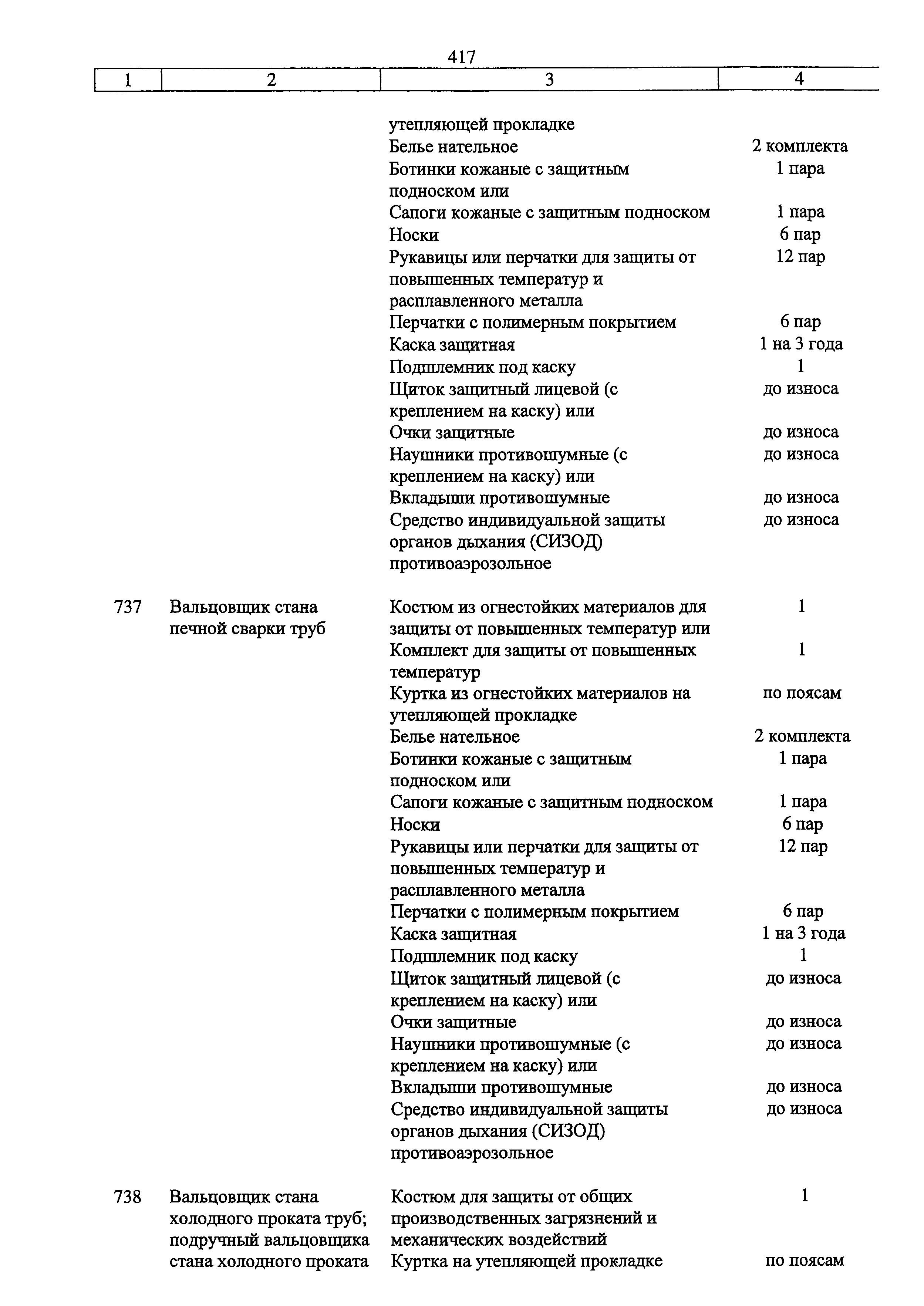 Типовые нормы бесплатной выдачи специальной одежды, специальной обуви и других средств индивидуальной защиты работникам горной и металлургической промышленности и металлургических производств других отраслей промышленности, занятым на работах с вредными и (или) опасными условиями труда, а также на работах, выполняемых в особых температурных условиях или связанных с загрязнением| Статус: | действует | | Название рус.: | Типовые нормы бесплатной выдачи специальной одежды, специальной обуви и других средств индивидуальной защиты работникам горной и металлургической промышленности и металлургических производств других отраслей промышленности, занятым на работах с вредными и (или) опасными условиями труда, а также на работах, выполняемых в особых температурных условиях или связанных с загрязнением | | Дата добавления в базу: | 01.02.2017 | | Дата актуализации: | 01.01.2021 | | Дата введения: | 14.02.2014 | | Область применения: | Нормы утверждаются локальными нормативными актами работодателя на основании результатов аттестации рабочих мест по условиям труда и могут быть включены в коллективный и (или) трудовой договор с указанием типовых норм, по сравнению с которыми улучшается обеспечение работников специальной одеждой, специальной обувью и другими средствами индивидуальной защиты. | | Оглавление: | I Горнодобывающая промышленность 1 Подземные горные работы (шахты) 2 Открытые горные работы и шахтная поверхность 3 Работа на гидравлических установках или с промывочными приборами 4 Дражные работы II Дробление, обогащение, брикетирование, обжиг, агломерация, извлечение металлов и сплавов III Черная металлургия 1 Коксохимическое производство 1.1 Углеподготовительные цеха 1.2 Углеобогатительные цеха 1.3 Производство каменноугольного кокса 1.4 Производство кристаллического нафталина, кумароновой смолы, смолоперерабатывающие цеха 1.5 Производство пиридиновых и фенольно-крезольных продуктов 1.6 Цеха улавливания химических продуктов и газовые цеха 1.7 Цеха ректификации сырого бензола 1.8 Цеха очистки коксового газа от сероводорода 1.9 Производство пекового кокса 1.10 Производство термоантрацита 2 Доменное производство 3 Сталеплавильное производство 3.1 Установки непрерывной разливки стали 4 Производство ферросплавов 4.1 Электролитическое производство 4.2 Производство электролитического хрома 4.3 Производство феррованадия 4.4 Подготовка шихты, обжиг руд и концентратов 4.5 Разливка и разделка ферросплавов 4.6 Обжиг извести 4.7 Общие профессии и должности ферросплавного производства 5 Прокатное производство 6 Производство труб (прокатка, сварка и волочение) 7 Колесопрокатное и бандажное производства 8 Валопрокатное производство 9 Производство рельсовых скреплений 10 Производство баллонов 11 Труболитейное производство 12 Производство метизов 12.1 Производство металлических канатов, сеток, пружин и пружинной ленты, щеток, цепей, колючей проволоки и других метизов 12.2 Волочение проволоки, калибровка и шлифовка металла 12.3 Изготовление волок 12.4 Холодноштамповочные и кузнечно-прессовые работы 12.5 Термическая обработка 12.6 Травление металла, защитные покрытия проволоки и извлечение железного купороса 12.7 Производство металлических электродов и порошковой проволоки 13 Производство огнеупоров 13.1 Огнеупоры 13.2 Карборундовые стержни 13.3 Высокоогнеупорные окислы 14 Ремонт 