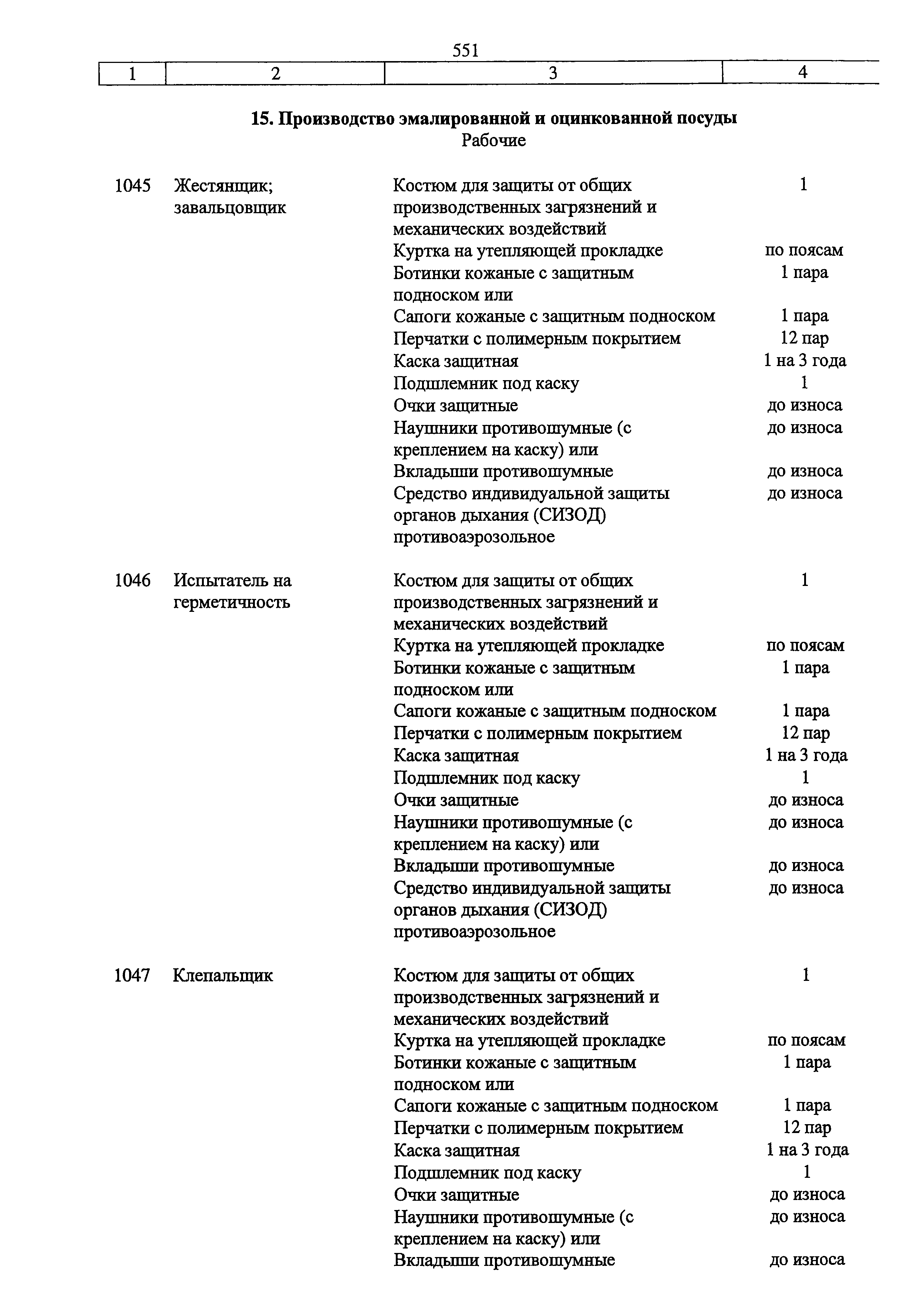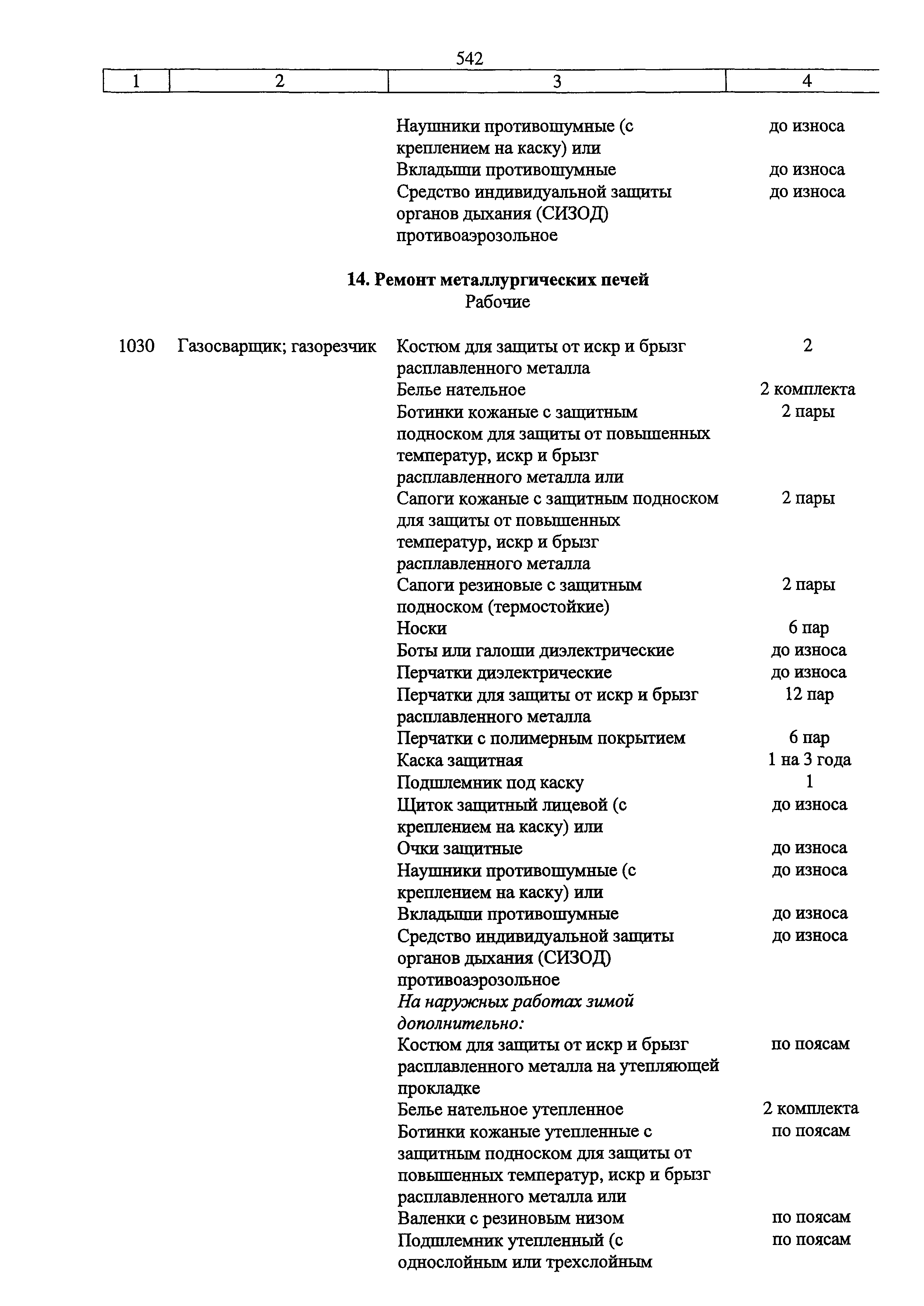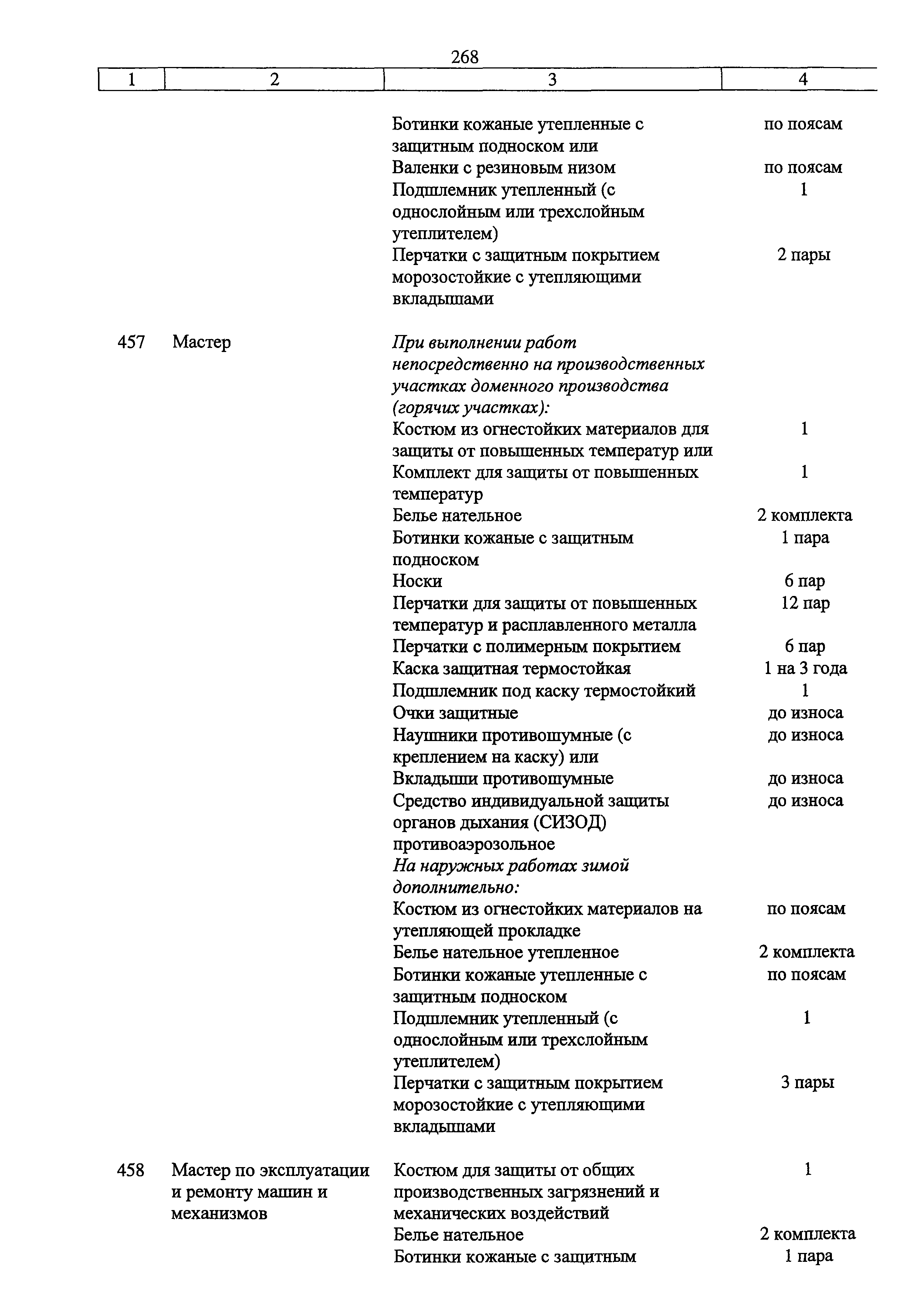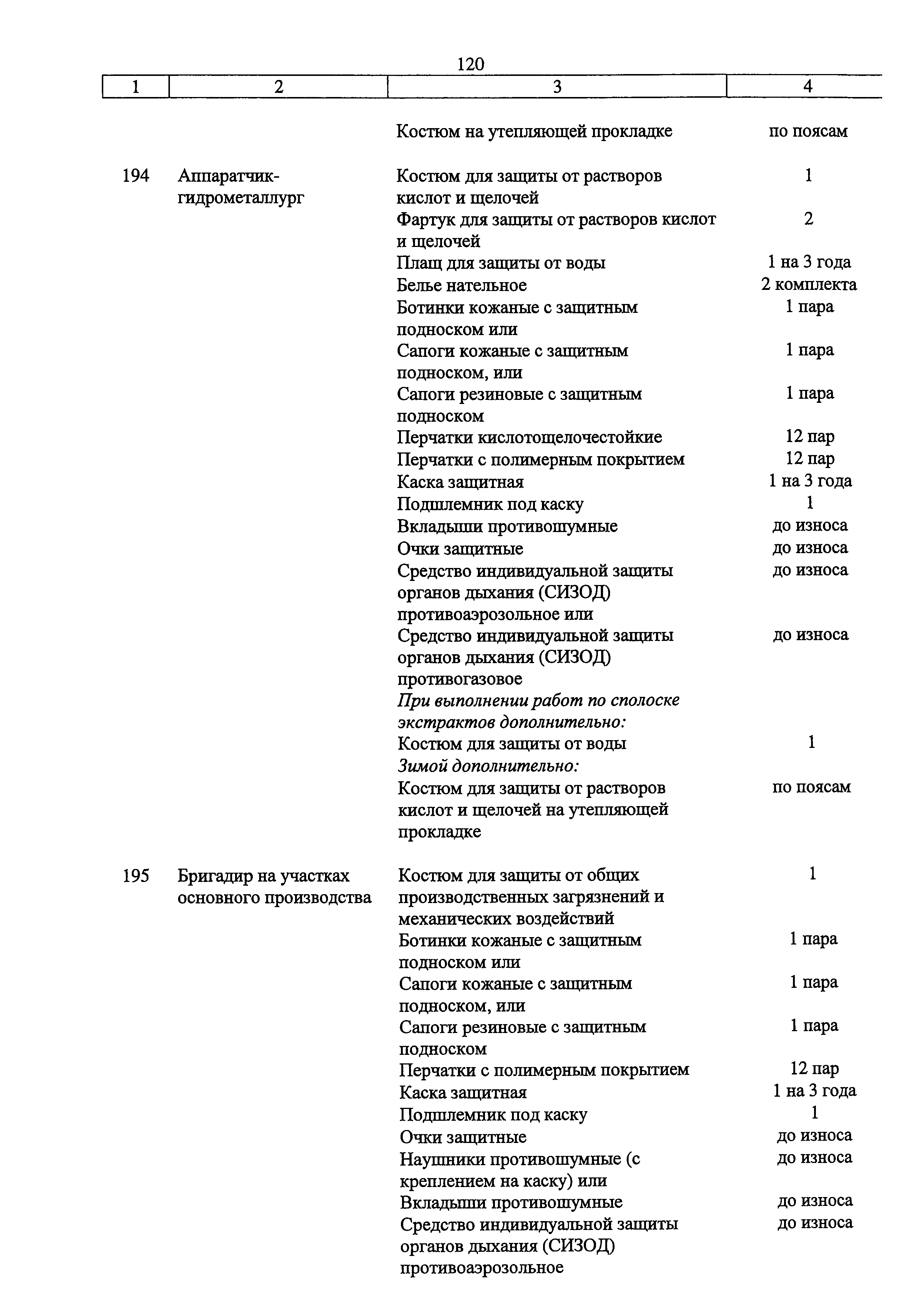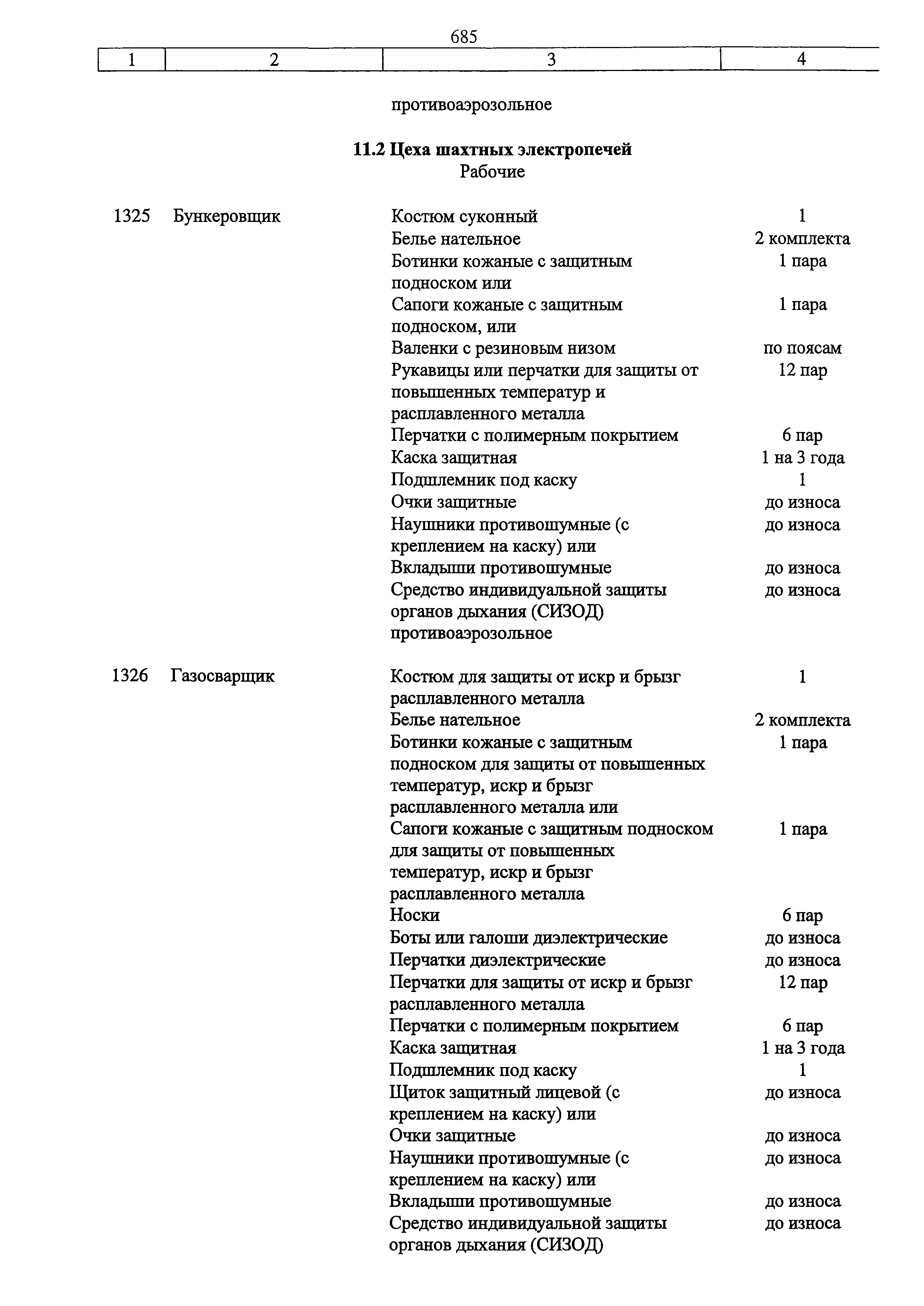 Типовые нормы бесплатной выдачи специальной одежды, специальной обуви и других средств индивидуальной защиты работникам горной и металлургической промышленности и металлургических производств других отраслей промышленности, занятым на работах с вредными и (или) опасными условиями труда, а также на работах, выполняемых в особых температурных условиях или связанных с загрязнением| Статус: | действует | | Название рус.: | Типовые нормы бесплатной выдачи специальной одежды, специальной обуви и других средств индивидуальной защиты работникам горной и металлургической промышленности и металлургических производств других отраслей промышленности, занятым на работах с вредными и (или) опасными условиями труда, а также на работах, выполняемых в особых температурных условиях или связанных с загрязнением | | Дата добавления в базу: | 01.02.2017 | | Дата актуализации: | 01.01.2021 | | Дата введения: | 14.02.2014 | | Область применения: | Нормы утверждаются локальными нормативными актами работодателя на основании результатов аттестации рабочих мест по условиям труда и могут быть включены в коллективный и (или) трудовой договор с указанием типовых норм, по сравнению с которыми улучшается обеспечение работников специальной одеждой, специальной обувью и другими средствами индивидуальной защиты. | | Оглавление: | I Горнодобывающая промышленность 1 Подземные горные работы (шахты) 2 Открытые горные работы и шахтная поверхность 3 Работа на гидравлических установках или с промывочными приборами 4 Дражные работы II Дробление, обогащение, брикетирование, обжиг, агломерация, извлечение металлов и сплавов III Черная металлургия 1 Коксохимическое производство 1.1 Углеподготовительные цеха 1.2 Углеобогатительные цеха 1.3 Производство каменноугольного кокса 1.4 Производство кристаллического нафталина, кумароновой смолы, смолоперерабатывающие цеха 1.5 Производство пиридиновых и фенольно-крезольных продуктов 1.6 Цеха улавливания химических продуктов и газовые цеха 1.7 Цеха ректификации сырого бензола 1.8 Цеха очистки коксового газа от сероводорода 1.9 Производство пекового кокса 1.10 Производство термоантрацита 2 Доменное производство 3 Сталеплавильное производство 3.1 Установки непрерывной разливки стали 4 Производство ферросплавов 4.1 Электролитическое производство 4.2 Производство электролитического хрома 4.3 Производство феррованадия 4.4 Подготовка шихты, обжиг руд и концентратов 4.5 Разливка и разделка ферросплавов 4.6 Обжиг извести 4.7 Общие профессии и должности ферросплавного производства 5 Прокатное производство 6 Производство труб (прокатка, сварка и волочение) 7 Колесопрокатное и бандажное производства 8 Валопрокатное производство 9 Производство рельсовых скреплений 10 Производство баллонов 11 Труболитейное производство 12 Производство метизов 12.1 Производство металлических канатов, сеток, пружин и пружинной ленты, щеток, цепей, колючей проволоки и других метизов 12.2 Волочение проволоки, калибровка и шлифовка металла 12.3 Изготовление волок 12.4 Холодноштамповочные и кузнечно-прессовые работы 12.5 Термическая обработка 12.6 Травление металла, защитные покрытия проволоки и извлечение железного купороса 12.7 Производство металлических электродов и порошковой проволоки 13 Производство огнеупоров 13.1 Огнеупоры 13.2 Карборундовые стержни 13.3 Высокоогнеупорные окислы 14 Ремонт 