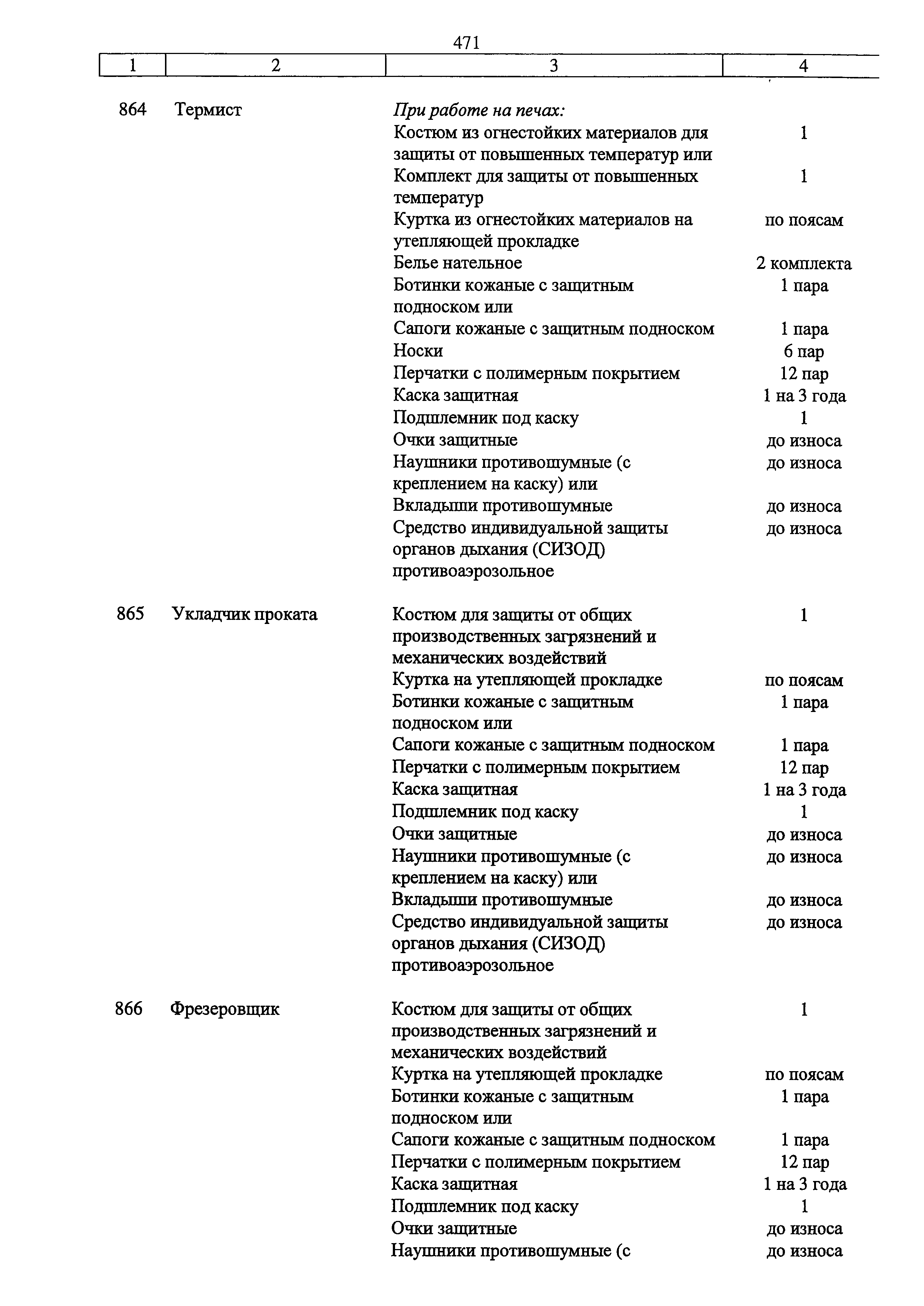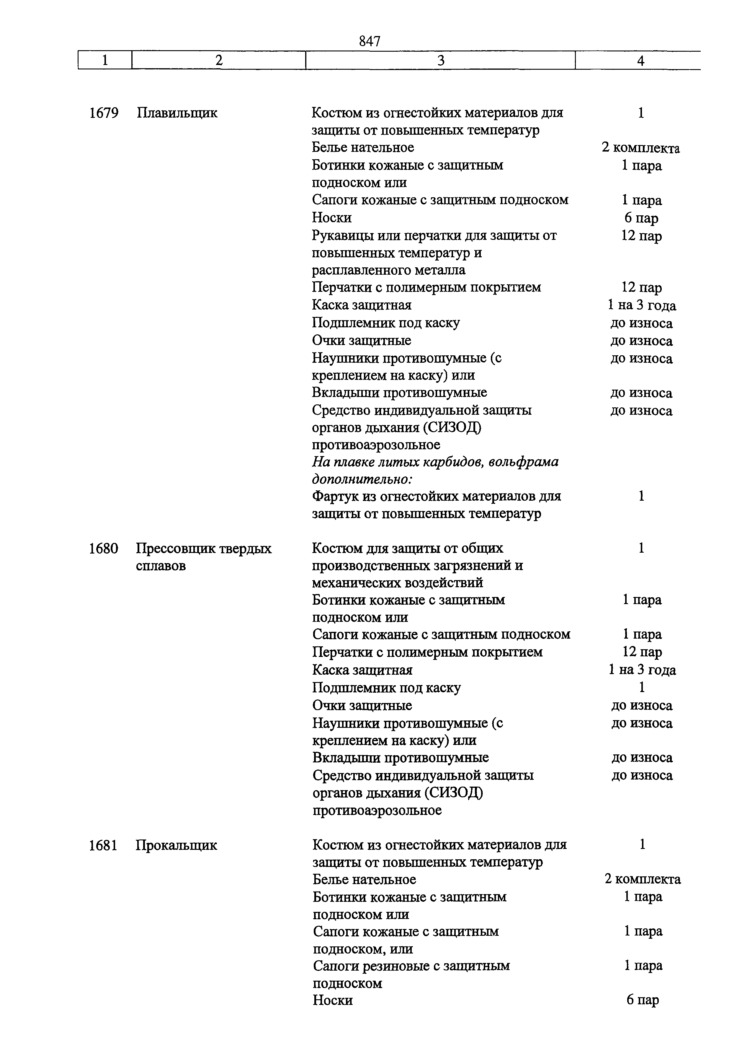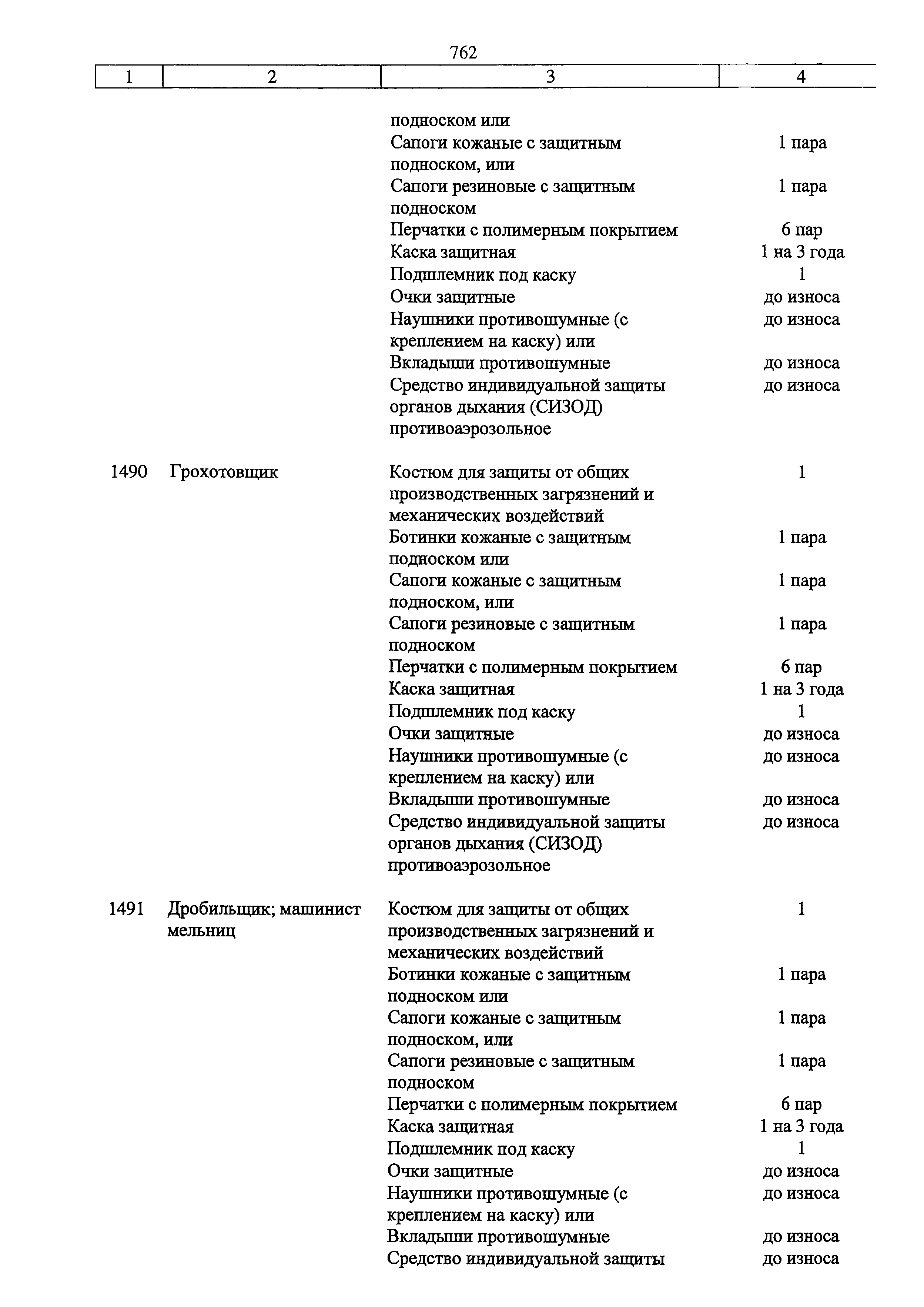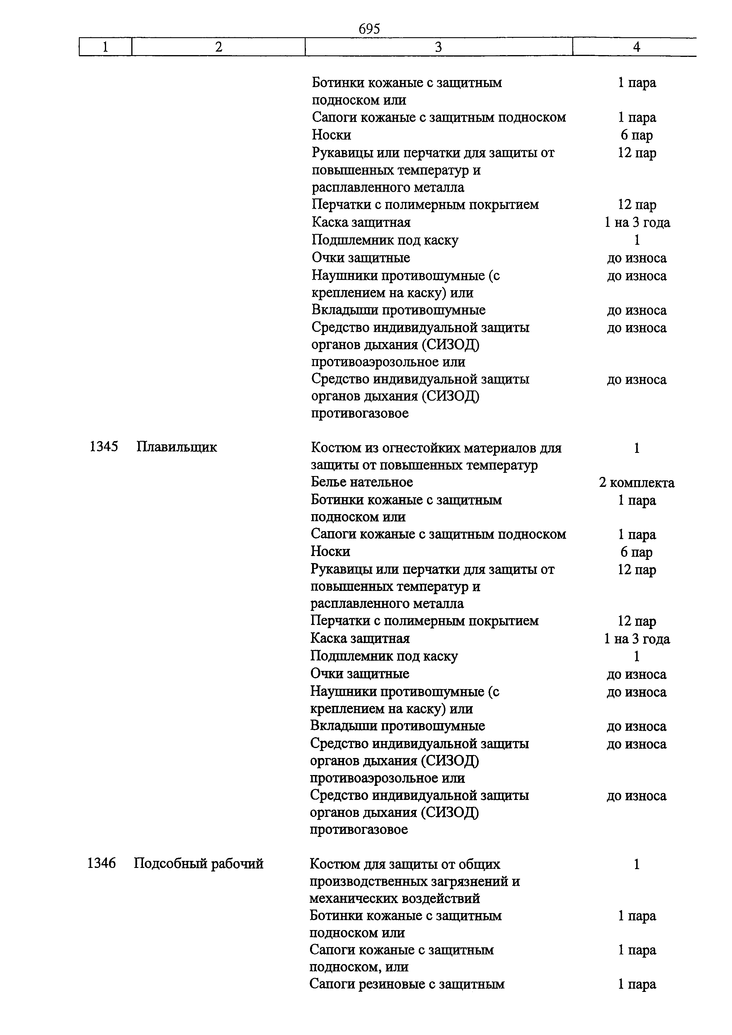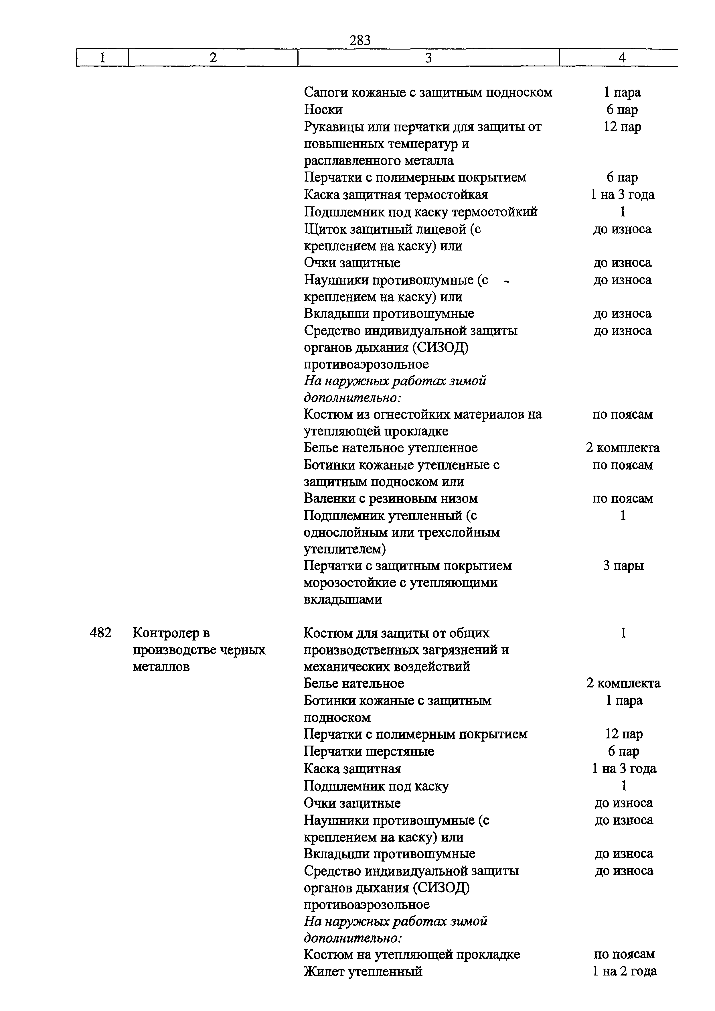 Типовые нормы бесплатной выдачи специальной одежды, специальной обуви и других средств индивидуальной защиты работникам горной и металлургической промышленности и металлургических производств других отраслей промышленности, занятым на работах с вредными и (или) опасными условиями труда, а также на работах, выполняемых в особых температурных условиях или связанных с загрязнением| Статус: | действует | | Название рус.: | Типовые нормы бесплатной выдачи специальной одежды, специальной обуви и других средств индивидуальной защиты работникам горной и металлургической промышленности и металлургических производств других отраслей промышленности, занятым на работах с вредными и (или) опасными условиями труда, а также на работах, выполняемых в особых температурных условиях или связанных с загрязнением | | Дата добавления в базу: | 01.02.2017 | | Дата актуализации: | 01.01.2021 | | Дата введения: | 14.02.2014 | | Область применения: | Нормы утверждаются локальными нормативными актами работодателя на основании результатов аттестации рабочих мест по условиям труда и могут быть включены в коллективный и (или) трудовой договор с указанием типовых норм, по сравнению с которыми улучшается обеспечение работников специальной одеждой, специальной обувью и другими средствами индивидуальной защиты. | | Оглавление: | I Горнодобывающая промышленность 1 Подземные горные работы (шахты) 2 Открытые горные работы и шахтная поверхность 3 Работа на гидравлических установках или с промывочными приборами 4 Дражные работы II Дробление, обогащение, брикетирование, обжиг, агломерация, извлечение металлов и сплавов III Черная металлургия 1 Коксохимическое производство 1.1 Углеподготовительные цеха 1.2 Углеобогатительные цеха 1.3 Производство каменноугольного кокса 1.4 Производство кристаллического нафталина, кумароновой смолы, смолоперерабатывающие цеха 1.5 Производство пиридиновых и фенольно-крезольных продуктов 1.6 Цеха улавливания химических продуктов и газовые цеха 1.7 Цеха ректификации сырого бензола 1.8 Цеха очистки коксового газа от сероводорода 1.9 Производство пекового кокса 1.10 Производство термоантрацита 2 Доменное производство 3 Сталеплавильное производство 3.1 Установки непрерывной разливки стали 4 Производство ферросплавов 4.1 Электролитическое производство 4.2 Производство электролитического хрома 4.3 Производство феррованадия 4.4 Подготовка шихты, обжиг руд и концентратов 4.5 Разливка и разделка ферросплавов 4.6 Обжиг извести 4.7 Общие профессии и должности ферросплавного производства 5 Прокатное производство 6 Производство труб (прокатка, сварка и волочение) 7 Колесопрокатное и бандажное производства 8 Валопрокатное производство 9 Производство рельсовых скреплений 10 Производство баллонов 11 Труболитейное производство 12 Производство метизов 12.1 Производство металлических канатов, сеток, пружин и пружинной ленты, щеток, цепей, колючей проволоки и других метизов 12.2 Волочение проволоки, калибровка и шлифовка металла 12.3 Изготовление волок 12.4 Холодноштамповочные и кузнечно-прессовые работы 12.5 Термическая обработка 12.6 Травление металла, защитные покрытия проволоки и извлечение железного купороса 12.7 Производство металлических электродов и порошковой проволоки 13 Производство огнеупоров 13.1 Огнеупоры 13.2 Карборундовые стержни 13.3 Высокоогнеупорные окислы 14 Ремонт 