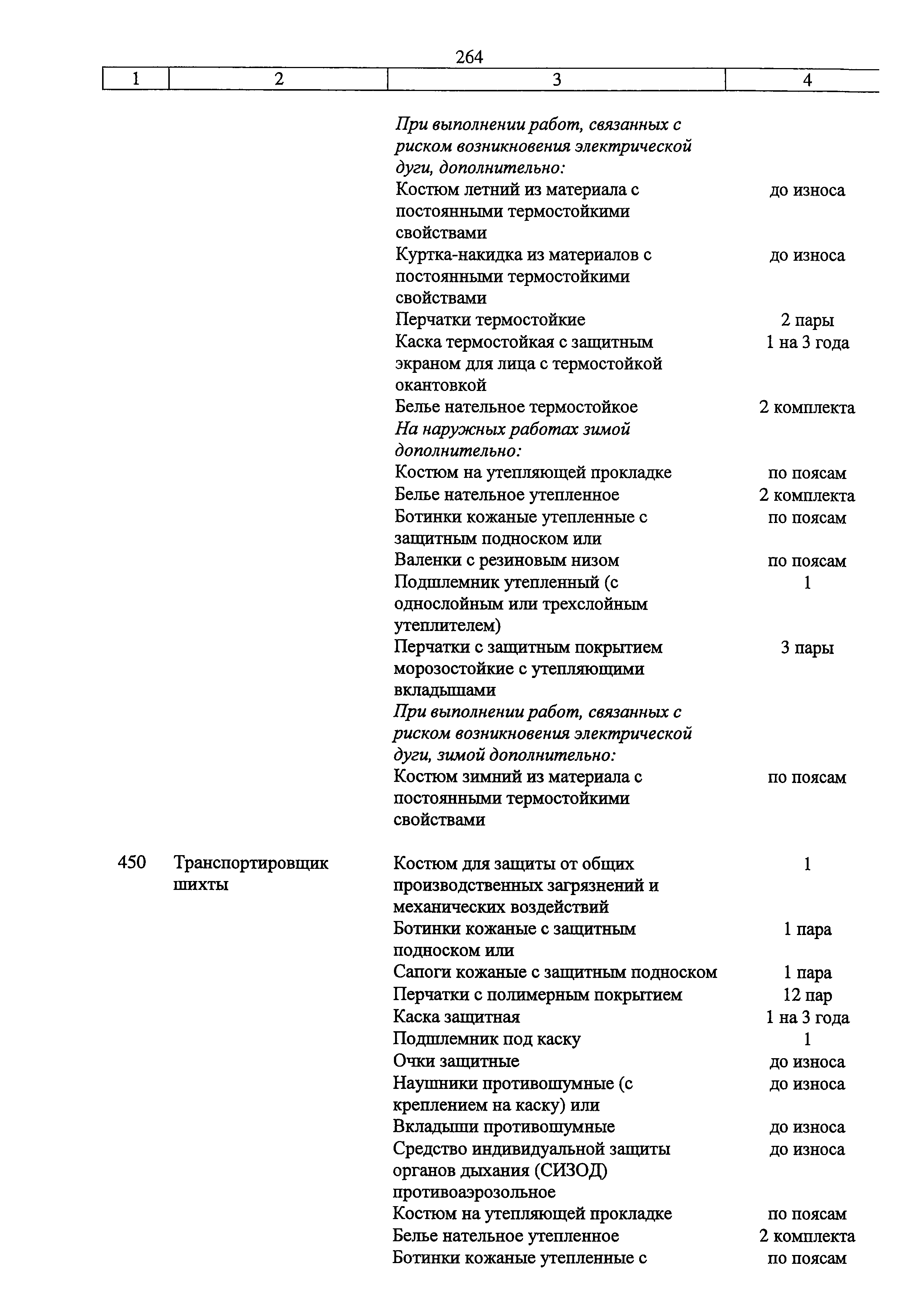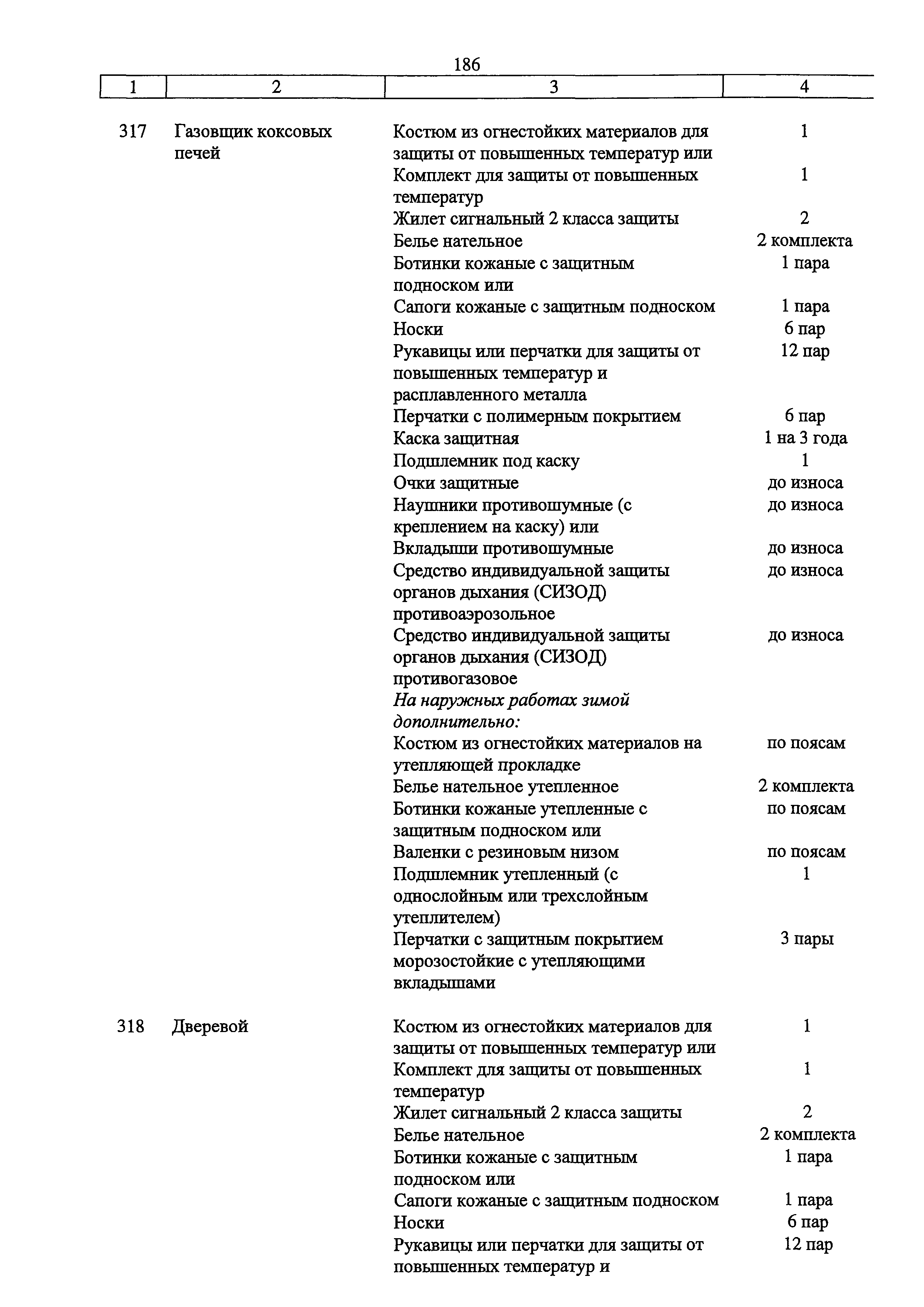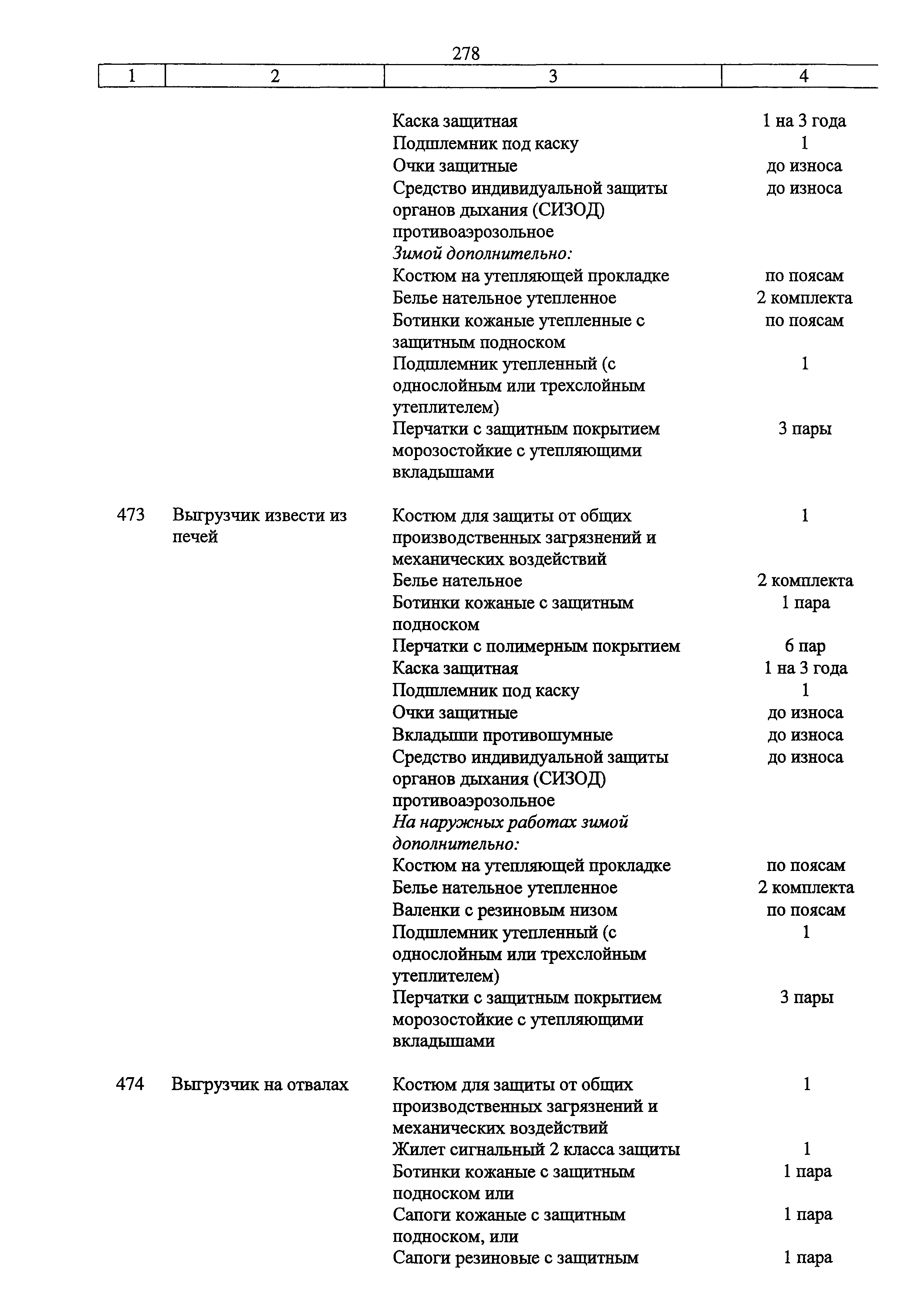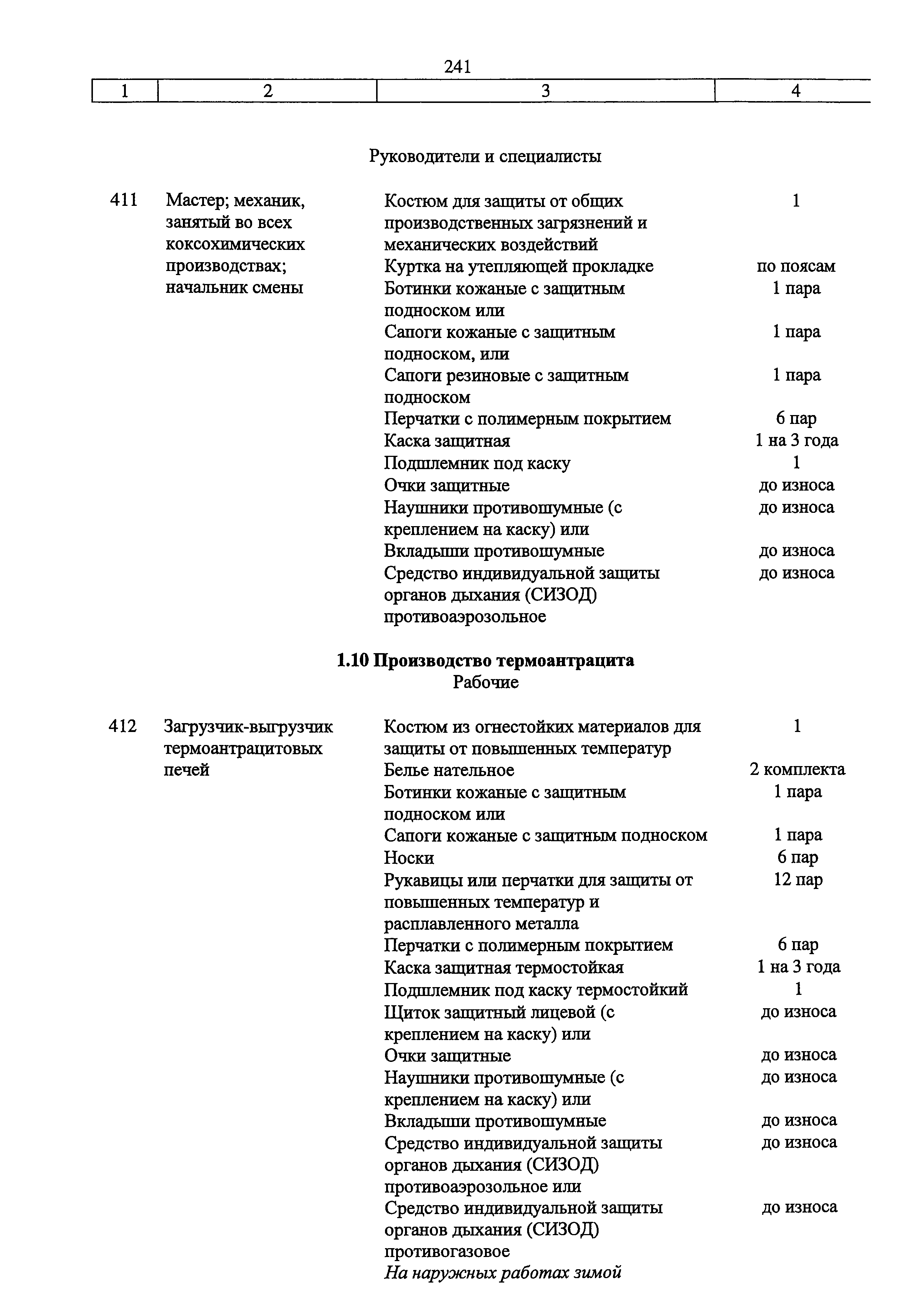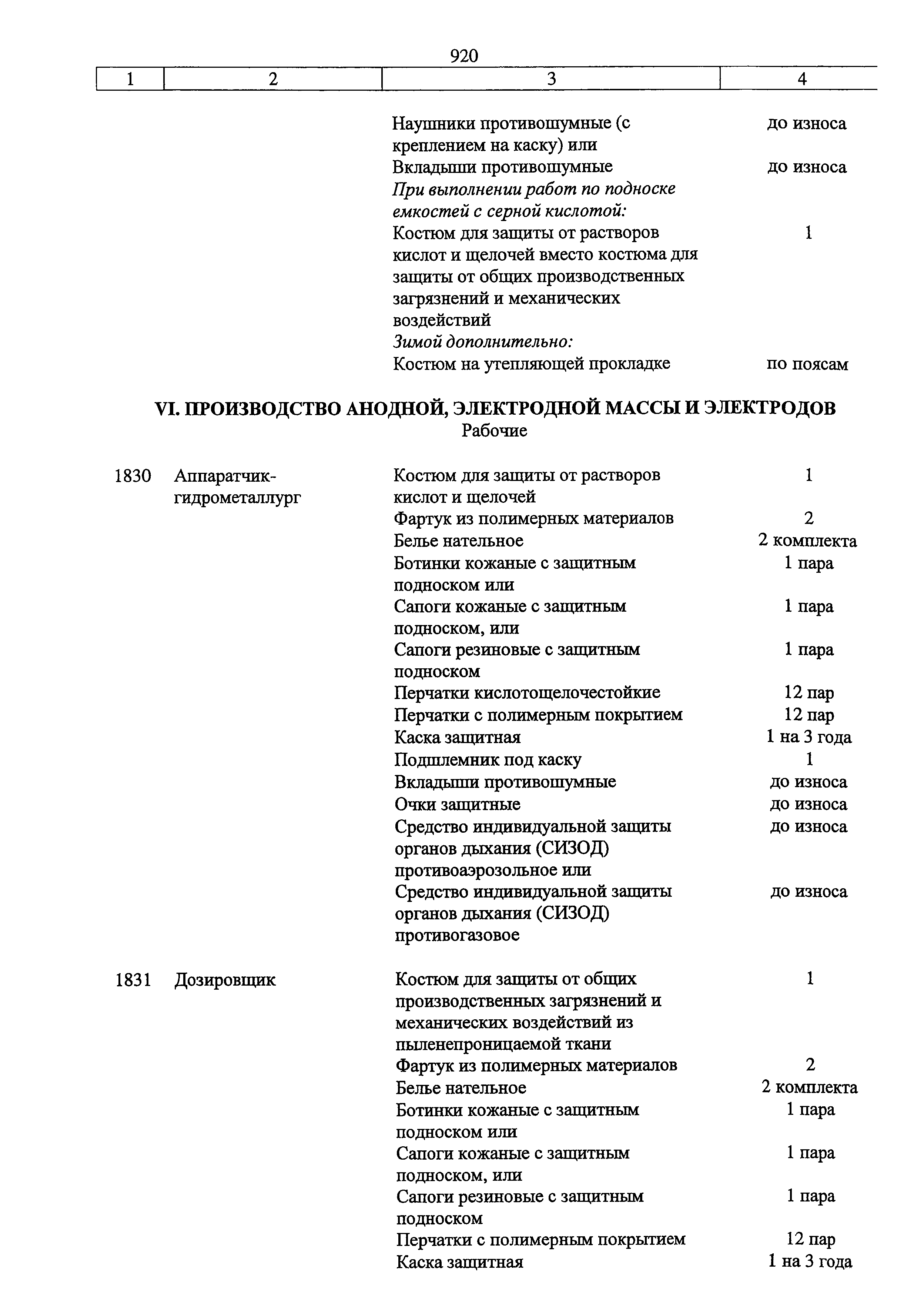 Типовые нормы бесплатной выдачи специальной одежды, специальной обуви и других средств индивидуальной защиты работникам горной и металлургической промышленности и металлургических производств других отраслей промышленности, занятым на работах с вредными и (или) опасными условиями труда, а также на работах, выполняемых в особых температурных условиях или связанных с загрязнением| Статус: | действует | | Название рус.: | Типовые нормы бесплатной выдачи специальной одежды, специальной обуви и других средств индивидуальной защиты работникам горной и металлургической промышленности и металлургических производств других отраслей промышленности, занятым на работах с вредными и (или) опасными условиями труда, а также на работах, выполняемых в особых температурных условиях или связанных с загрязнением | | Дата добавления в базу: | 01.02.2017 | | Дата актуализации: | 01.01.2021 | | Дата введения: | 14.02.2014 | | Область применения: | Нормы утверждаются локальными нормативными актами работодателя на основании результатов аттестации рабочих мест по условиям труда и могут быть включены в коллективный и (или) трудовой договор с указанием типовых норм, по сравнению с которыми улучшается обеспечение работников специальной одеждой, специальной обувью и другими средствами индивидуальной защиты. | | Оглавление: | I Горнодобывающая промышленность 1 Подземные горные работы (шахты) 2 Открытые горные работы и шахтная поверхность 3 Работа на гидравлических установках или с промывочными приборами 4 Дражные работы II Дробление, обогащение, брикетирование, обжиг, агломерация, извлечение металлов и сплавов III Черная металлургия 1 Коксохимическое производство 1.1 Углеподготовительные цеха 1.2 Углеобогатительные цеха 1.3 Производство каменноугольного кокса 1.4 Производство кристаллического нафталина, кумароновой смолы, смолоперерабатывающие цеха 1.5 Производство пиридиновых и фенольно-крезольных продуктов 1.6 Цеха улавливания химических продуктов и газовые цеха 1.7 Цеха ректификации сырого бензола 1.8 Цеха очистки коксового газа от сероводорода 1.9 Производство пекового кокса 1.10 Производство термоантрацита 2 Доменное производство 3 Сталеплавильное производство 3.1 Установки непрерывной разливки стали 4 Производство ферросплавов 4.1 Электролитическое производство 4.2 Производство электролитического хрома 4.3 Производство феррованадия 4.4 Подготовка шихты, обжиг руд и концентратов 4.5 Разливка и разделка ферросплавов 4.6 Обжиг извести 4.7 Общие профессии и должности ферросплавного производства 5 Прокатное производство 6 Производство труб (прокатка, сварка и волочение) 7 Колесопрокатное и бандажное производства 8 Валопрокатное производство 9 Производство рельсовых скреплений 10 Производство баллонов 11 Труболитейное производство 12 Производство метизов 12.1 Производство металлических канатов, сеток, пружин и пружинной ленты, щеток, цепей, колючей проволоки и других метизов 12.2 Волочение проволоки, калибровка и шлифовка металла 12.3 Изготовление волок 12.4 Холодноштамповочные и кузнечно-прессовые работы 12.5 Термическая обработка 12.6 Травление металла, защитные покрытия проволоки и извлечение железного купороса 12.7 Производство металлических электродов и порошковой проволоки 13 Производство огнеупоров 13.1 Огнеупоры 13.2 Карборундовые стержни 13.3 Высокоогнеупорные окислы 14 Ремонт 