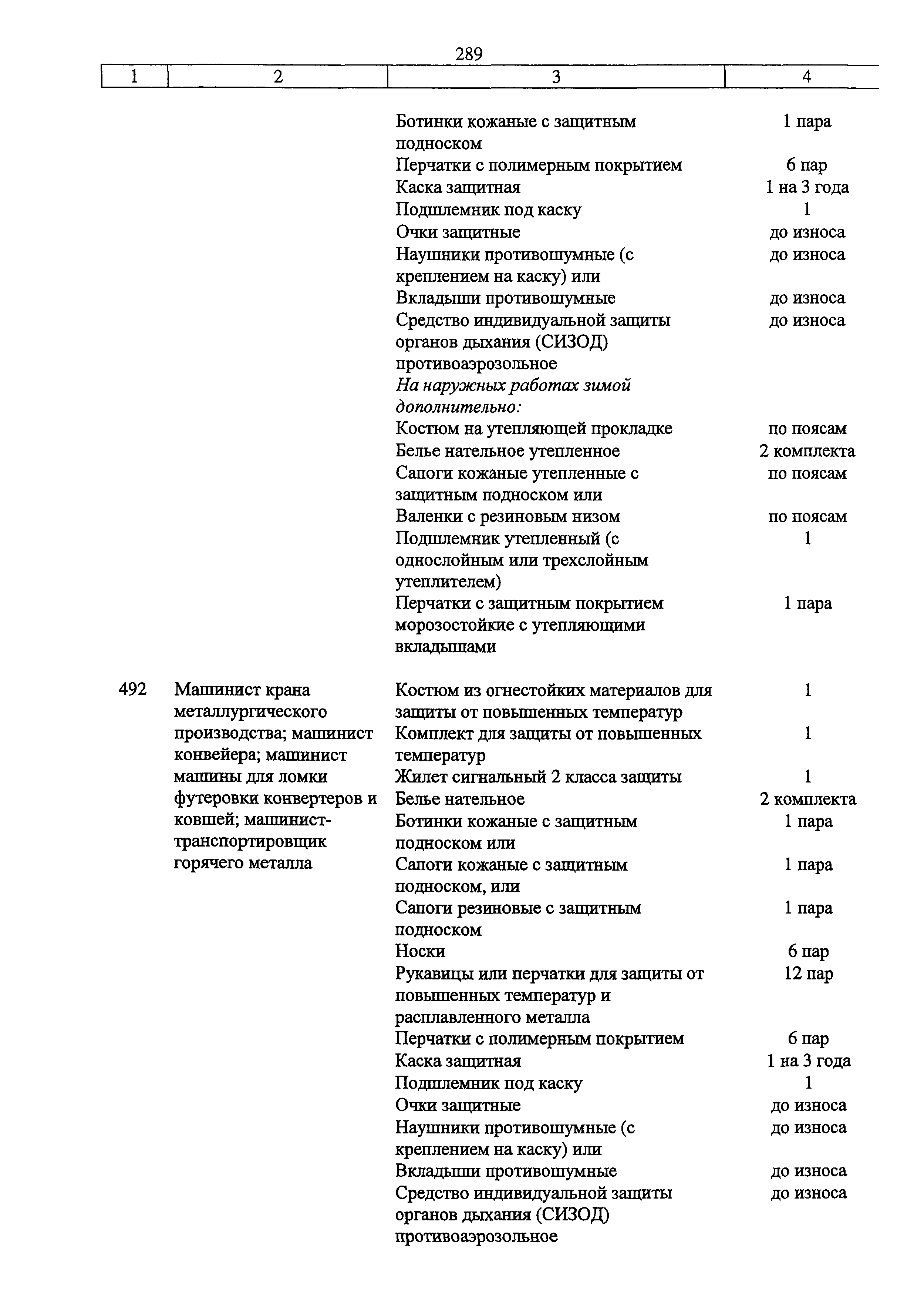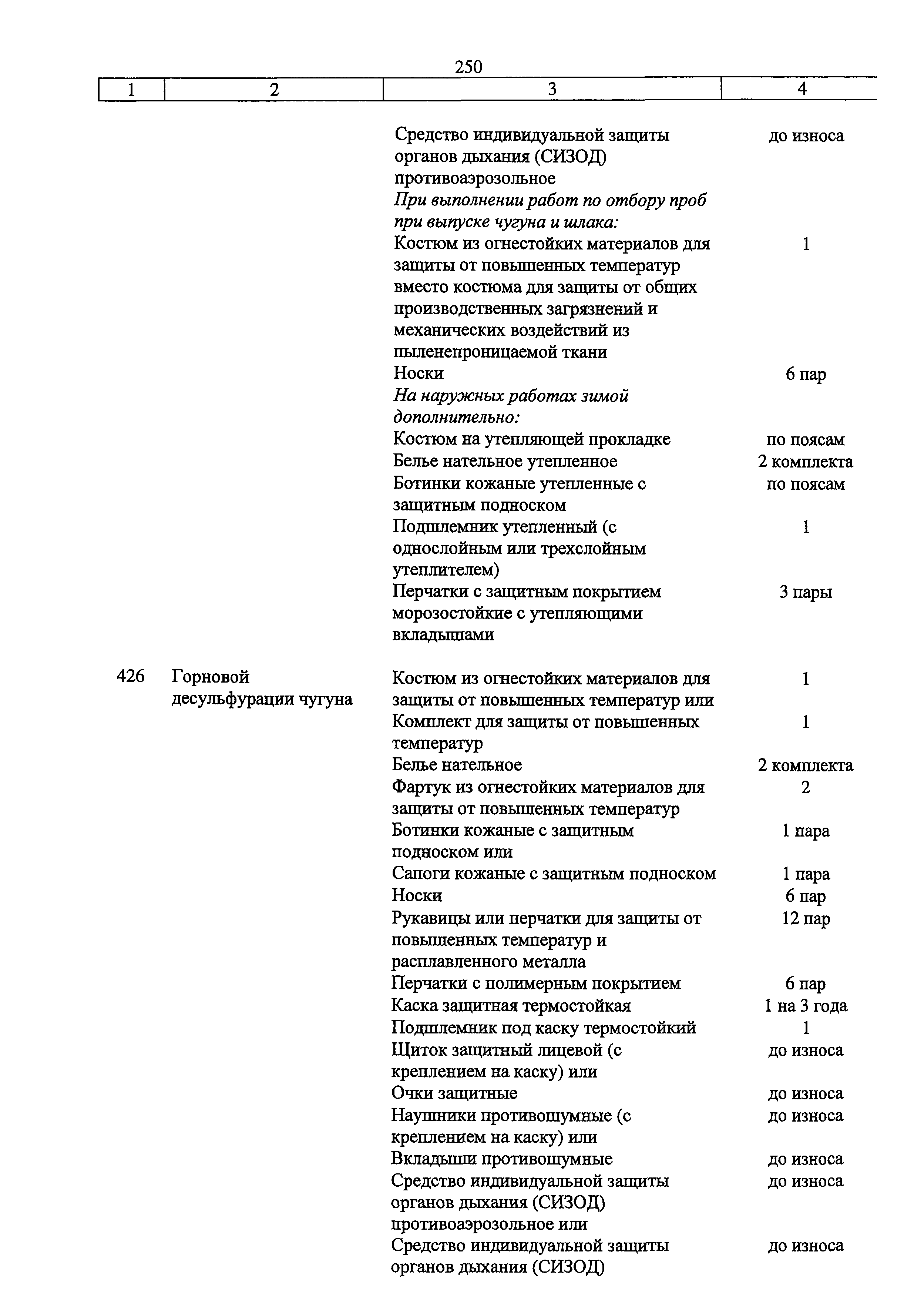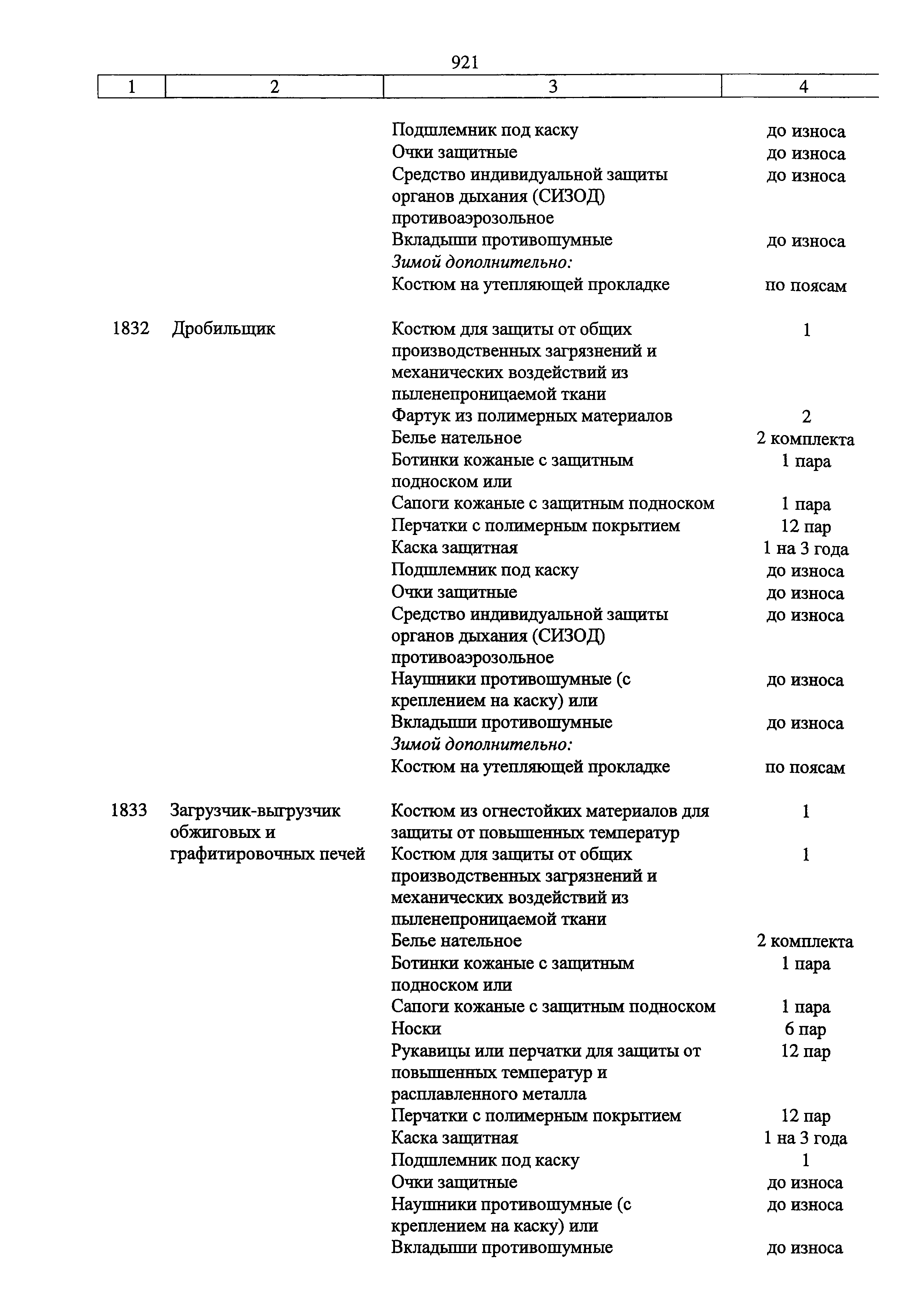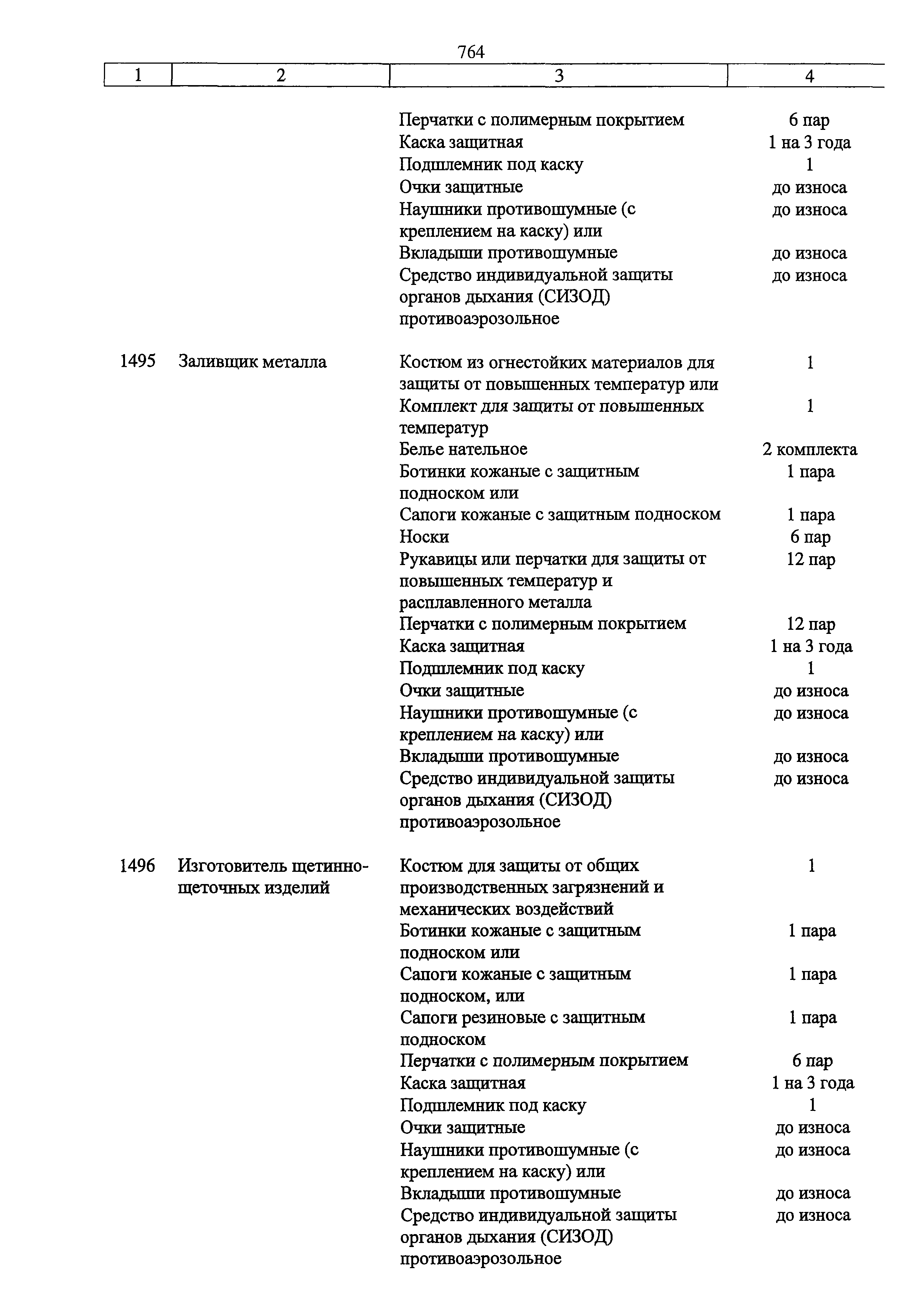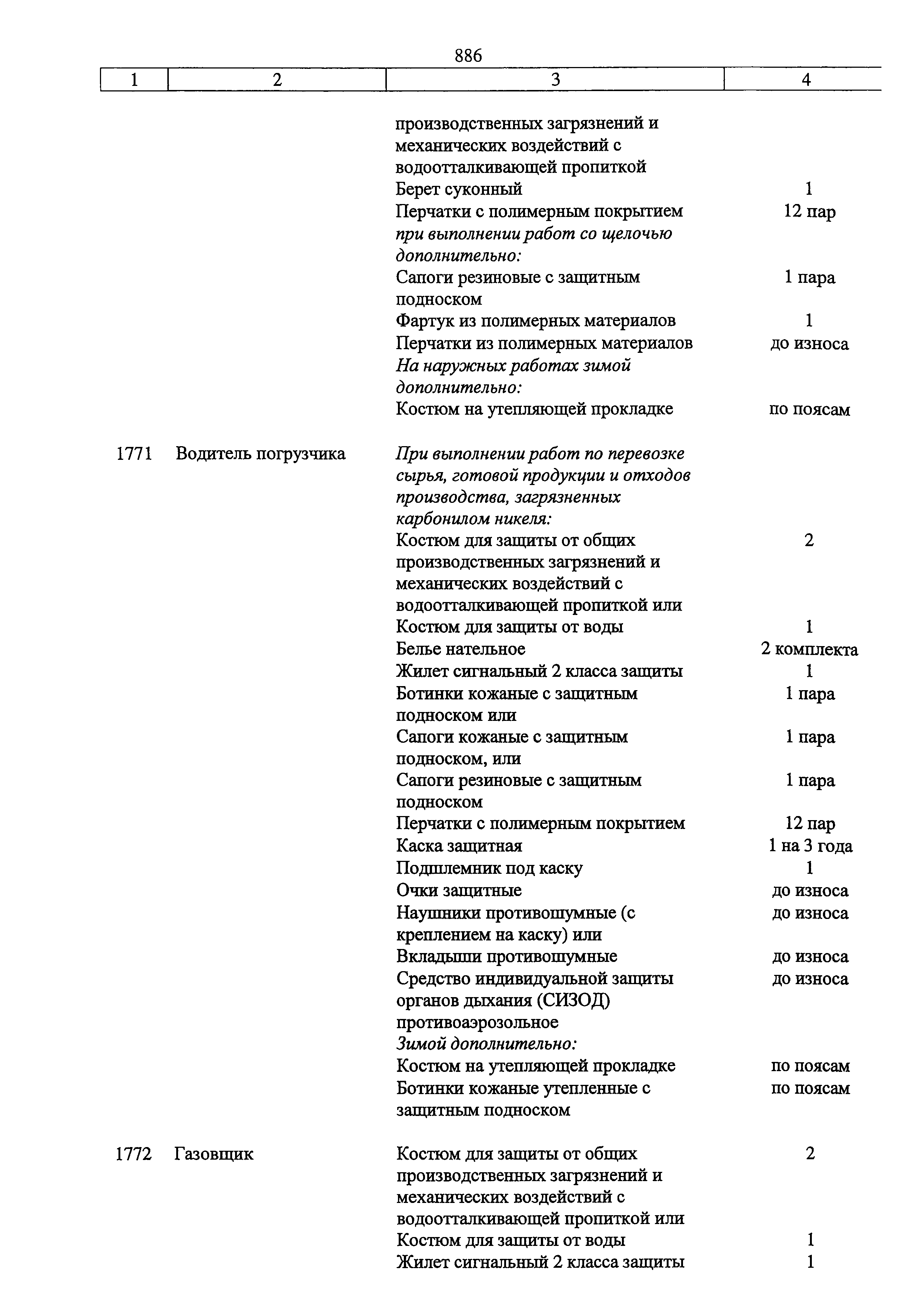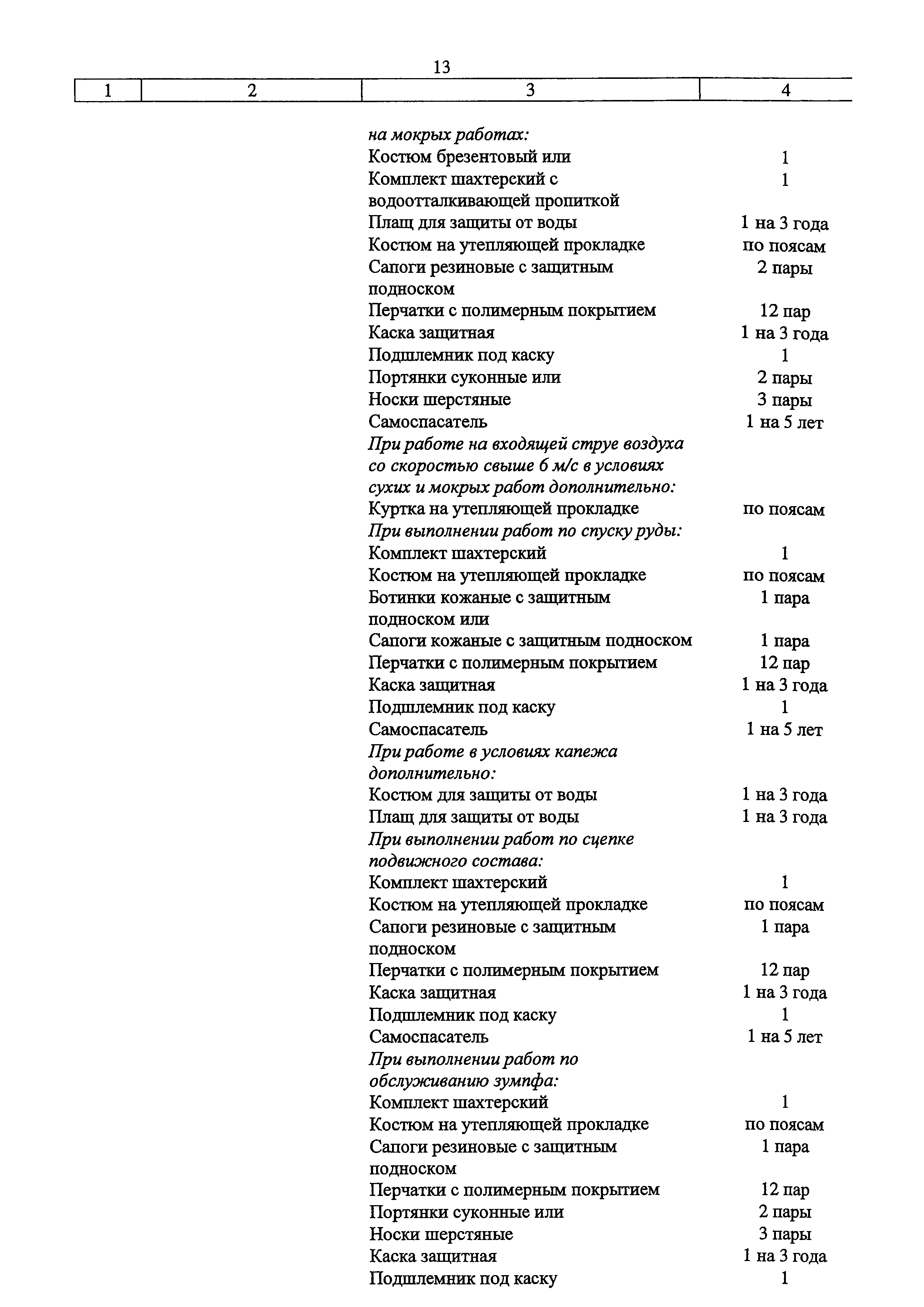 Типовые нормы бесплатной выдачи специальной одежды, специальной обуви и других средств индивидуальной защиты работникам горной и металлургической промышленности и металлургических производств других отраслей промышленности, занятым на работах с вредными и (или) опасными условиями труда, а также на работах, выполняемых в особых температурных условиях или связанных с загрязнением| Статус: | действует | | Название рус.: | Типовые нормы бесплатной выдачи специальной одежды, специальной обуви и других средств индивидуальной защиты работникам горной и металлургической промышленности и металлургических производств других отраслей промышленности, занятым на работах с вредными и (или) опасными условиями труда, а также на работах, выполняемых в особых температурных условиях или связанных с загрязнением | | Дата добавления в базу: | 01.02.2017 | | Дата актуализации: | 01.01.2021 | | Дата введения: | 14.02.2014 | | Область применения: | Нормы утверждаются локальными нормативными актами работодателя на основании результатов аттестации рабочих мест по условиям труда и могут быть включены в коллективный и (или) трудовой договор с указанием типовых норм, по сравнению с которыми улучшается обеспечение работников специальной одеждой, специальной обувью и другими средствами индивидуальной защиты. | | Оглавление: | I Горнодобывающая промышленность 1 Подземные горные работы (шахты) 2 Открытые горные работы и шахтная поверхность 3 Работа на гидравлических установках или с промывочными приборами 4 Дражные работы II Дробление, обогащение, брикетирование, обжиг, агломерация, извлечение металлов и сплавов III Черная металлургия 1 Коксохимическое производство 1.1 Углеподготовительные цеха 1.2 Углеобогатительные цеха 1.3 Производство каменноугольного кокса 1.4 Производство кристаллического нафталина, кумароновой смолы, смолоперерабатывающие цеха 1.5 Производство пиридиновых и фенольно-крезольных продуктов 1.6 Цеха улавливания химических продуктов и газовые цеха 1.7 Цеха ректификации сырого бензола 1.8 Цеха очистки коксового газа от сероводорода 1.9 Производство пекового кокса 1.10 Производство термоантрацита 2 Доменное производство 3 Сталеплавильное производство 3.1 Установки непрерывной разливки стали 4 Производство ферросплавов 4.1 Электролитическое производство 4.2 Производство электролитического хрома 4.3 Производство феррованадия 4.4 Подготовка шихты, обжиг руд и концентратов 4.5 Разливка и разделка ферросплавов 4.6 Обжиг извести 4.7 Общие профессии и должности ферросплавного производства 5 Прокатное производство 6 Производство труб (прокатка, сварка и волочение) 7 Колесопрокатное и бандажное производства 8 Валопрокатное производство 9 Производство рельсовых скреплений 10 Производство баллонов 11 Труболитейное производство 12 Производство метизов 12.1 Производство металлических канатов, сеток, пружин и пружинной ленты, щеток, цепей, колючей проволоки и других метизов 12.2 Волочение проволоки, калибровка и шлифовка металла 12.3 Изготовление волок 12.4 Холодноштамповочные и кузнечно-прессовые работы 12.5 Термическая обработка 12.6 Травление металла, защитные покрытия проволоки и извлечение железного купороса 12.7 Производство металлических электродов и порошковой проволоки 13 Производство огнеупоров 13.1 Огнеупоры 13.2 Карборундовые стержни 13.3 Высокоогнеупорные окислы 14 Ремонт 