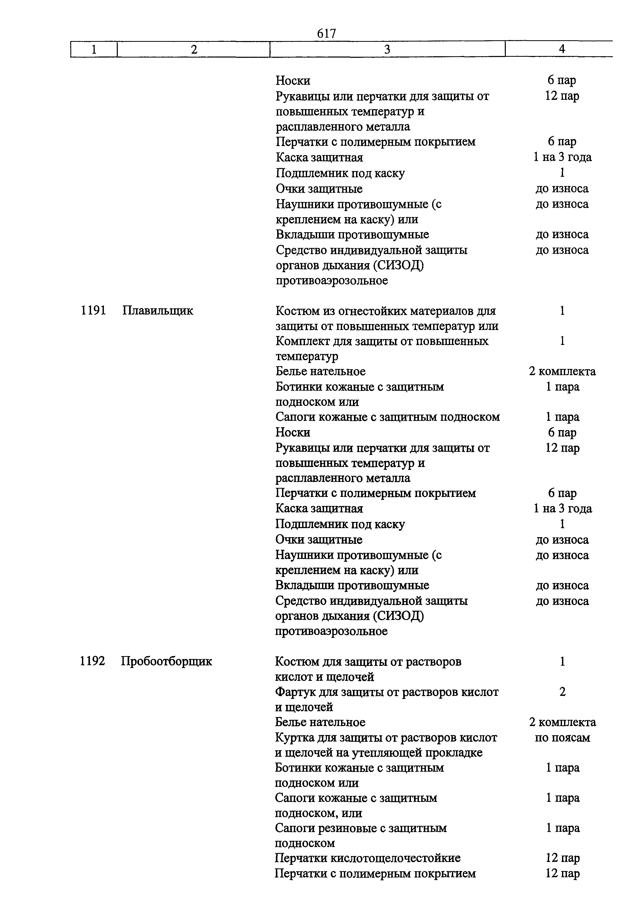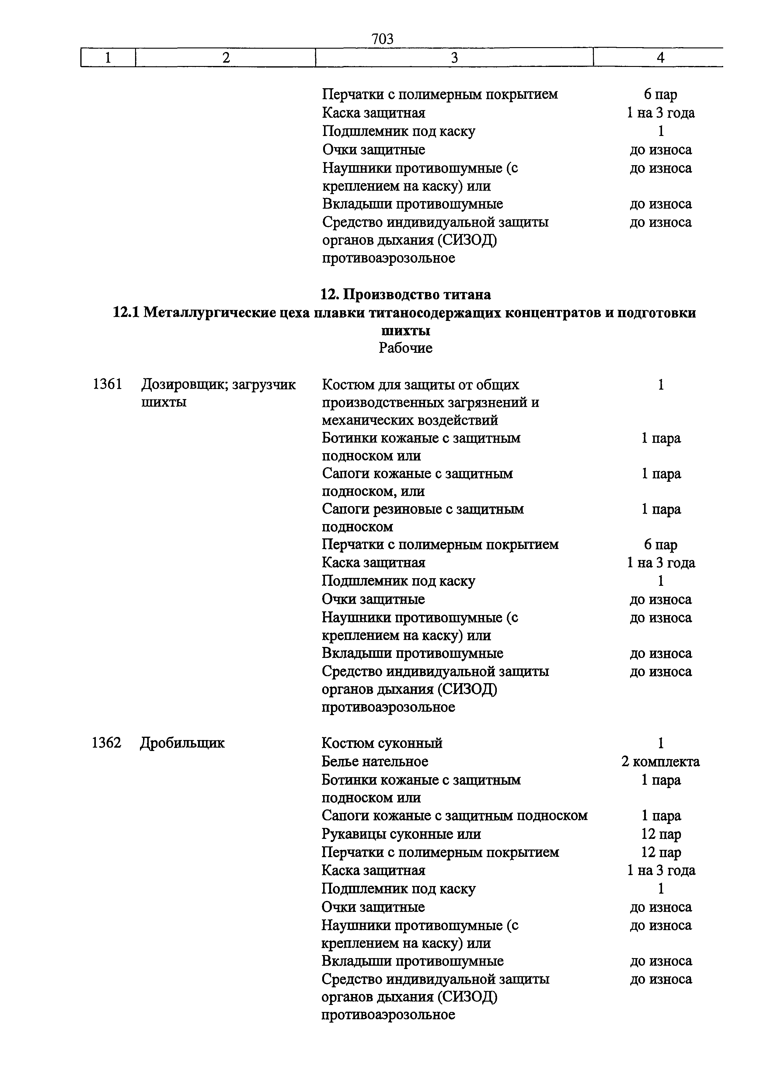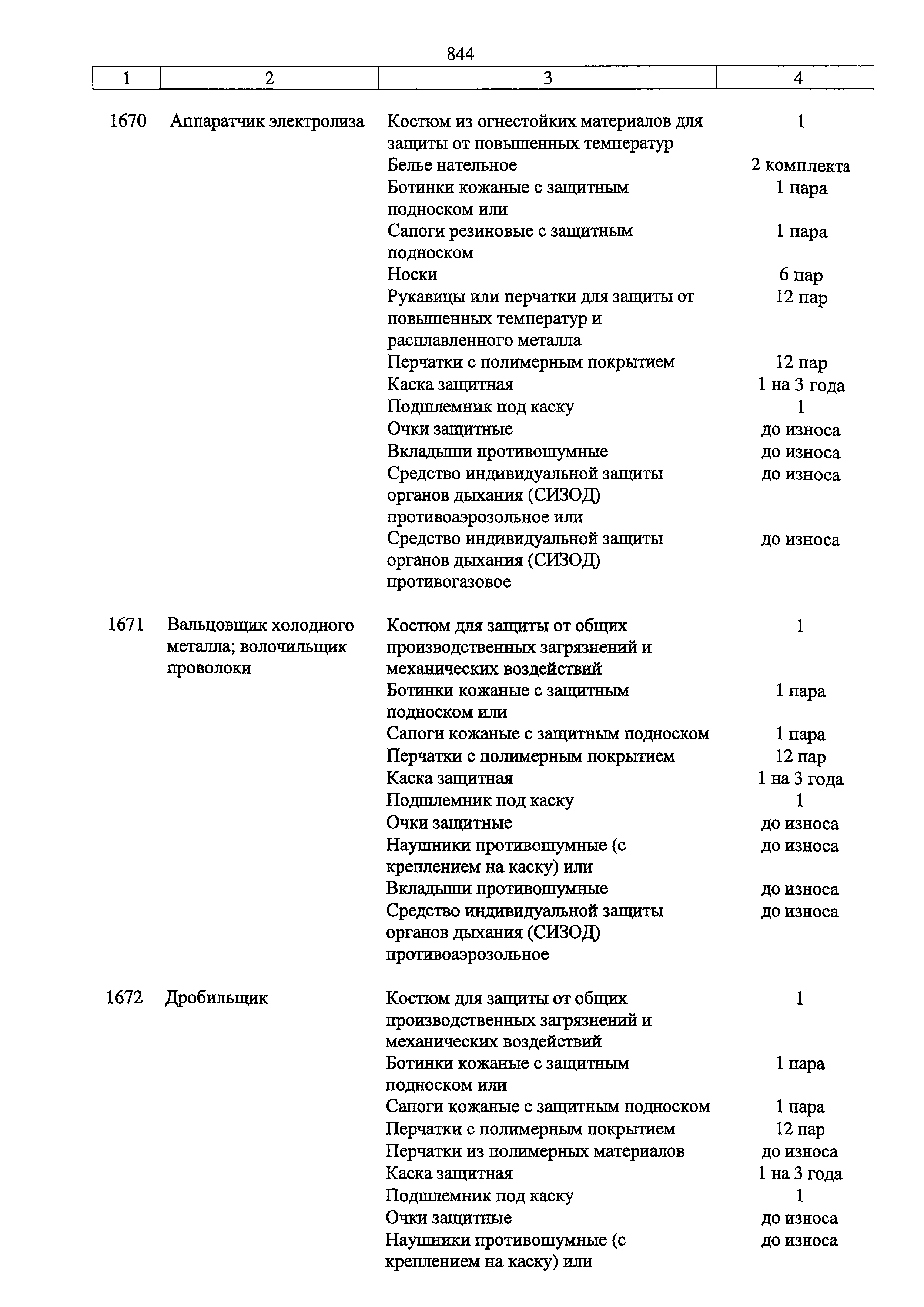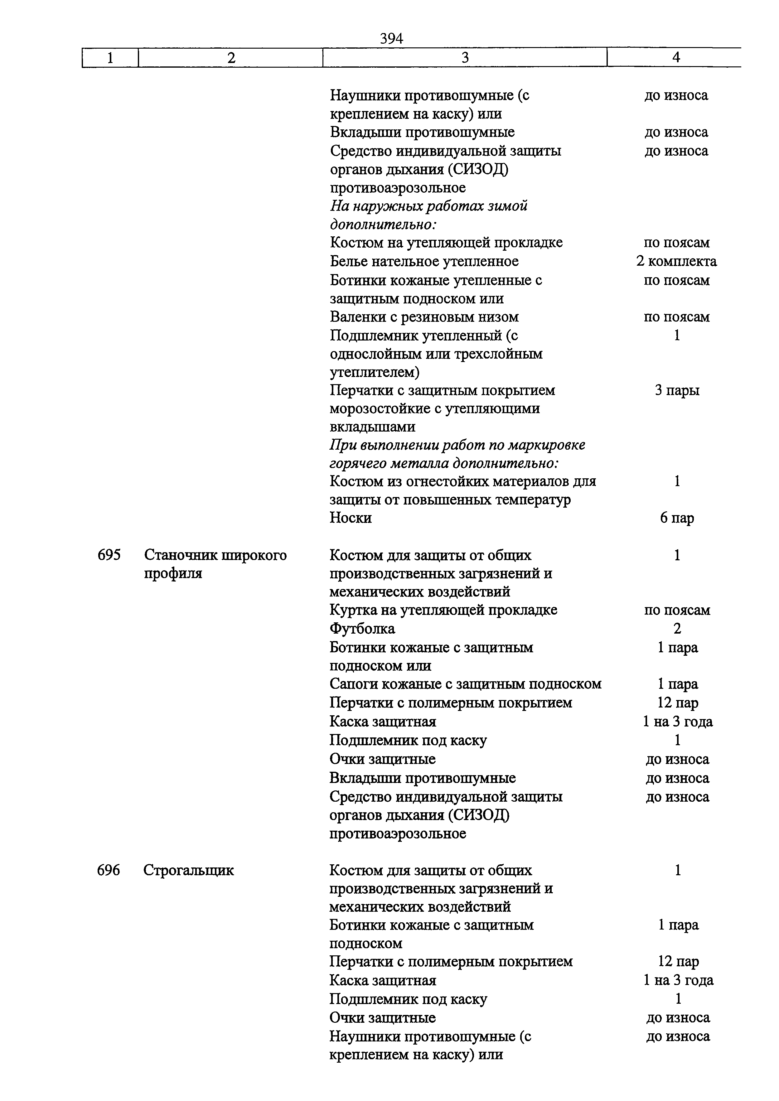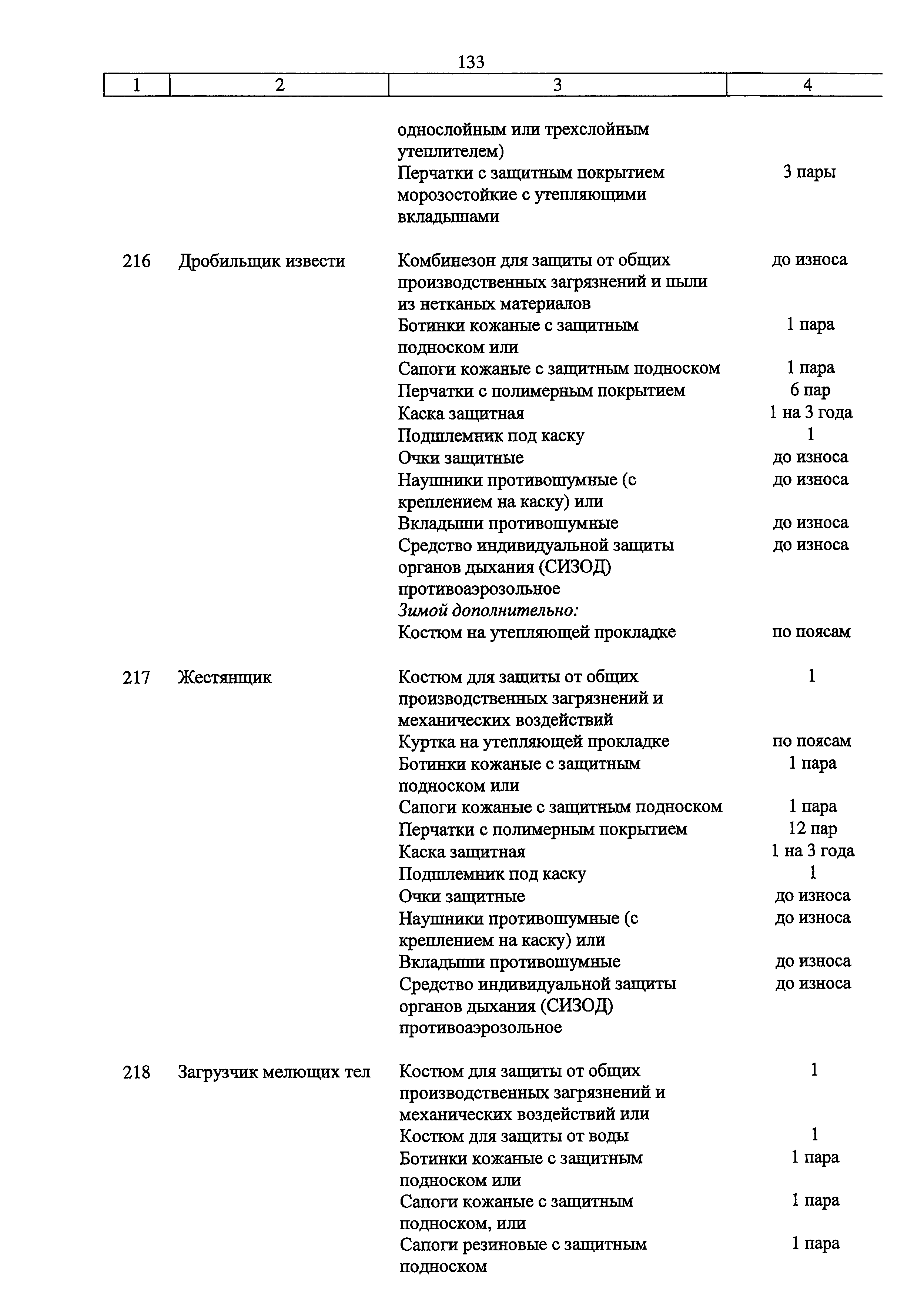 Типовые нормы бесплатной выдачи специальной одежды, специальной обуви и других средств индивидуальной защиты работникам горной и металлургической промышленности и металлургических производств других отраслей промышленности, занятым на работах с вредными и (или) опасными условиями труда, а также на работах, выполняемых в особых температурных условиях или связанных с загрязнением| Статус: | действует | | Название рус.: | Типовые нормы бесплатной выдачи специальной одежды, специальной обуви и других средств индивидуальной защиты работникам горной и металлургической промышленности и металлургических производств других отраслей промышленности, занятым на работах с вредными и (или) опасными условиями труда, а также на работах, выполняемых в особых температурных условиях или связанных с загрязнением | | Дата добавления в базу: | 01.02.2017 | | Дата актуализации: | 01.01.2021 | | Дата введения: | 14.02.2014 | | Область применения: | Нормы утверждаются локальными нормативными актами работодателя на основании результатов аттестации рабочих мест по условиям труда и могут быть включены в коллективный и (или) трудовой договор с указанием типовых норм, по сравнению с которыми улучшается обеспечение работников специальной одеждой, специальной обувью и другими средствами индивидуальной защиты. | | Оглавление: | I Горнодобывающая промышленность 1 Подземные горные работы (шахты) 2 Открытые горные работы и шахтная поверхность 3 Работа на гидравлических установках или с промывочными приборами 4 Дражные работы II Дробление, обогащение, брикетирование, обжиг, агломерация, извлечение металлов и сплавов III Черная металлургия 1 Коксохимическое производство 1.1 Углеподготовительные цеха 1.2 Углеобогатительные цеха 1.3 Производство каменноугольного кокса 1.4 Производство кристаллического нафталина, кумароновой смолы, смолоперерабатывающие цеха 1.5 Производство пиридиновых и фенольно-крезольных продуктов 1.6 Цеха улавливания химических продуктов и газовые цеха 1.7 Цеха ректификации сырого бензола 1.8 Цеха очистки коксового газа от сероводорода 1.9 Производство пекового кокса 1.10 Производство термоантрацита 2 Доменное производство 3 Сталеплавильное производство 3.1 Установки непрерывной разливки стали 4 Производство ферросплавов 4.1 Электролитическое производство 4.2 Производство электролитического хрома 4.3 Производство феррованадия 4.4 Подготовка шихты, обжиг руд и концентратов 4.5 Разливка и разделка ферросплавов 4.6 Обжиг извести 4.7 Общие профессии и должности ферросплавного производства 5 Прокатное производство 6 Производство труб (прокатка, сварка и волочение) 7 Колесопрокатное и бандажное производства 8 Валопрокатное производство 9 Производство рельсовых скреплений 10 Производство баллонов 11 Труболитейное производство 12 Производство метизов 12.1 Производство металлических канатов, сеток, пружин и пружинной ленты, щеток, цепей, колючей проволоки и других метизов 12.2 Волочение проволоки, калибровка и шлифовка металла 12.3 Изготовление волок 12.4 Холодноштамповочные и кузнечно-прессовые работы 12.5 Термическая обработка 12.6 Травление металла, защитные покрытия проволоки и извлечение железного купороса 12.7 Производство металлических электродов и порошковой проволоки 13 Производство огнеупоров 13.1 Огнеупоры 13.2 Карборундовые стержни 13.3 Высокоогнеупорные окислы 14 Ремонт 