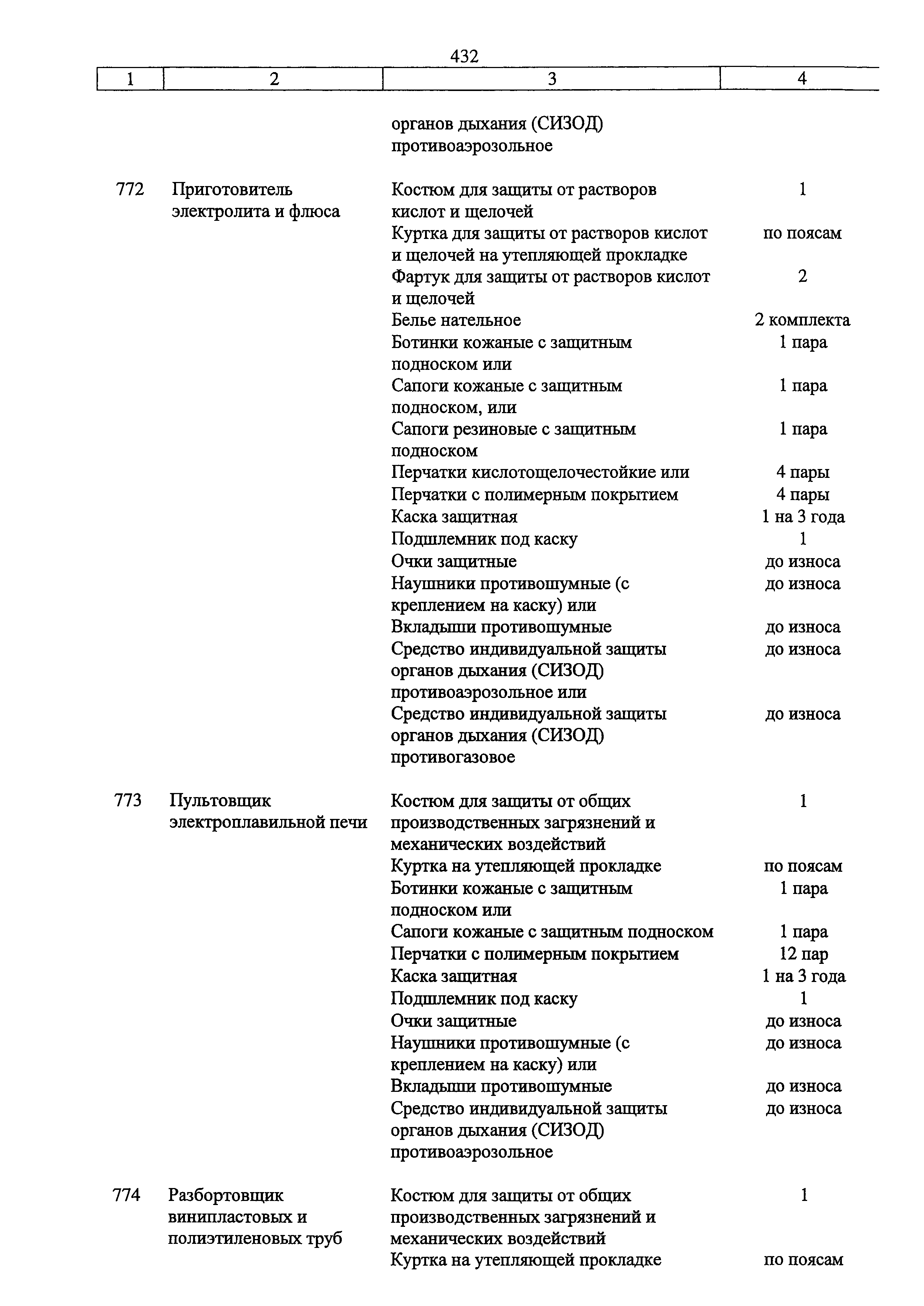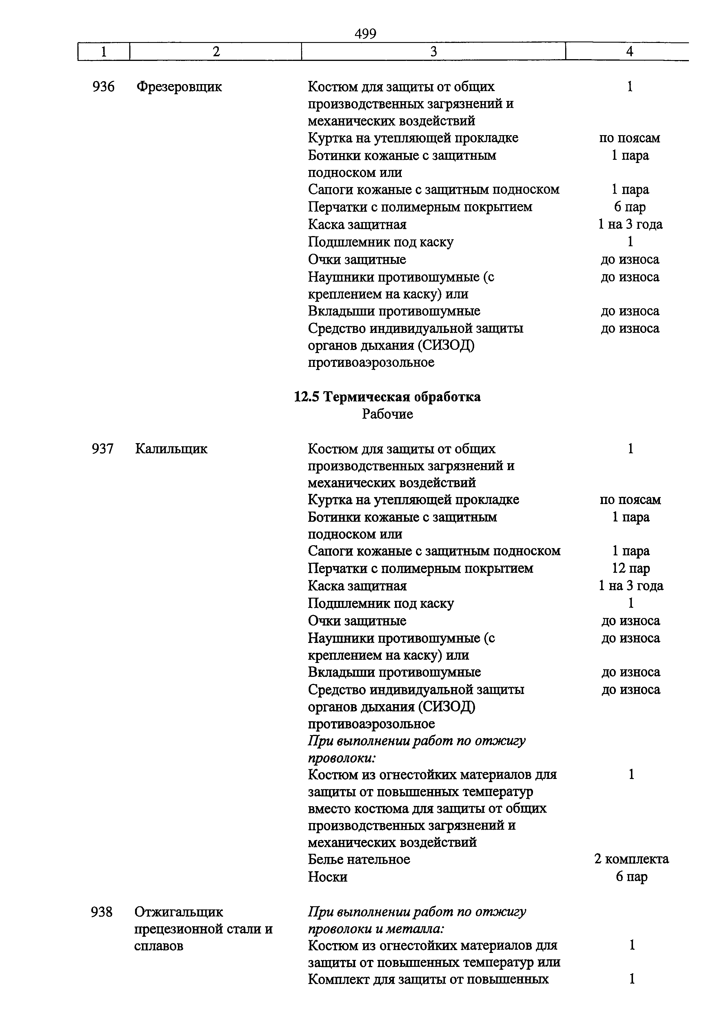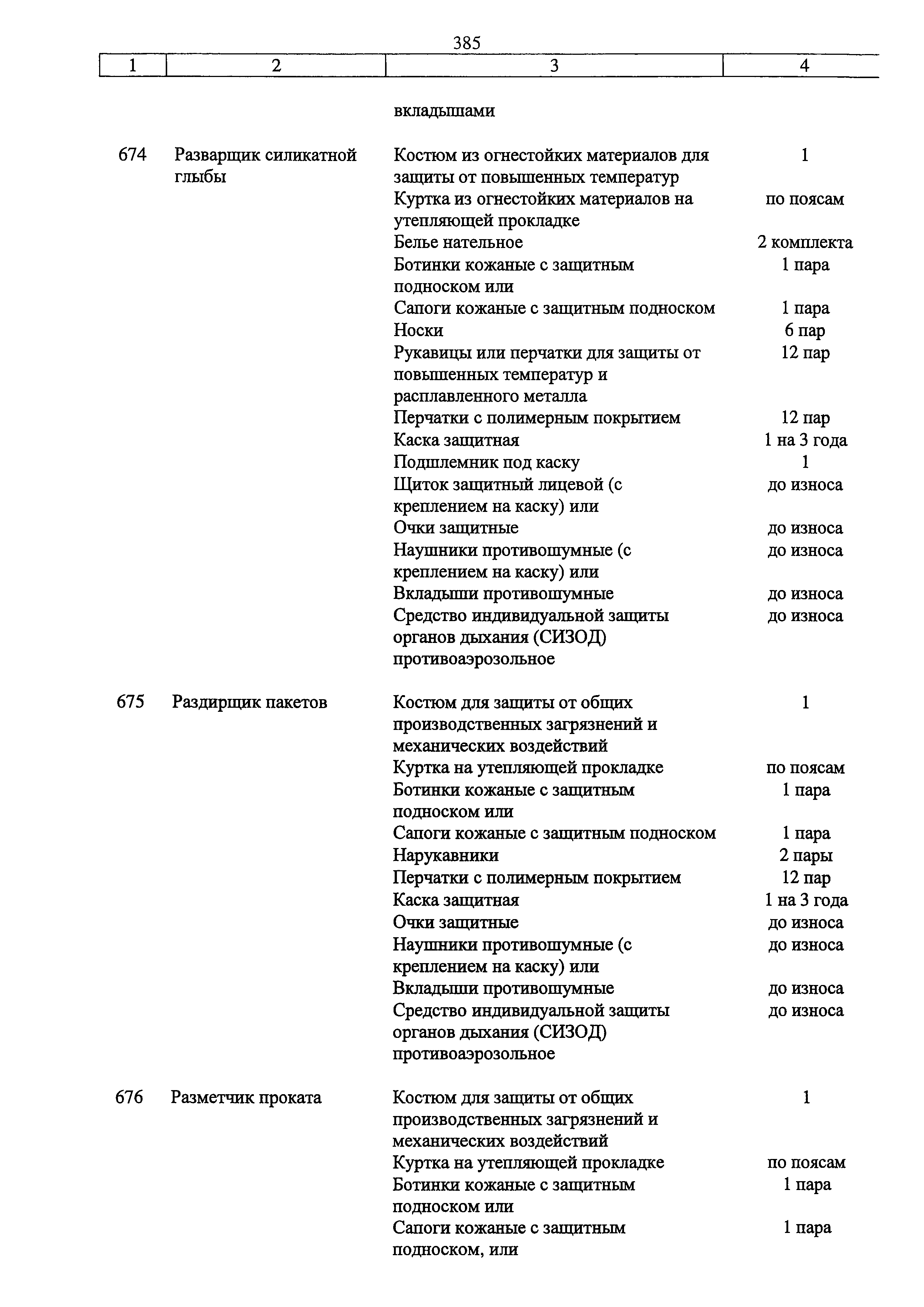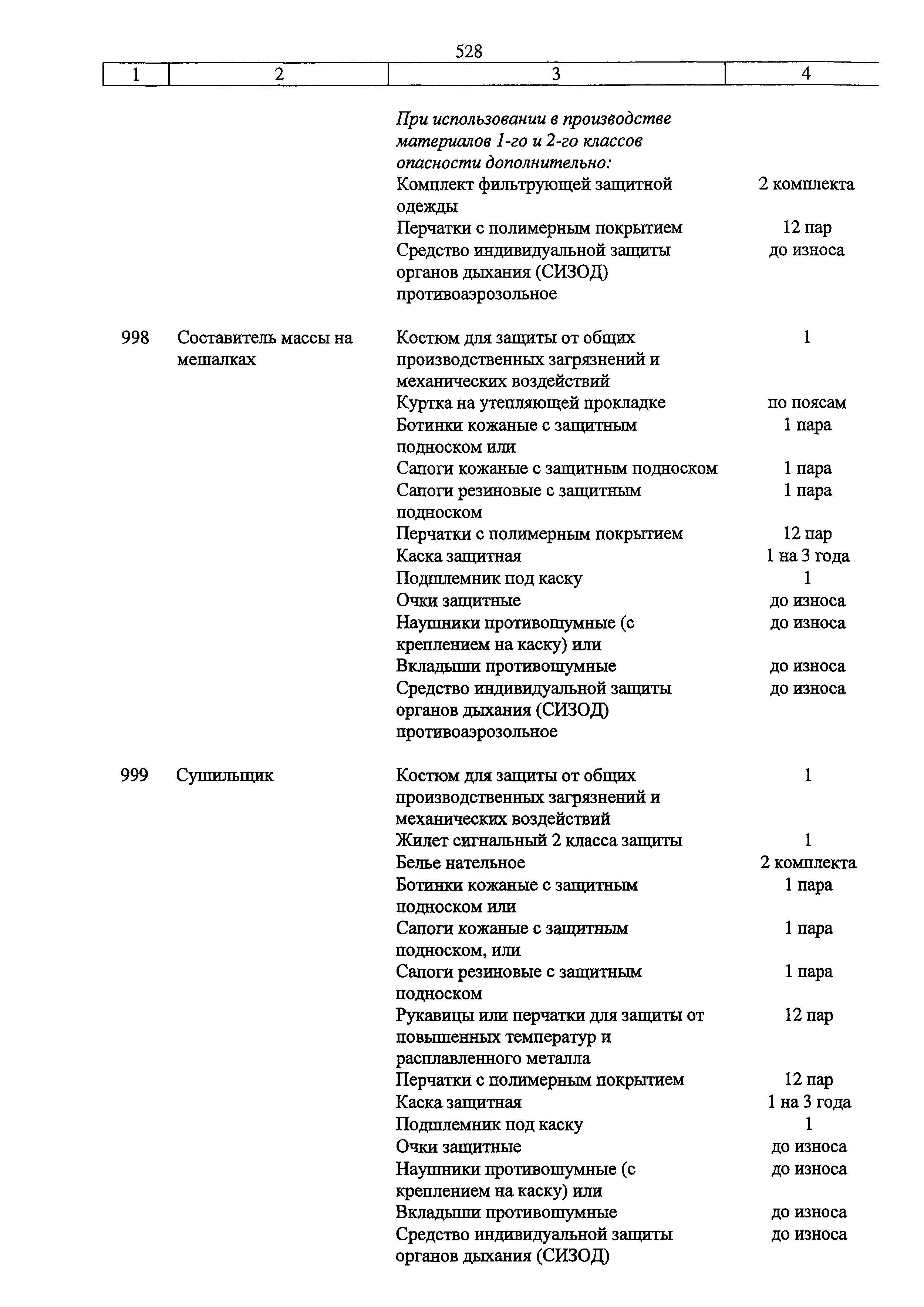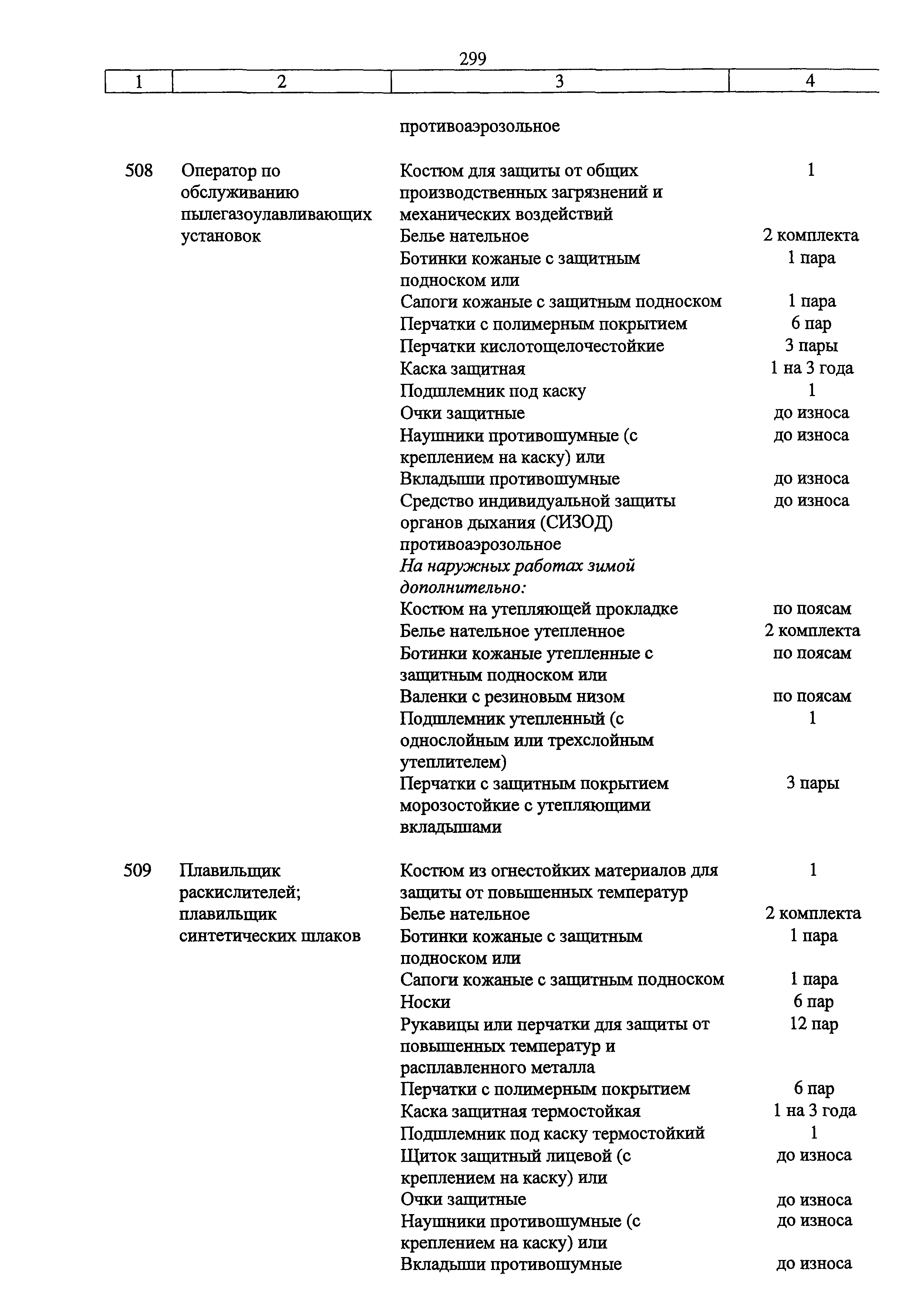 Типовые нормы бесплатной выдачи специальной одежды, специальной обуви и других средств индивидуальной защиты работникам горной и металлургической промышленности и металлургических производств других отраслей промышленности, занятым на работах с вредными и (или) опасными условиями труда, а также на работах, выполняемых в особых температурных условиях или связанных с загрязнением| Статус: | действует | | Название рус.: | Типовые нормы бесплатной выдачи специальной одежды, специальной обуви и других средств индивидуальной защиты работникам горной и металлургической промышленности и металлургических производств других отраслей промышленности, занятым на работах с вредными и (или) опасными условиями труда, а также на работах, выполняемых в особых температурных условиях или связанных с загрязнением | | Дата добавления в базу: | 01.02.2017 | | Дата актуализации: | 01.01.2021 | | Дата введения: | 14.02.2014 | | Область применения: | Нормы утверждаются локальными нормативными актами работодателя на основании результатов аттестации рабочих мест по условиям труда и могут быть включены в коллективный и (или) трудовой договор с указанием типовых норм, по сравнению с которыми улучшается обеспечение работников специальной одеждой, специальной обувью и другими средствами индивидуальной защиты. | | Оглавление: | I Горнодобывающая промышленность 1 Подземные горные работы (шахты) 2 Открытые горные работы и шахтная поверхность 3 Работа на гидравлических установках или с промывочными приборами 4 Дражные работы II Дробление, обогащение, брикетирование, обжиг, агломерация, извлечение металлов и сплавов III Черная металлургия 1 Коксохимическое производство 1.1 Углеподготовительные цеха 1.2 Углеобогатительные цеха 1.3 Производство каменноугольного кокса 1.4 Производство кристаллического нафталина, кумароновой смолы, смолоперерабатывающие цеха 1.5 Производство пиридиновых и фенольно-крезольных продуктов 1.6 Цеха улавливания химических продуктов и газовые цеха 1.7 Цеха ректификации сырого бензола 1.8 Цеха очистки коксового газа от сероводорода 1.9 Производство пекового кокса 1.10 Производство термоантрацита 2 Доменное производство 3 Сталеплавильное производство 3.1 Установки непрерывной разливки стали 4 Производство ферросплавов 4.1 Электролитическое производство 4.2 Производство электролитического хрома 4.3 Производство феррованадия 4.4 Подготовка шихты, обжиг руд и концентратов 4.5 Разливка и разделка ферросплавов 4.6 Обжиг извести 4.7 Общие профессии и должности ферросплавного производства 5 Прокатное производство 6 Производство труб (прокатка, сварка и волочение) 7 Колесопрокатное и бандажное производства 8 Валопрокатное производство 9 Производство рельсовых скреплений 10 Производство баллонов 11 Труболитейное производство 12 Производство метизов 12.1 Производство металлических канатов, сеток, пружин и пружинной ленты, щеток, цепей, колючей проволоки и других метизов 12.2 Волочение проволоки, калибровка и шлифовка металла 12.3 Изготовление волок 12.4 Холодноштамповочные и кузнечно-прессовые работы 12.5 Термическая обработка 12.6 Травление металла, защитные покрытия проволоки и извлечение железного купороса 12.7 Производство металлических электродов и порошковой проволоки 13 Производство огнеупоров 13.1 Огнеупоры 13.2 Карборундовые стержни 13.3 Высокоогнеупорные окислы 14 Ремонт 