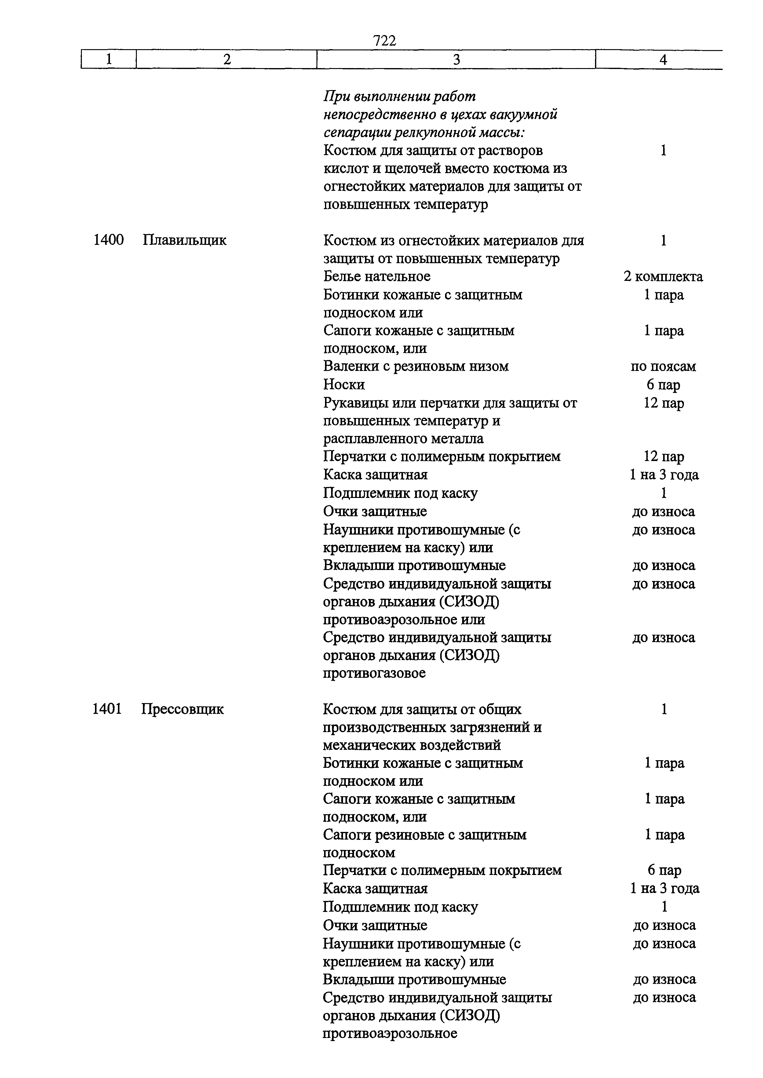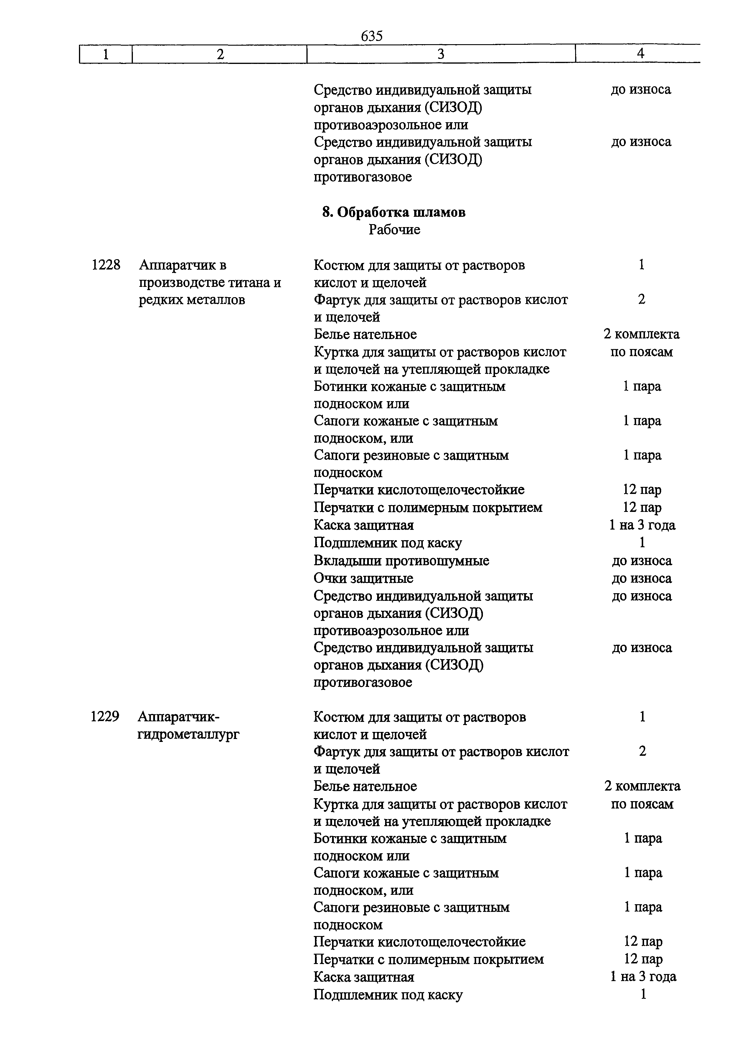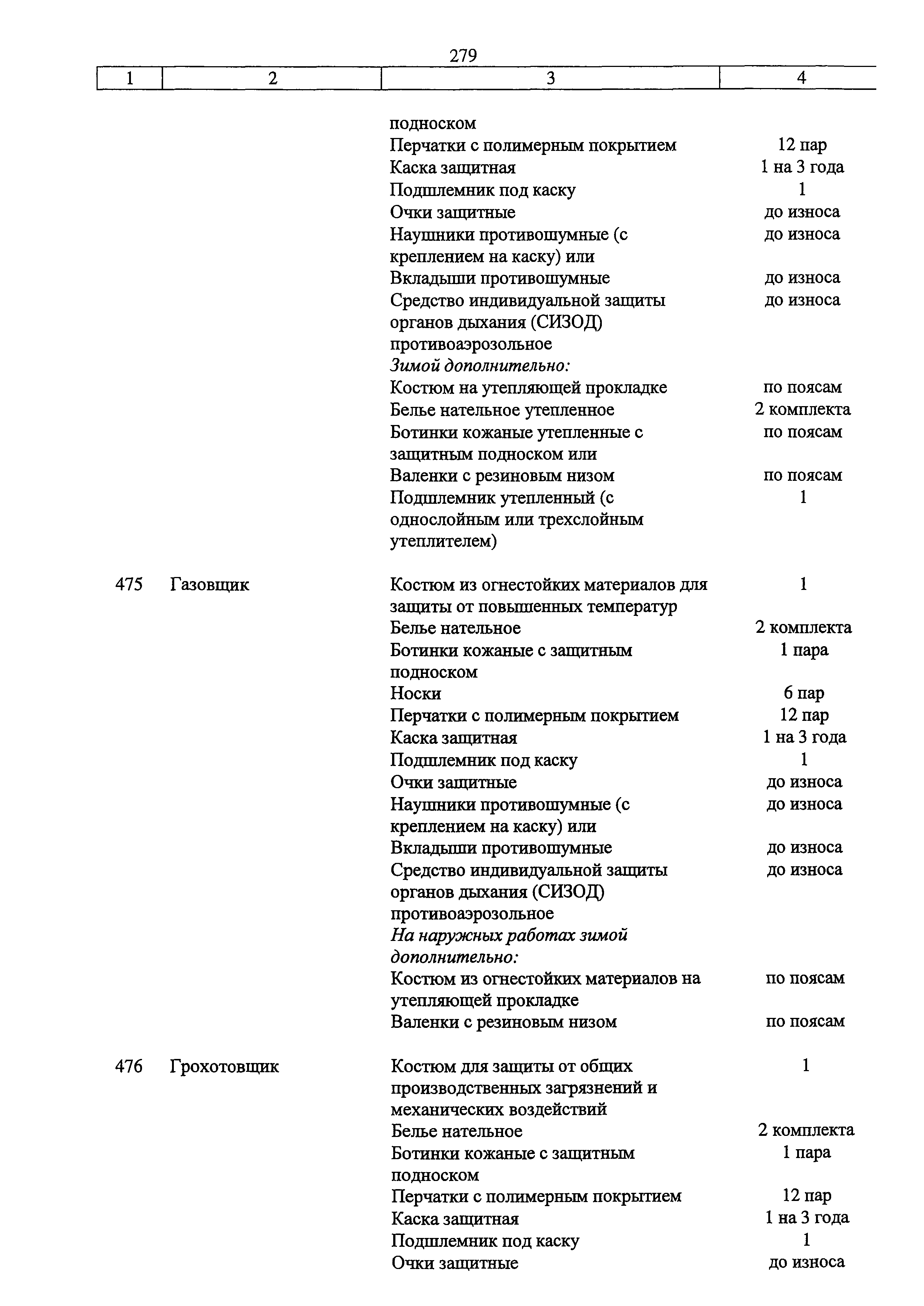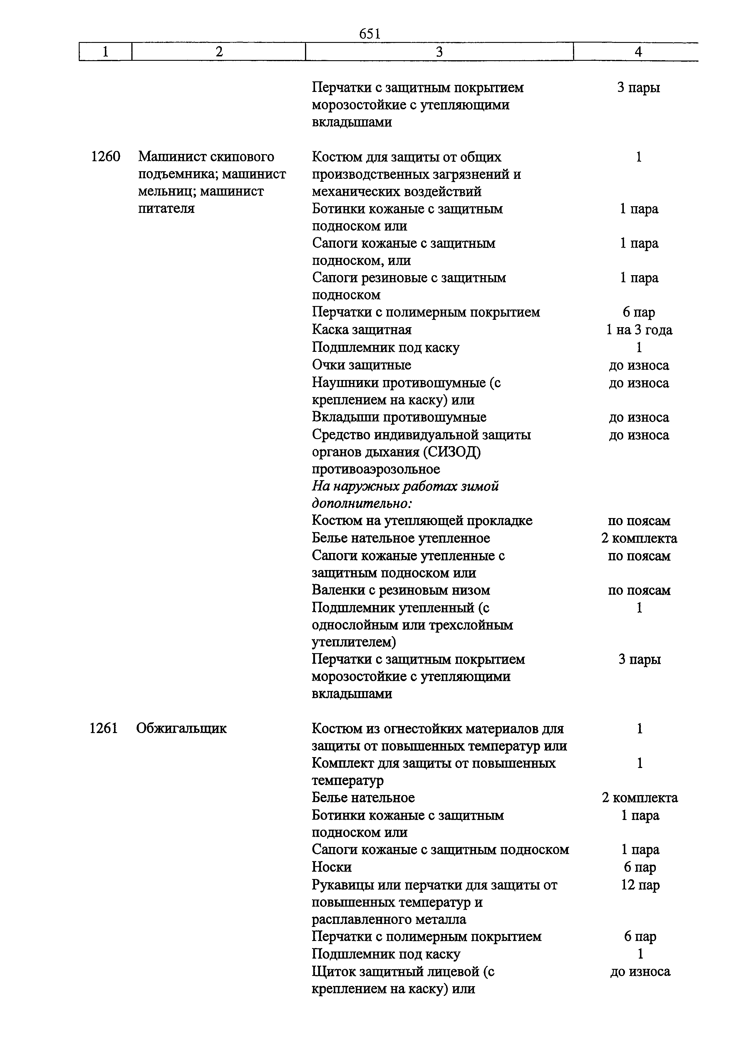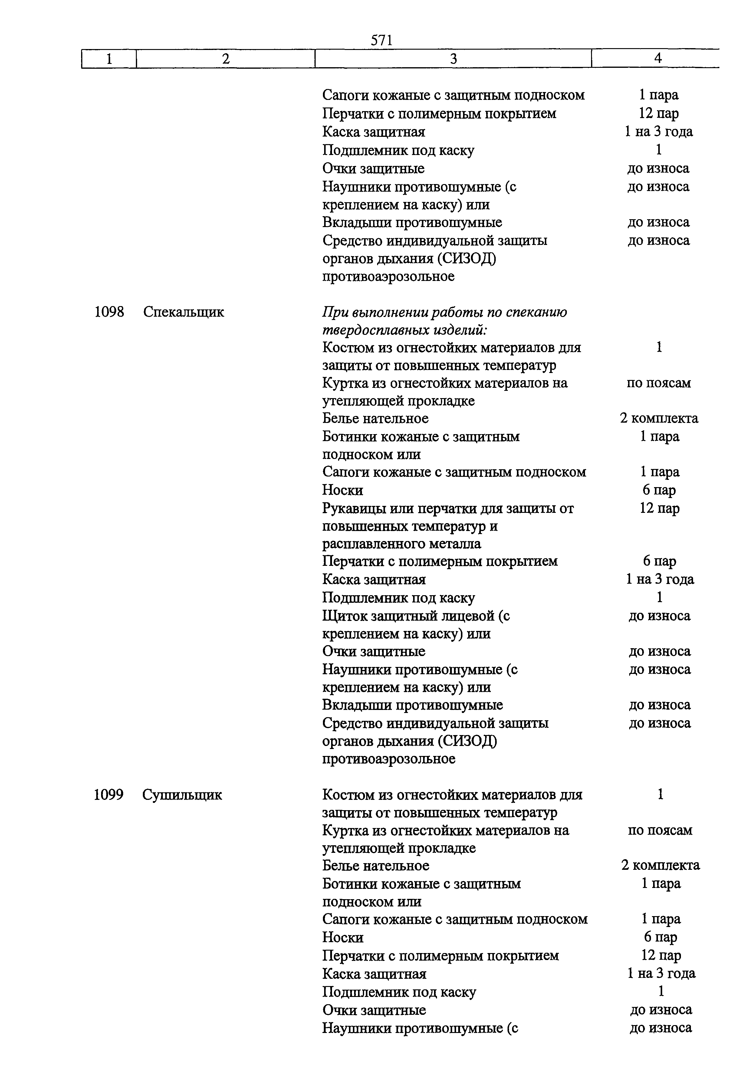 Типовые нормы бесплатной выдачи специальной одежды, специальной обуви и других средств индивидуальной защиты работникам горной и металлургической промышленности и металлургических производств других отраслей промышленности, занятым на работах с вредными и (или) опасными условиями труда, а также на работах, выполняемых в особых температурных условиях или связанных с загрязнением| Статус: | действует | | Название рус.: | Типовые нормы бесплатной выдачи специальной одежды, специальной обуви и других средств индивидуальной защиты работникам горной и металлургической промышленности и металлургических производств других отраслей промышленности, занятым на работах с вредными и (или) опасными условиями труда, а также на работах, выполняемых в особых температурных условиях или связанных с загрязнением | | Дата добавления в базу: | 01.02.2017 | | Дата актуализации: | 01.01.2021 | | Дата введения: | 14.02.2014 | | Область применения: | Нормы утверждаются локальными нормативными актами работодателя на основании результатов аттестации рабочих мест по условиям труда и могут быть включены в коллективный и (или) трудовой договор с указанием типовых норм, по сравнению с которыми улучшается обеспечение работников специальной одеждой, специальной обувью и другими средствами индивидуальной защиты. | | Оглавление: | I Горнодобывающая промышленность 1 Подземные горные работы (шахты) 2 Открытые горные работы и шахтная поверхность 3 Работа на гидравлических установках или с промывочными приборами 4 Дражные работы II Дробление, обогащение, брикетирование, обжиг, агломерация, извлечение металлов и сплавов III Черная металлургия 1 Коксохимическое производство 1.1 Углеподготовительные цеха 1.2 Углеобогатительные цеха 1.3 Производство каменноугольного кокса 1.4 Производство кристаллического нафталина, кумароновой смолы, смолоперерабатывающие цеха 1.5 Производство пиридиновых и фенольно-крезольных продуктов 1.6 Цеха улавливания химических продуктов и газовые цеха 1.7 Цеха ректификации сырого бензола 1.8 Цеха очистки коксового газа от сероводорода 1.9 Производство пекового кокса 1.10 Производство термоантрацита 2 Доменное производство 3 Сталеплавильное производство 3.1 Установки непрерывной разливки стали 4 Производство ферросплавов 4.1 Электролитическое производство 4.2 Производство электролитического хрома 4.3 Производство феррованадия 4.4 Подготовка шихты, обжиг руд и концентратов 4.5 Разливка и разделка ферросплавов 4.6 Обжиг извести 4.7 Общие профессии и должности ферросплавного производства 5 Прокатное производство 6 Производство труб (прокатка, сварка и волочение) 7 Колесопрокатное и бандажное производства 8 Валопрокатное производство 9 Производство рельсовых скреплений 10 Производство баллонов 11 Труболитейное производство 12 Производство метизов 12.1 Производство металлических канатов, сеток, пружин и пружинной ленты, щеток, цепей, колючей проволоки и других метизов 12.2 Волочение проволоки, калибровка и шлифовка металла 12.3 Изготовление волок 12.4 Холодноштамповочные и кузнечно-прессовые работы 12.5 Термическая обработка 12.6 Травление металла, защитные покрытия проволоки и извлечение железного купороса 12.7 Производство металлических электродов и порошковой проволоки 13 Производство огнеупоров 13.1 Огнеупоры 13.2 Карборундовые стержни 13.3 Высокоогнеупорные окислы 14 Ремонт 