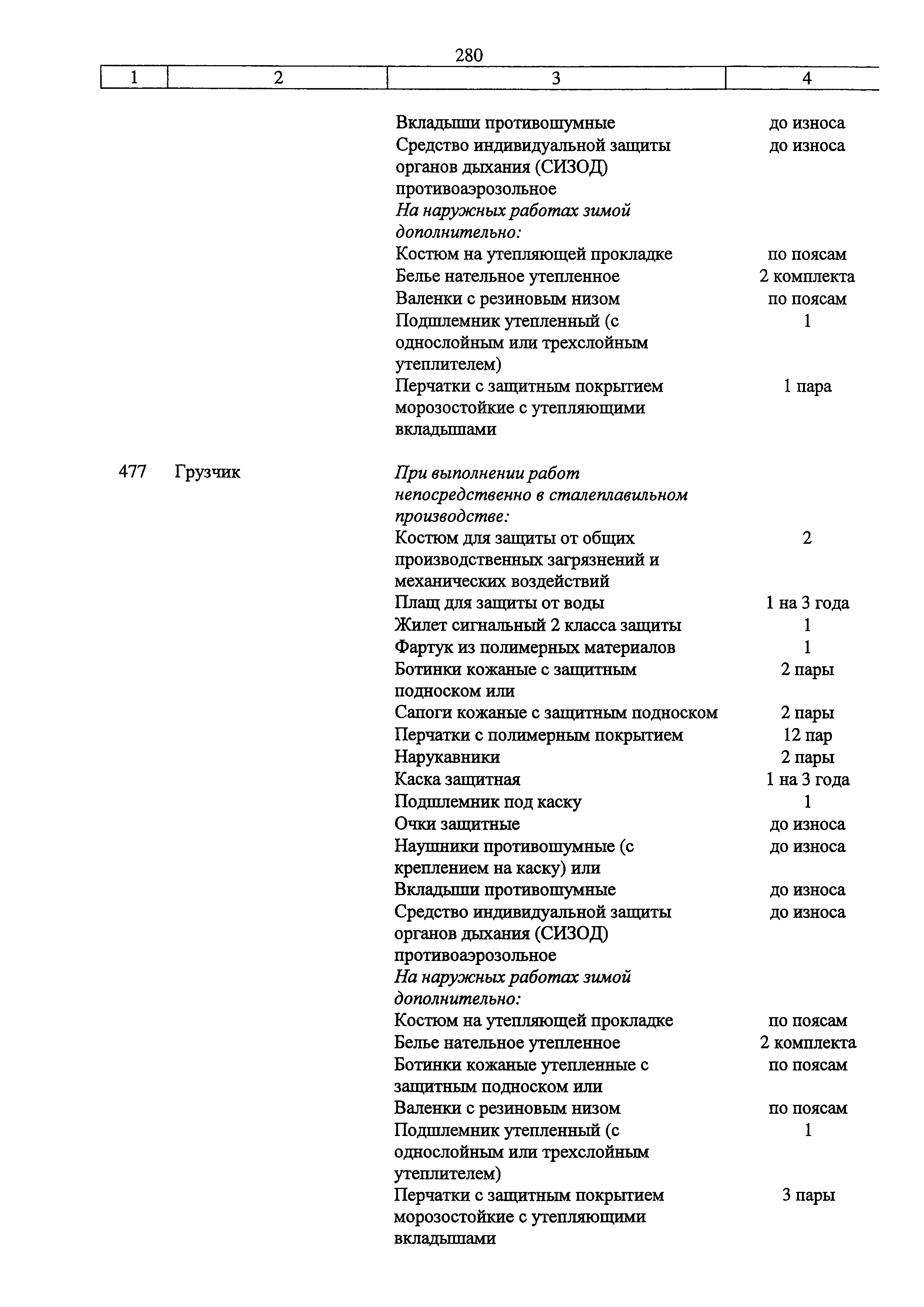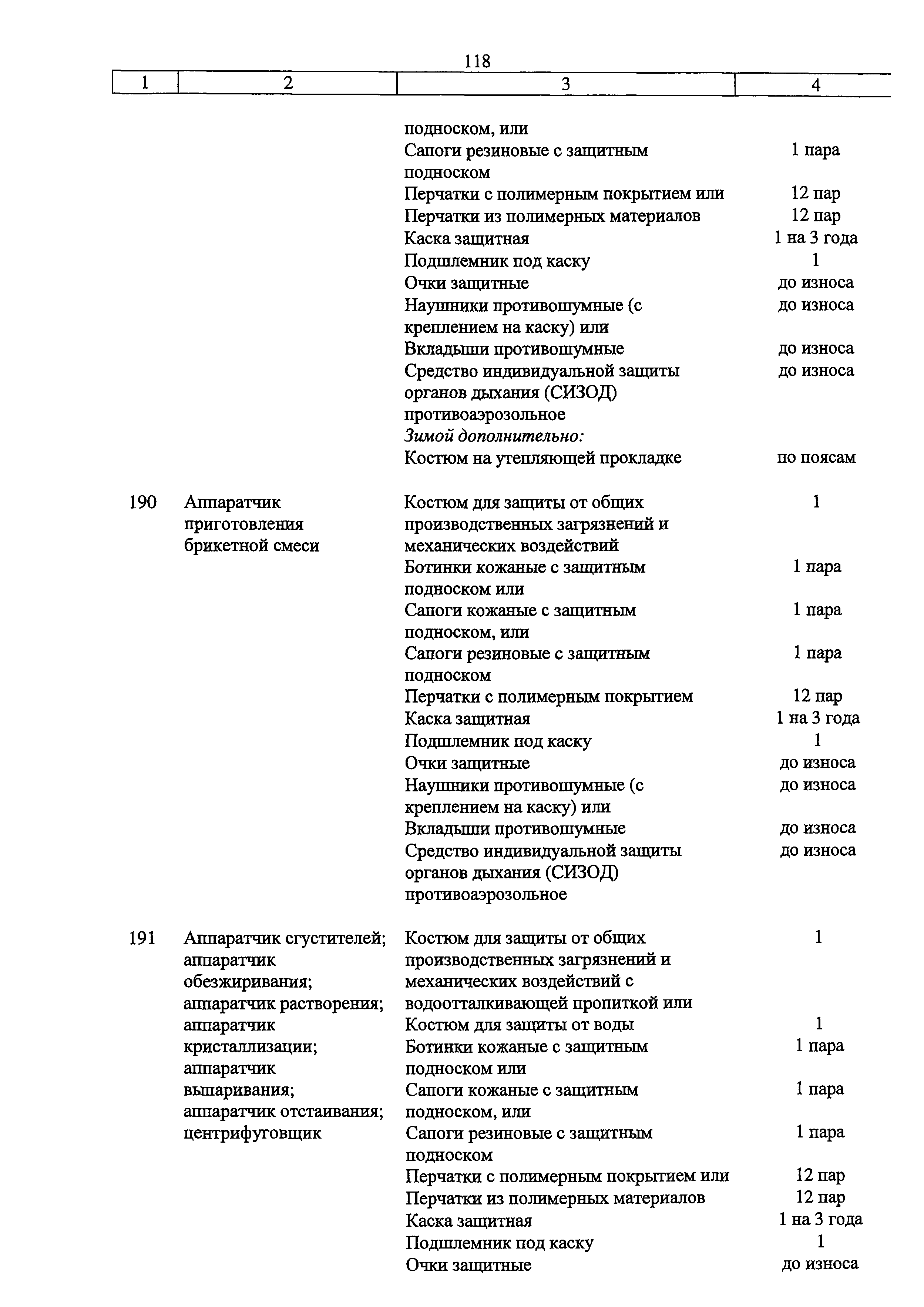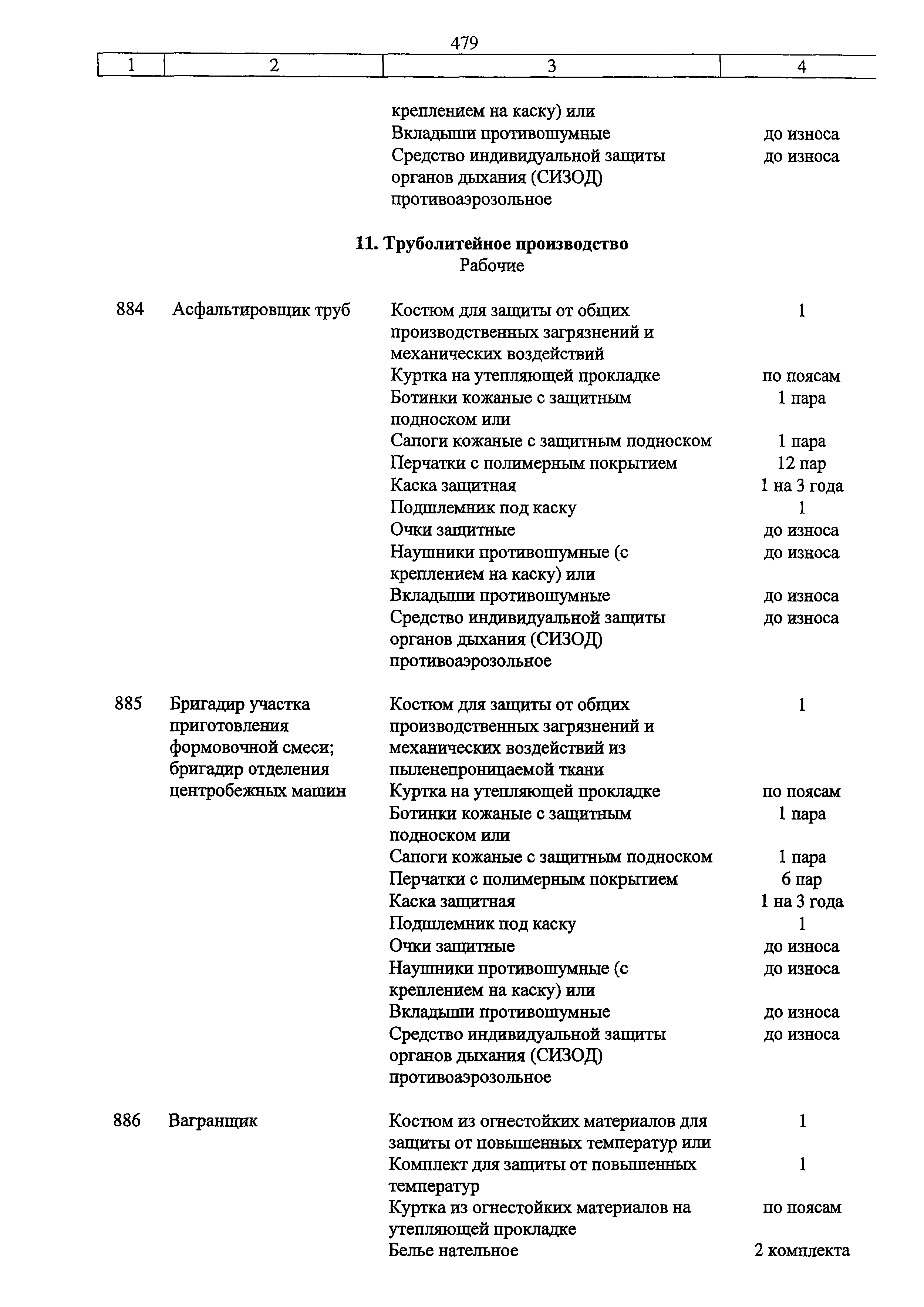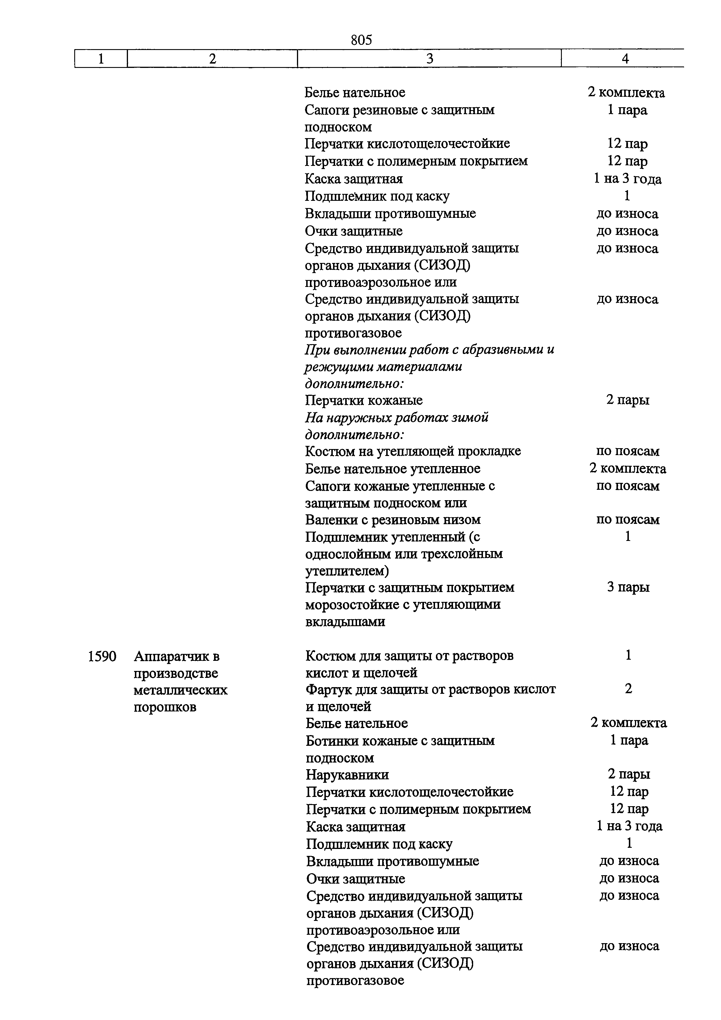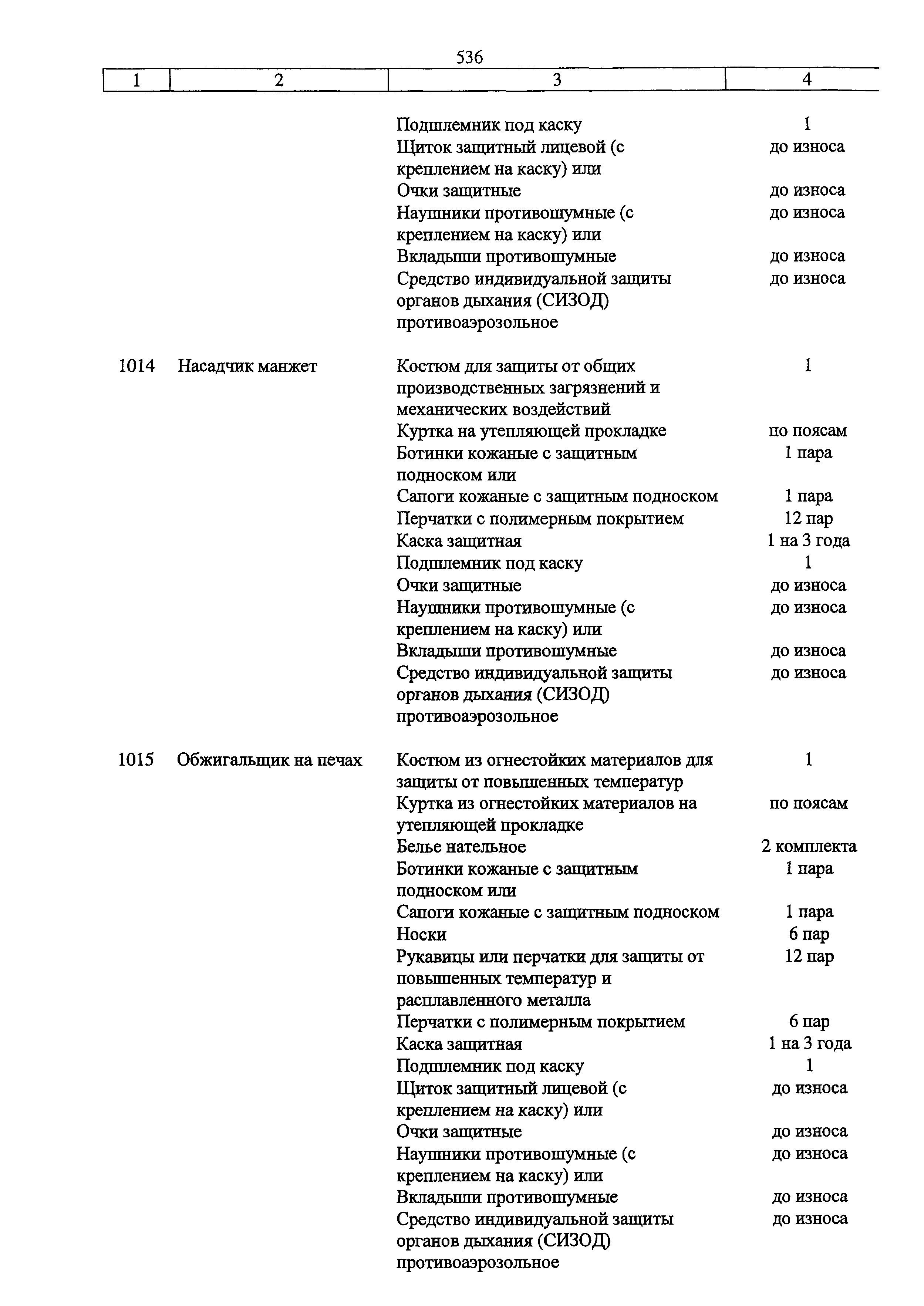 Типовые нормы бесплатной выдачи специальной одежды, специальной обуви и других средств индивидуальной защиты работникам горной и металлургической промышленности и металлургических производств других отраслей промышленности, занятым на работах с вредными и (или) опасными условиями труда, а также на работах, выполняемых в особых температурных условиях или связанных с загрязнением| Статус: | действует | | Название рус.: | Типовые нормы бесплатной выдачи специальной одежды, специальной обуви и других средств индивидуальной защиты работникам горной и металлургической промышленности и металлургических производств других отраслей промышленности, занятым на работах с вредными и (или) опасными условиями труда, а также на работах, выполняемых в особых температурных условиях или связанных с загрязнением | | Дата добавления в базу: | 01.02.2017 | | Дата актуализации: | 01.01.2021 | | Дата введения: | 14.02.2014 | | Область применения: | Нормы утверждаются локальными нормативными актами работодателя на основании результатов аттестации рабочих мест по условиям труда и могут быть включены в коллективный и (или) трудовой договор с указанием типовых норм, по сравнению с которыми улучшается обеспечение работников специальной одеждой, специальной обувью и другими средствами индивидуальной защиты. | | Оглавление: | I Горнодобывающая промышленность 1 Подземные горные работы (шахты) 2 Открытые горные работы и шахтная поверхность 3 Работа на гидравлических установках или с промывочными приборами 4 Дражные работы II Дробление, обогащение, брикетирование, обжиг, агломерация, извлечение металлов и сплавов III Черная металлургия 1 Коксохимическое производство 1.1 Углеподготовительные цеха 1.2 Углеобогатительные цеха 1.3 Производство каменноугольного кокса 1.4 Производство кристаллического нафталина, кумароновой смолы, смолоперерабатывающие цеха 1.5 Производство пиридиновых и фенольно-крезольных продуктов 1.6 Цеха улавливания химических продуктов и газовые цеха 1.7 Цеха ректификации сырого бензола 1.8 Цеха очистки коксового газа от сероводорода 1.9 Производство пекового кокса 1.10 Производство термоантрацита 2 Доменное производство 3 Сталеплавильное производство 3.1 Установки непрерывной разливки стали 4 Производство ферросплавов 4.1 Электролитическое производство 4.2 Производство электролитического хрома 4.3 Производство феррованадия 4.4 Подготовка шихты, обжиг руд и концентратов 4.5 Разливка и разделка ферросплавов 4.6 Обжиг извести 4.7 Общие профессии и должности ферросплавного производства 5 Прокатное производство 6 Производство труб (прокатка, сварка и волочение) 7 Колесопрокатное и бандажное производства 8 Валопрокатное производство 9 Производство рельсовых скреплений 10 Производство баллонов 11 Труболитейное производство 12 Производство метизов 12.1 Производство металлических канатов, сеток, пружин и пружинной ленты, щеток, цепей, колючей проволоки и других метизов 12.2 Волочение проволоки, калибровка и шлифовка металла 12.3 Изготовление волок 12.4 Холодноштамповочные и кузнечно-прессовые работы 12.5 Термическая обработка 12.6 Травление металла, защитные покрытия проволоки и извлечение железного купороса 12.7 Производство металлических электродов и порошковой проволоки 13 Производство огнеупоров 13.1 Огнеупоры 13.2 Карборундовые стержни 13.3 Высокоогнеупорные окислы 14 Ремонт 