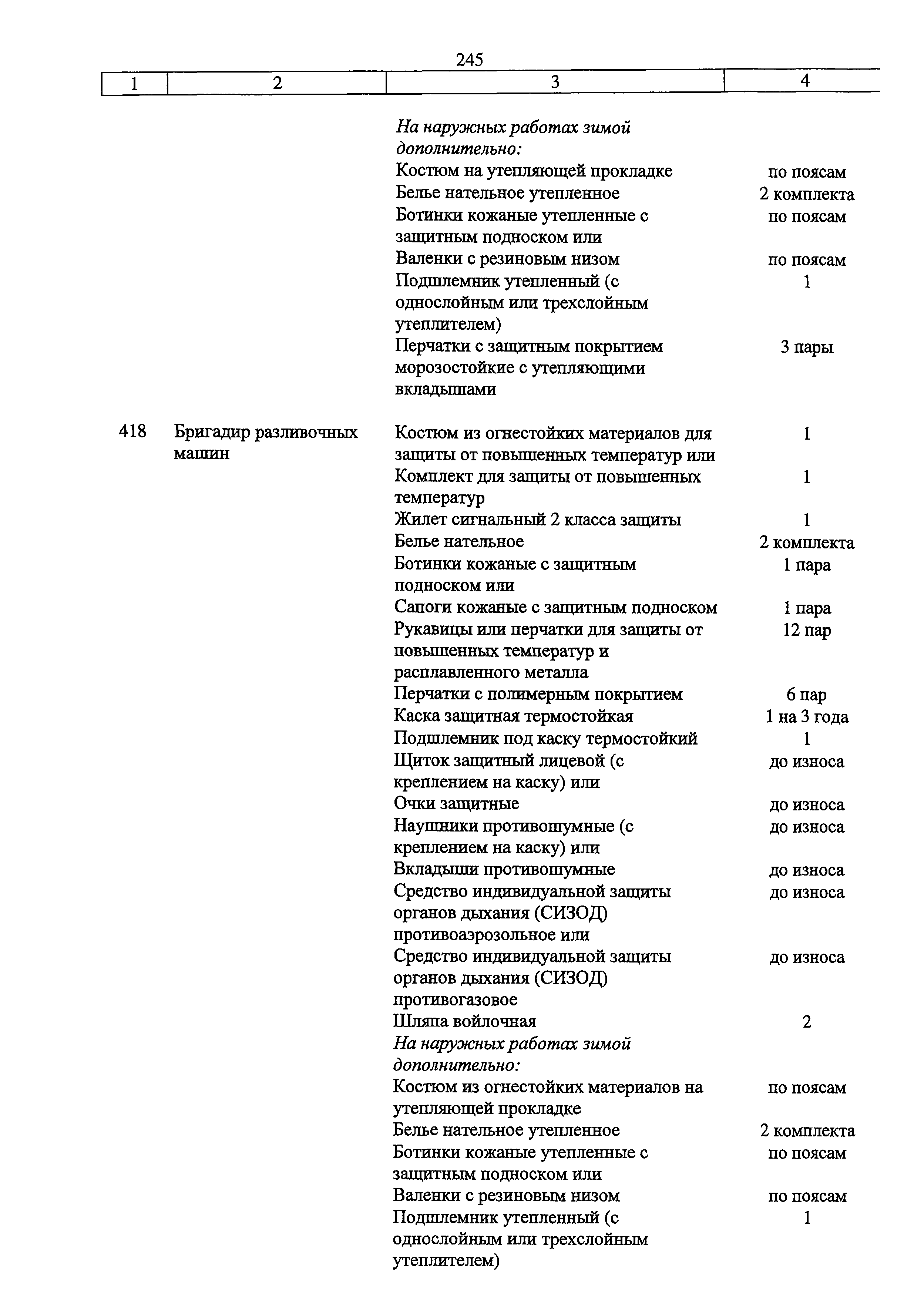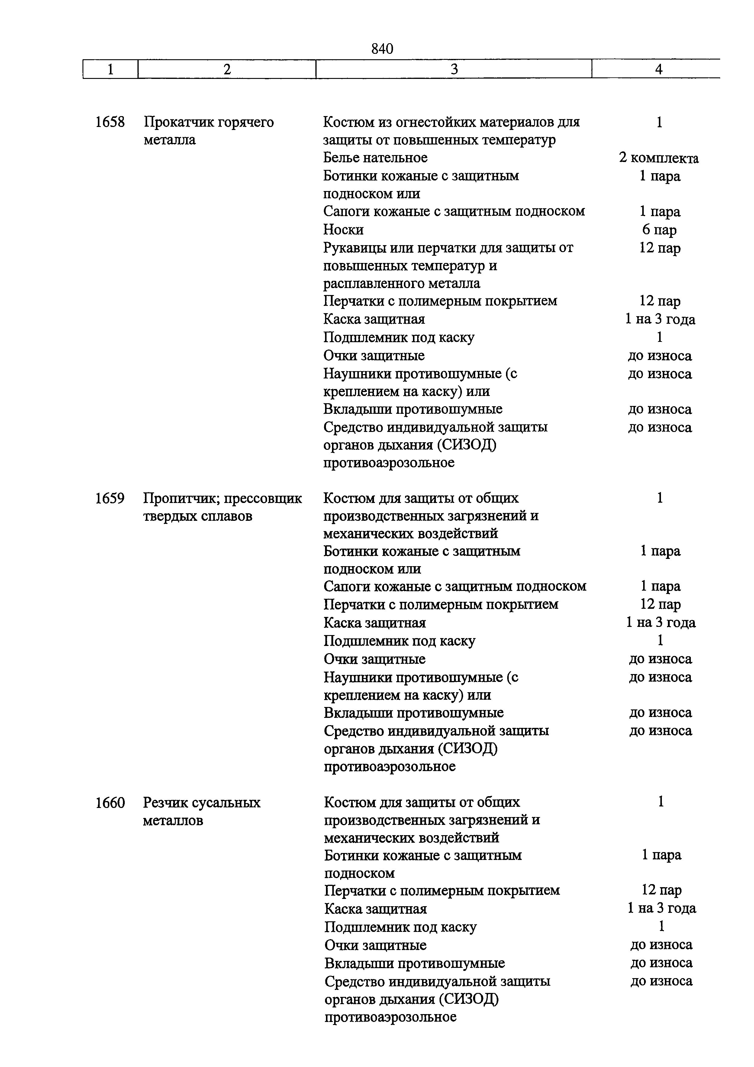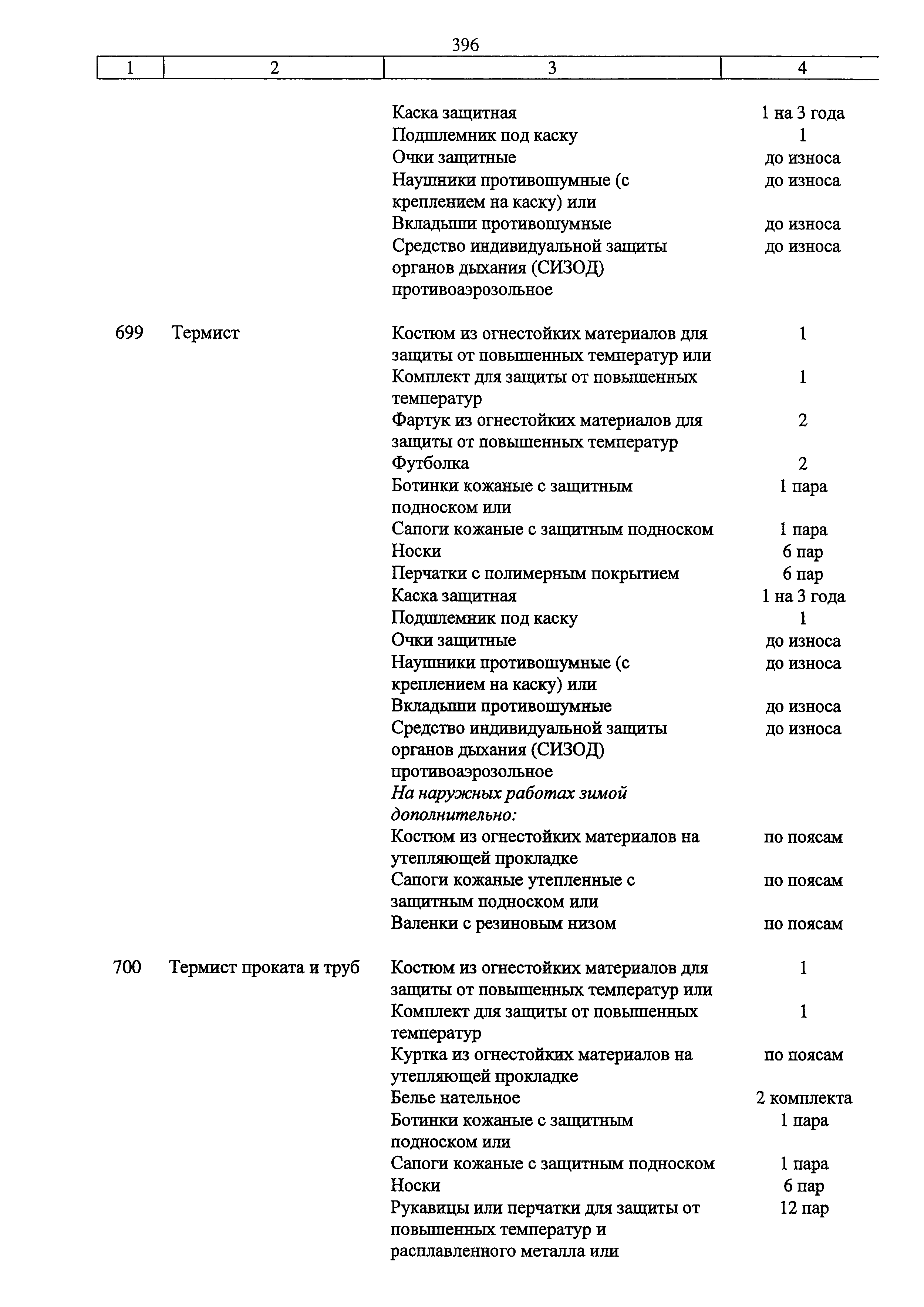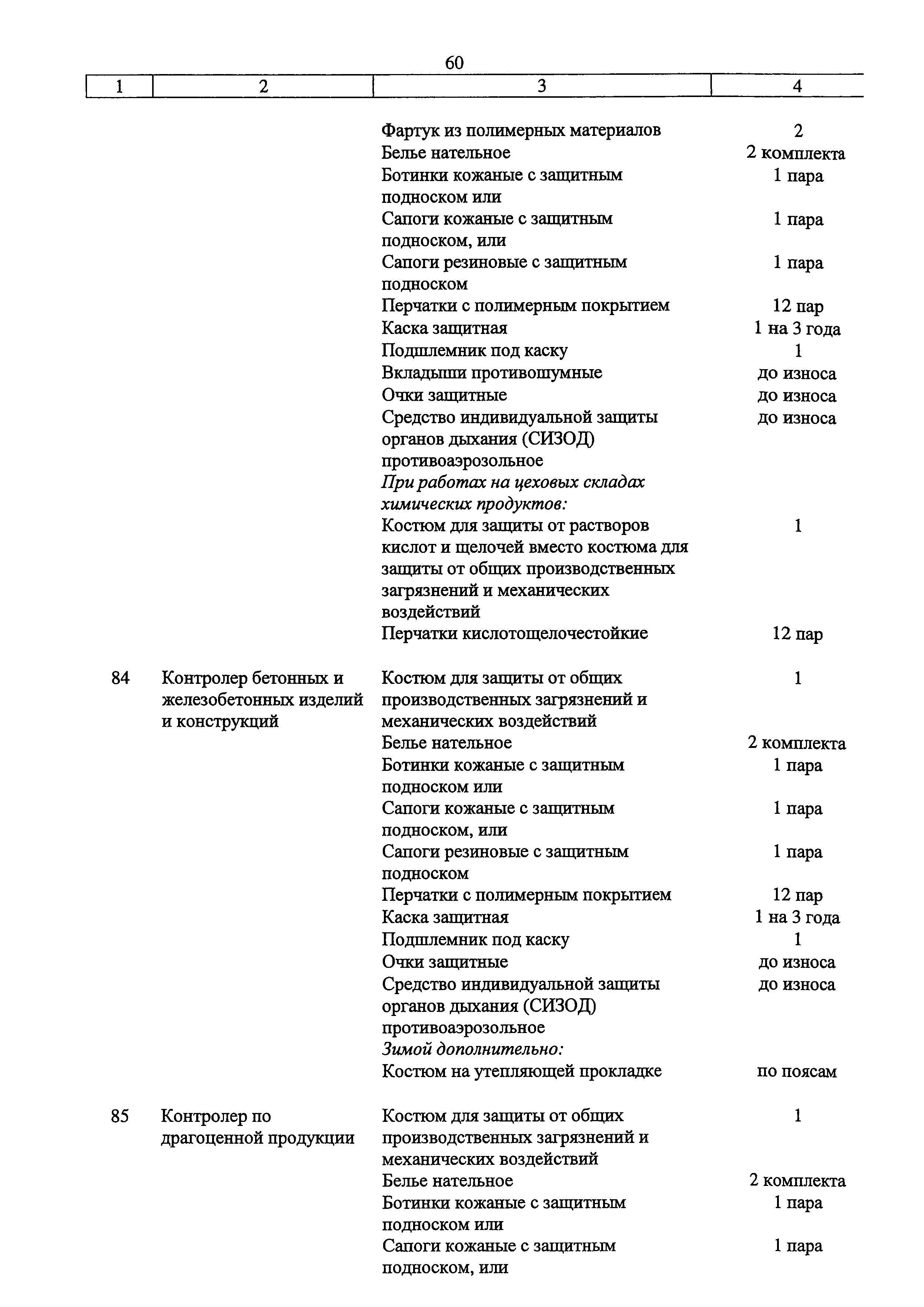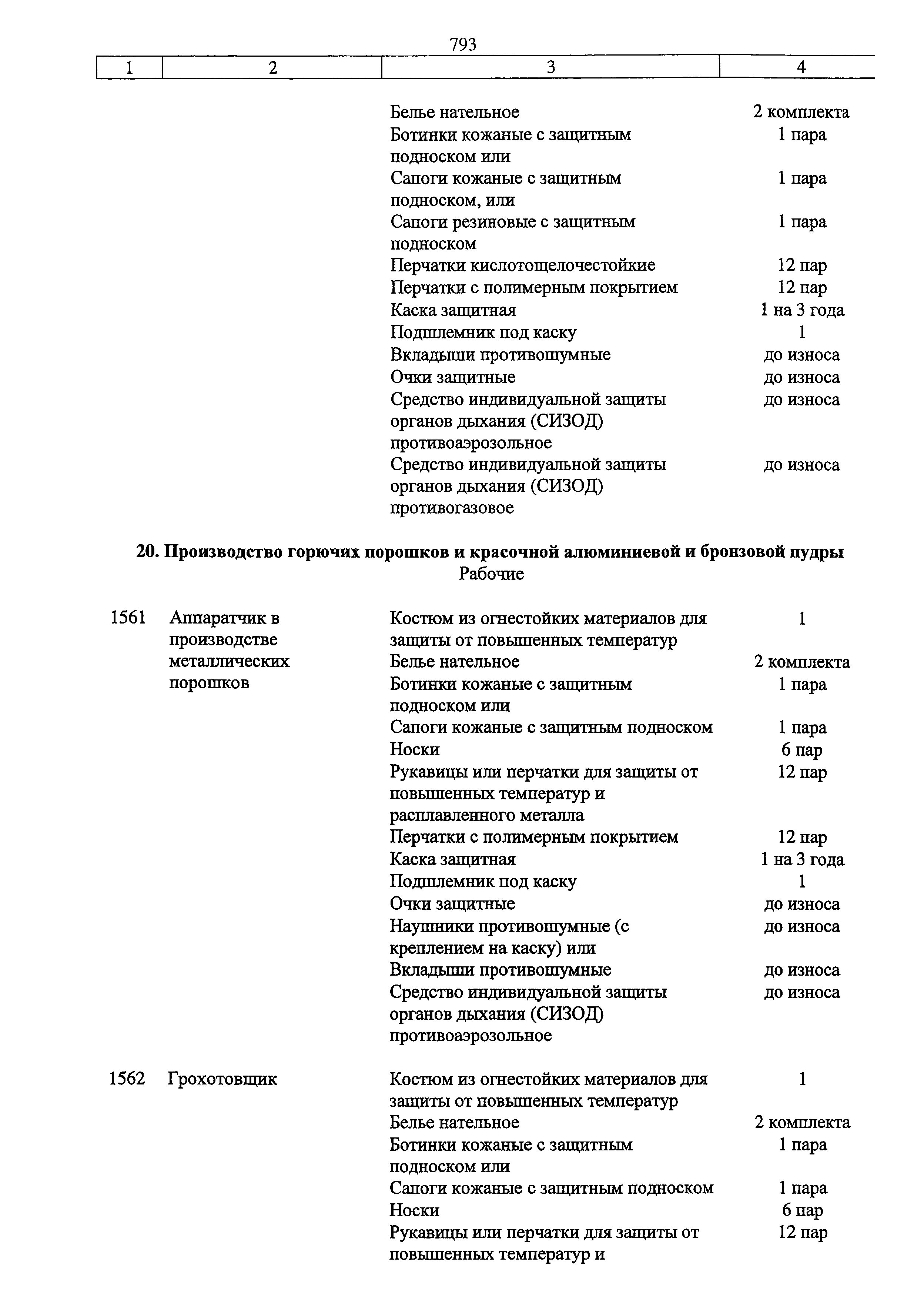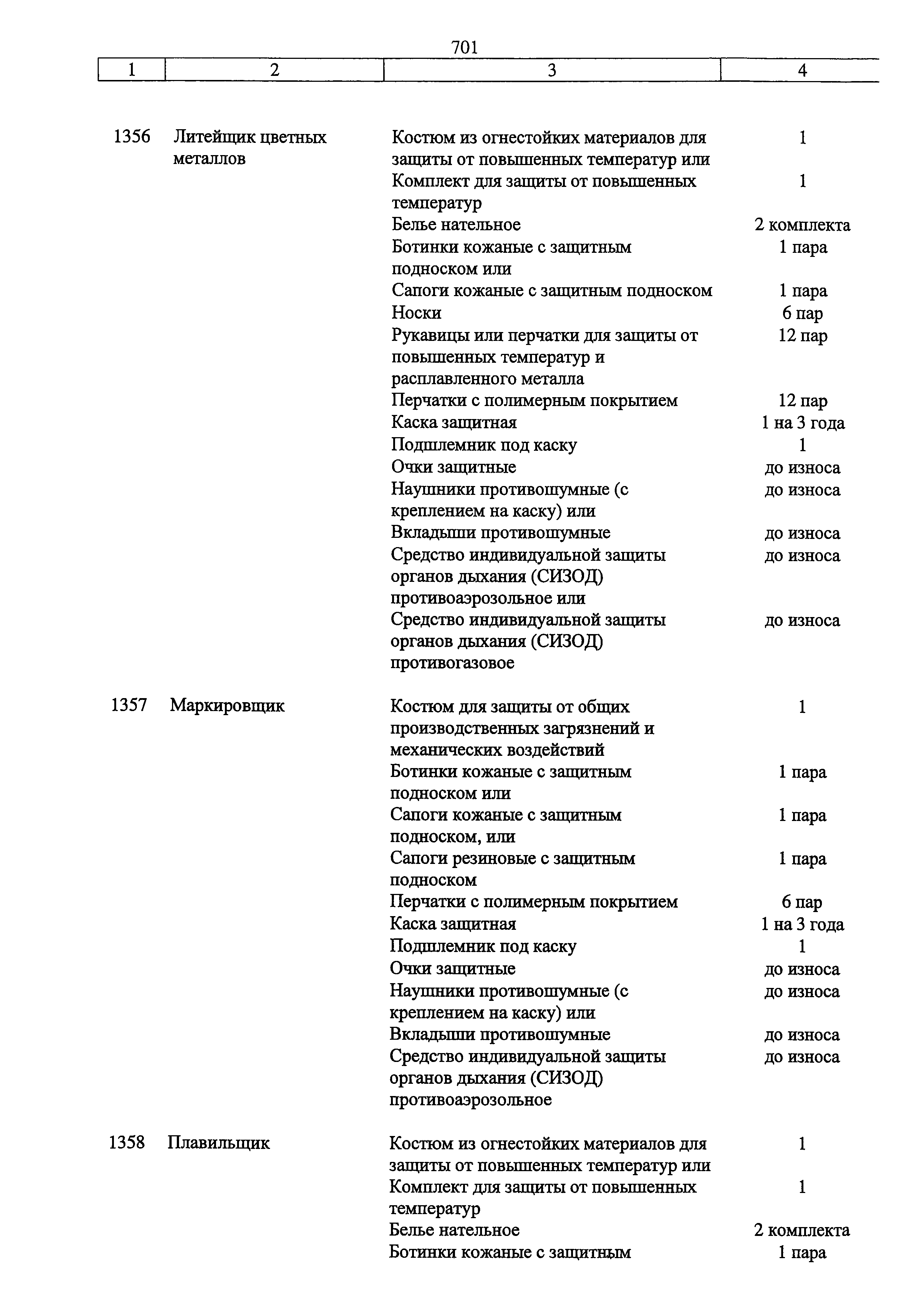 Типовые нормы бесплатной выдачи специальной одежды, специальной обуви и других средств индивидуальной защиты работникам горной и металлургической промышленности и металлургических производств других отраслей промышленности, занятым на работах с вредными и (или) опасными условиями труда, а также на работах, выполняемых в особых температурных условиях или связанных с загрязнением| Статус: | действует | | Название рус.: | Типовые нормы бесплатной выдачи специальной одежды, специальной обуви и других средств индивидуальной защиты работникам горной и металлургической промышленности и металлургических производств других отраслей промышленности, занятым на работах с вредными и (или) опасными условиями труда, а также на работах, выполняемых в особых температурных условиях или связанных с загрязнением | | Дата добавления в базу: | 01.02.2017 | | Дата актуализации: | 01.01.2021 | | Дата введения: | 14.02.2014 | | Область применения: | Нормы утверждаются локальными нормативными актами работодателя на основании результатов аттестации рабочих мест по условиям труда и могут быть включены в коллективный и (или) трудовой договор с указанием типовых норм, по сравнению с которыми улучшается обеспечение работников специальной одеждой, специальной обувью и другими средствами индивидуальной защиты. | | Оглавление: | I Горнодобывающая промышленность 1 Подземные горные работы (шахты) 2 Открытые горные работы и шахтная поверхность 3 Работа на гидравлических установках или с промывочными приборами 4 Дражные работы II Дробление, обогащение, брикетирование, обжиг, агломерация, извлечение металлов и сплавов III Черная металлургия 1 Коксохимическое производство 1.1 Углеподготовительные цеха 1.2 Углеобогатительные цеха 1.3 Производство каменноугольного кокса 1.4 Производство кристаллического нафталина, кумароновой смолы, смолоперерабатывающие цеха 1.5 Производство пиридиновых и фенольно-крезольных продуктов 1.6 Цеха улавливания химических продуктов и газовые цеха 1.7 Цеха ректификации сырого бензола 1.8 Цеха очистки коксового газа от сероводорода 1.9 Производство пекового кокса 1.10 Производство термоантрацита 2 Доменное производство 3 Сталеплавильное производство 3.1 Установки непрерывной разливки стали 4 Производство ферросплавов 4.1 Электролитическое производство 4.2 Производство электролитического хрома 4.3 Производство феррованадия 4.4 Подготовка шихты, обжиг руд и концентратов 4.5 Разливка и разделка ферросплавов 4.6 Обжиг извести 4.7 Общие профессии и должности ферросплавного производства 5 Прокатное производство 6 Производство труб (прокатка, сварка и волочение) 7 Колесопрокатное и бандажное производства 8 Валопрокатное производство 9 Производство рельсовых скреплений 10 Производство баллонов 11 Труболитейное производство 12 Производство метизов 12.1 Производство металлических канатов, сеток, пружин и пружинной ленты, щеток, цепей, колючей проволоки и других метизов 12.2 Волочение проволоки, калибровка и шлифовка металла 12.3 Изготовление волок 12.4 Холодноштамповочные и кузнечно-прессовые работы 12.5 Термическая обработка 12.6 Травление металла, защитные покрытия проволоки и извлечение железного купороса 12.7 Производство металлических электродов и порошковой проволоки 13 Производство огнеупоров 13.1 Огнеупоры 13.2 Карборундовые стержни 13.3 Высокоогнеупорные окислы 14 Ремонт 