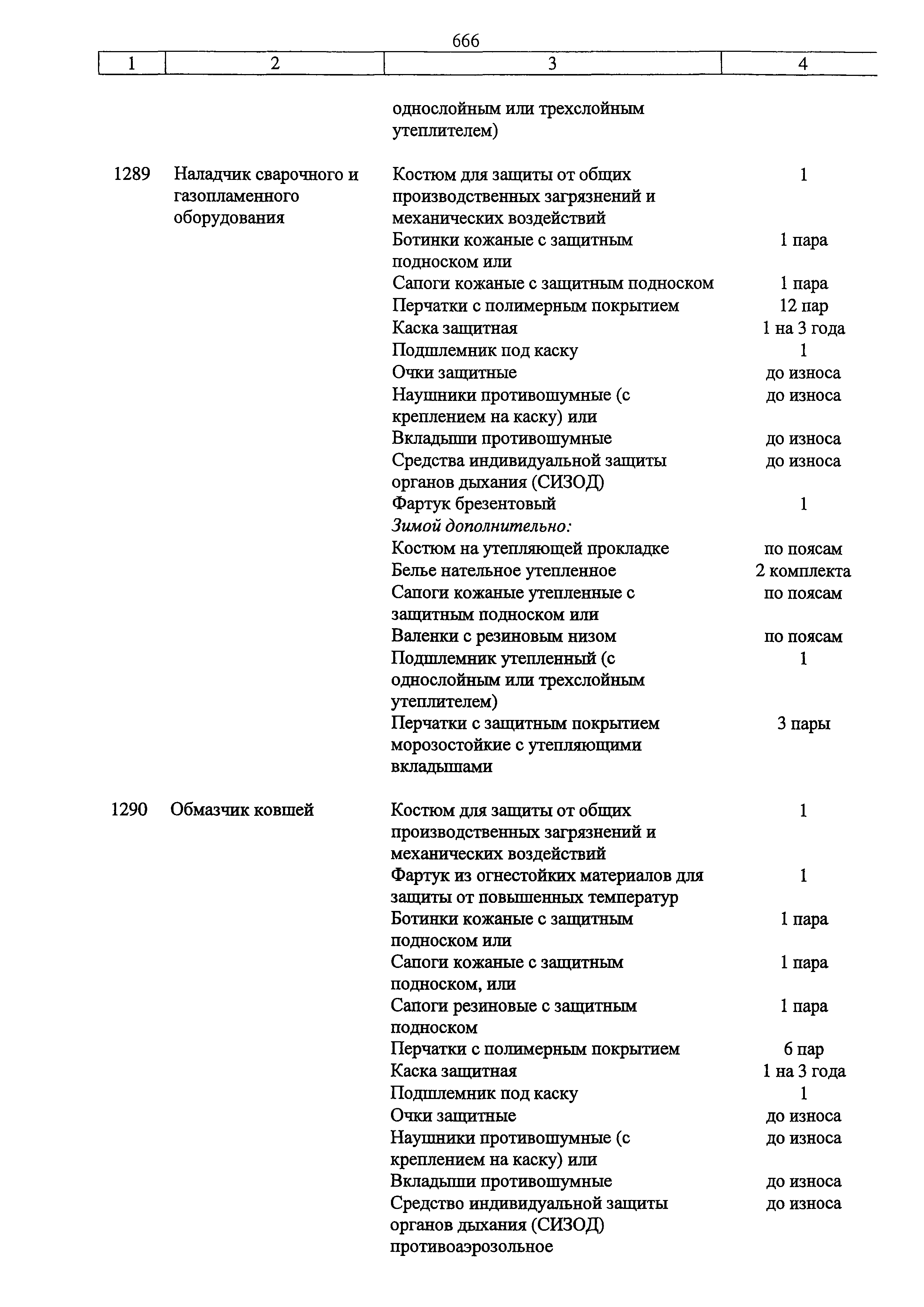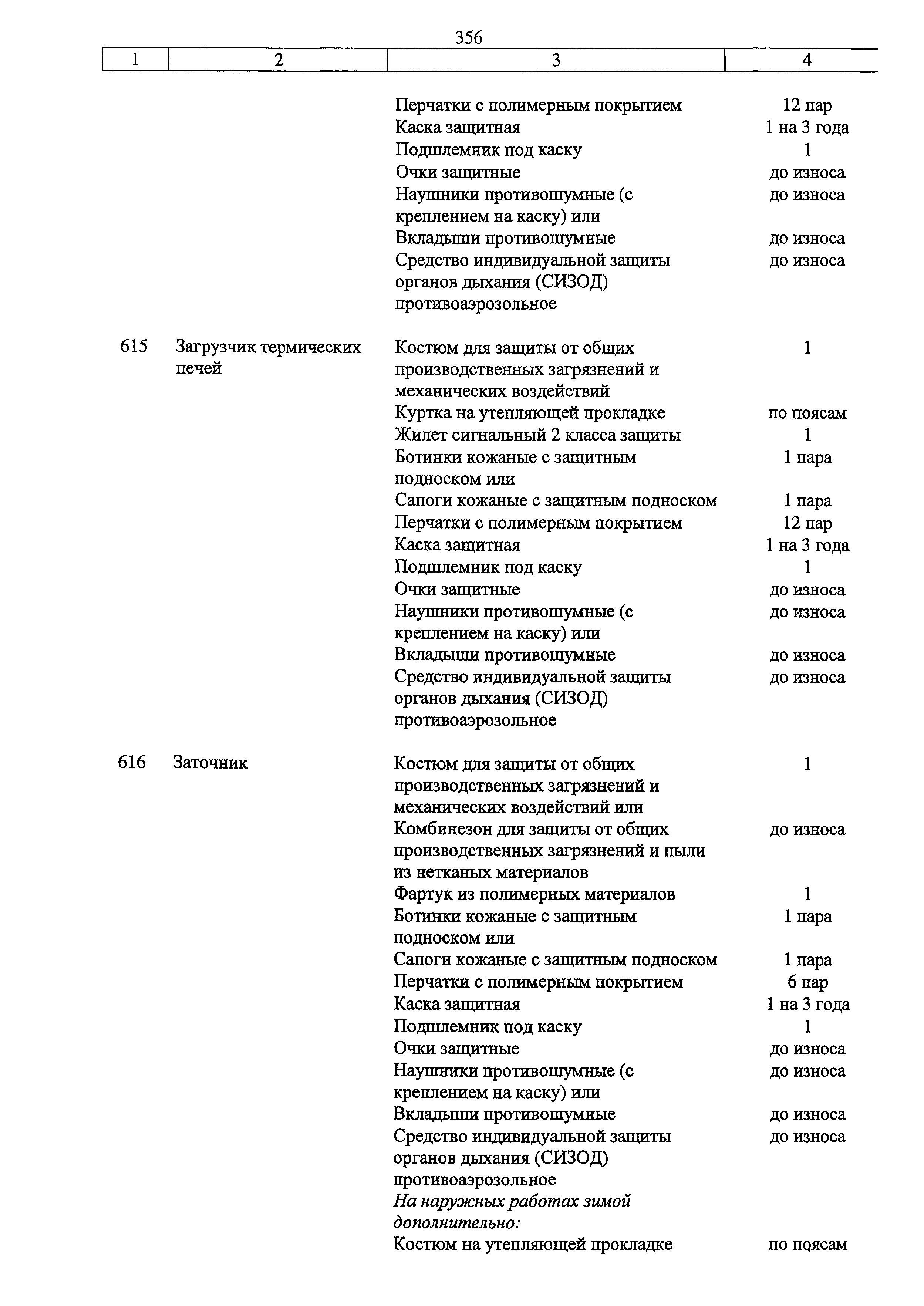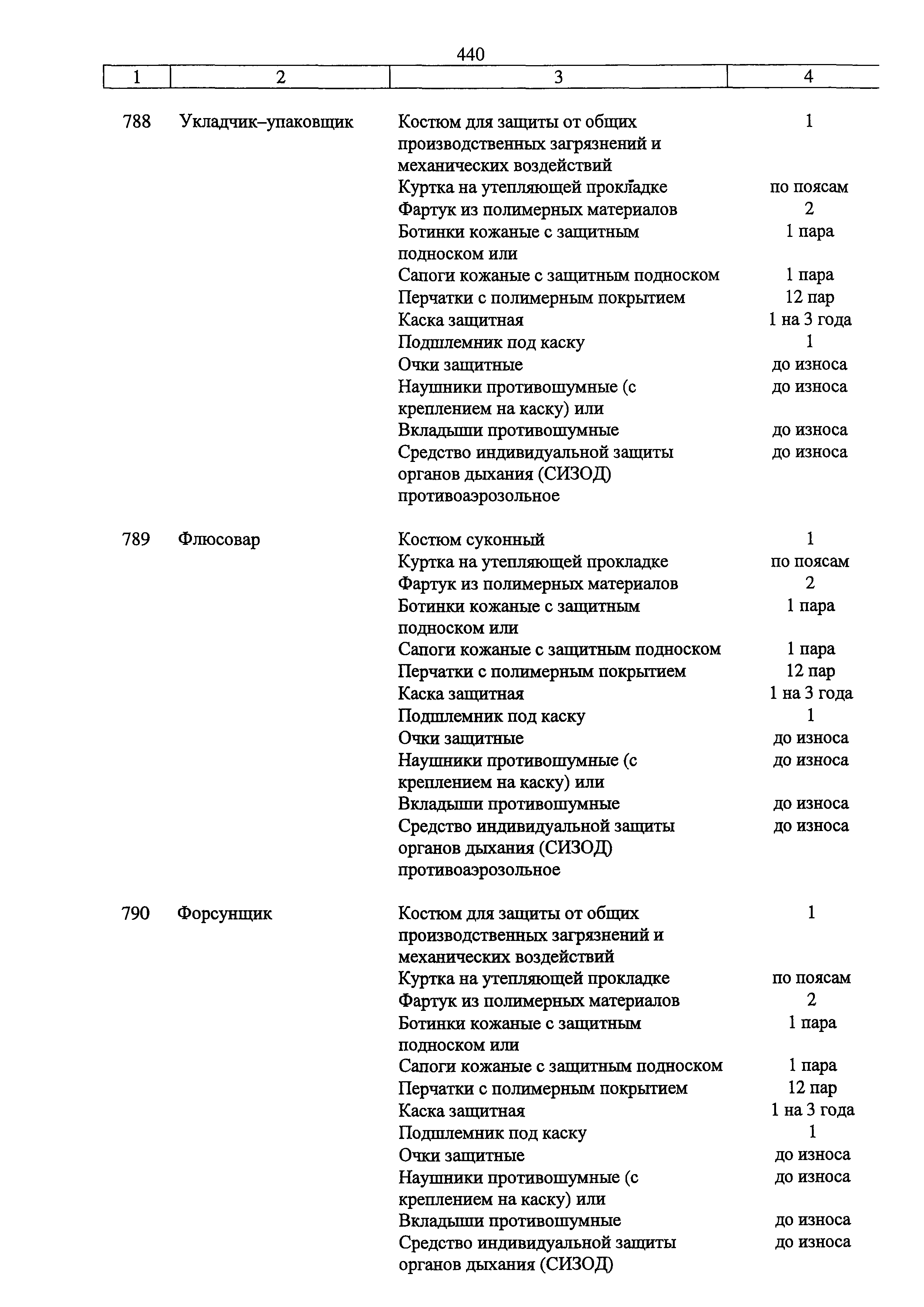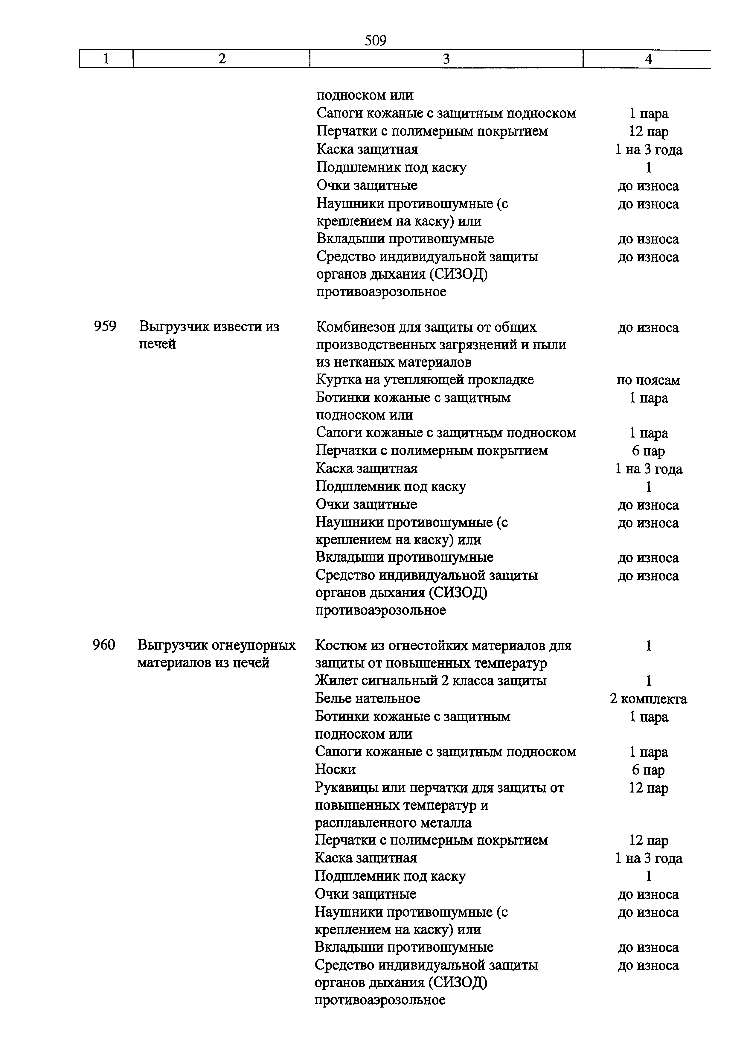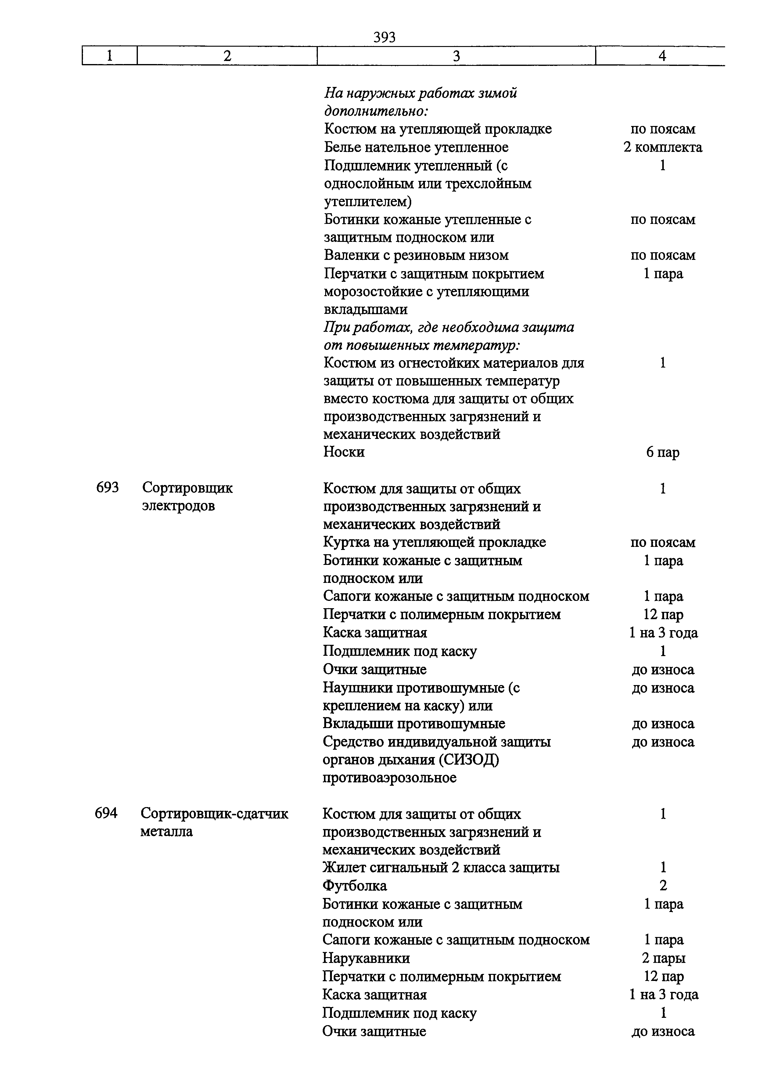 Типовые нормы бесплатной выдачи специальной одежды, специальной обуви и других средств индивидуальной защиты работникам горной и металлургической промышленности и металлургических производств других отраслей промышленности, занятым на работах с вредными и (или) опасными условиями труда, а также на работах, выполняемых в особых температурных условиях или связанных с загрязнением| Статус: | действует | | Название рус.: | Типовые нормы бесплатной выдачи специальной одежды, специальной обуви и других средств индивидуальной защиты работникам горной и металлургической промышленности и металлургических производств других отраслей промышленности, занятым на работах с вредными и (или) опасными условиями труда, а также на работах, выполняемых в особых температурных условиях или связанных с загрязнением | | Дата добавления в базу: | 01.02.2017 | | Дата актуализации: | 01.01.2021 | | Дата введения: | 14.02.2014 | | Область применения: | Нормы утверждаются локальными нормативными актами работодателя на основании результатов аттестации рабочих мест по условиям труда и могут быть включены в коллективный и (или) трудовой договор с указанием типовых норм, по сравнению с которыми улучшается обеспечение работников специальной одеждой, специальной обувью и другими средствами индивидуальной защиты. | | Оглавление: | I Горнодобывающая промышленность 1 Подземные горные работы (шахты) 2 Открытые горные работы и шахтная поверхность 3 Работа на гидравлических установках или с промывочными приборами 4 Дражные работы II Дробление, обогащение, брикетирование, обжиг, агломерация, извлечение металлов и сплавов III Черная металлургия 1 Коксохимическое производство 1.1 Углеподготовительные цеха 1.2 Углеобогатительные цеха 1.3 Производство каменноугольного кокса 1.4 Производство кристаллического нафталина, кумароновой смолы, смолоперерабатывающие цеха 1.5 Производство пиридиновых и фенольно-крезольных продуктов 1.6 Цеха улавливания химических продуктов и газовые цеха 1.7 Цеха ректификации сырого бензола 1.8 Цеха очистки коксового газа от сероводорода 1.9 Производство пекового кокса 1.10 Производство термоантрацита 2 Доменное производство 3 Сталеплавильное производство 3.1 Установки непрерывной разливки стали 4 Производство ферросплавов 4.1 Электролитическое производство 4.2 Производство электролитического хрома 4.3 Производство феррованадия 4.4 Подготовка шихты, обжиг руд и концентратов 4.5 Разливка и разделка ферросплавов 4.6 Обжиг извести 4.7 Общие профессии и должности ферросплавного производства 5 Прокатное производство 6 Производство труб (прокатка, сварка и волочение) 7 Колесопрокатное и бандажное производства 8 Валопрокатное производство 9 Производство рельсовых скреплений 10 Производство баллонов 11 Труболитейное производство 12 Производство метизов 12.1 Производство металлических канатов, сеток, пружин и пружинной ленты, щеток, цепей, колючей проволоки и других метизов 12.2 Волочение проволоки, калибровка и шлифовка металла 12.3 Изготовление волок 12.4 Холодноштамповочные и кузнечно-прессовые работы 12.5 Термическая обработка 12.6 Травление металла, защитные покрытия проволоки и извлечение железного купороса 12.7 Производство металлических электродов и порошковой проволоки 13 Производство огнеупоров 13.1 Огнеупоры 13.2 Карборундовые стержни 13.3 Высокоогнеупорные окислы 14 Ремонт 
