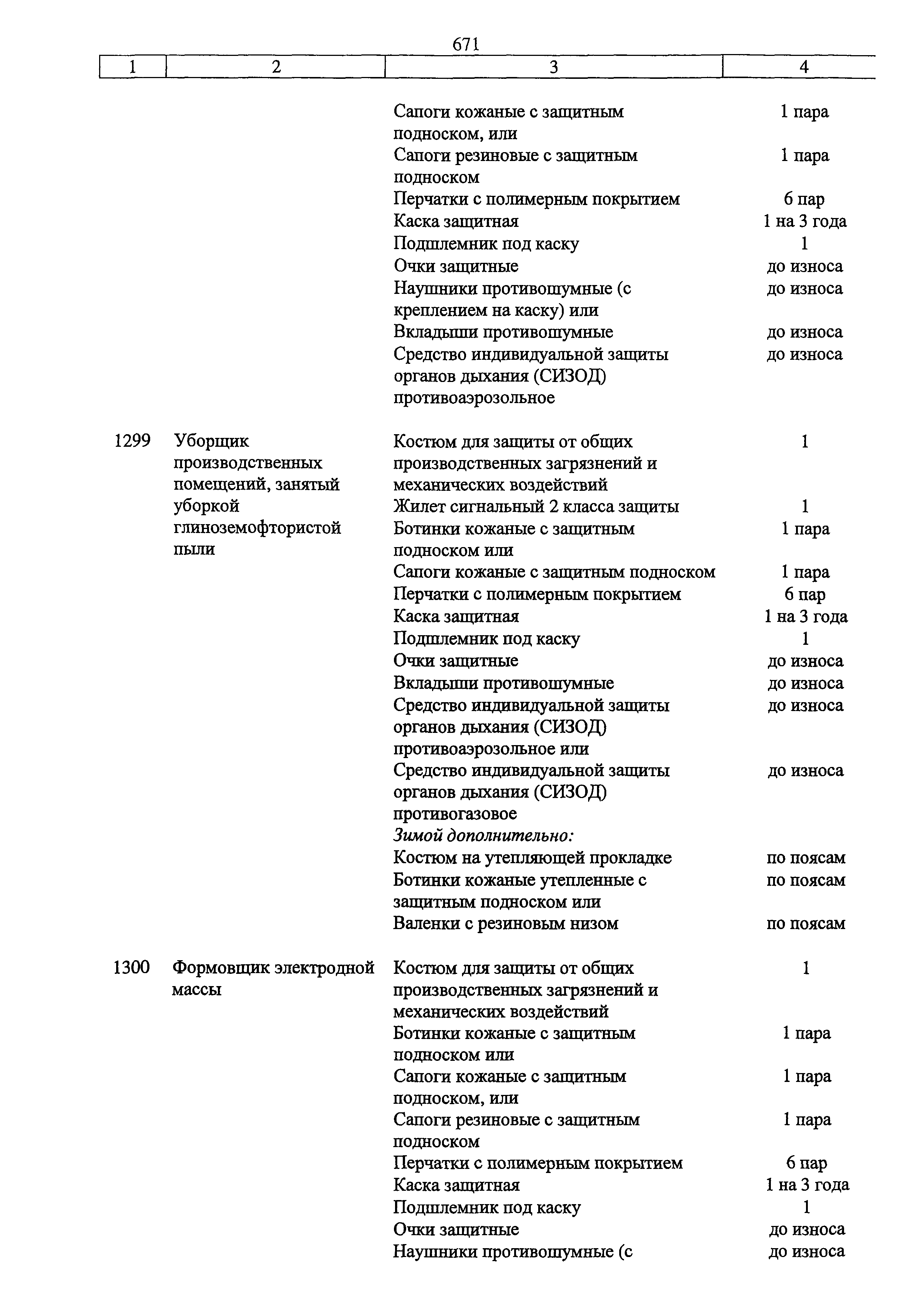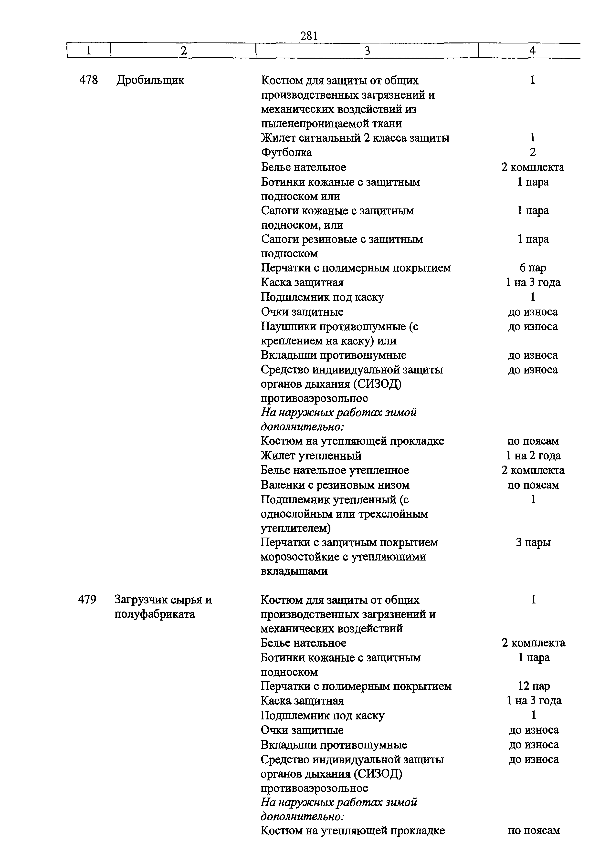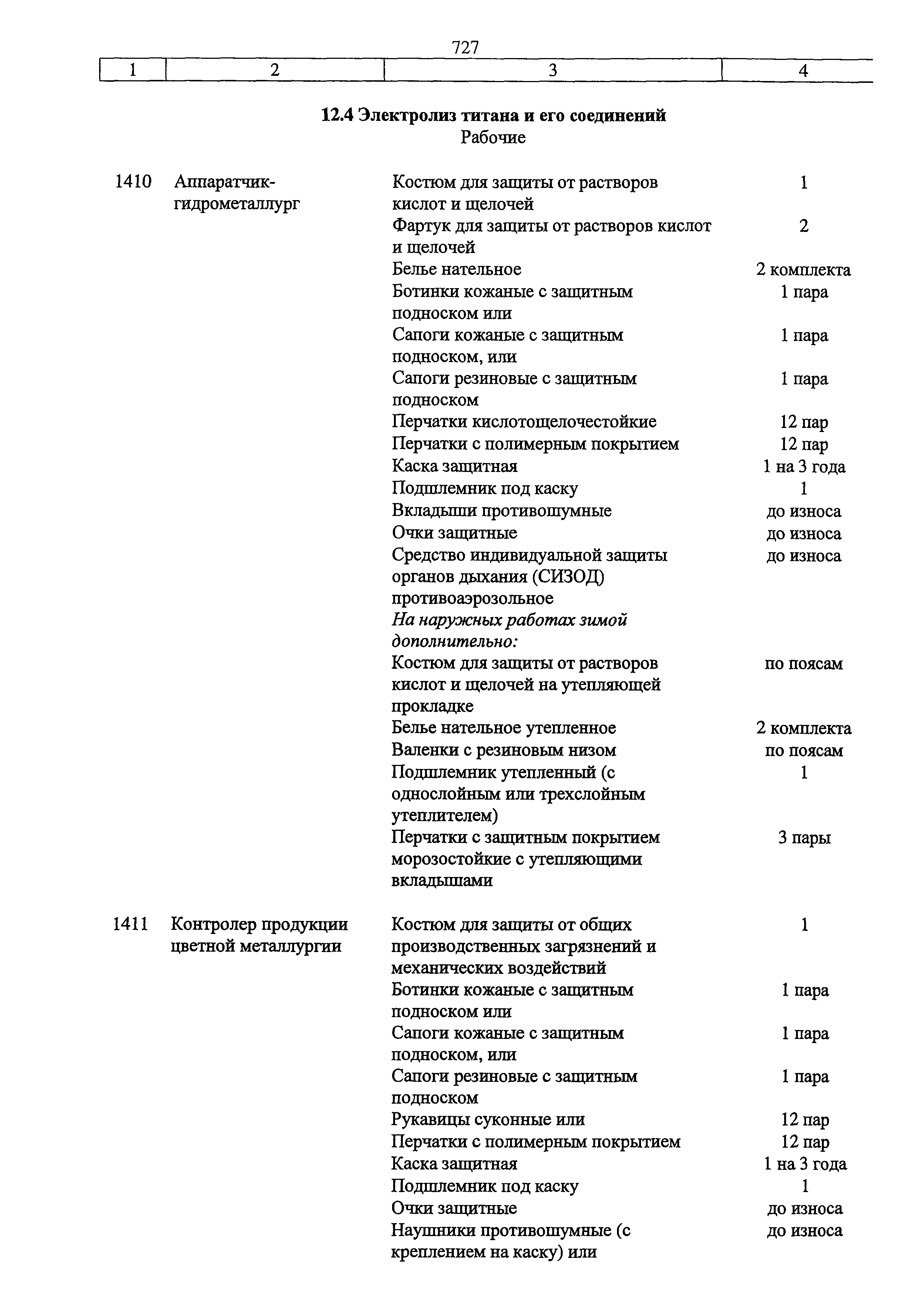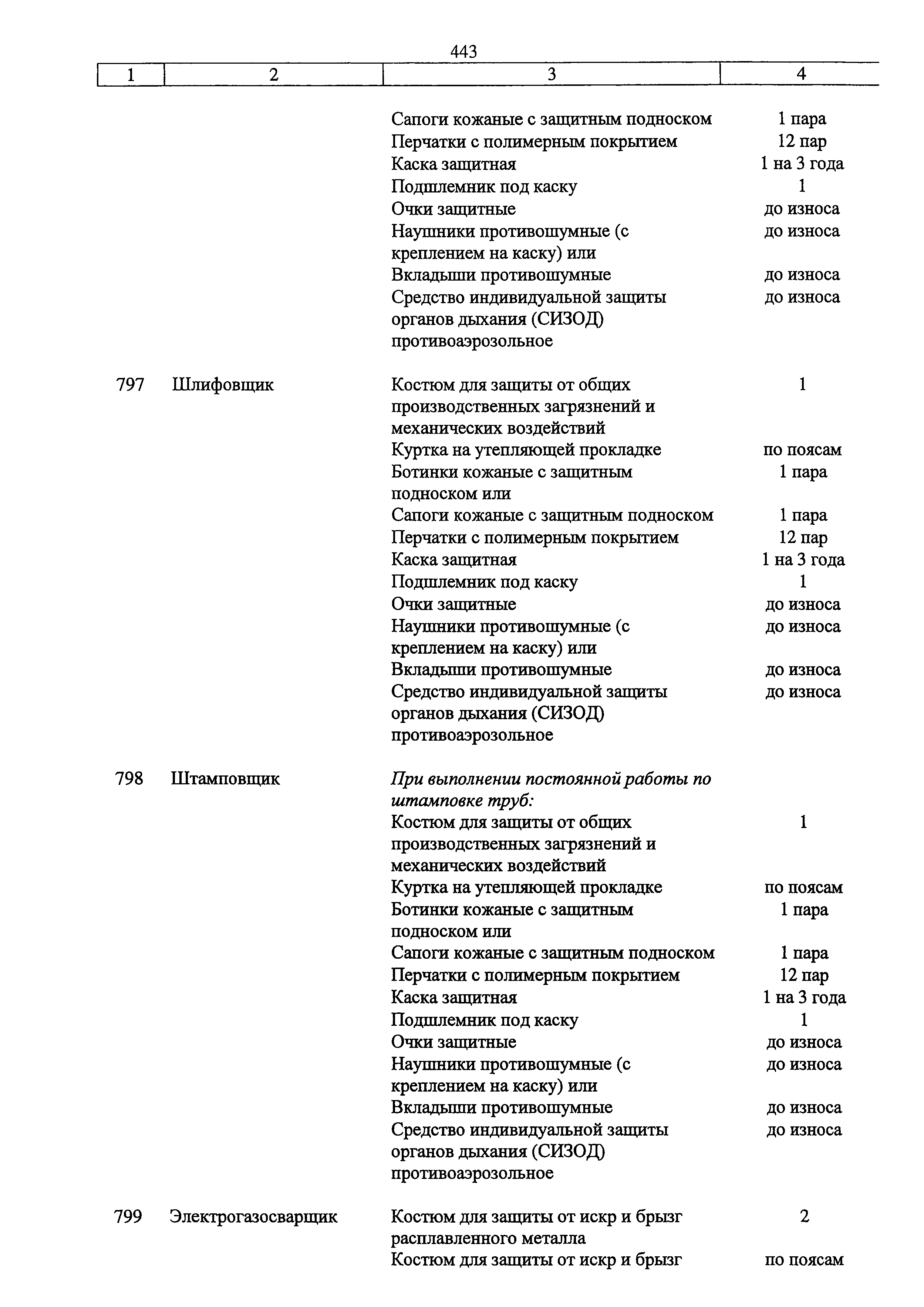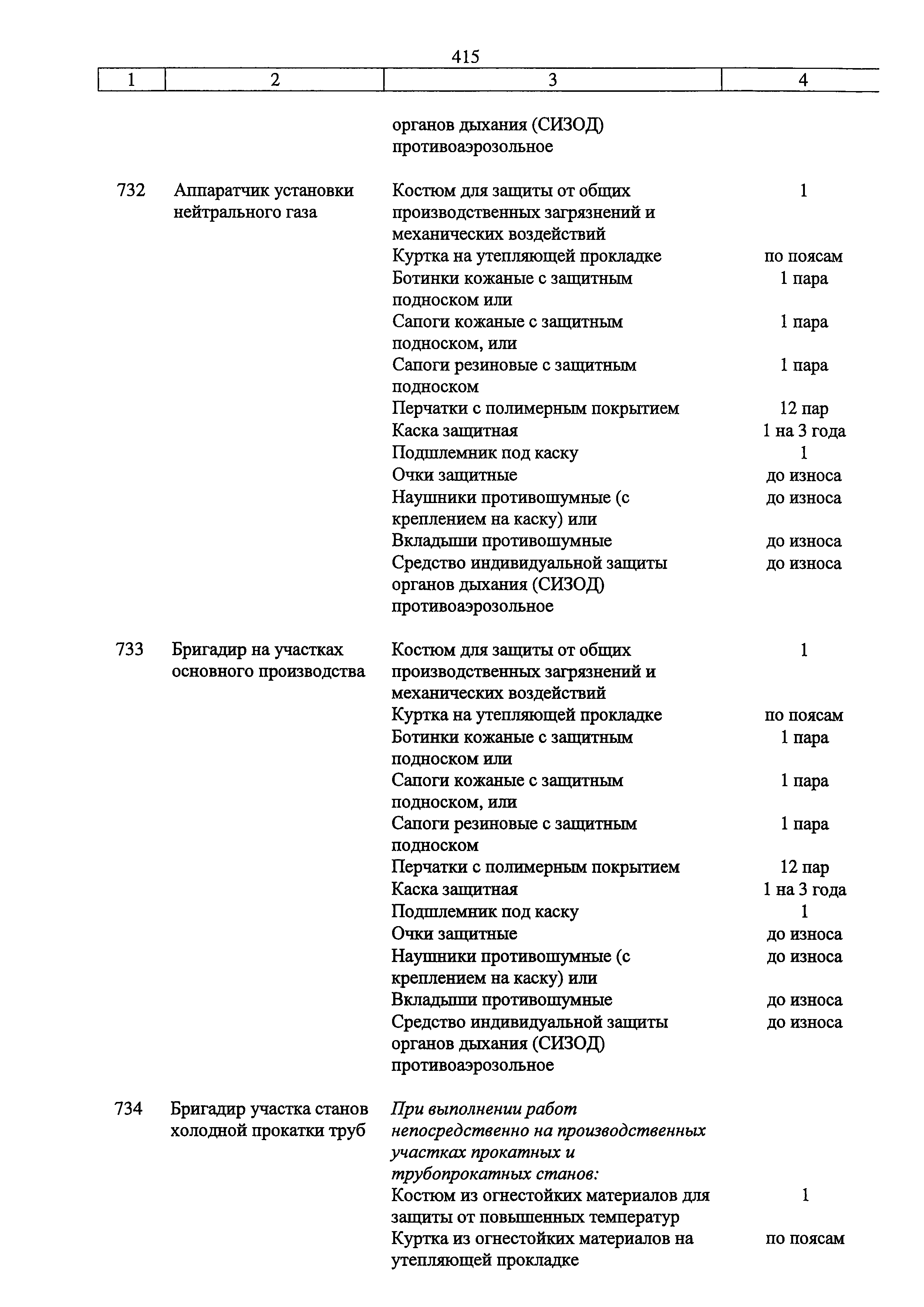 Типовые нормы бесплатной выдачи специальной одежды, специальной обуви и других средств индивидуальной защиты работникам горной и металлургической промышленности и металлургических производств других отраслей промышленности, занятым на работах с вредными и (или) опасными условиями труда, а также на работах, выполняемых в особых температурных условиях или связанных с загрязнением| Статус: | действует | | Название рус.: | Типовые нормы бесплатной выдачи специальной одежды, специальной обуви и других средств индивидуальной защиты работникам горной и металлургической промышленности и металлургических производств других отраслей промышленности, занятым на работах с вредными и (или) опасными условиями труда, а также на работах, выполняемых в особых температурных условиях или связанных с загрязнением | | Дата добавления в базу: | 01.02.2017 | | Дата актуализации: | 01.01.2021 | | Дата введения: | 14.02.2014 | | Область применения: | Нормы утверждаются локальными нормативными актами работодателя на основании результатов аттестации рабочих мест по условиям труда и могут быть включены в коллективный и (или) трудовой договор с указанием типовых норм, по сравнению с которыми улучшается обеспечение работников специальной одеждой, специальной обувью и другими средствами индивидуальной защиты. | | Оглавление: | I Горнодобывающая промышленность 1 Подземные горные работы (шахты) 2 Открытые горные работы и шахтная поверхность 3 Работа на гидравлических установках или с промывочными приборами 4 Дражные работы II Дробление, обогащение, брикетирование, обжиг, агломерация, извлечение металлов и сплавов III Черная металлургия 1 Коксохимическое производство 1.1 Углеподготовительные цеха 1.2 Углеобогатительные цеха 1.3 Производство каменноугольного кокса 1.4 Производство кристаллического нафталина, кумароновой смолы, смолоперерабатывающие цеха 1.5 Производство пиридиновых и фенольно-крезольных продуктов 1.6 Цеха улавливания химических продуктов и газовые цеха 1.7 Цеха ректификации сырого бензола 1.8 Цеха очистки коксового газа от сероводорода 1.9 Производство пекового кокса 1.10 Производство термоантрацита 2 Доменное производство 3 Сталеплавильное производство 3.1 Установки непрерывной разливки стали 4 Производство ферросплавов 4.1 Электролитическое производство 4.2 Производство электролитического хрома 4.3 Производство феррованадия 4.4 Подготовка шихты, обжиг руд и концентратов 4.5 Разливка и разделка ферросплавов 4.6 Обжиг извести 4.7 Общие профессии и должности ферросплавного производства 5 Прокатное производство 6 Производство труб (прокатка, сварка и волочение) 7 Колесопрокатное и бандажное производства 8 Валопрокатное производство 9 Производство рельсовых скреплений 10 Производство баллонов 11 Труболитейное производство 12 Производство метизов 12.1 Производство металлических канатов, сеток, пружин и пружинной ленты, щеток, цепей, колючей проволоки и других метизов 12.2 Волочение проволоки, калибровка и шлифовка металла 12.3 Изготовление волок 12.4 Холодноштамповочные и кузнечно-прессовые работы 12.5 Термическая обработка 12.6 Травление металла, защитные покрытия проволоки и извлечение железного купороса 12.7 Производство металлических электродов и порошковой проволоки 13 Производство огнеупоров 13.1 Огнеупоры 13.2 Карборундовые стержни 13.3 Высокоогнеупорные окислы 14 Ремонт 