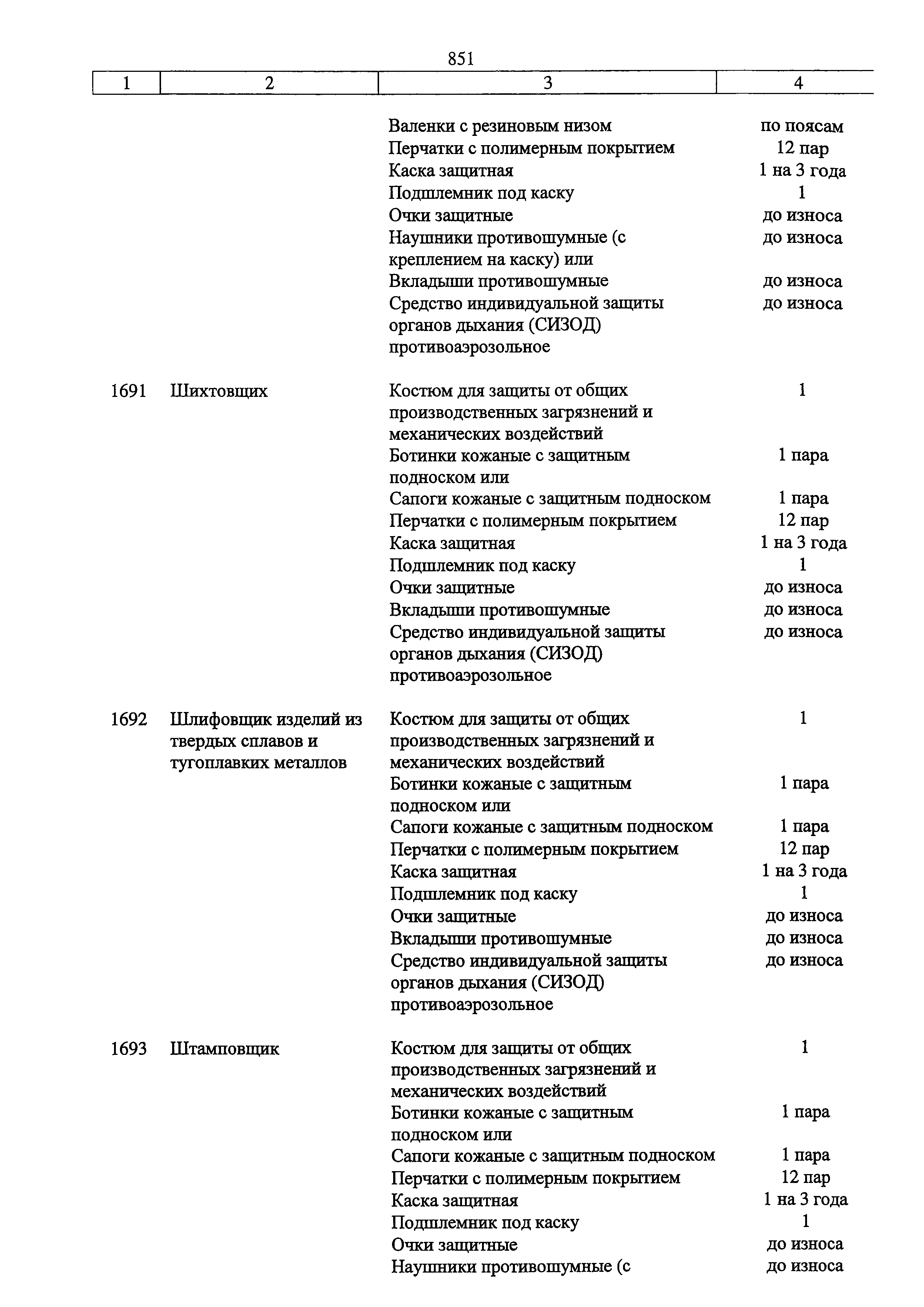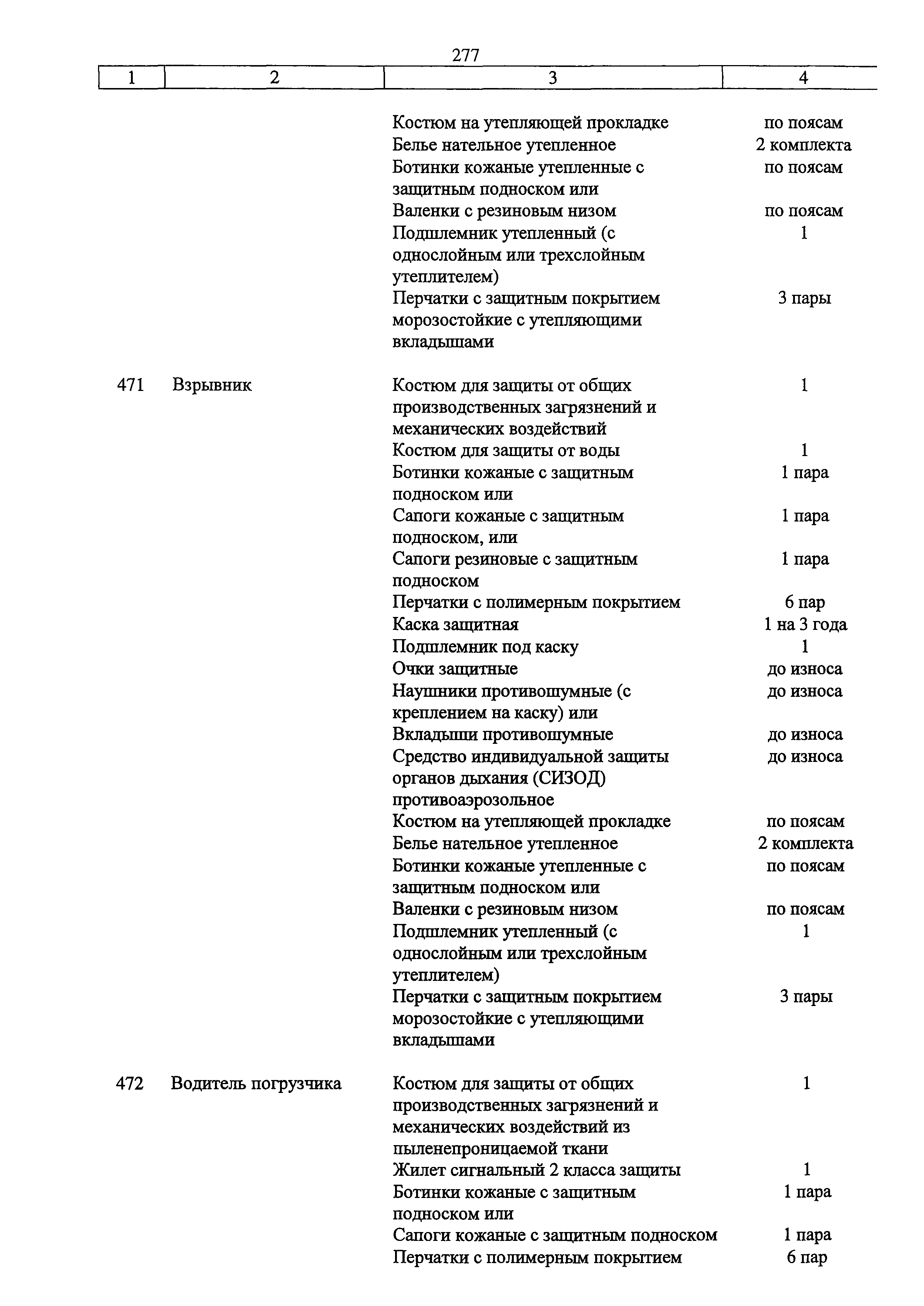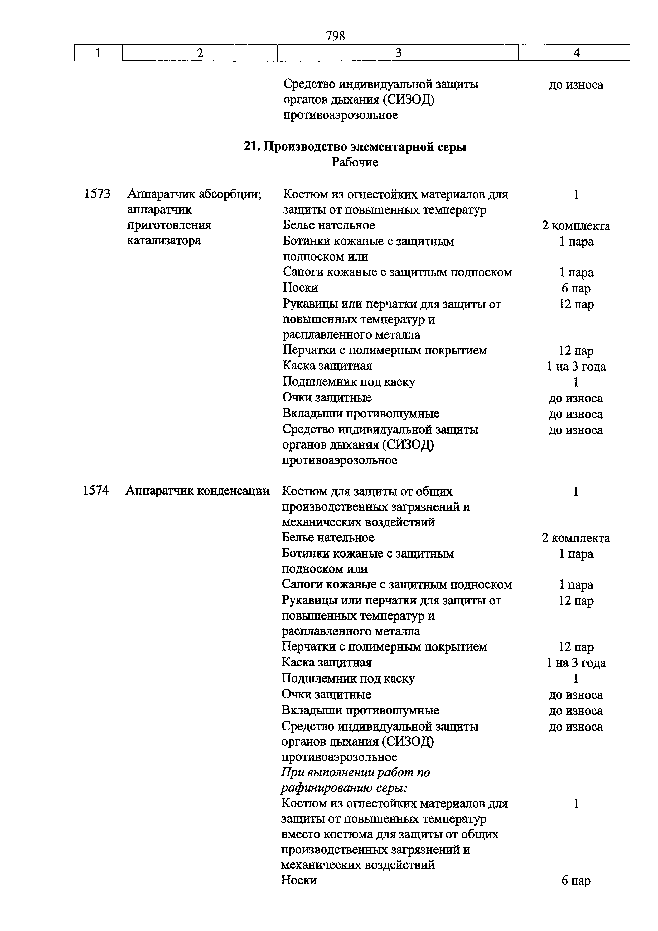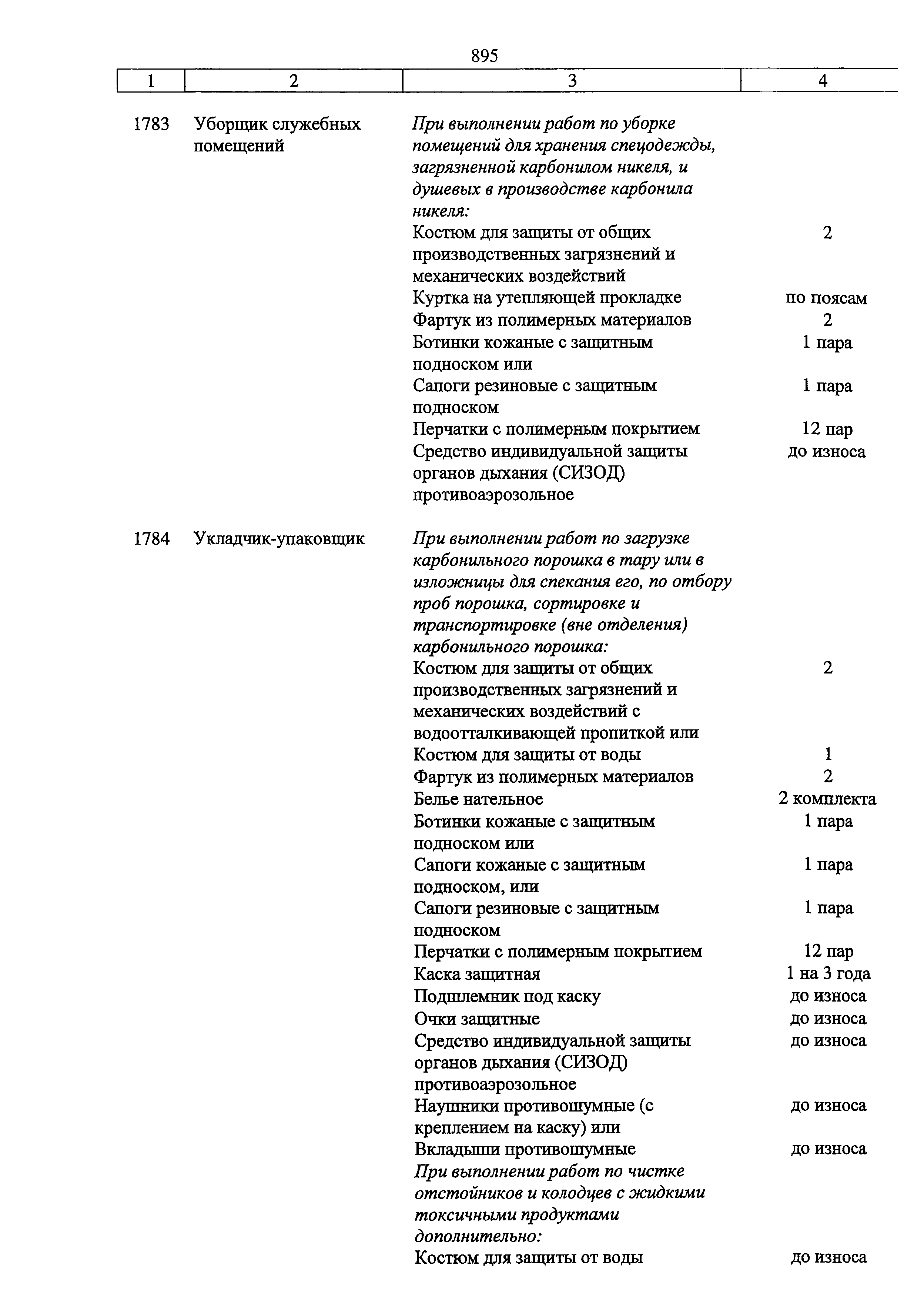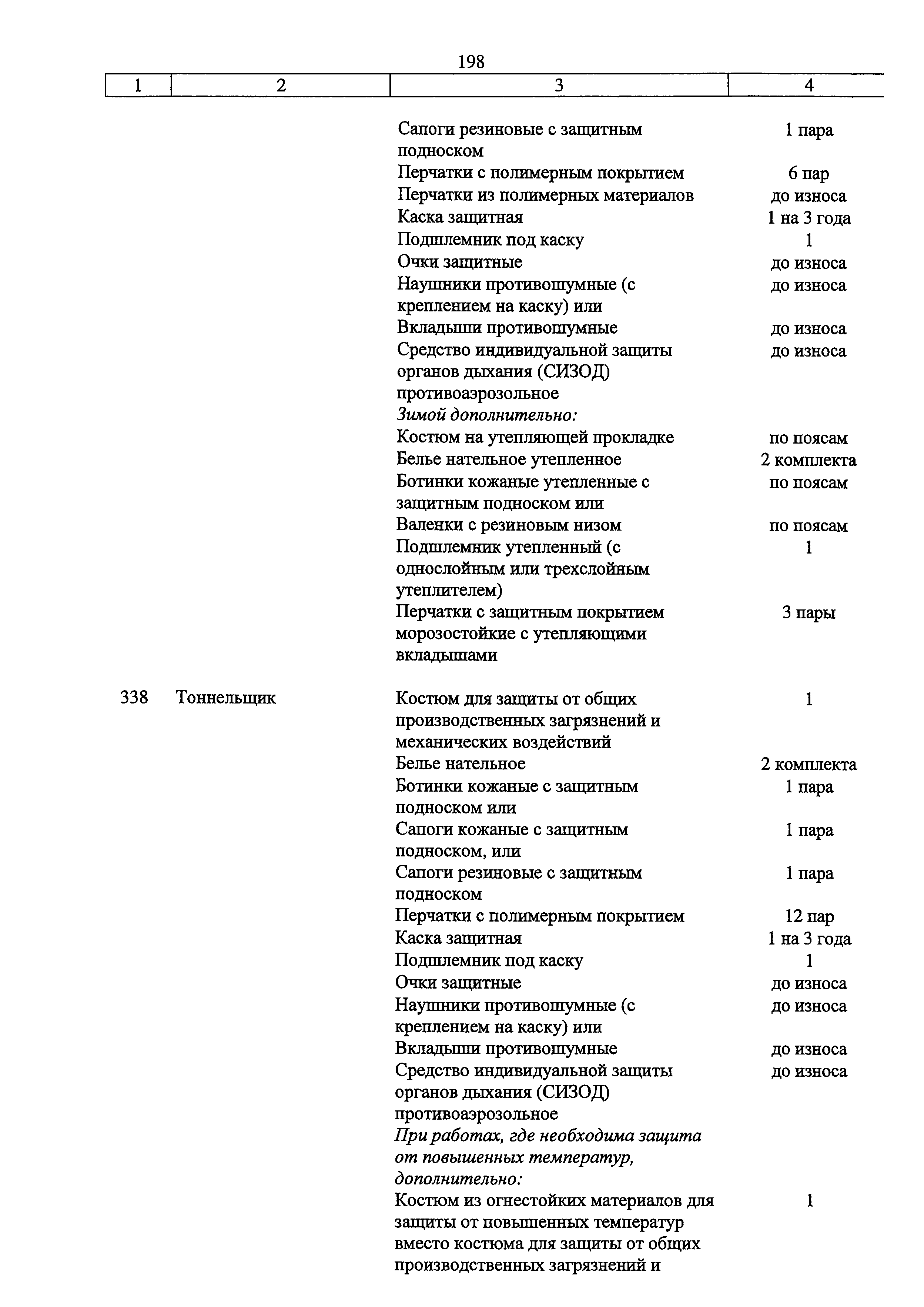Типовые нормы бесплатной выдачи специальной одежды, специальной обуви и других средств индивидуальной защиты работникам горной и металлургической промышленности и металлургических производств других отраслей промышленности, занятым на работах с вредными и (или) опасными условиями труда, а также на работах, выполняемых в особых температурных условиях или связанных с загрязнением| Статус: | действует | | Название рус.: | Типовые нормы бесплатной выдачи специальной одежды, специальной обуви и других средств индивидуальной защиты работникам горной и металлургической промышленности и металлургических производств других отраслей промышленности, занятым на работах с вредными и (или) опасными условиями труда, а также на работах, выполняемых в особых температурных условиях или связанных с загрязнением | | Дата добавления в базу: | 01.02.2017 | | Дата актуализации: | 01.01.2021 | | Дата введения: | 14.02.2014 | | Область применения: | Нормы утверждаются локальными нормативными актами работодателя на основании результатов аттестации рабочих мест по условиям труда и могут быть включены в коллективный и (или) трудовой договор с указанием типовых норм, по сравнению с которыми улучшается обеспечение работников специальной одеждой, специальной обувью и другими средствами индивидуальной защиты. | | Оглавление: | I Горнодобывающая промышленность 1 Подземные горные работы (шахты) 2 Открытые горные работы и шахтная поверхность 3 Работа на гидравлических установках или с промывочными приборами 4 Дражные работы II Дробление, обогащение, брикетирование, обжиг, агломерация, извлечение металлов и сплавов III Черная металлургия 1 Коксохимическое производство 1.1 Углеподготовительные цеха 1.2 Углеобогатительные цеха 1.3 Производство каменноугольного кокса 1.4 Производство кристаллического нафталина, кумароновой смолы, смолоперерабатывающие цеха 1.5 Производство пиридиновых и фенольно-крезольных продуктов 1.6 Цеха улавливания химических продуктов и газовые цеха 1.7 Цеха ректификации сырого бензола 1.8 Цеха очистки коксового газа от сероводорода 1.9 Производство пекового кокса 1.10 Производство термоантрацита 2 Доменное производство 3 Сталеплавильное производство 3.1 Установки непрерывной разливки стали 4 Производство ферросплавов 4.1 Электролитическое производство 4.2 Производство электролитического хрома 4.3 Производство феррованадия 4.4 Подготовка шихты, обжиг руд и концентратов 4.5 Разливка и разделка ферросплавов 4.6 Обжиг извести 4.7 Общие профессии и должности ферросплавного производства 5 Прокатное производство 6 Производство труб (прокатка, сварка и волочение) 7 Колесопрокатное и бандажное производства 8 Валопрокатное производство 9 Производство рельсовых скреплений 10 Производство баллонов 11 Труболитейное производство 12 Производство метизов 12.1 Производство металлических канатов, сеток, пружин и пружинной ленты, щеток, цепей, колючей проволоки и других метизов 12.2 Волочение проволоки, калибровка и шлифовка металла 12.3 Изготовление волок 12.4 Холодноштамповочные и кузнечно-прессовые работы 12.5 Термическая обработка 12.6 Травление металла, защитные покрытия проволоки и извлечение железного купороса 12.7 Производство металлических электродов и порошковой проволоки 13 Производство огнеупоров 13.1 Огнеупоры 13.2 Карборундовые стержни 13.3 Высокоогнеупорные окислы 14 Ремонт 