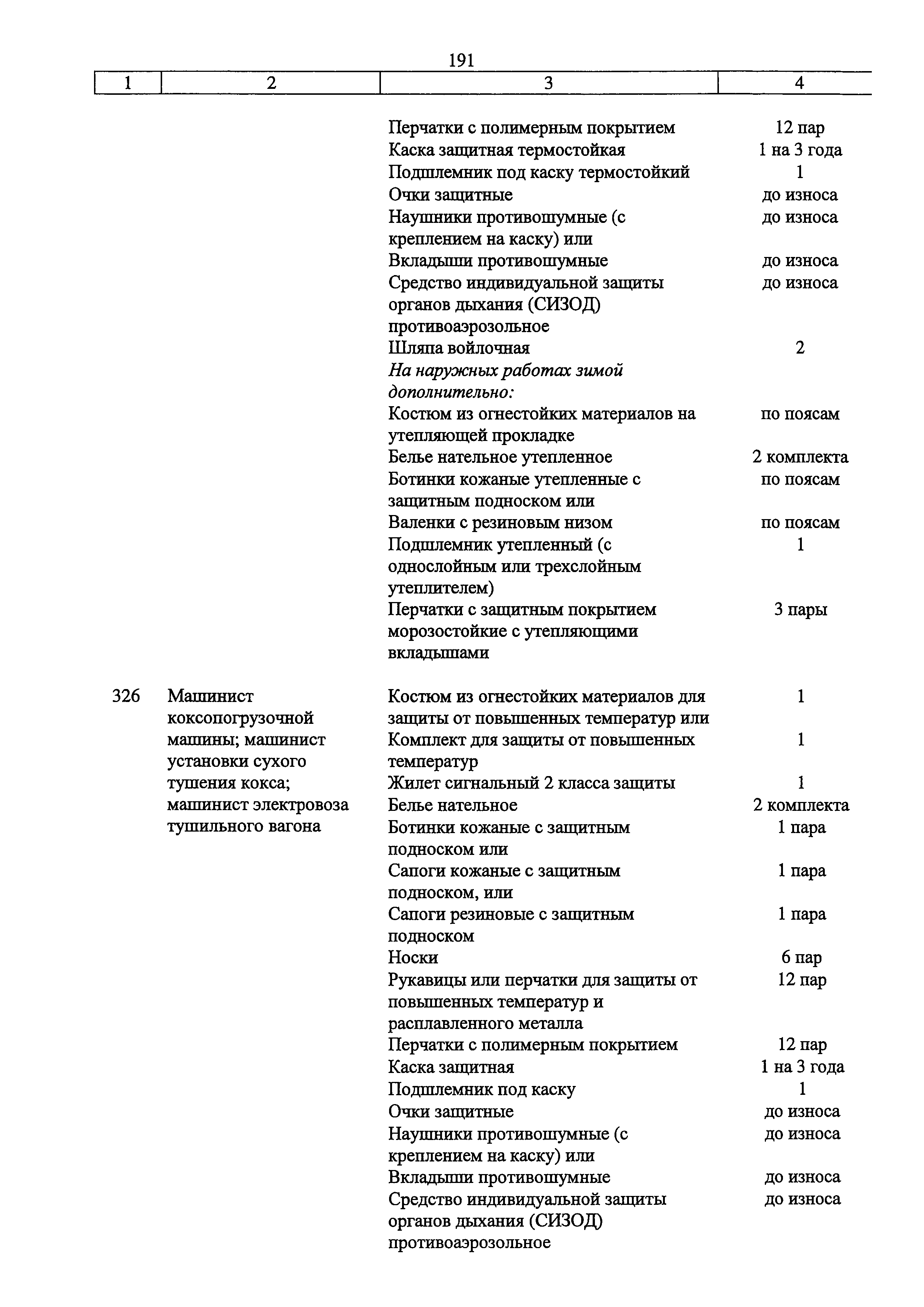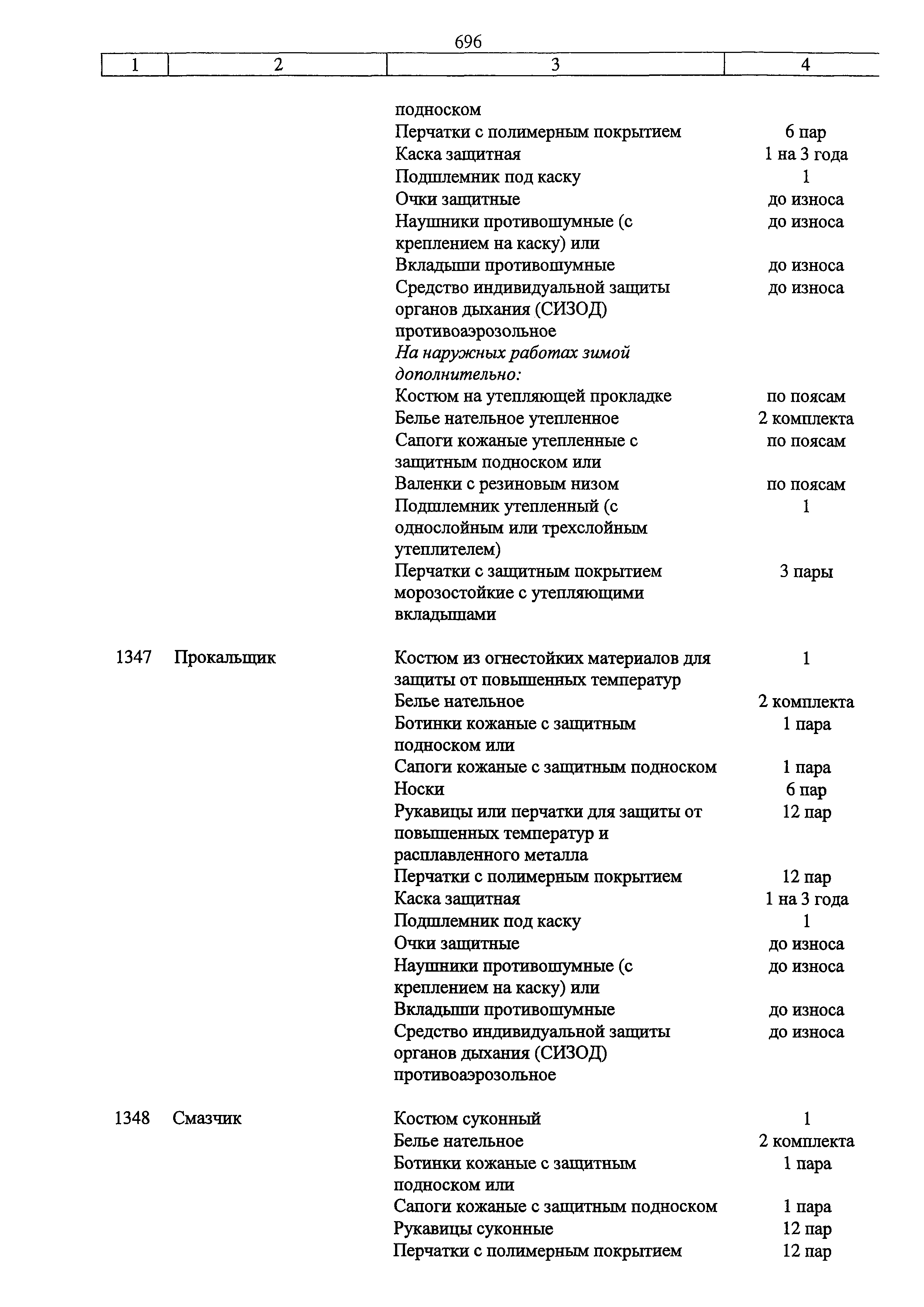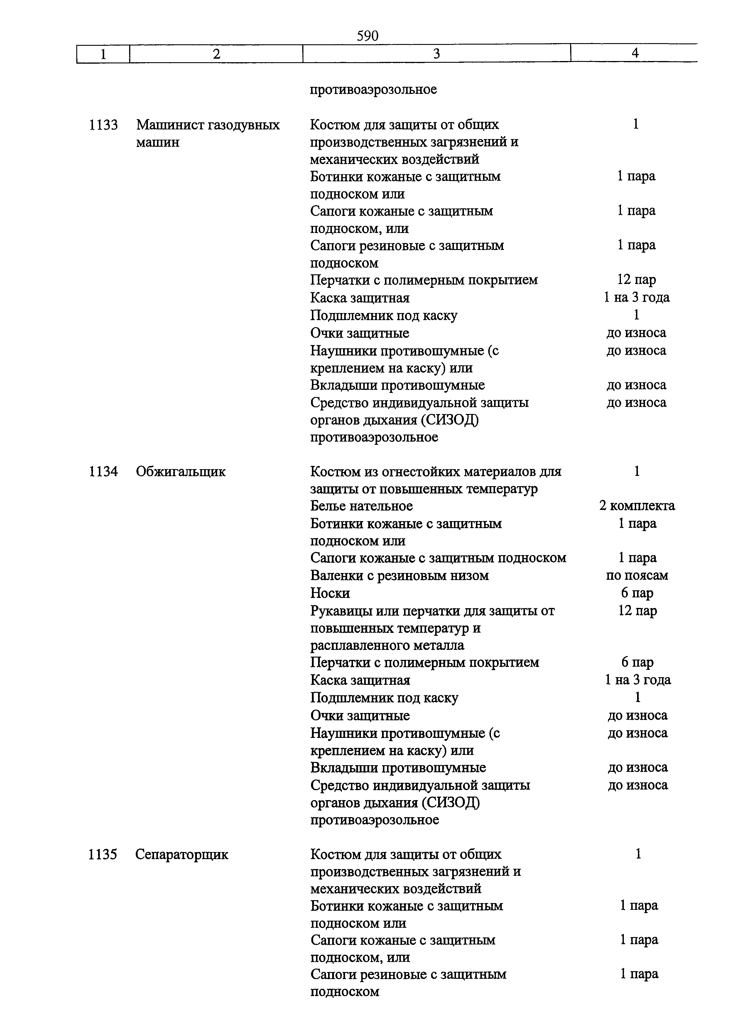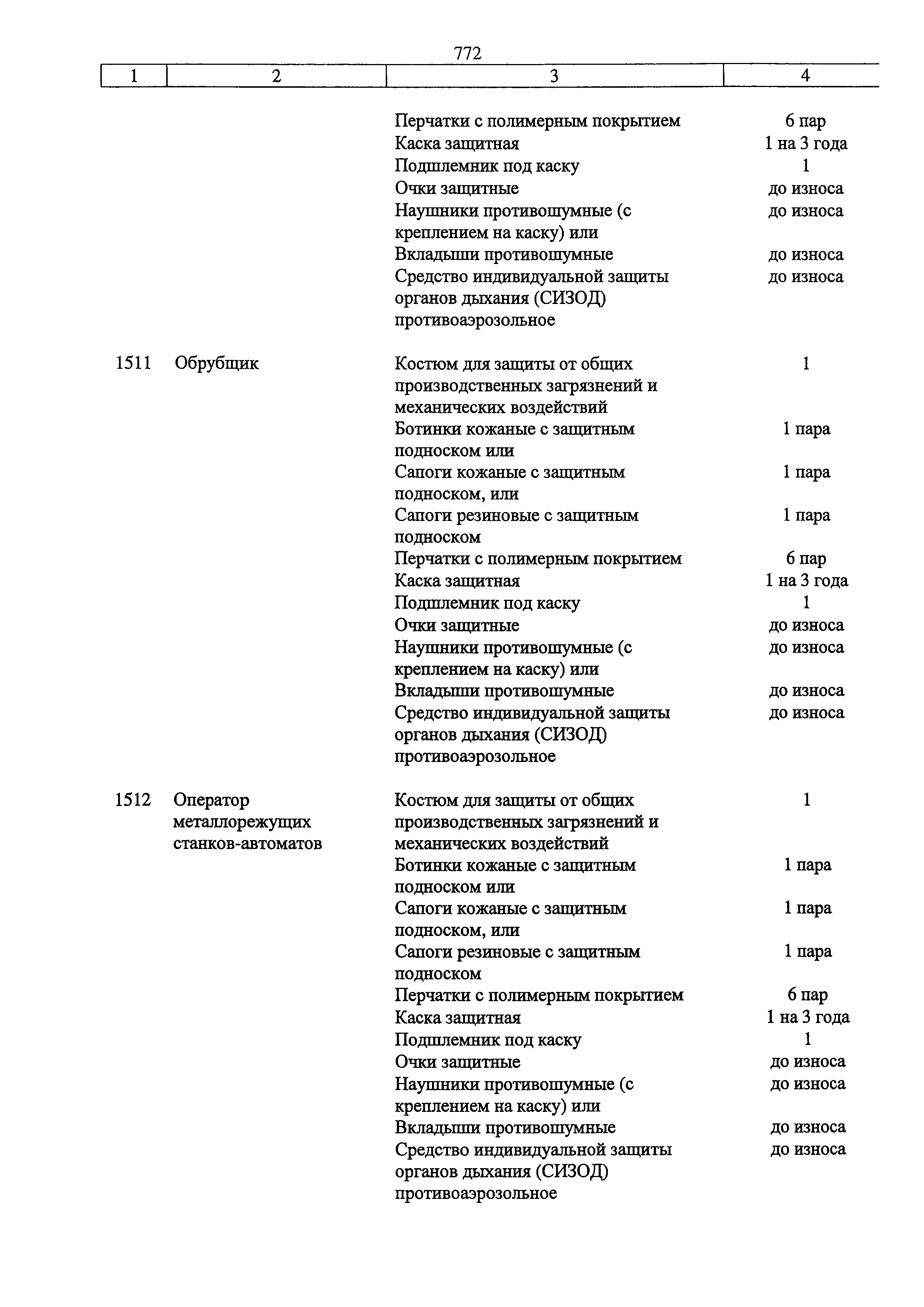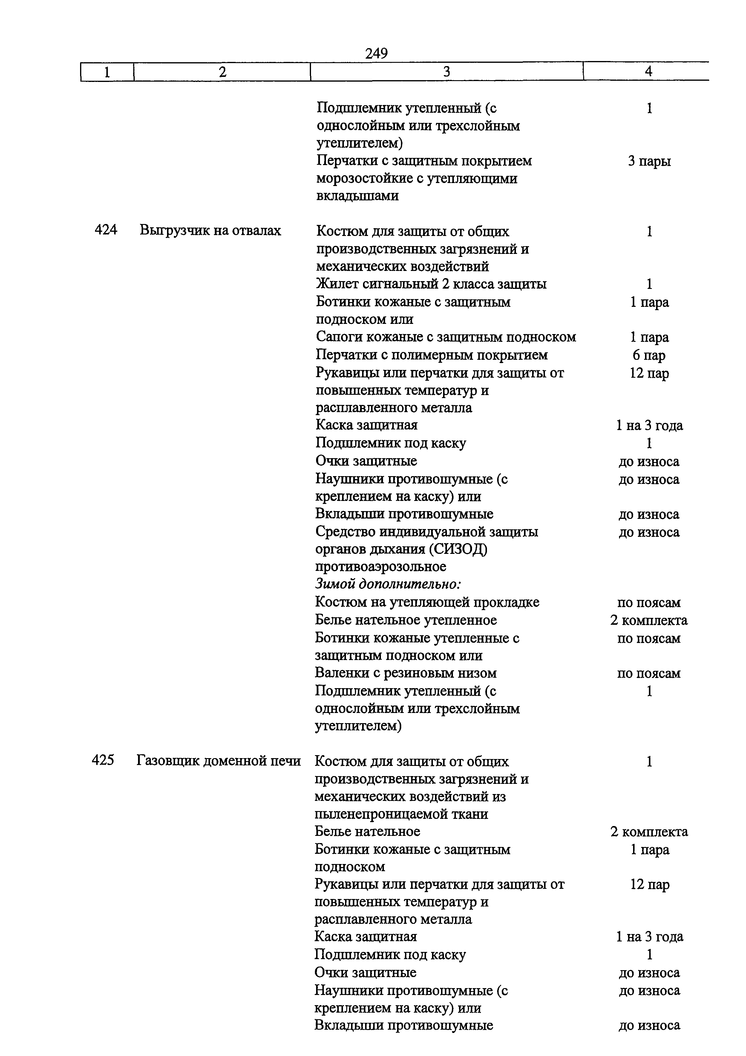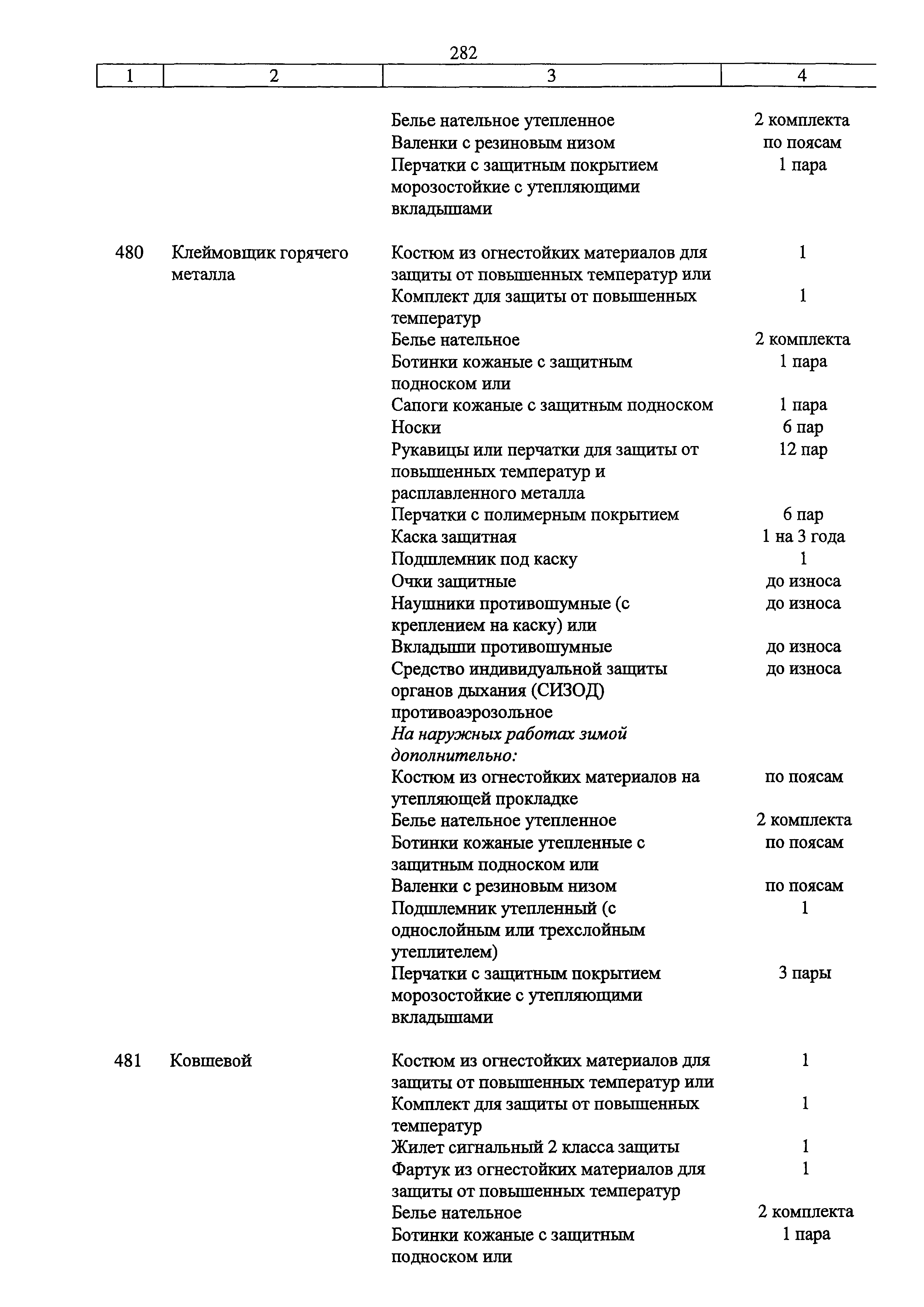 Типовые нормы бесплатной выдачи специальной одежды, специальной обуви и других средств индивидуальной защиты работникам горной и металлургической промышленности и металлургических производств других отраслей промышленности, занятым на работах с вредными и (или) опасными условиями труда, а также на работах, выполняемых в особых температурных условиях или связанных с загрязнением| Статус: | действует | | Название рус.: | Типовые нормы бесплатной выдачи специальной одежды, специальной обуви и других средств индивидуальной защиты работникам горной и металлургической промышленности и металлургических производств других отраслей промышленности, занятым на работах с вредными и (или) опасными условиями труда, а также на работах, выполняемых в особых температурных условиях или связанных с загрязнением | | Дата добавления в базу: | 01.02.2017 | | Дата актуализации: | 01.01.2021 | | Дата введения: | 14.02.2014 | | Область применения: | Нормы утверждаются локальными нормативными актами работодателя на основании результатов аттестации рабочих мест по условиям труда и могут быть включены в коллективный и (или) трудовой договор с указанием типовых норм, по сравнению с которыми улучшается обеспечение работников специальной одеждой, специальной обувью и другими средствами индивидуальной защиты. | | Оглавление: | I Горнодобывающая промышленность 1 Подземные горные работы (шахты) 2 Открытые горные работы и шахтная поверхность 3 Работа на гидравлических установках или с промывочными приборами 4 Дражные работы II Дробление, обогащение, брикетирование, обжиг, агломерация, извлечение металлов и сплавов III Черная металлургия 1 Коксохимическое производство 1.1 Углеподготовительные цеха 1.2 Углеобогатительные цеха 1.3 Производство каменноугольного кокса 1.4 Производство кристаллического нафталина, кумароновой смолы, смолоперерабатывающие цеха 1.5 Производство пиридиновых и фенольно-крезольных продуктов 1.6 Цеха улавливания химических продуктов и газовые цеха 1.7 Цеха ректификации сырого бензола 1.8 Цеха очистки коксового газа от сероводорода 1.9 Производство пекового кокса 1.10 Производство термоантрацита 2 Доменное производство 3 Сталеплавильное производство 3.1 Установки непрерывной разливки стали 4 Производство ферросплавов 4.1 Электролитическое производство 4.2 Производство электролитического хрома 4.3 Производство феррованадия 4.4 Подготовка шихты, обжиг руд и концентратов 4.5 Разливка и разделка ферросплавов 4.6 Обжиг извести 4.7 Общие профессии и должности ферросплавного производства 5 Прокатное производство 6 Производство труб (прокатка, сварка и волочение) 7 Колесопрокатное и бандажное производства 8 Валопрокатное производство 9 Производство рельсовых скреплений 10 Производство баллонов 11 Труболитейное производство 12 Производство метизов 12.1 Производство металлических канатов, сеток, пружин и пружинной ленты, щеток, цепей, колючей проволоки и других метизов 12.2 Волочение проволоки, калибровка и шлифовка металла 12.3 Изготовление волок 12.4 Холодноштамповочные и кузнечно-прессовые работы 12.5 Термическая обработка 12.6 Травление металла, защитные покрытия проволоки и извлечение железного купороса 12.7 Производство металлических электродов и порошковой проволоки 13 Производство огнеупоров 13.1 Огнеупоры 13.2 Карборундовые стержни 13.3 Высокоогнеупорные окислы 14 Ремонт 