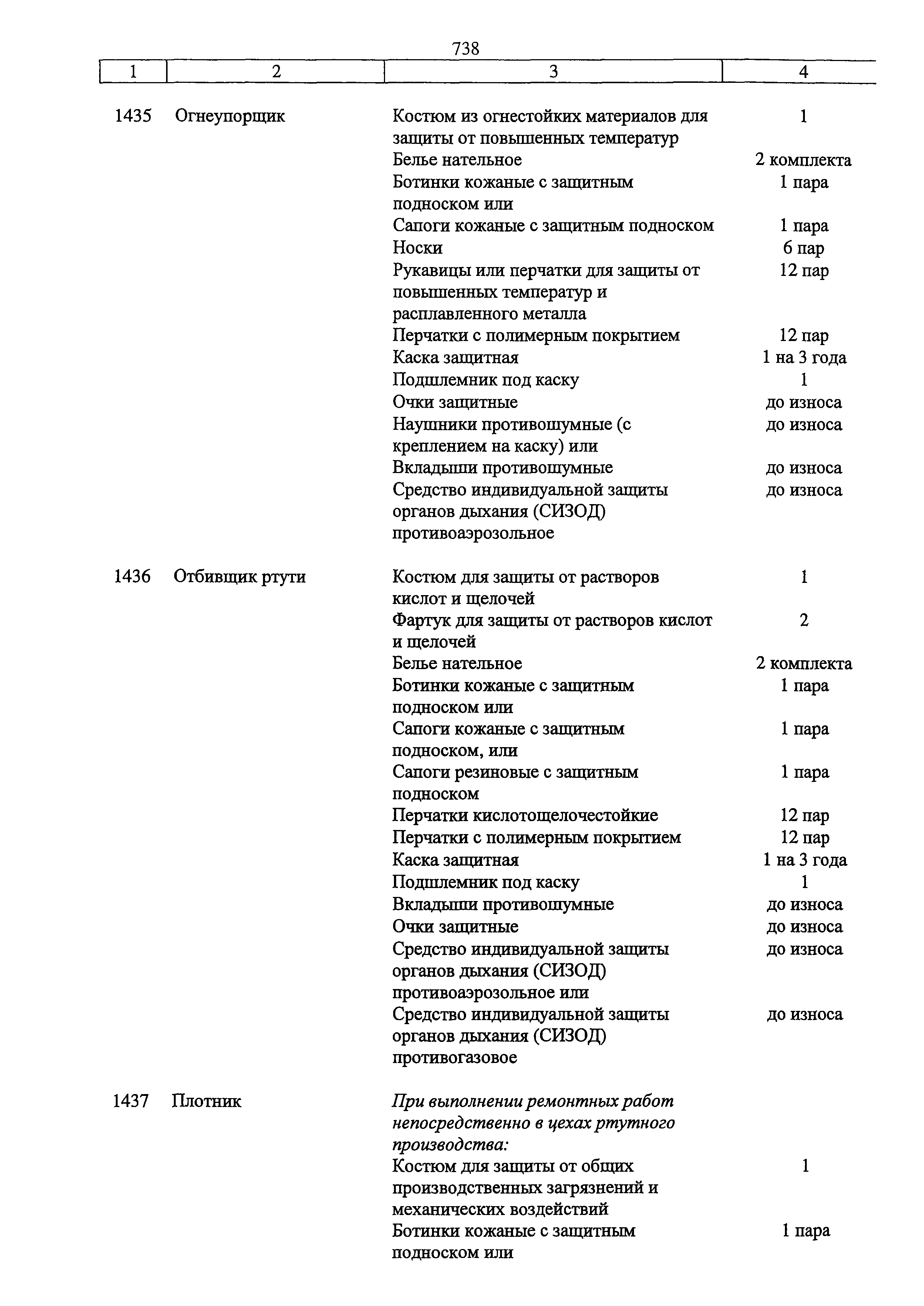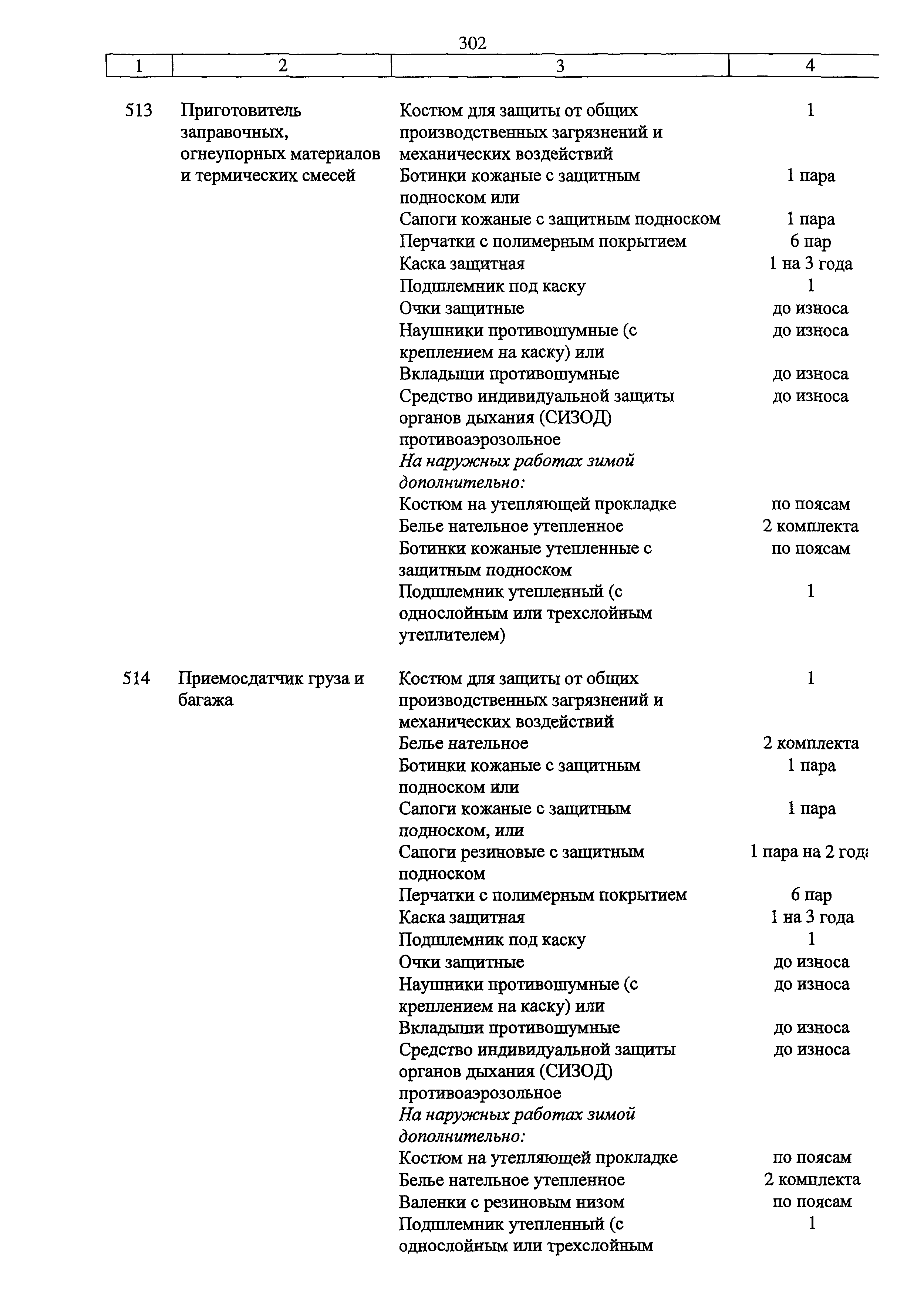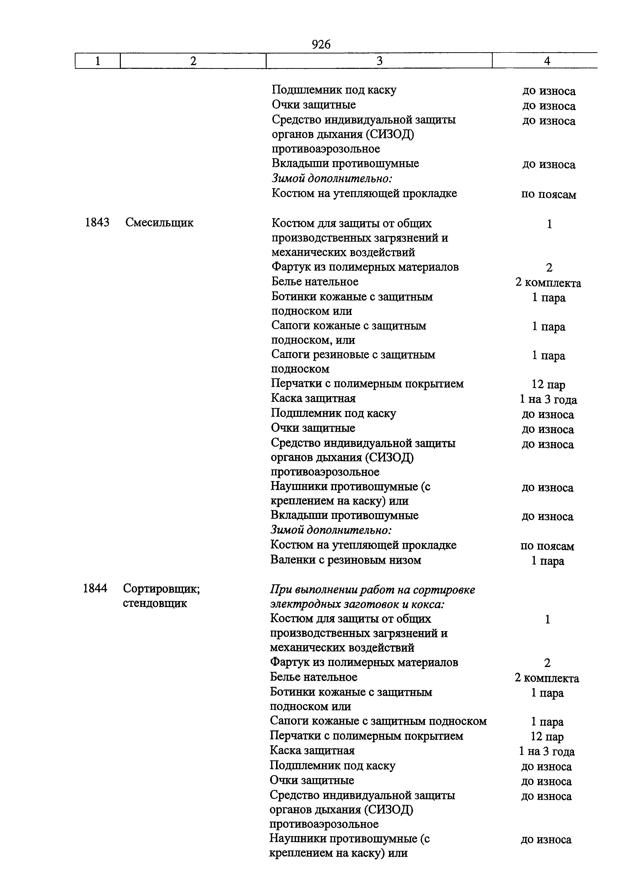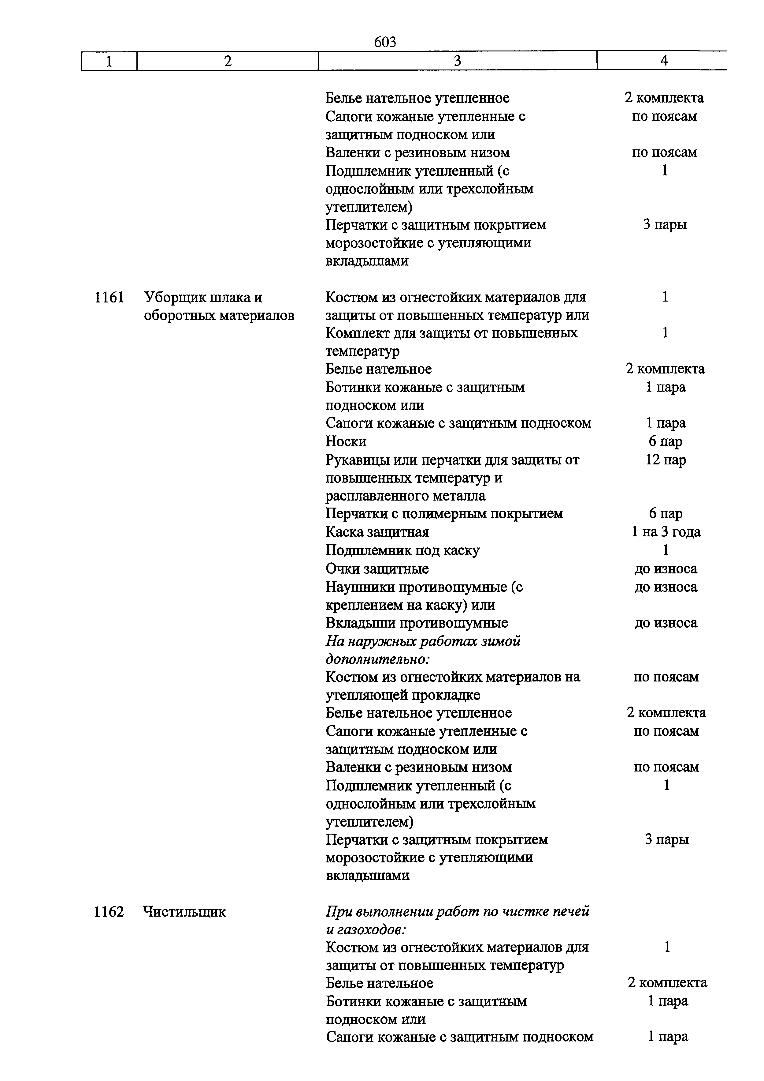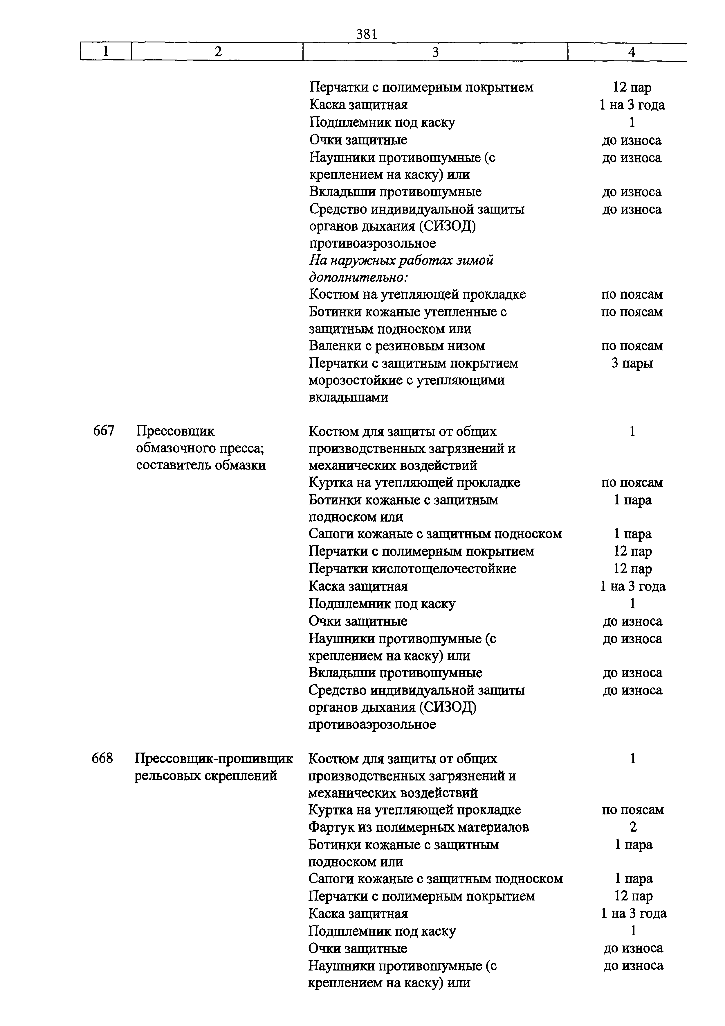 Типовые нормы бесплатной выдачи специальной одежды, специальной обуви и других средств индивидуальной защиты работникам горной и металлургической промышленности и металлургических производств других отраслей промышленности, занятым на работах с вредными и (или) опасными условиями труда, а также на работах, выполняемых в особых температурных условиях или связанных с загрязнением| Статус: | действует | | Название рус.: | Типовые нормы бесплатной выдачи специальной одежды, специальной обуви и других средств индивидуальной защиты работникам горной и металлургической промышленности и металлургических производств других отраслей промышленности, занятым на работах с вредными и (или) опасными условиями труда, а также на работах, выполняемых в особых температурных условиях или связанных с загрязнением | | Дата добавления в базу: | 01.02.2017 | | Дата актуализации: | 01.01.2021 | | Дата введения: | 14.02.2014 | | Область применения: | Нормы утверждаются локальными нормативными актами работодателя на основании результатов аттестации рабочих мест по условиям труда и могут быть включены в коллективный и (или) трудовой договор с указанием типовых норм, по сравнению с которыми улучшается обеспечение работников специальной одеждой, специальной обувью и другими средствами индивидуальной защиты. | | Оглавление: | I Горнодобывающая промышленность 1 Подземные горные работы (шахты) 2 Открытые горные работы и шахтная поверхность 3 Работа на гидравлических установках или с промывочными приборами 4 Дражные работы II Дробление, обогащение, брикетирование, обжиг, агломерация, извлечение металлов и сплавов III Черная металлургия 1 Коксохимическое производство 1.1 Углеподготовительные цеха 1.2 Углеобогатительные цеха 1.3 Производство каменноугольного кокса 1.4 Производство кристаллического нафталина, кумароновой смолы, смолоперерабатывающие цеха 1.5 Производство пиридиновых и фенольно-крезольных продуктов 1.6 Цеха улавливания химических продуктов и газовые цеха 1.7 Цеха ректификации сырого бензола 1.8 Цеха очистки коксового газа от сероводорода 1.9 Производство пекового кокса 1.10 Производство термоантрацита 2 Доменное производство 3 Сталеплавильное производство 3.1 Установки непрерывной разливки стали 4 Производство ферросплавов 4.1 Электролитическое производство 4.2 Производство электролитического хрома 4.3 Производство феррованадия 4.4 Подготовка шихты, обжиг руд и концентратов 4.5 Разливка и разделка ферросплавов 4.6 Обжиг извести 4.7 Общие профессии и должности ферросплавного производства 5 Прокатное производство 6 Производство труб (прокатка, сварка и волочение) 7 Колесопрокатное и бандажное производства 8 Валопрокатное производство 9 Производство рельсовых скреплений 10 Производство баллонов 11 Труболитейное производство 12 Производство метизов 12.1 Производство металлических канатов, сеток, пружин и пружинной ленты, щеток, цепей, колючей проволоки и других метизов 12.2 Волочение проволоки, калибровка и шлифовка металла 12.3 Изготовление волок 12.4 Холодноштамповочные и кузнечно-прессовые работы 12.5 Термическая обработка 12.6 Травление металла, защитные покрытия проволоки и извлечение железного купороса 12.7 Производство металлических электродов и порошковой проволоки 13 Производство огнеупоров 13.1 Огнеупоры 13.2 Карборундовые стержни 13.3 Высокоогнеупорные окислы 14 Ремонт 