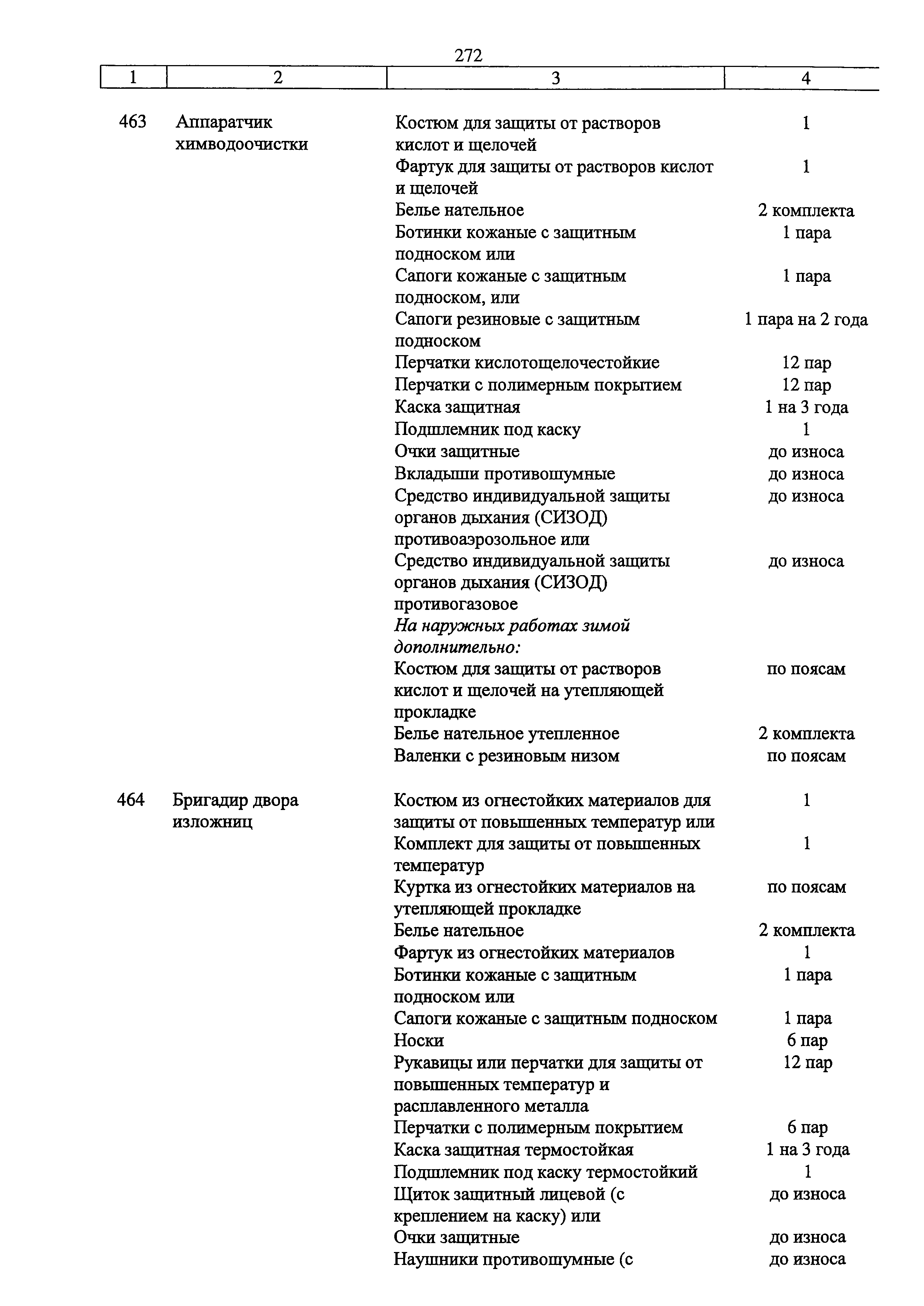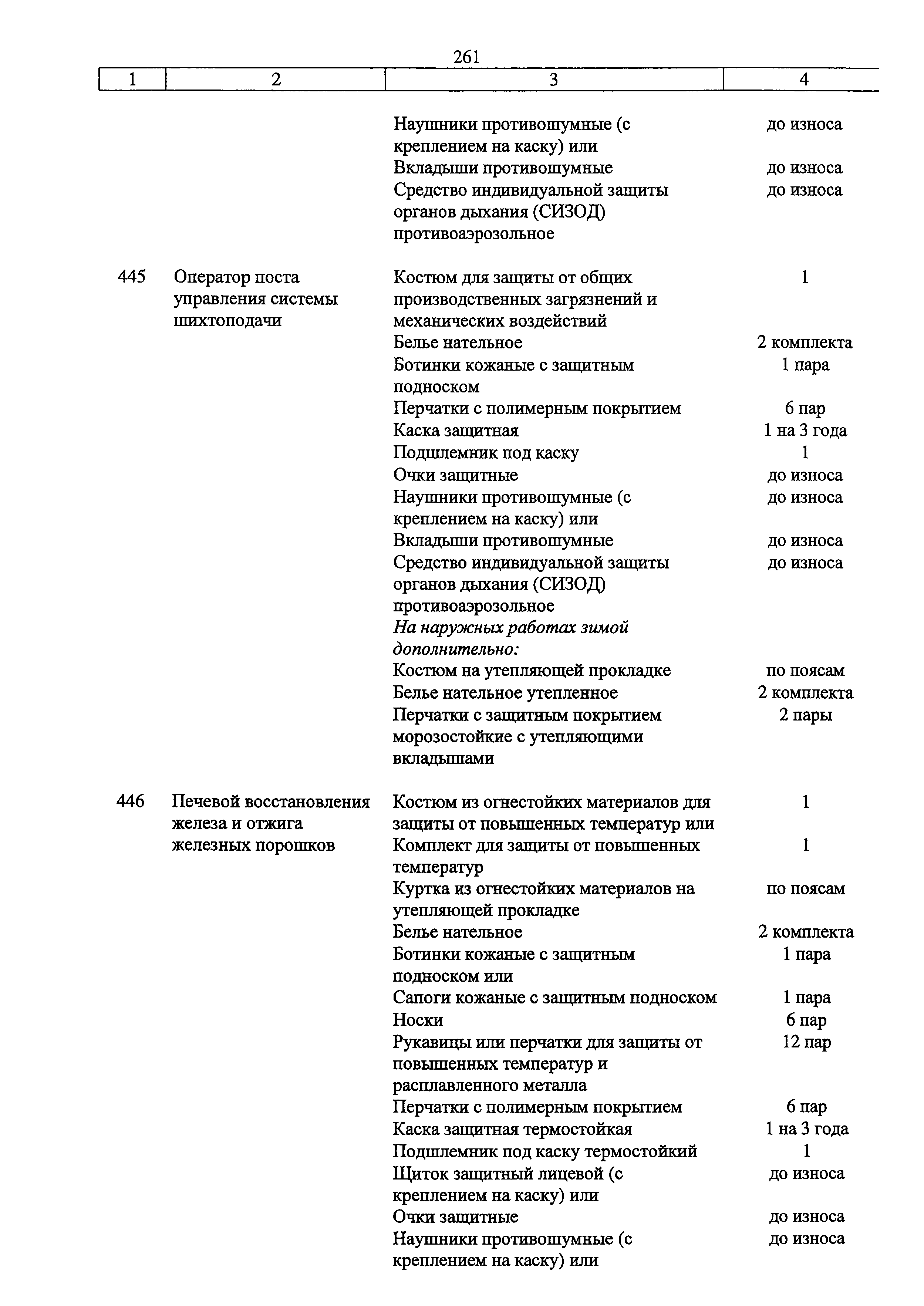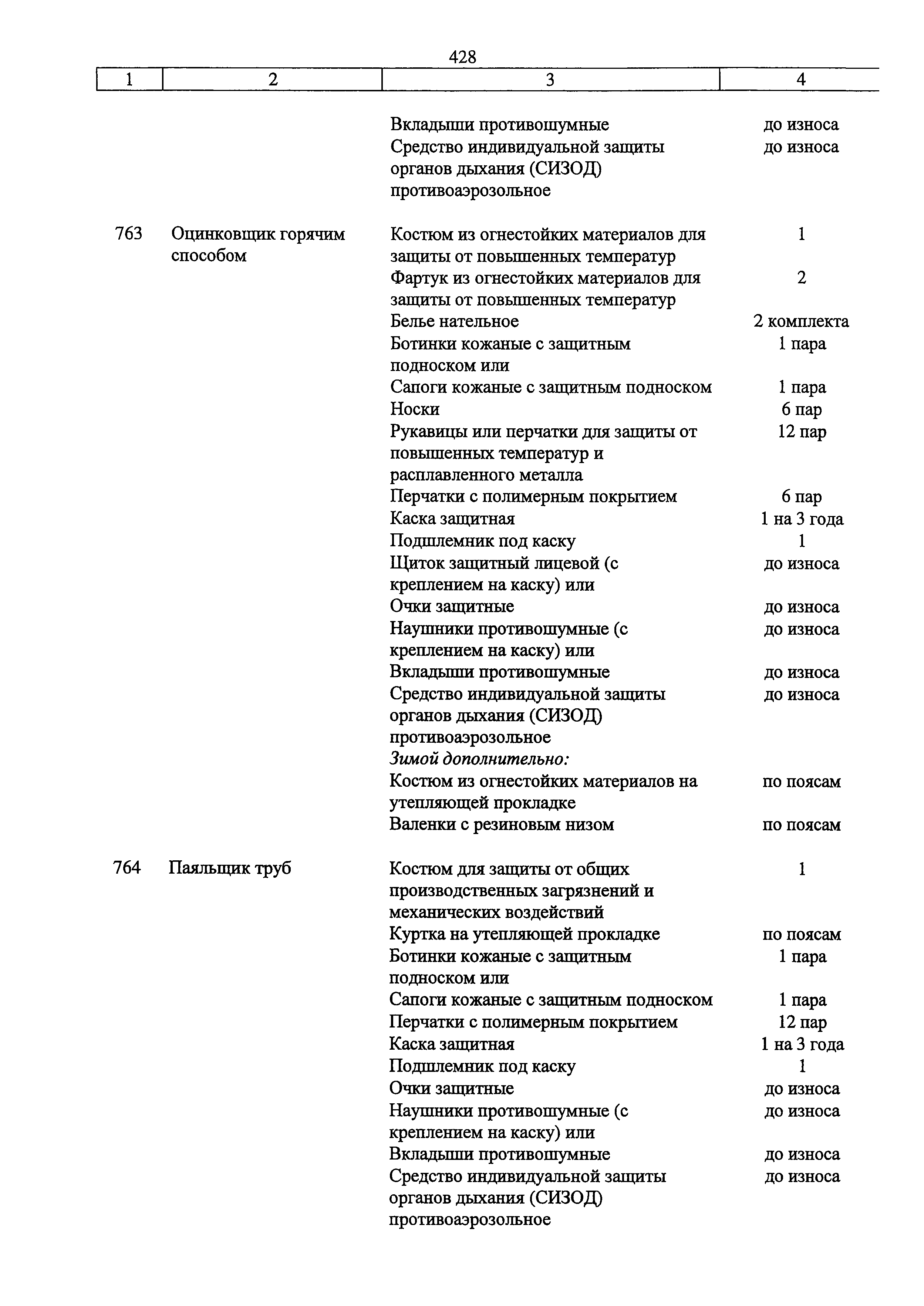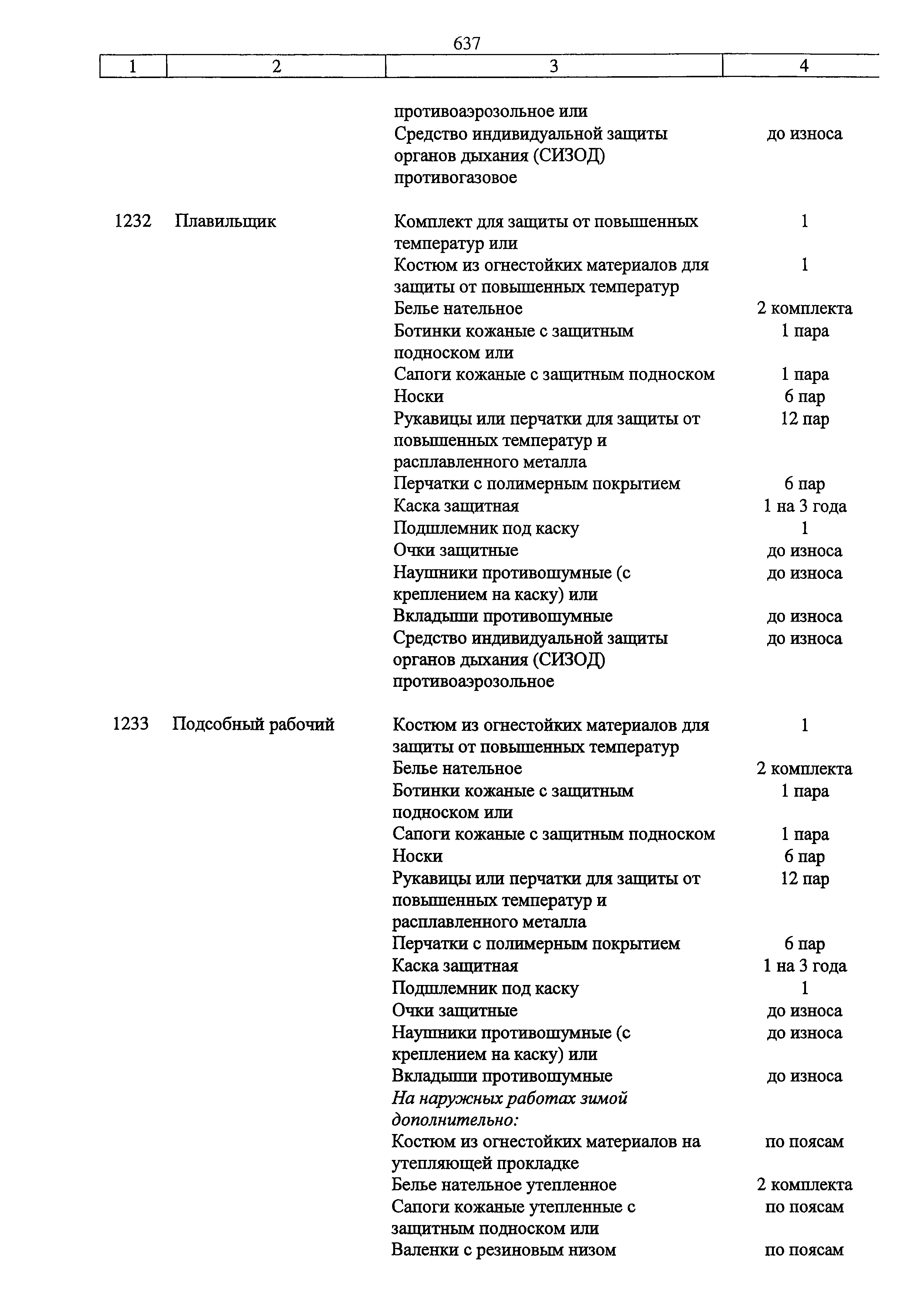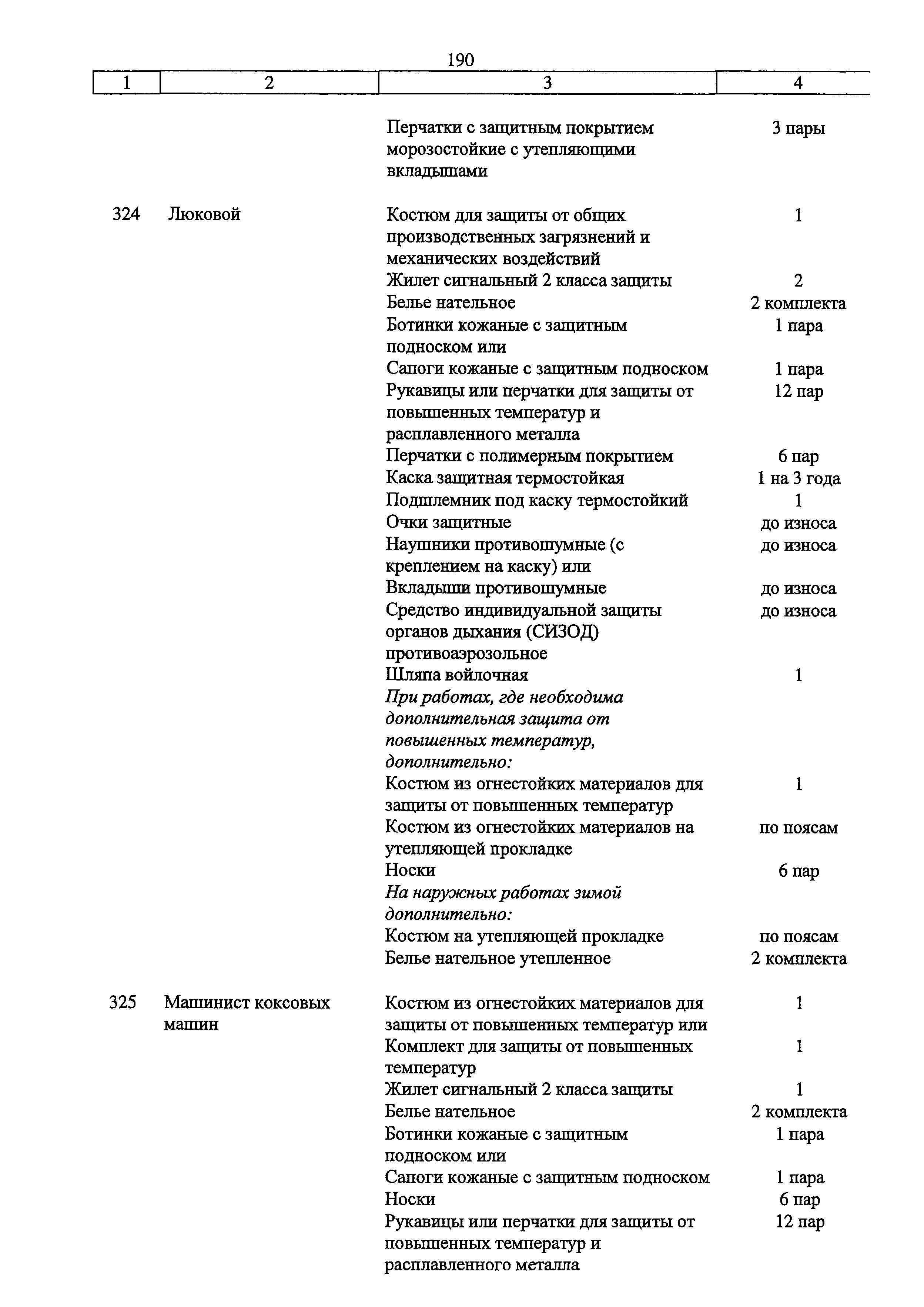 Типовые нормы бесплатной выдачи специальной одежды, специальной обуви и других средств индивидуальной защиты работникам горной и металлургической промышленности и металлургических производств других отраслей промышленности, занятым на работах с вредными и (или) опасными условиями труда, а также на работах, выполняемых в особых температурных условиях или связанных с загрязнением| Статус: | действует | | Название рус.: | Типовые нормы бесплатной выдачи специальной одежды, специальной обуви и других средств индивидуальной защиты работникам горной и металлургической промышленности и металлургических производств других отраслей промышленности, занятым на работах с вредными и (или) опасными условиями труда, а также на работах, выполняемых в особых температурных условиях или связанных с загрязнением | | Дата добавления в базу: | 01.02.2017 | | Дата актуализации: | 01.01.2021 | | Дата введения: | 14.02.2014 | | Область применения: | Нормы утверждаются локальными нормативными актами работодателя на основании результатов аттестации рабочих мест по условиям труда и могут быть включены в коллективный и (или) трудовой договор с указанием типовых норм, по сравнению с которыми улучшается обеспечение работников специальной одеждой, специальной обувью и другими средствами индивидуальной защиты. | | Оглавление: | I Горнодобывающая промышленность 1 Подземные горные работы (шахты) 2 Открытые горные работы и шахтная поверхность 3 Работа на гидравлических установках или с промывочными приборами 4 Дражные работы II Дробление, обогащение, брикетирование, обжиг, агломерация, извлечение металлов и сплавов III Черная металлургия 1 Коксохимическое производство 1.1 Углеподготовительные цеха 1.2 Углеобогатительные цеха 1.3 Производство каменноугольного кокса 1.4 Производство кристаллического нафталина, кумароновой смолы, смолоперерабатывающие цеха 1.5 Производство пиридиновых и фенольно-крезольных продуктов 1.6 Цеха улавливания химических продуктов и газовые цеха 1.7 Цеха ректификации сырого бензола 1.8 Цеха очистки коксового газа от сероводорода 1.9 Производство пекового кокса 1.10 Производство термоантрацита 2 Доменное производство 3 Сталеплавильное производство 3.1 Установки непрерывной разливки стали 4 Производство ферросплавов 4.1 Электролитическое производство 4.2 Производство электролитического хрома 4.3 Производство феррованадия 4.4 Подготовка шихты, обжиг руд и концентратов 4.5 Разливка и разделка ферросплавов 4.6 Обжиг извести 4.7 Общие профессии и должности ферросплавного производства 5 Прокатное производство 6 Производство труб (прокатка, сварка и волочение) 7 Колесопрокатное и бандажное производства 8 Валопрокатное производство 9 Производство рельсовых скреплений 10 Производство баллонов 11 Труболитейное производство 12 Производство метизов 12.1 Производство металлических канатов, сеток, пружин и пружинной ленты, щеток, цепей, колючей проволоки и других метизов 12.2 Волочение проволоки, калибровка и шлифовка металла 12.3 Изготовление волок 12.4 Холодноштамповочные и кузнечно-прессовые работы 12.5 Термическая обработка 12.6 Травление металла, защитные покрытия проволоки и извлечение железного купороса 12.7 Производство металлических электродов и порошковой проволоки 13 Производство огнеупоров 13.1 Огнеупоры 13.2 Карборундовые стержни 13.3 Высокоогнеупорные окислы 14 Ремонт 