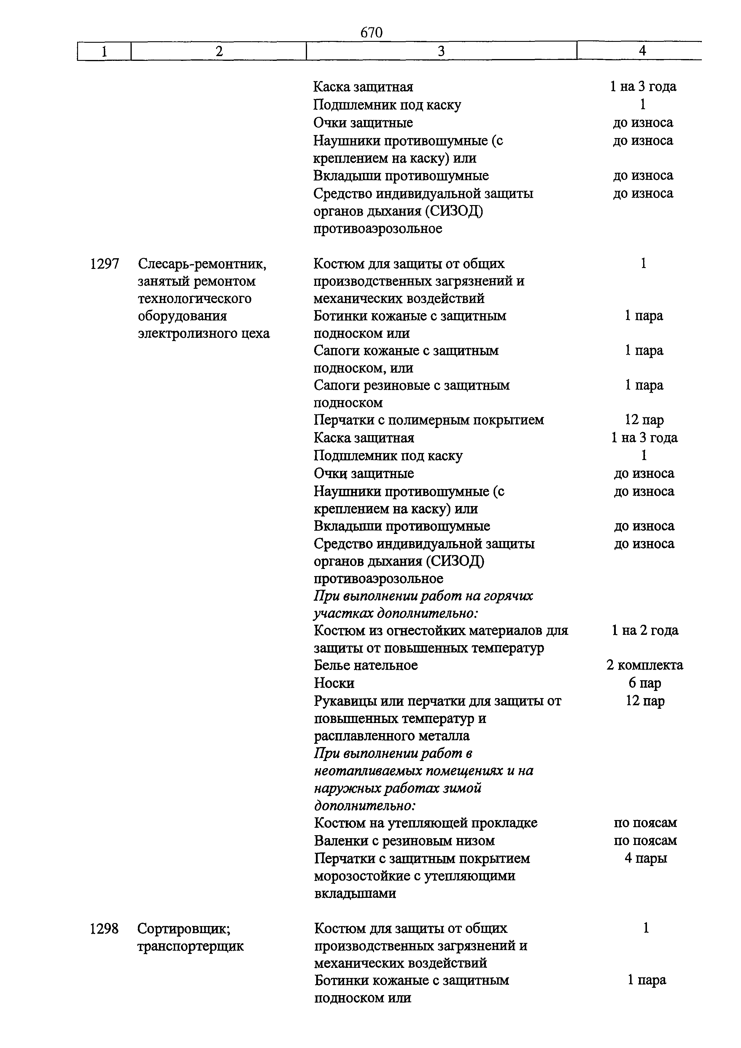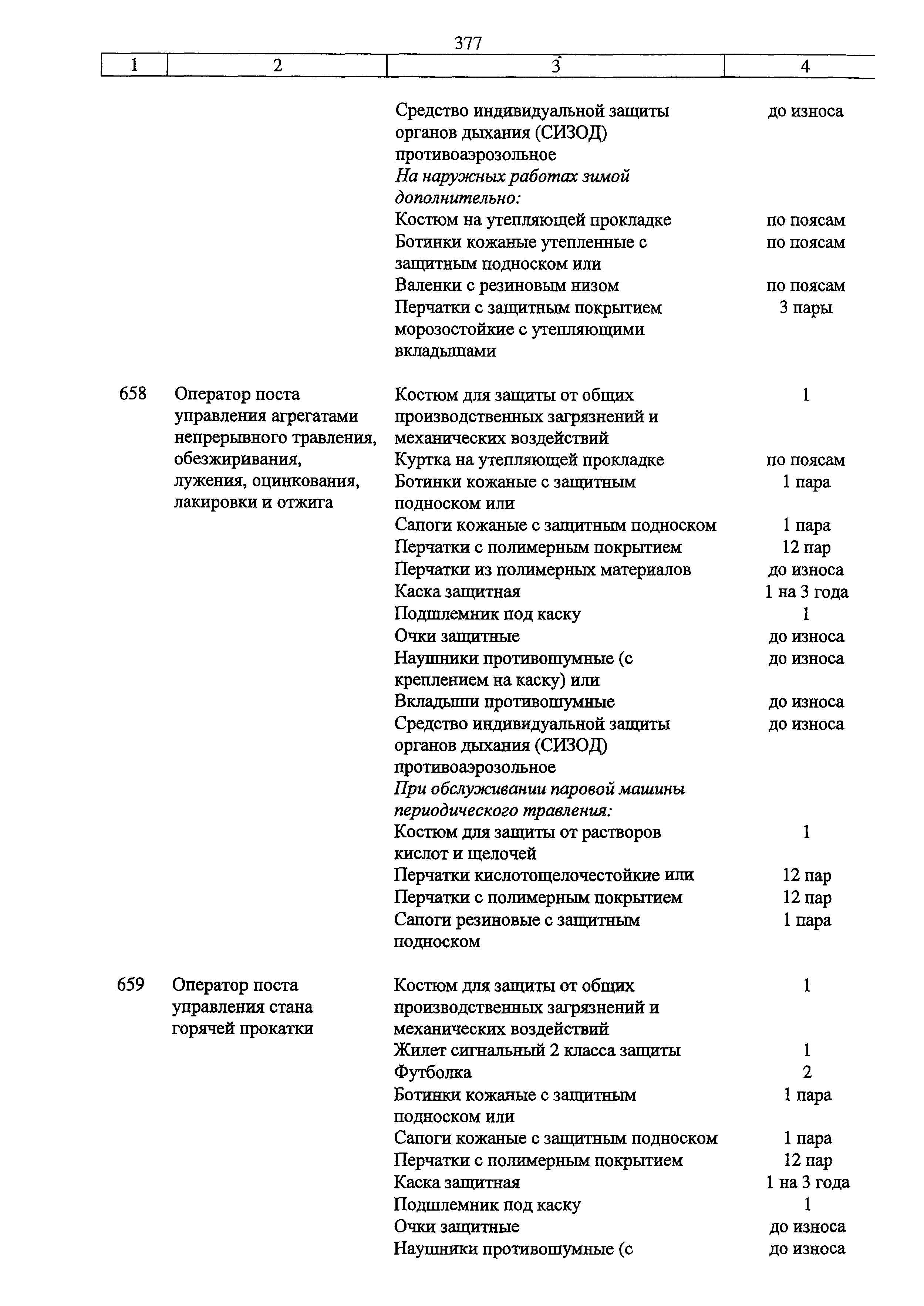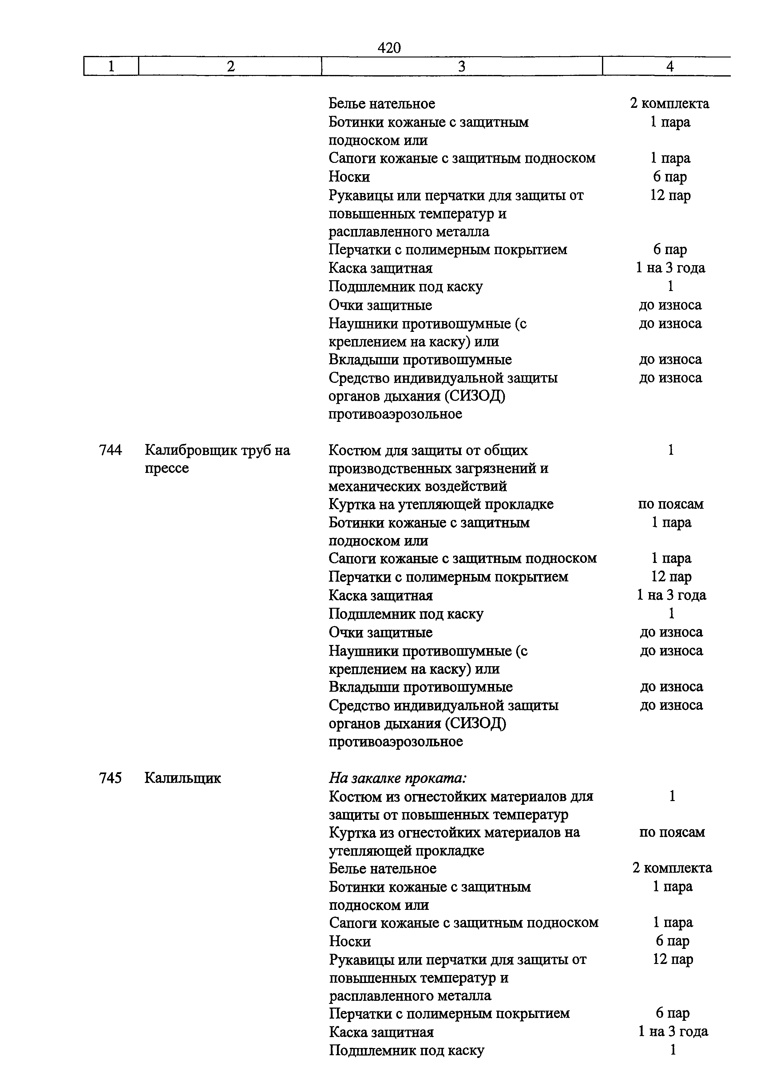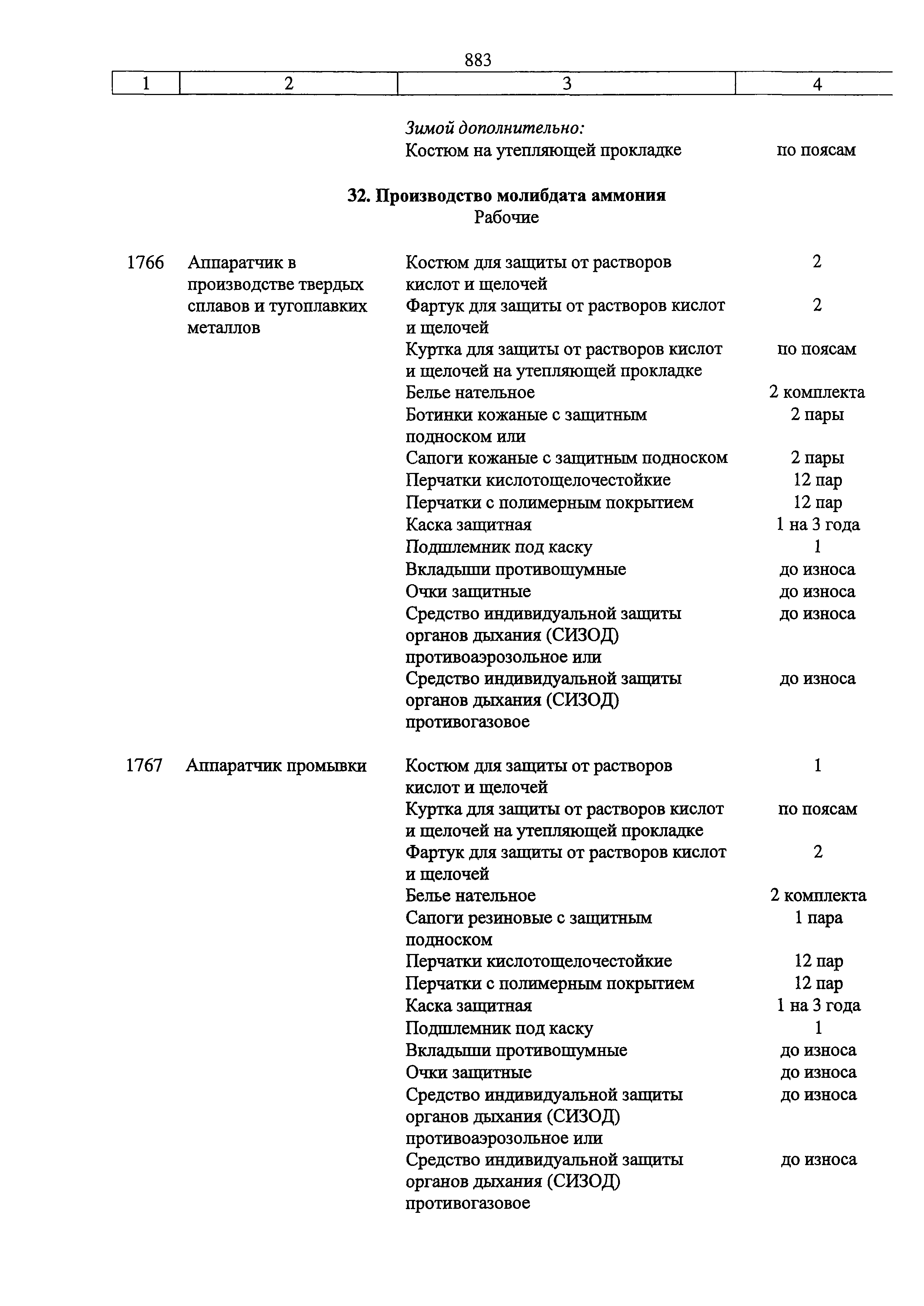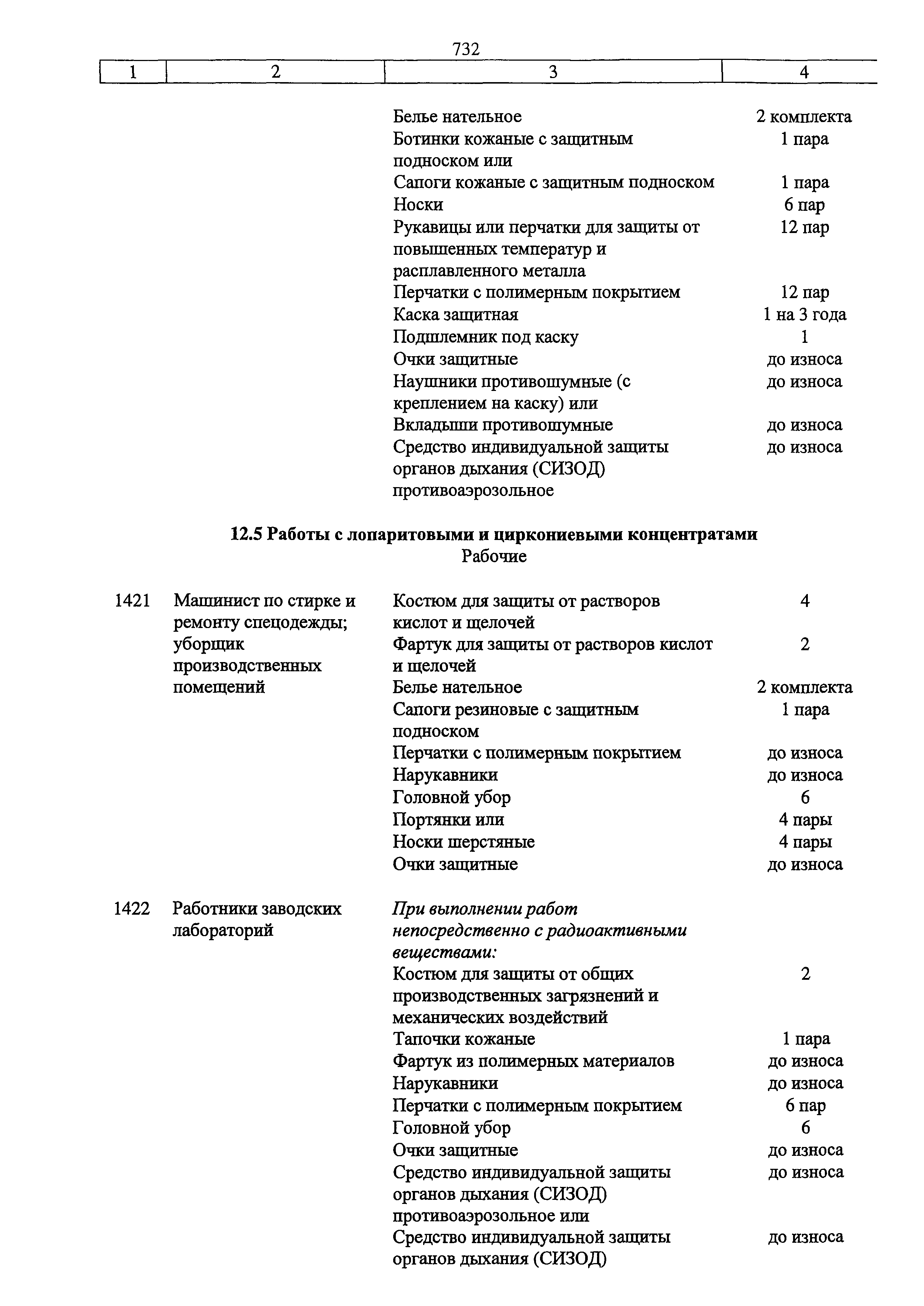 Типовые нормы бесплатной выдачи специальной одежды, специальной обуви и других средств индивидуальной защиты работникам горной и металлургической промышленности и металлургических производств других отраслей промышленности, занятым на работах с вредными и (или) опасными условиями труда, а также на работах, выполняемых в особых температурных условиях или связанных с загрязнением| Статус: | действует | | Название рус.: | Типовые нормы бесплатной выдачи специальной одежды, специальной обуви и других средств индивидуальной защиты работникам горной и металлургической промышленности и металлургических производств других отраслей промышленности, занятым на работах с вредными и (или) опасными условиями труда, а также на работах, выполняемых в особых температурных условиях или связанных с загрязнением | | Дата добавления в базу: | 01.02.2017 | | Дата актуализации: | 01.01.2021 | | Дата введения: | 14.02.2014 | | Область применения: | Нормы утверждаются локальными нормативными актами работодателя на основании результатов аттестации рабочих мест по условиям труда и могут быть включены в коллективный и (или) трудовой договор с указанием типовых норм, по сравнению с которыми улучшается обеспечение работников специальной одеждой, специальной обувью и другими средствами индивидуальной защиты. | | Оглавление: | I Горнодобывающая промышленность 1 Подземные горные работы (шахты) 2 Открытые горные работы и шахтная поверхность 3 Работа на гидравлических установках или с промывочными приборами 4 Дражные работы II Дробление, обогащение, брикетирование, обжиг, агломерация, извлечение металлов и сплавов III Черная металлургия 1 Коксохимическое производство 1.1 Углеподготовительные цеха 1.2 Углеобогатительные цеха 1.3 Производство каменноугольного кокса 1.4 Производство кристаллического нафталина, кумароновой смолы, смолоперерабатывающие цеха 1.5 Производство пиридиновых и фенольно-крезольных продуктов 1.6 Цеха улавливания химических продуктов и газовые цеха 1.7 Цеха ректификации сырого бензола 1.8 Цеха очистки коксового газа от сероводорода 1.9 Производство пекового кокса 1.10 Производство термоантрацита 2 Доменное производство 3 Сталеплавильное производство 3.1 Установки непрерывной разливки стали 4 Производство ферросплавов 4.1 Электролитическое производство 4.2 Производство электролитического хрома 4.3 Производство феррованадия 4.4 Подготовка шихты, обжиг руд и концентратов 4.5 Разливка и разделка ферросплавов 4.6 Обжиг извести 4.7 Общие профессии и должности ферросплавного производства 5 Прокатное производство 6 Производство труб (прокатка, сварка и волочение) 7 Колесопрокатное и бандажное производства 8 Валопрокатное производство 9 Производство рельсовых скреплений 10 Производство баллонов 11 Труболитейное производство 12 Производство метизов 12.1 Производство металлических канатов, сеток, пружин и пружинной ленты, щеток, цепей, колючей проволоки и других метизов 12.2 Волочение проволоки, калибровка и шлифовка металла 12.3 Изготовление волок 12.4 Холодноштамповочные и кузнечно-прессовые работы 12.5 Термическая обработка 12.6 Травление металла, защитные покрытия проволоки и извлечение железного купороса 12.7 Производство металлических электродов и порошковой проволоки 13 Производство огнеупоров 13.1 Огнеупоры 13.2 Карборундовые стержни 13.3 Высокоогнеупорные окислы 14 Ремонт 