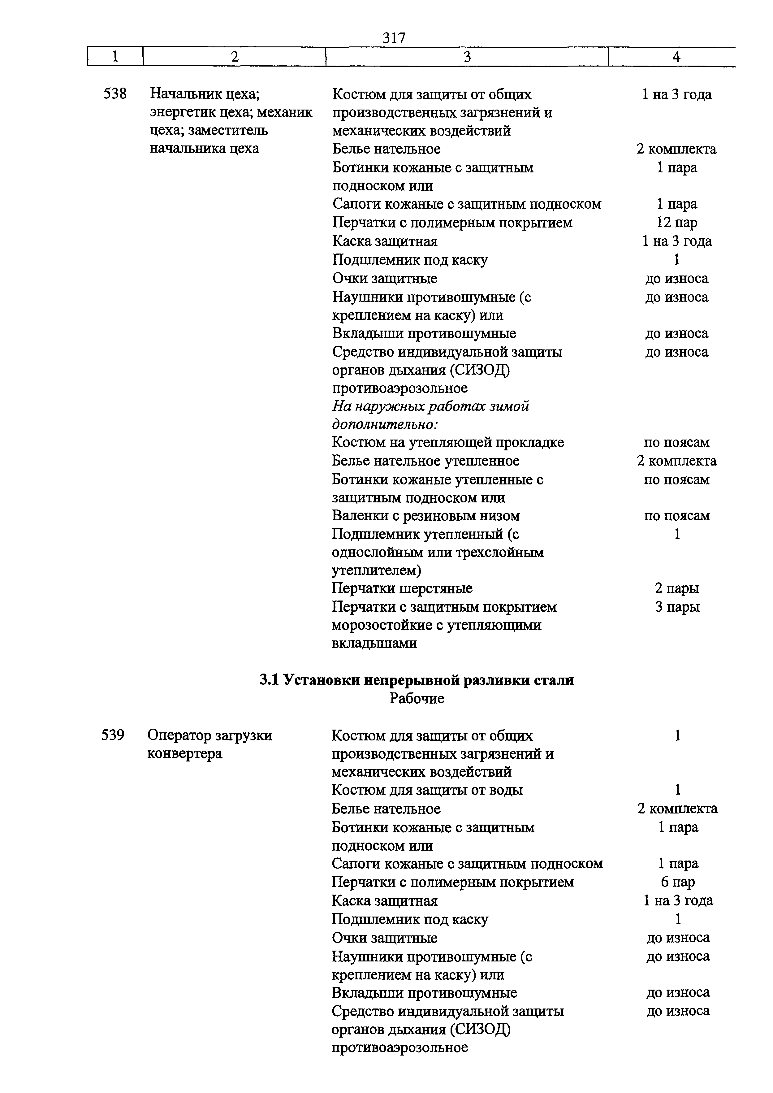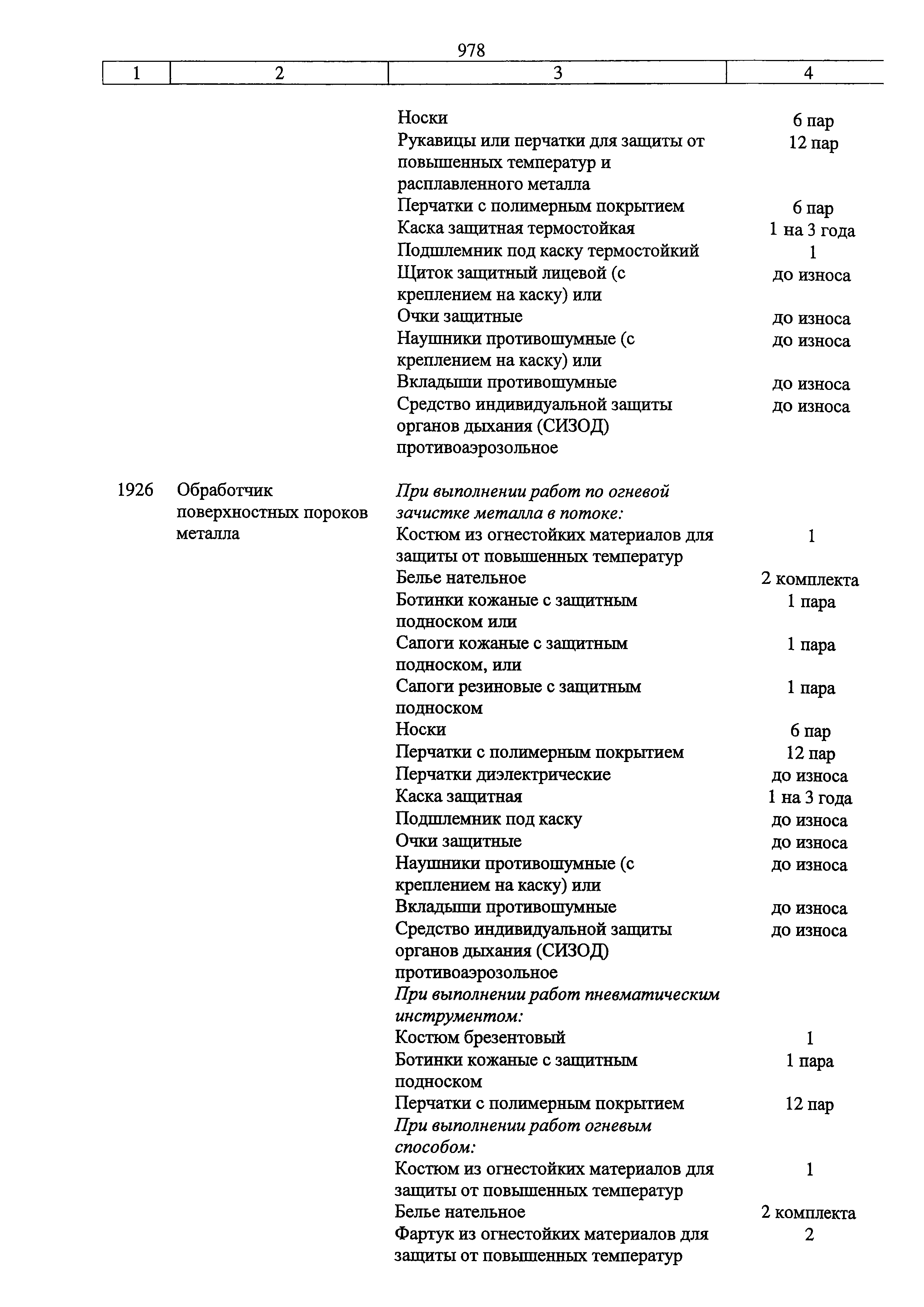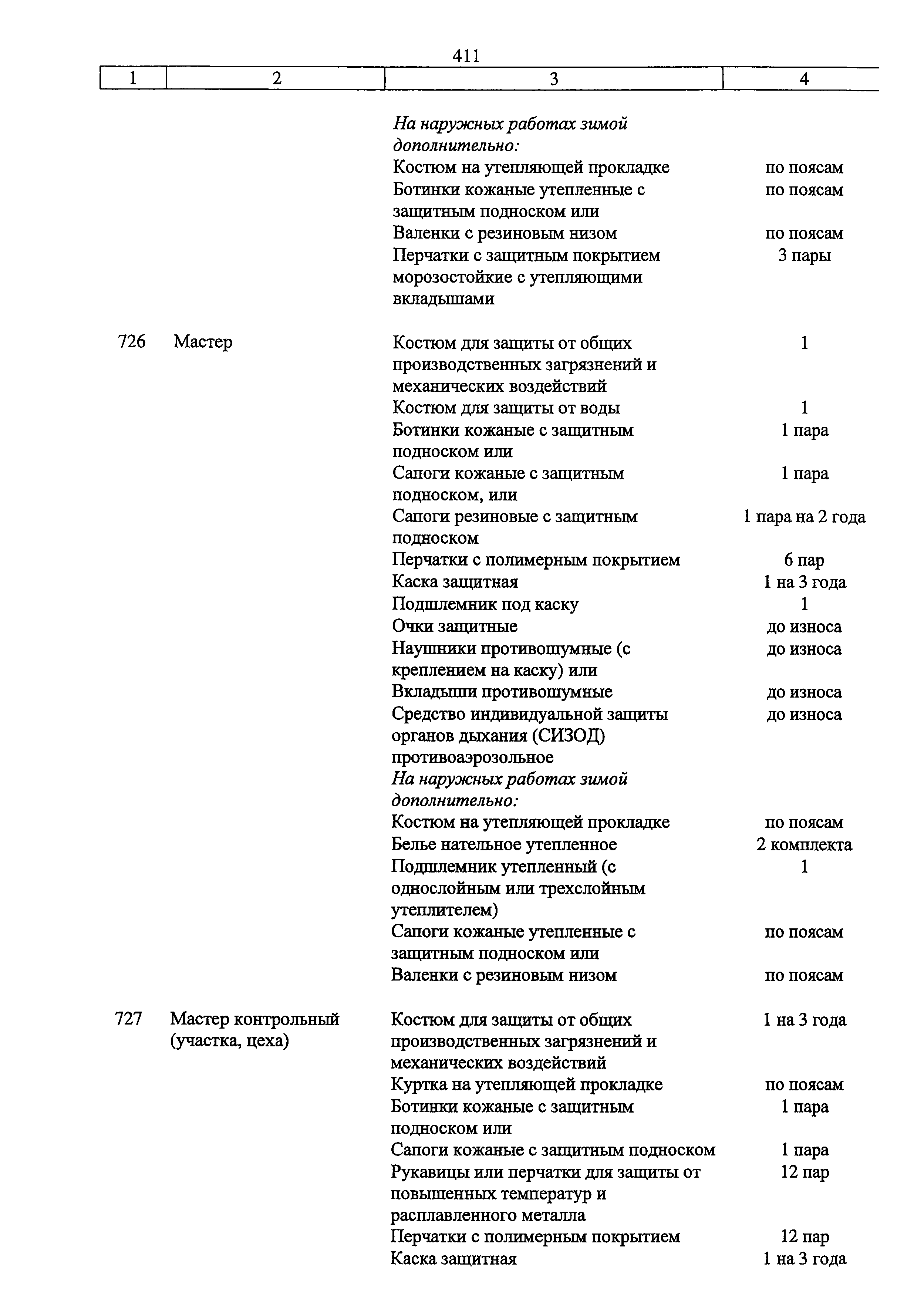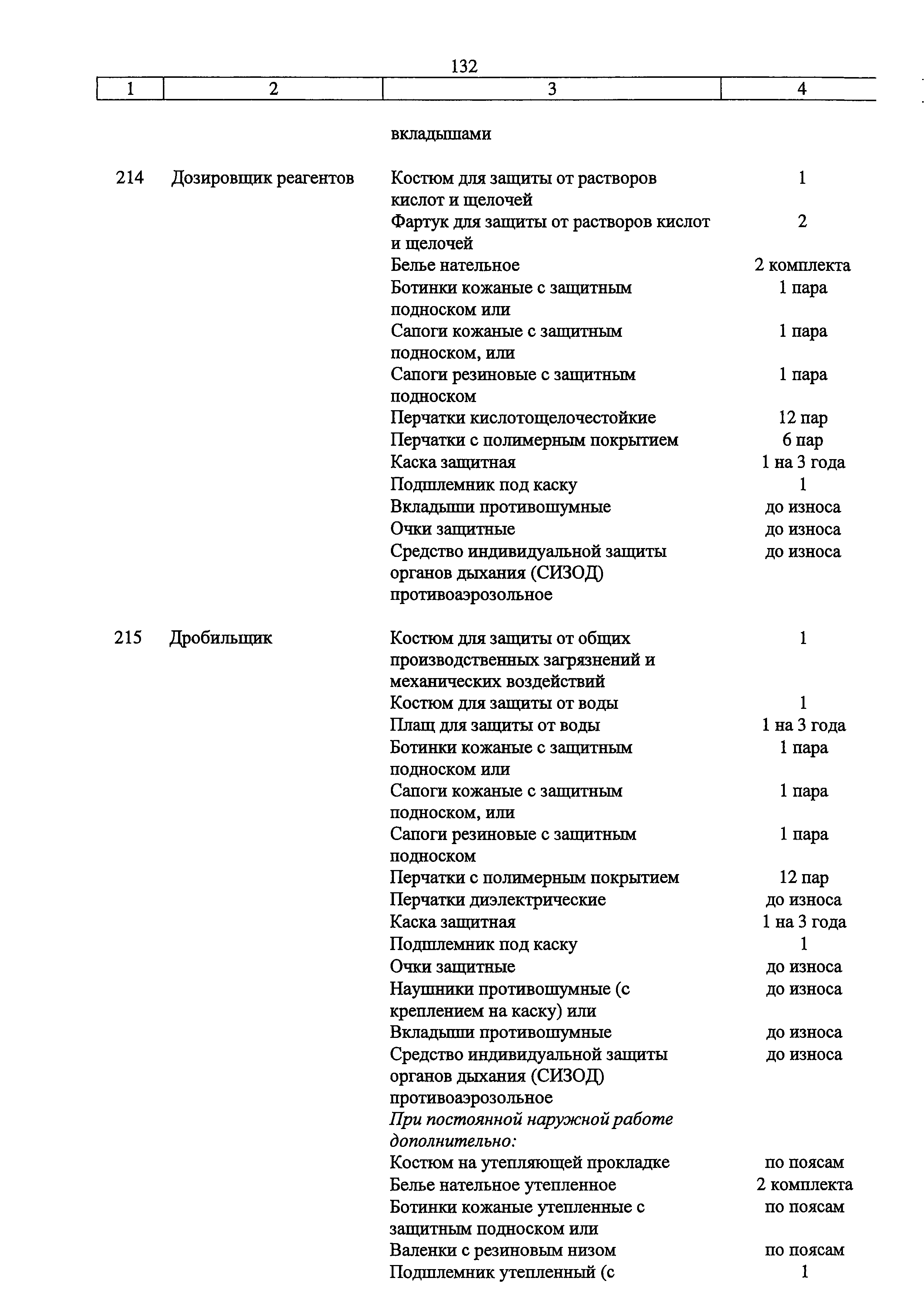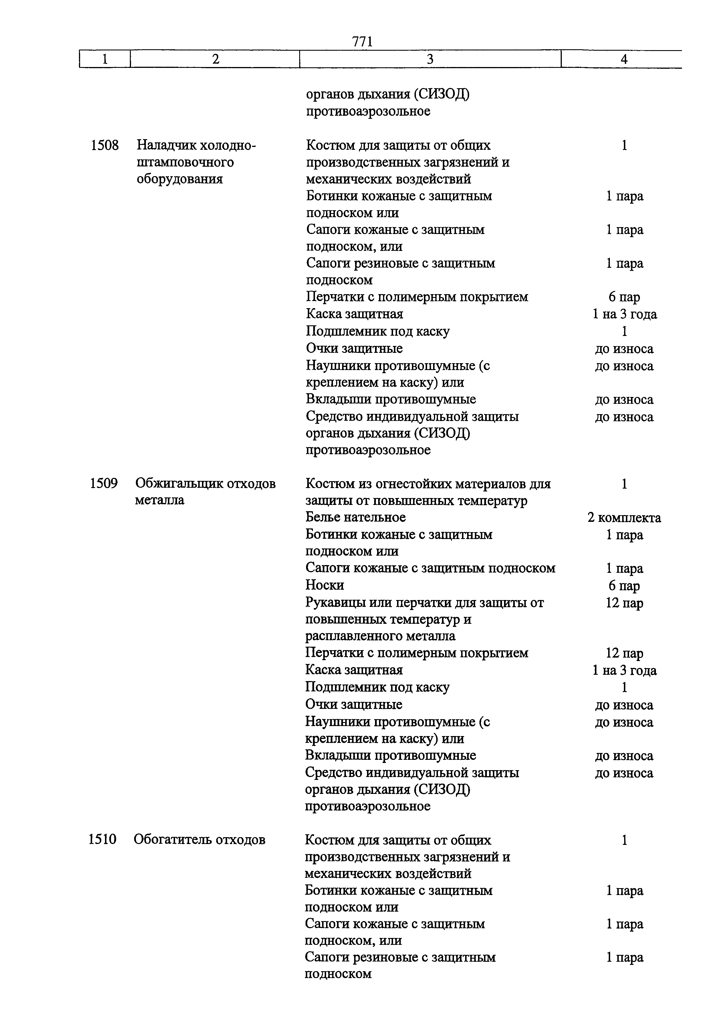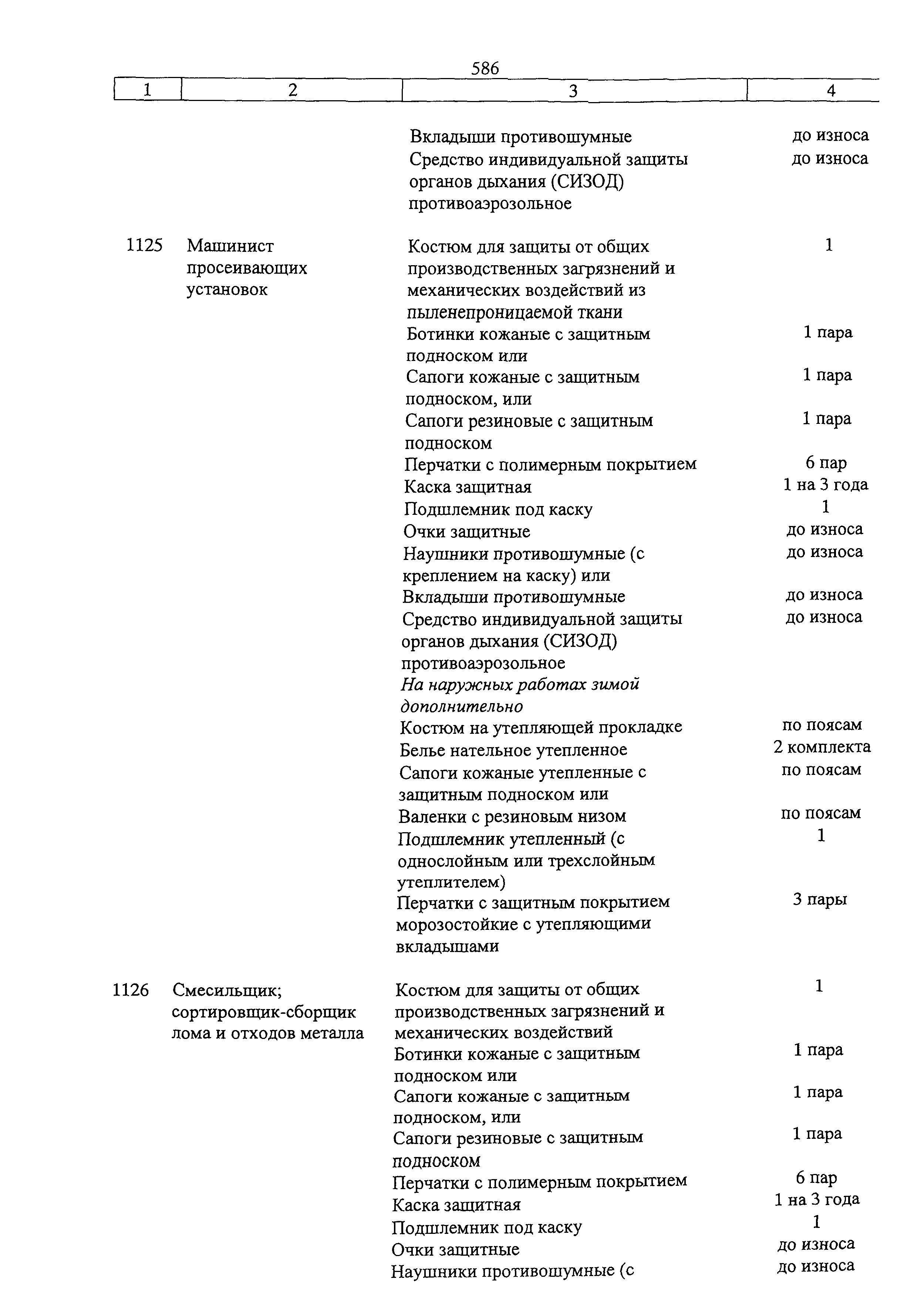 Типовые нормы бесплатной выдачи специальной одежды, специальной обуви и других средств индивидуальной защиты работникам горной и металлургической промышленности и металлургических производств других отраслей промышленности, занятым на работах с вредными и (или) опасными условиями труда, а также на работах, выполняемых в особых температурных условиях или связанных с загрязнением| Статус: | действует | | Название рус.: | Типовые нормы бесплатной выдачи специальной одежды, специальной обуви и других средств индивидуальной защиты работникам горной и металлургической промышленности и металлургических производств других отраслей промышленности, занятым на работах с вредными и (или) опасными условиями труда, а также на работах, выполняемых в особых температурных условиях или связанных с загрязнением | | Дата добавления в базу: | 01.02.2017 | | Дата актуализации: | 01.01.2021 | | Дата введения: | 14.02.2014 | | Область применения: | Нормы утверждаются локальными нормативными актами работодателя на основании результатов аттестации рабочих мест по условиям труда и могут быть включены в коллективный и (или) трудовой договор с указанием типовых норм, по сравнению с которыми улучшается обеспечение работников специальной одеждой, специальной обувью и другими средствами индивидуальной защиты. | | Оглавление: | I Горнодобывающая промышленность 1 Подземные горные работы (шахты) 2 Открытые горные работы и шахтная поверхность 3 Работа на гидравлических установках или с промывочными приборами 4 Дражные работы II Дробление, обогащение, брикетирование, обжиг, агломерация, извлечение металлов и сплавов III Черная металлургия 1 Коксохимическое производство 1.1 Углеподготовительные цеха 1.2 Углеобогатительные цеха 1.3 Производство каменноугольного кокса 1.4 Производство кристаллического нафталина, кумароновой смолы, смолоперерабатывающие цеха 1.5 Производство пиридиновых и фенольно-крезольных продуктов 1.6 Цеха улавливания химических продуктов и газовые цеха 1.7 Цеха ректификации сырого бензола 1.8 Цеха очистки коксового газа от сероводорода 1.9 Производство пекового кокса 1.10 Производство термоантрацита 2 Доменное производство 3 Сталеплавильное производство 3.1 Установки непрерывной разливки стали 4 Производство ферросплавов 4.1 Электролитическое производство 4.2 Производство электролитического хрома 4.3 Производство феррованадия 4.4 Подготовка шихты, обжиг руд и концентратов 4.5 Разливка и разделка ферросплавов 4.6 Обжиг извести 4.7 Общие профессии и должности ферросплавного производства 5 Прокатное производство 6 Производство труб (прокатка, сварка и волочение) 7 Колесопрокатное и бандажное производства 8 Валопрокатное производство 9 Производство рельсовых скреплений 10 Производство баллонов 11 Труболитейное производство 12 Производство метизов 12.1 Производство металлических канатов, сеток, пружин и пружинной ленты, щеток, цепей, колючей проволоки и других метизов 12.2 Волочение проволоки, калибровка и шлифовка металла 12.3 Изготовление волок 12.4 Холодноштамповочные и кузнечно-прессовые работы 12.5 Термическая обработка 12.6 Травление металла, защитные покрытия проволоки и извлечение железного купороса 12.7 Производство металлических электродов и порошковой проволоки 13 Производство огнеупоров 13.1 Огнеупоры 13.2 Карборундовые стержни 13.3 Высокоогнеупорные окислы 14 Ремонт 