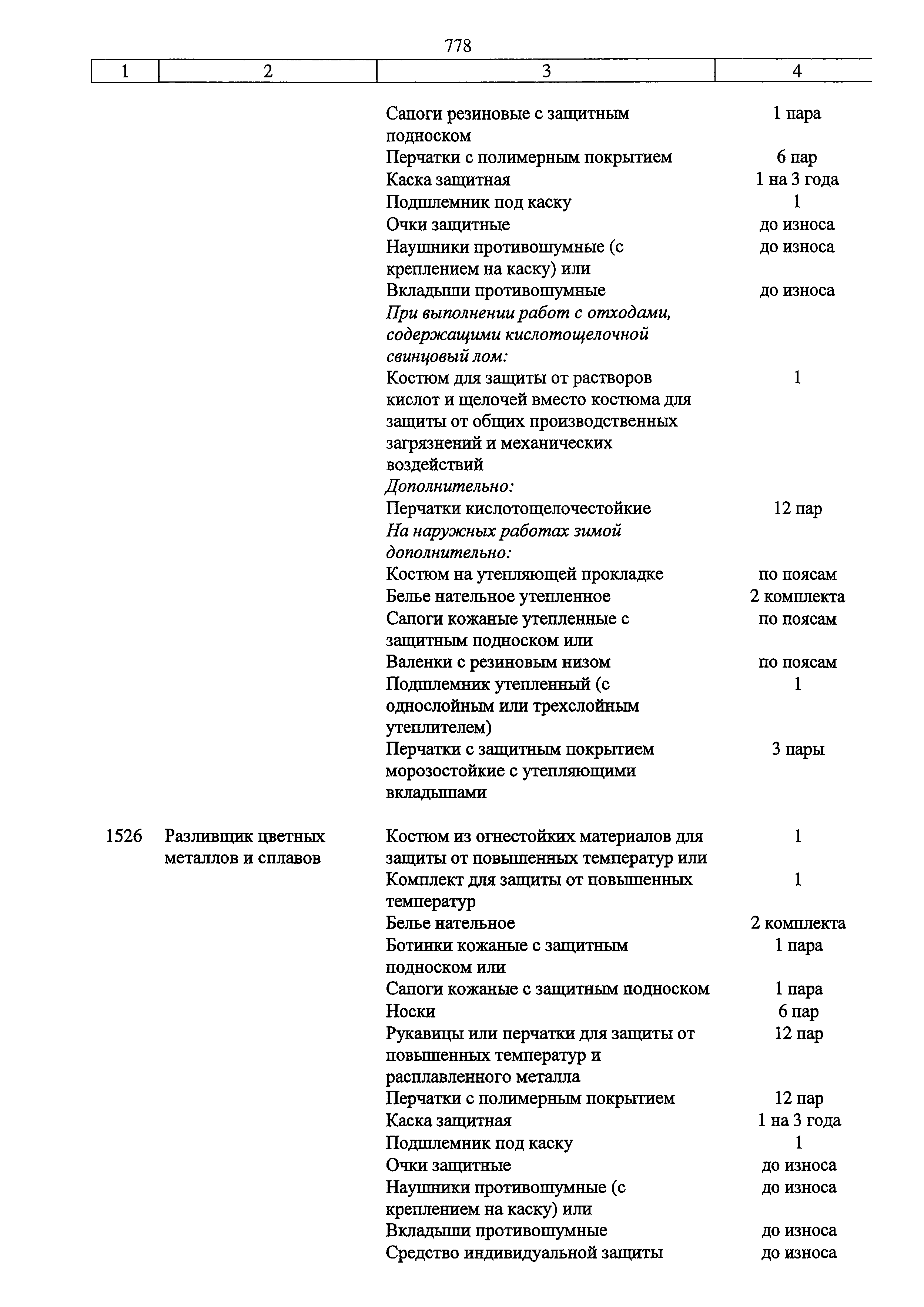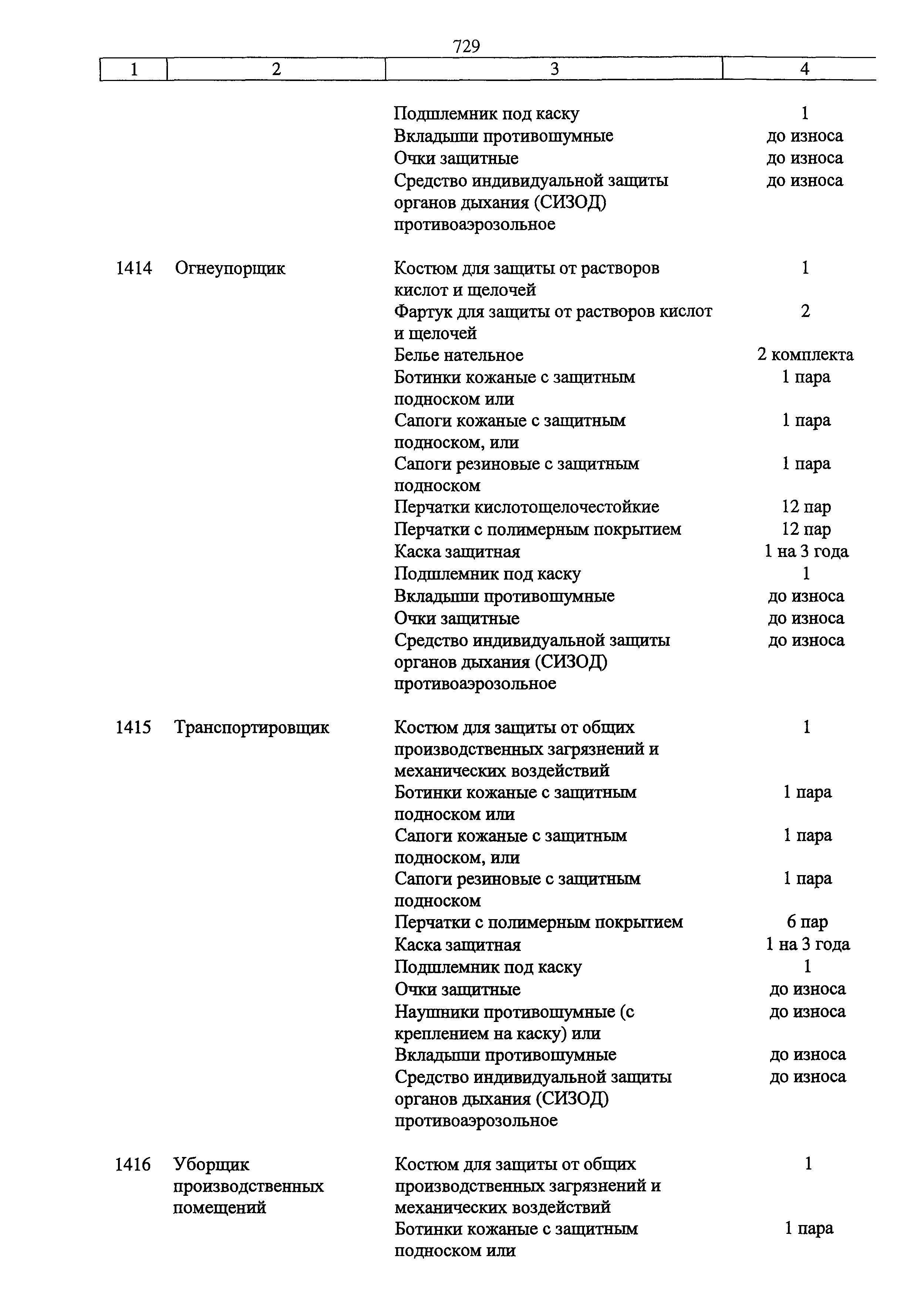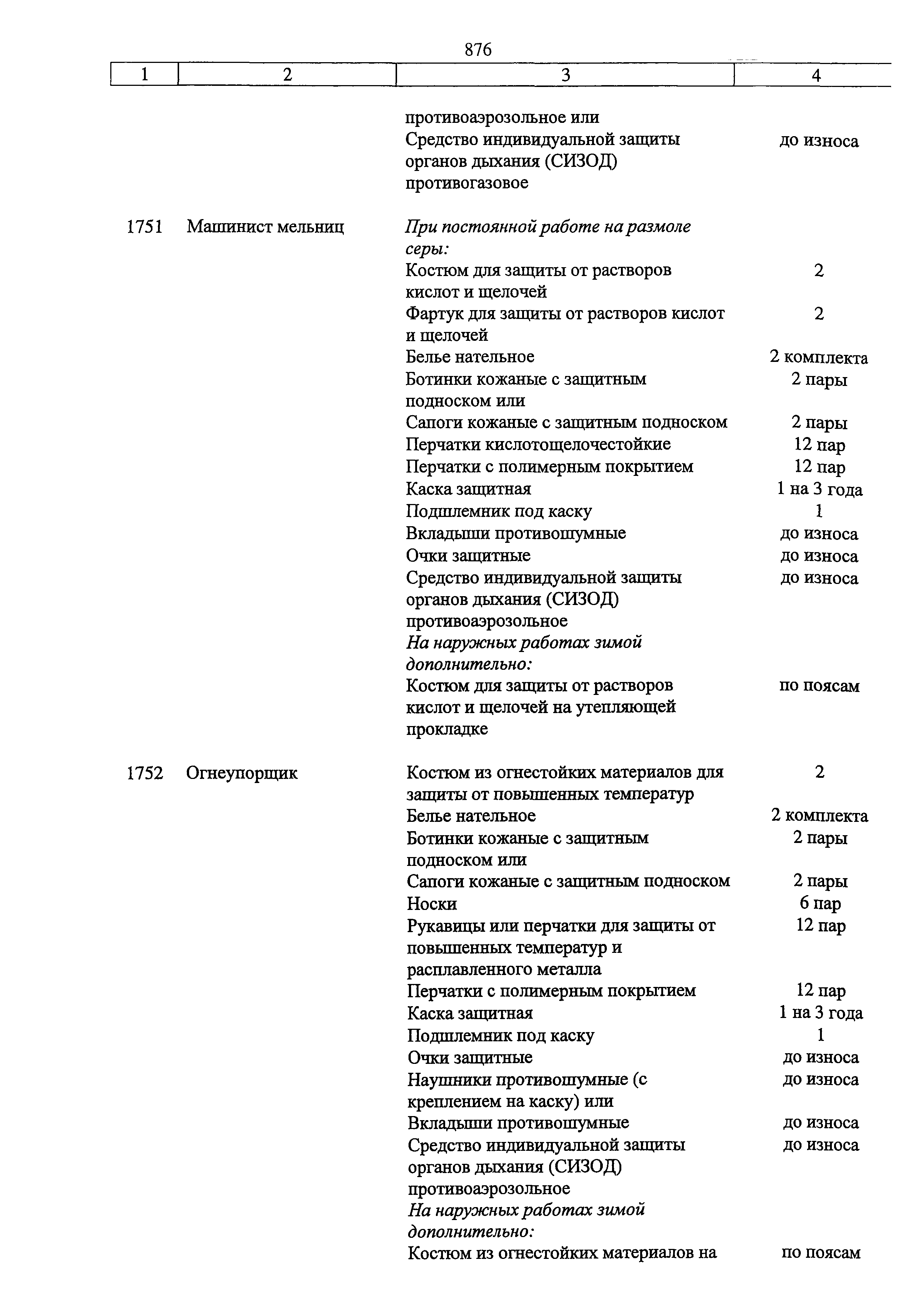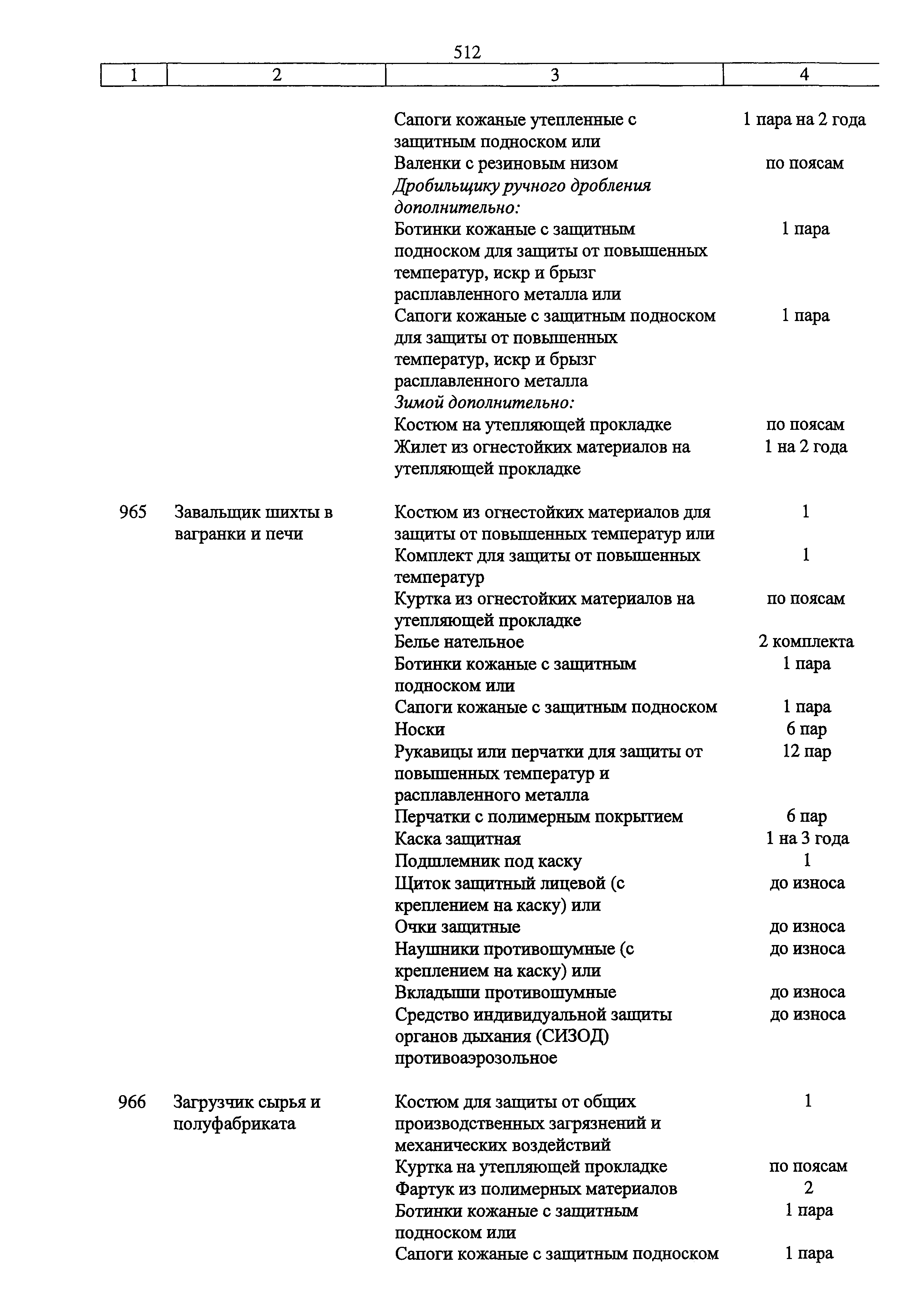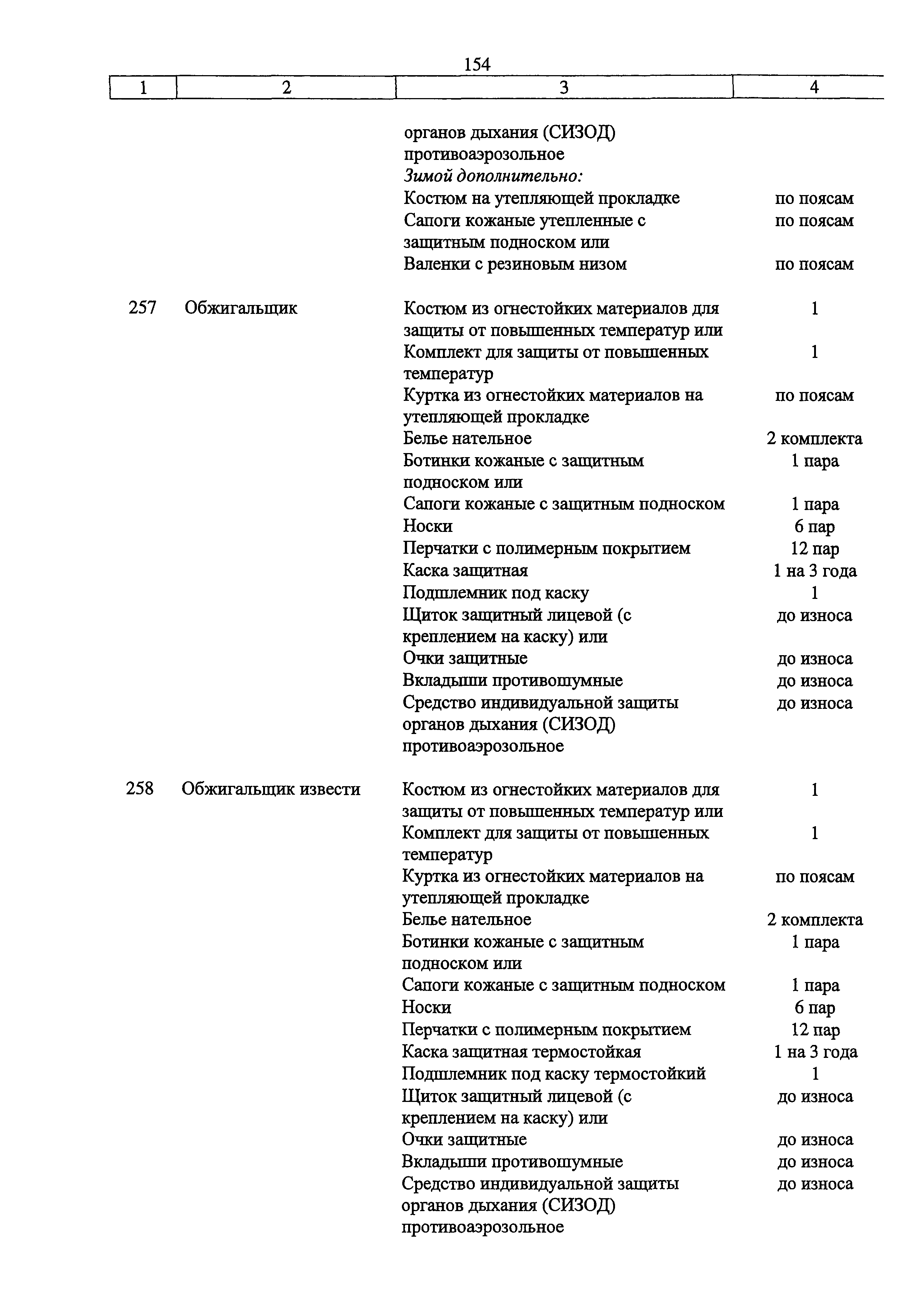 Типовые нормы бесплатной выдачи специальной одежды, специальной обуви и других средств индивидуальной защиты работникам горной и металлургической промышленности и металлургических производств других отраслей промышленности, занятым на работах с вредными и (или) опасными условиями труда, а также на работах, выполняемых в особых температурных условиях или связанных с загрязнением| Статус: | действует | | Название рус.: | Типовые нормы бесплатной выдачи специальной одежды, специальной обуви и других средств индивидуальной защиты работникам горной и металлургической промышленности и металлургических производств других отраслей промышленности, занятым на работах с вредными и (или) опасными условиями труда, а также на работах, выполняемых в особых температурных условиях или связанных с загрязнением | | Дата добавления в базу: | 01.02.2017 | | Дата актуализации: | 01.01.2021 | | Дата введения: | 14.02.2014 | | Область применения: | Нормы утверждаются локальными нормативными актами работодателя на основании результатов аттестации рабочих мест по условиям труда и могут быть включены в коллективный и (или) трудовой договор с указанием типовых норм, по сравнению с которыми улучшается обеспечение работников специальной одеждой, специальной обувью и другими средствами индивидуальной защиты. | | Оглавление: | I Горнодобывающая промышленность 1 Подземные горные работы (шахты) 2 Открытые горные работы и шахтная поверхность 3 Работа на гидравлических установках или с промывочными приборами 4 Дражные работы II Дробление, обогащение, брикетирование, обжиг, агломерация, извлечение металлов и сплавов III Черная металлургия 1 Коксохимическое производство 1.1 Углеподготовительные цеха 1.2 Углеобогатительные цеха 1.3 Производство каменноугольного кокса 1.4 Производство кристаллического нафталина, кумароновой смолы, смолоперерабатывающие цеха 1.5 Производство пиридиновых и фенольно-крезольных продуктов 1.6 Цеха улавливания химических продуктов и газовые цеха 1.7 Цеха ректификации сырого бензола 1.8 Цеха очистки коксового газа от сероводорода 1.9 Производство пекового кокса 1.10 Производство термоантрацита 2 Доменное производство 3 Сталеплавильное производство 3.1 Установки непрерывной разливки стали 4 Производство ферросплавов 4.1 Электролитическое производство 4.2 Производство электролитического хрома 4.3 Производство феррованадия 4.4 Подготовка шихты, обжиг руд и концентратов 4.5 Разливка и разделка ферросплавов 4.6 Обжиг извести 4.7 Общие профессии и должности ферросплавного производства 5 Прокатное производство 6 Производство труб (прокатка, сварка и волочение) 7 Колесопрокатное и бандажное производства 8 Валопрокатное производство 9 Производство рельсовых скреплений 10 Производство баллонов 11 Труболитейное производство 12 Производство метизов 12.1 Производство металлических канатов, сеток, пружин и пружинной ленты, щеток, цепей, колючей проволоки и других метизов 12.2 Волочение проволоки, калибровка и шлифовка металла 12.3 Изготовление волок 12.4 Холодноштамповочные и кузнечно-прессовые работы 12.5 Термическая обработка 12.6 Травление металла, защитные покрытия проволоки и извлечение железного купороса 12.7 Производство металлических электродов и порошковой проволоки 13 Производство огнеупоров 13.1 Огнеупоры 13.2 Карборундовые стержни 13.3 Высокоогнеупорные окислы 14 Ремонт 