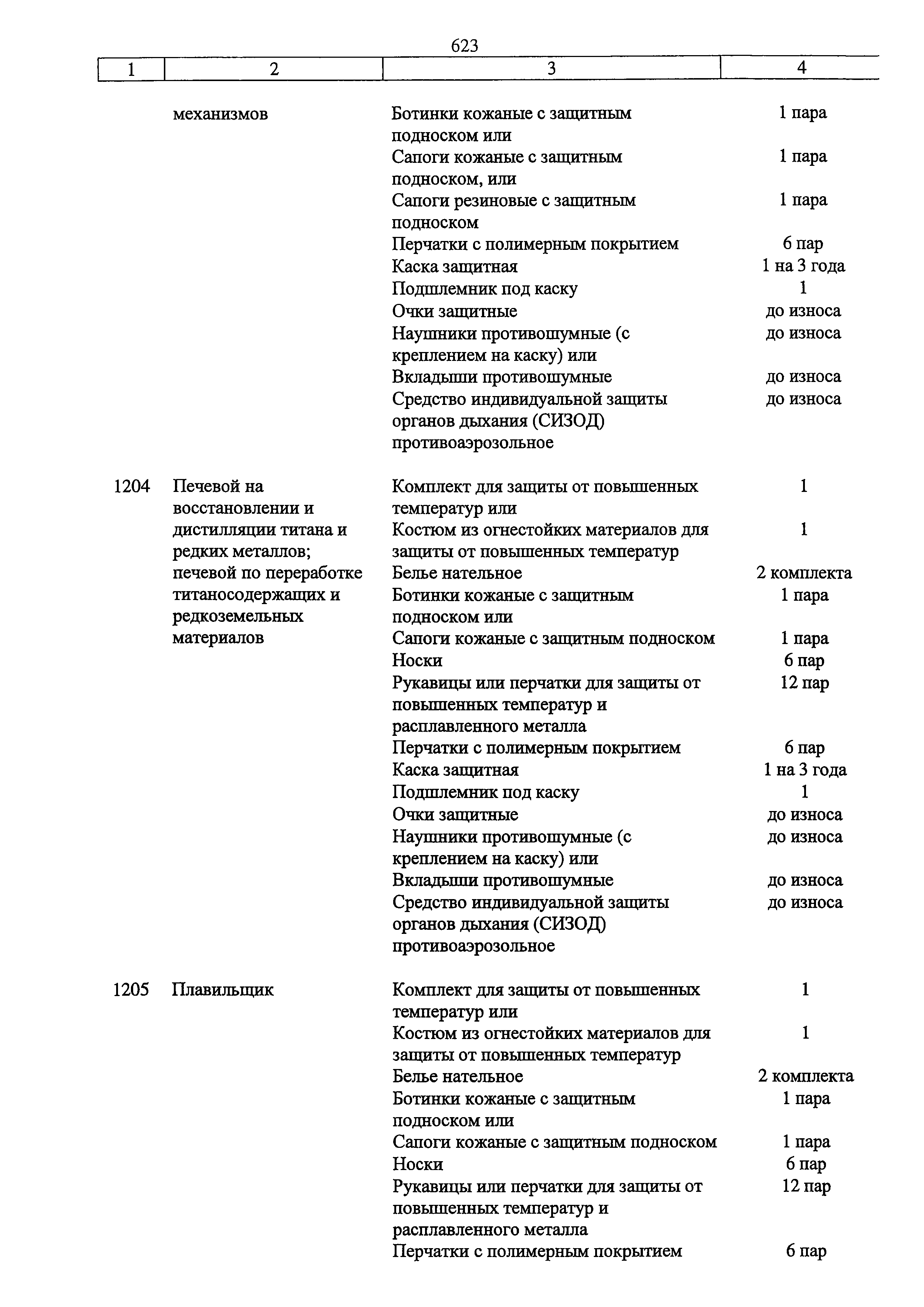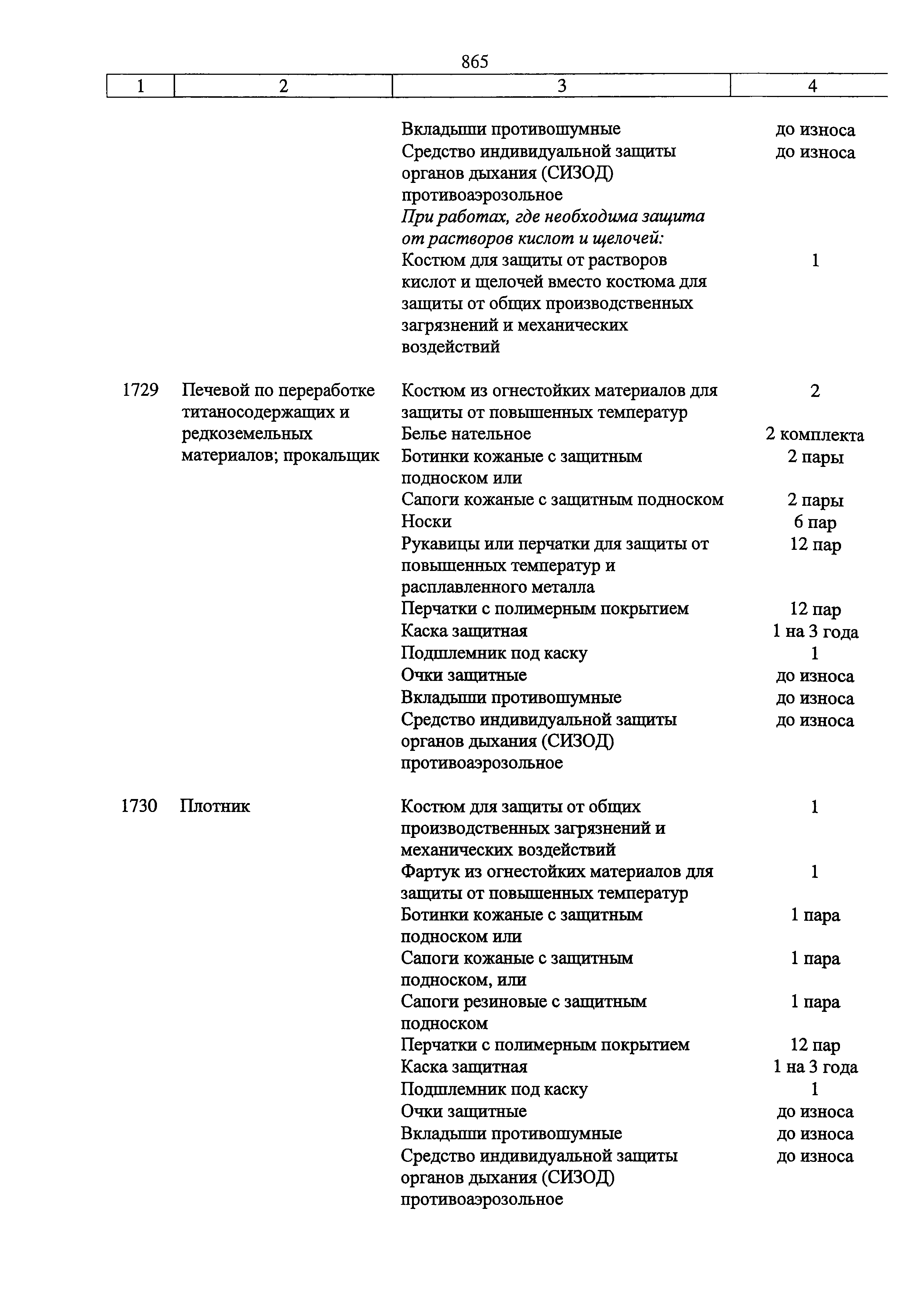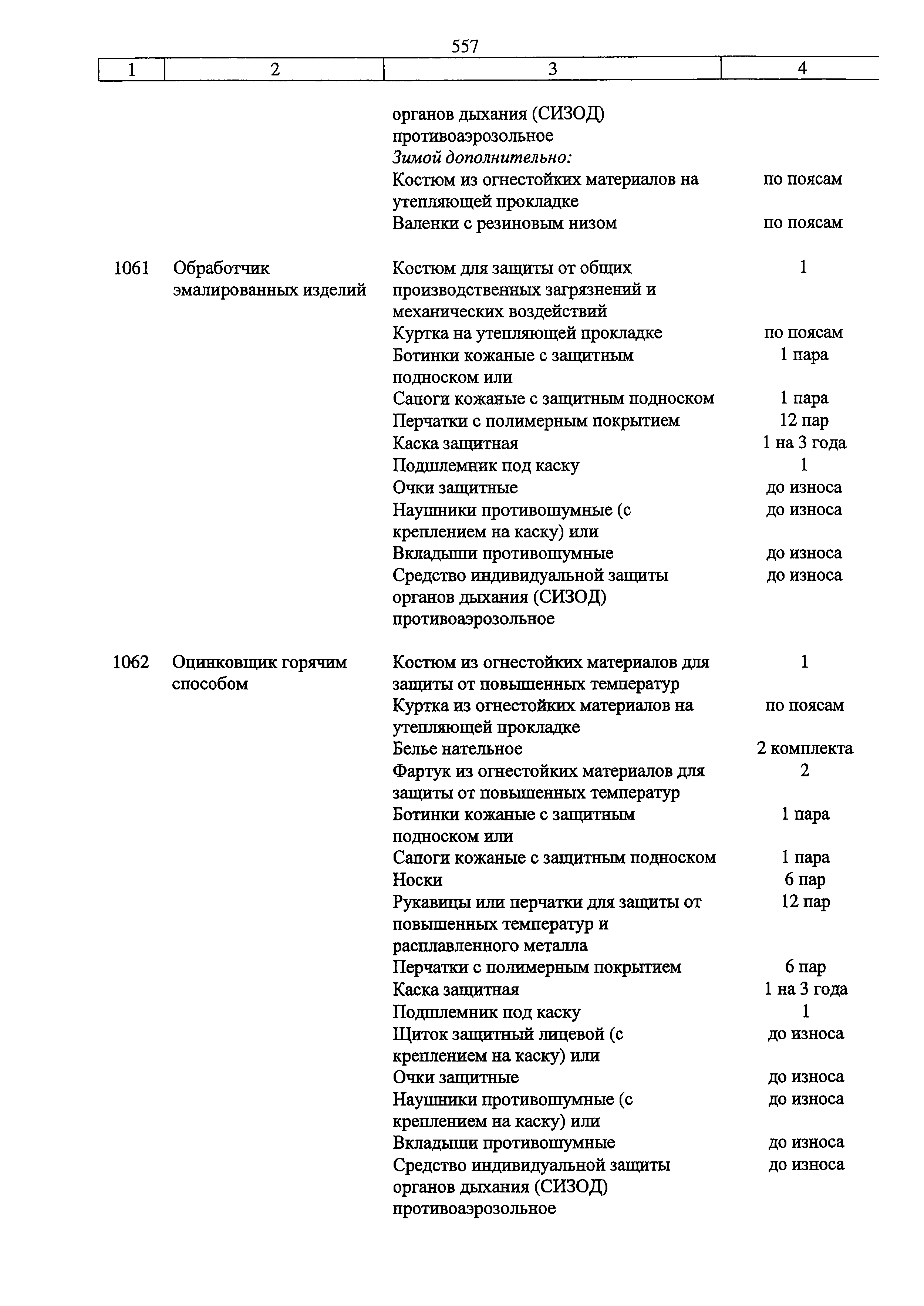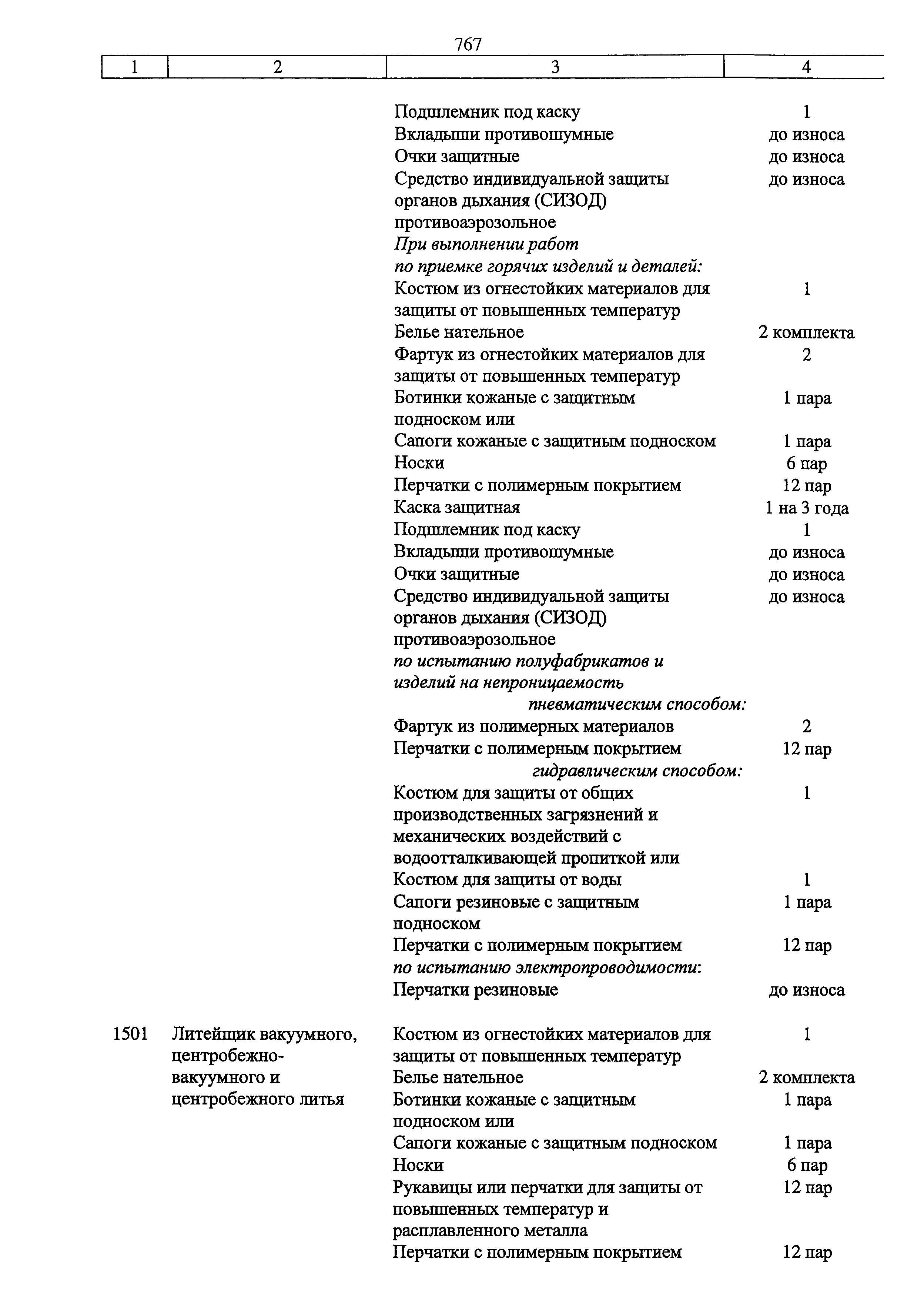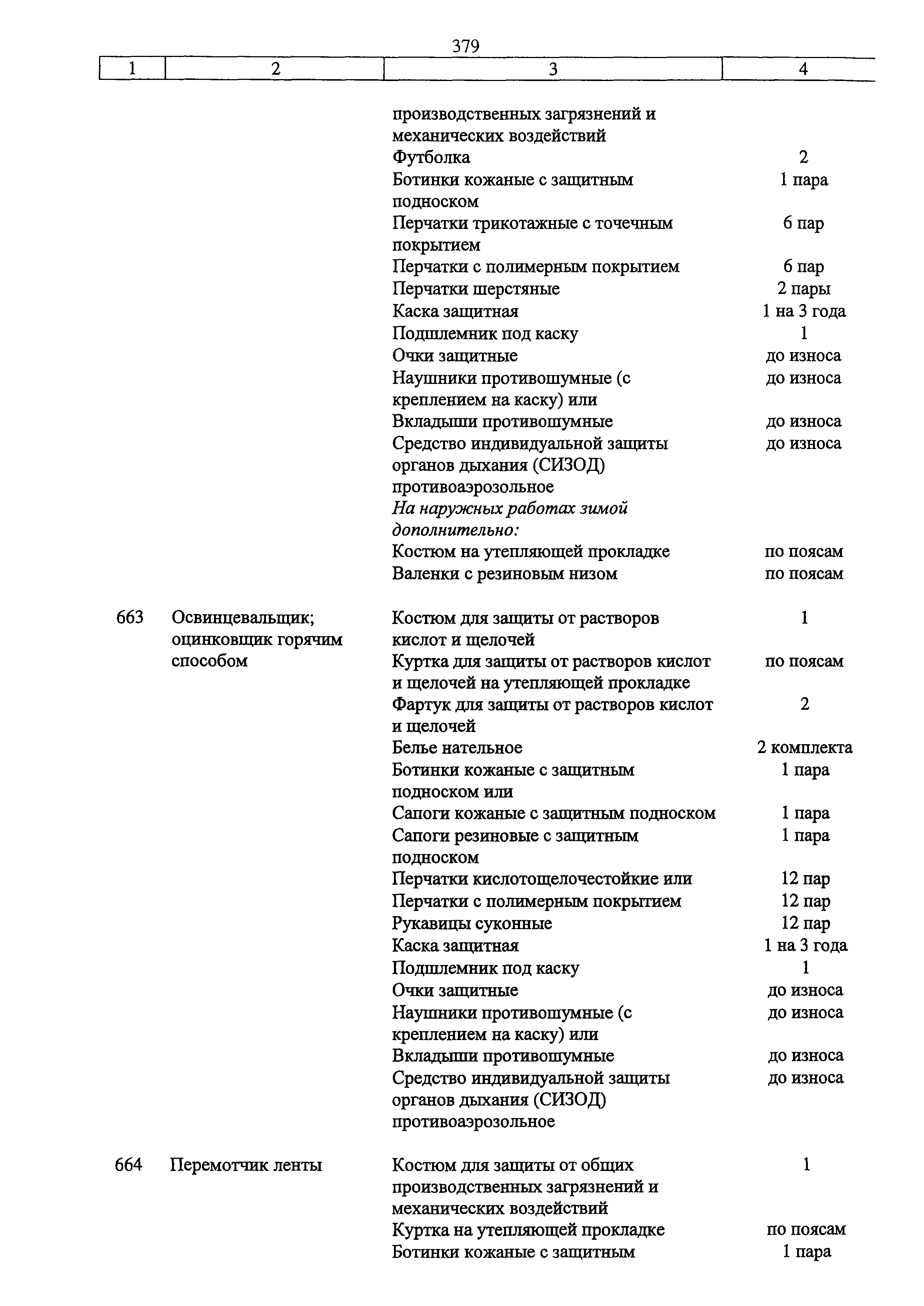 Типовые нормы бесплатной выдачи специальной одежды, специальной обуви и других средств индивидуальной защиты работникам горной и металлургической промышленности и металлургических производств других отраслей промышленности, занятым на работах с вредными и (или) опасными условиями труда, а также на работах, выполняемых в особых температурных условиях или связанных с загрязнением| Статус: | действует | | Название рус.: | Типовые нормы бесплатной выдачи специальной одежды, специальной обуви и других средств индивидуальной защиты работникам горной и металлургической промышленности и металлургических производств других отраслей промышленности, занятым на работах с вредными и (или) опасными условиями труда, а также на работах, выполняемых в особых температурных условиях или связанных с загрязнением | | Дата добавления в базу: | 01.02.2017 | | Дата актуализации: | 01.01.2021 | | Дата введения: | 14.02.2014 | | Область применения: | Нормы утверждаются локальными нормативными актами работодателя на основании результатов аттестации рабочих мест по условиям труда и могут быть включены в коллективный и (или) трудовой договор с указанием типовых норм, по сравнению с которыми улучшается обеспечение работников специальной одеждой, специальной обувью и другими средствами индивидуальной защиты. | | Оглавление: | I Горнодобывающая промышленность 1 Подземные горные работы (шахты) 2 Открытые горные работы и шахтная поверхность 3 Работа на гидравлических установках или с промывочными приборами 4 Дражные работы II Дробление, обогащение, брикетирование, обжиг, агломерация, извлечение металлов и сплавов III Черная металлургия 1 Коксохимическое производство 1.1 Углеподготовительные цеха 1.2 Углеобогатительные цеха 1.3 Производство каменноугольного кокса 1.4 Производство кристаллического нафталина, кумароновой смолы, смолоперерабатывающие цеха 1.5 Производство пиридиновых и фенольно-крезольных продуктов 1.6 Цеха улавливания химических продуктов и газовые цеха 1.7 Цеха ректификации сырого бензола 1.8 Цеха очистки коксового газа от сероводорода 1.9 Производство пекового кокса 1.10 Производство термоантрацита 2 Доменное производство 3 Сталеплавильное производство 3.1 Установки непрерывной разливки стали 4 Производство ферросплавов 4.1 Электролитическое производство 4.2 Производство электролитического хрома 4.3 Производство феррованадия 4.4 Подготовка шихты, обжиг руд и концентратов 4.5 Разливка и разделка ферросплавов 4.6 Обжиг извести 4.7 Общие профессии и должности ферросплавного производства 5 Прокатное производство 6 Производство труб (прокатка, сварка и волочение) 7 Колесопрокатное и бандажное производства 8 Валопрокатное производство 9 Производство рельсовых скреплений 10 Производство баллонов 11 Труболитейное производство 12 Производство метизов 12.1 Производство металлических канатов, сеток, пружин и пружинной ленты, щеток, цепей, колючей проволоки и других метизов 12.2 Волочение проволоки, калибровка и шлифовка металла 12.3 Изготовление волок 12.4 Холодноштамповочные и кузнечно-прессовые работы 12.5 Термическая обработка 12.6 Травление металла, защитные покрытия проволоки и извлечение железного купороса 12.7 Производство металлических электродов и порошковой проволоки 13 Производство огнеупоров 13.1 Огнеупоры 13.2 Карборундовые стержни 13.3 Высокоогнеупорные окислы 14 Ремонт 
